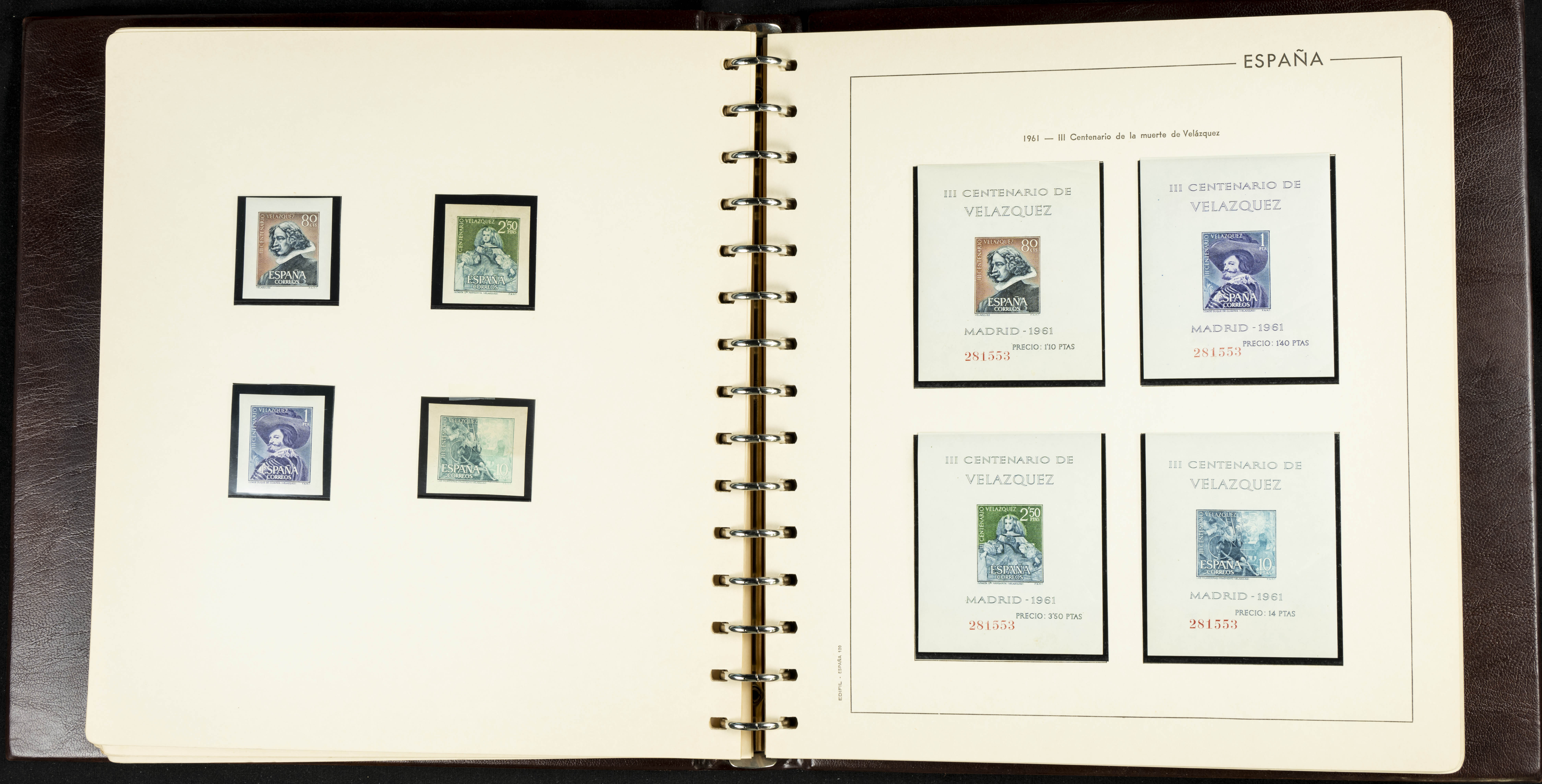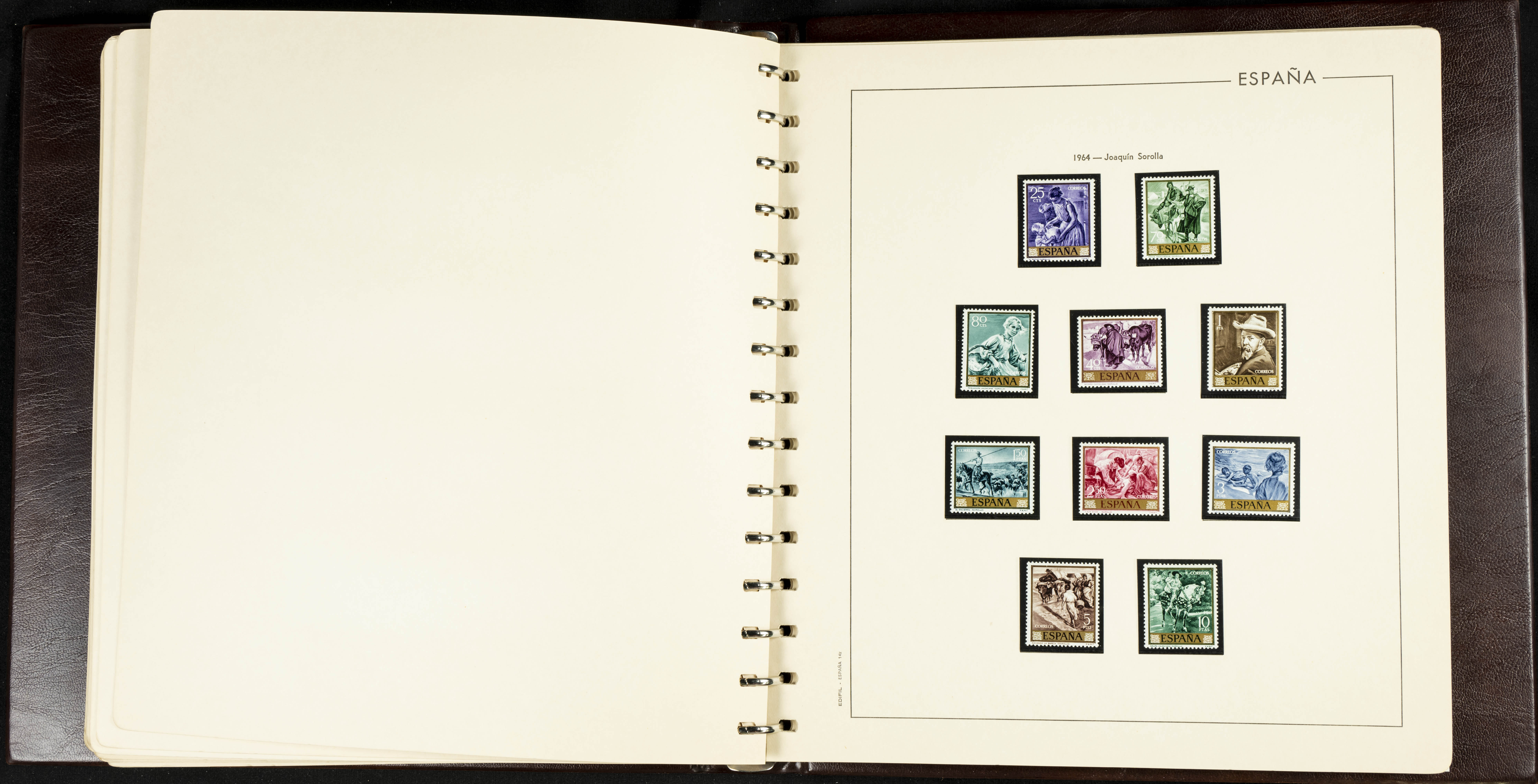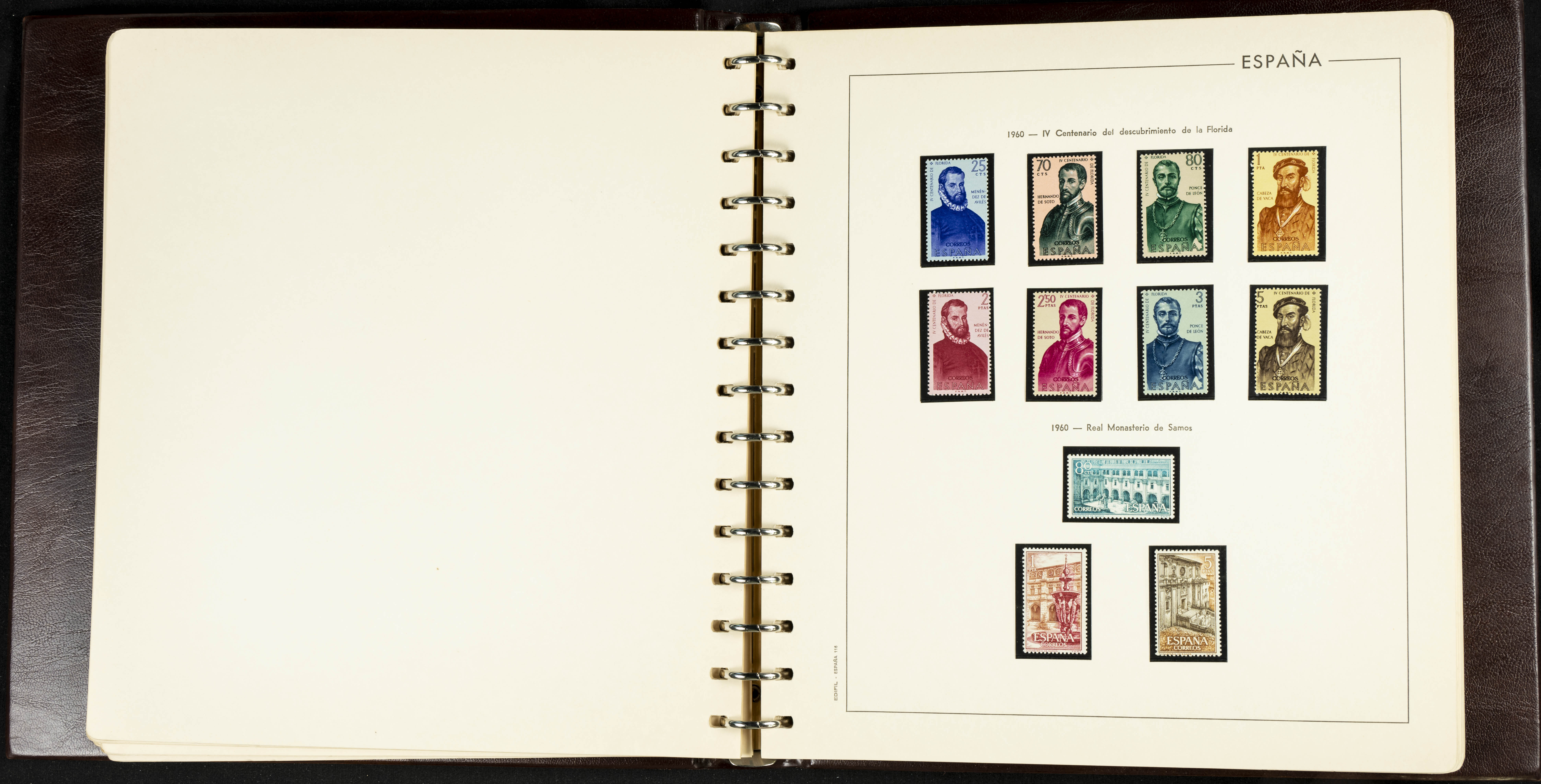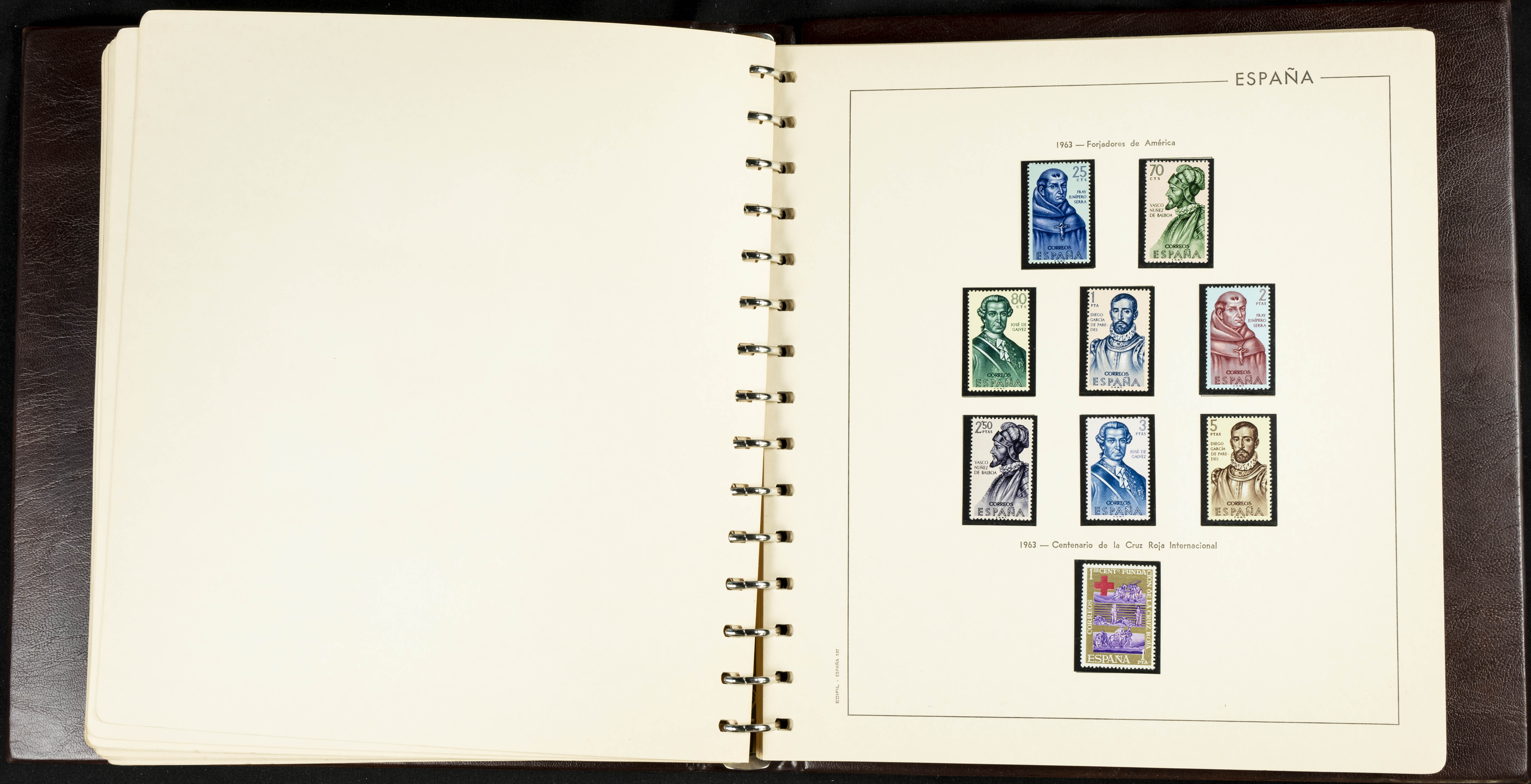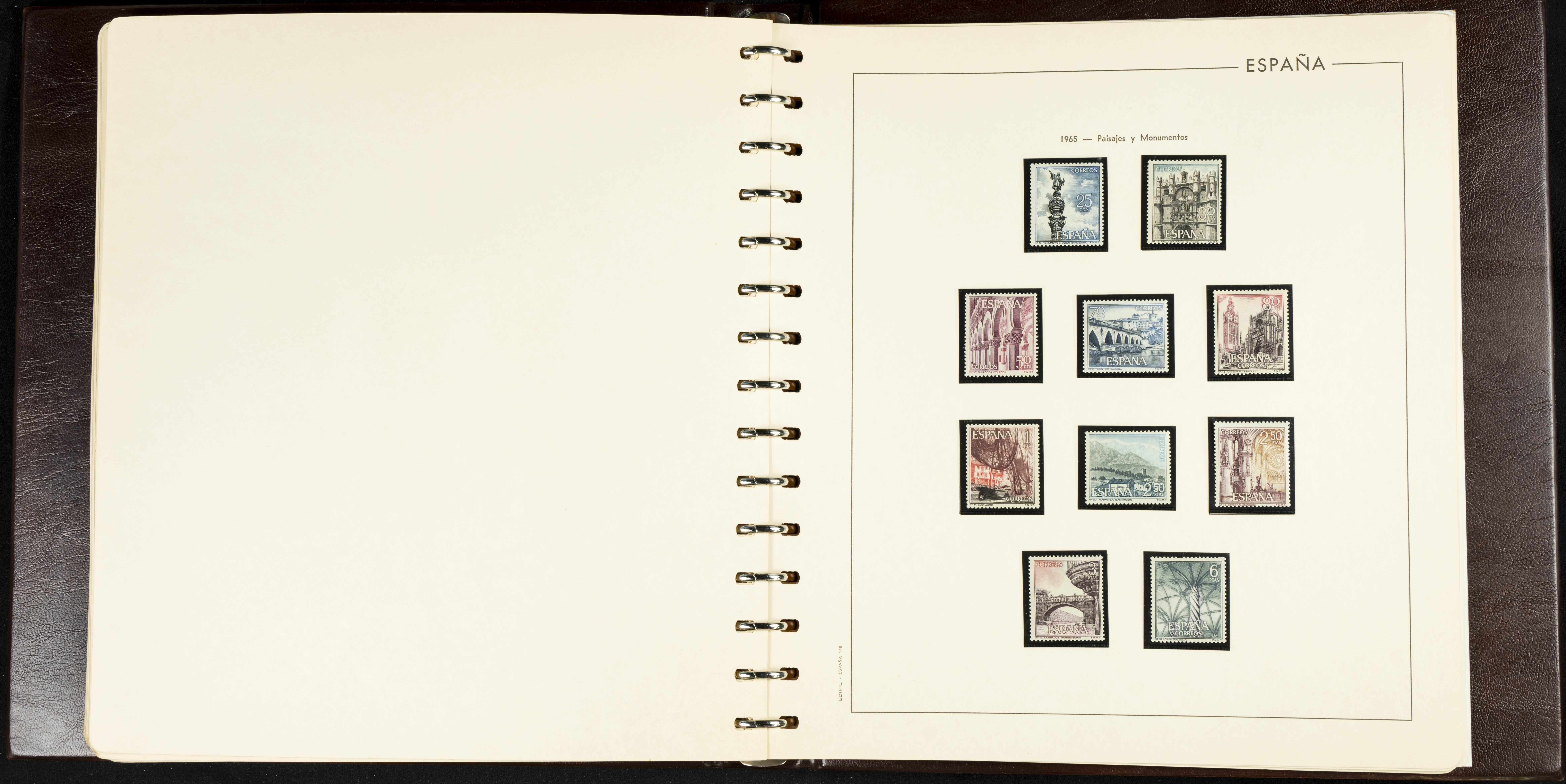 ★★(1950ca). Colección completa entre 1950 y 1975, en nuevo y sin fijasellos a falta de los Caudillos a Canarias con y sin número e incluyendo la 1ª y 2ª Tirada terrestres, Centenario, "Legazpi y Sorolla" (duplicado en usado) y juegos completos de Trajes y Escudos en bloques de cuatro. ALTO VALOR DE CATALOGO. A EXAMINAR.