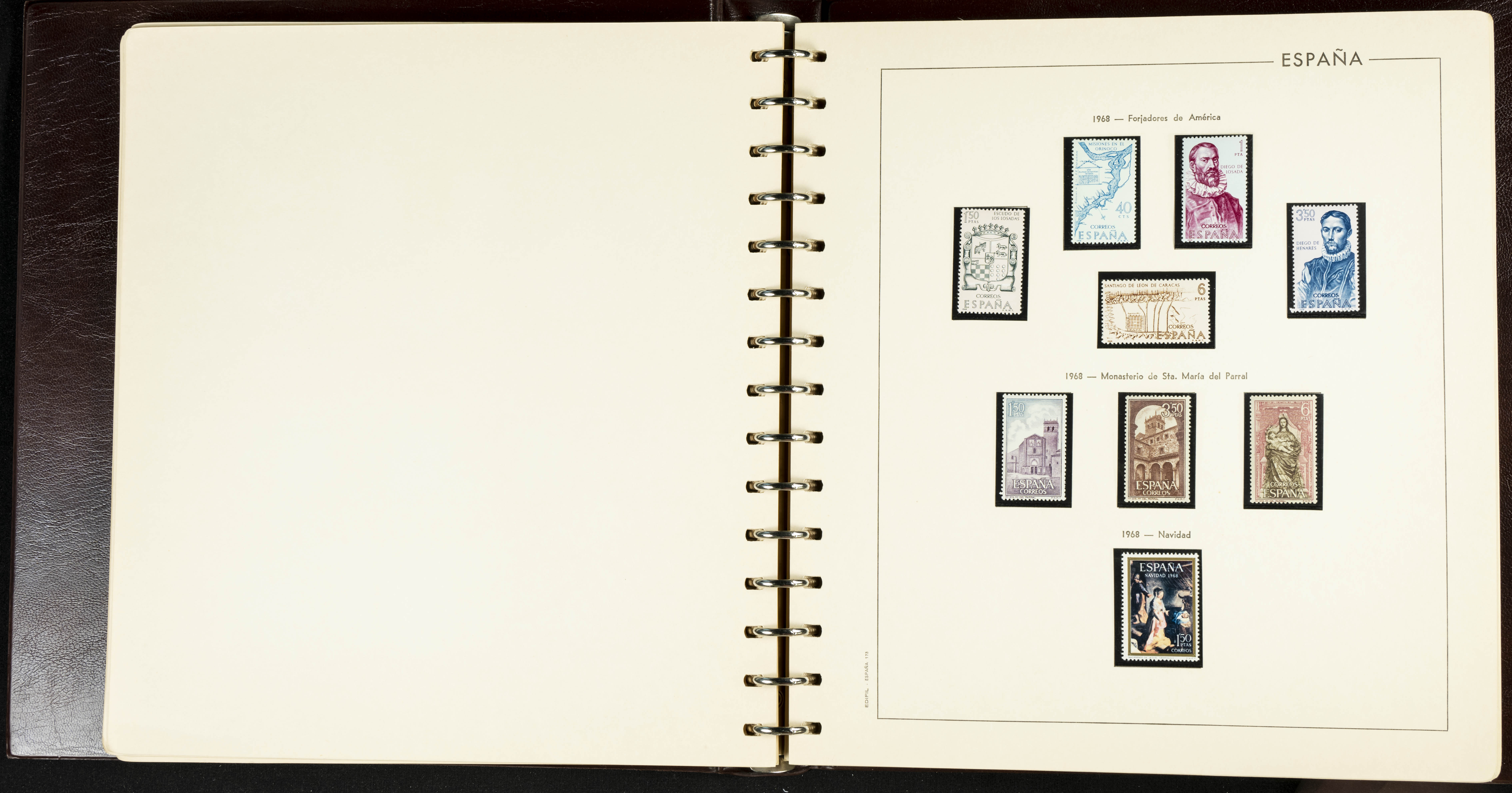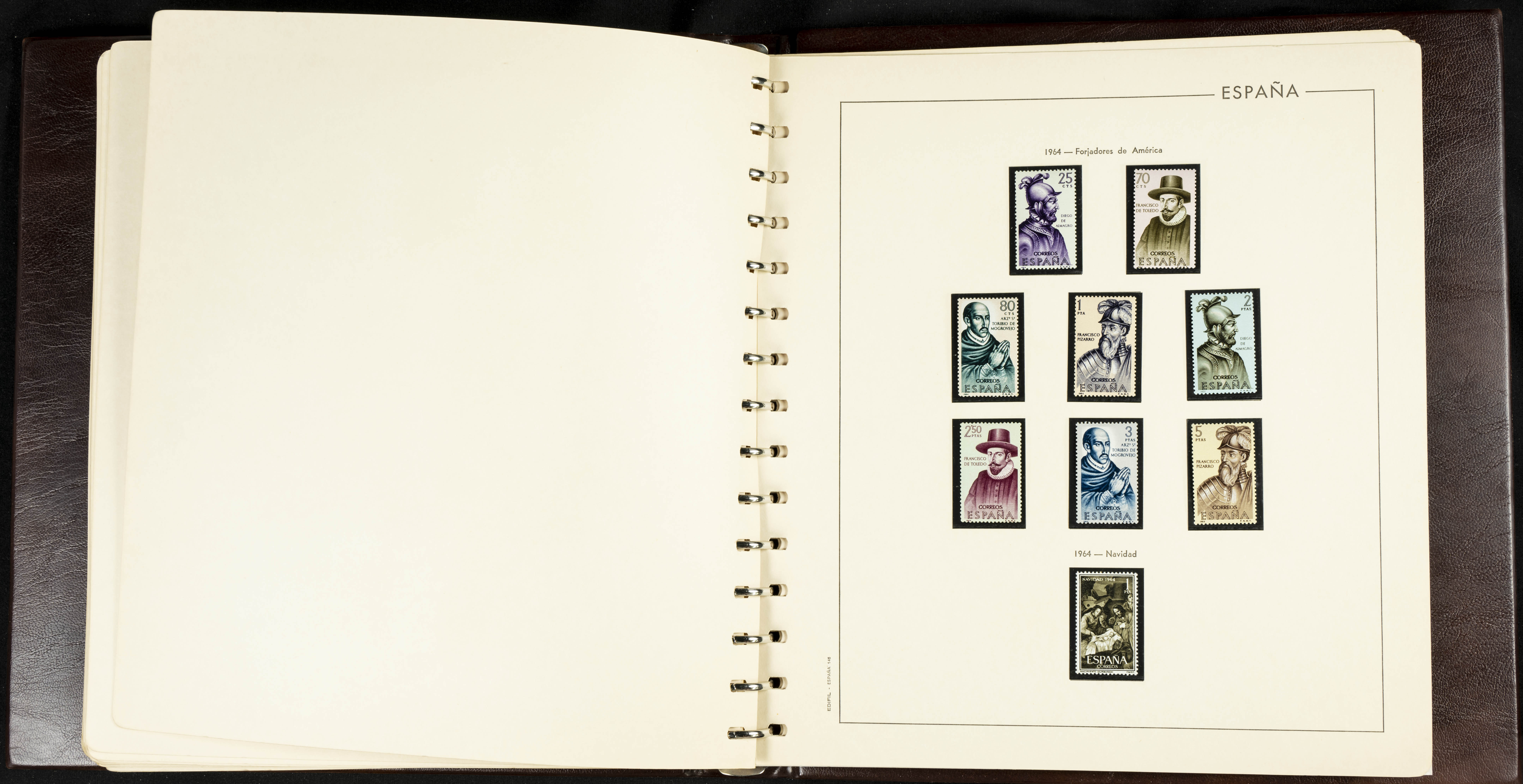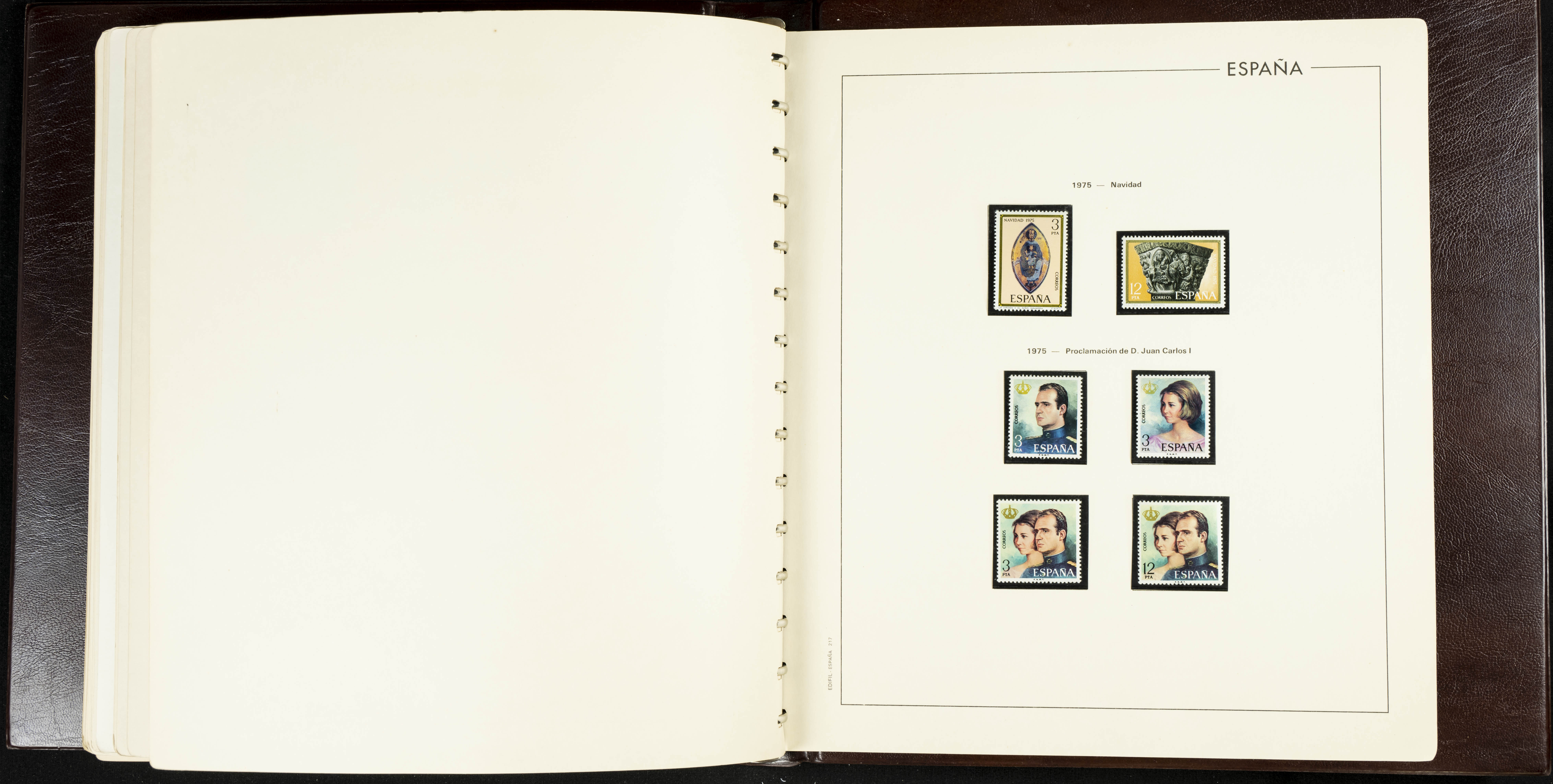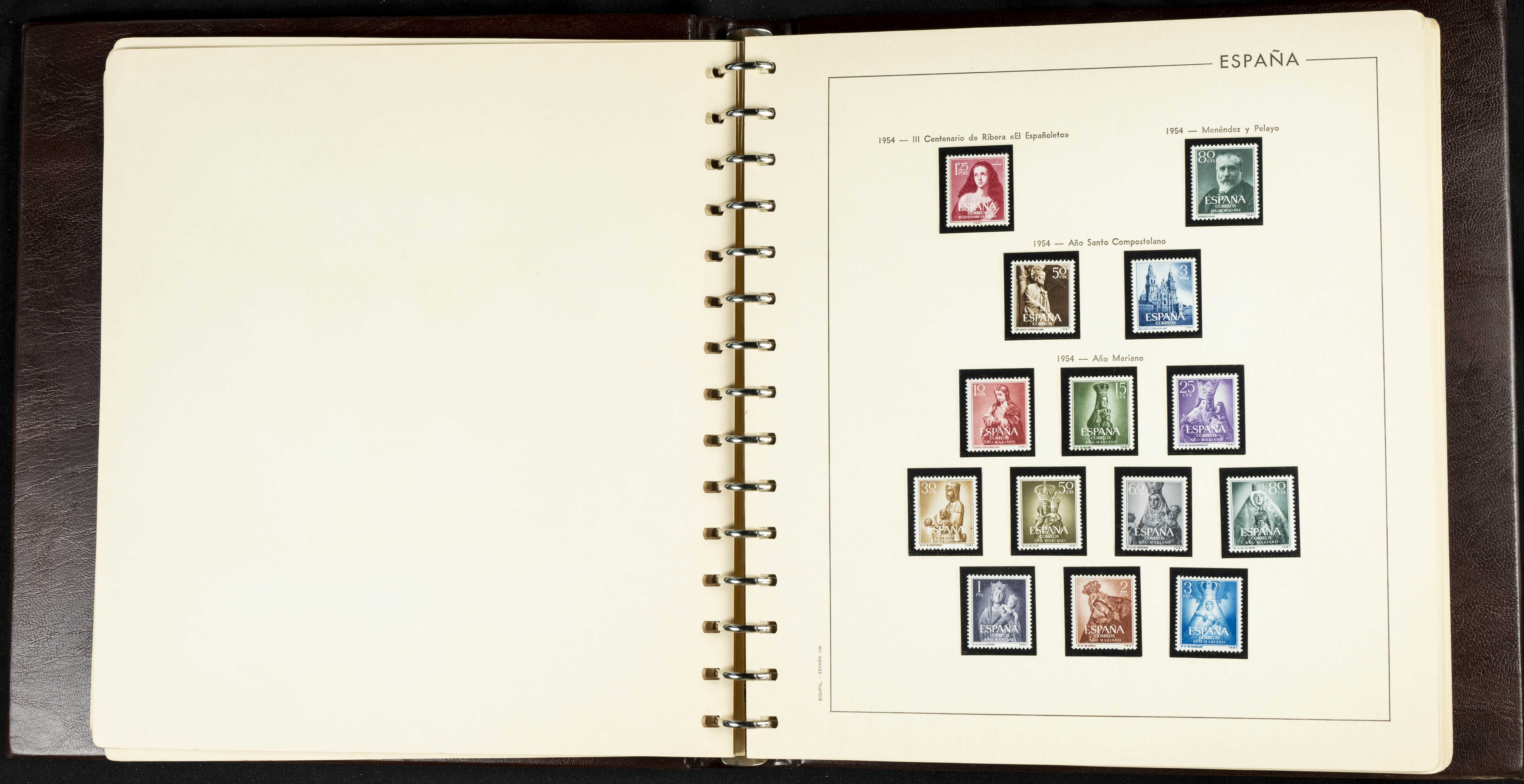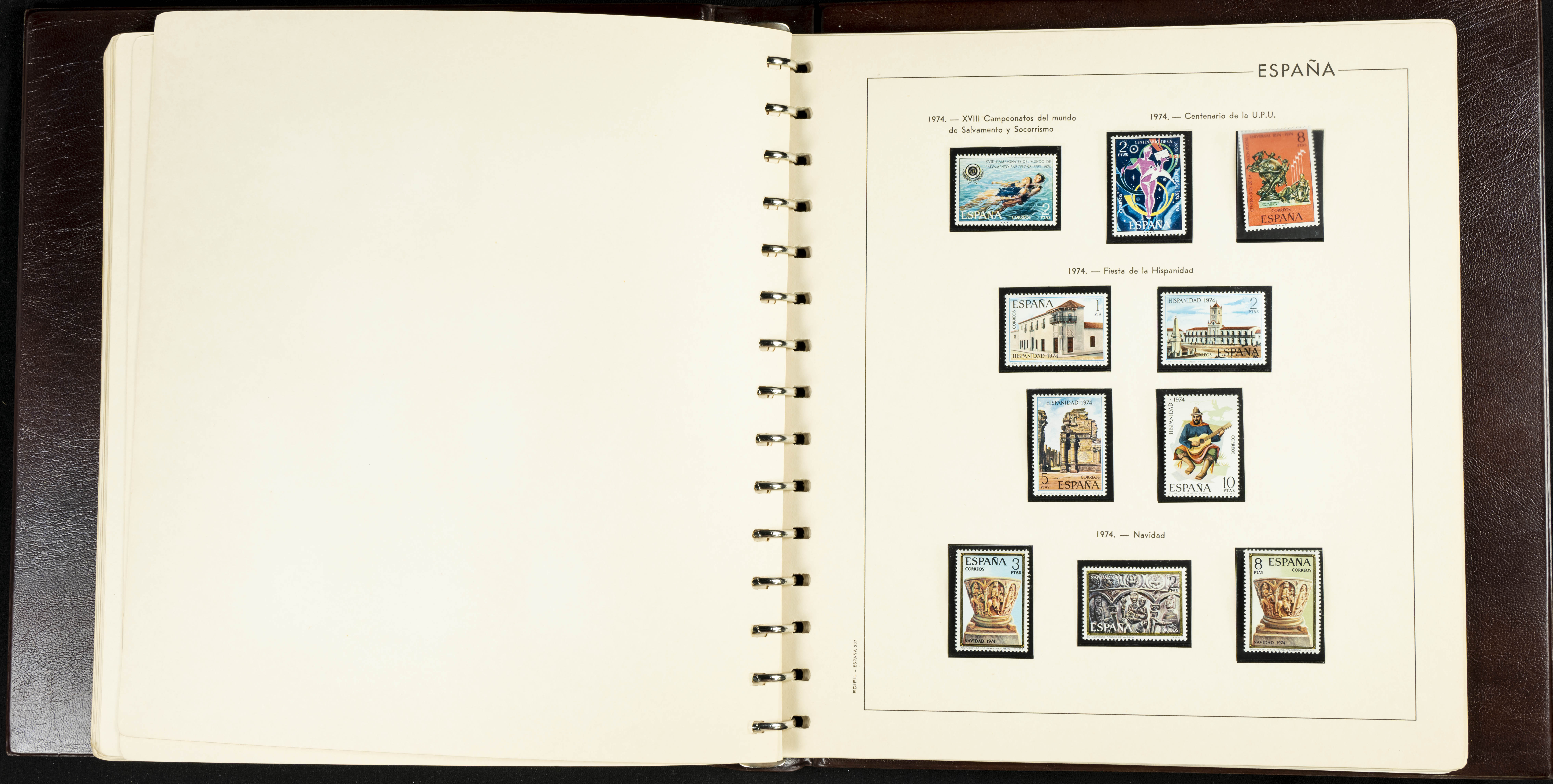★★(1950ca). Colección completa entre 1950 y 1975, en nuevo y sin fijasellos a falta de los Caudillos a Canarias con y sin número e incluyendo la 1ª y 2ª Tirada terrestres, Centenario, "Legazpi y Sorolla" (duplicado en usado) y juegos completos de Trajes y Escudos en bloques de cuatro. ALTO VALOR DE CATALOGO. A EXAMINAR.