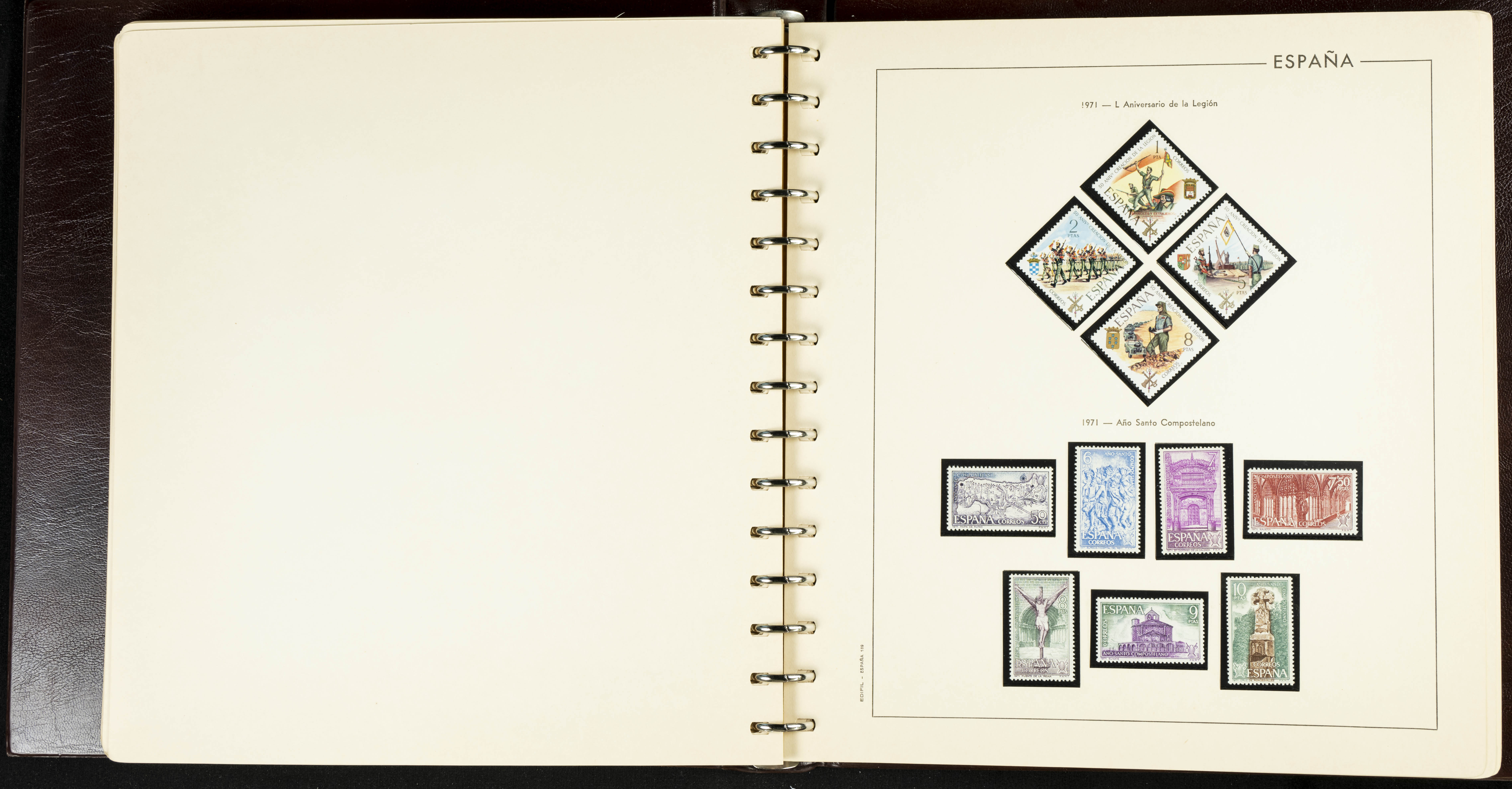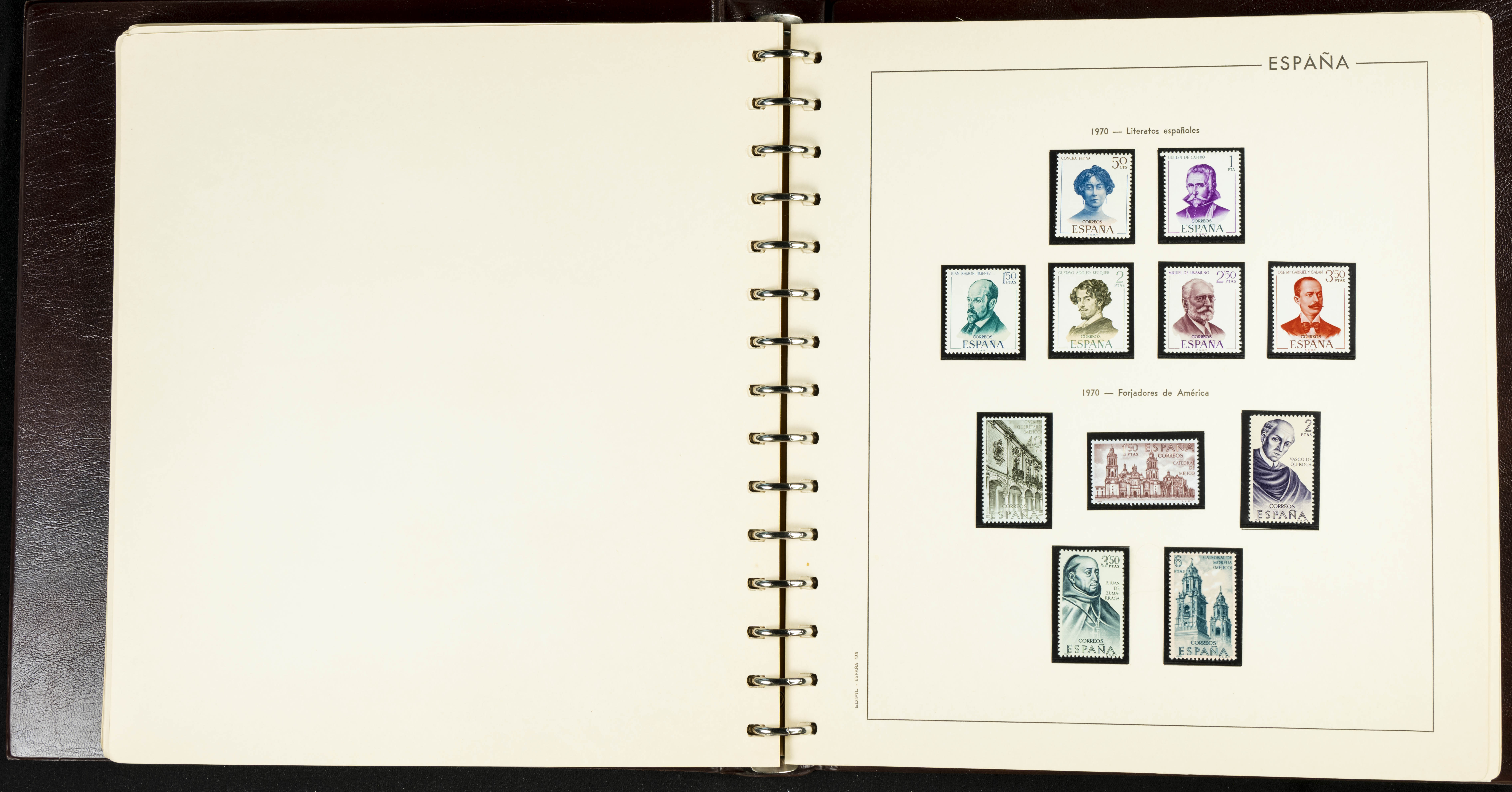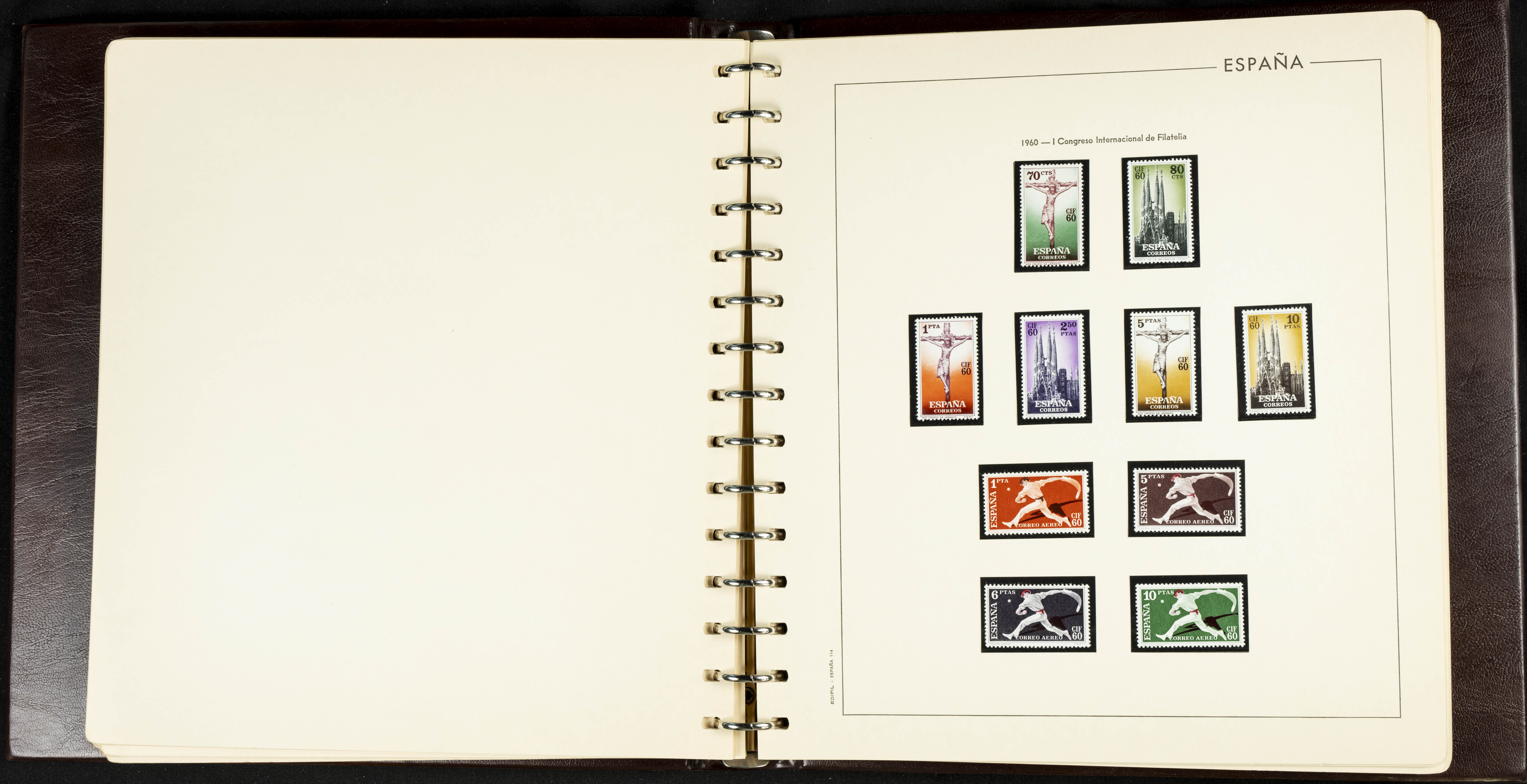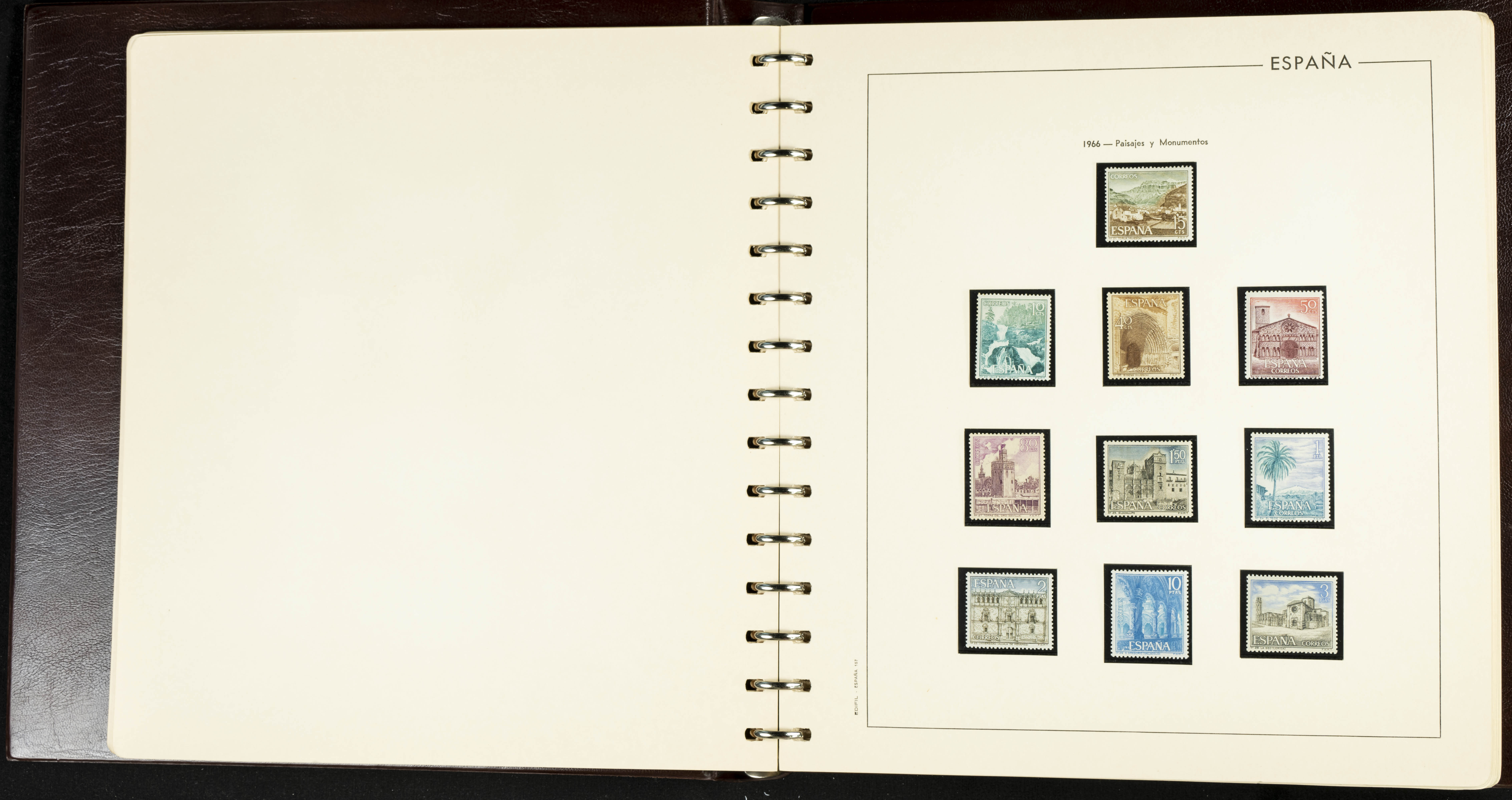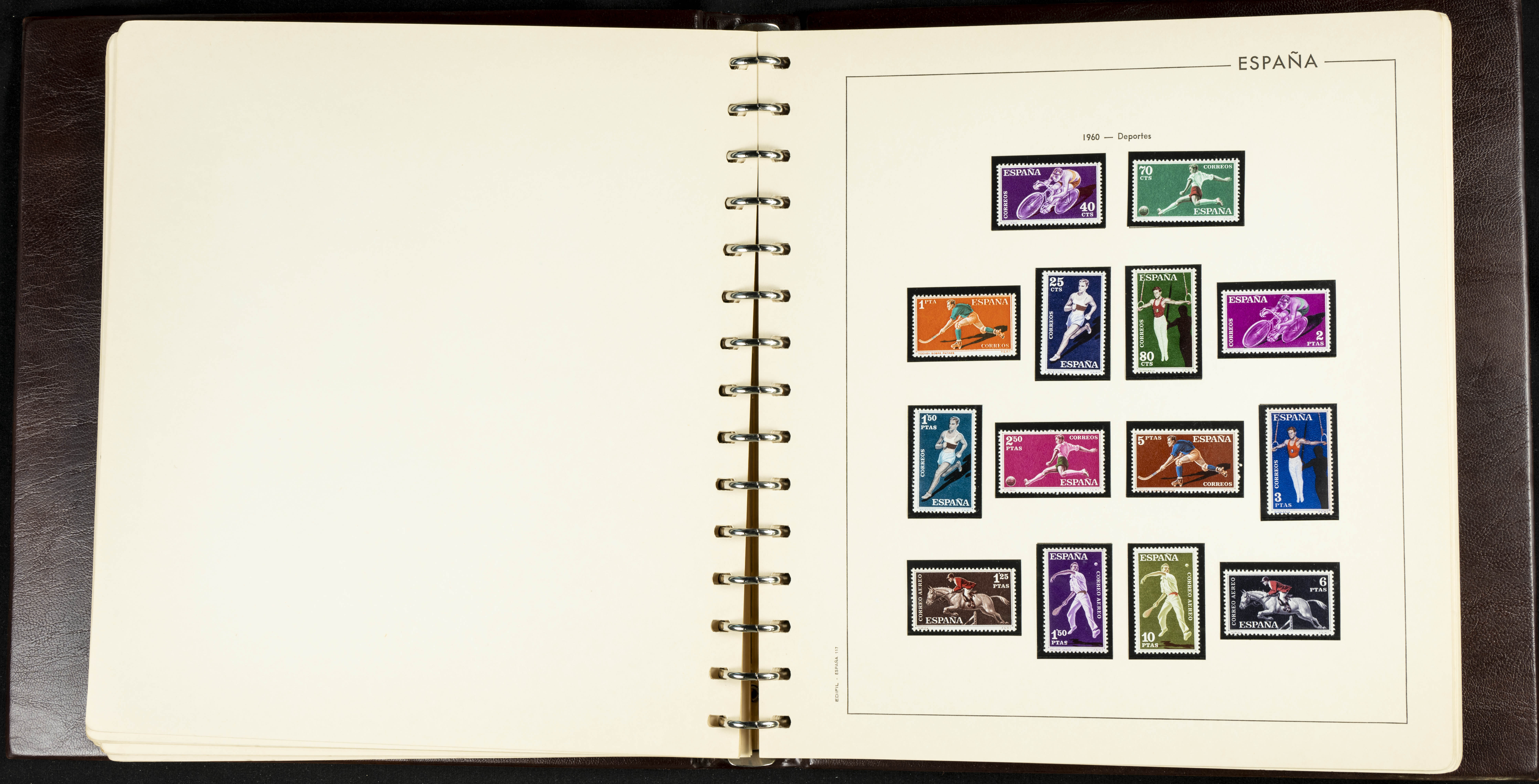 ★★(1950ca). Colección completa entre 1950 y 1975, en nuevo y sin fijasellos a falta de los Caudillos a Canarias con y sin número e incluyendo la 1ª y 2ª Tirada terrestres, Centenario, "Legazpi y Sorolla" (duplicado en usado) y juegos completos de Trajes y Escudos en bloques de cuatro. ALTO VALOR DE CATALOGO. A EXAMINAR.