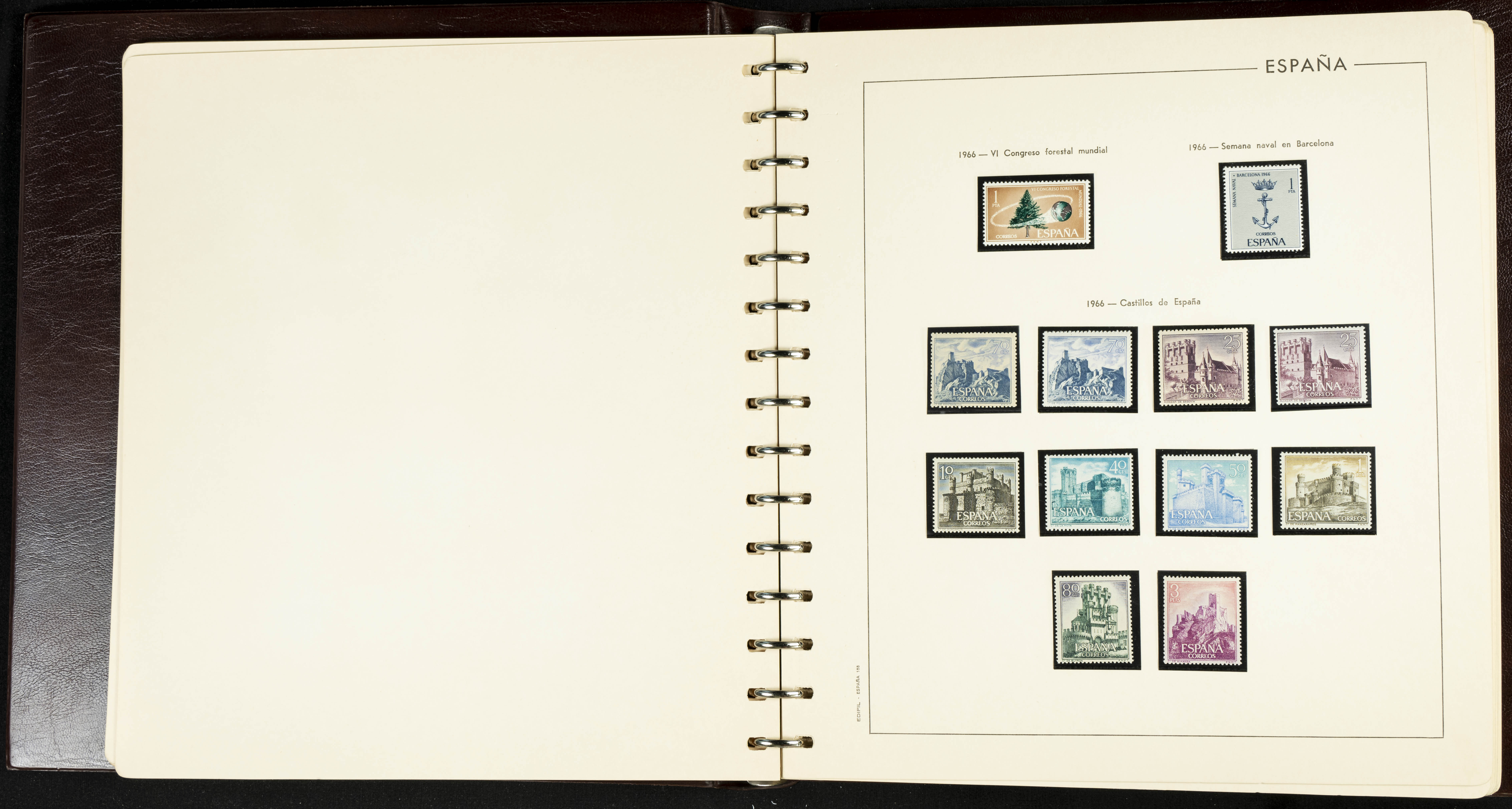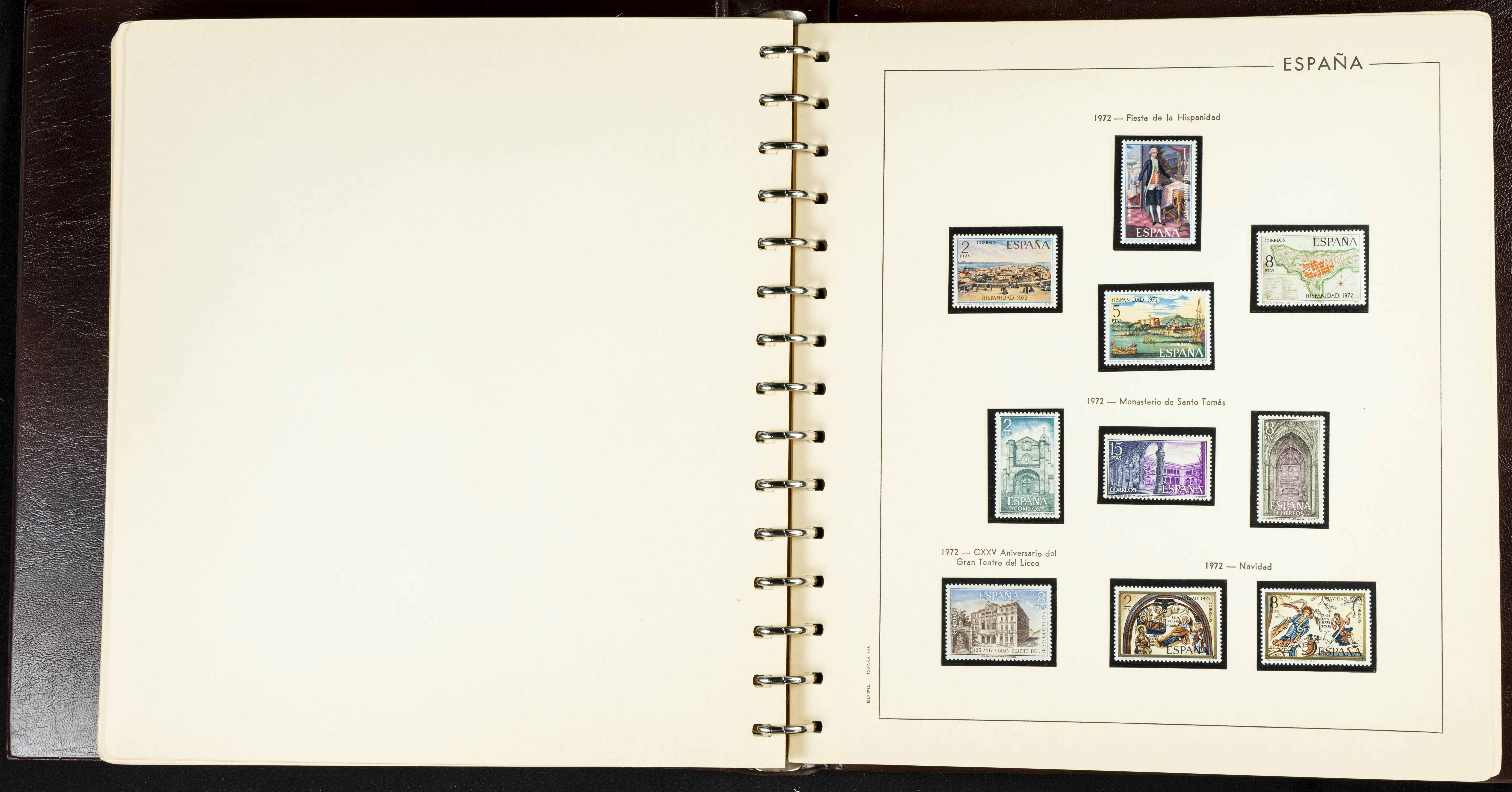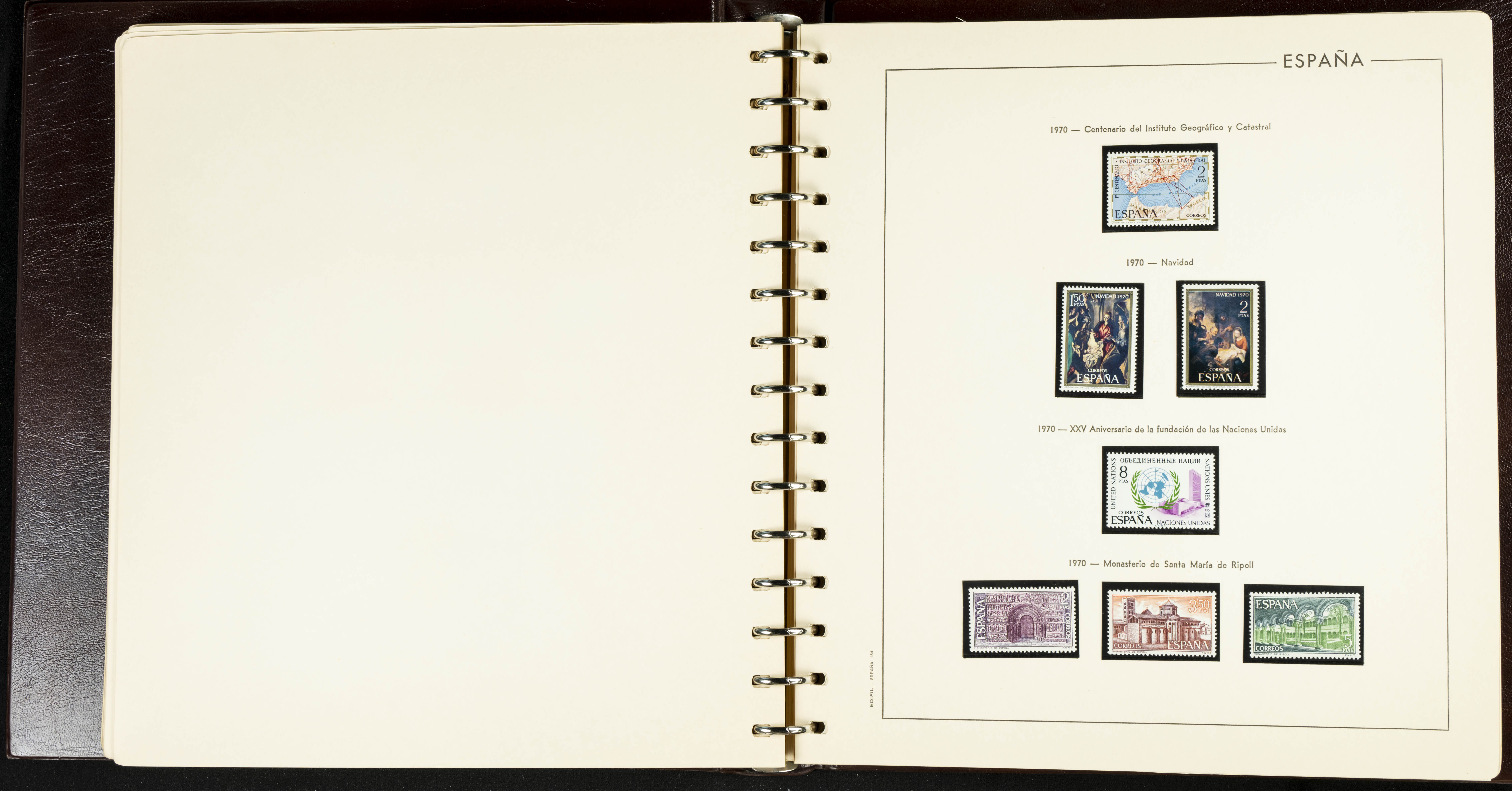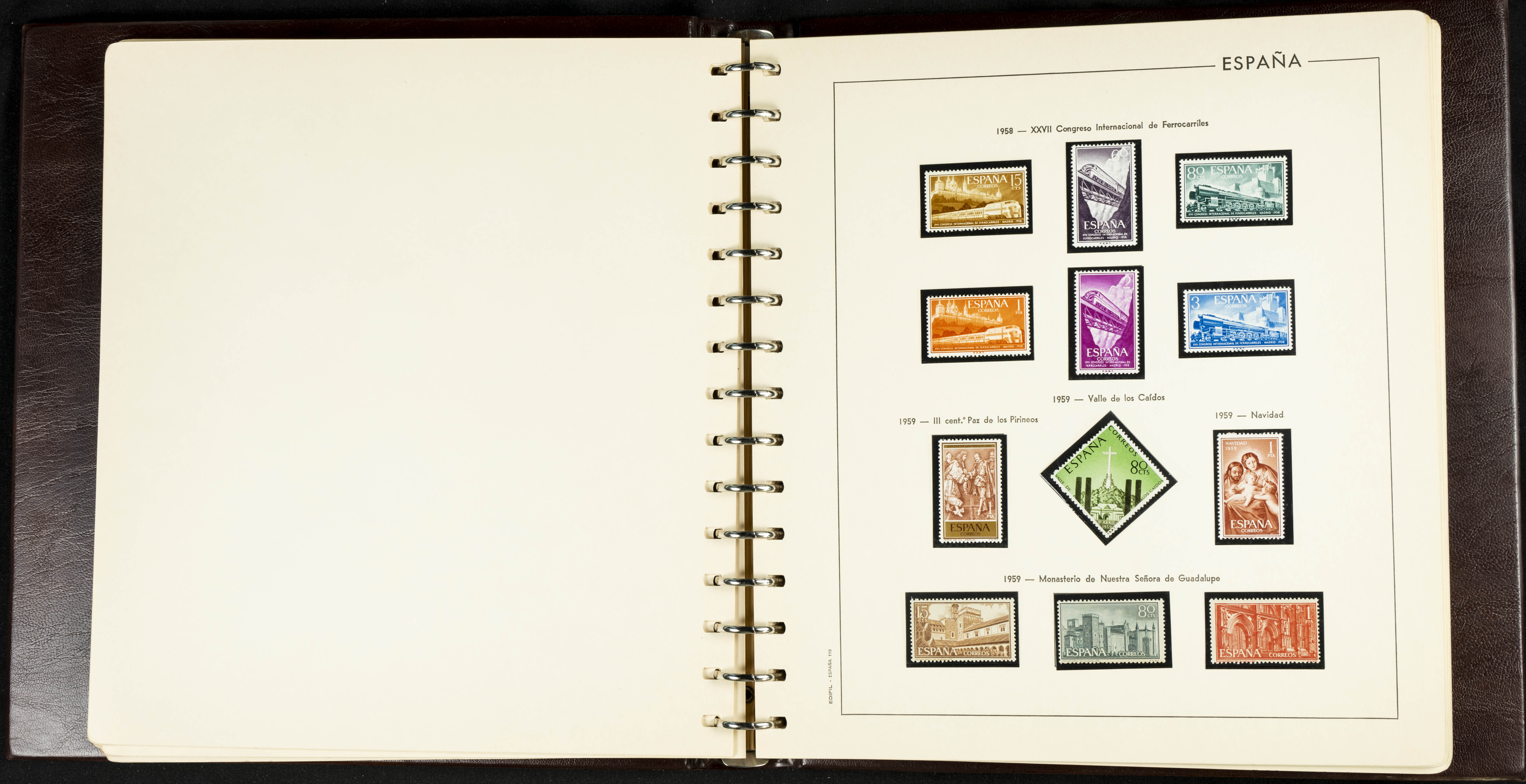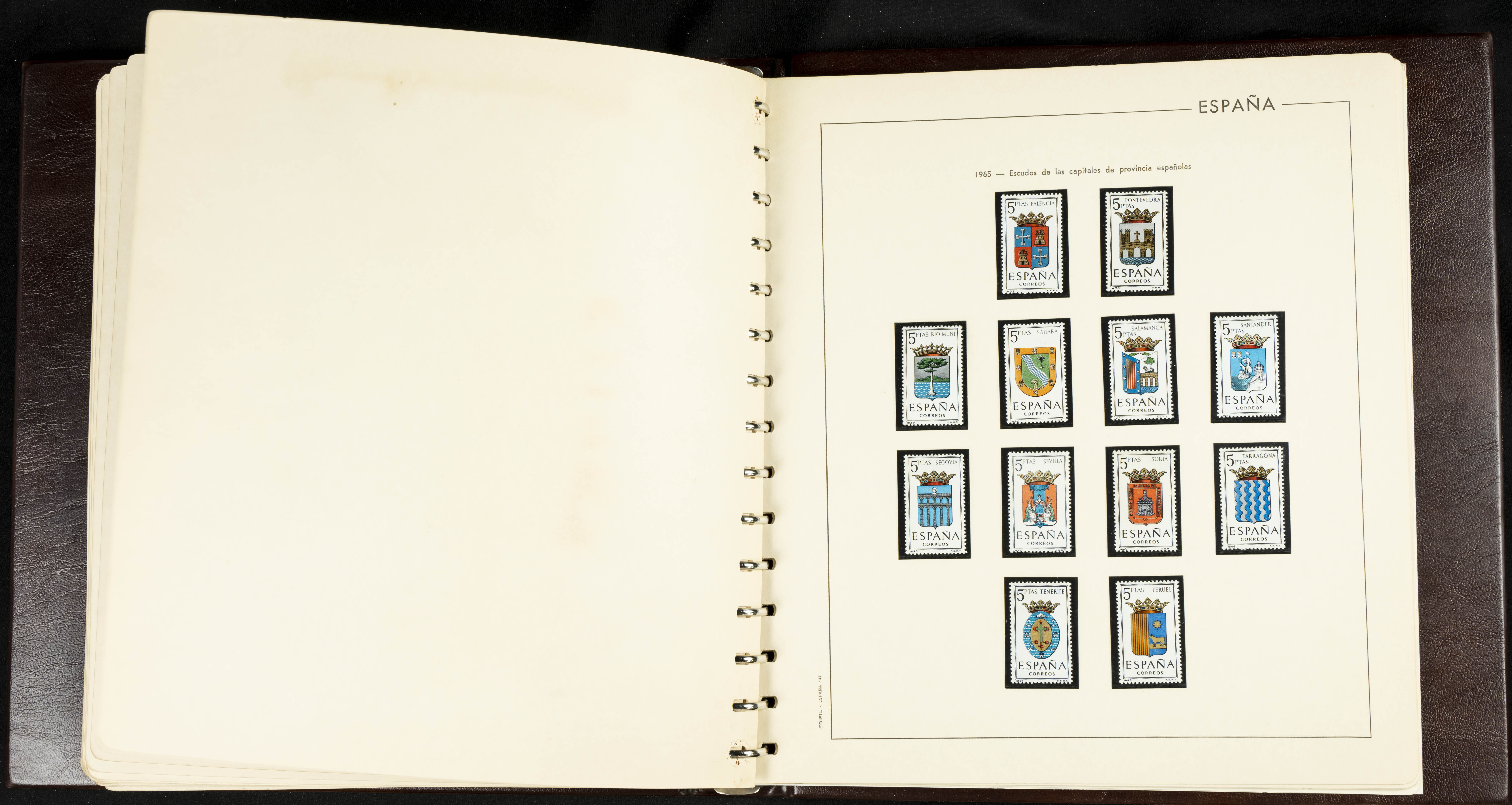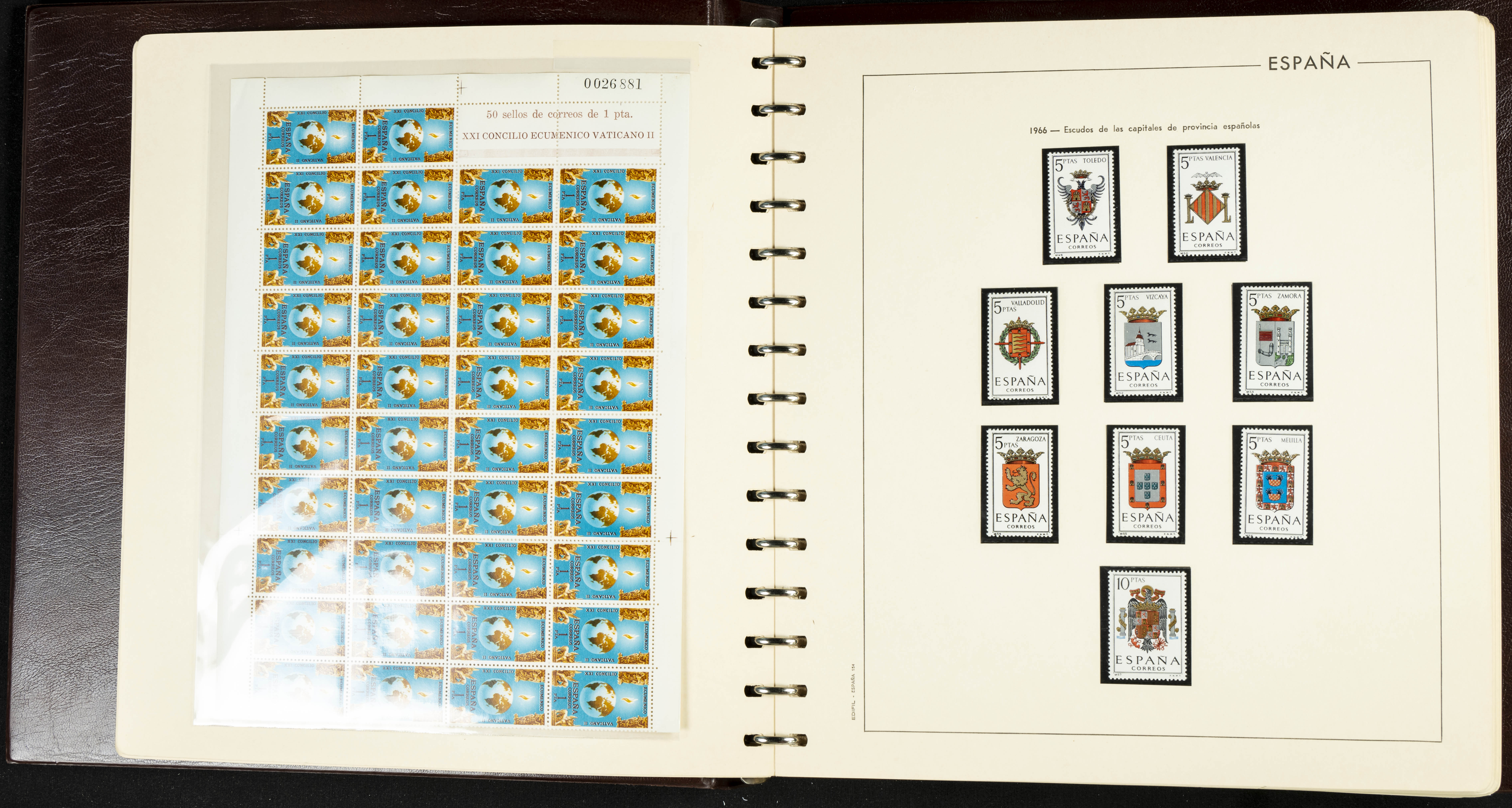 ★★(1950ca). Colección completa entre 1950 y 1975, en nuevo y sin fijasellos a falta de los Caudillos a Canarias con y sin número e incluyendo la 1ª y 2ª Tirada terrestres, Centenario, "Legazpi y Sorolla" (duplicado en usado) y juegos completos de Trajes y Escudos en bloques de cuatro. ALTO VALOR DE CATALOGO. A EXAMINAR.