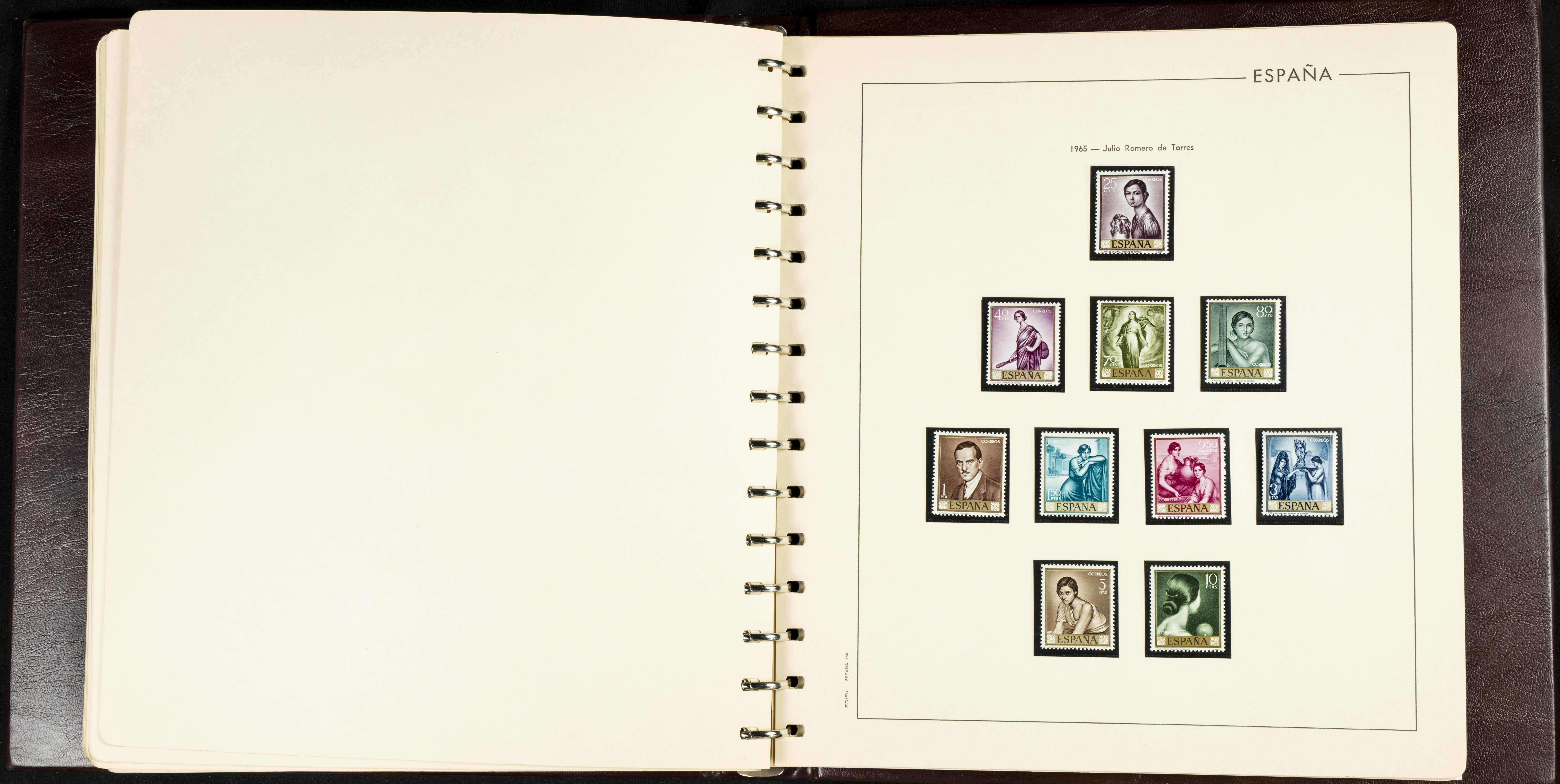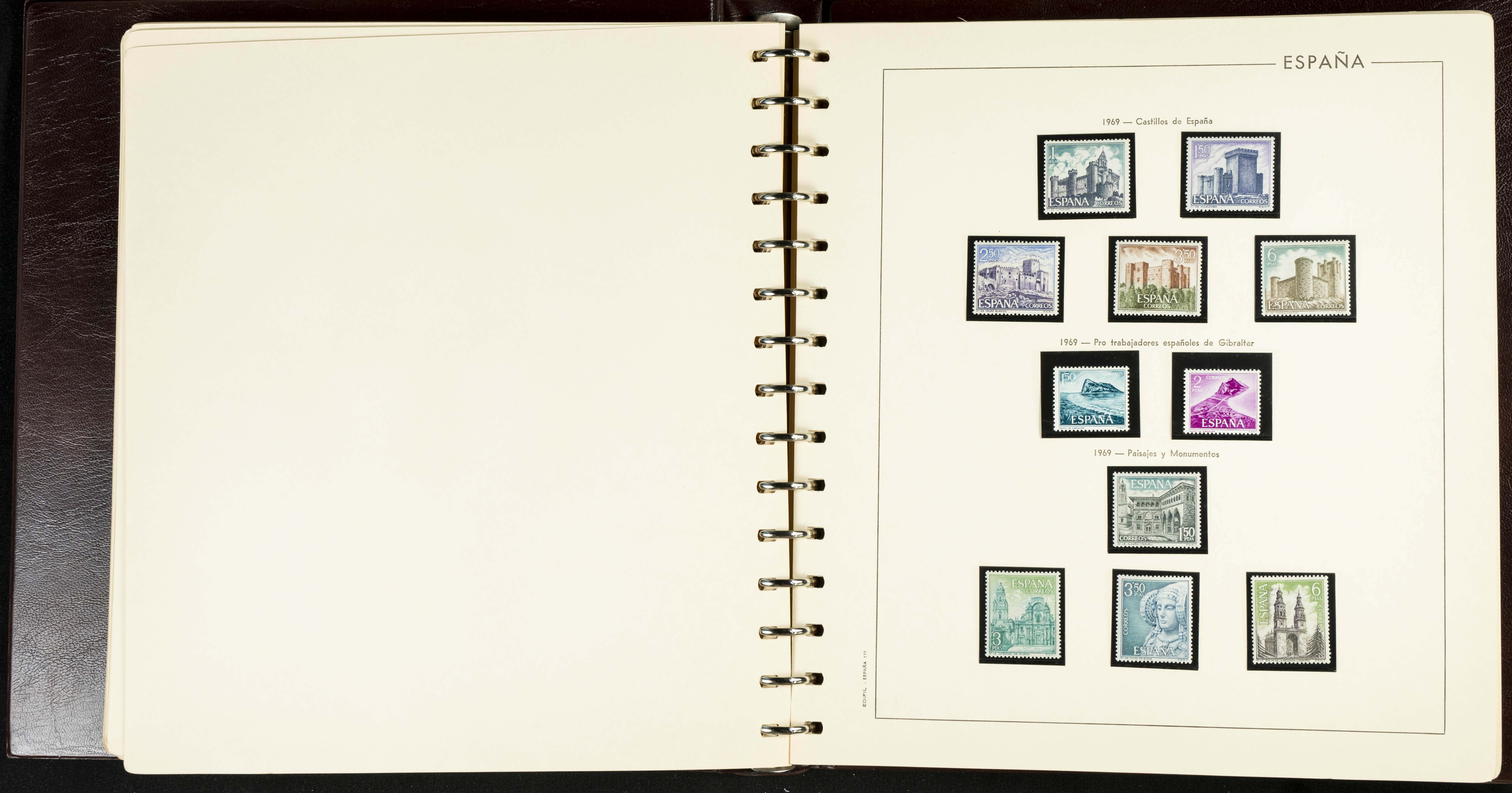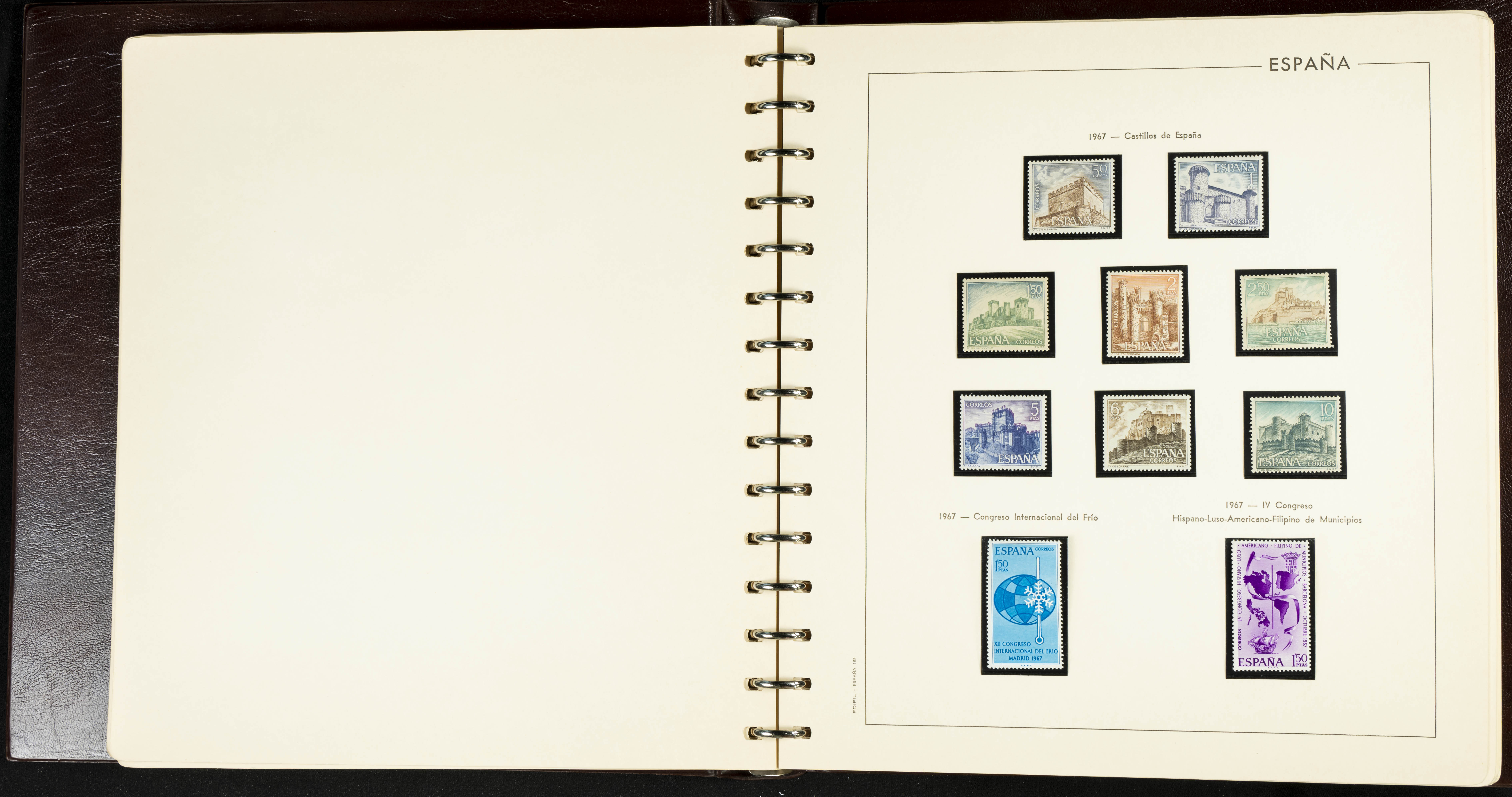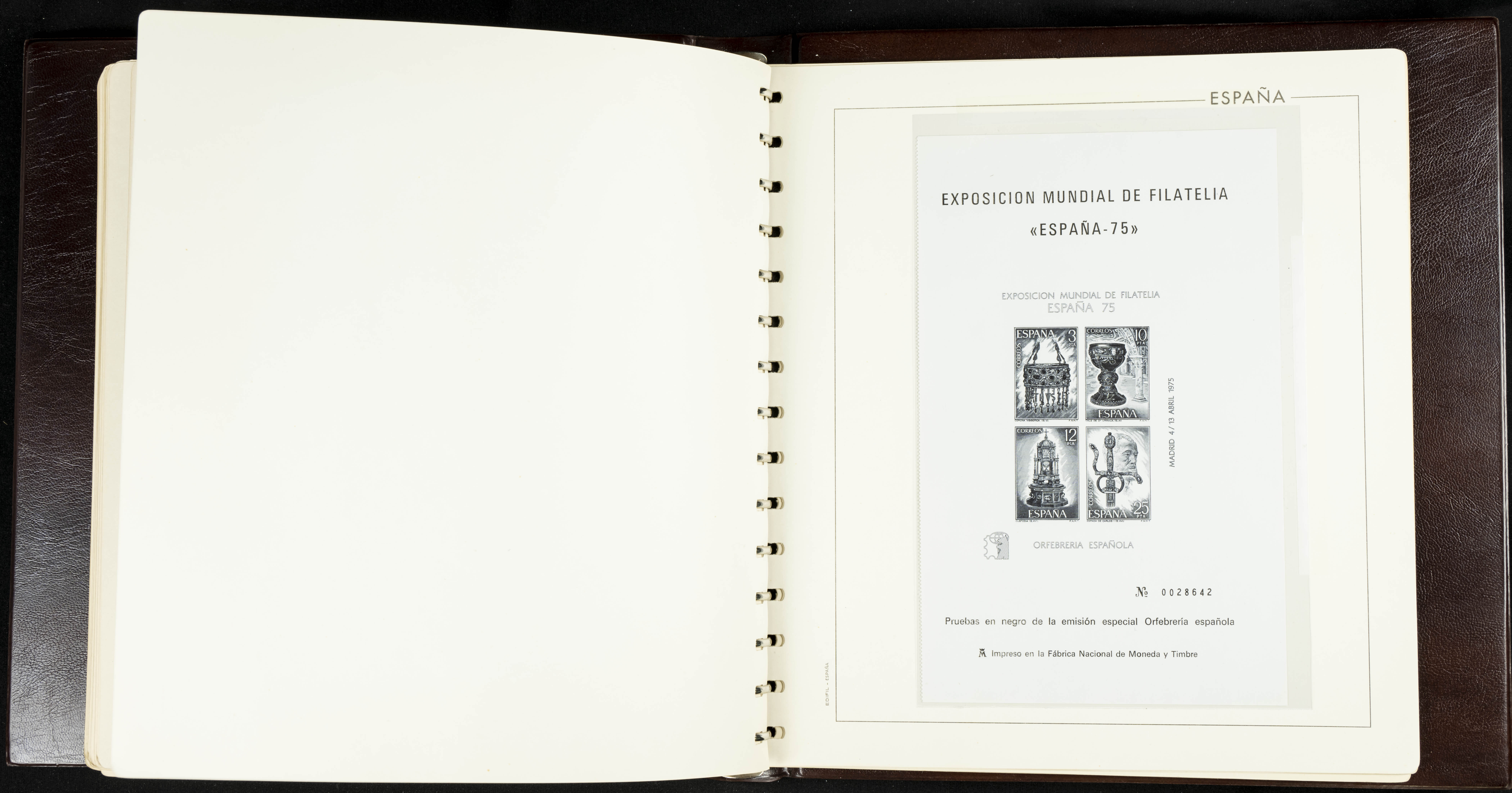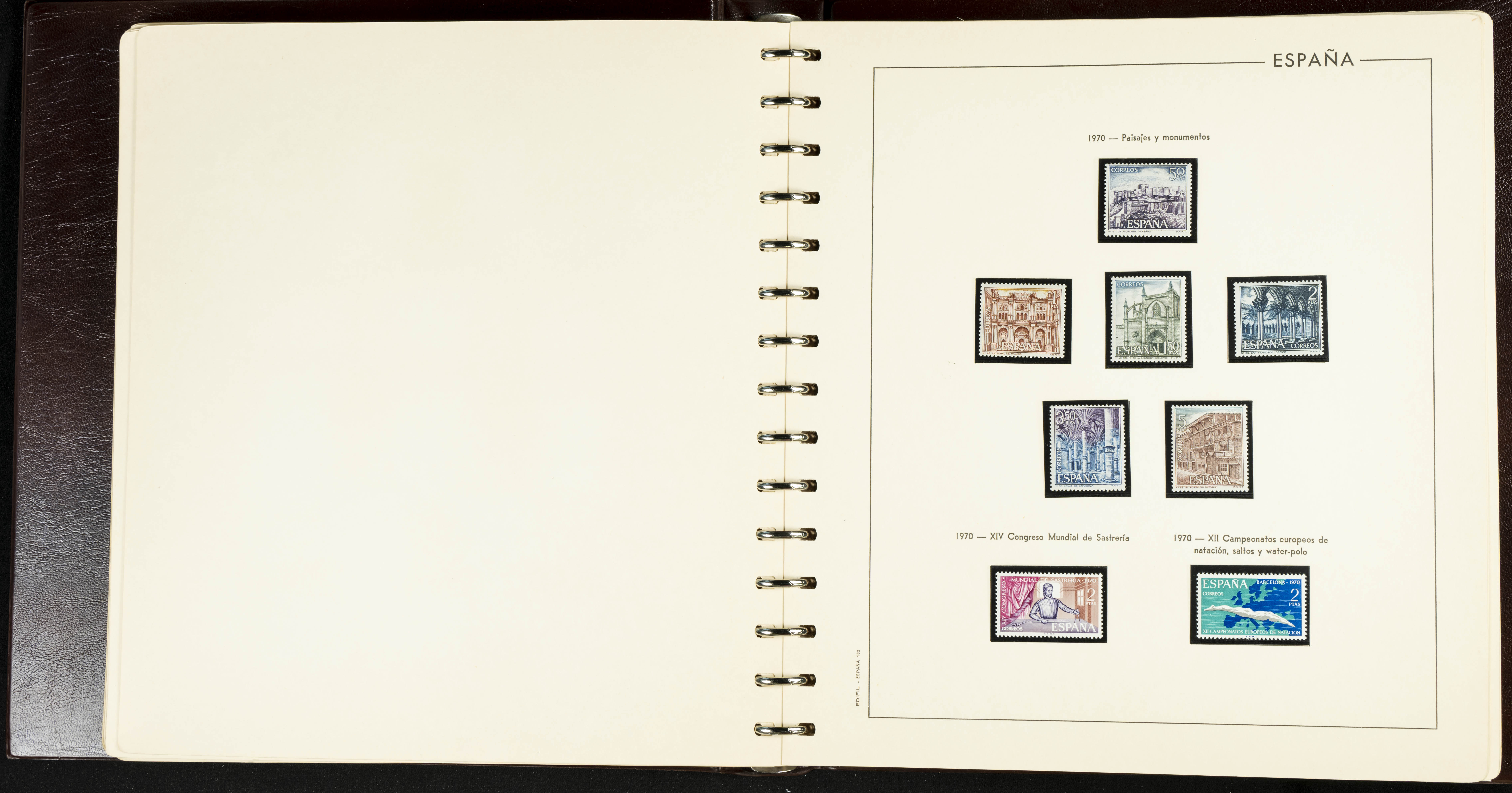 ★★(1950ca). Colección completa entre 1950 y 1975, en nuevo y sin fijasellos a falta de los Caudillos a Canarias con y sin número e incluyendo la 1ª y 2ª Tirada terrestres, Centenario, "Legazpi y Sorolla" (duplicado en usado) y juegos completos de Trajes y Escudos en bloques de cuatro. ALTO VALOR DE CATALOGO. A EXAMINAR.