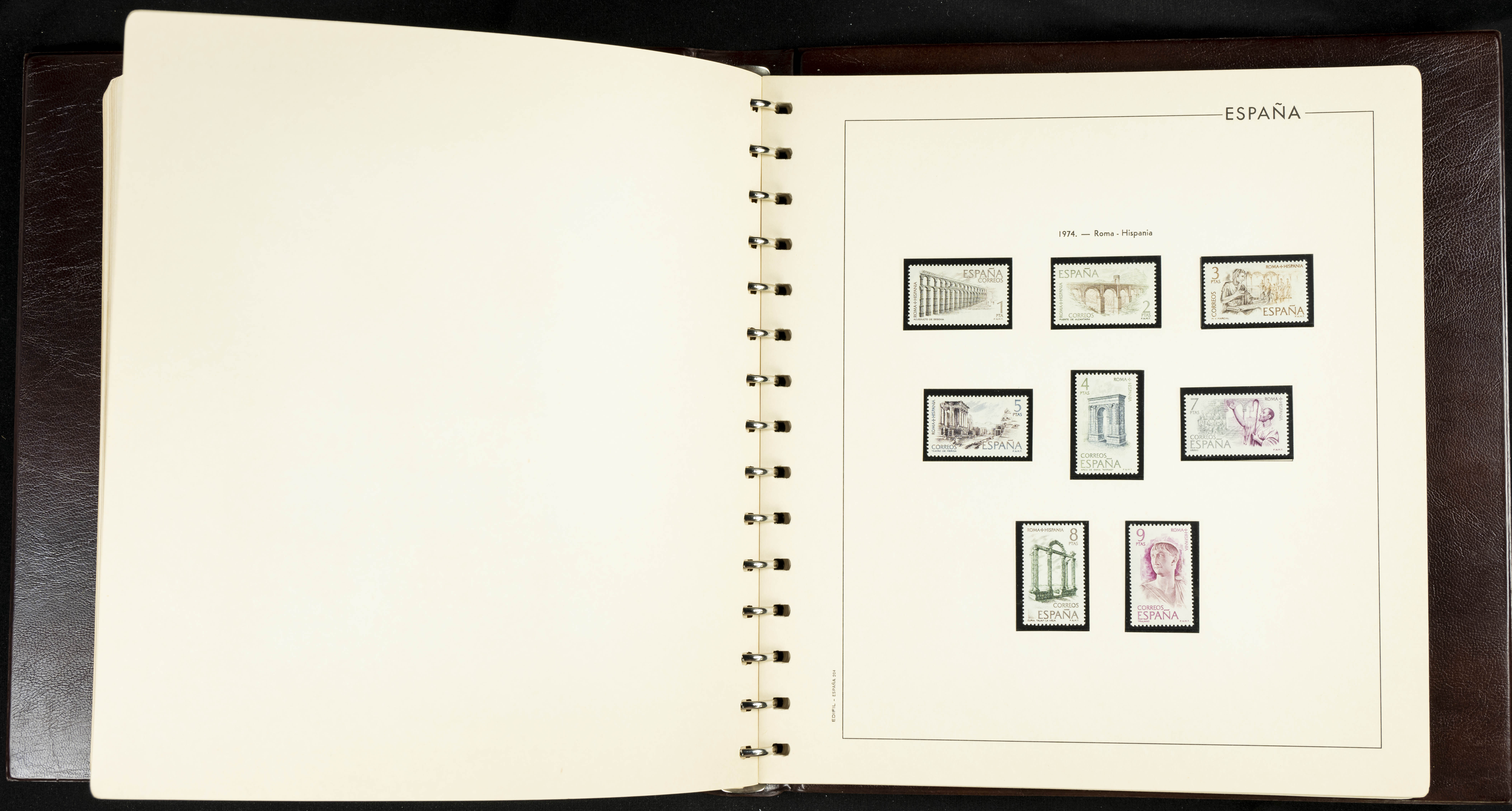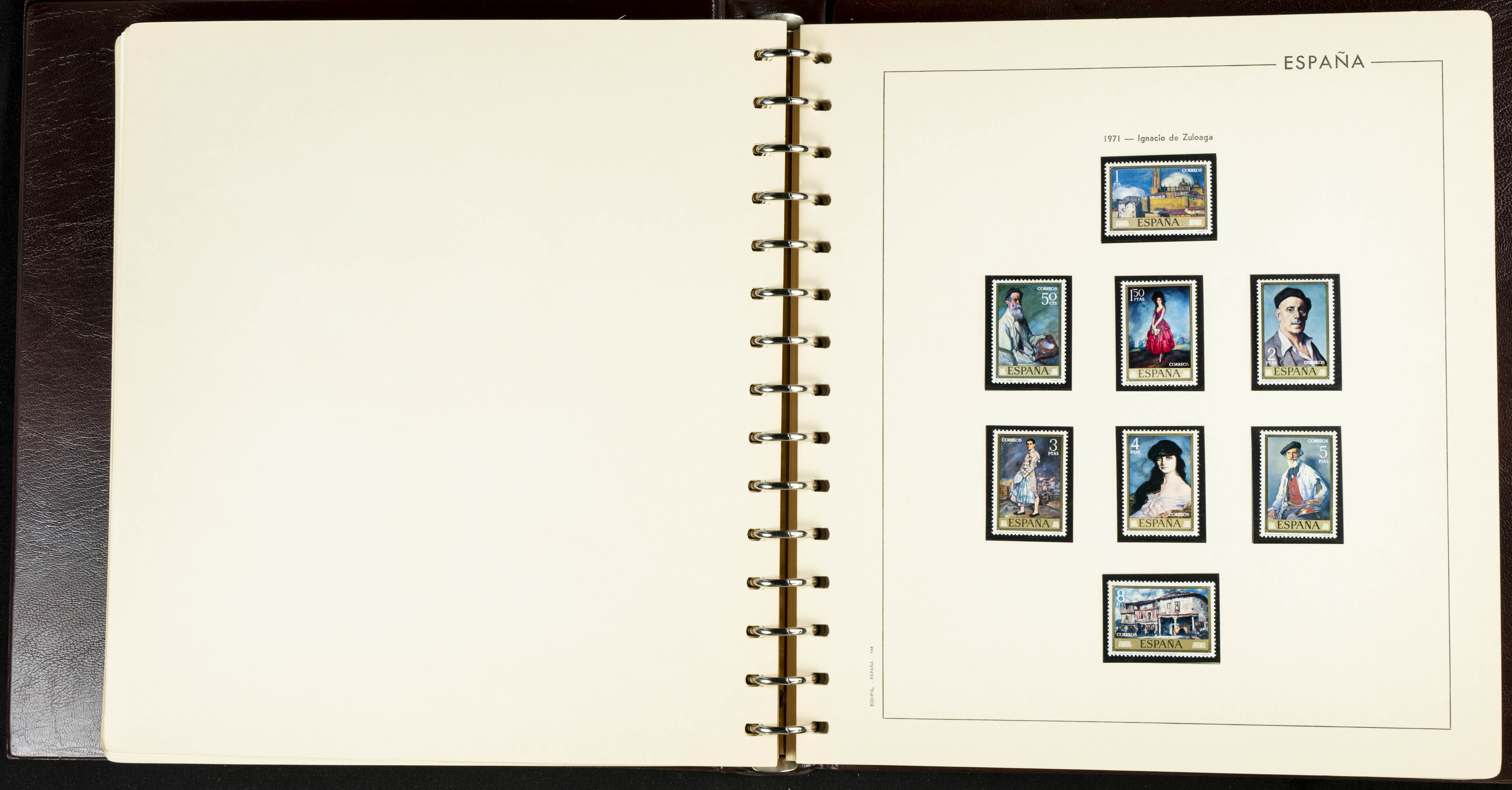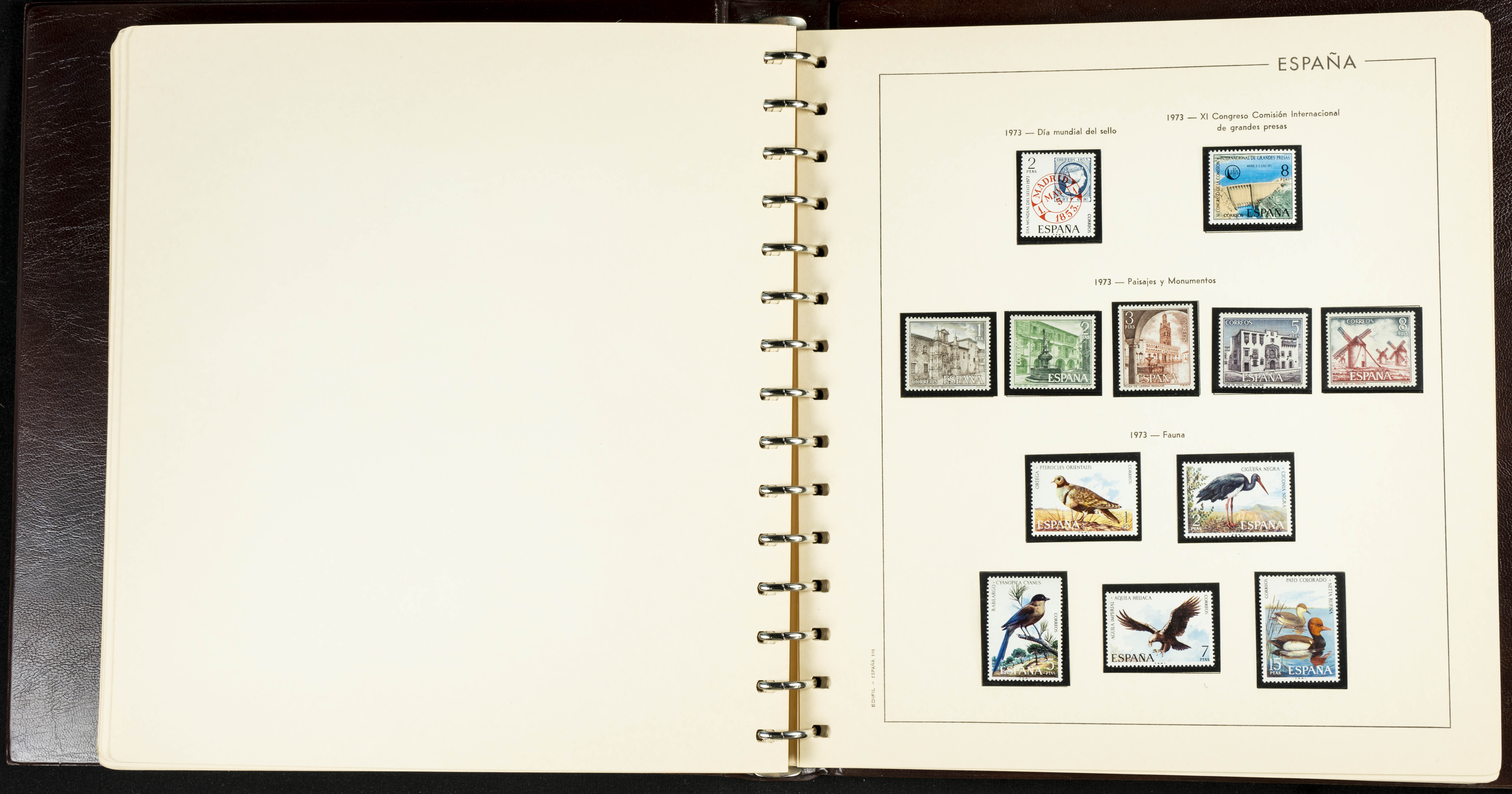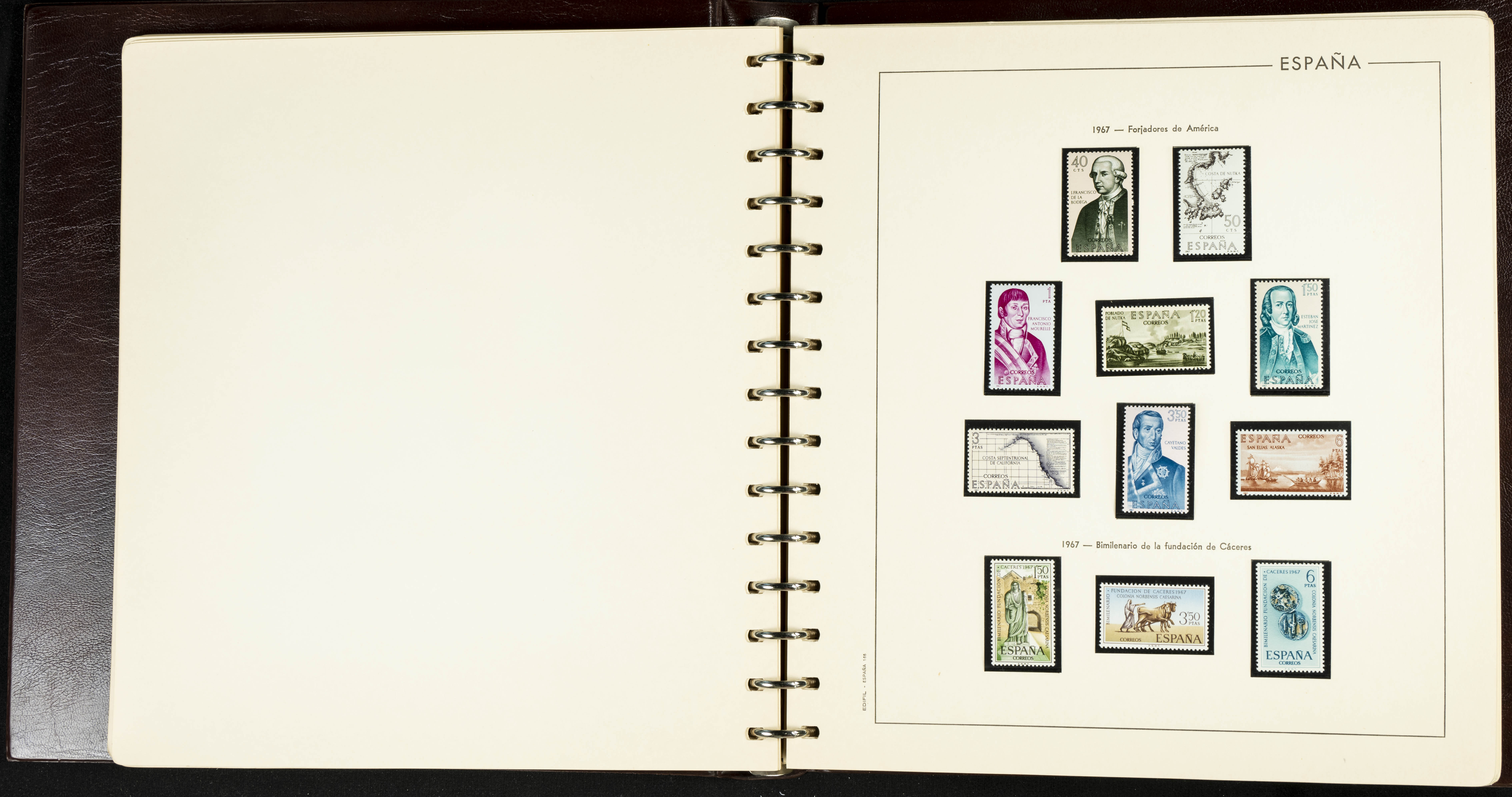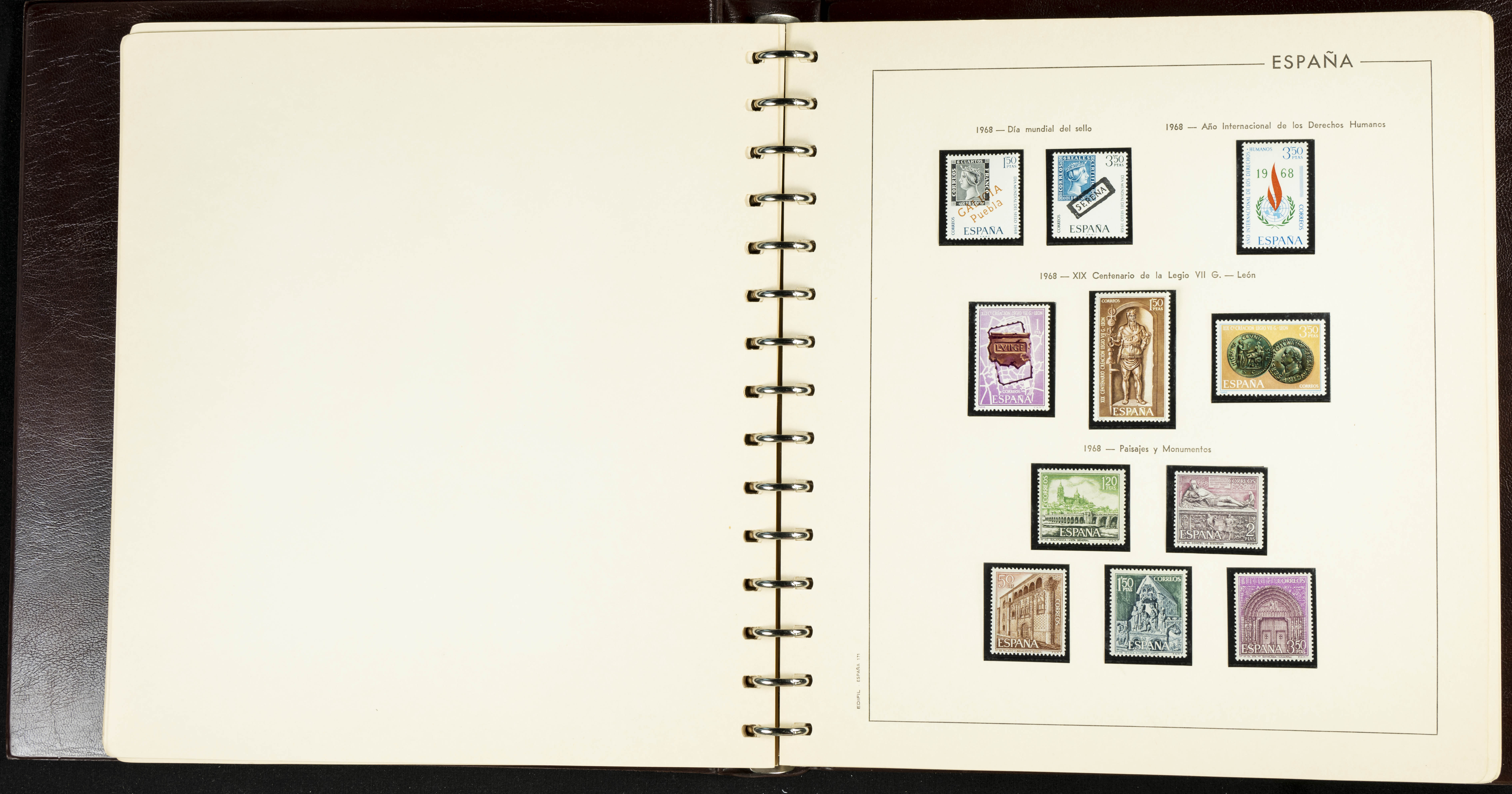 ★★(1950ca). Colección completa entre 1950 y 1975, en nuevo y sin fijasellos a falta de los Caudillos a Canarias con y sin número e incluyendo la 1ª y 2ª Tirada terrestres, Centenario, "Legazpi y Sorolla" (duplicado en usado) y juegos completos de Trajes y Escudos en bloques de cuatro. ALTO VALOR DE CATALOGO. A EXAMINAR.