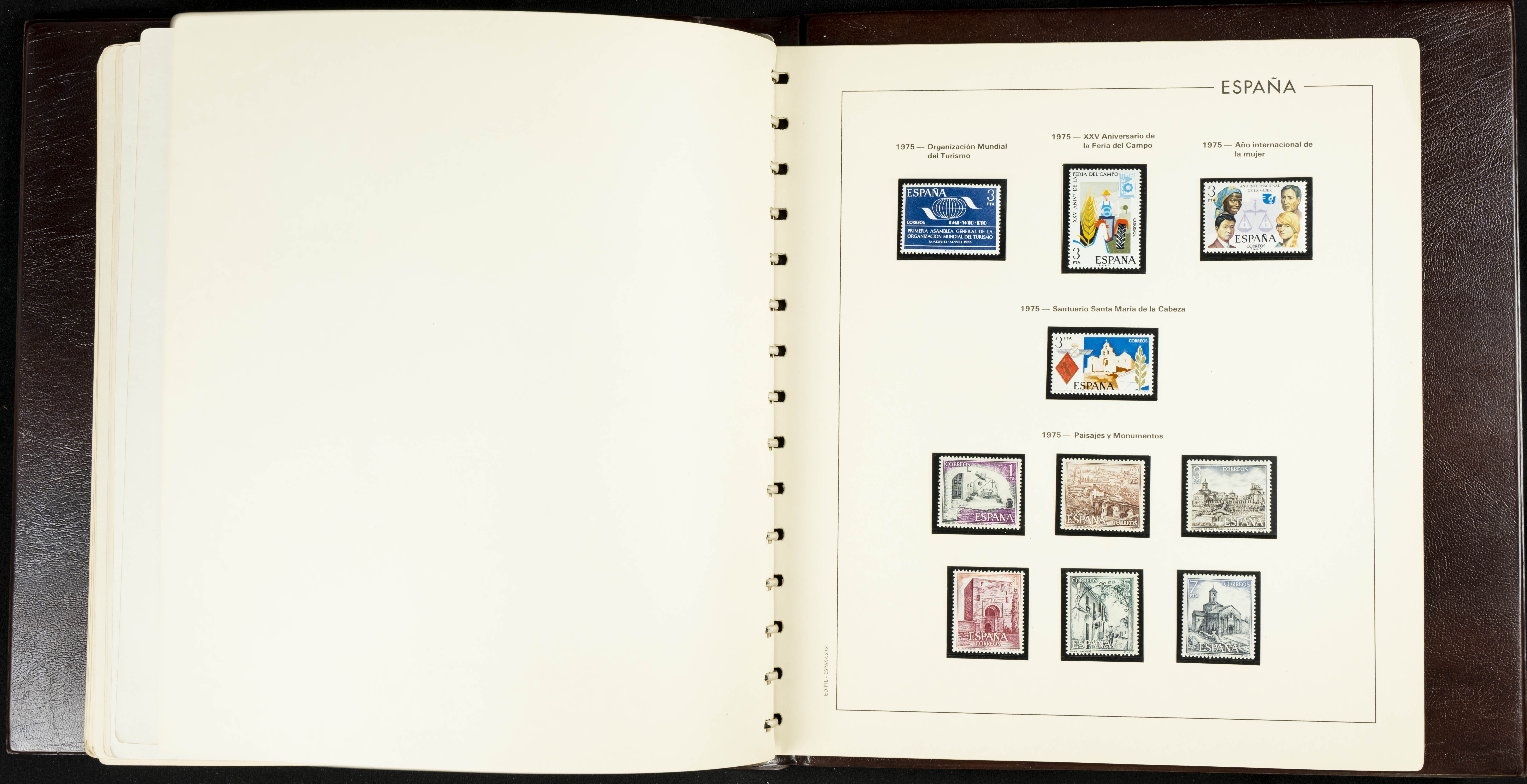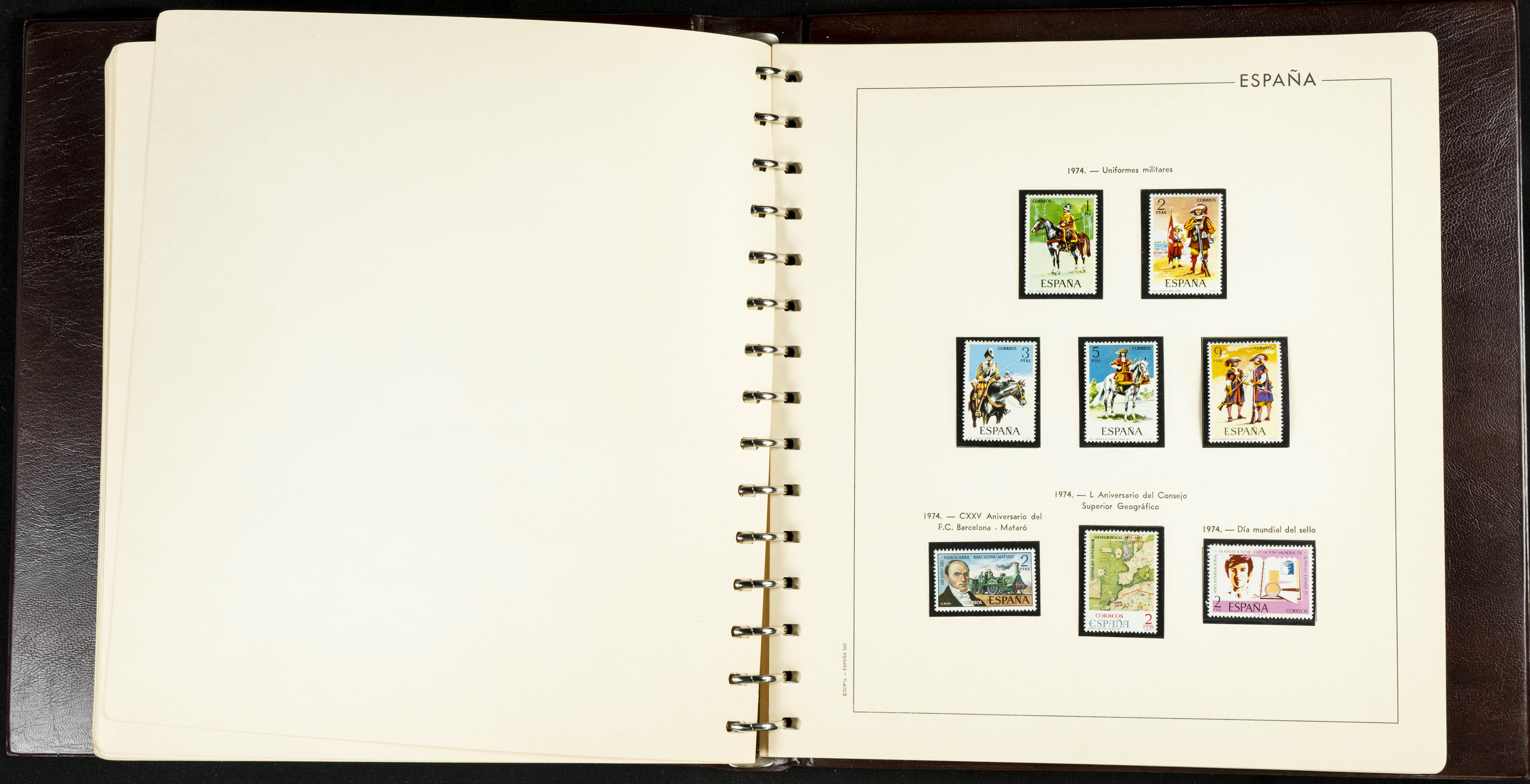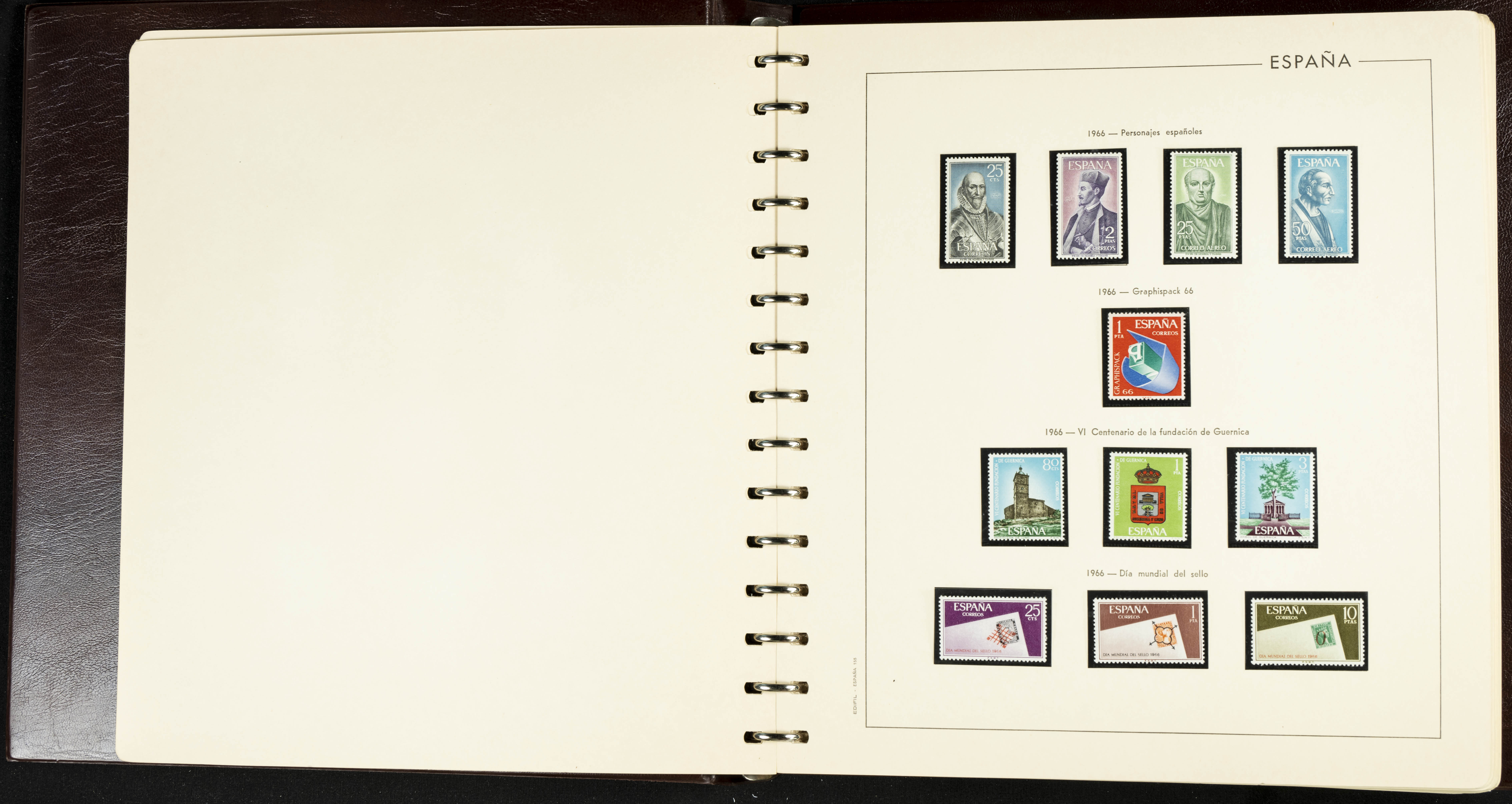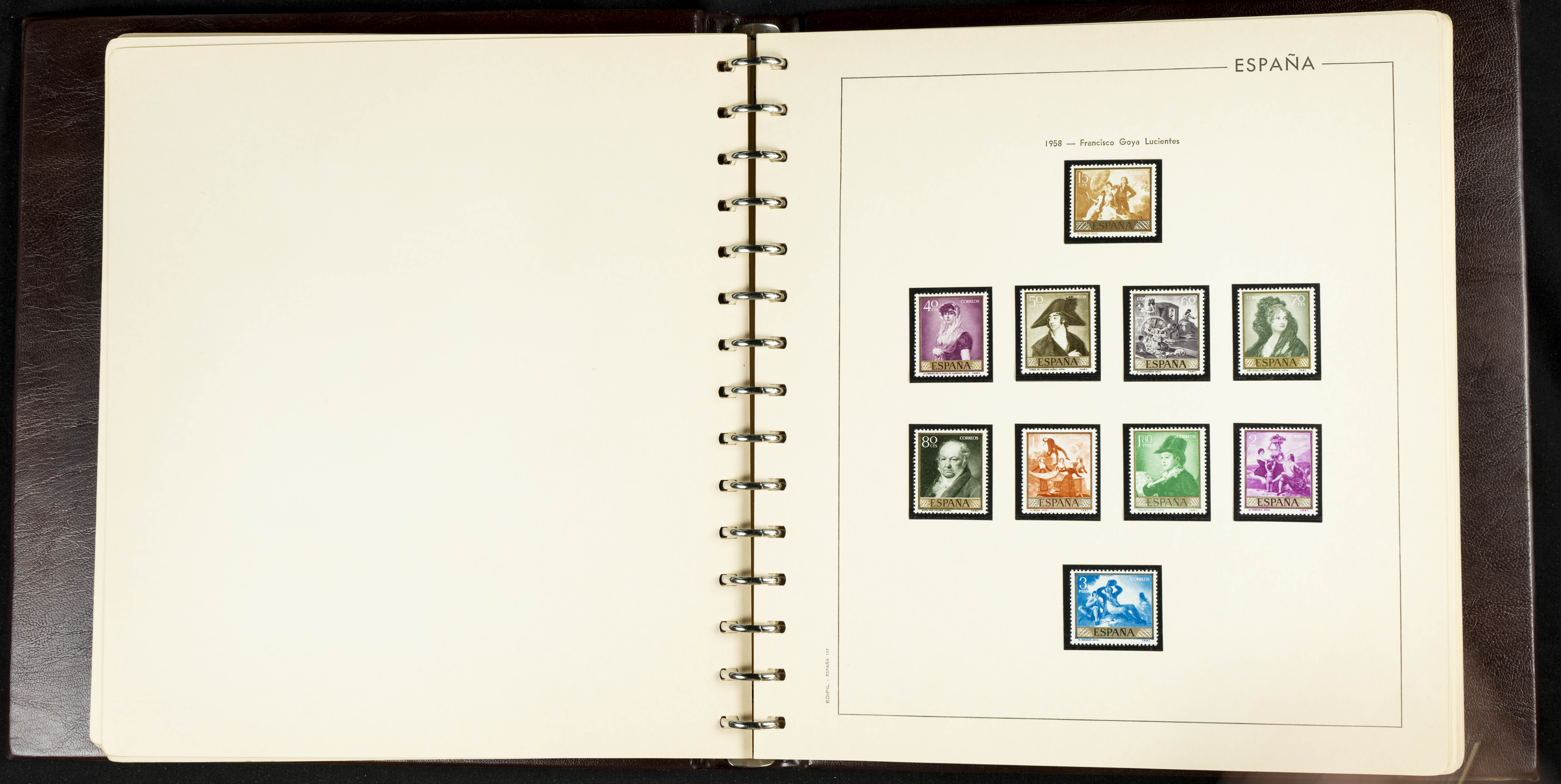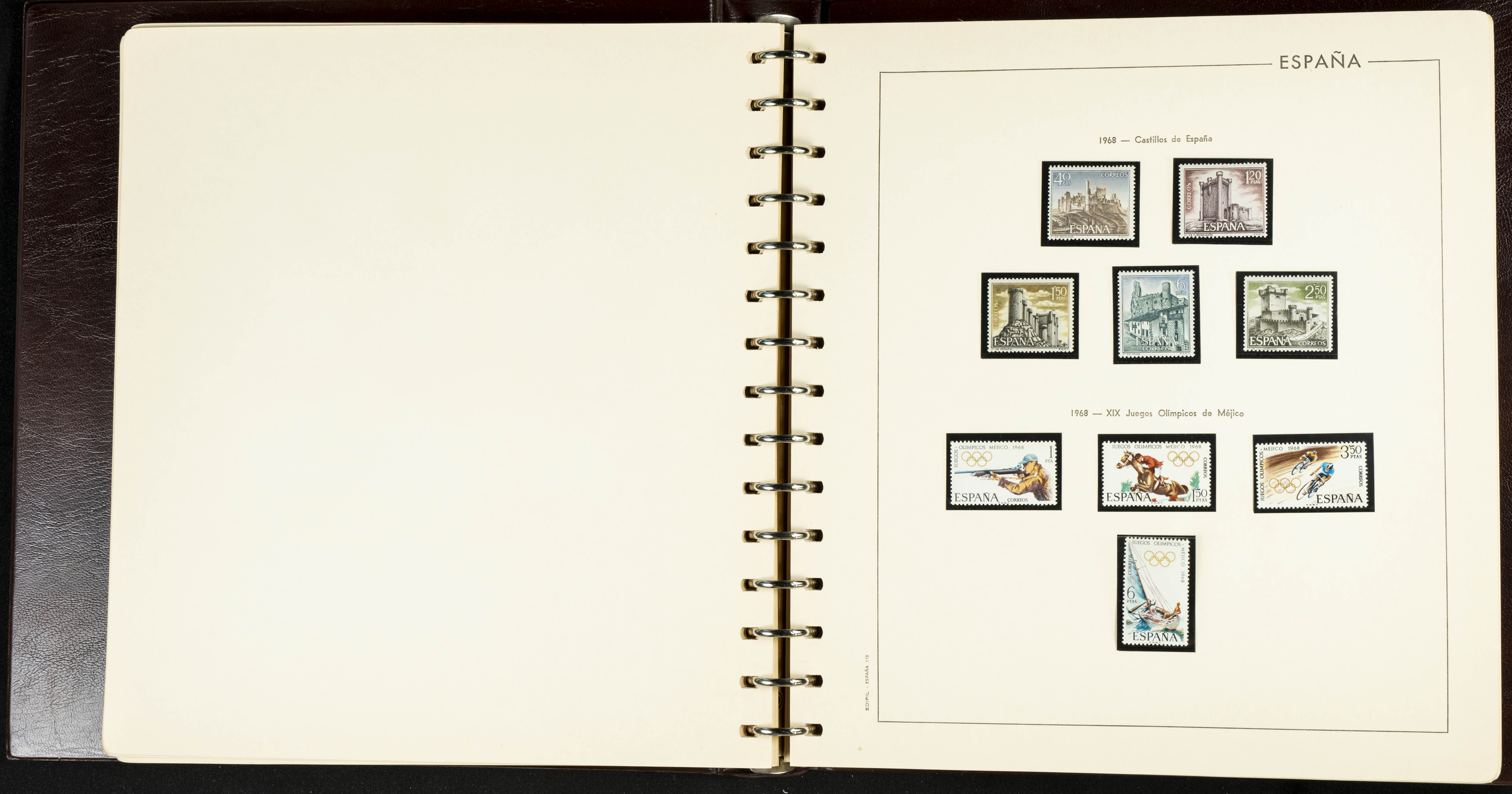 ★★(1950ca). Colección completa entre 1950 y 1975, en nuevo y sin fijasellos a falta de los Caudillos a Canarias con y sin número e incluyendo la 1ª y 2ª Tirada terrestres, Centenario, "Legazpi y Sorolla" (duplicado en usado) y juegos completos de Trajes y Escudos en bloques de cuatro. ALTO VALOR DE CATALOGO. A EXAMINAR.