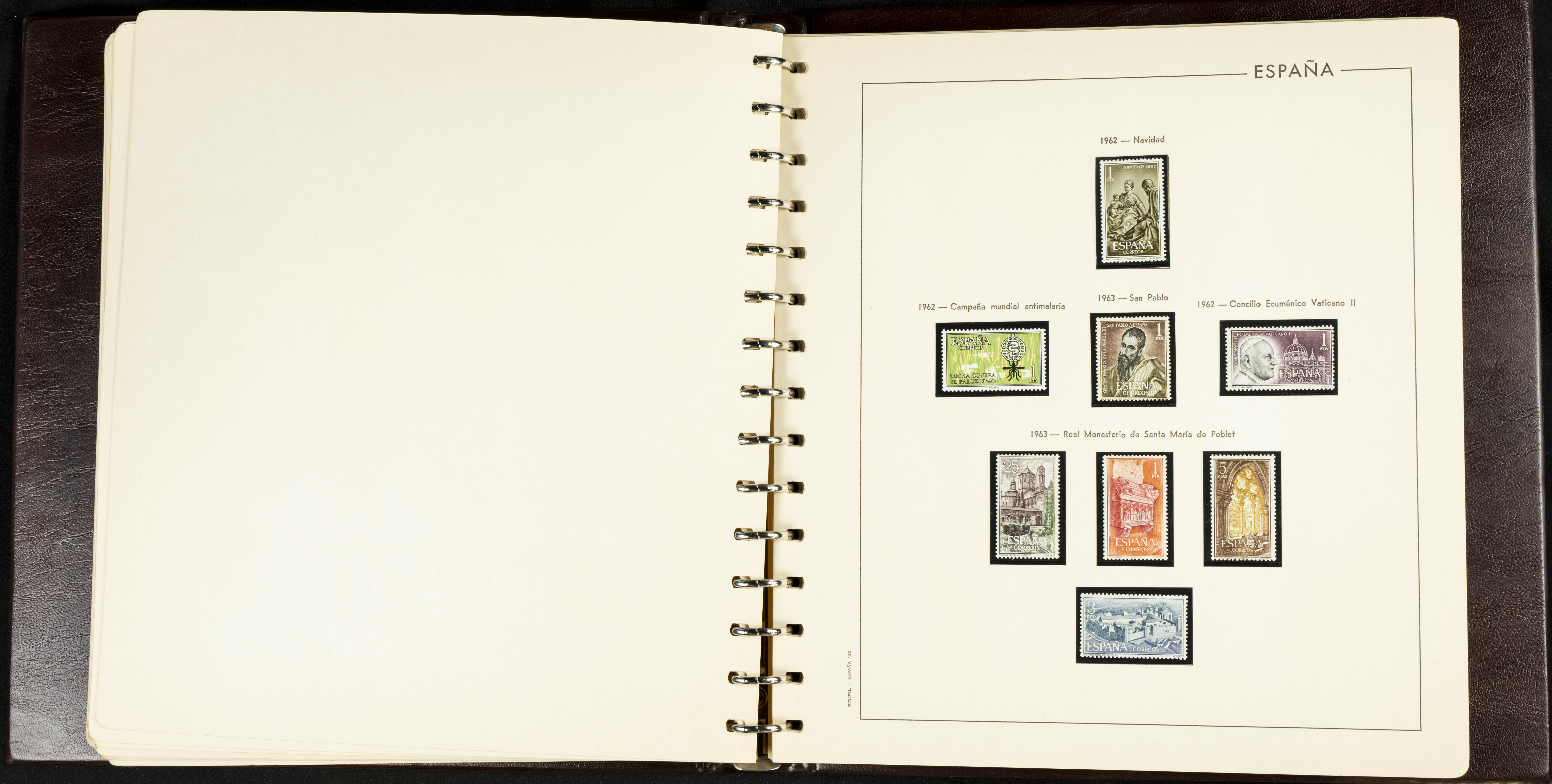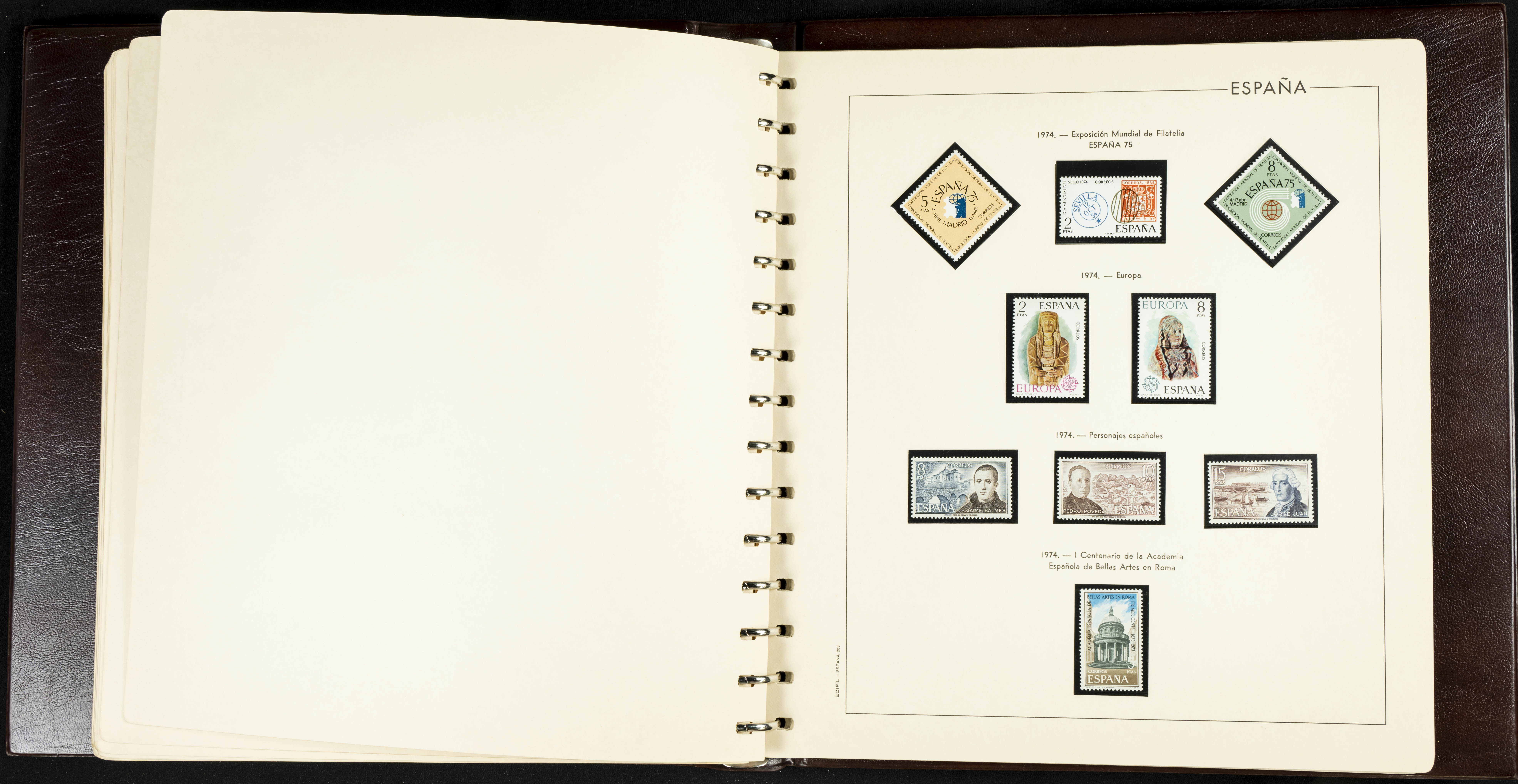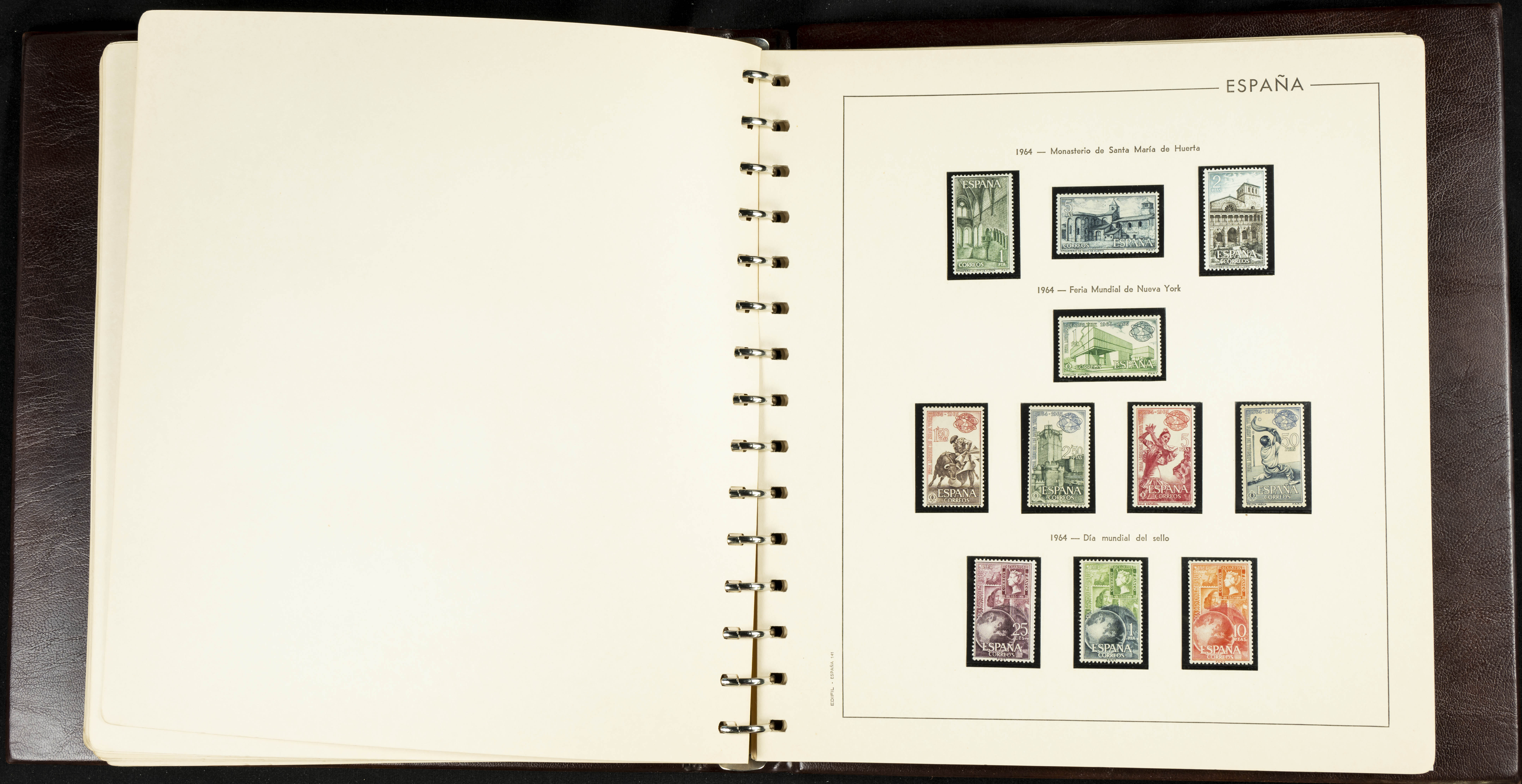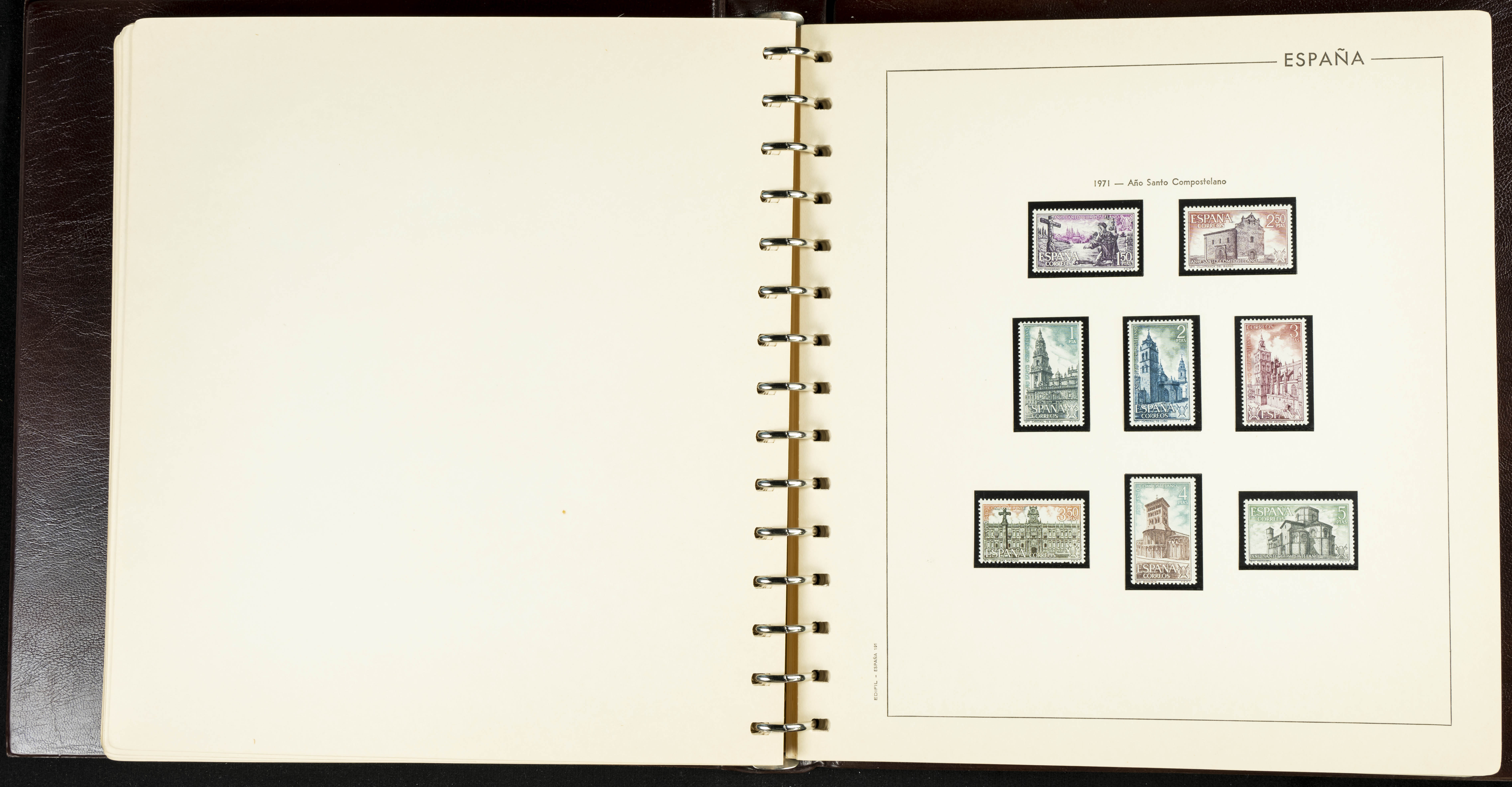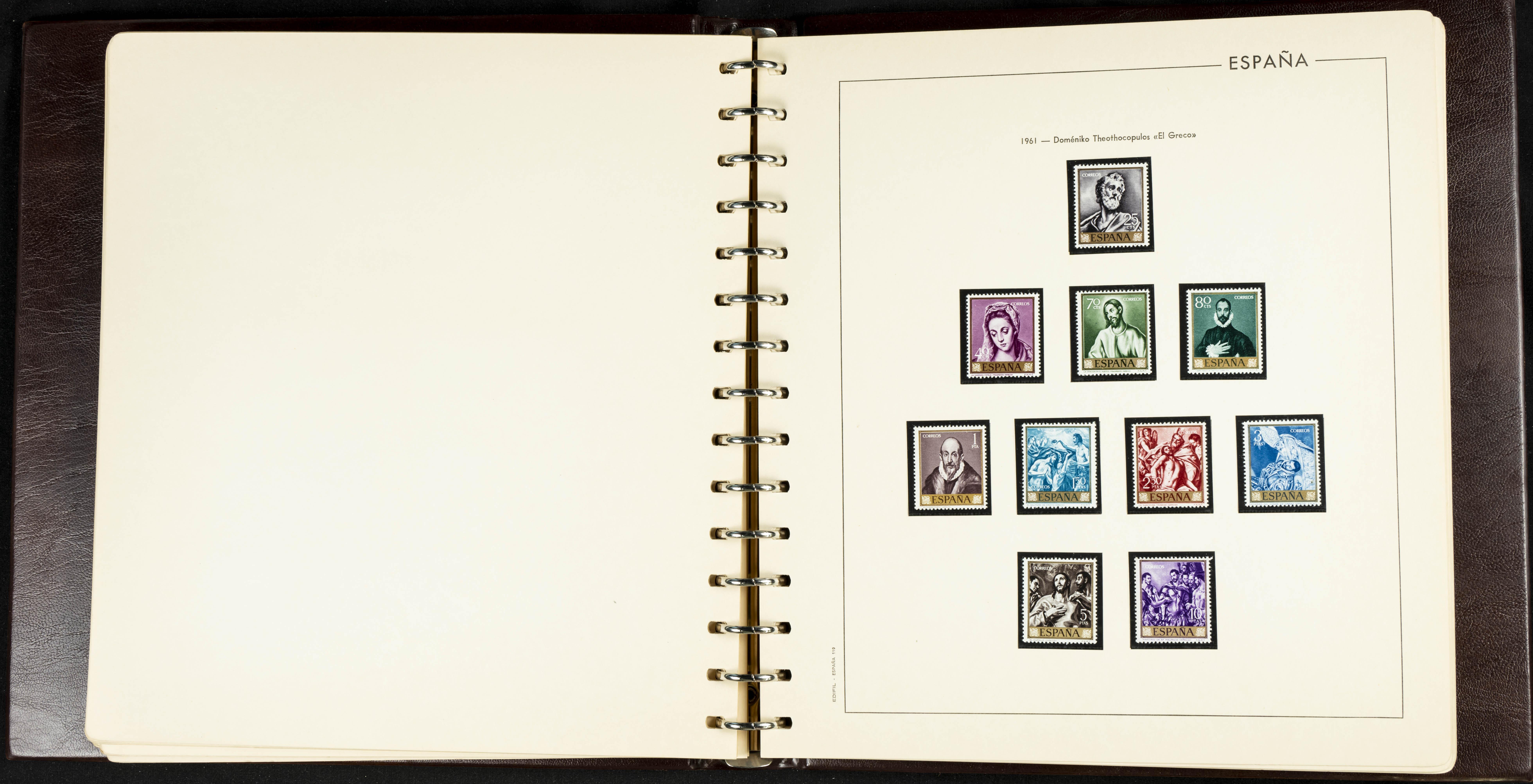 ★★(1950ca). Colección completa entre 1950 y 1975, en nuevo y sin fijasellos a falta de los Caudillos a Canarias con y sin número e incluyendo la 1ª y 2ª Tirada terrestres, Centenario, "Legazpi y Sorolla" (duplicado en usado) y juegos completos de Trajes y Escudos en bloques de cuatro. ALTO VALOR DE CATALOGO. A EXAMINAR.