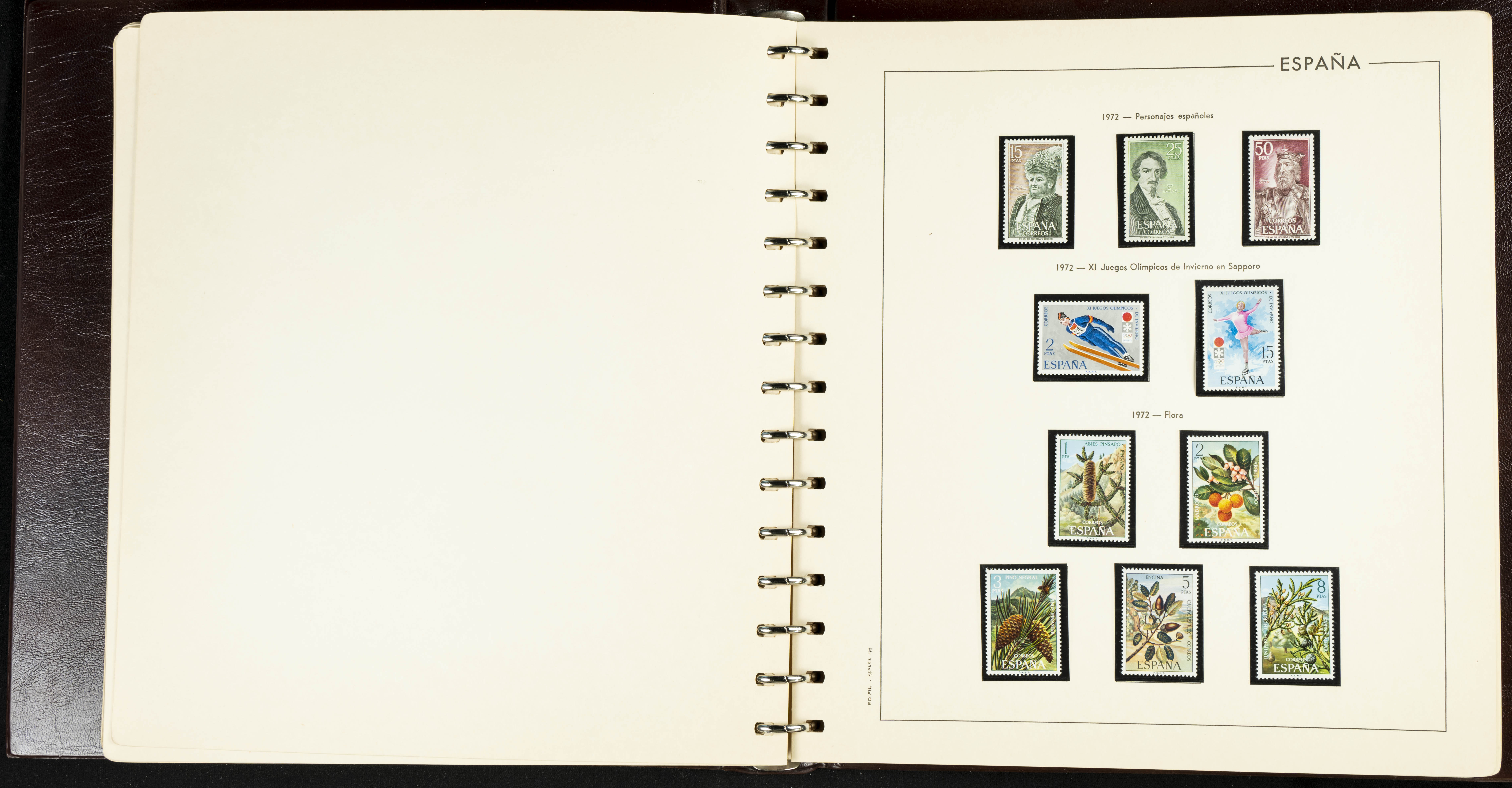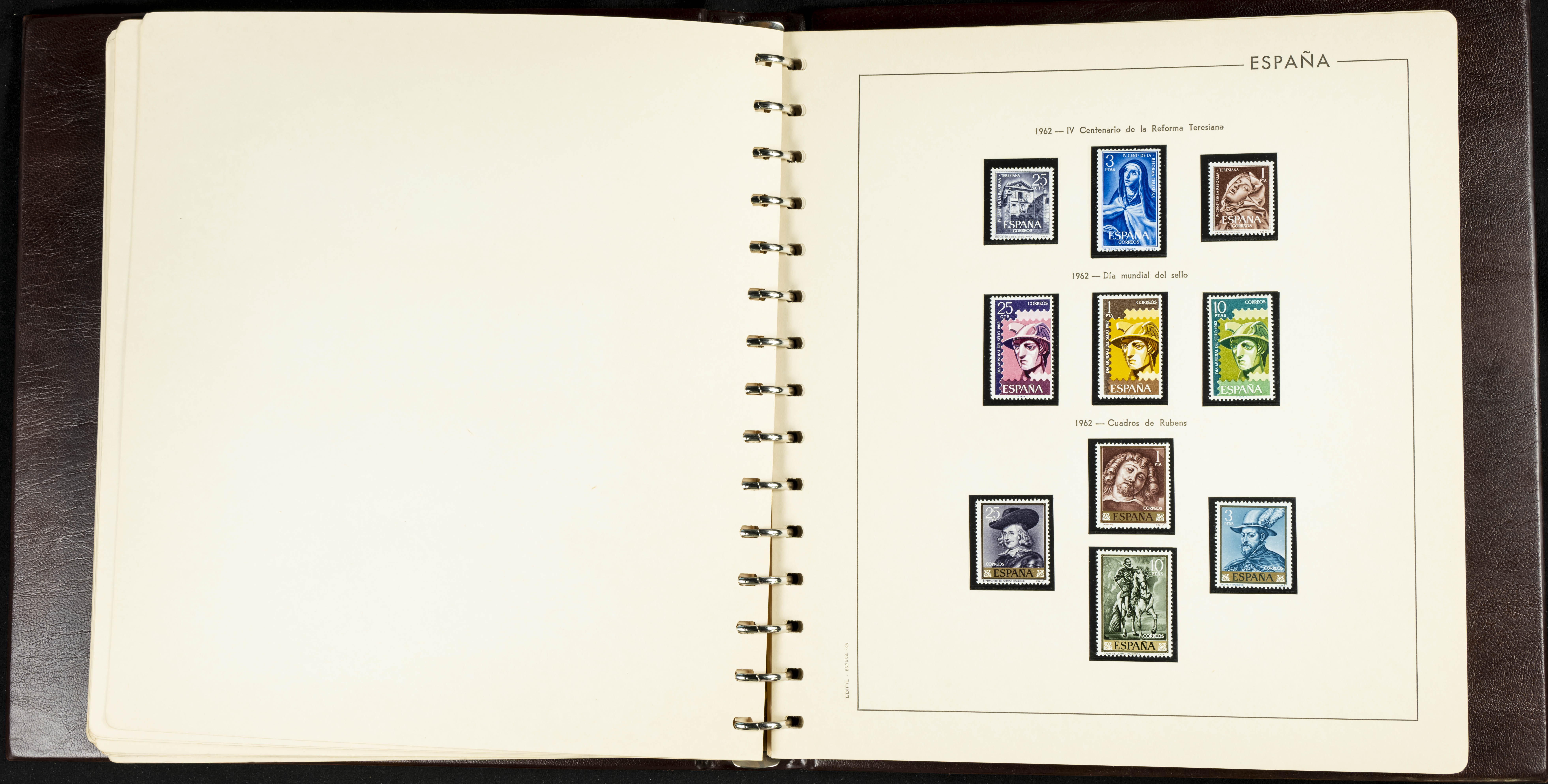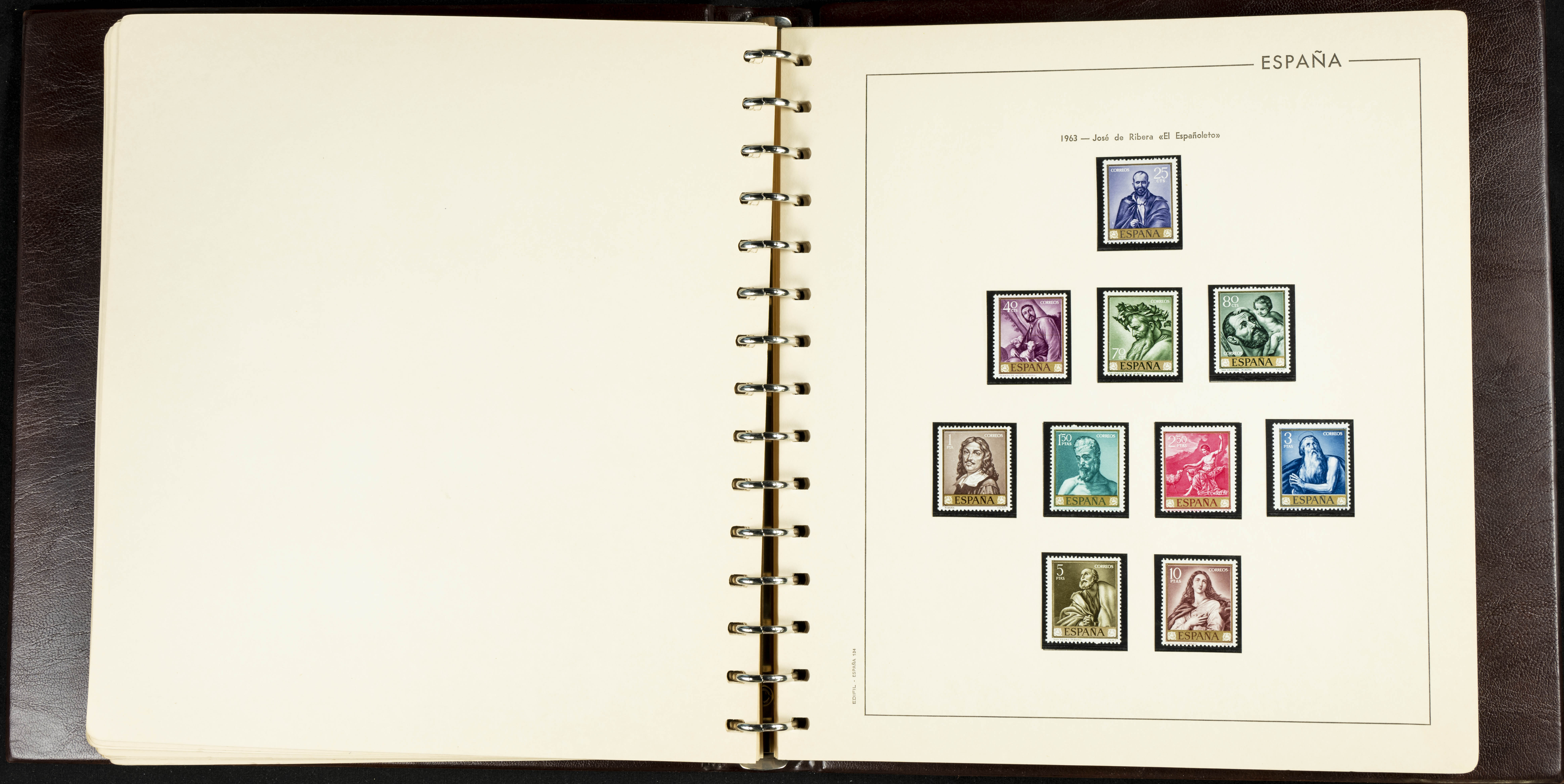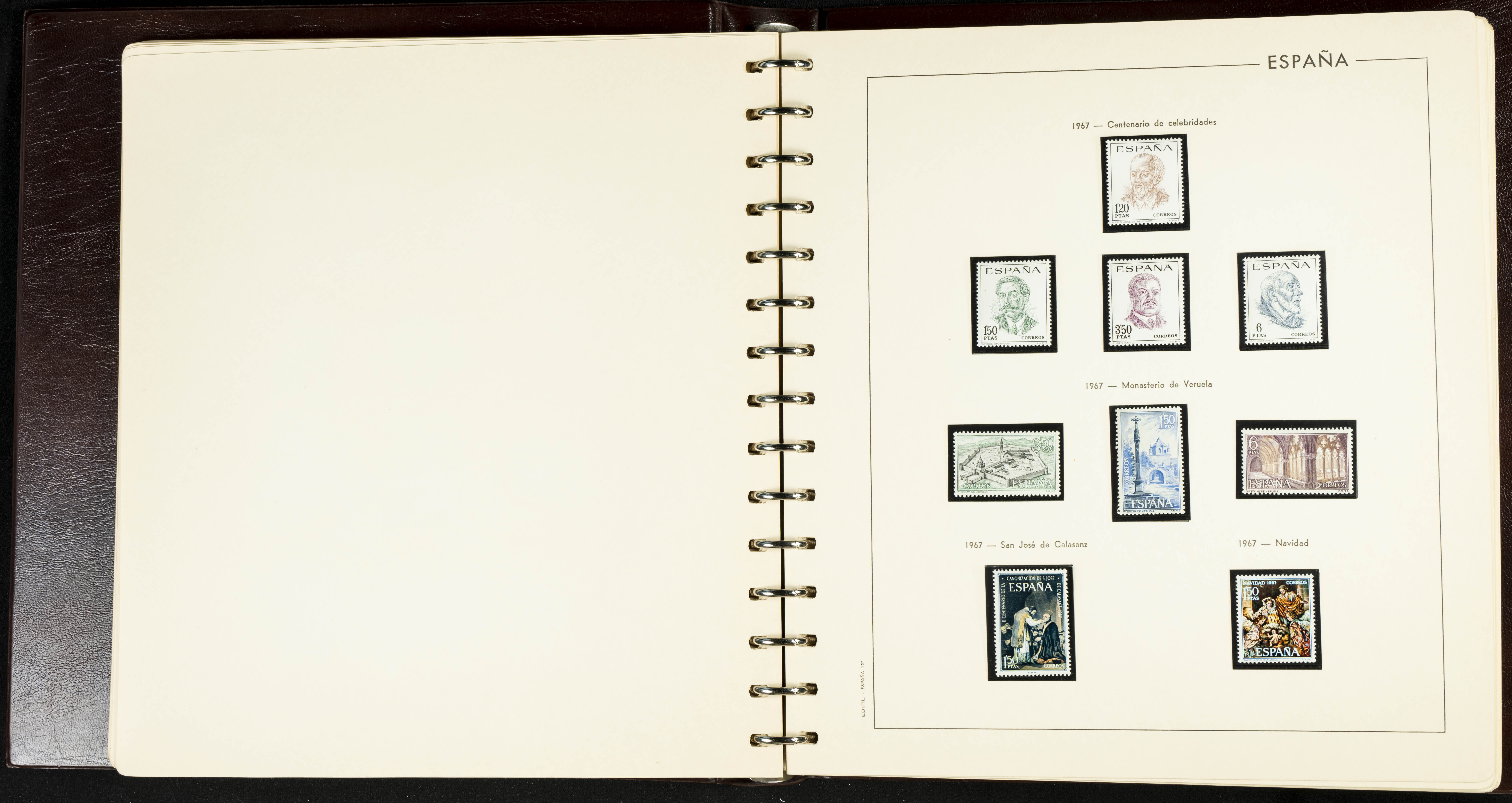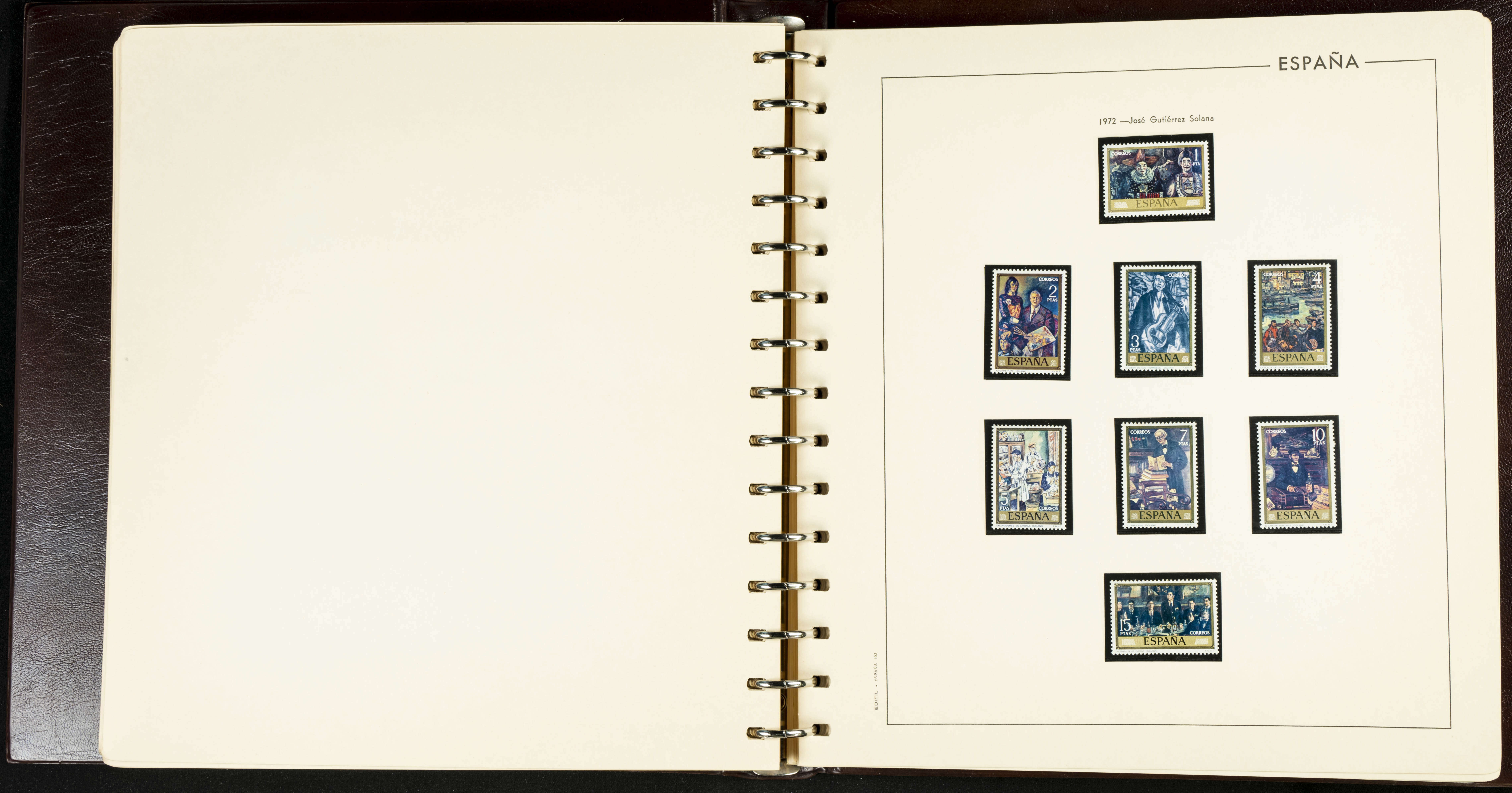 ★★(1950ca). Colección completa entre 1950 y 1975, en nuevo y sin fijasellos a falta de los Caudillos a Canarias con y sin número e incluyendo la 1ª y 2ª Tirada terrestres, Centenario, "Legazpi y Sorolla" (duplicado en usado) y juegos completos de Trajes y Escudos en bloques de cuatro. ALTO VALOR DE CATALOGO. A EXAMINAR.
