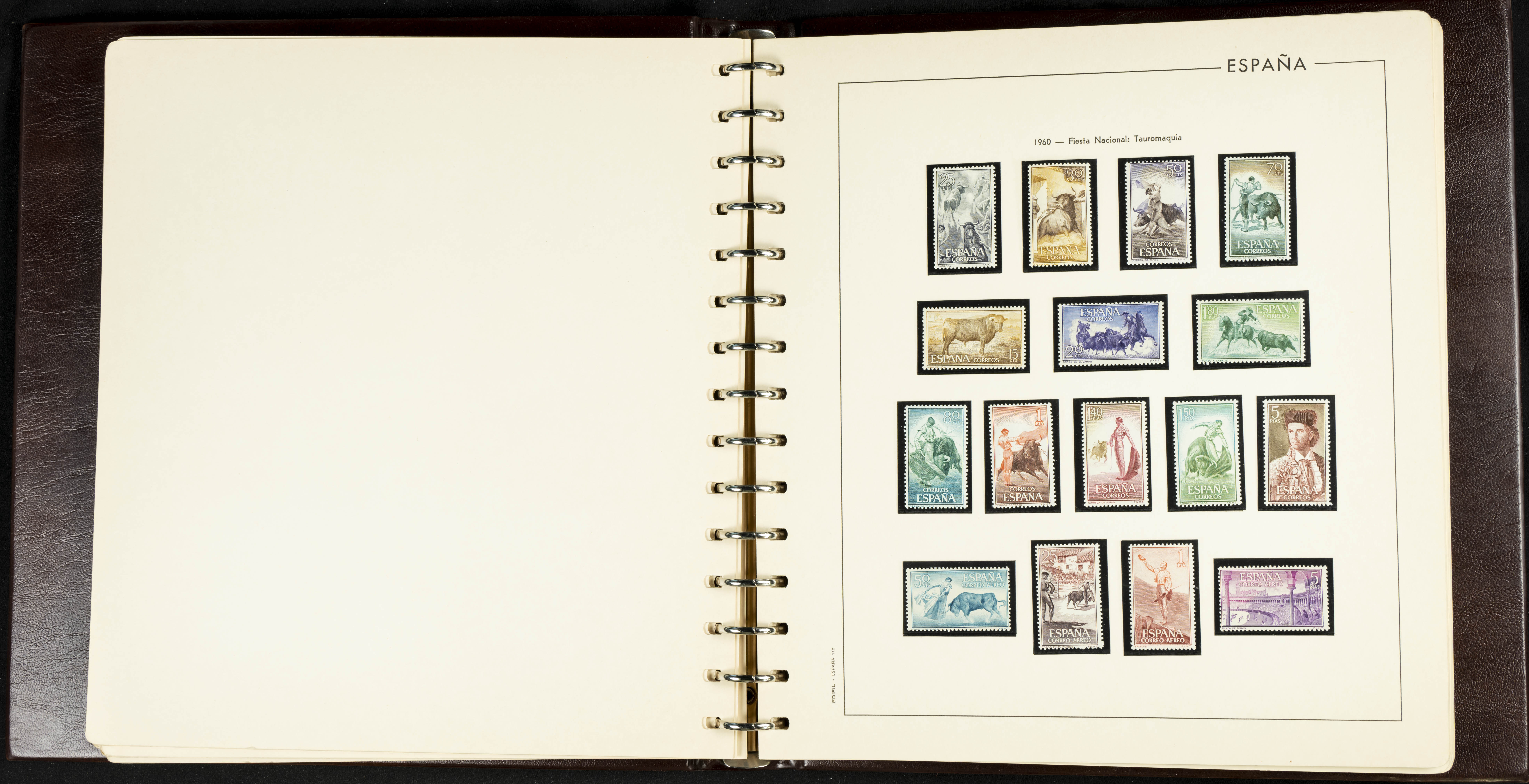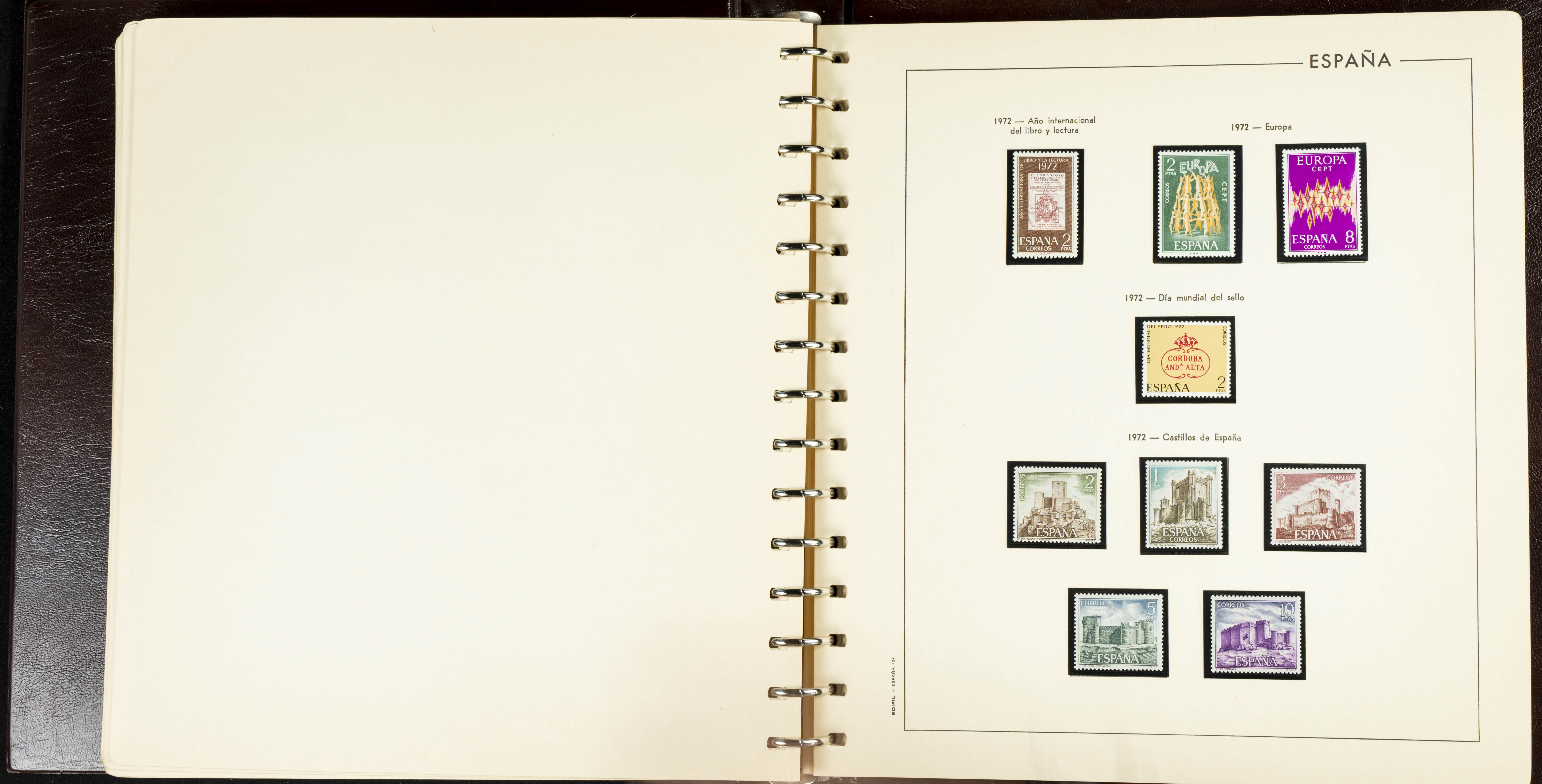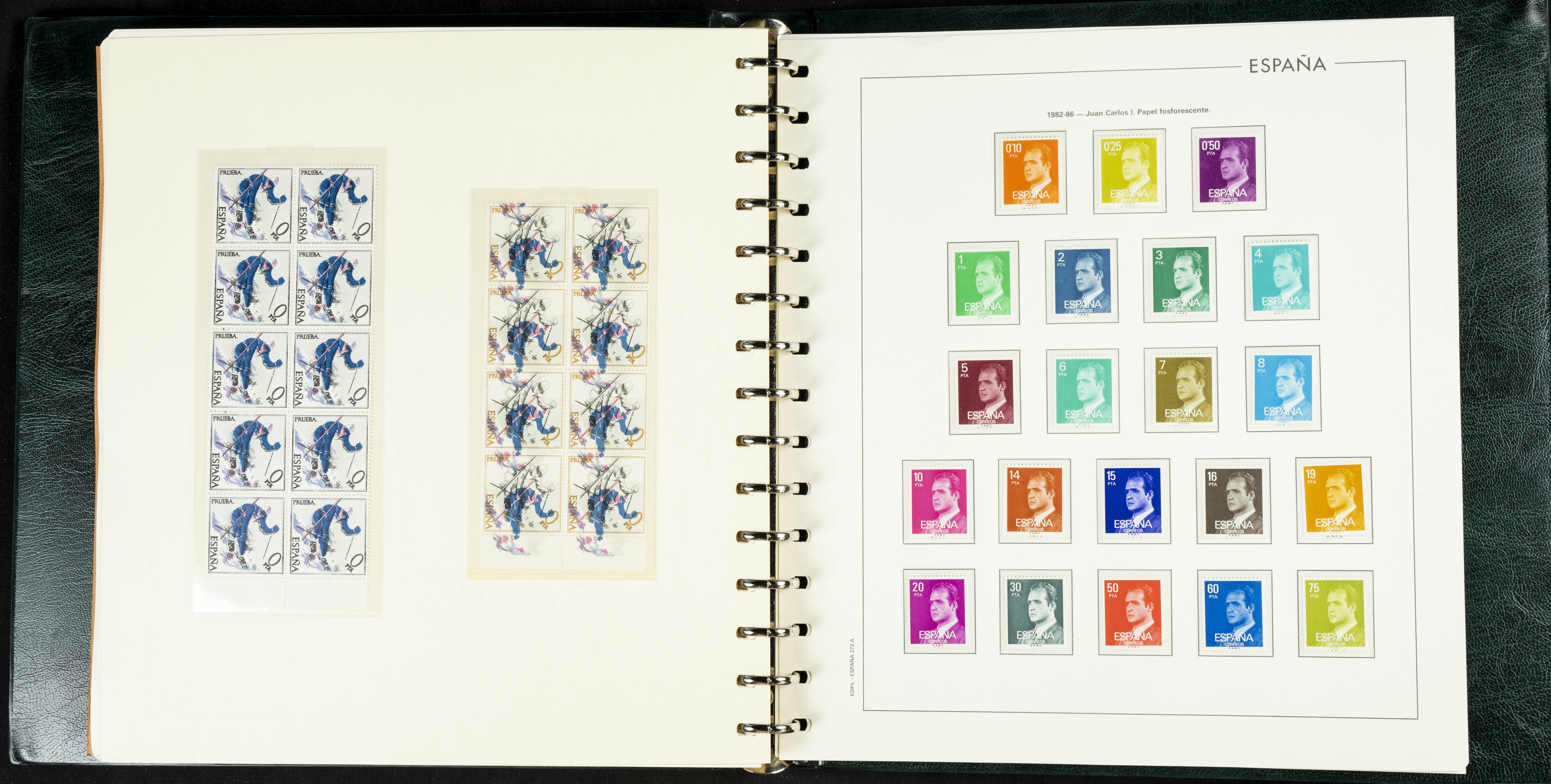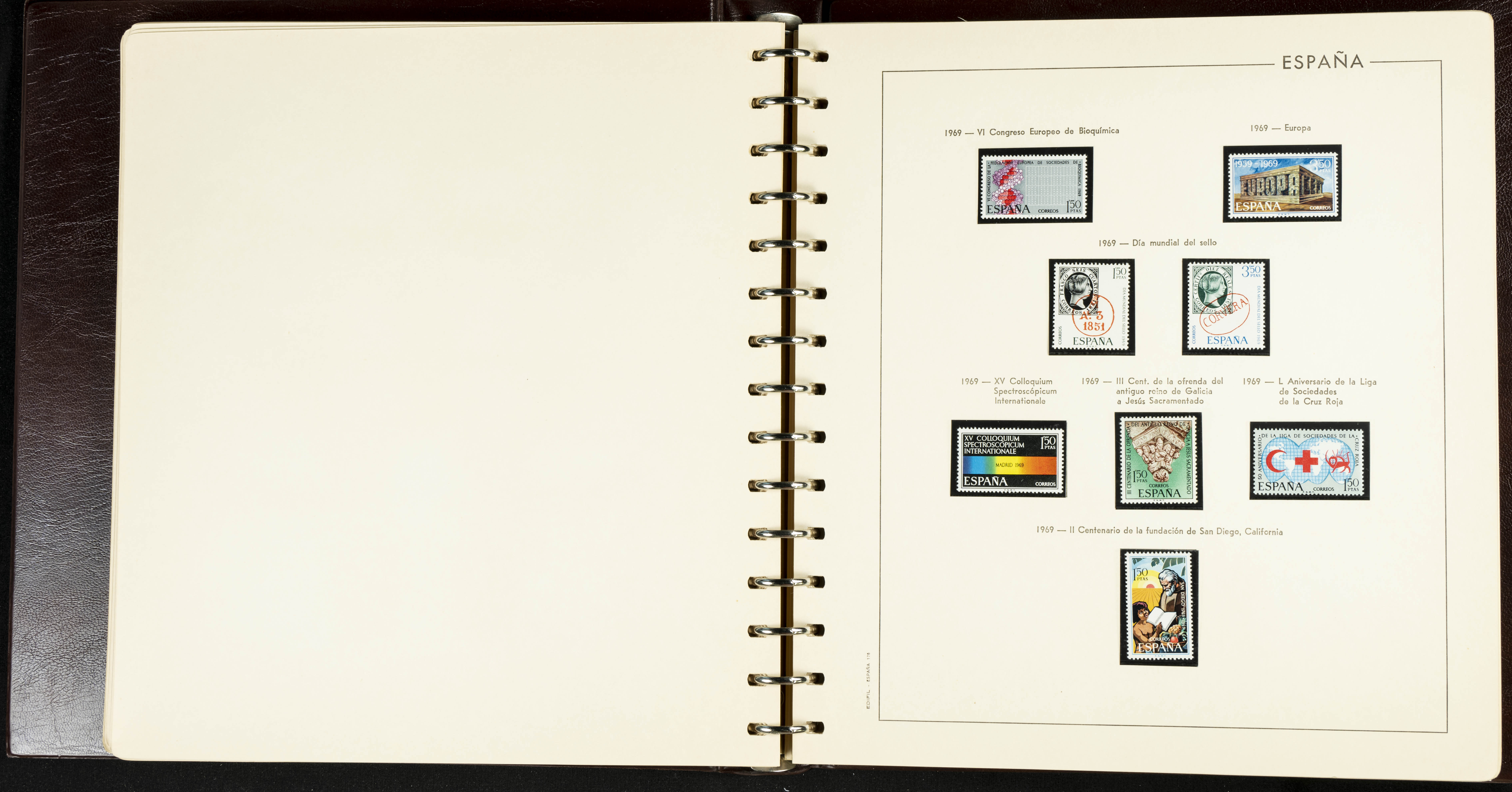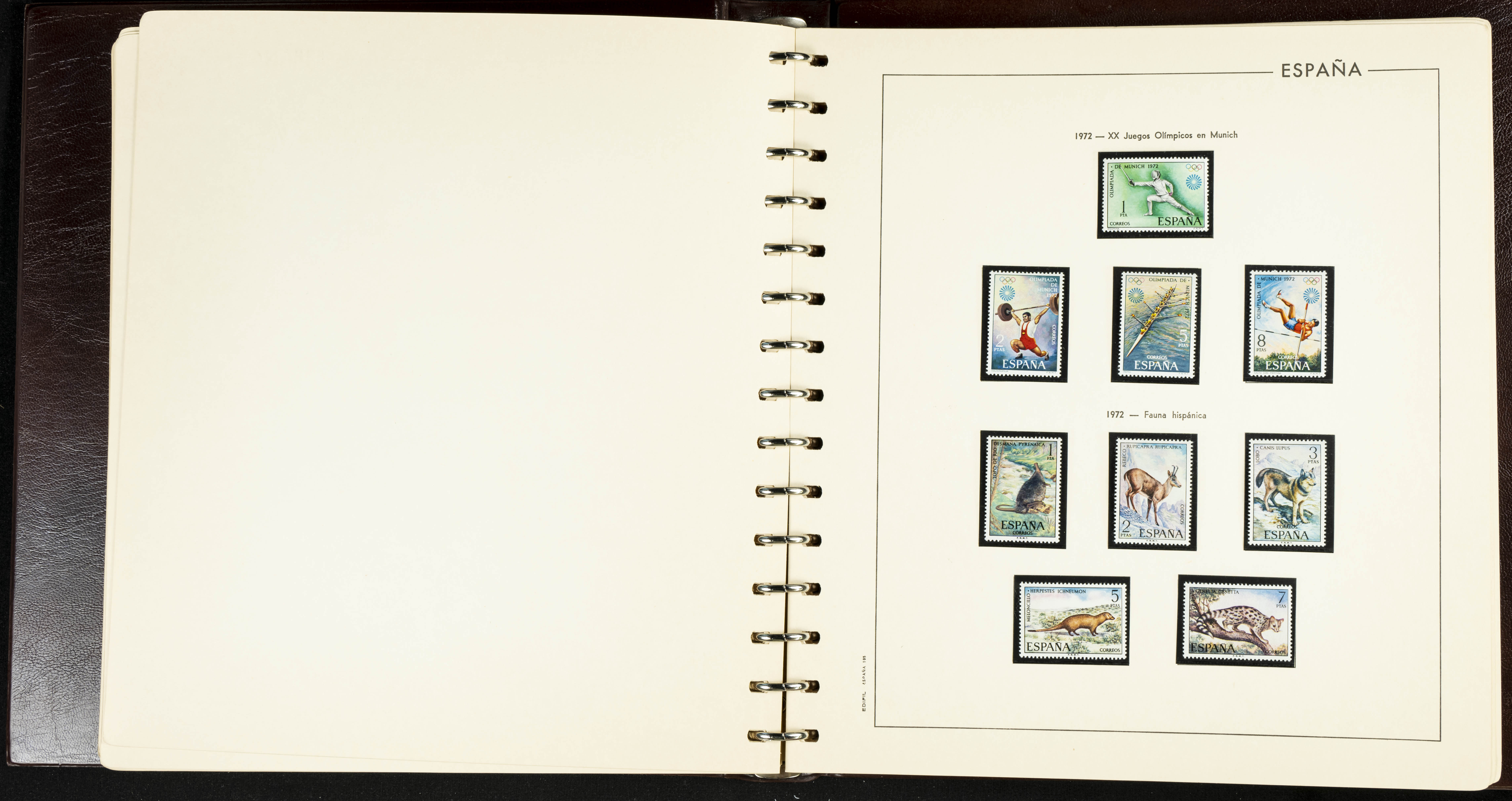 ★★(1950ca). Colección completa entre 1950 y 1975, en nuevo y sin fijasellos a falta de los Caudillos a Canarias con y sin número e incluyendo la 1ª y 2ª Tirada terrestres, Centenario, "Legazpi y Sorolla" (duplicado en usado) y juegos completos de Trajes y Escudos en bloques de cuatro. ALTO VALOR DE CATALOGO. A EXAMINAR.