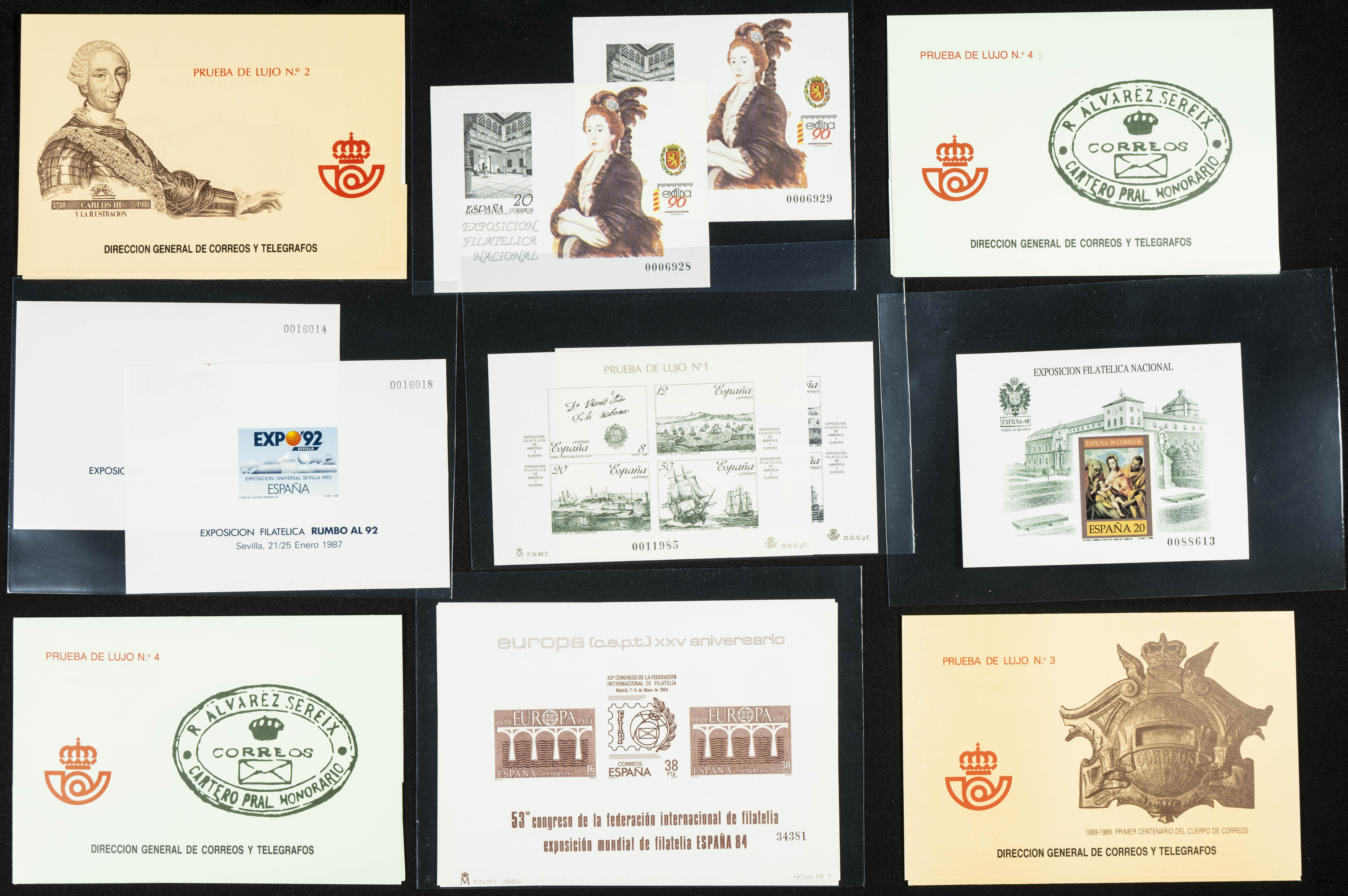 ★★(1984ca). Conjunto de Pruebas de Lujo entre 1984 y 1990, alguna repetida. A EXAMINAR. Edifil 2026: 657 Euros