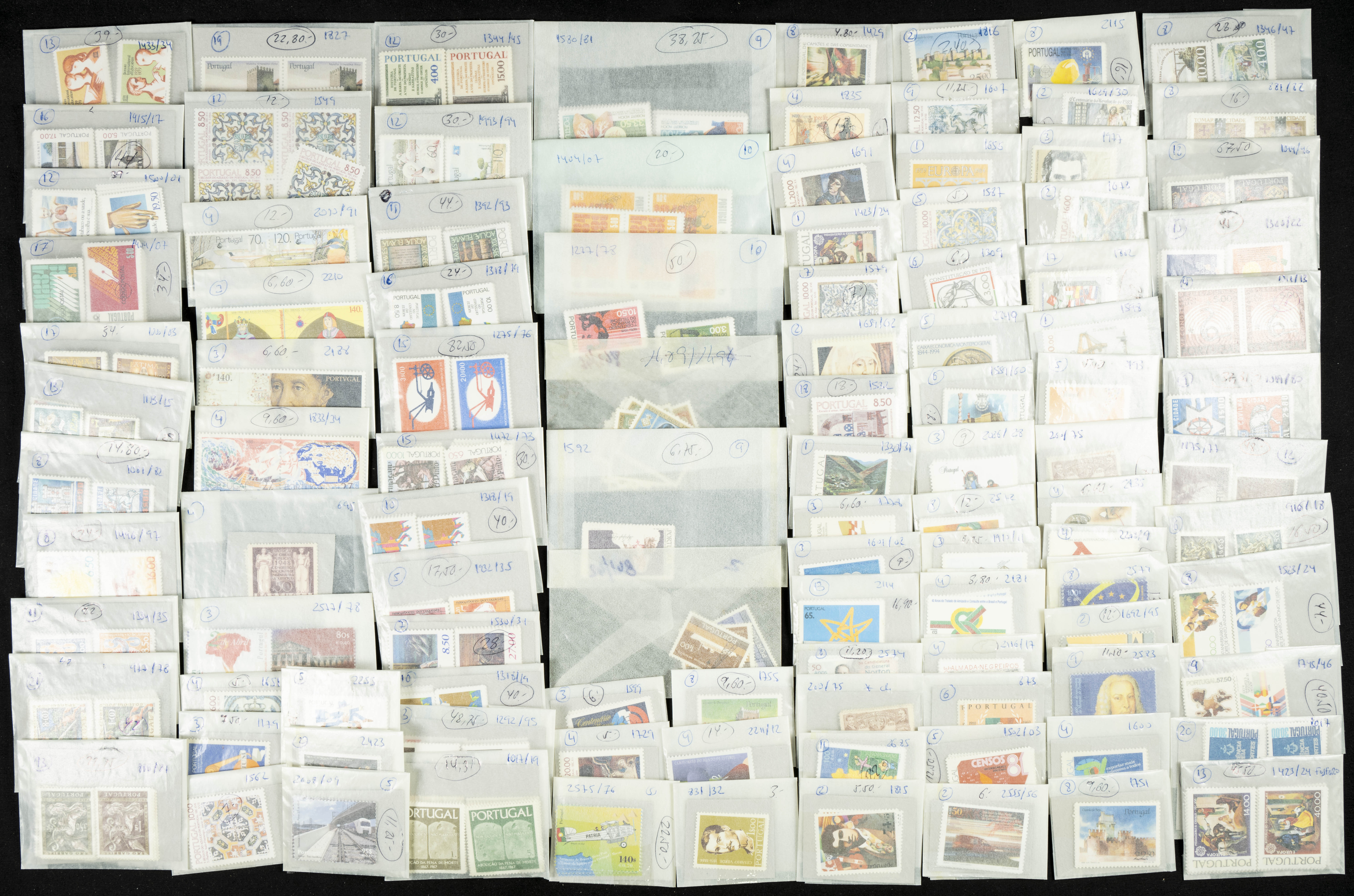 ★★(1950ca). Interesante conjunto-stock de series completas de Portugal entre 1950 (hay algún sello anterior) y 1990, en nuevo y organizado en sobres y repeticiones hasta diez unidades de cada. A EXAMINAR. Yvert 2023: +2.400 Euros