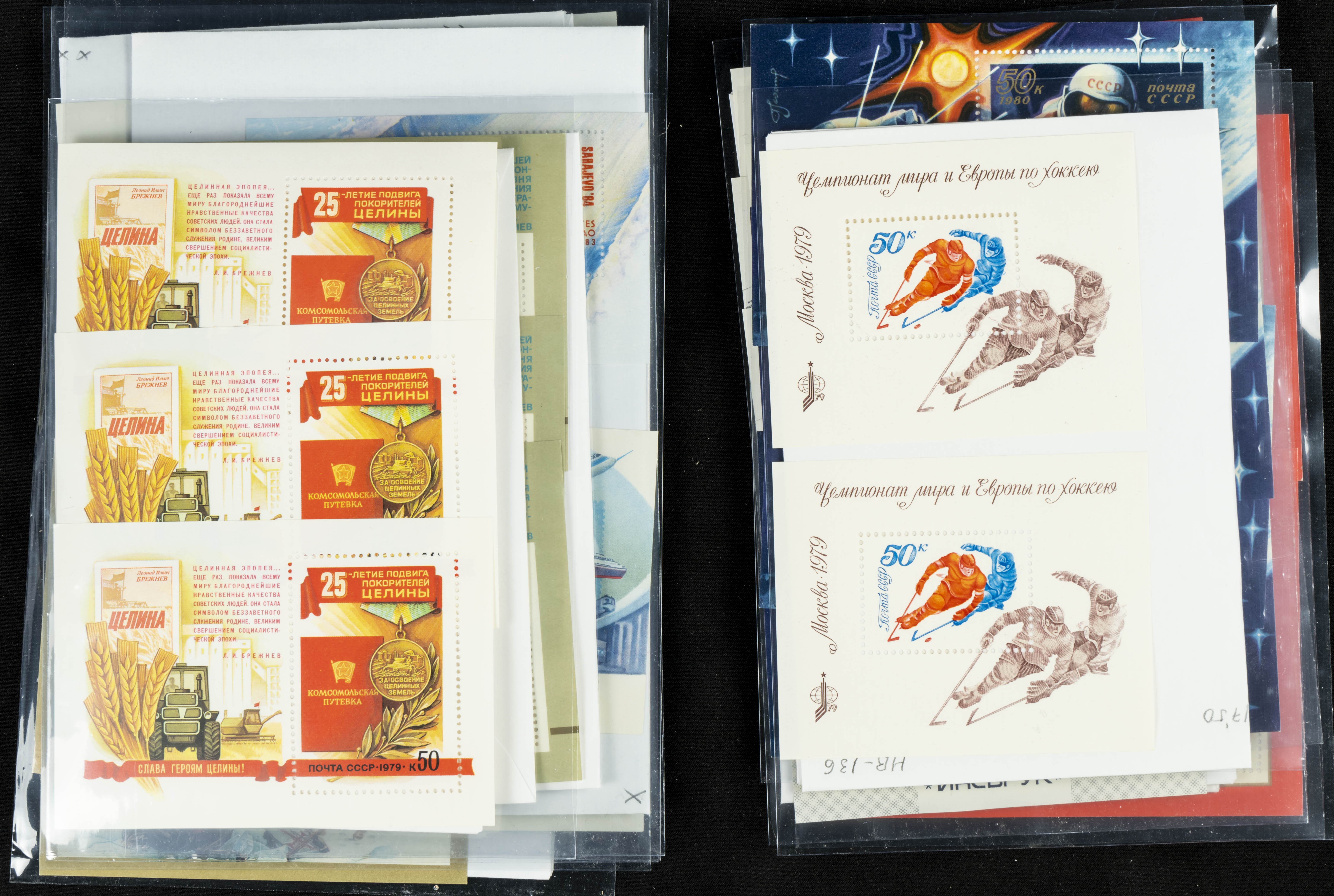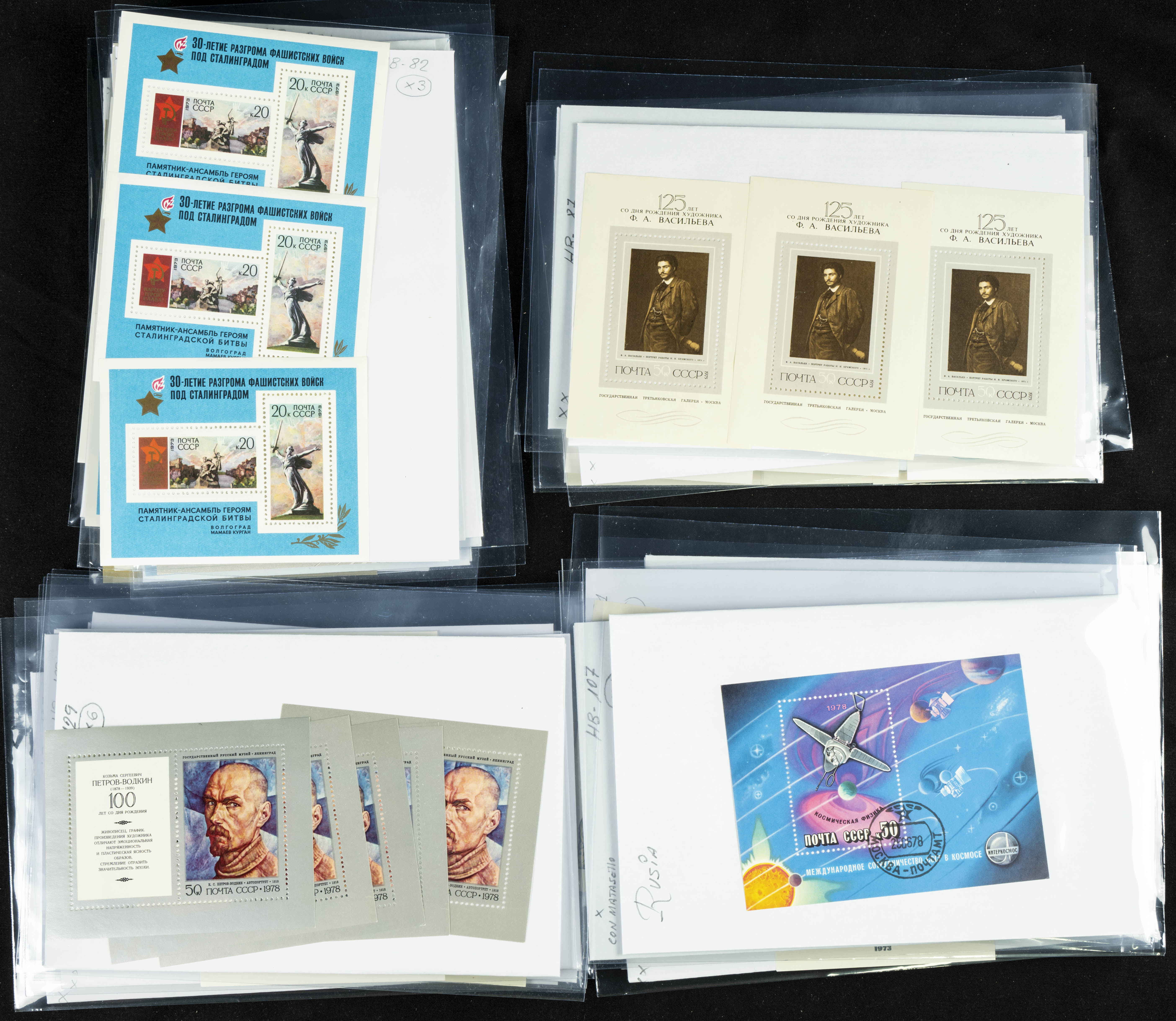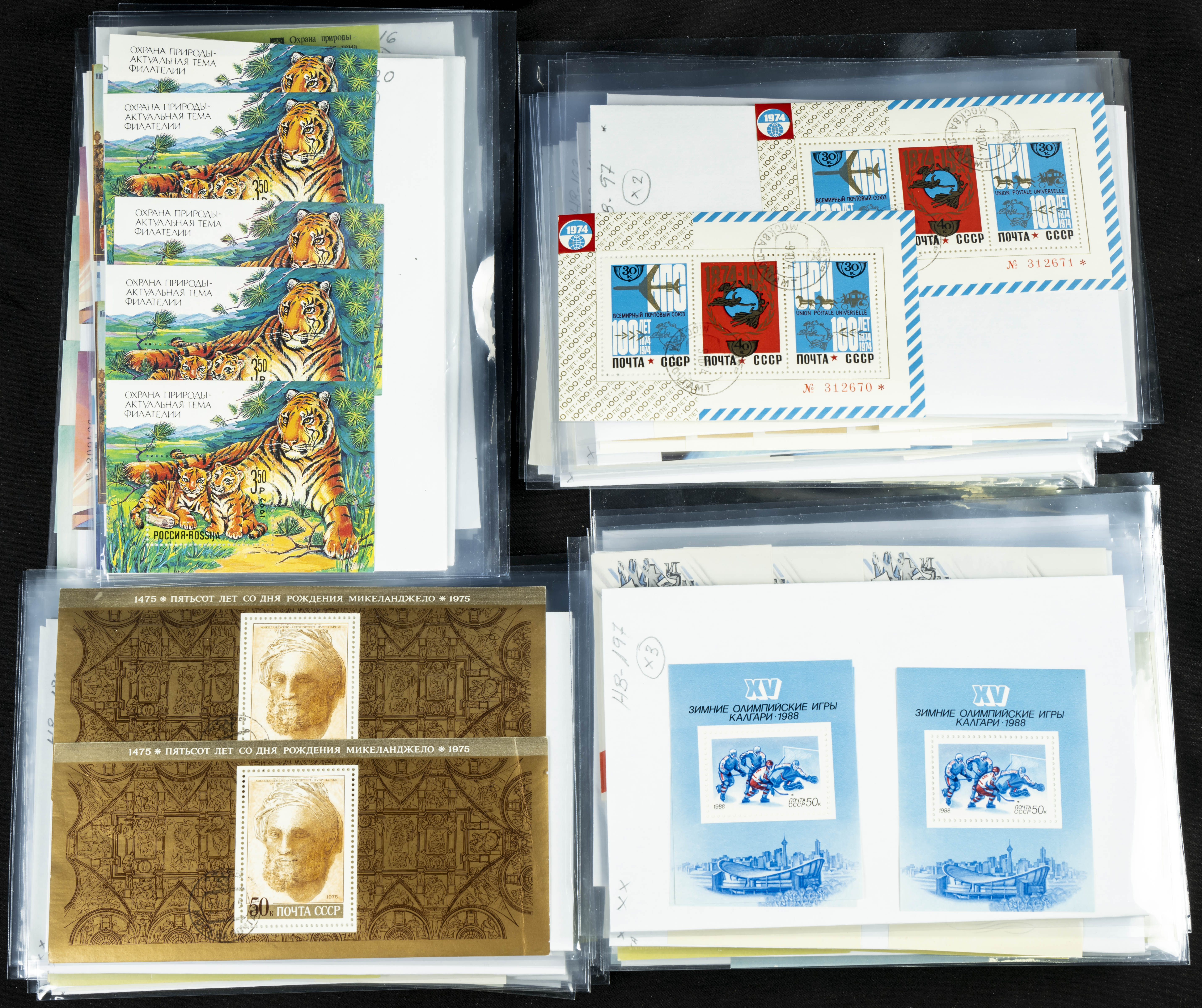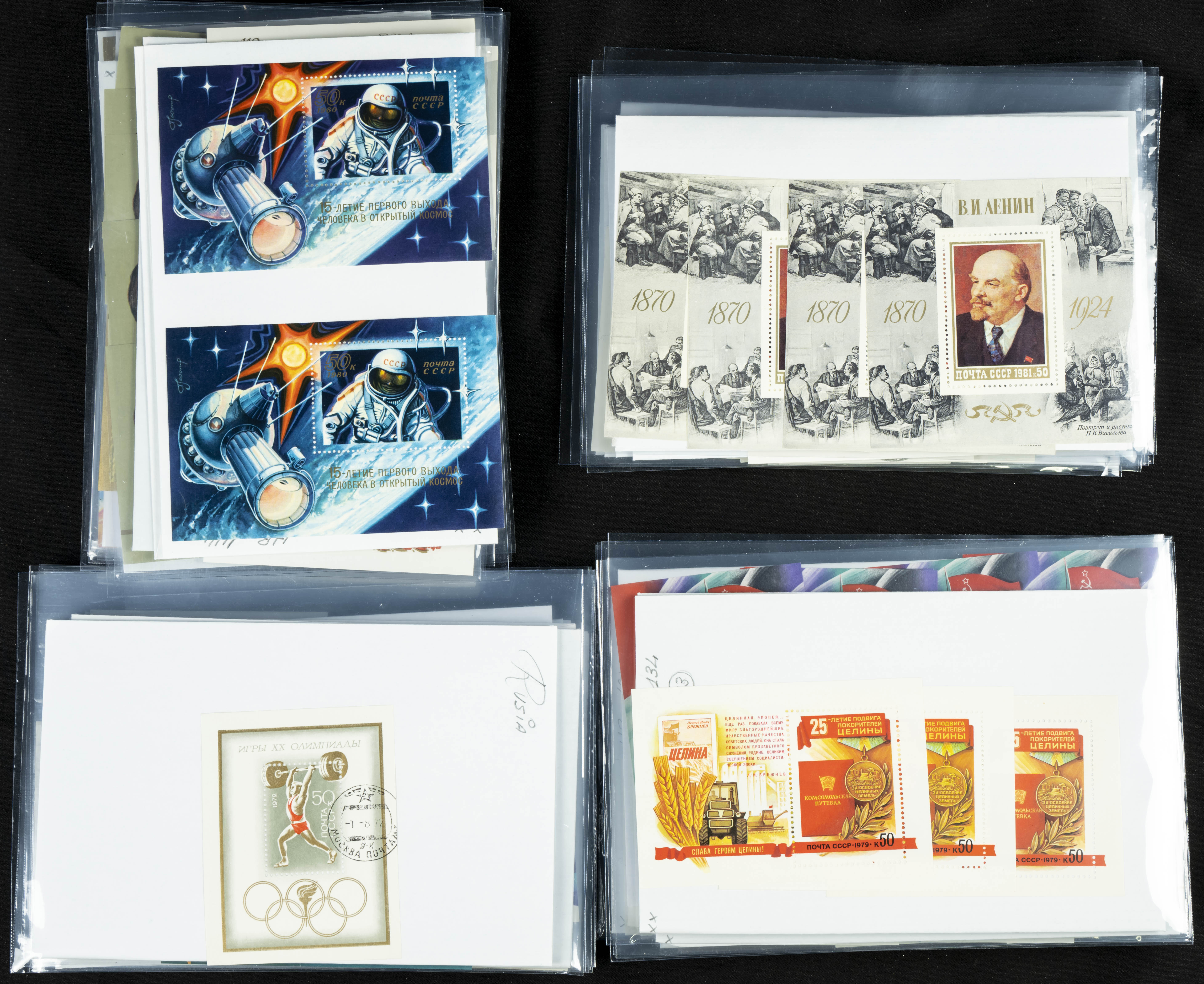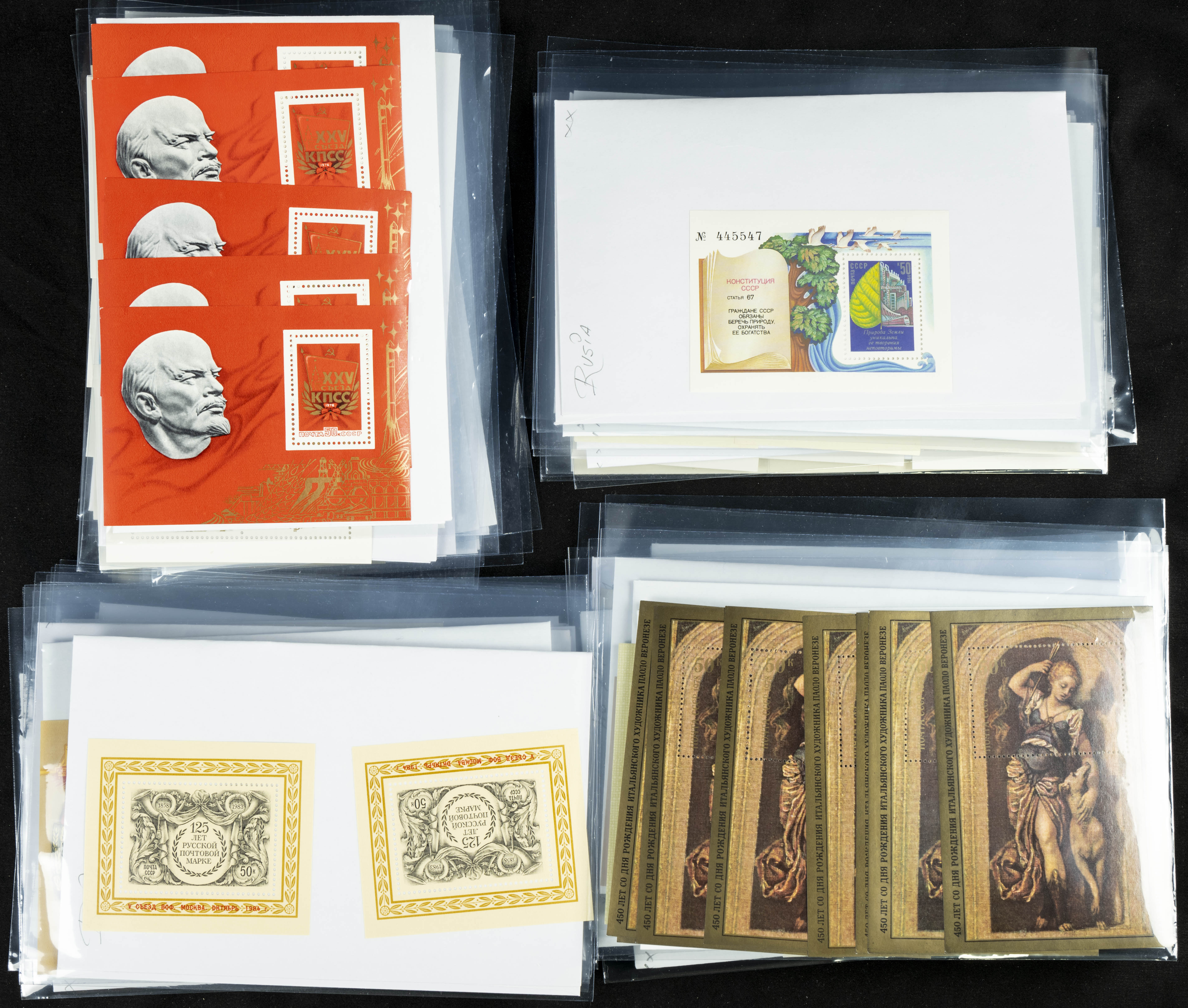 ★★(1970ca). Interesante conjunto-stock de hojas bloque de Rusia, la mayoría de los años setenta y ochenta, en nuevo y repeticiones variadas. ALTO VALOR DE CATALOGO. A EXAMINAR.