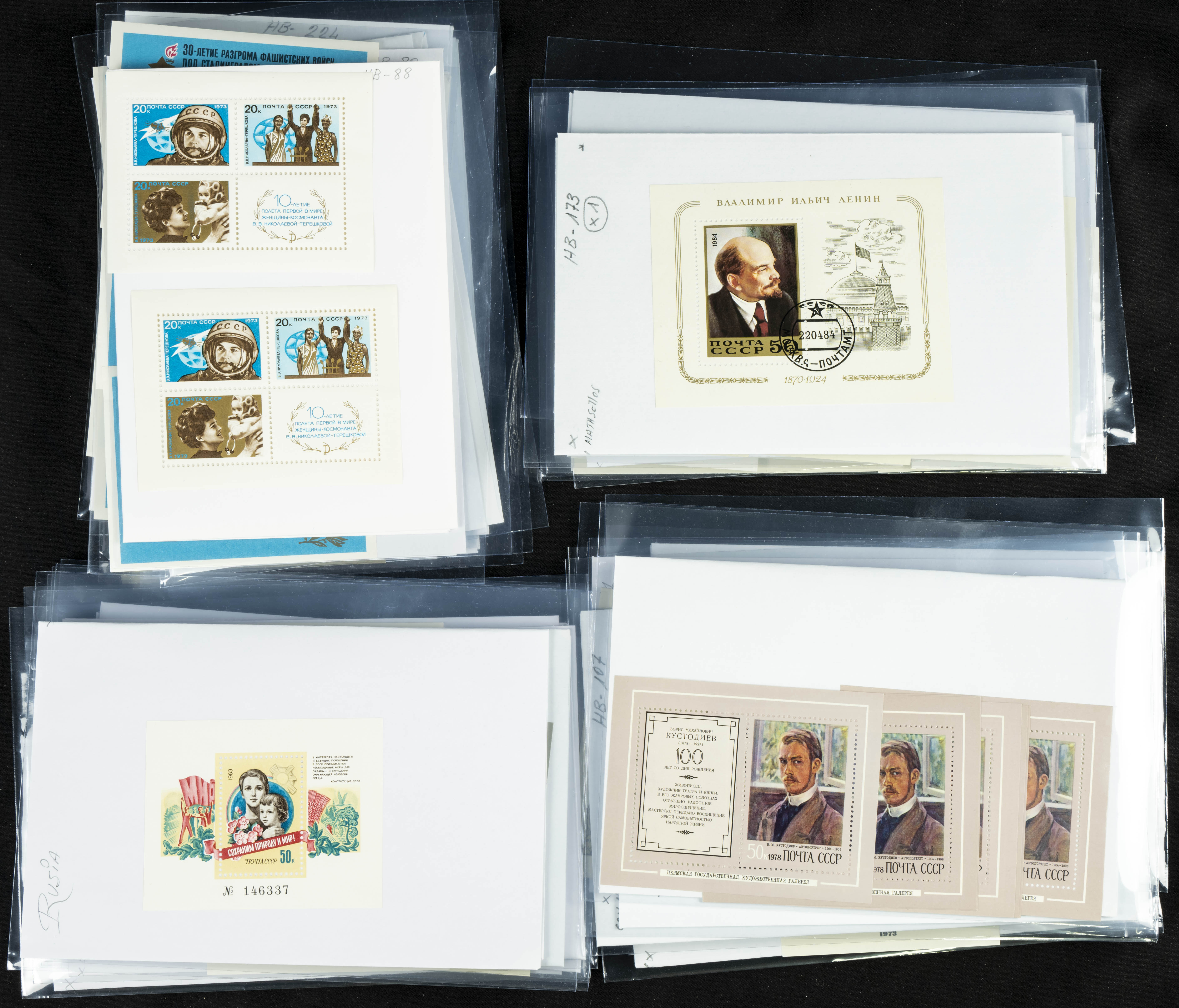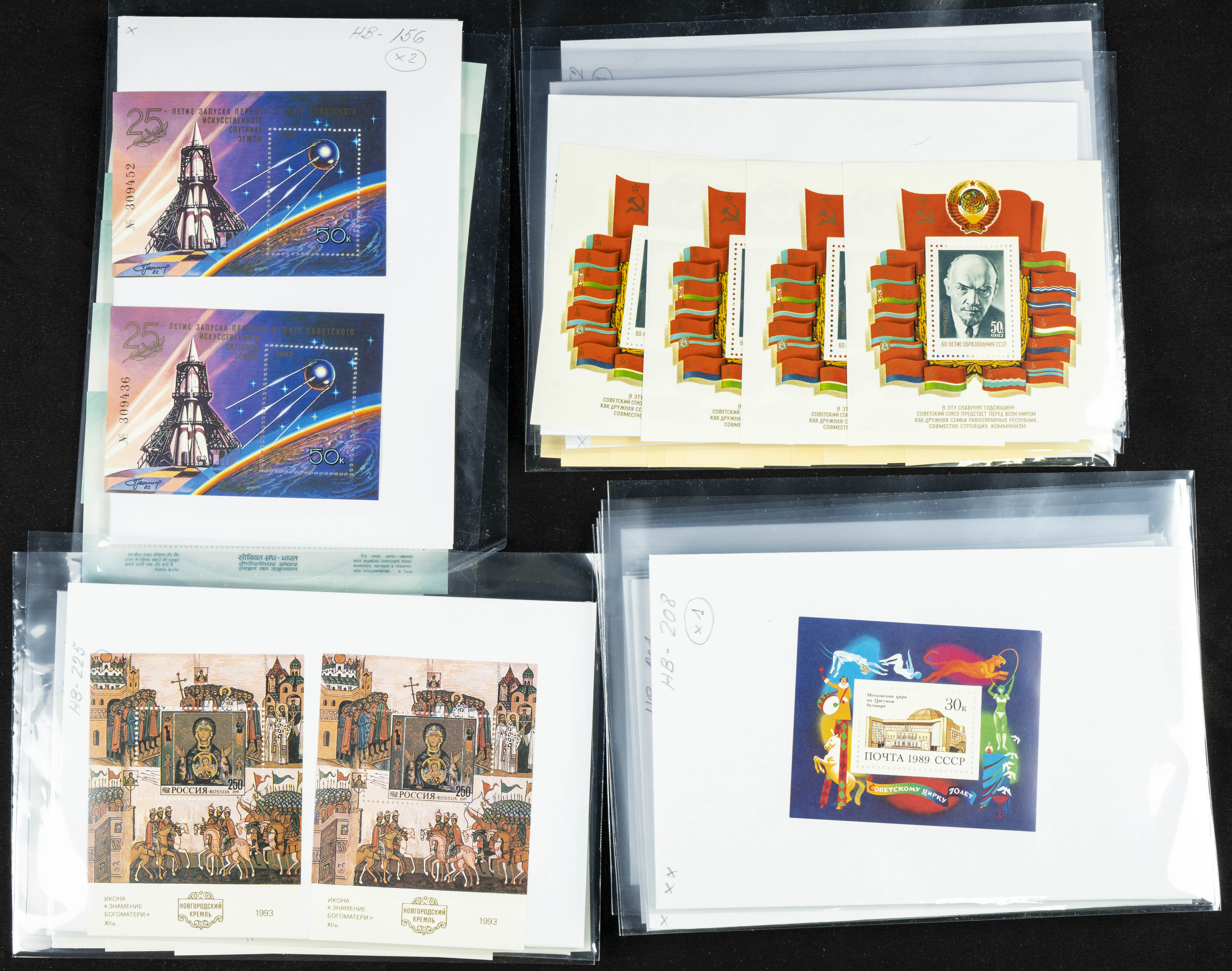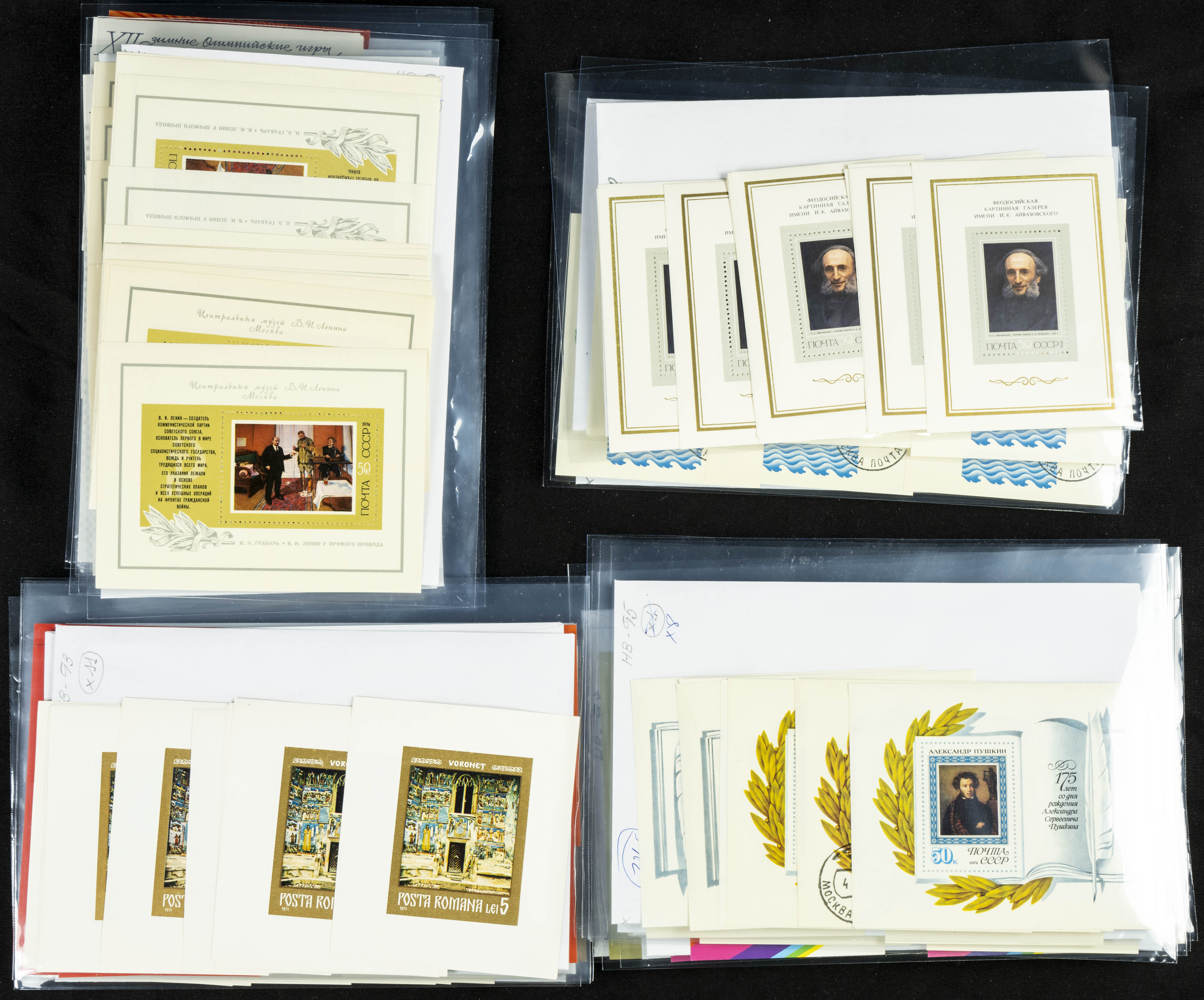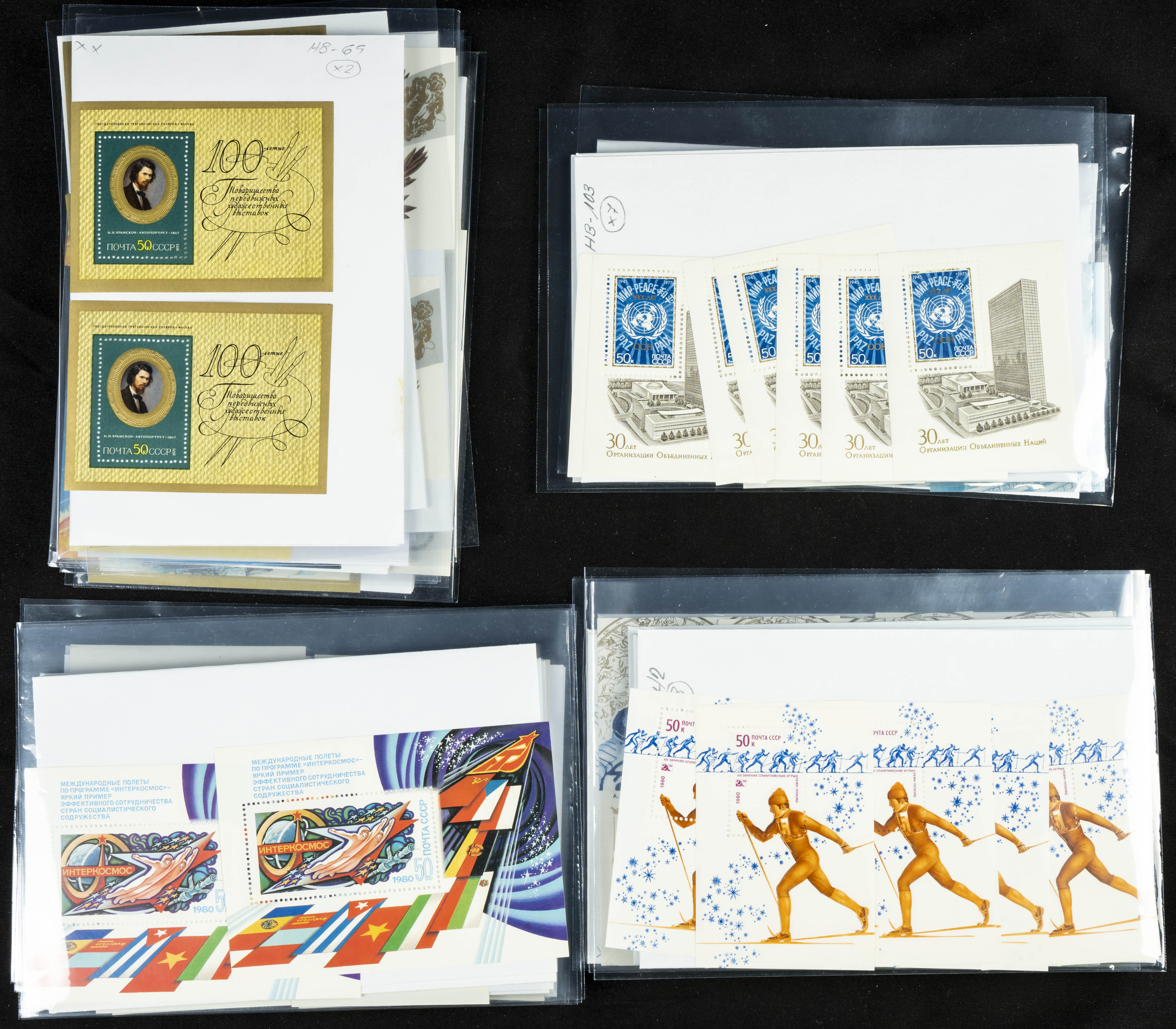 ★★(1970ca). Interesante conjunto-stock de hojas bloque de Rusia, la mayoría de los años setenta y ochenta, en nuevo y repeticiones variadas. ALTO VALOR DE CATALOGO. A EXAMINAR.