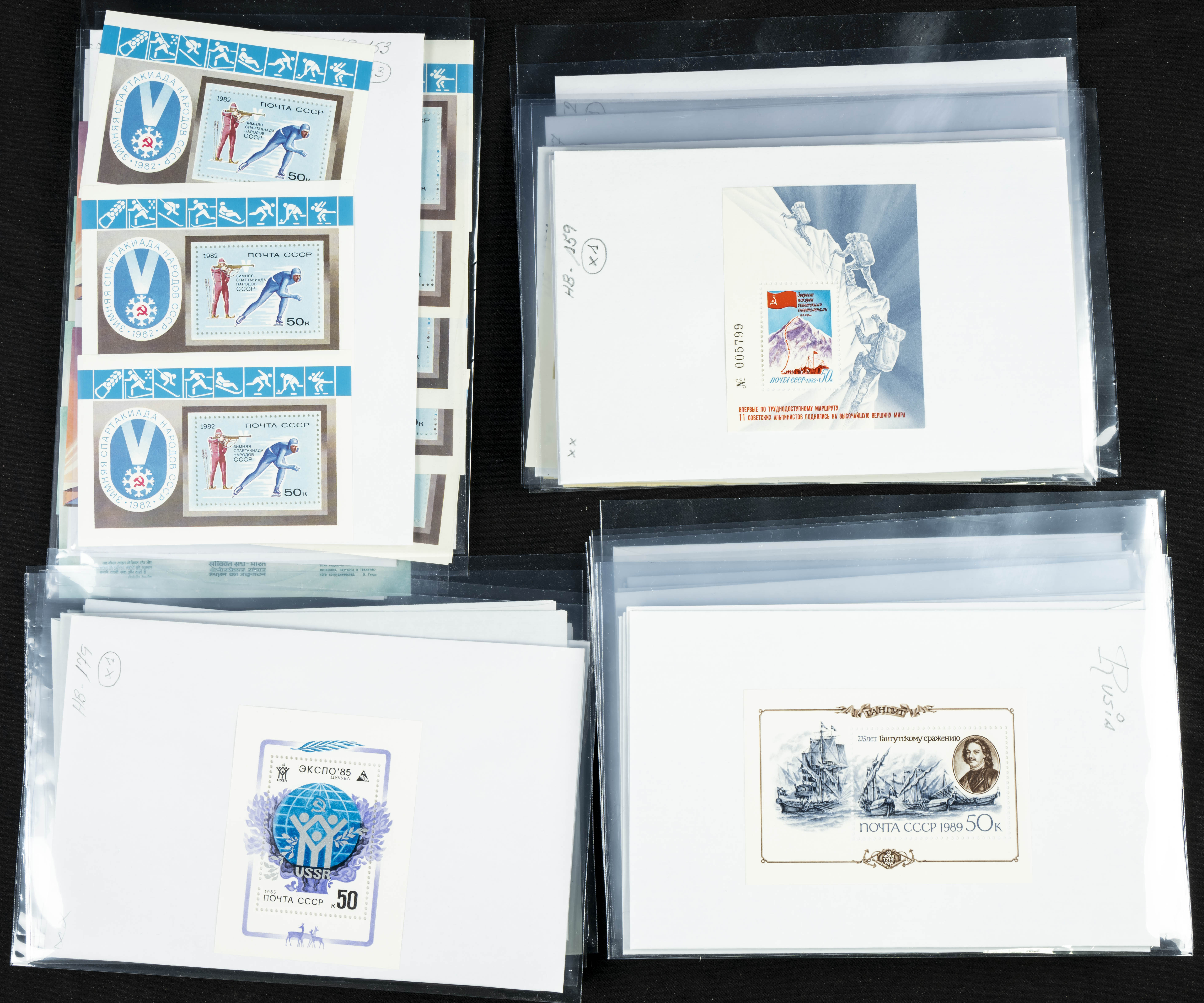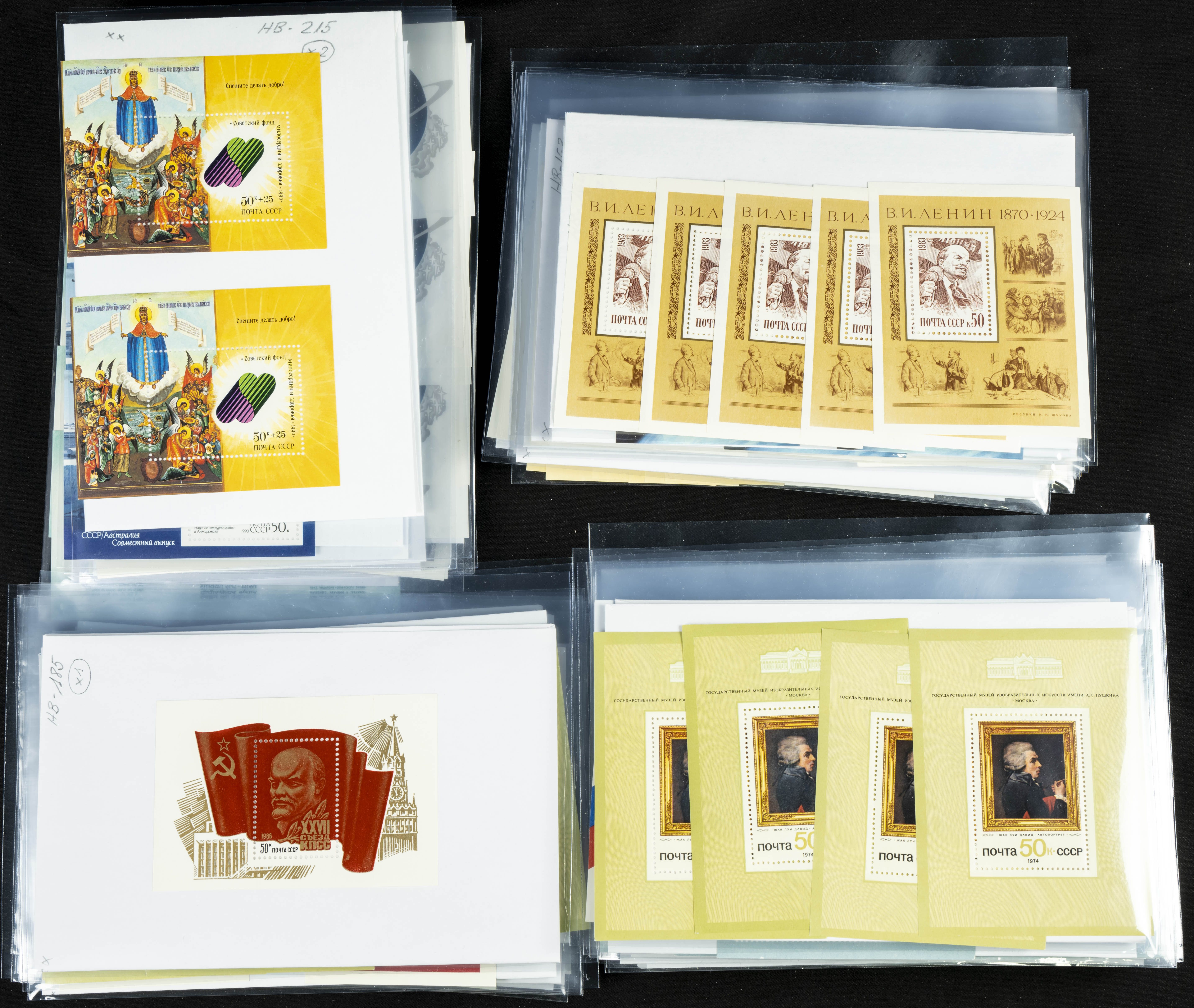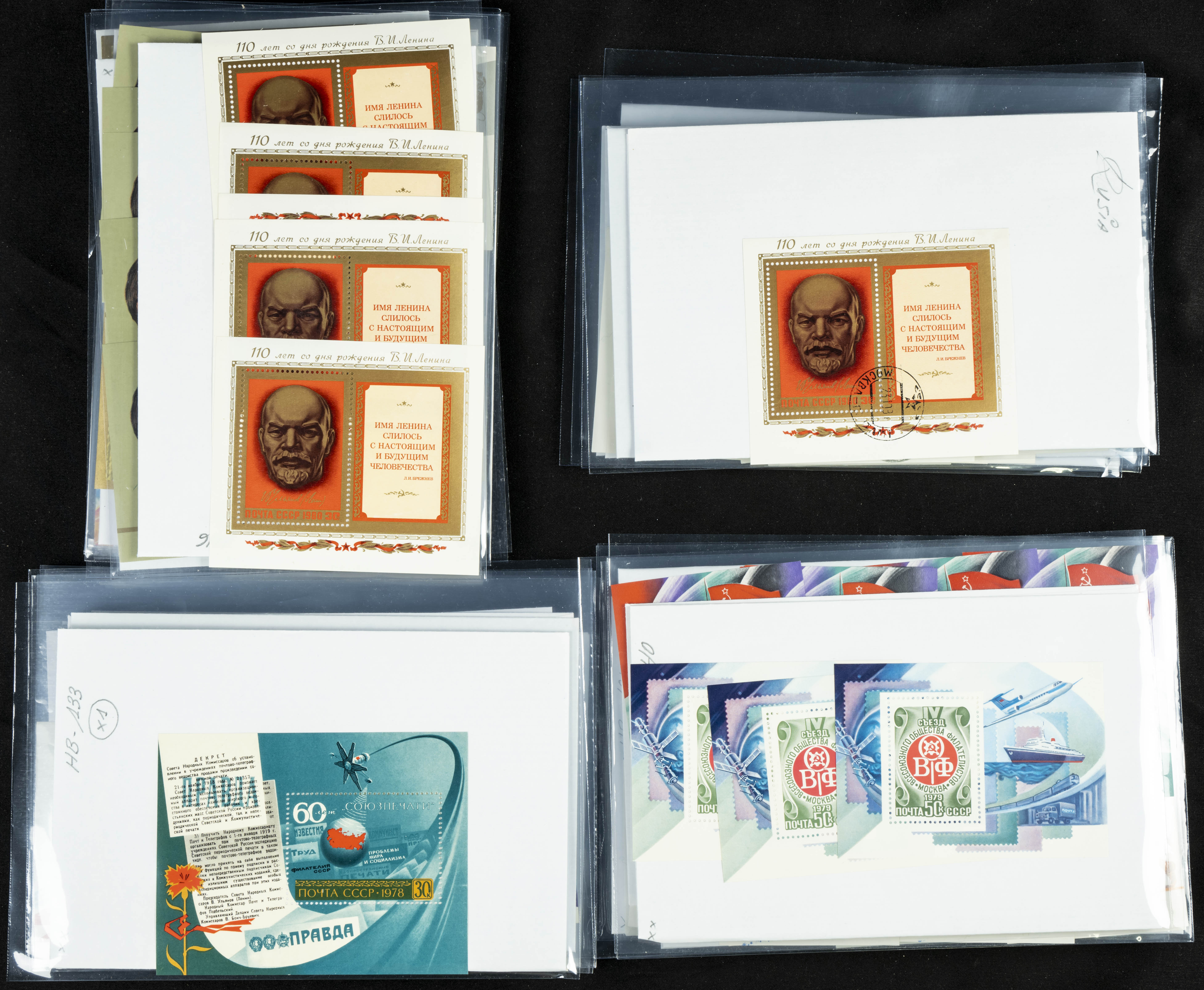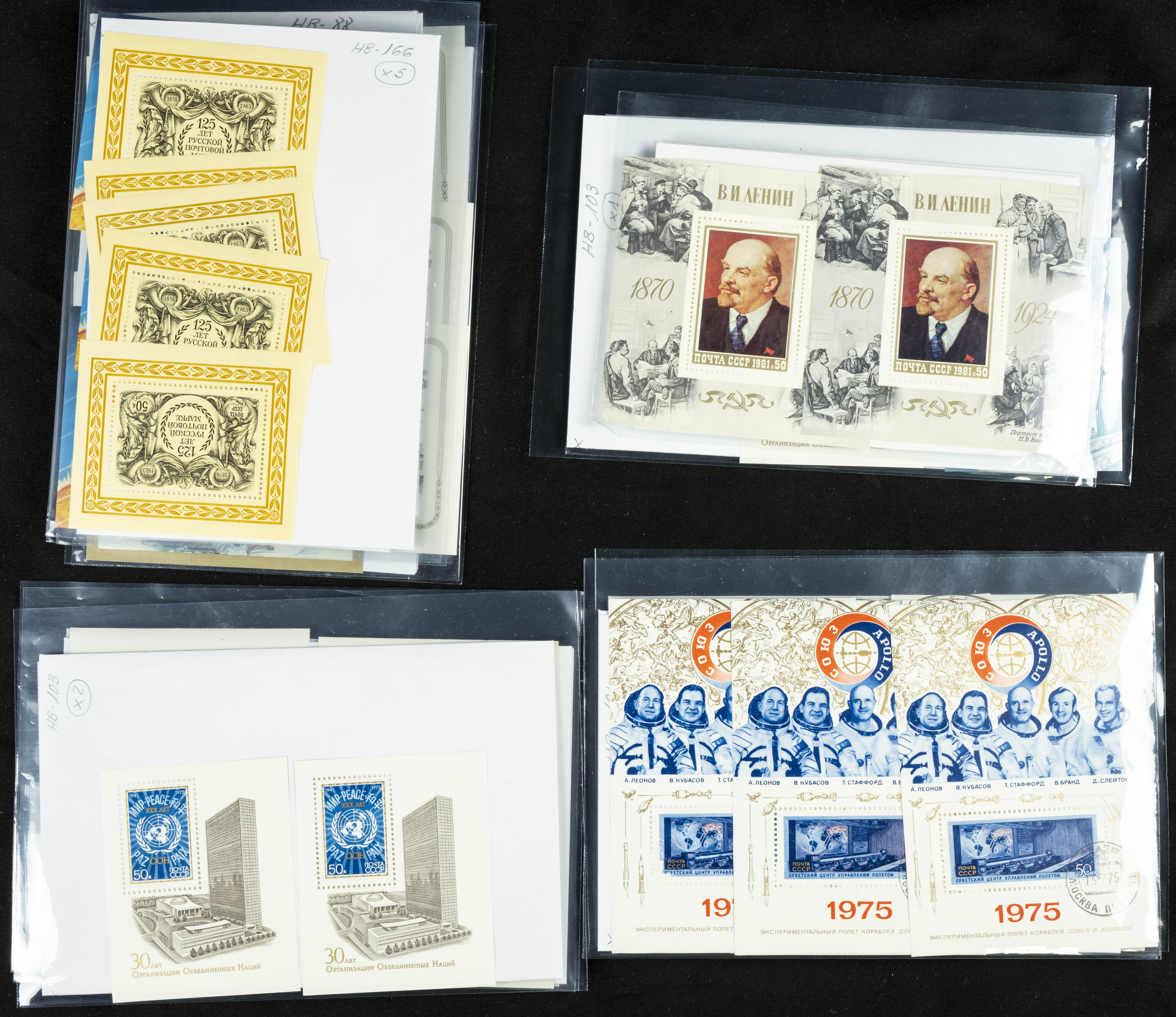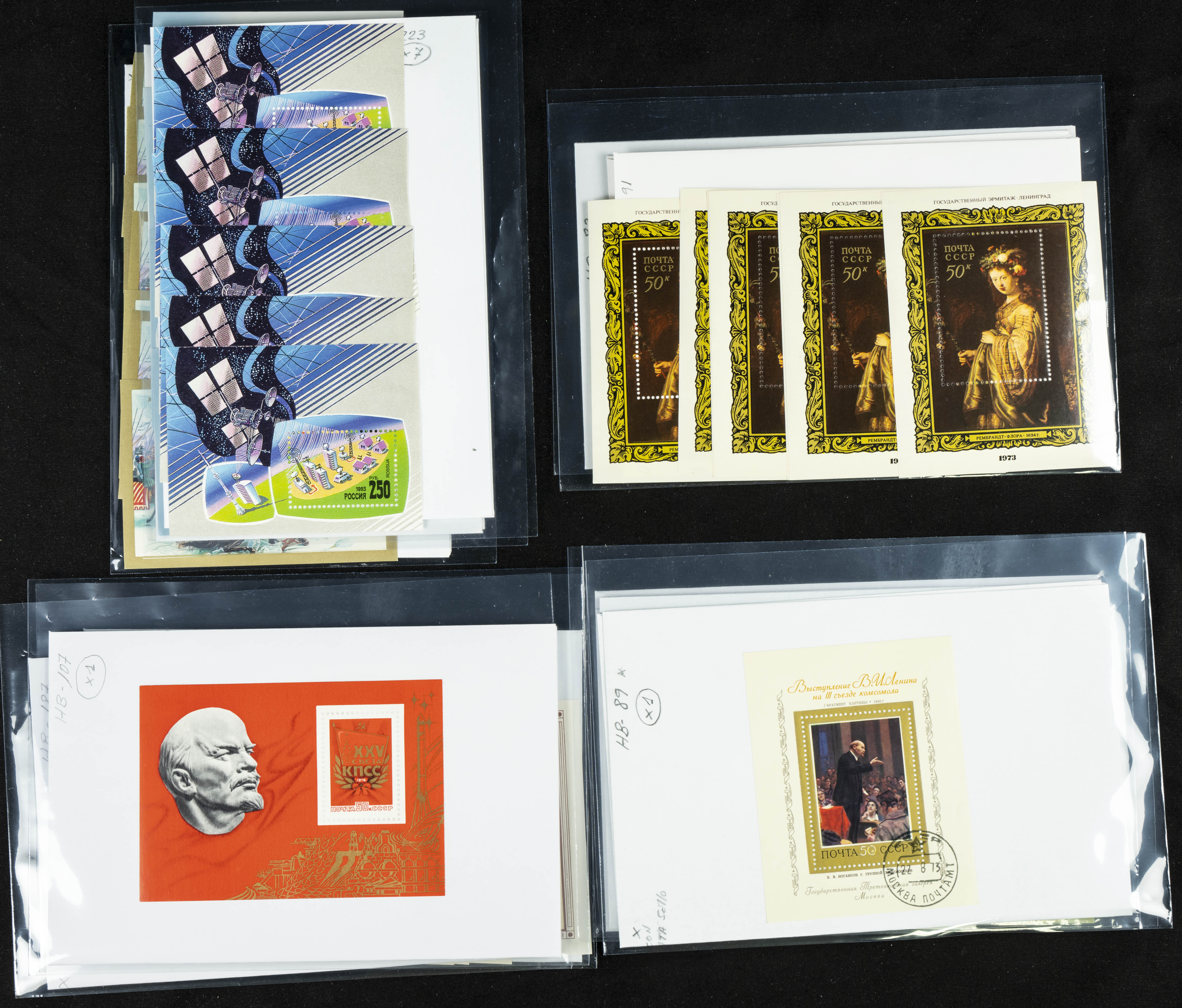 ★★(1970ca). Interesante conjunto-stock de hojas bloque de Rusia, la mayoría de los años setenta y ochenta, en nuevo y repeticiones variadas. ALTO VALOR DE CATALOGO. A EXAMINAR.