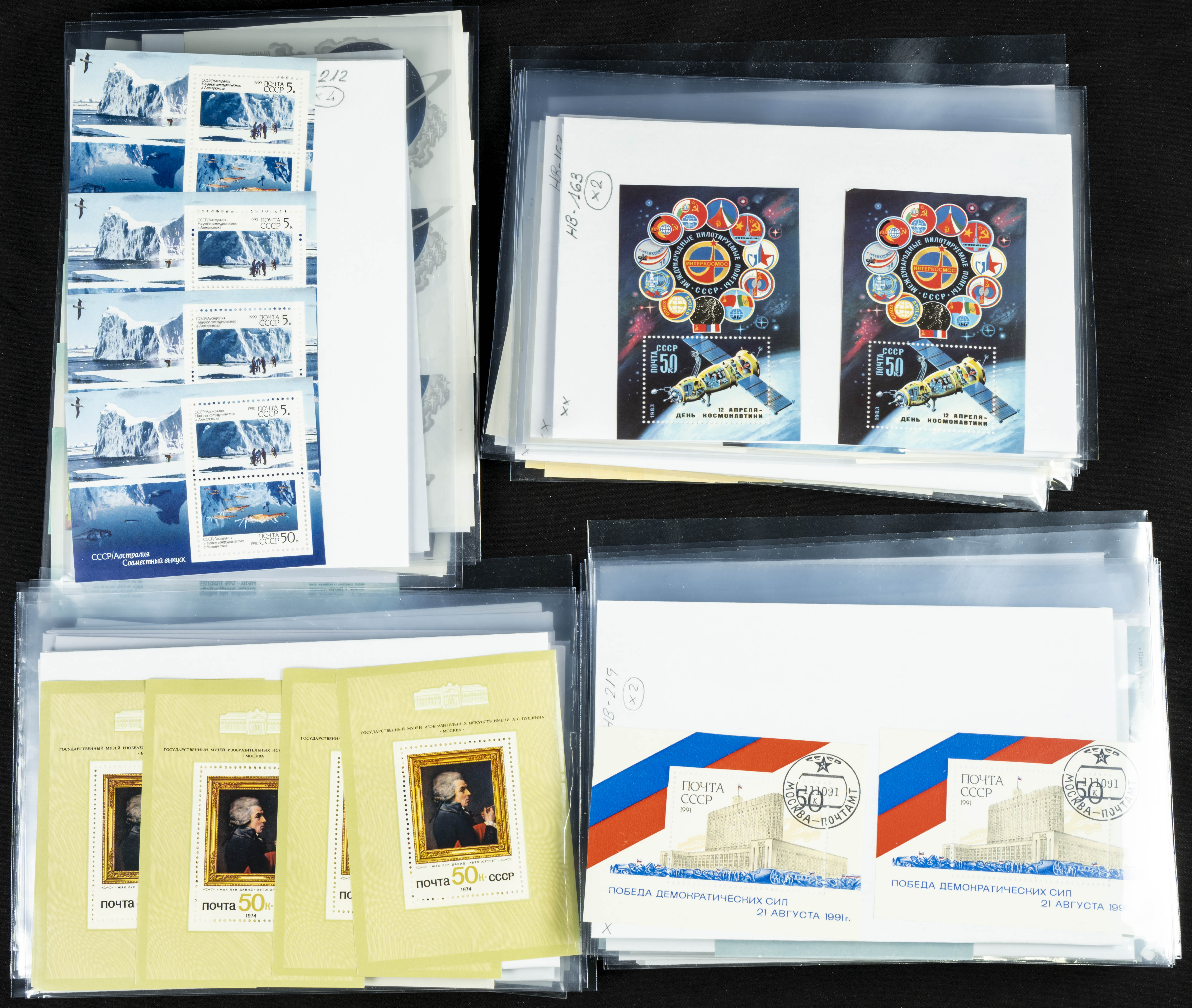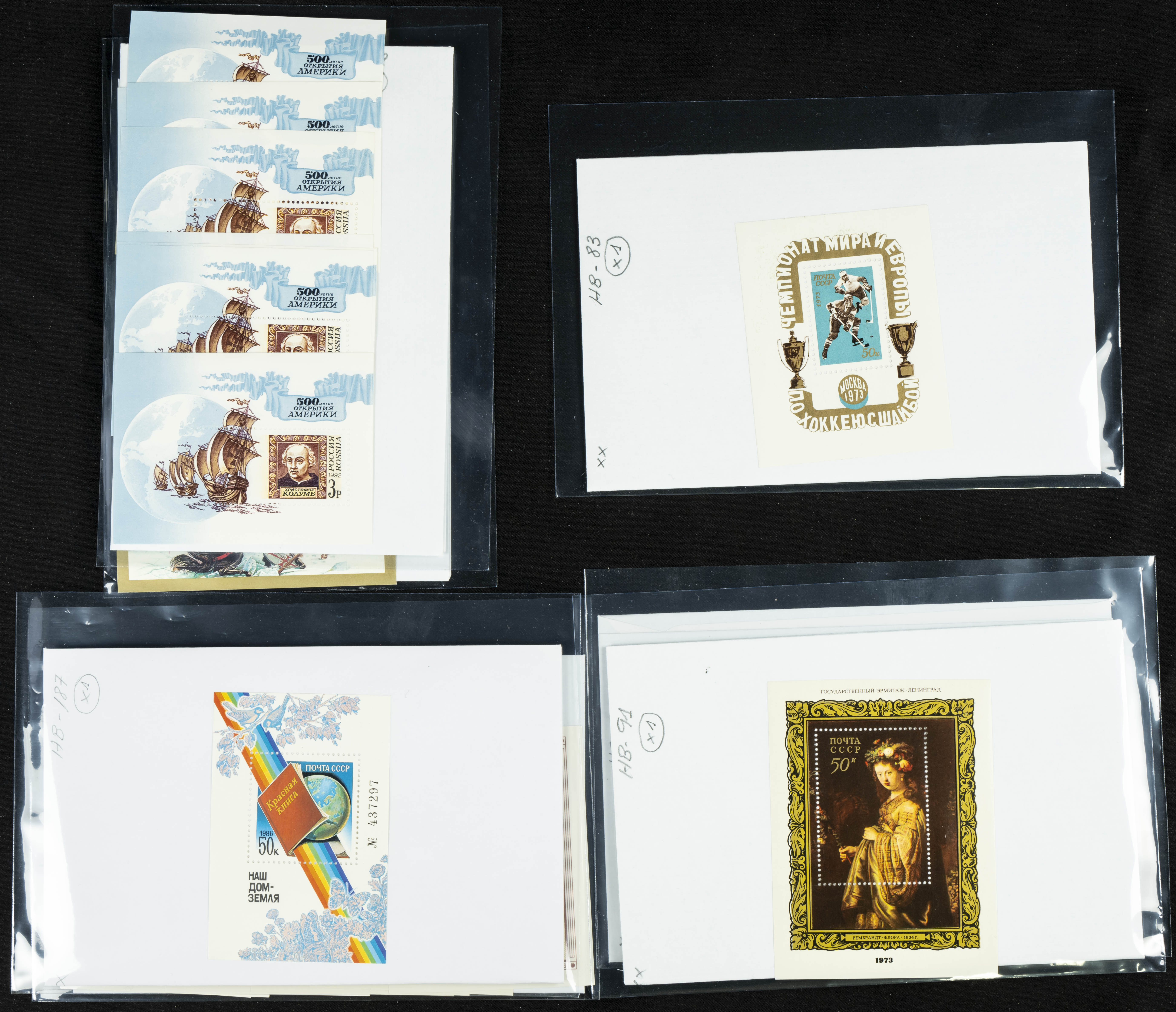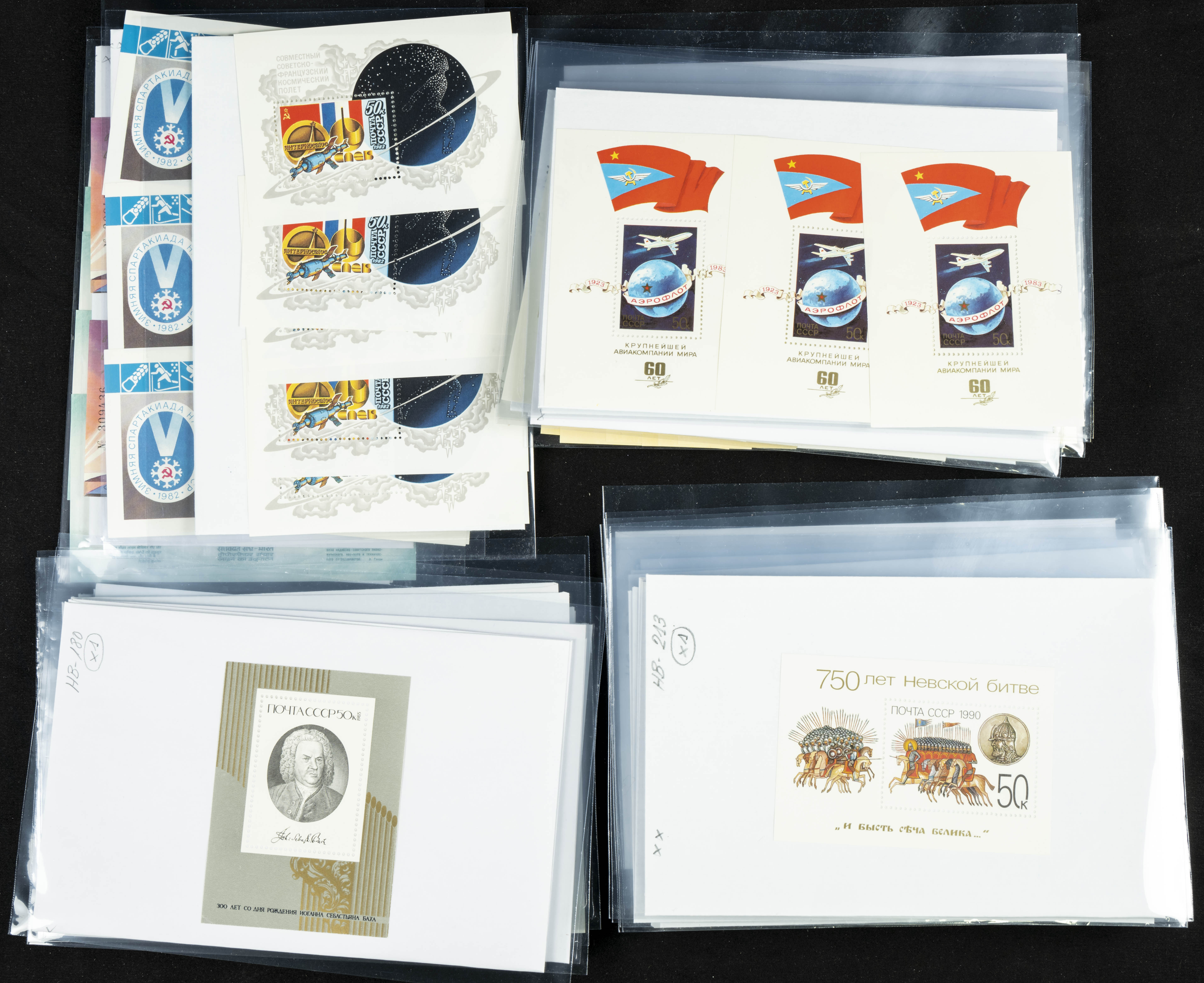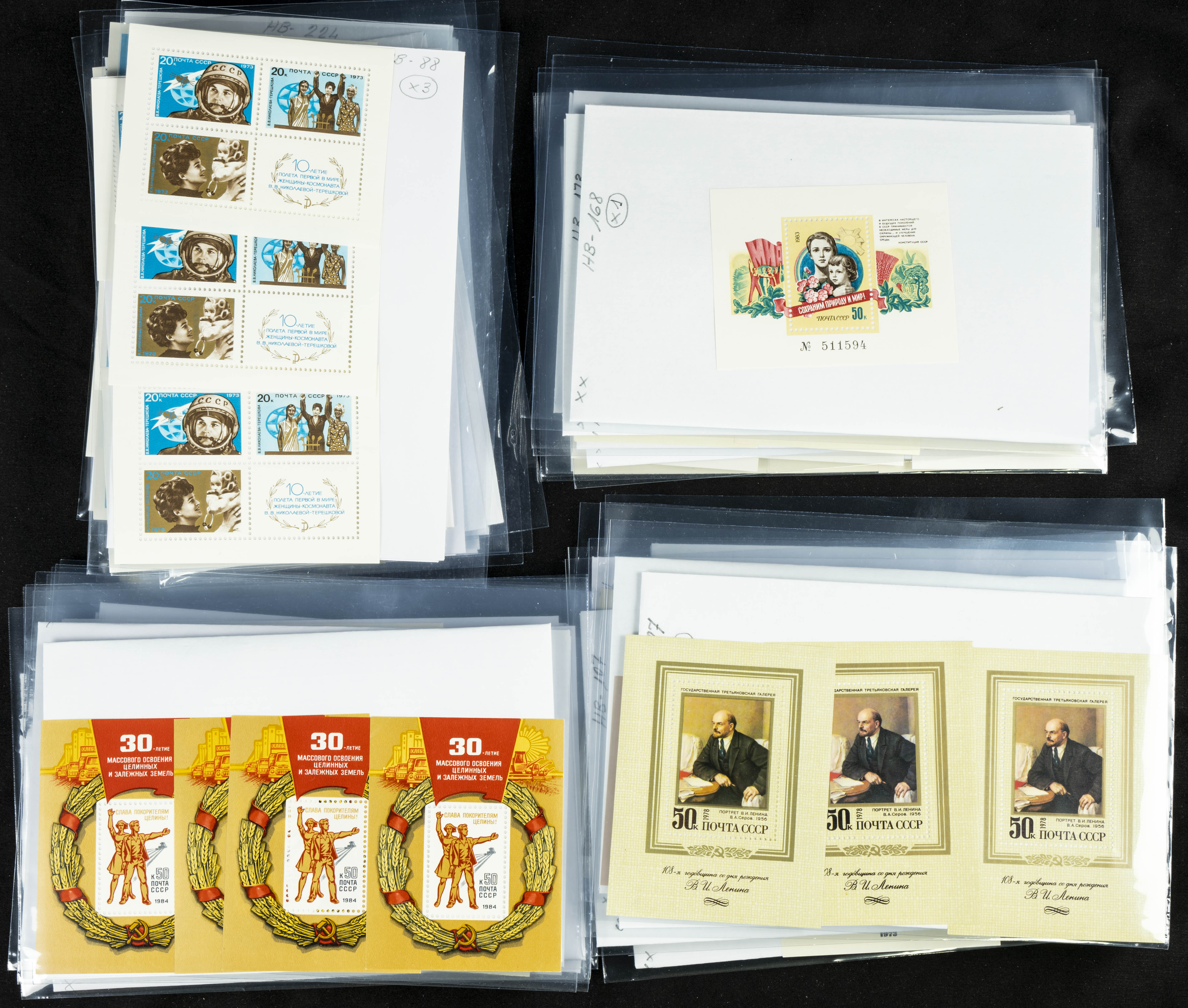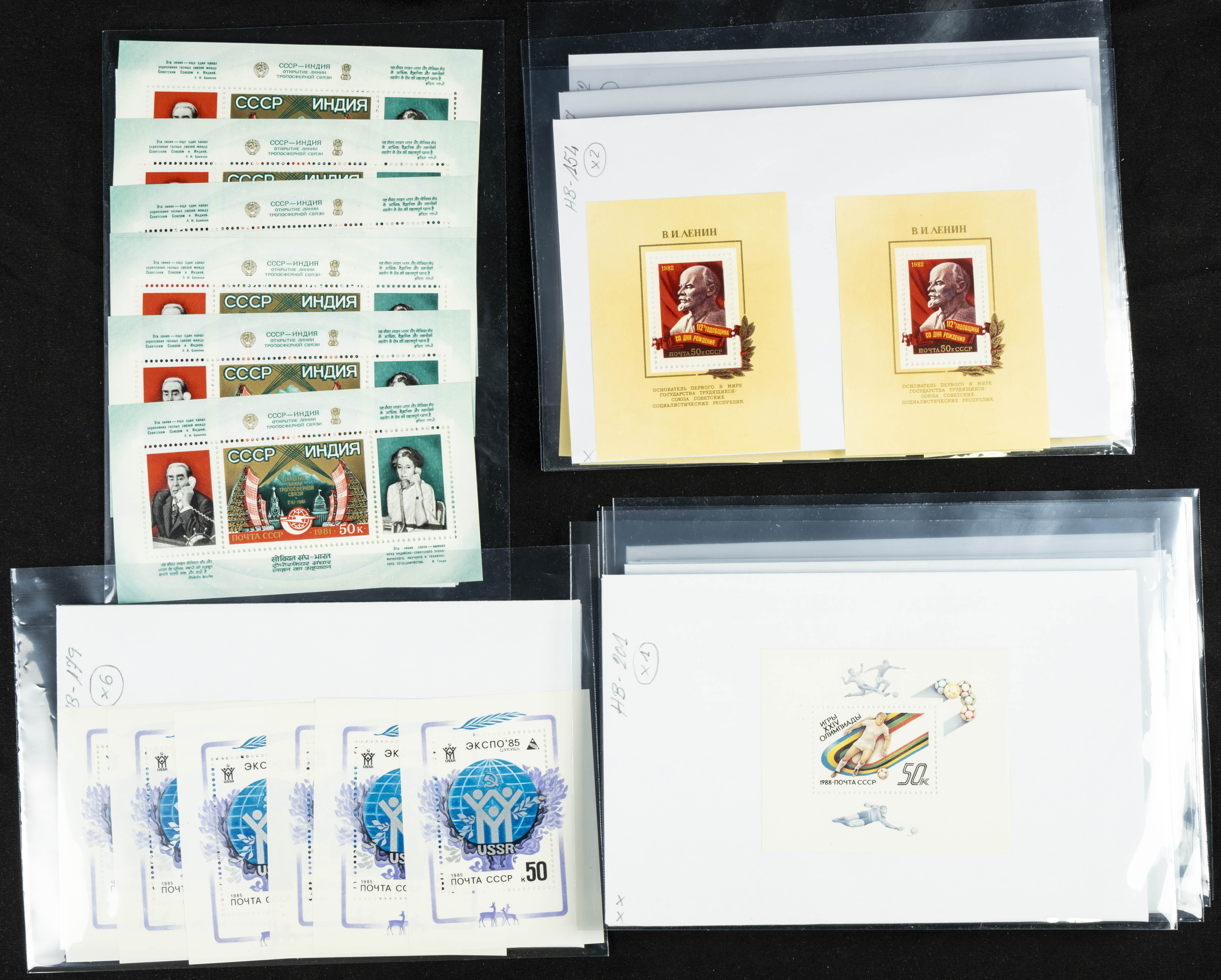 ★★(1970ca). Interesante conjunto-stock de hojas bloque de Rusia, la mayoría de los años setenta y ochenta, en nuevo y repeticiones variadas. ALTO VALOR DE CATALOGO. A EXAMINAR.