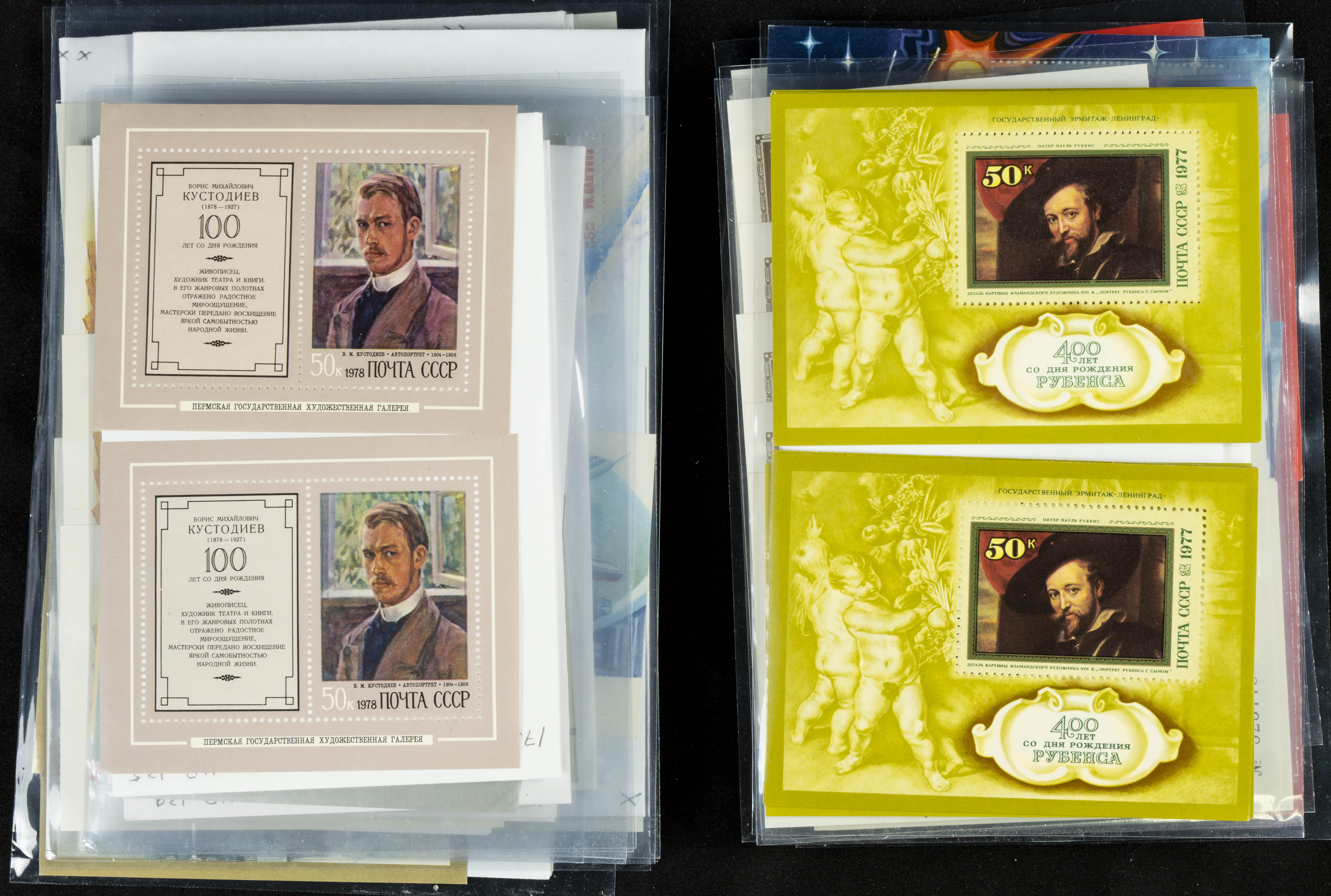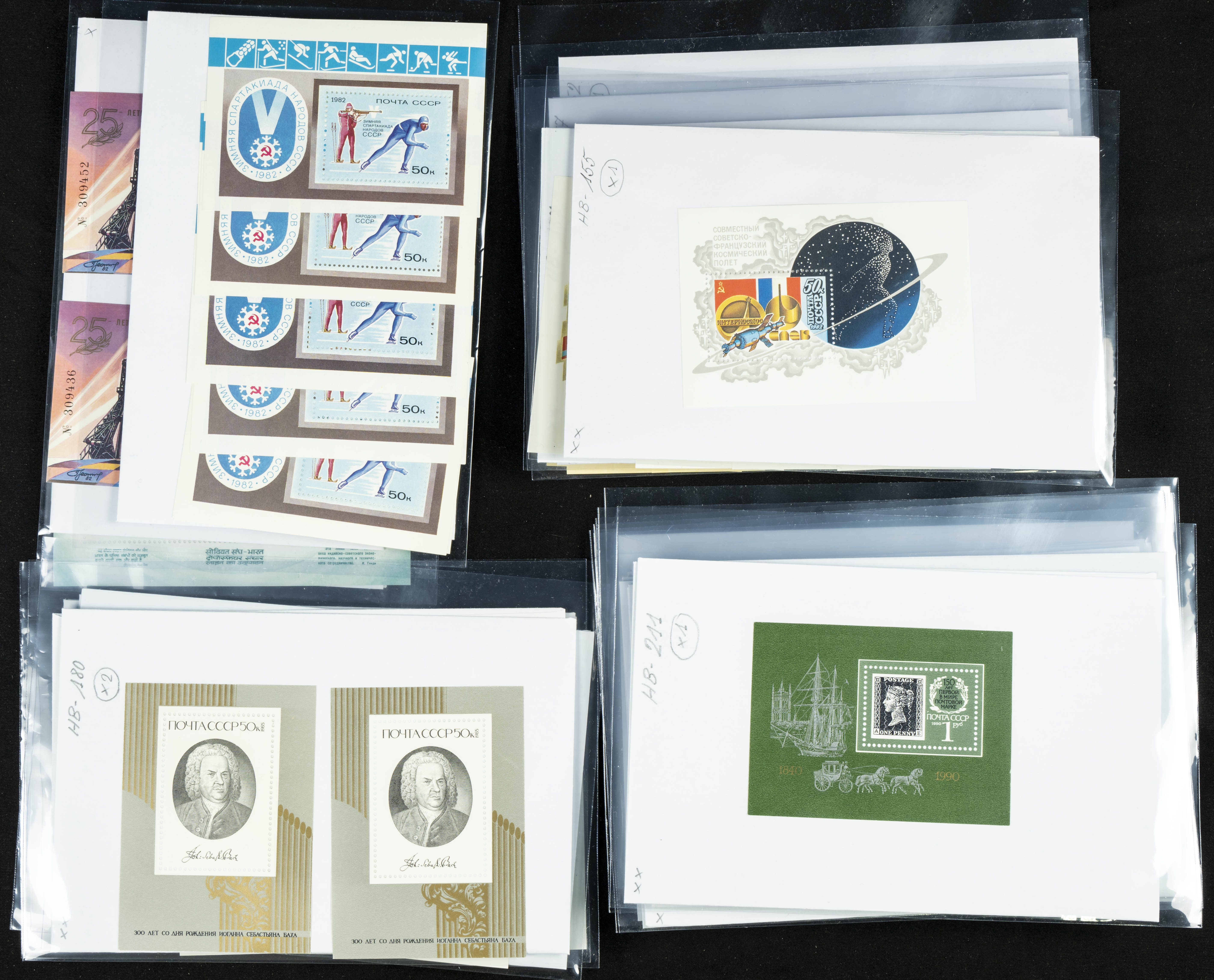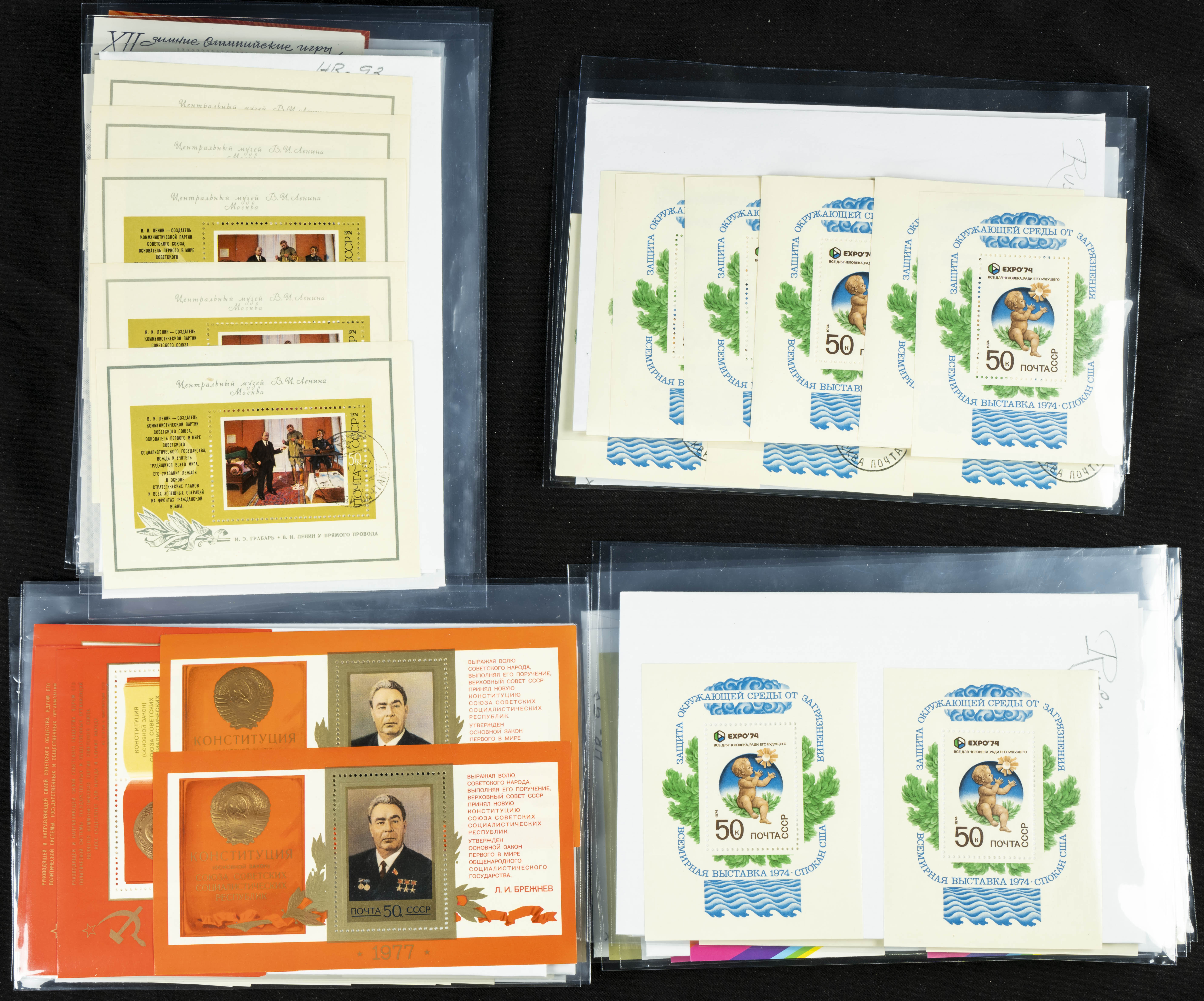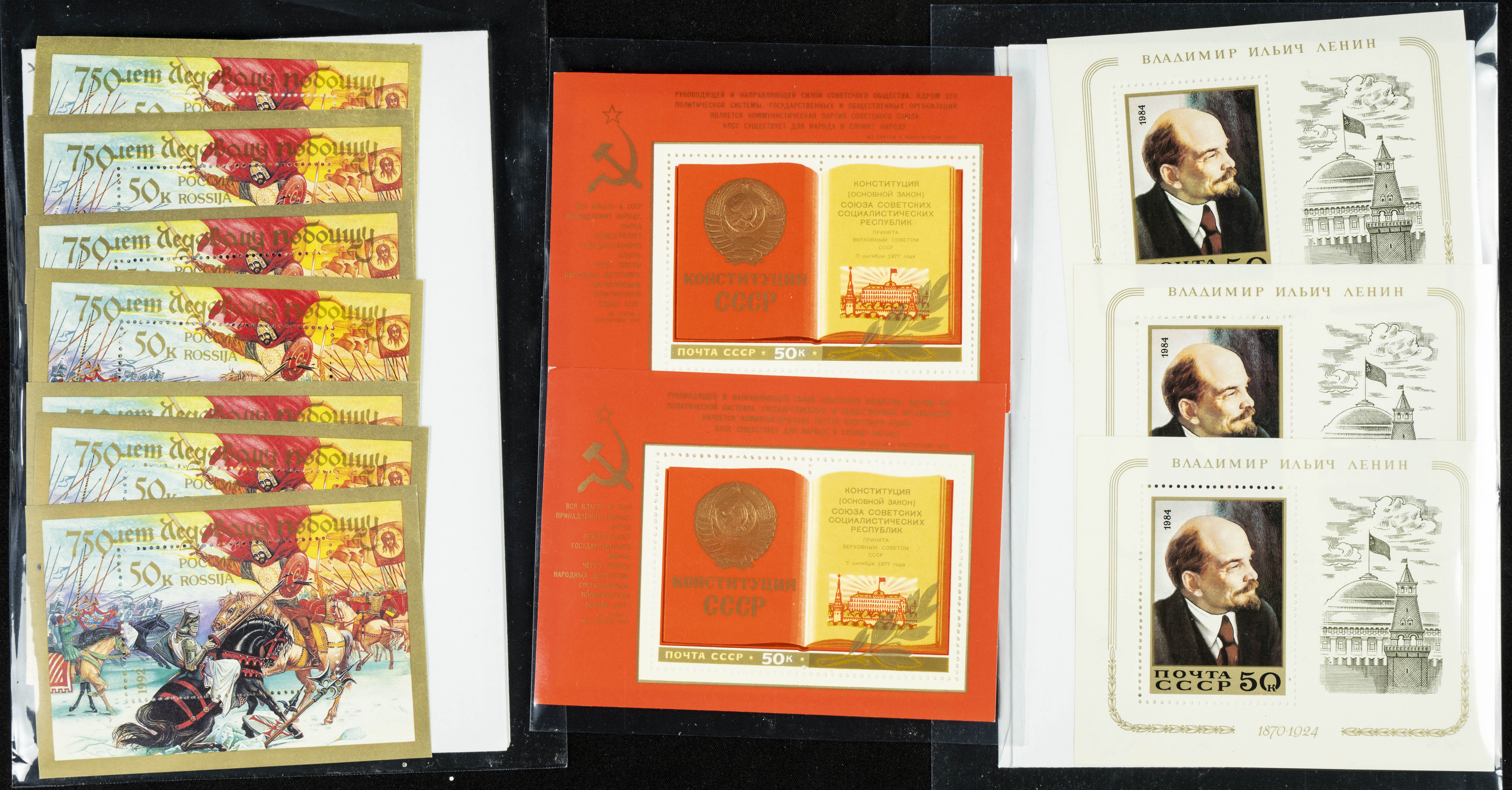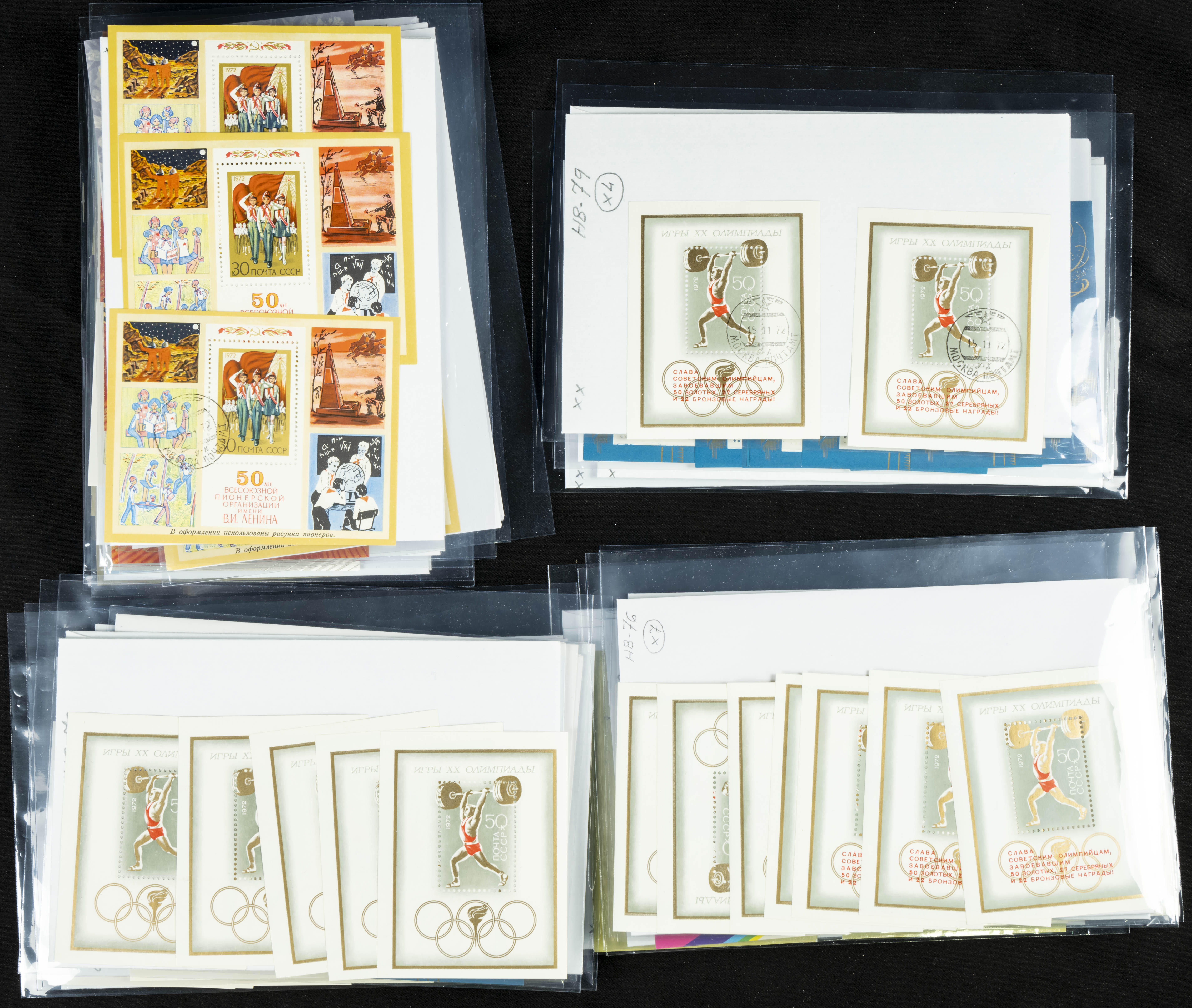★★(1970ca). Interesante conjunto-stock de hojas bloque de Rusia, la mayoría de los años setenta y ochenta, en nuevo y repeticiones variadas. ALTO VALOR DE CATALOGO. A EXAMINAR.