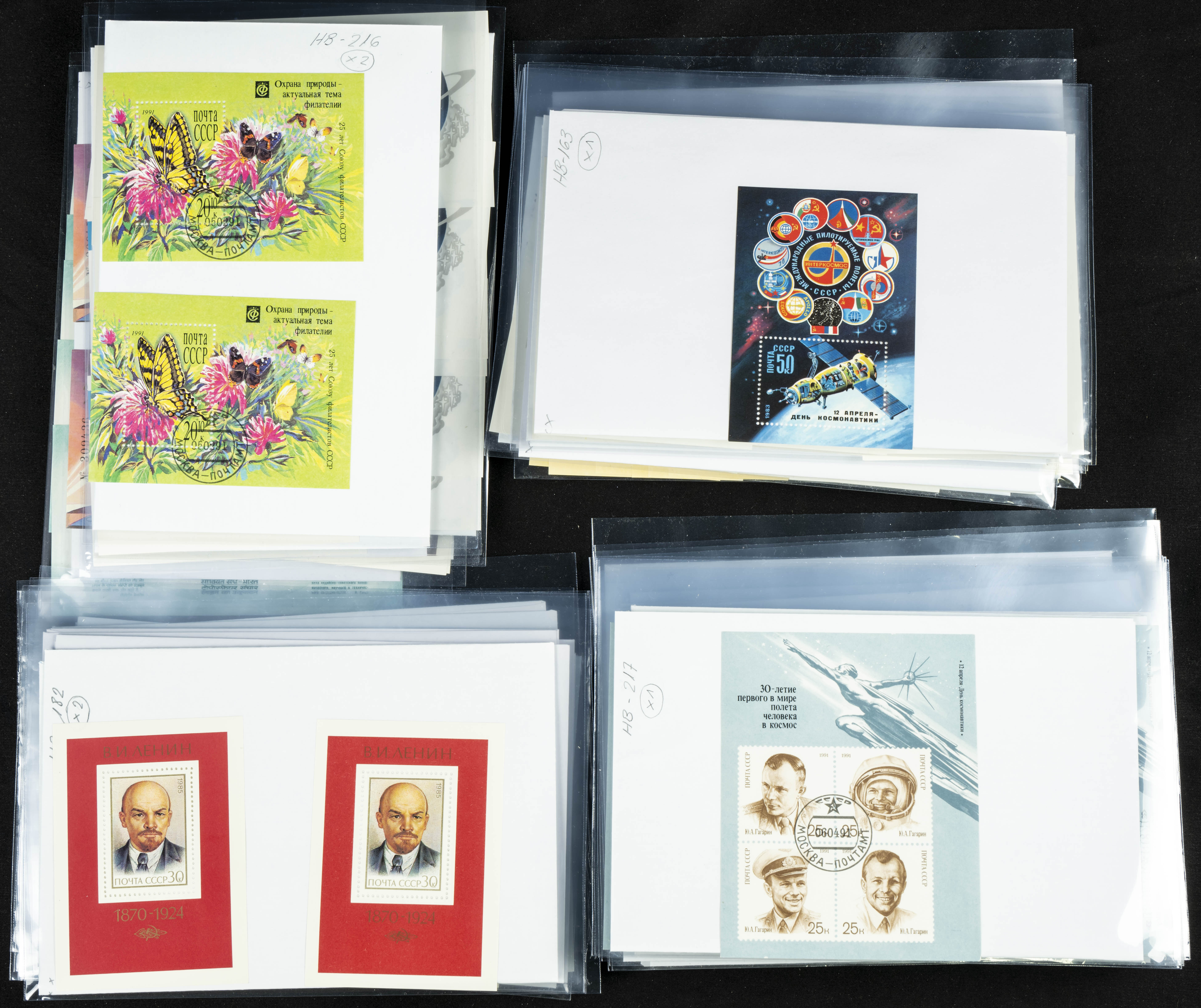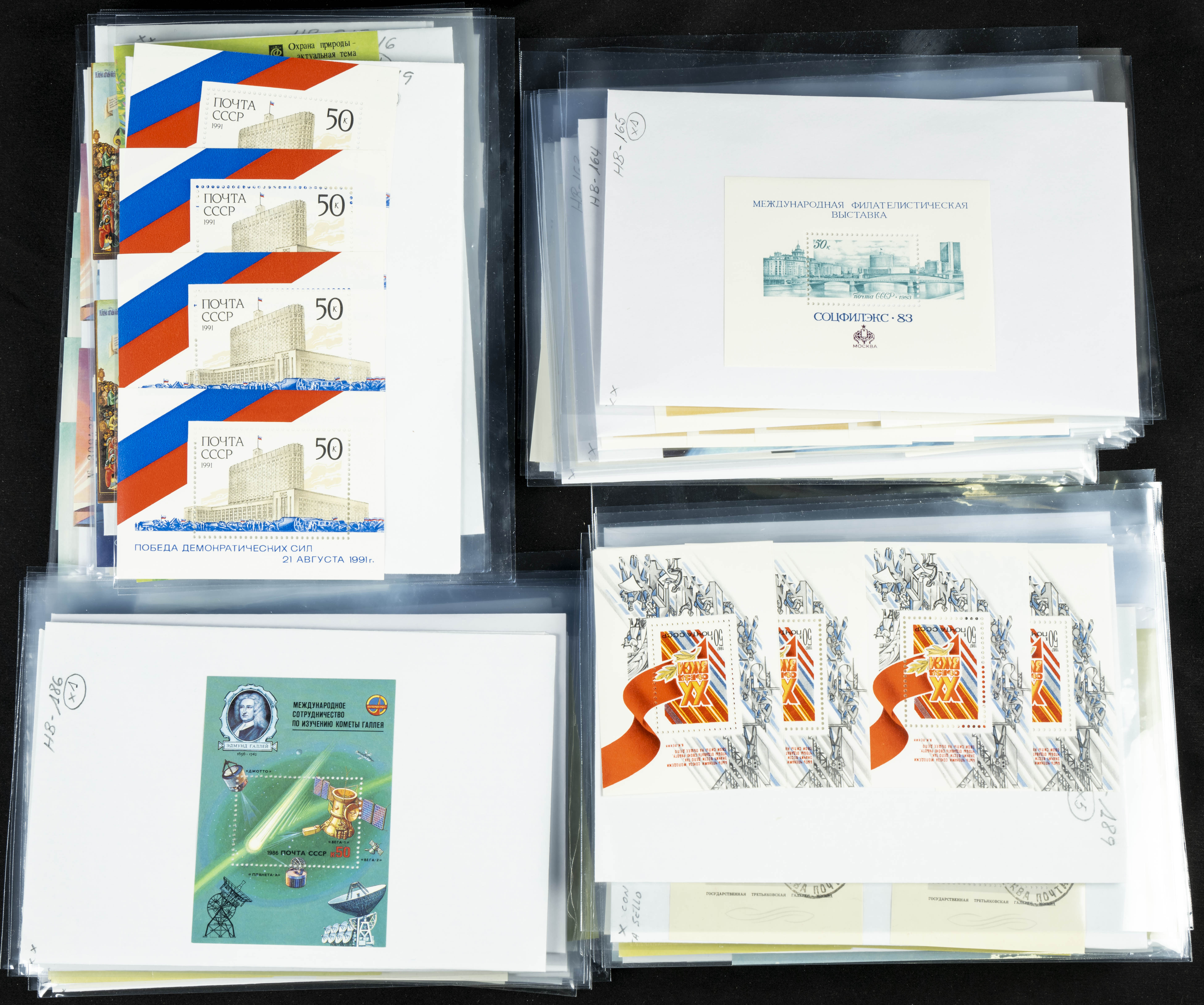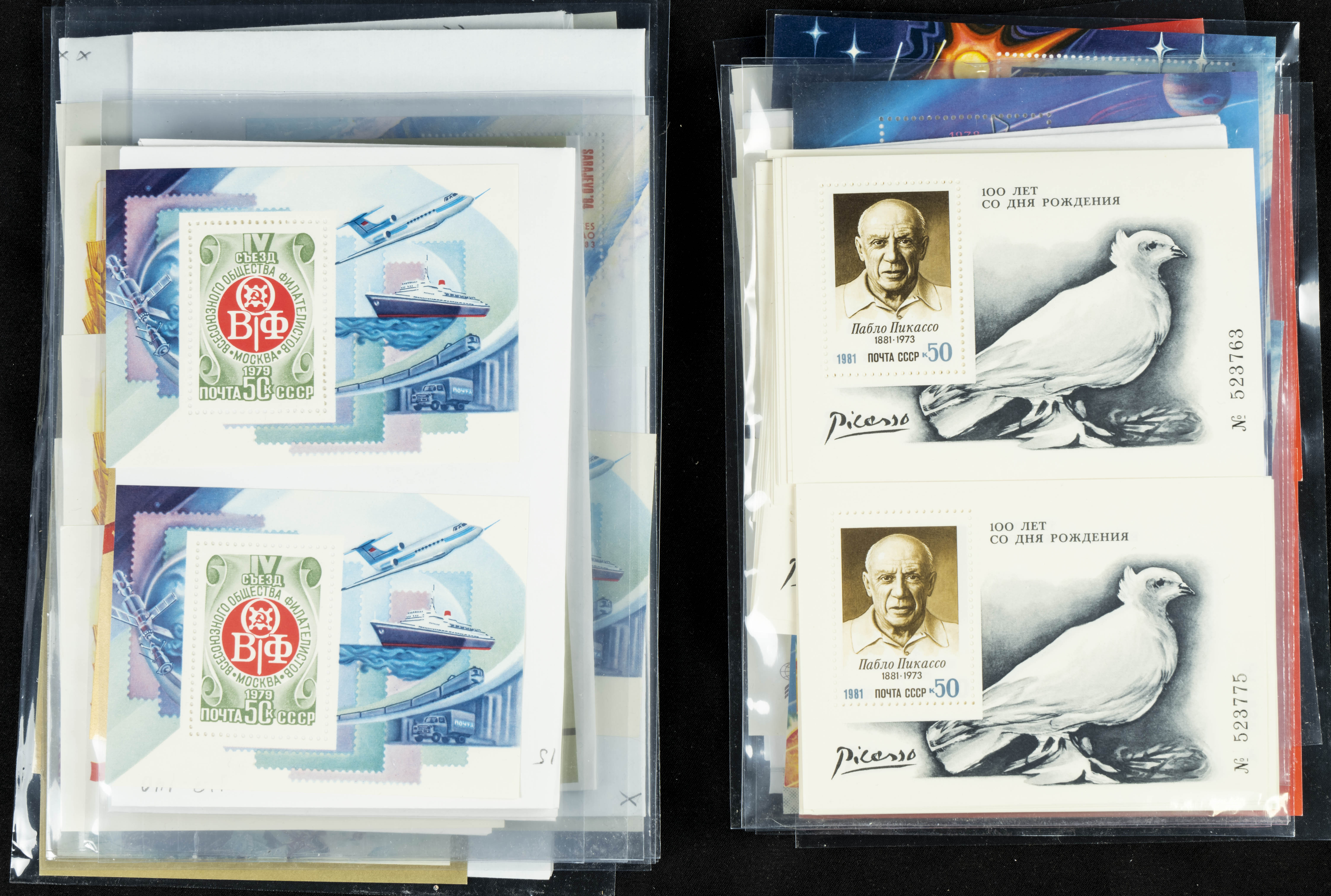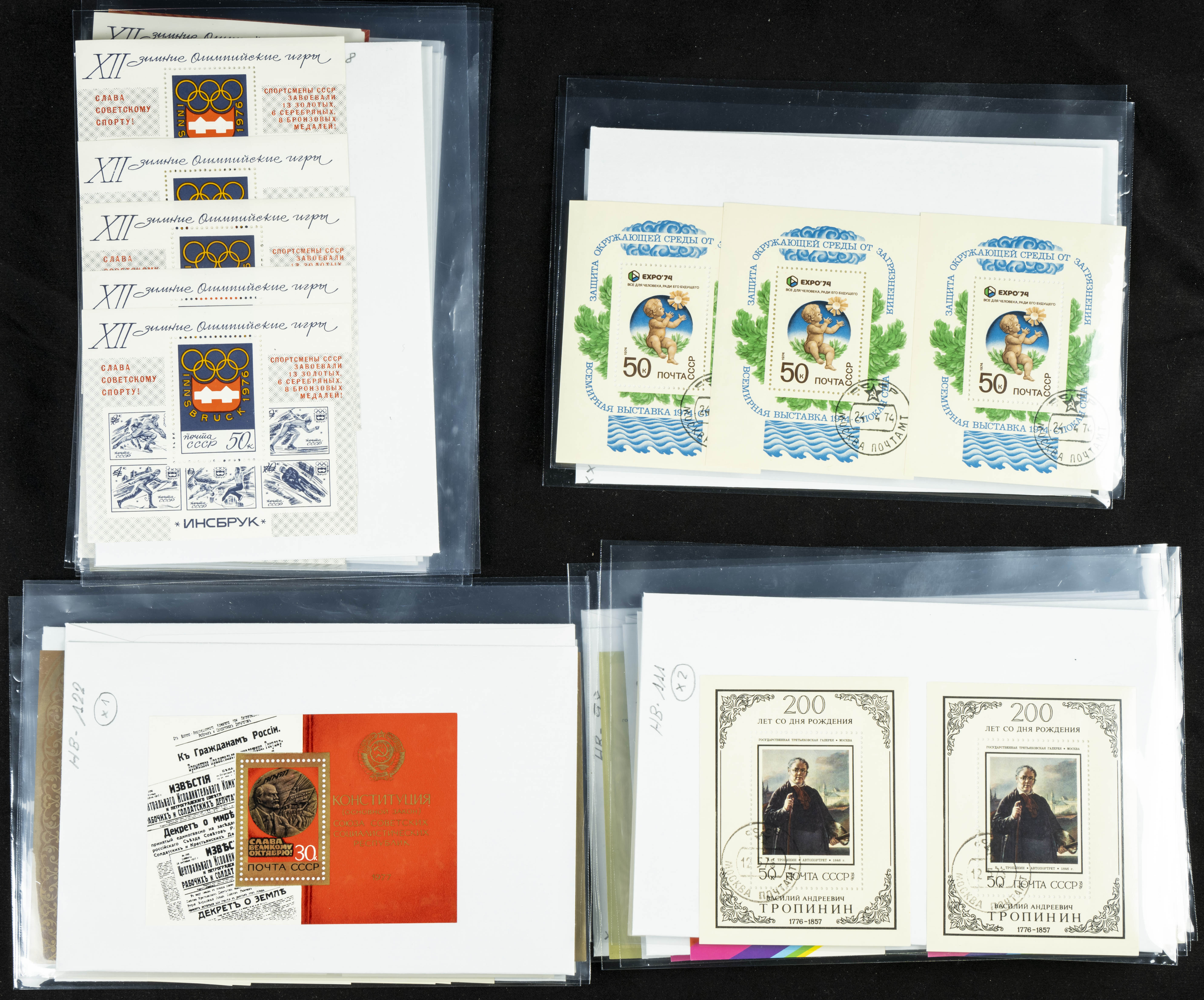 ★★(1970ca). Interesante conjunto-stock de hojas bloque de Rusia, la mayoría de los años setenta y ochenta, en nuevo y repeticiones variadas. ALTO VALOR DE CATALOGO. A EXAMINAR.