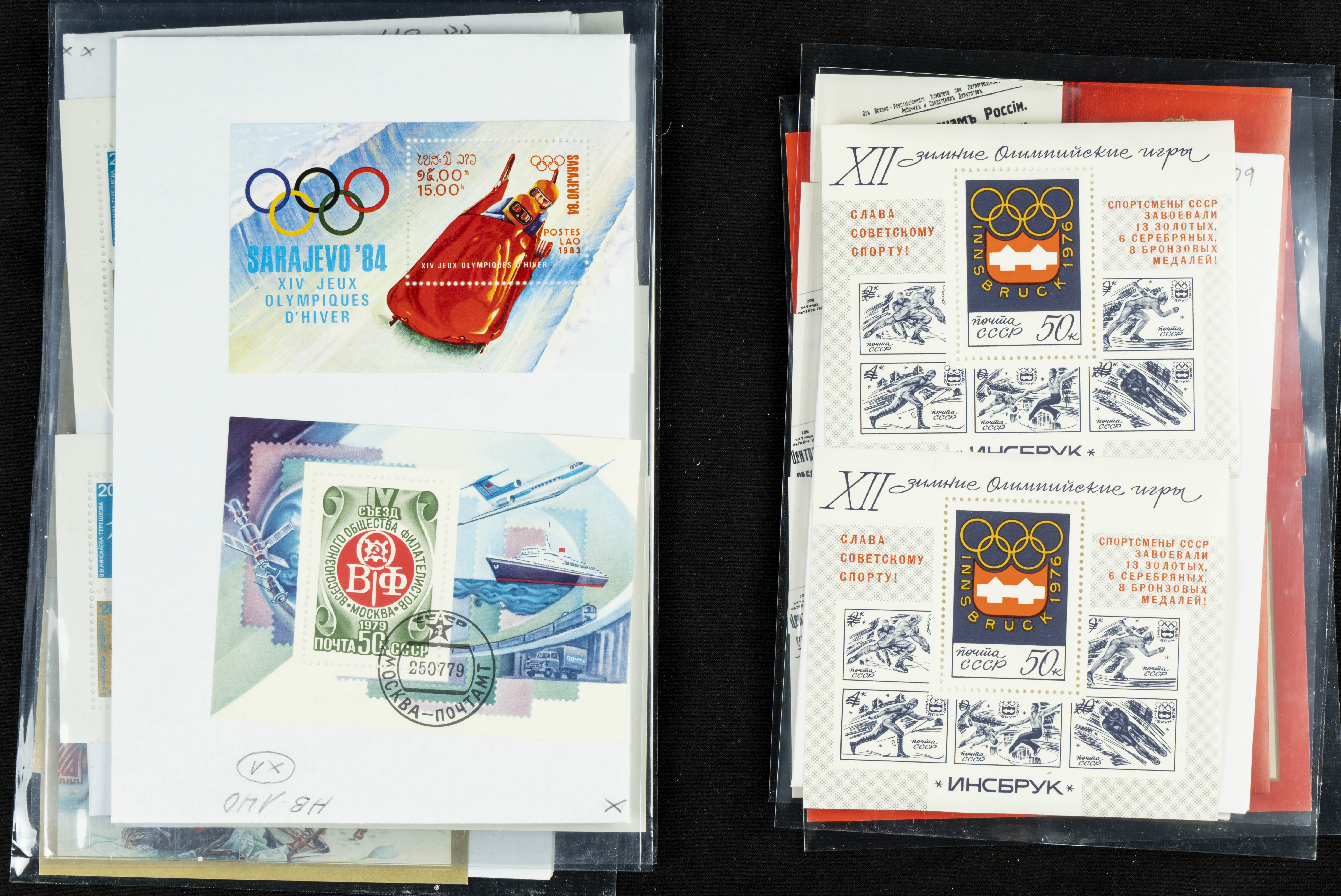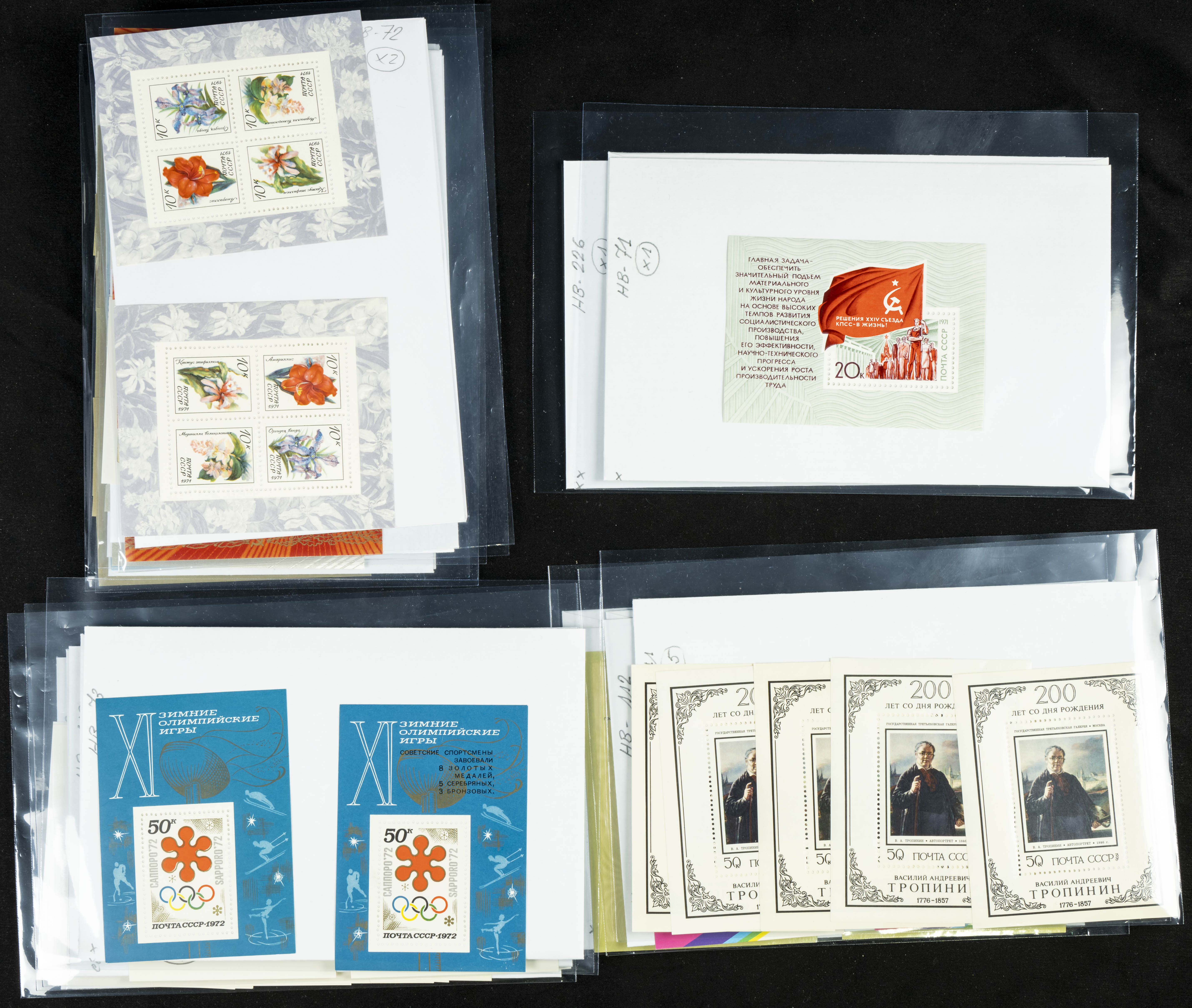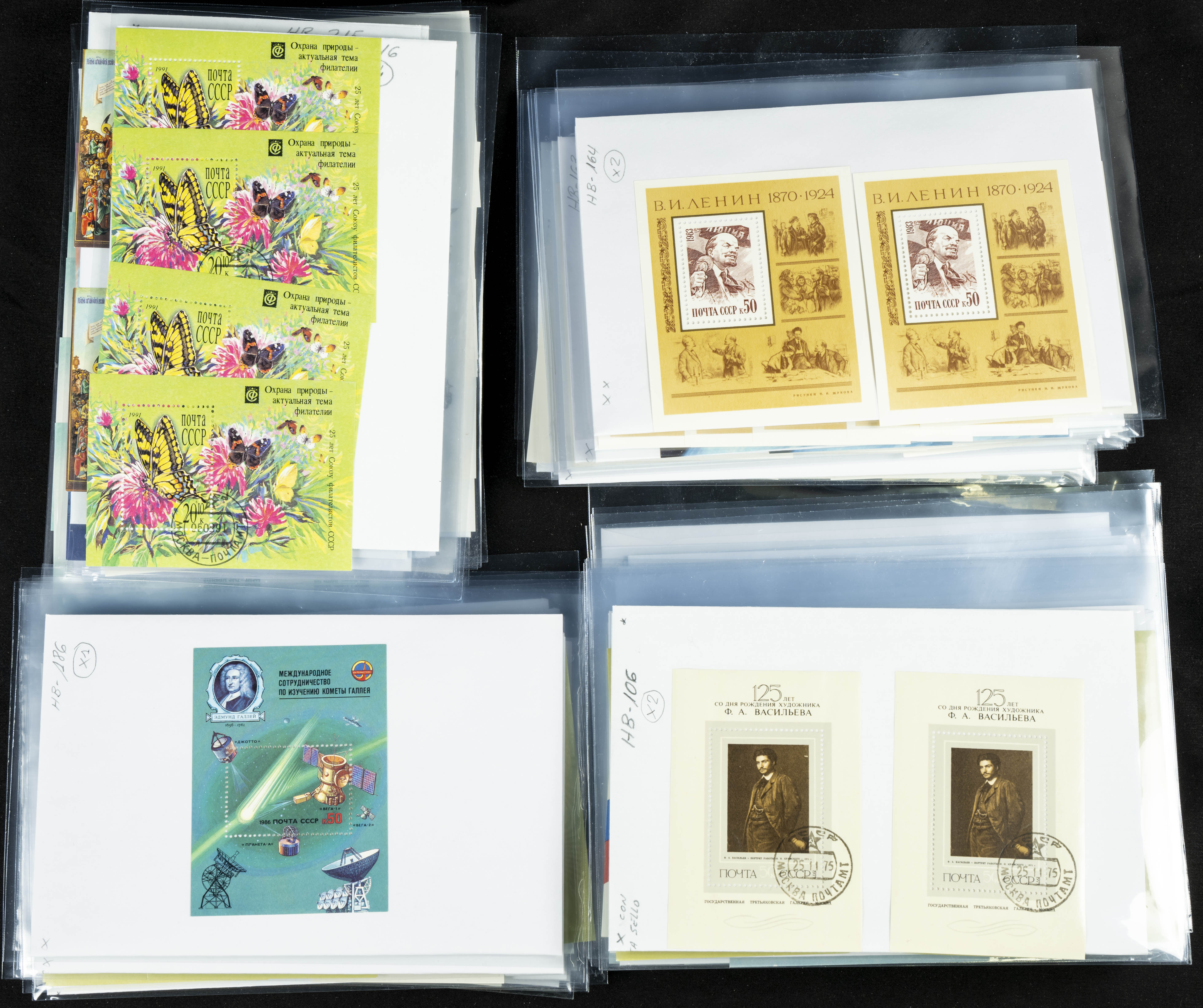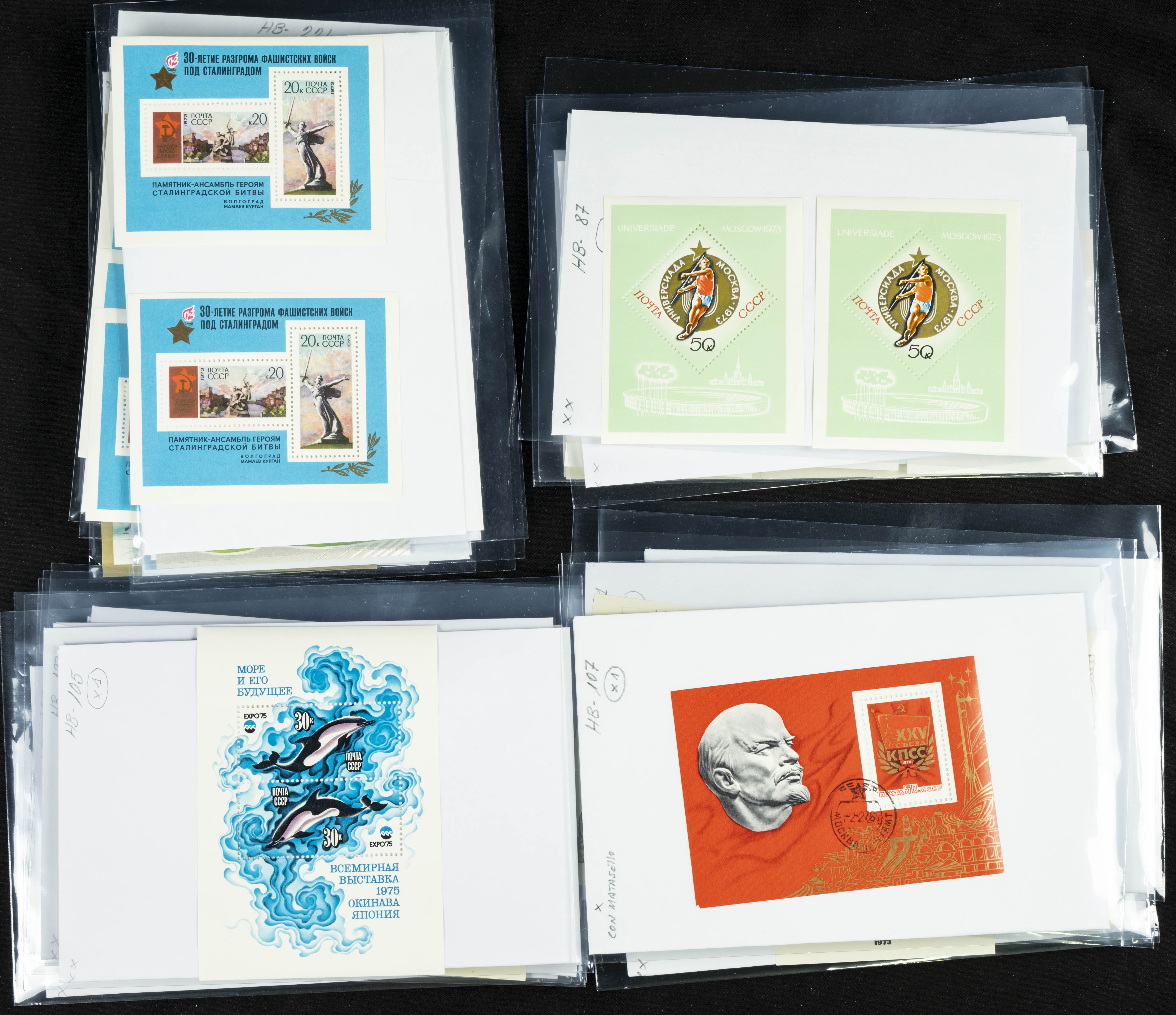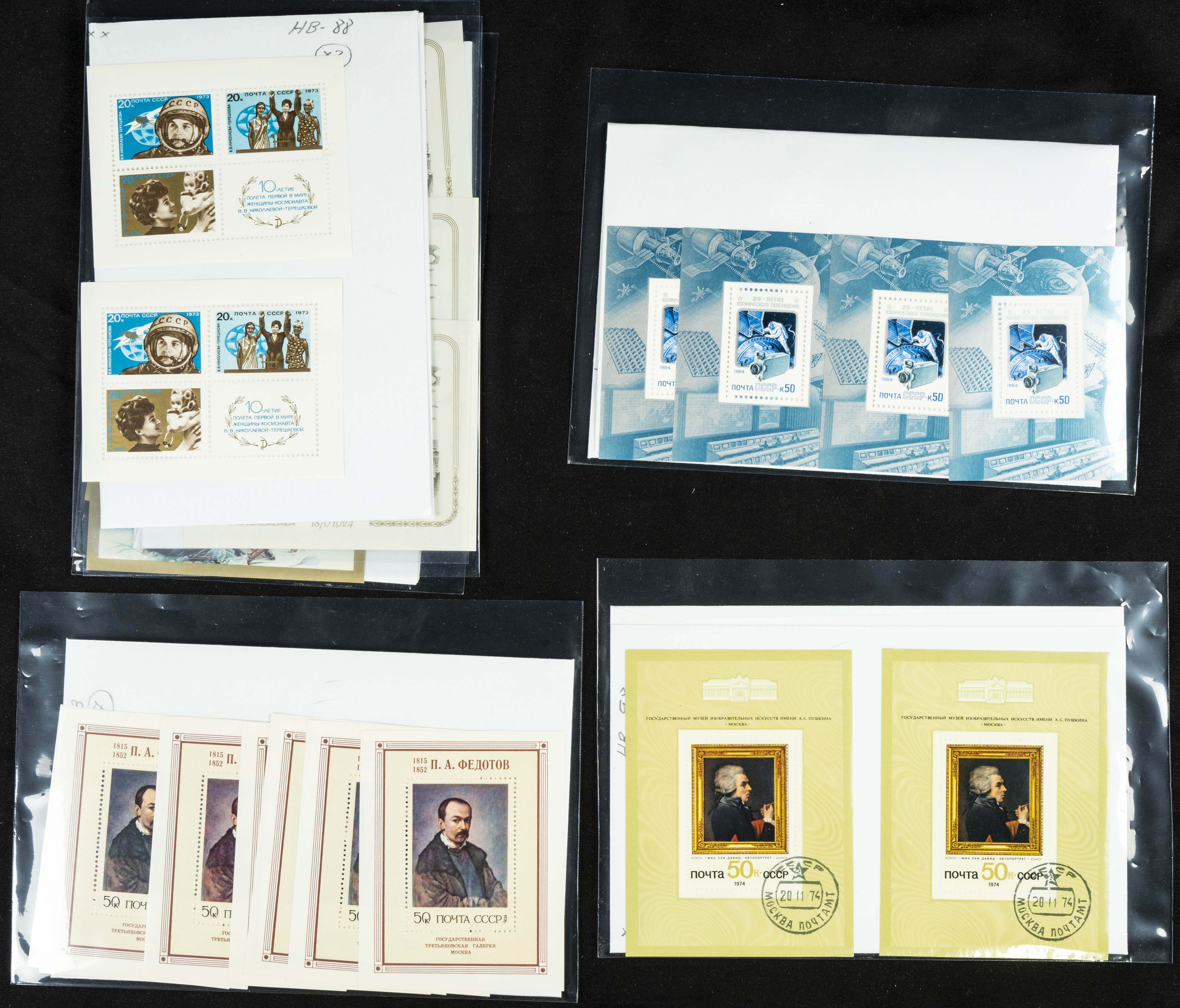★★(1970ca). Interesante conjunto-stock de hojas bloque de Rusia, la mayoría de los años setenta y ochenta, en nuevo y repeticiones variadas. ALTO VALOR DE CATALOGO. A EXAMINAR.