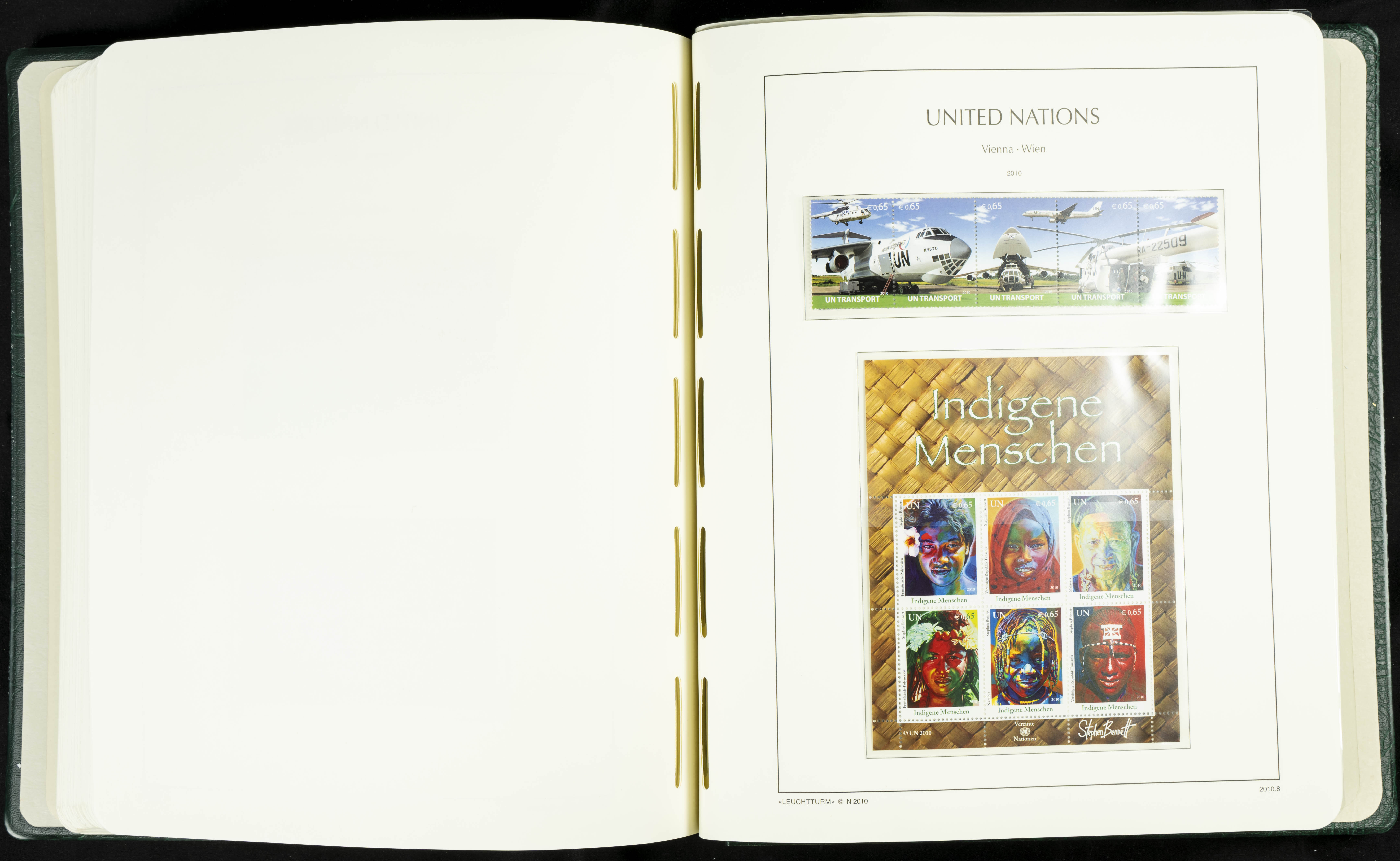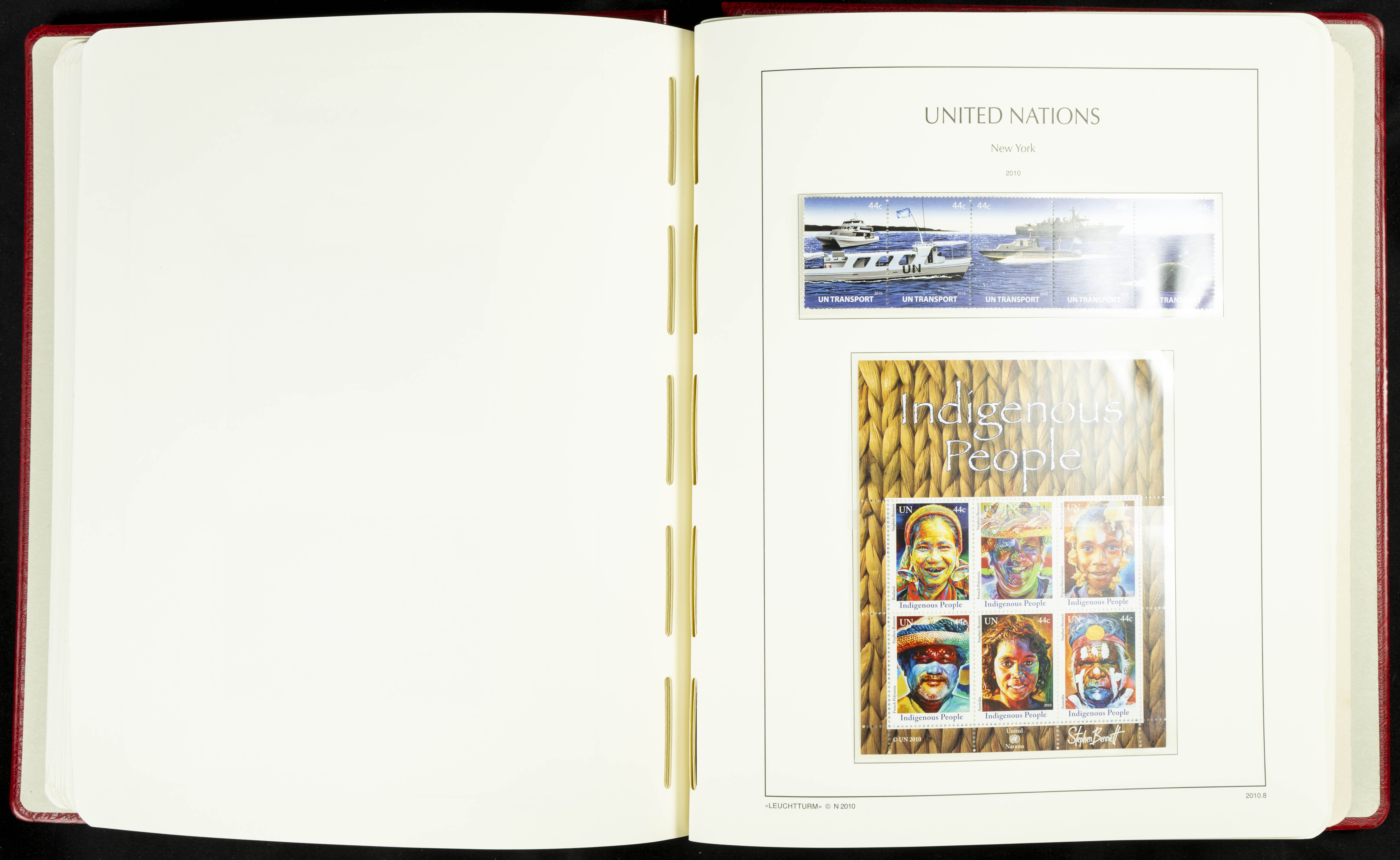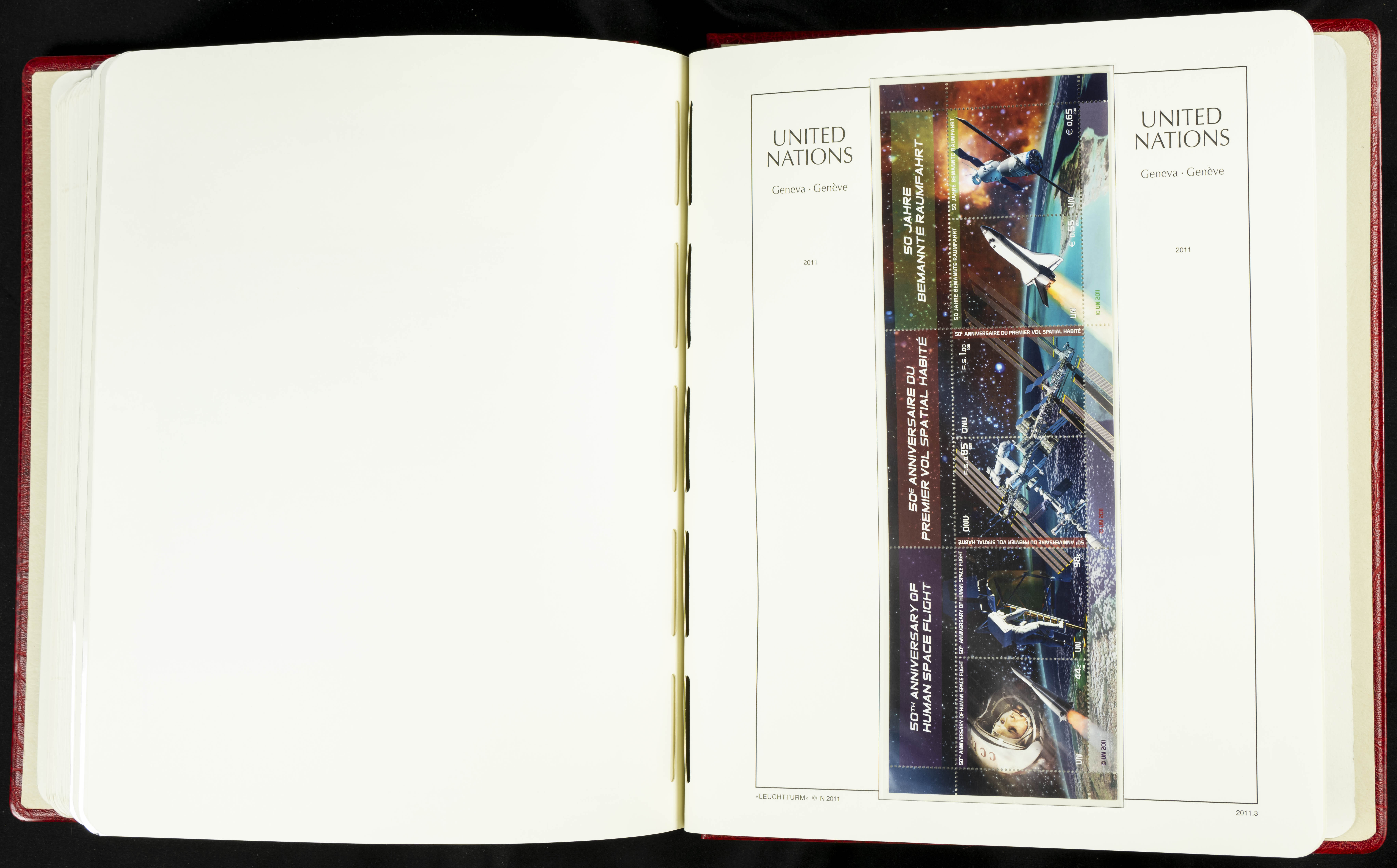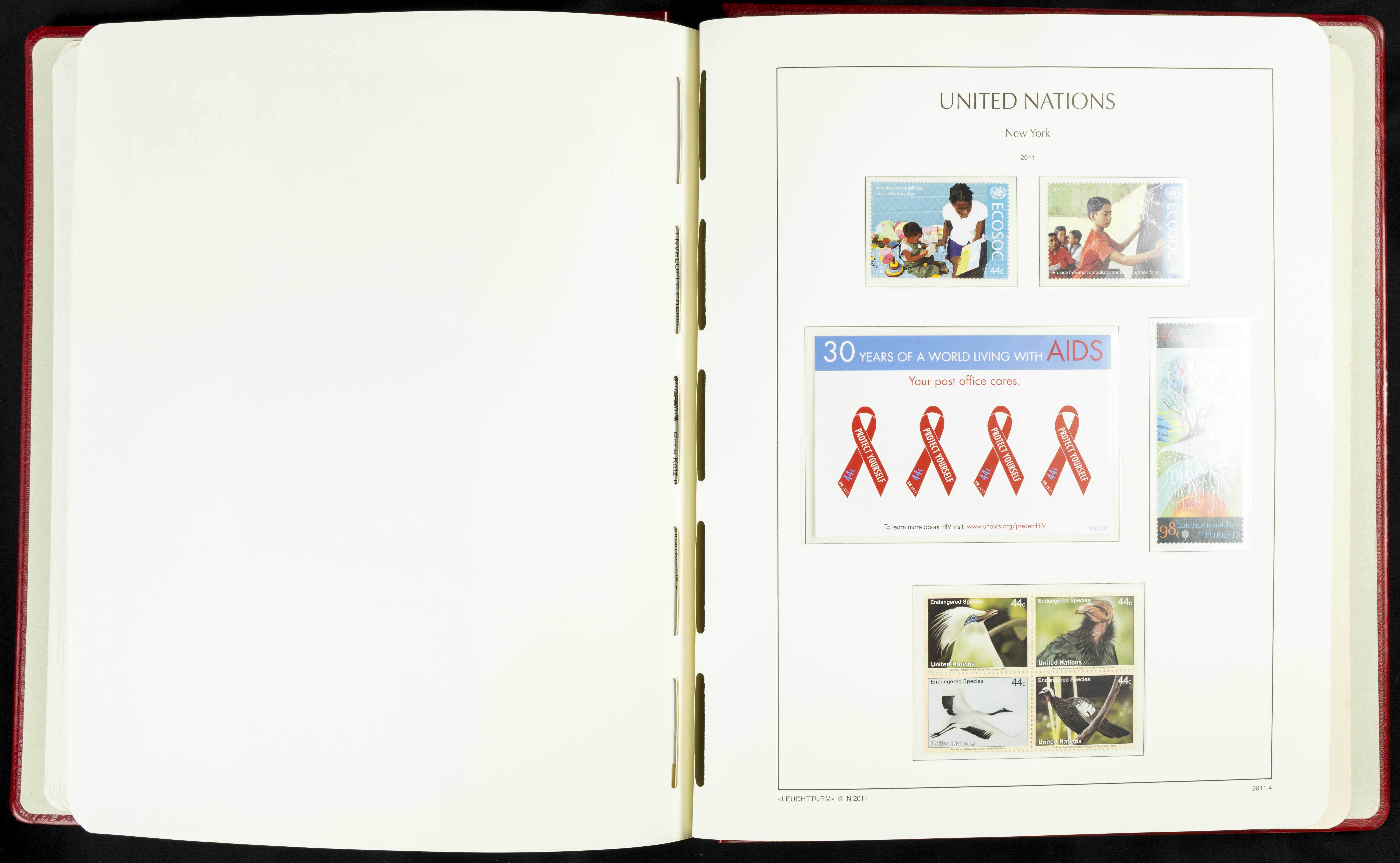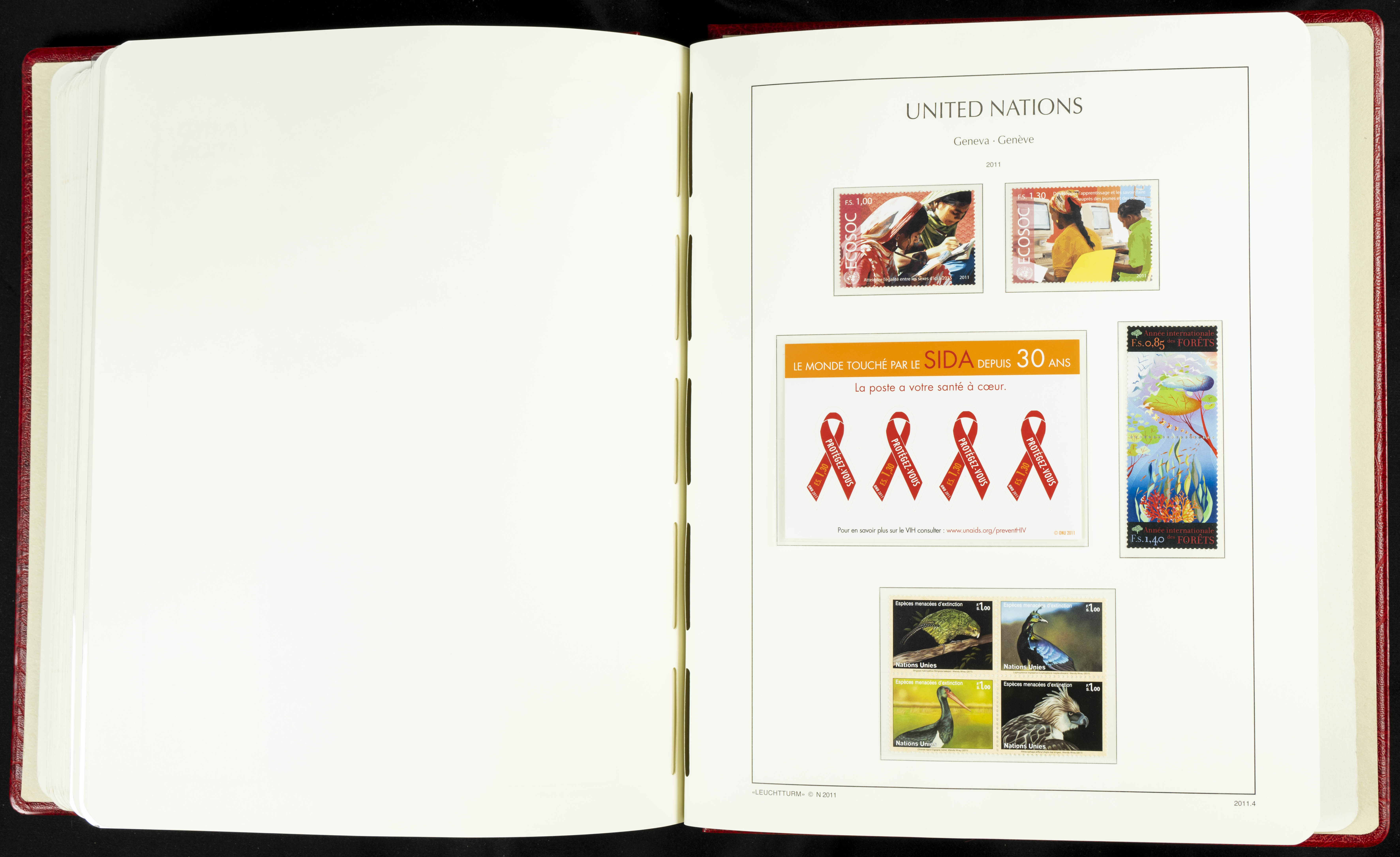 ★★(1951ca). Colección completa de Naciones Unidas (Nueva York, Ginebra y Viena) entre 1951 y 2011, en nuevo y sin fijasellos (montada en álbumes Faro). ALTO VALOR DE CATALOGO. A EXAMINAR.