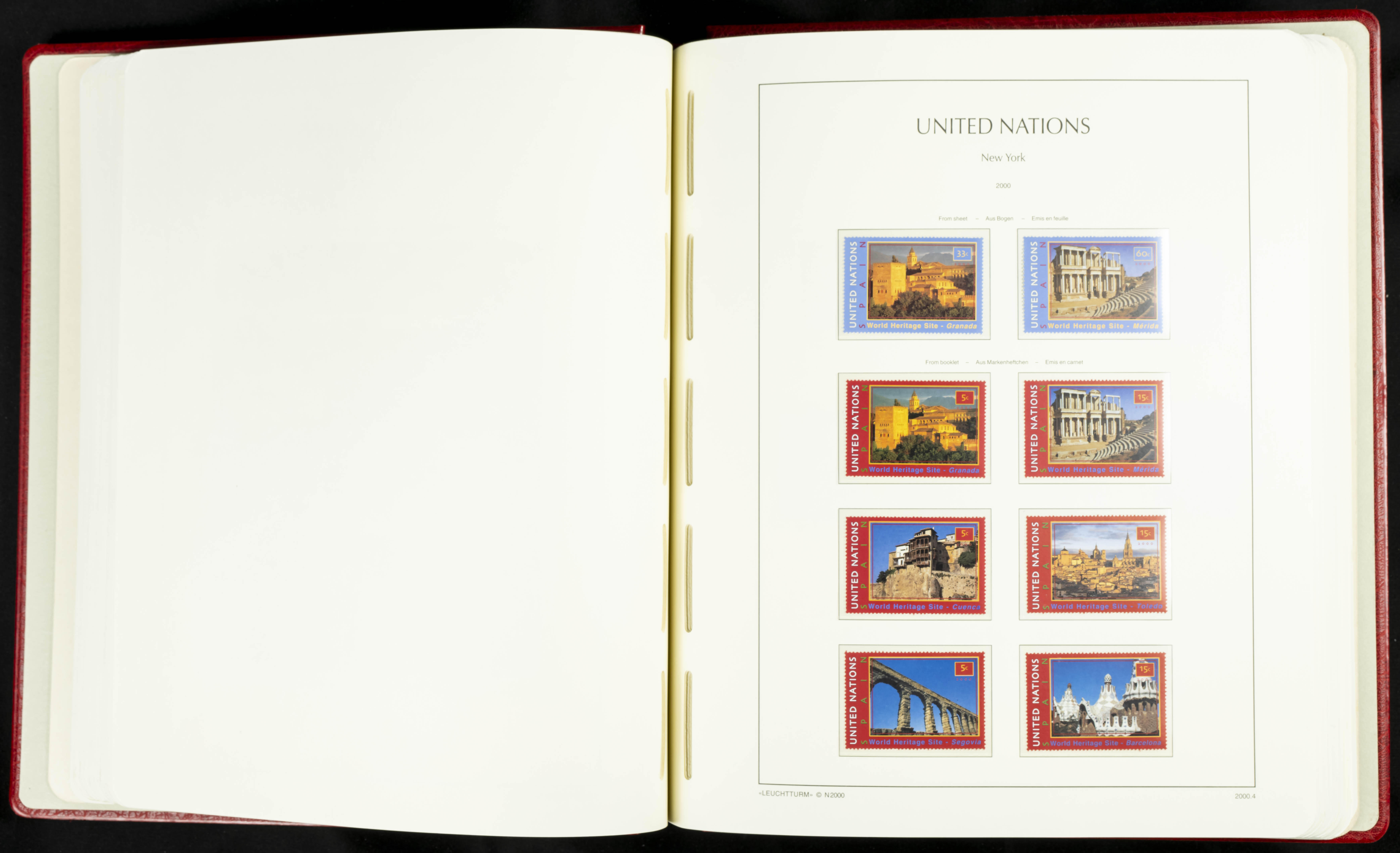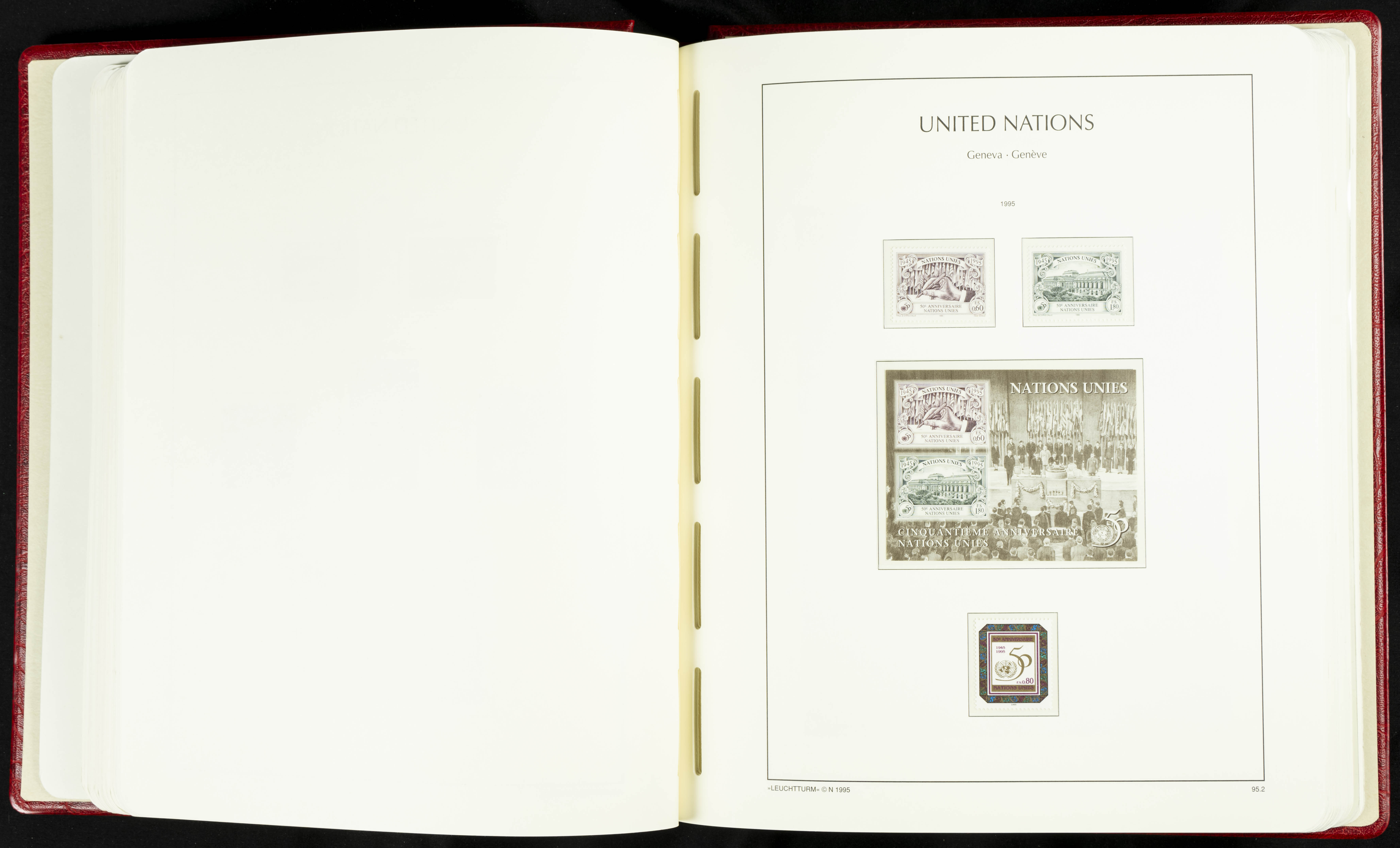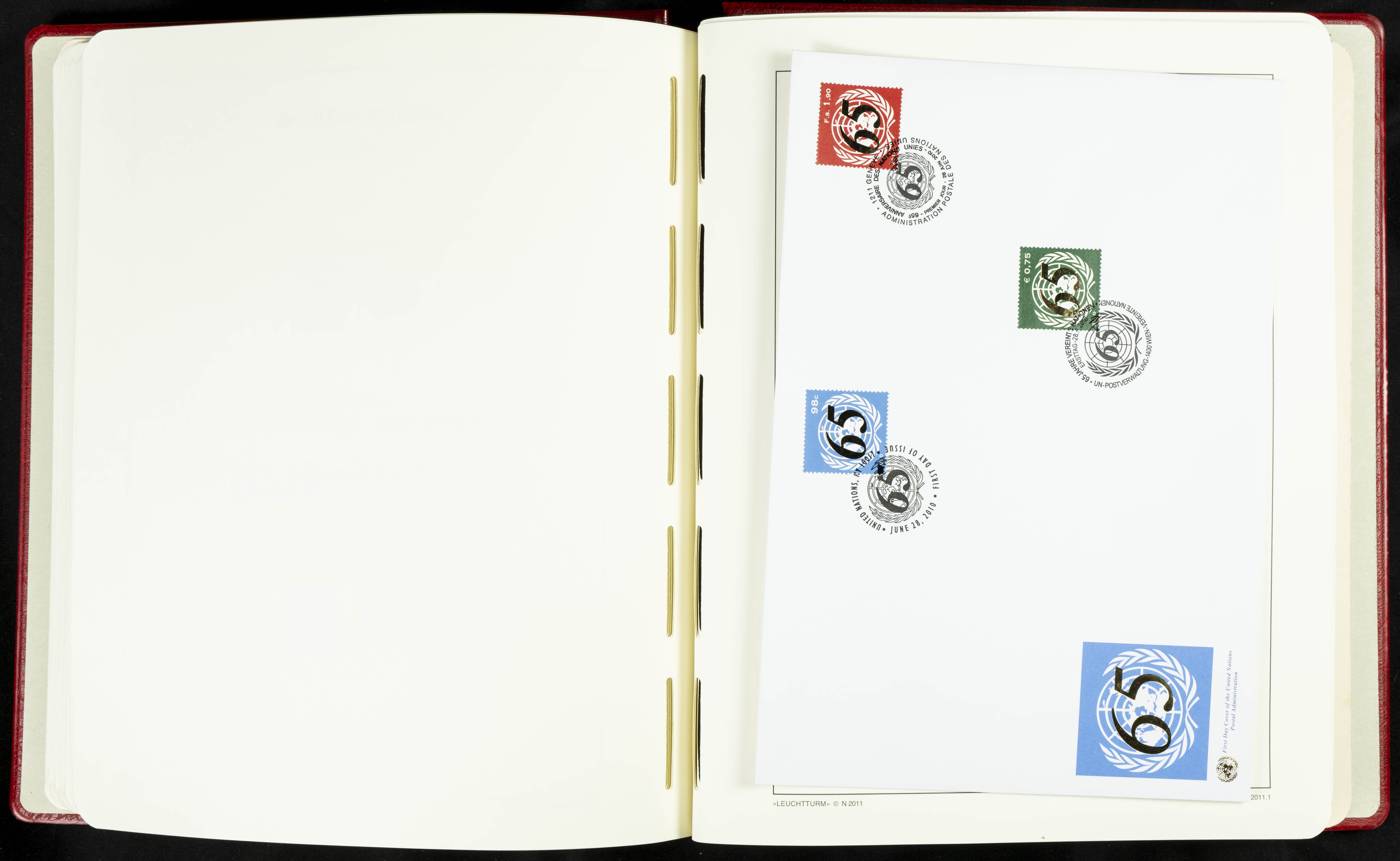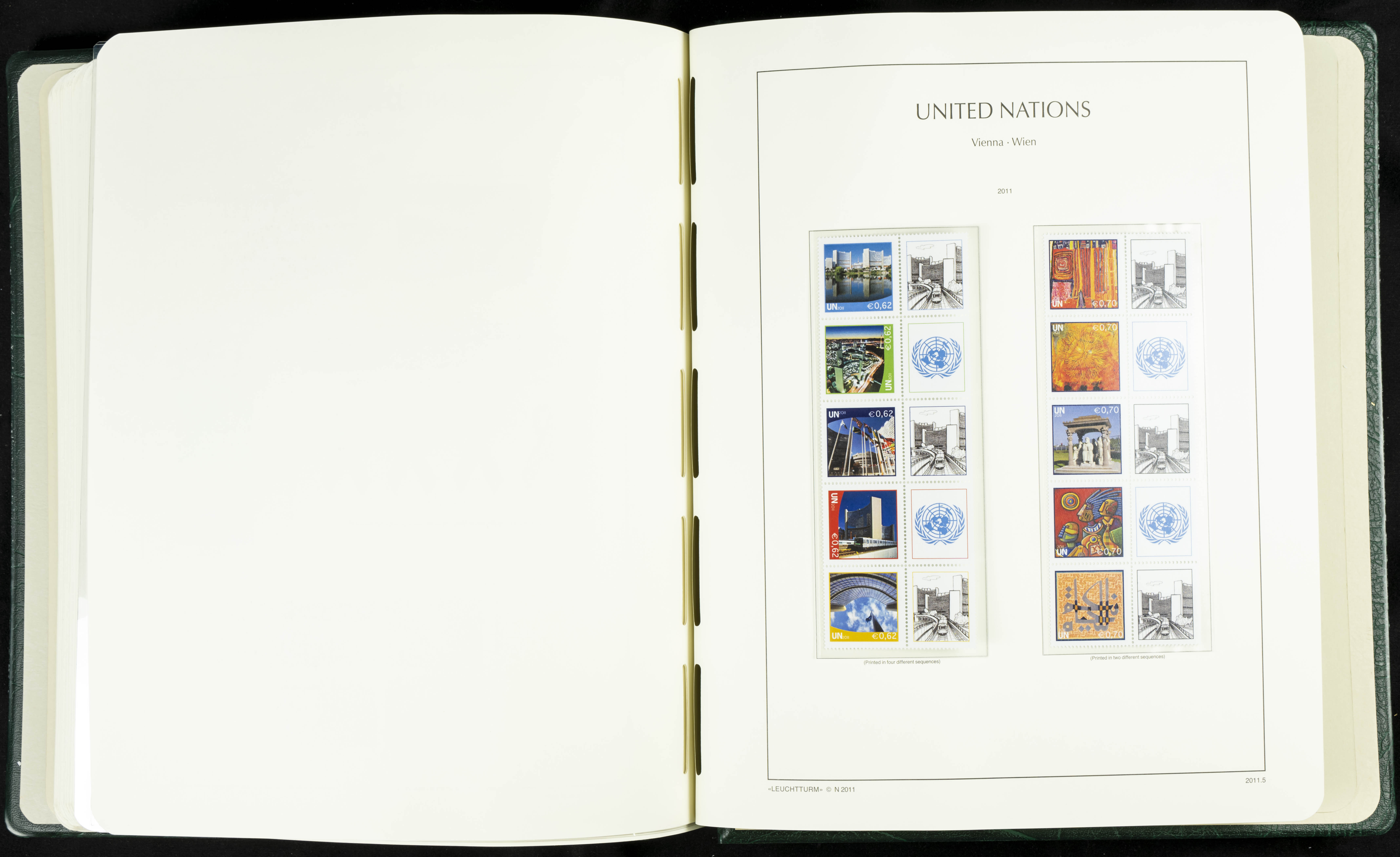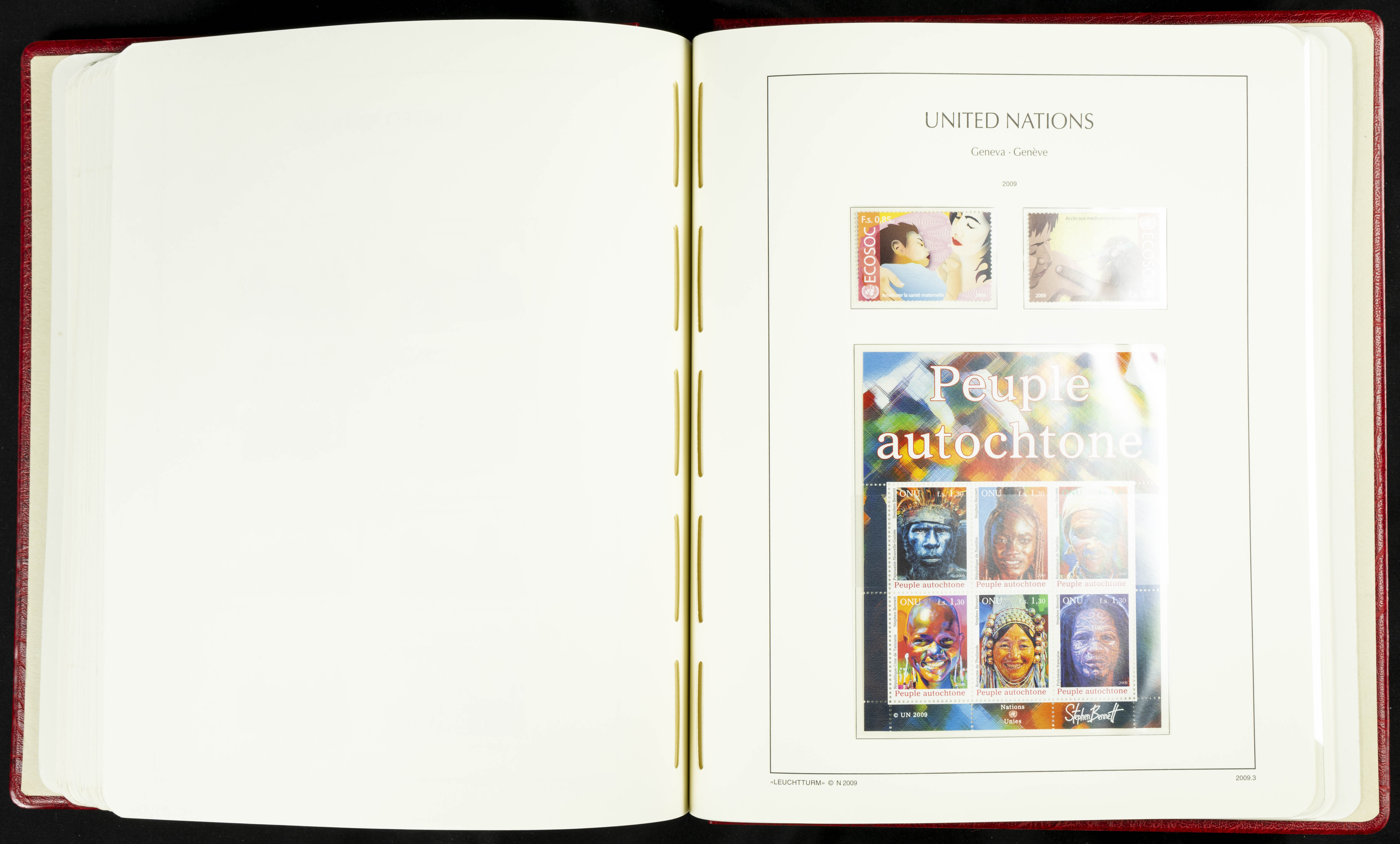 ★★(1951ca). Colección completa de Naciones Unidas (Nueva York, Ginebra y Viena) entre 1951 y 2011, en nuevo y sin fijasellos (montada en álbumes Faro). ALTO VALOR DE CATALOGO. A EXAMINAR.