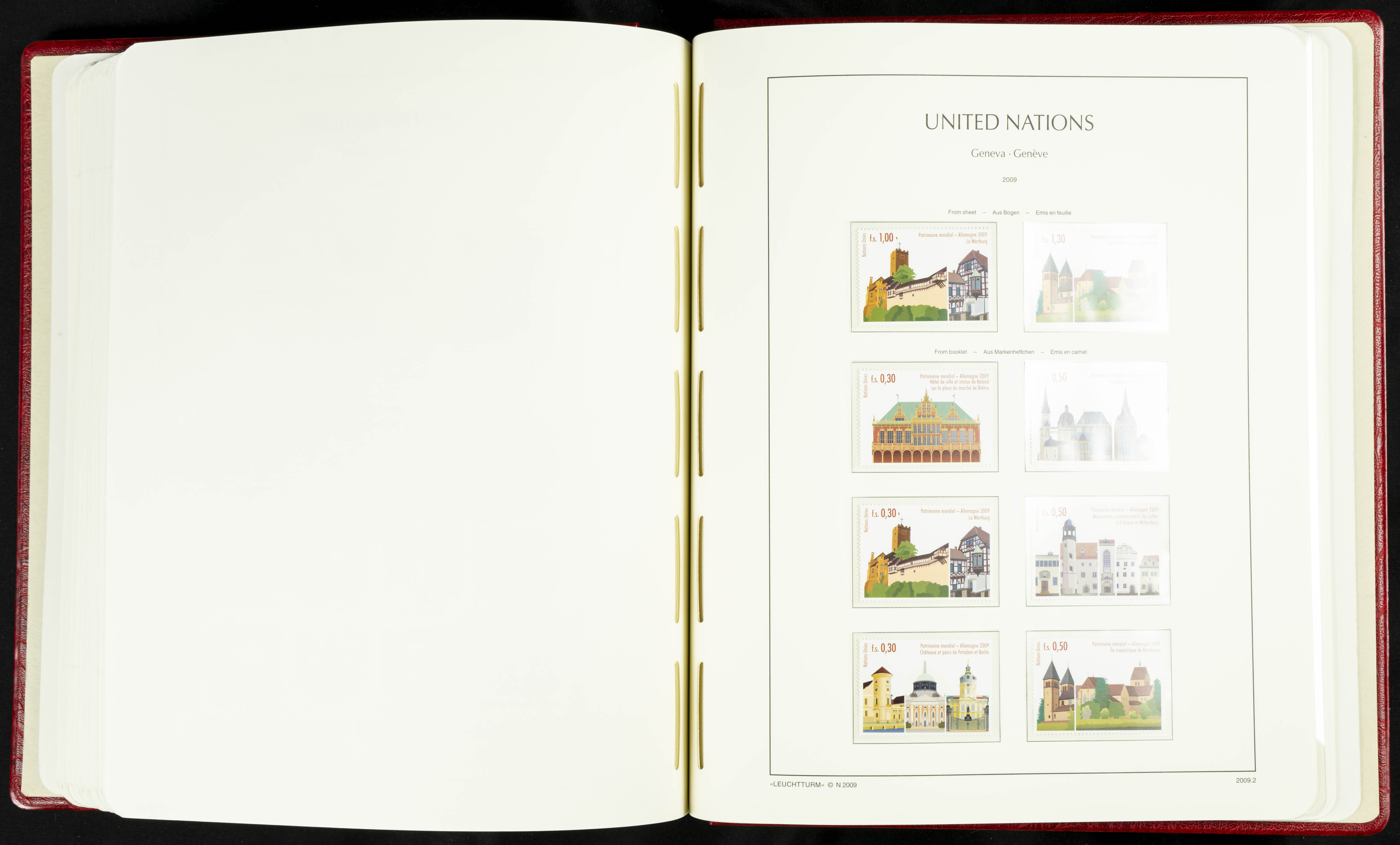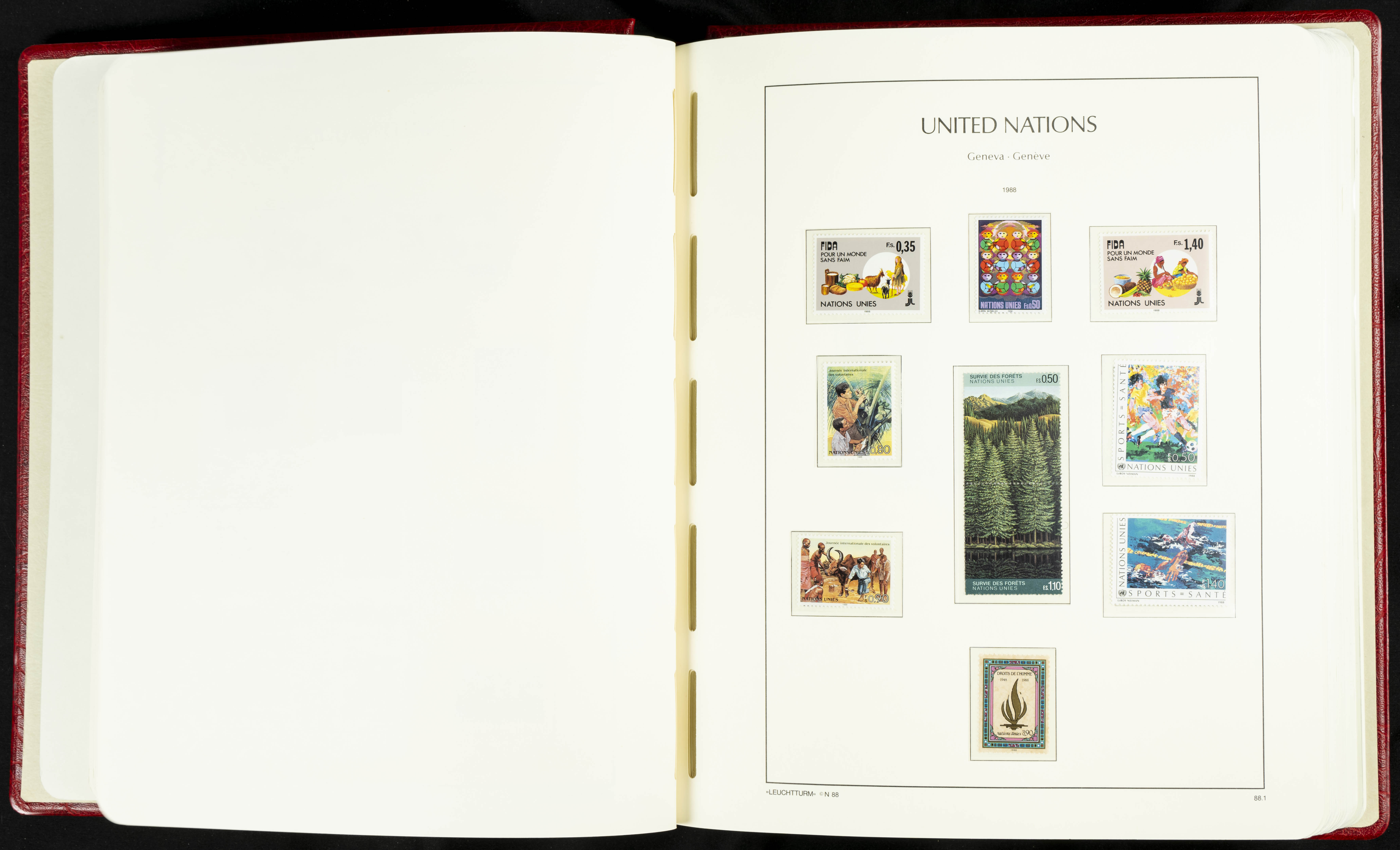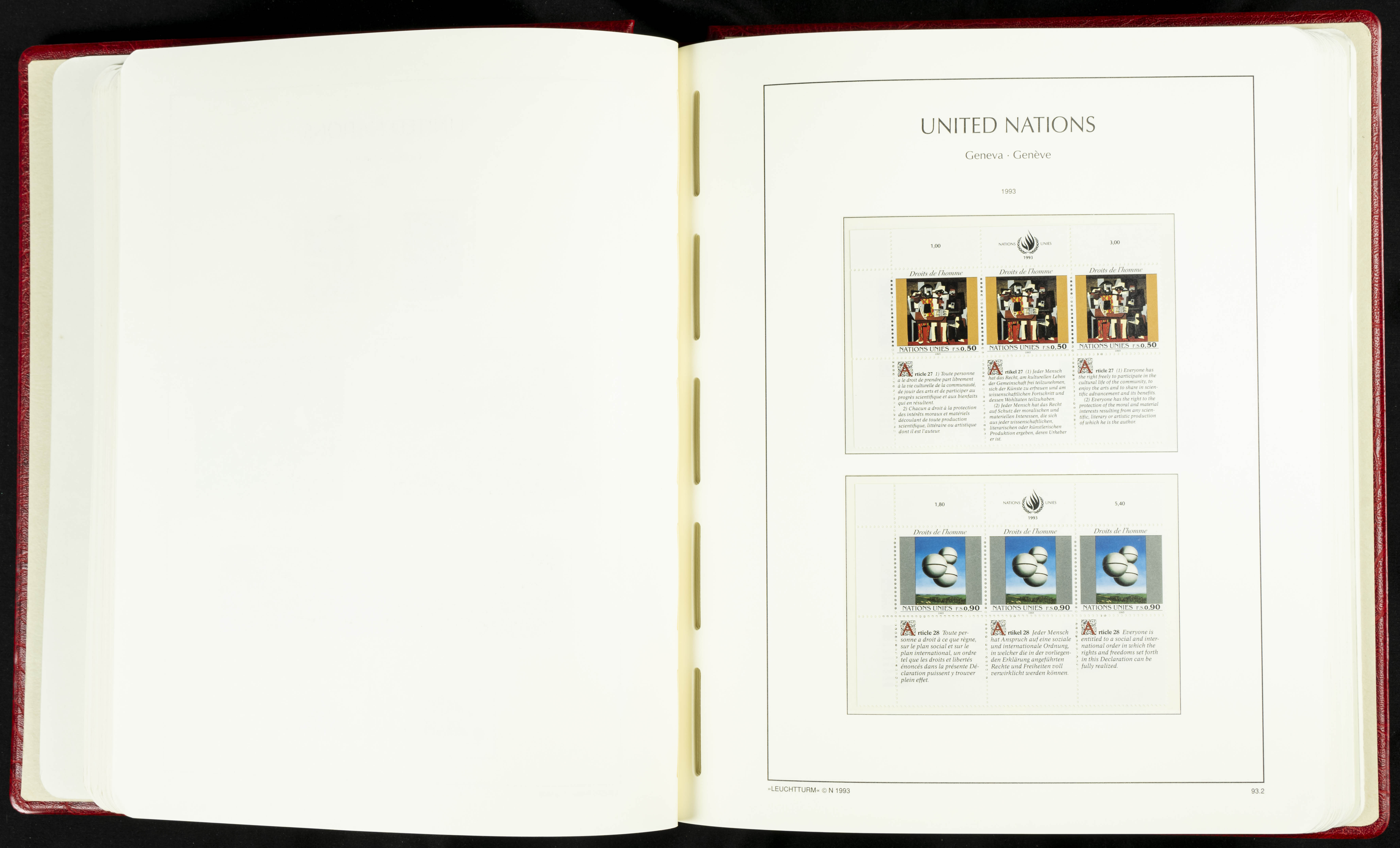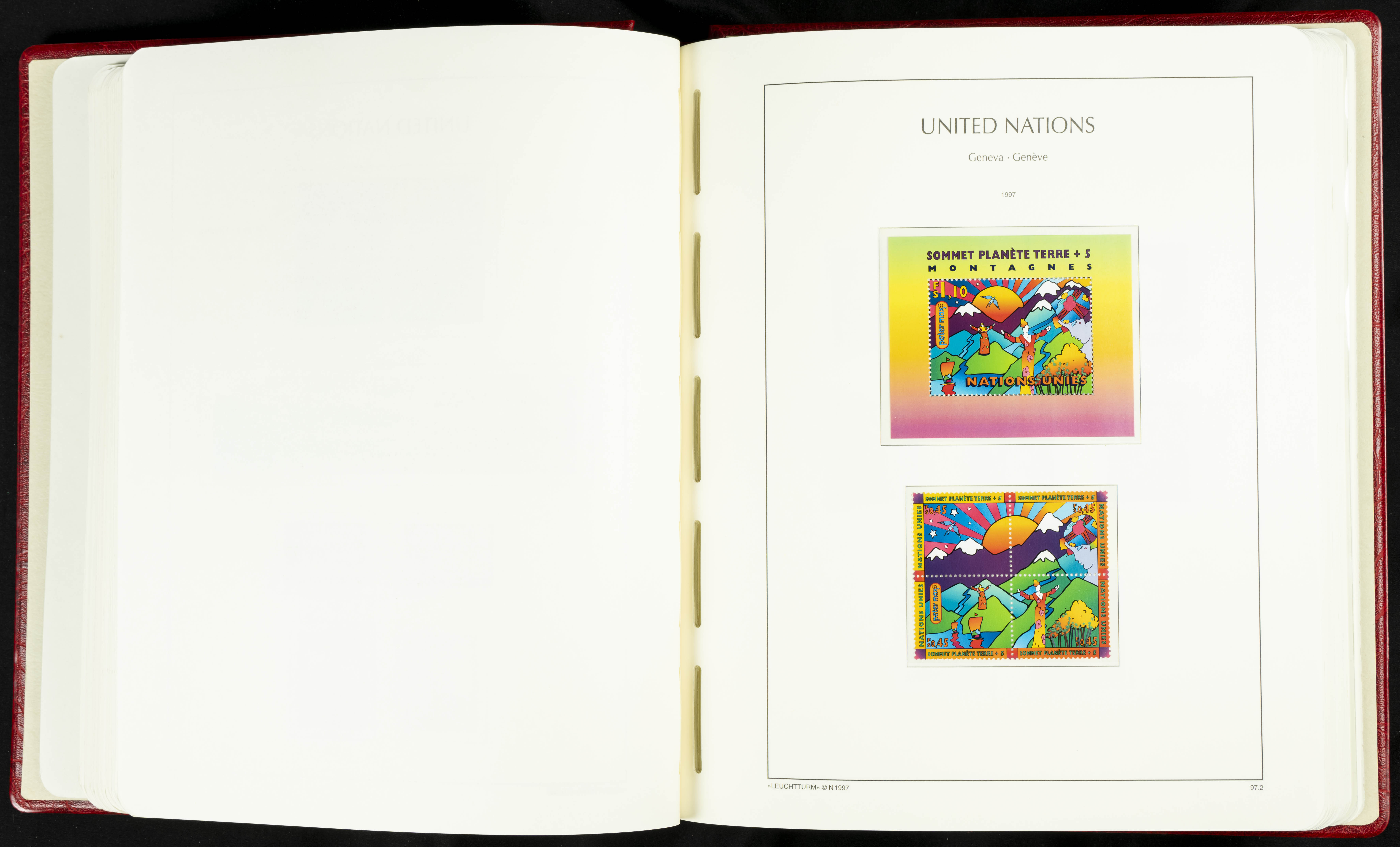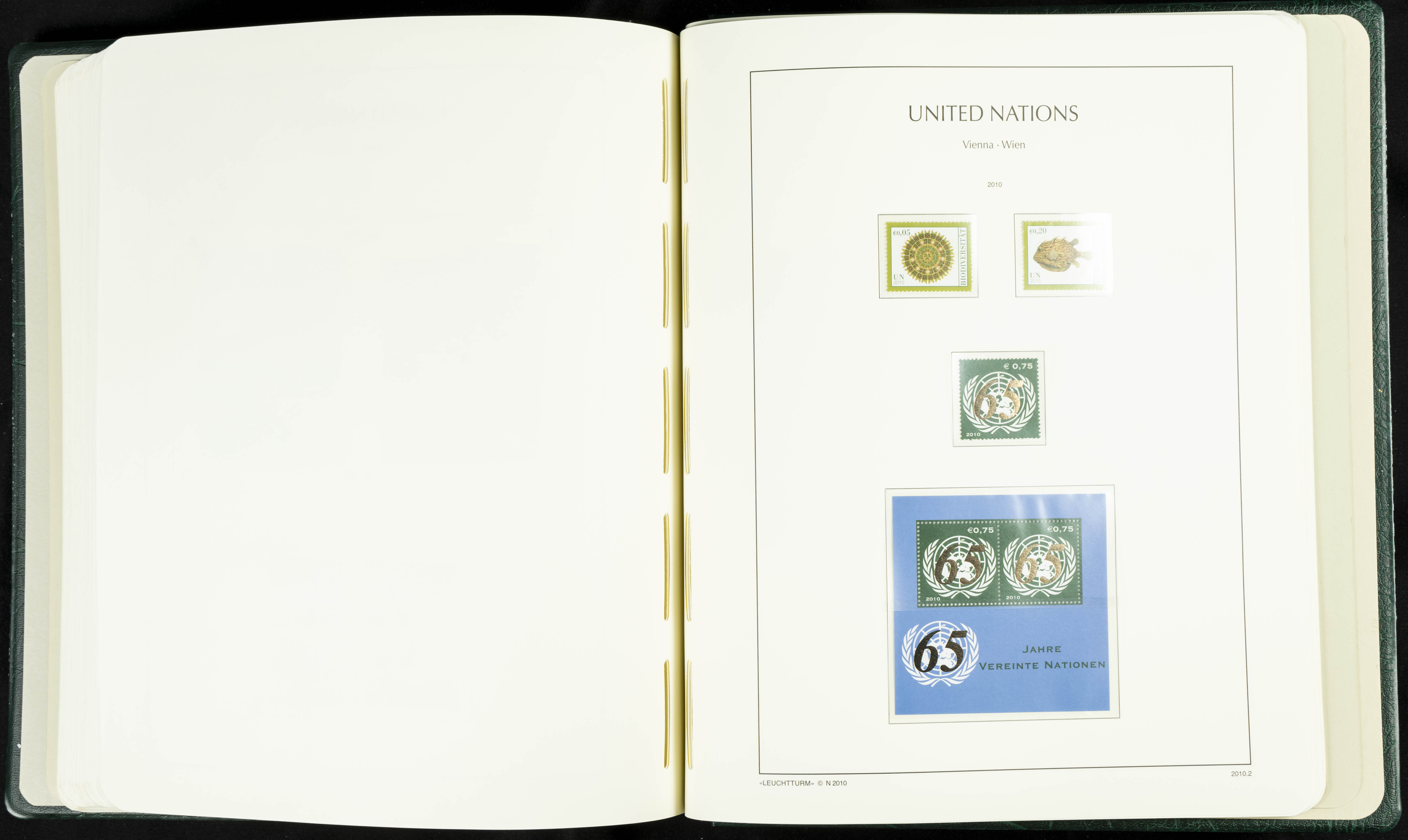 ★★(1951ca). Colección completa de Naciones Unidas (Nueva York, Ginebra y Viena) entre 1951 y 2011, en nuevo y sin fijasellos (montada en álbumes Faro). ALTO VALOR DE CATALOGO. A EXAMINAR.