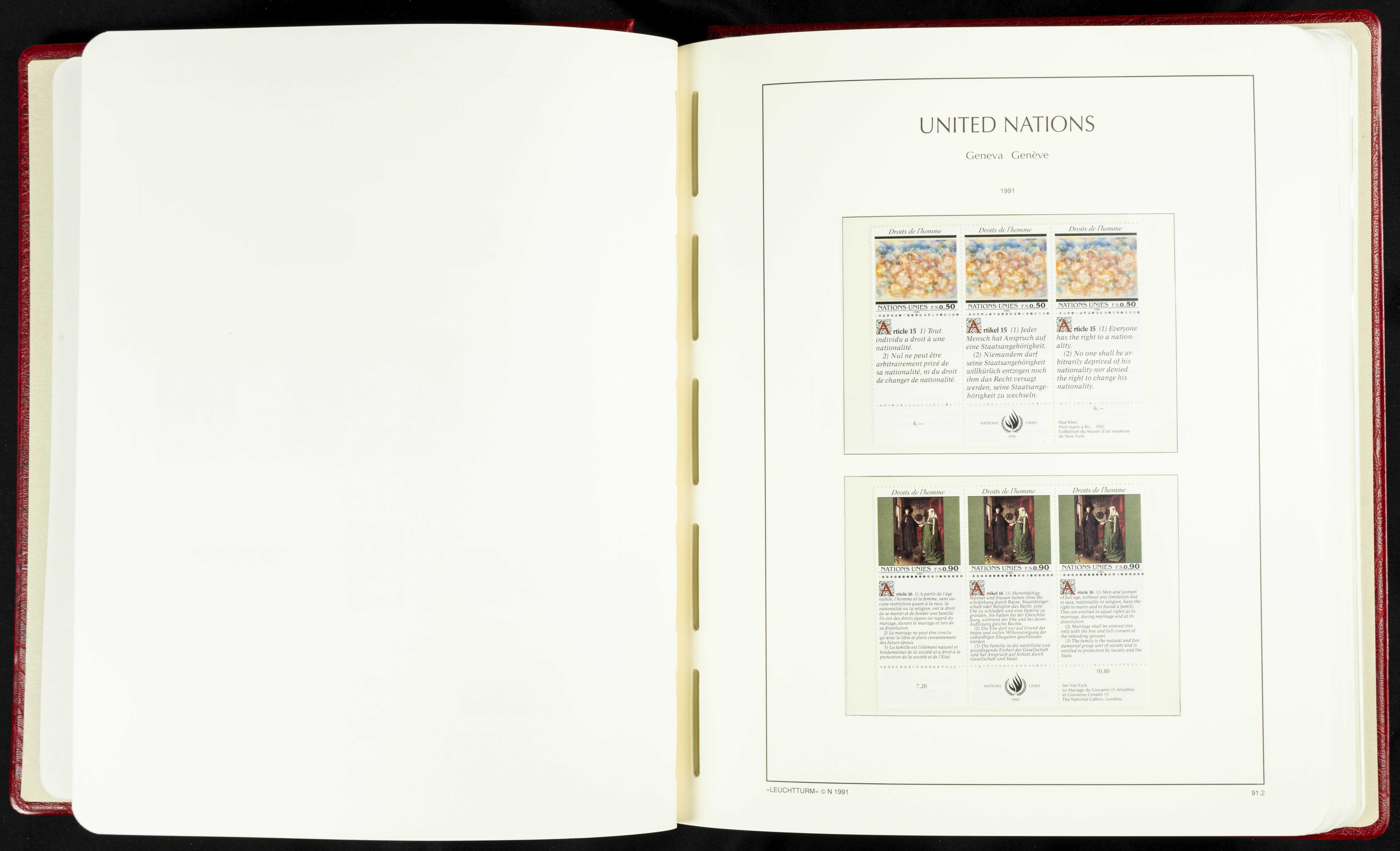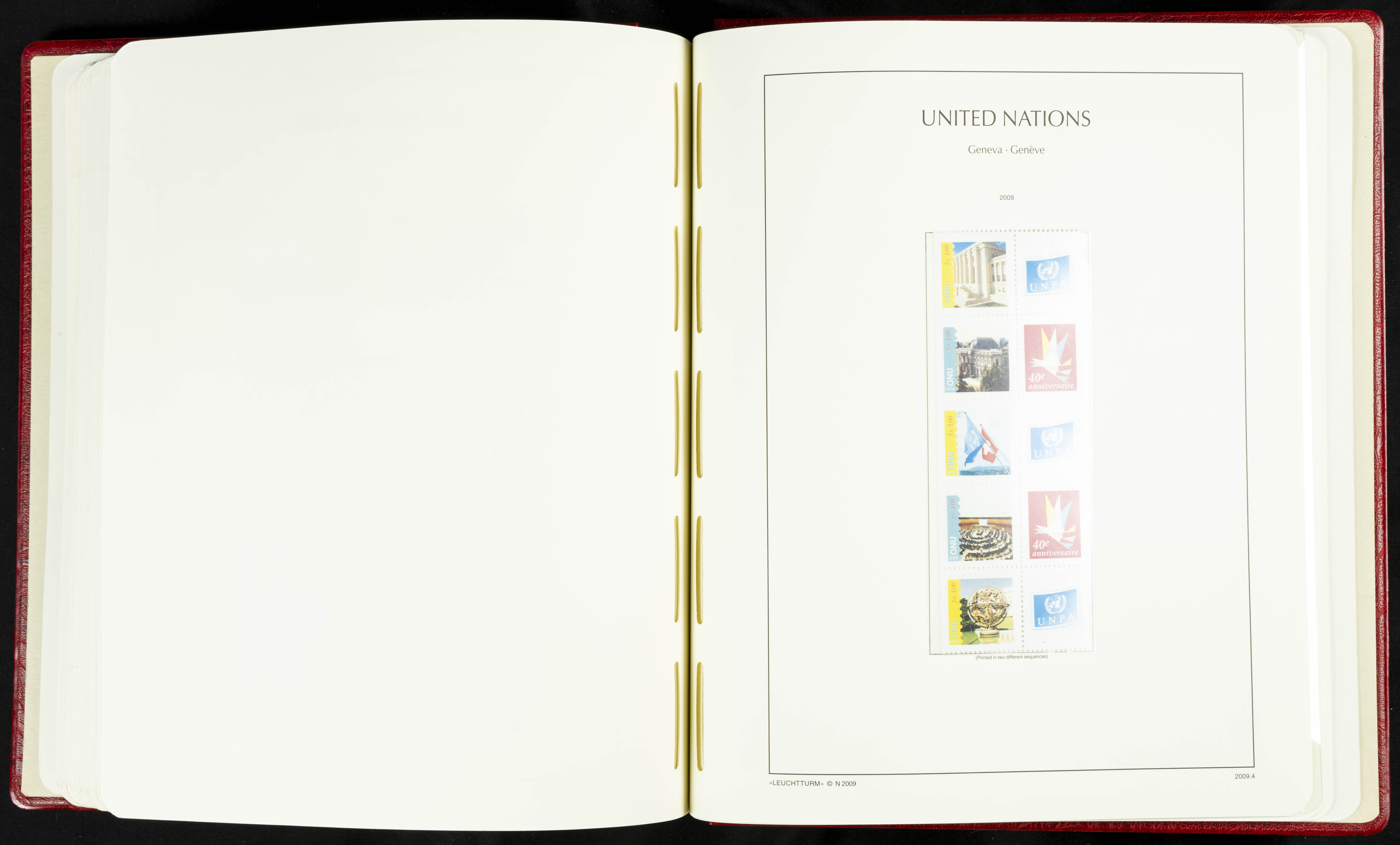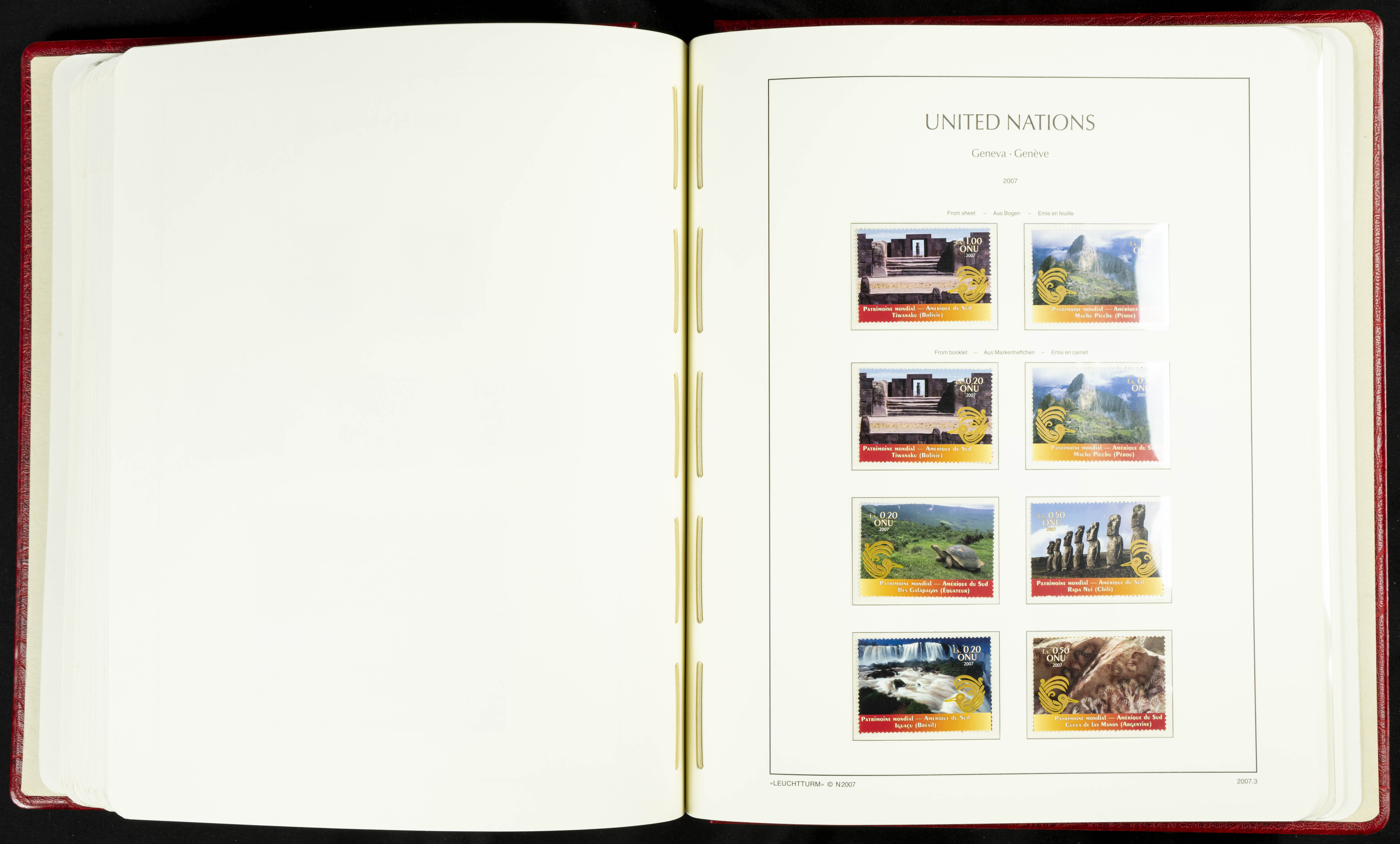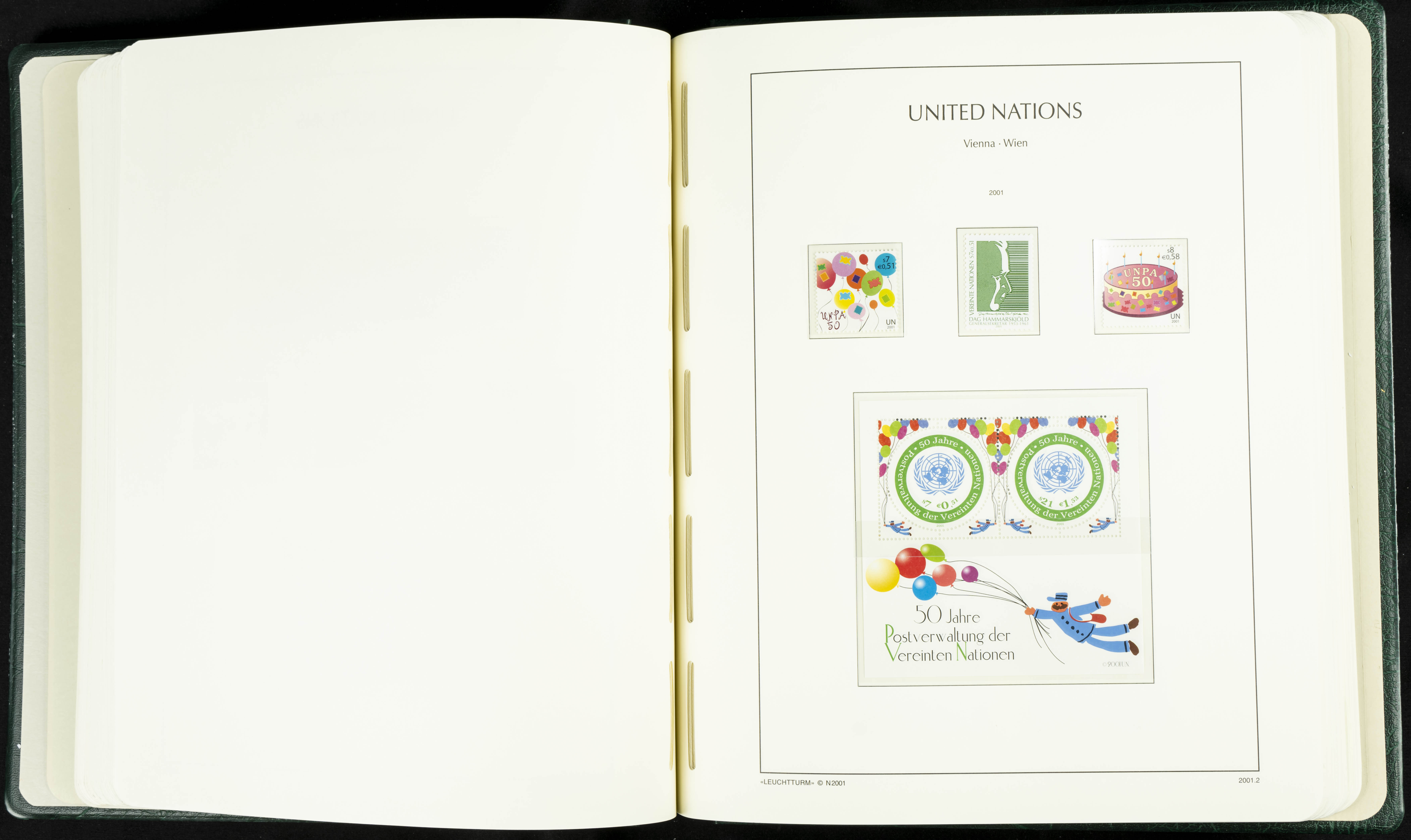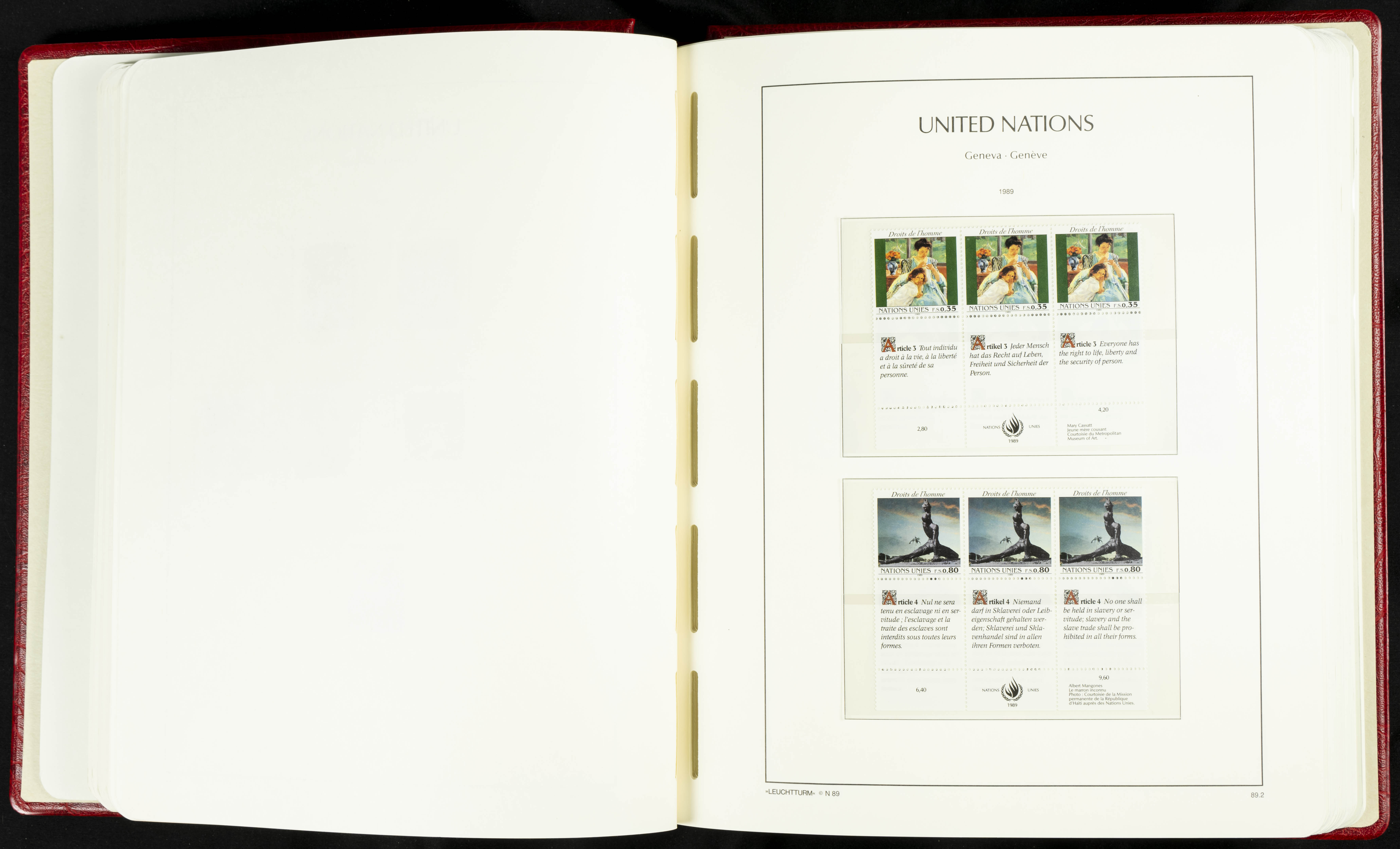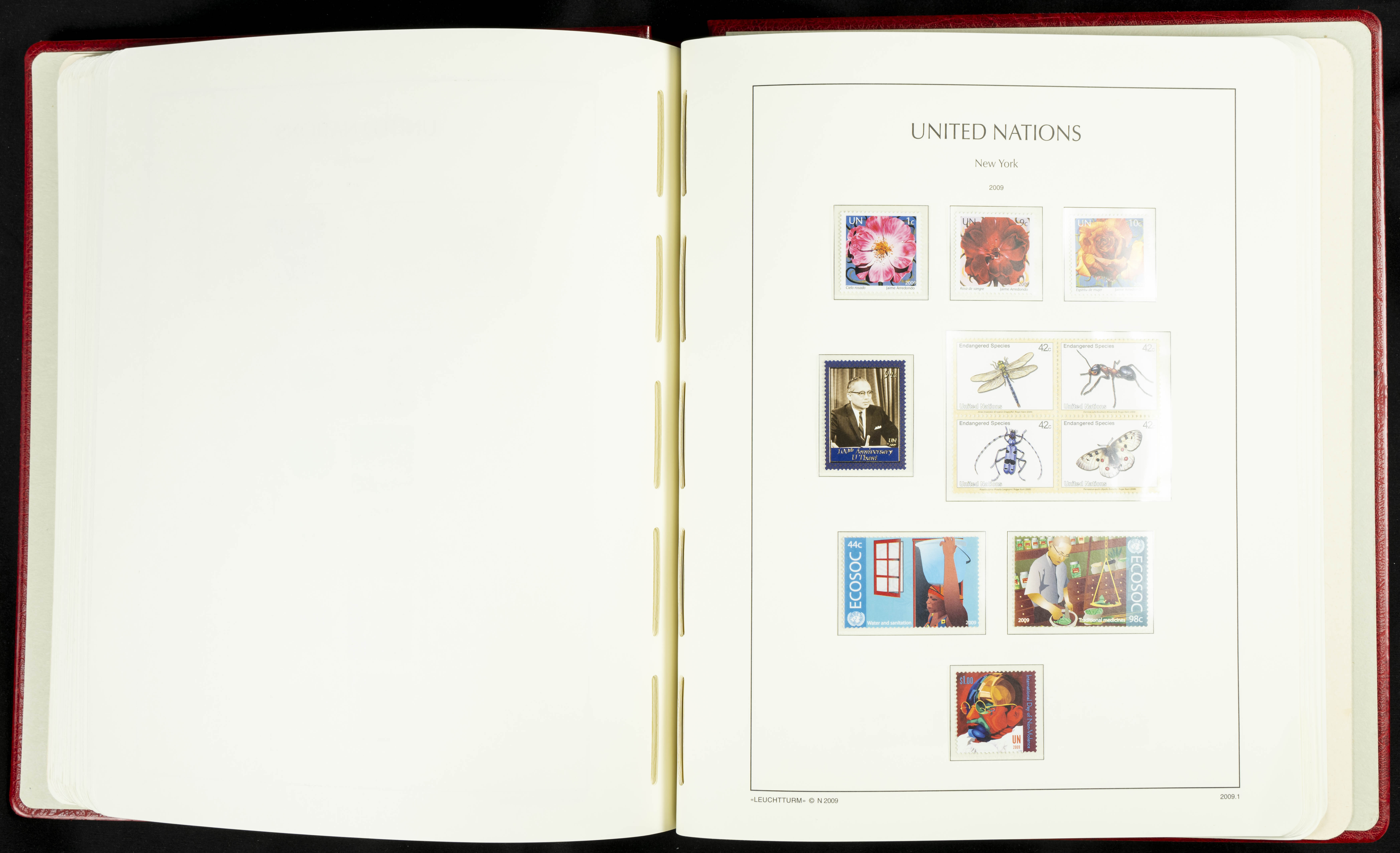 ★★(1951ca). Colección completa de Naciones Unidas (Nueva York, Ginebra y Viena) entre 1951 y 2011, en nuevo y sin fijasellos (montada en álbumes Faro). ALTO VALOR DE CATALOGO. A EXAMINAR.