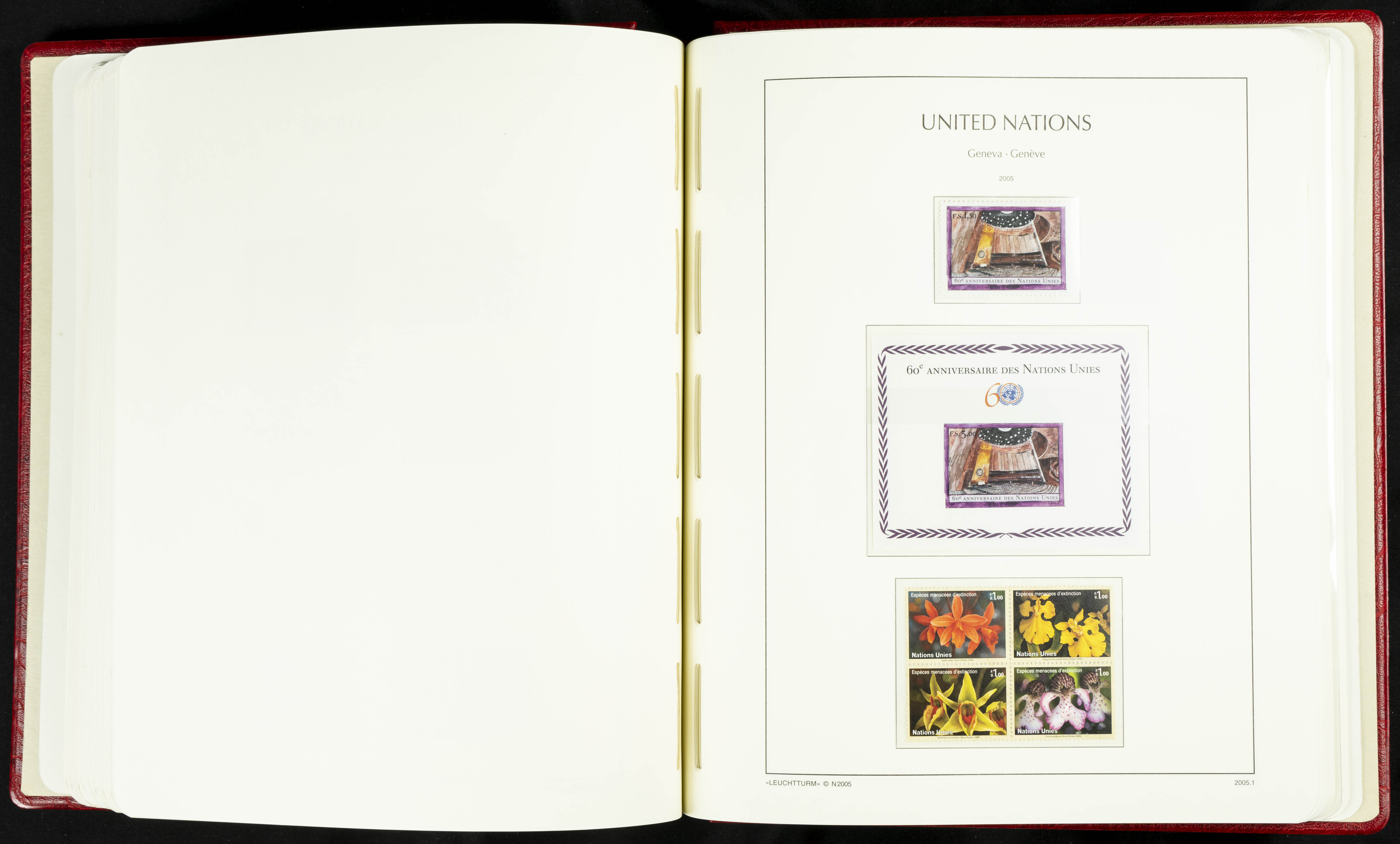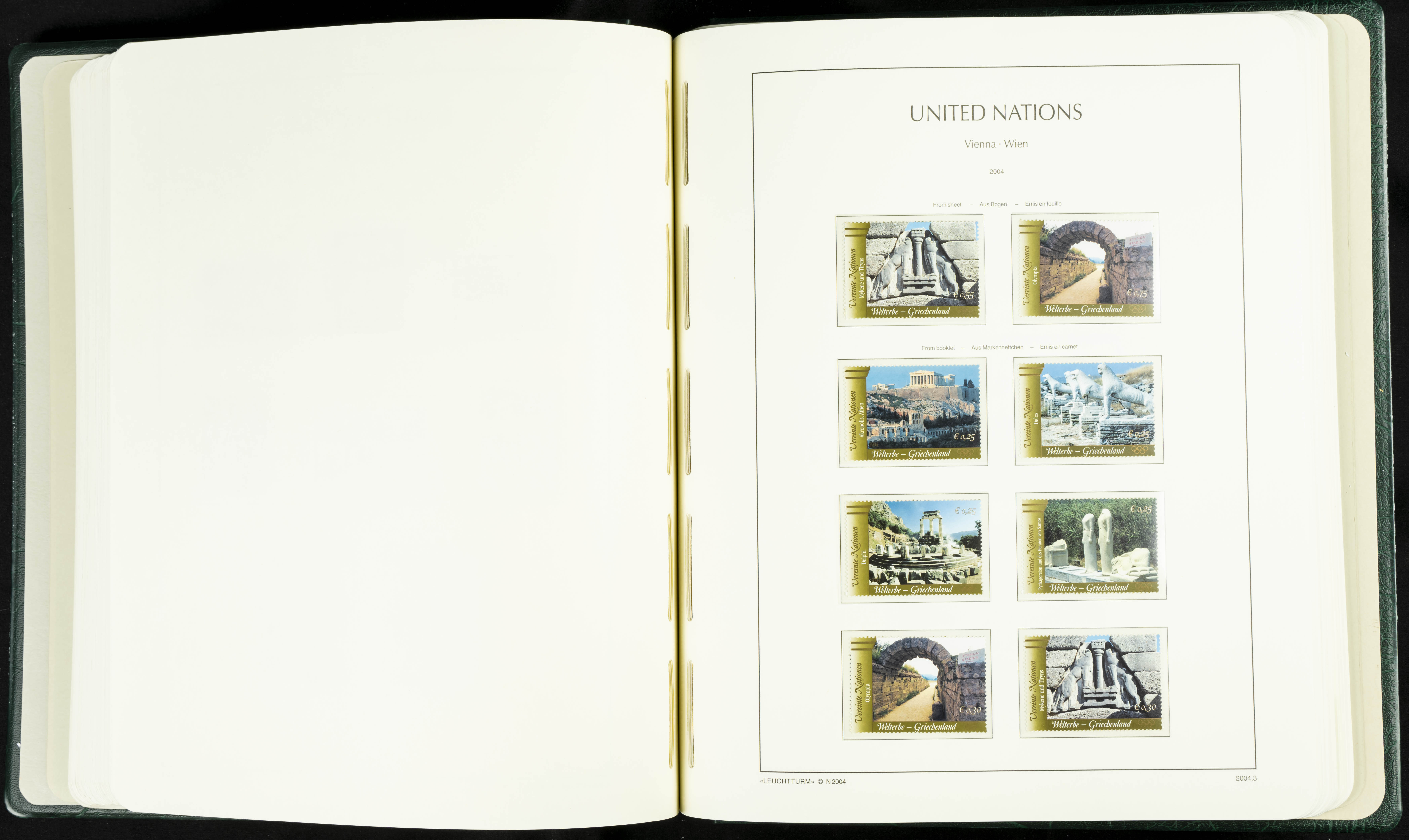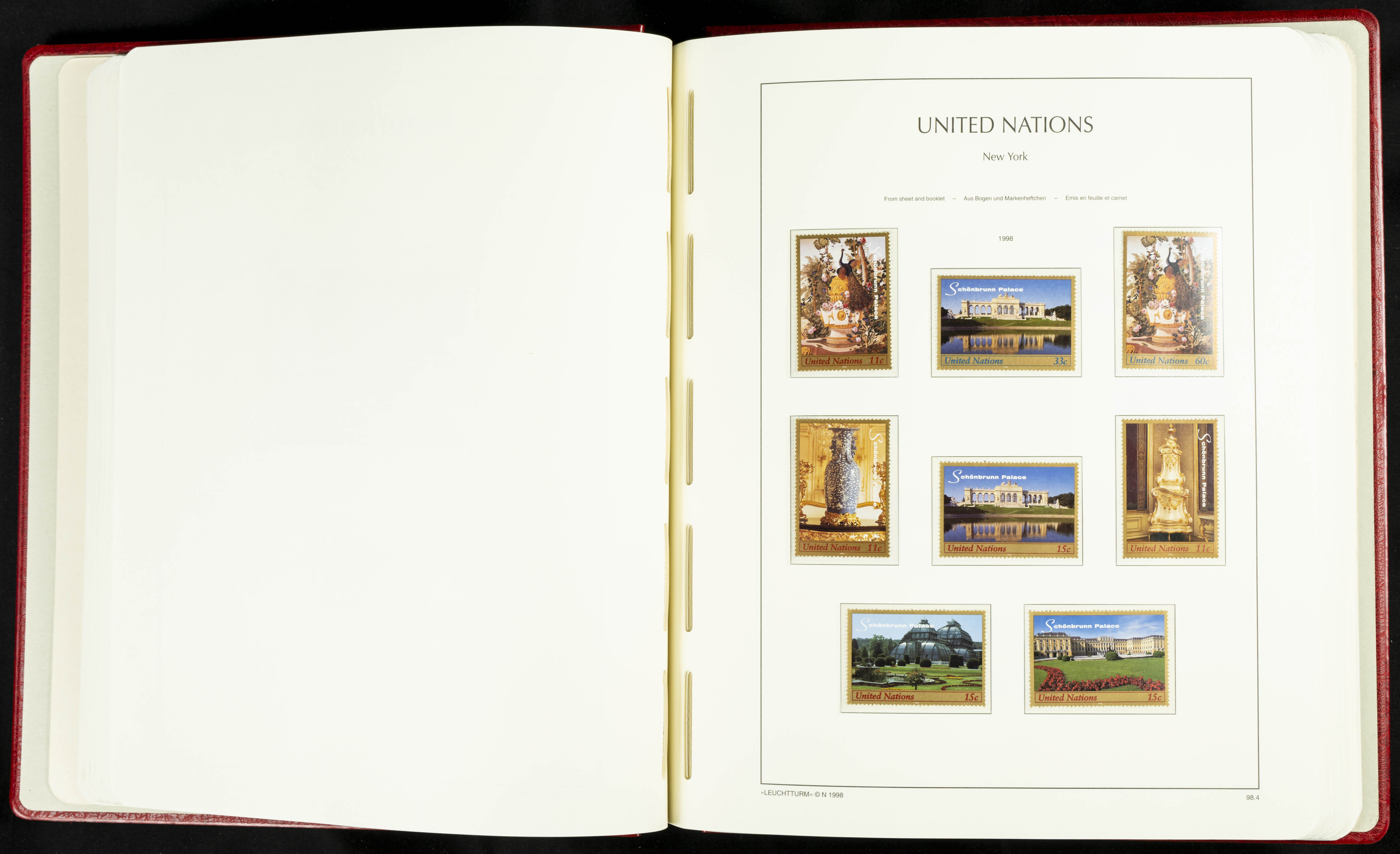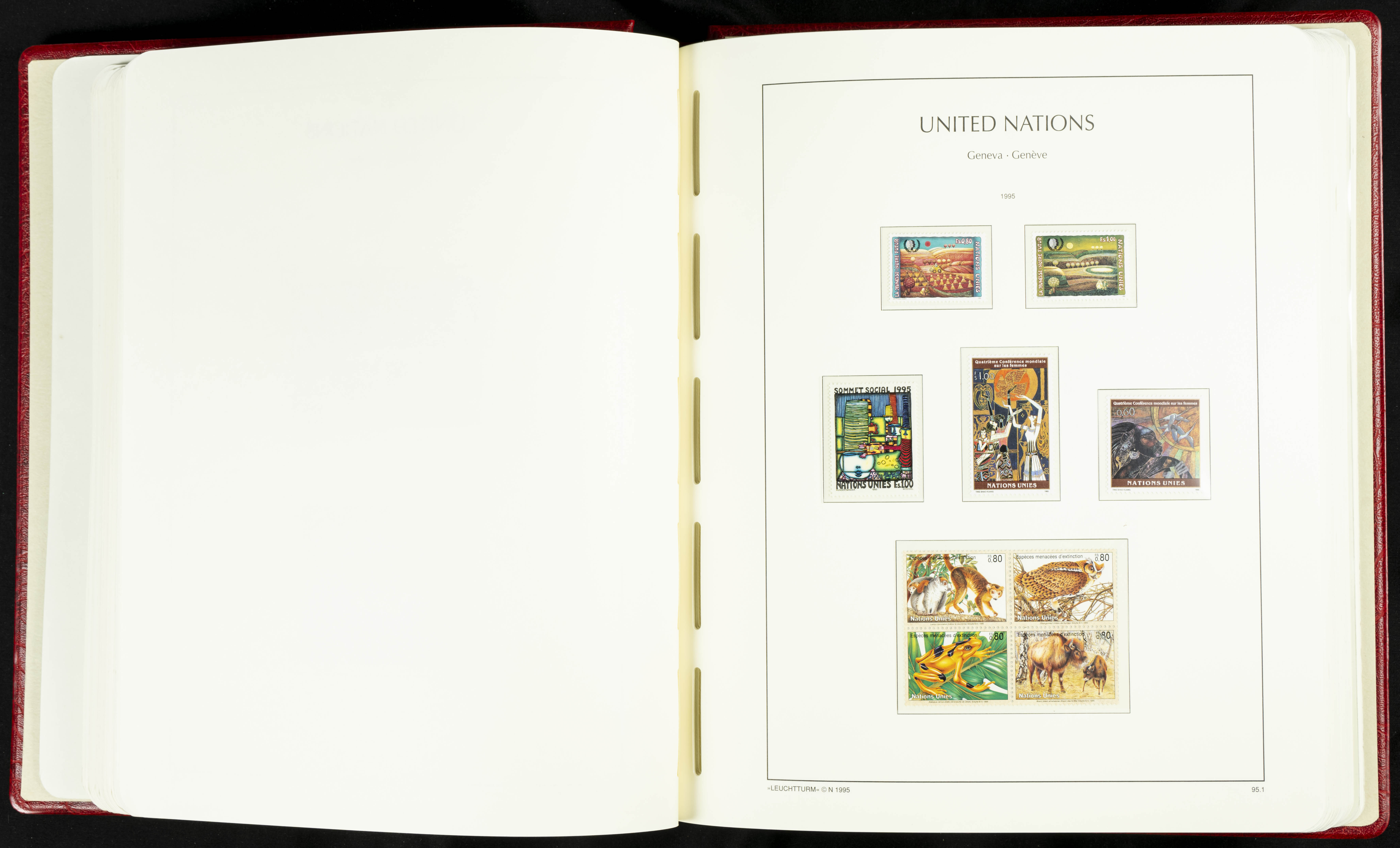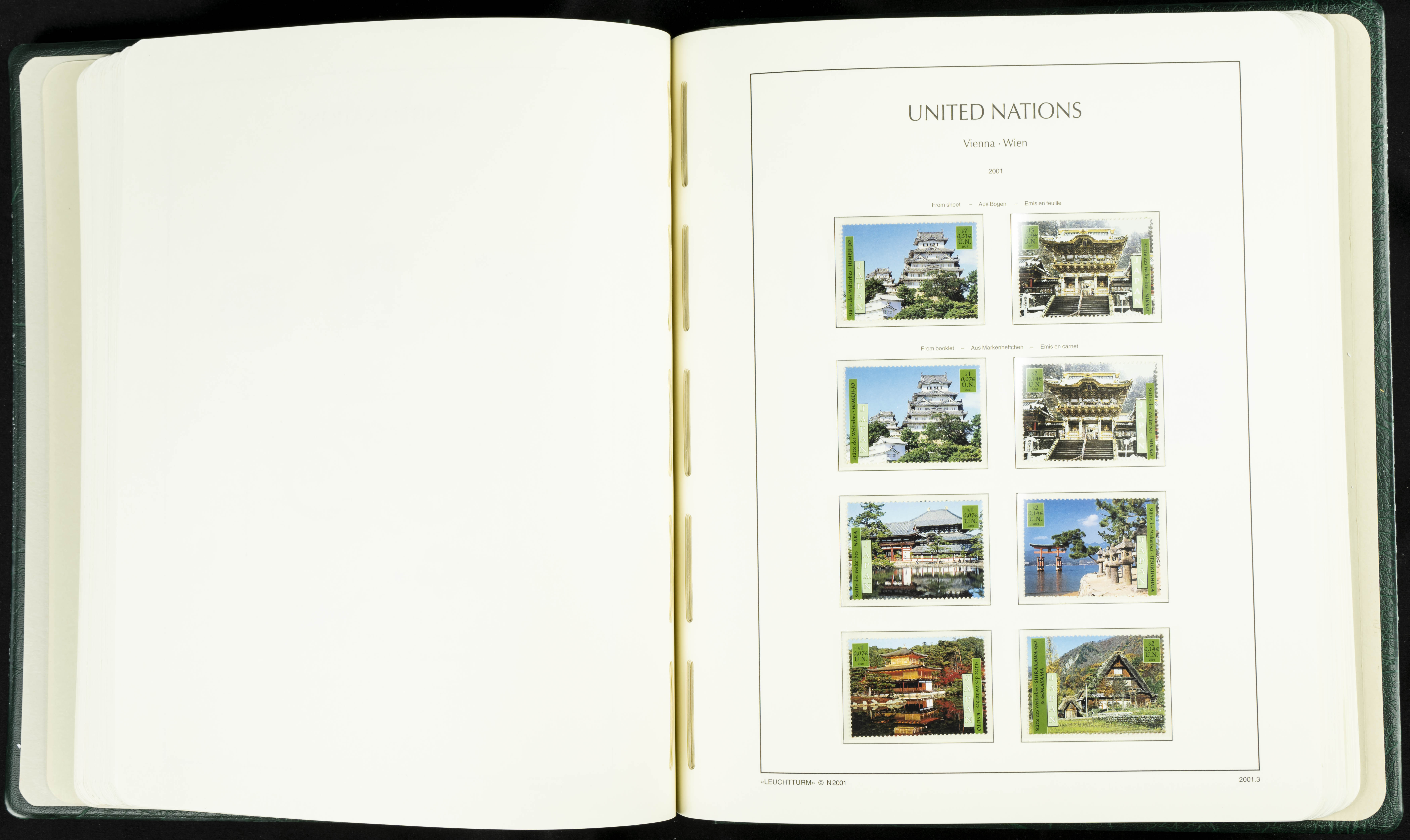 ★★(1951ca). Colección completa de Naciones Unidas (Nueva York, Ginebra y Viena) entre 1951 y 2011, en nuevo y sin fijasellos (montada en álbumes Faro). ALTO VALOR DE CATALOGO. A EXAMINAR.
