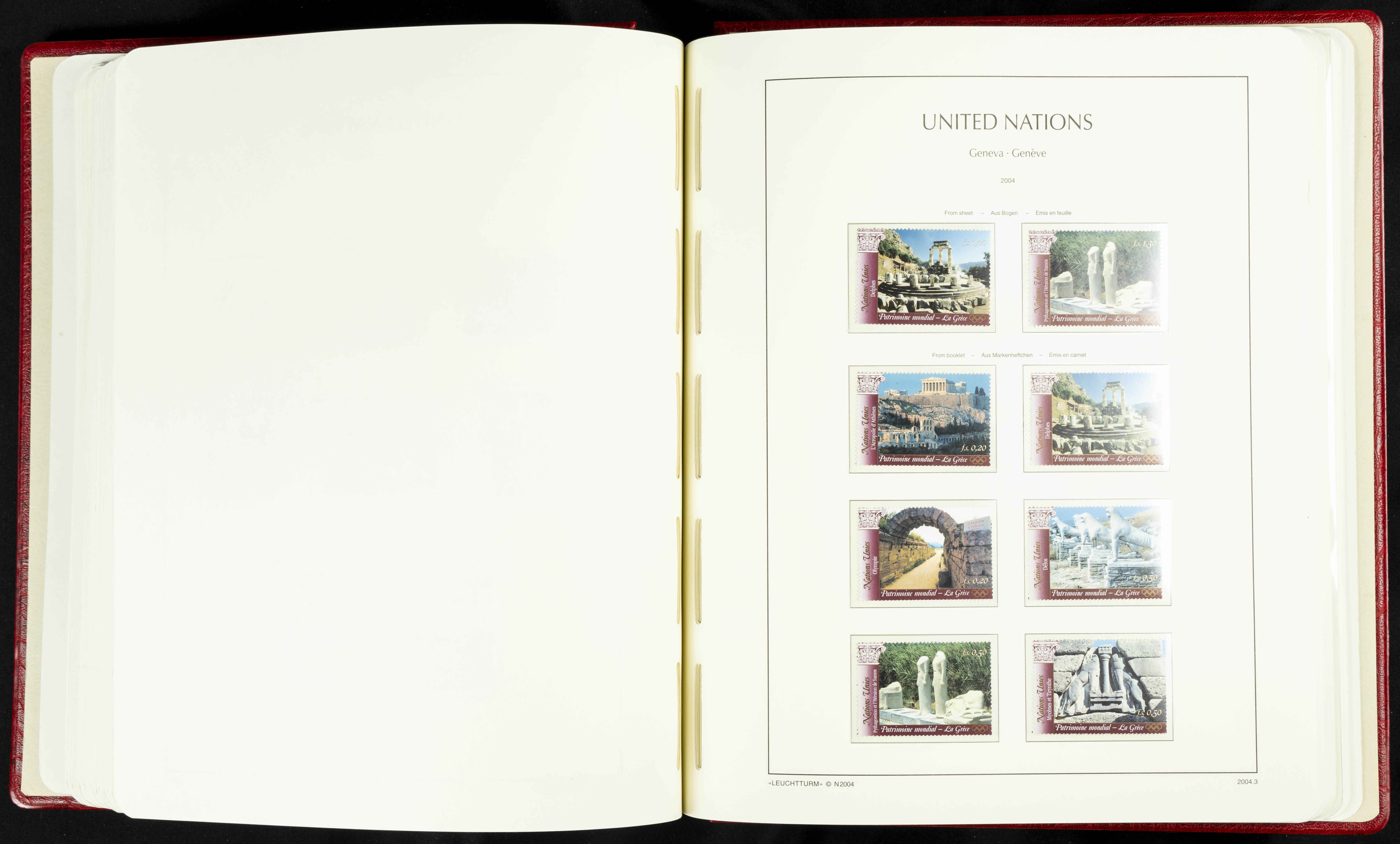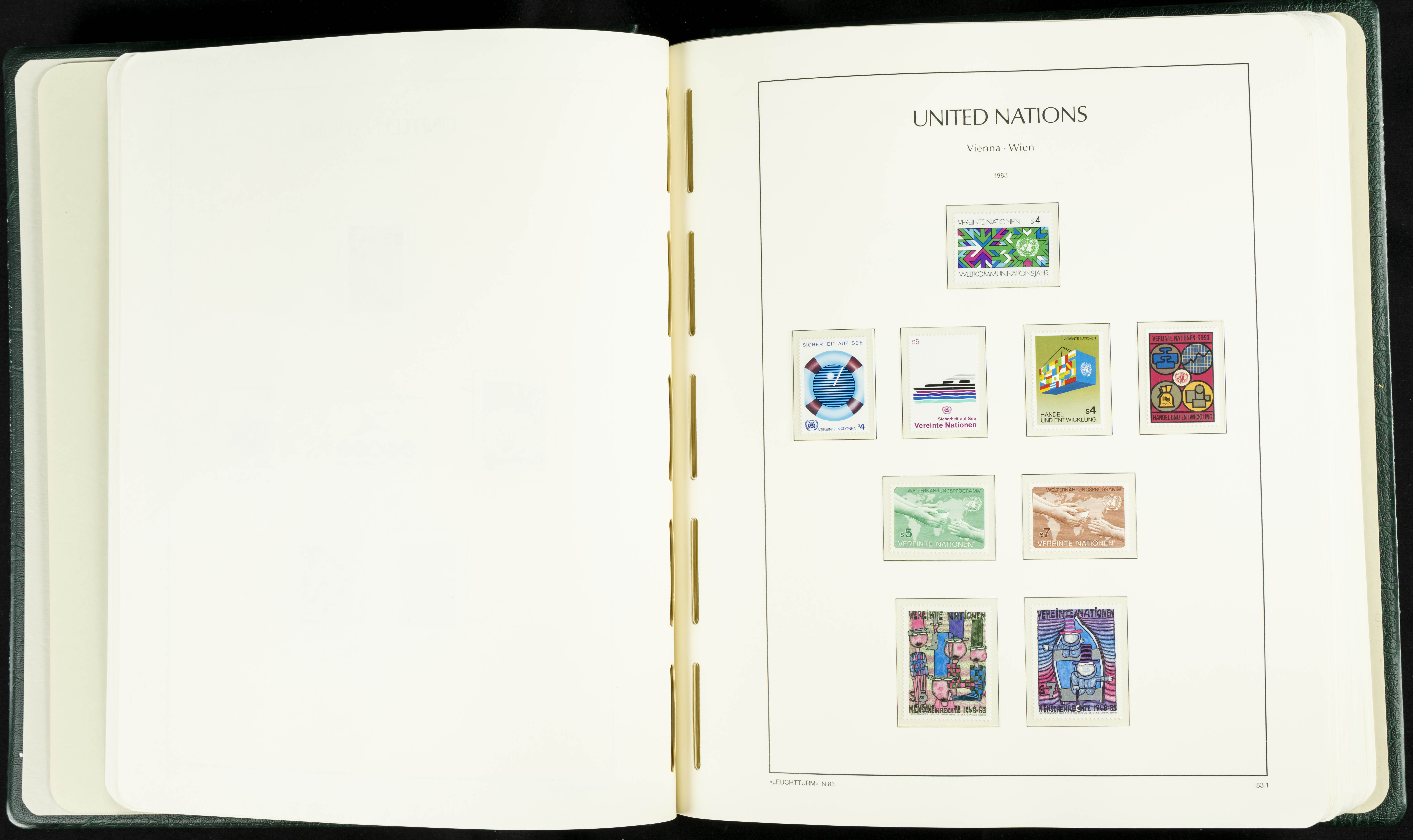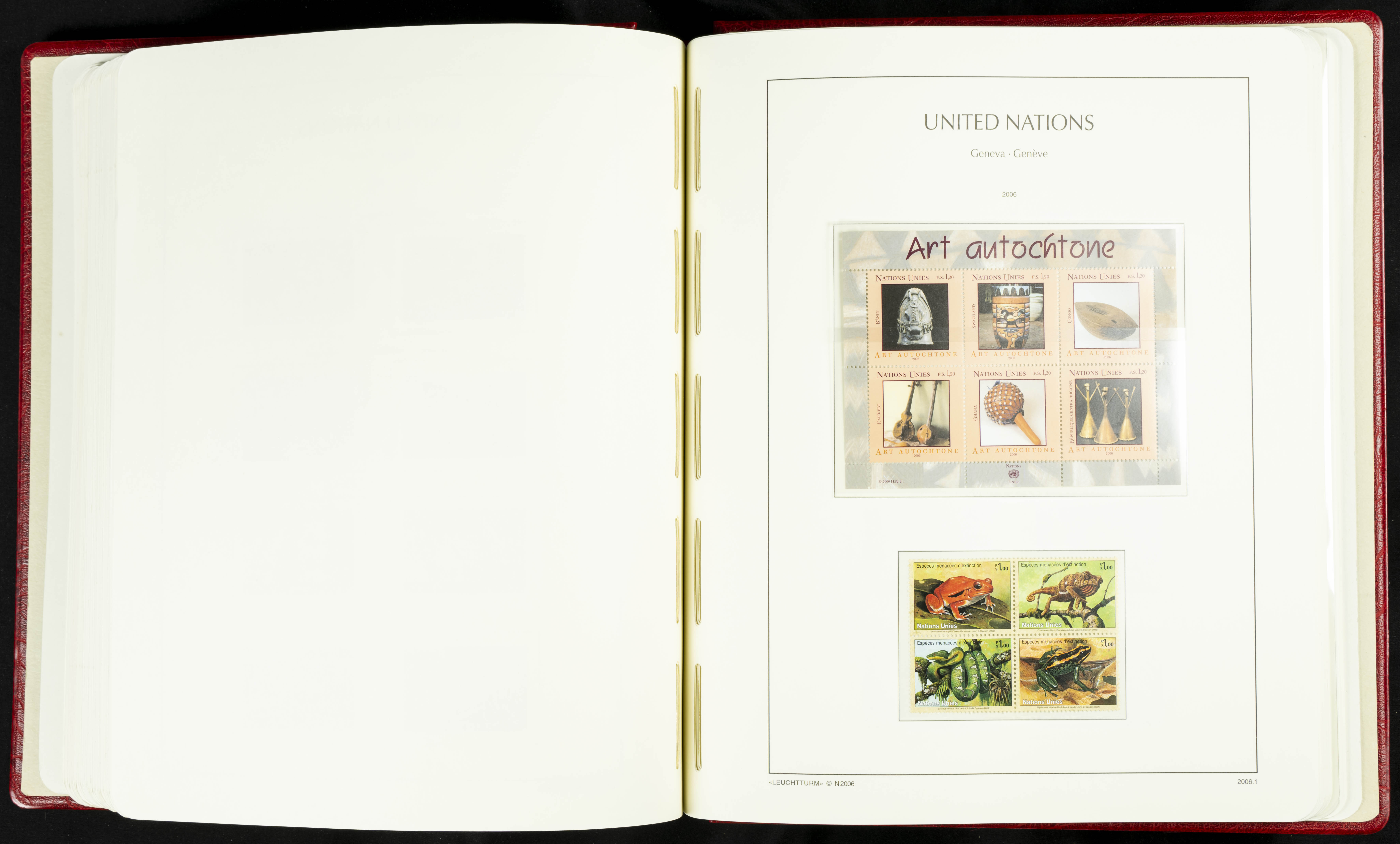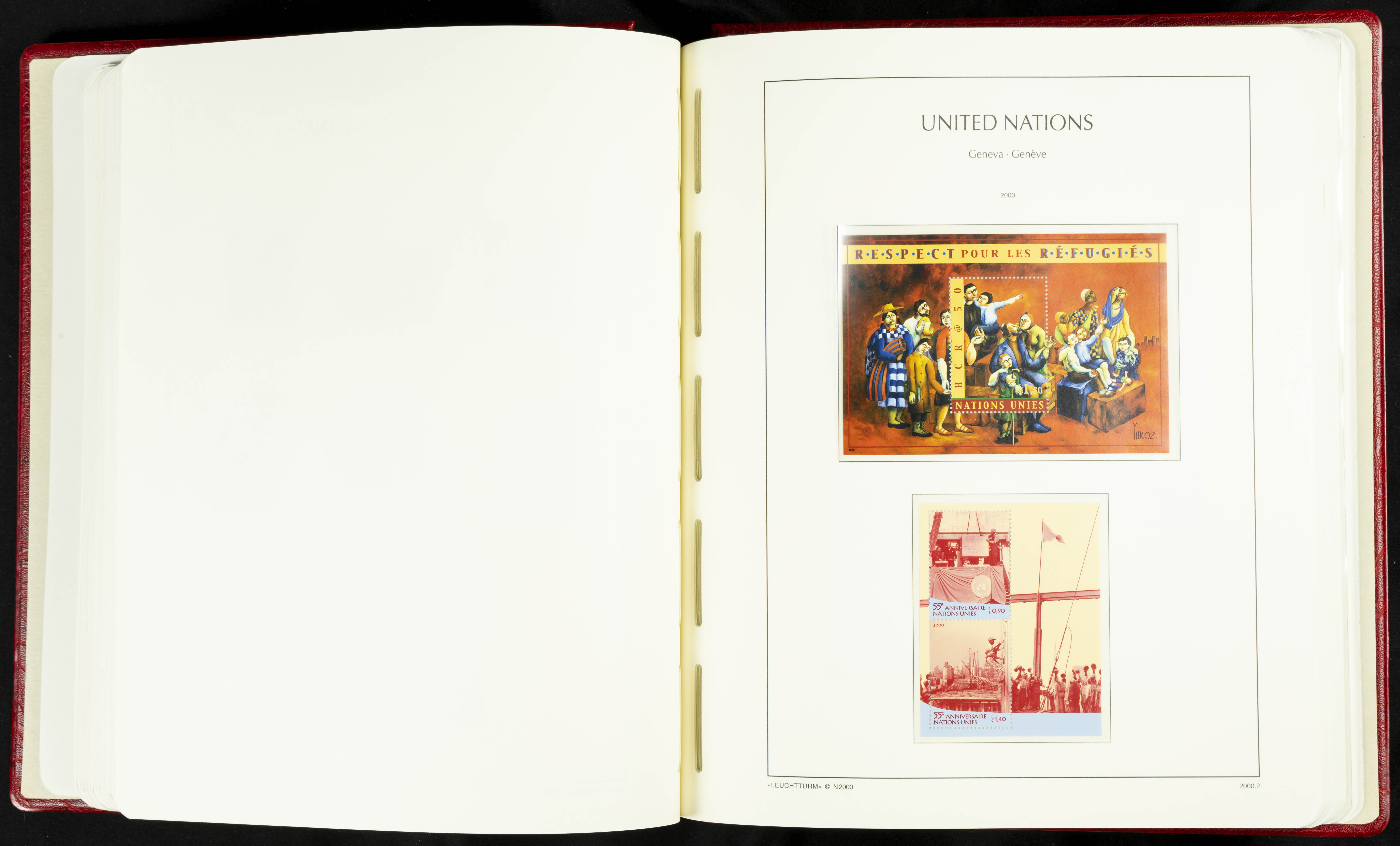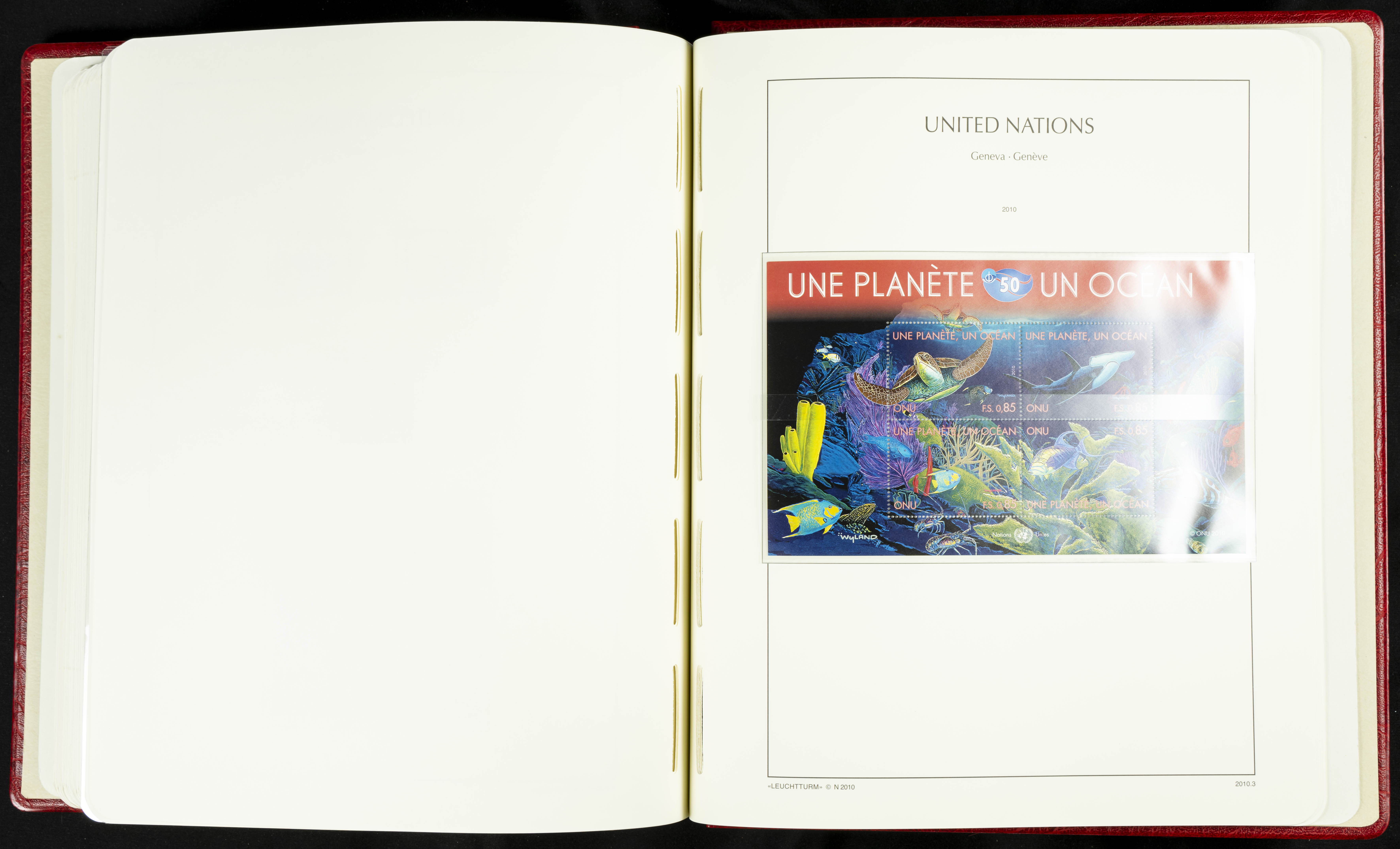 ★★(1951ca). Colección completa de Naciones Unidas (Nueva York, Ginebra y Viena) entre 1951 y 2011, en nuevo y sin fijasellos (montada en álbumes Faro). ALTO VALOR DE CATALOGO. A EXAMINAR.