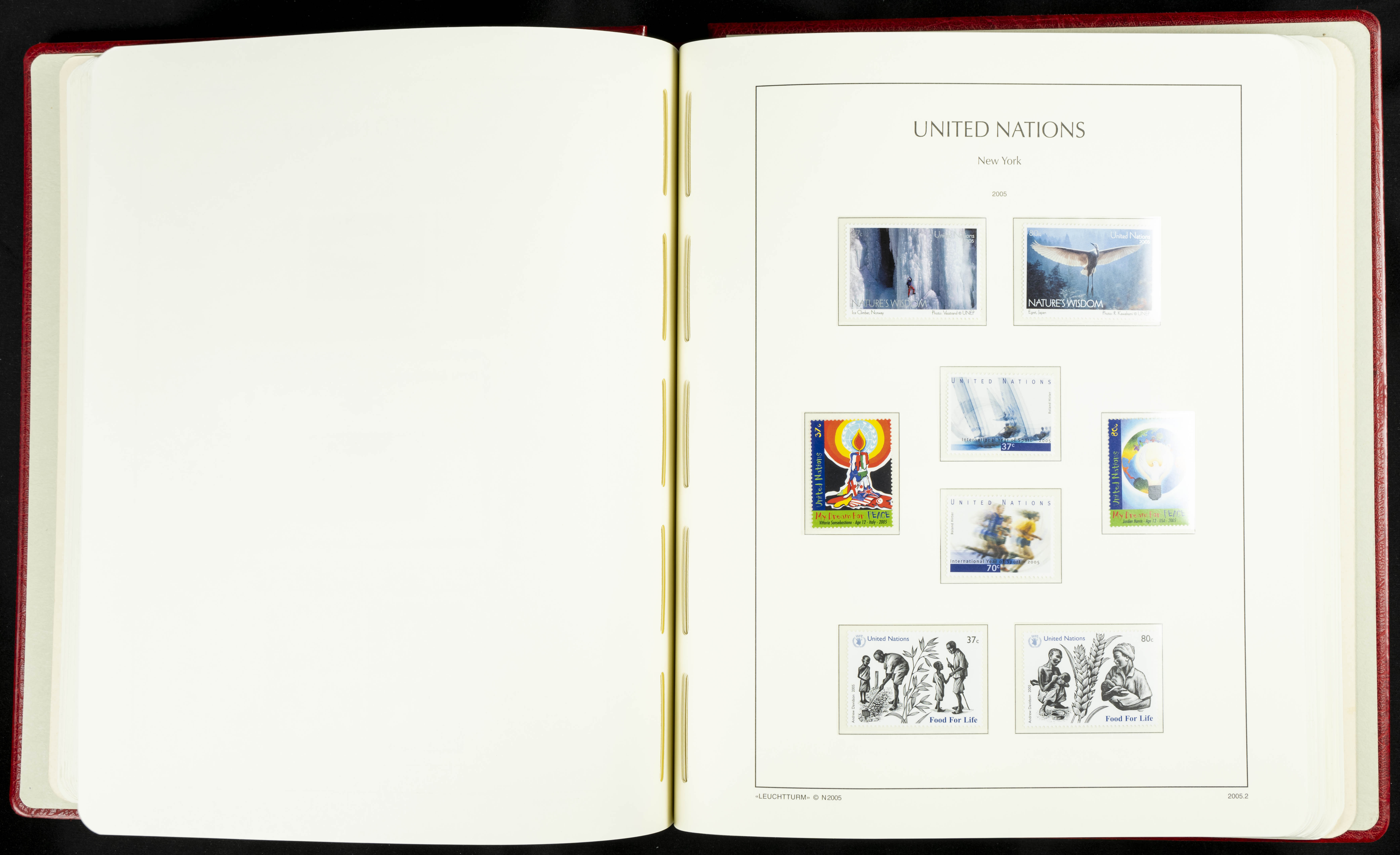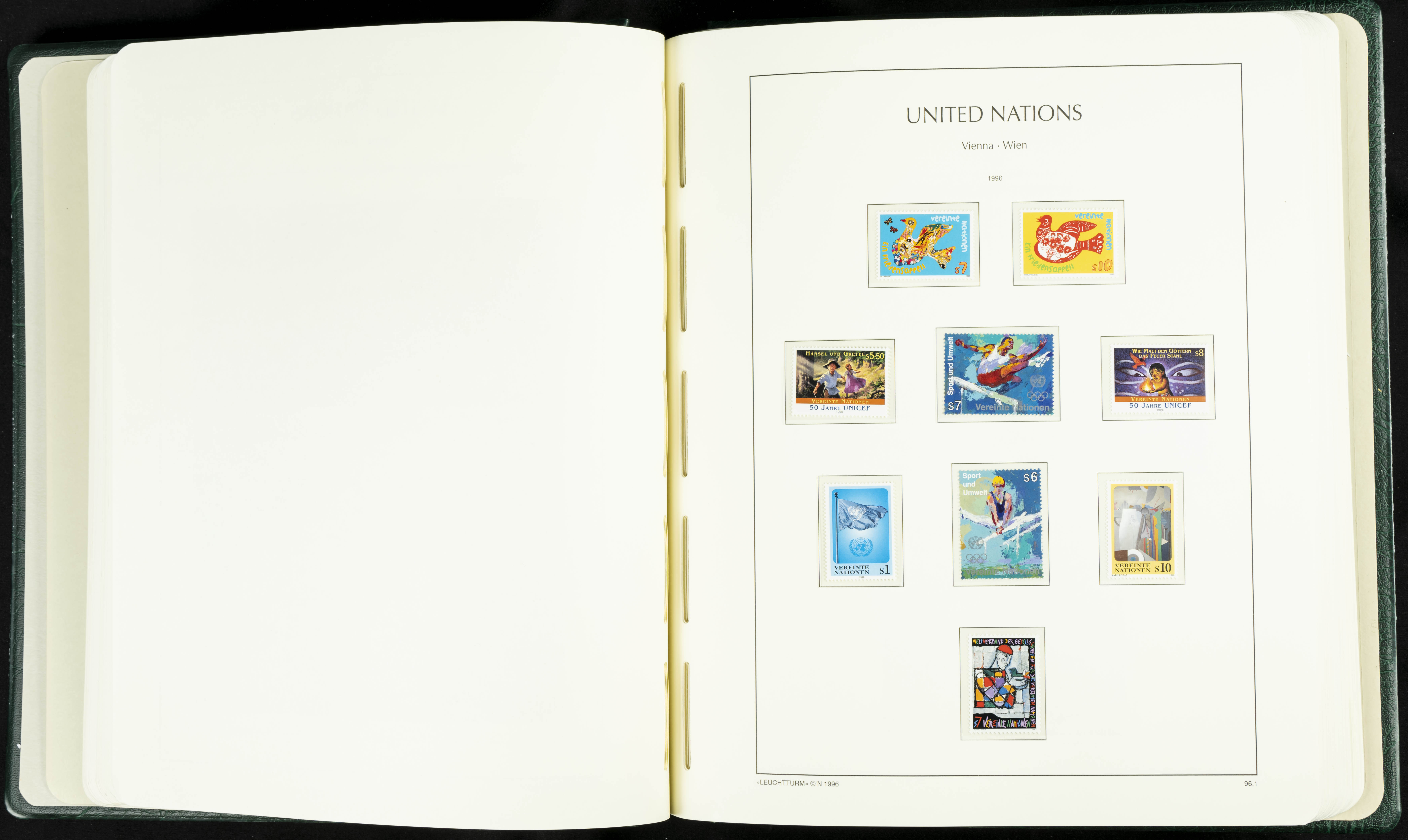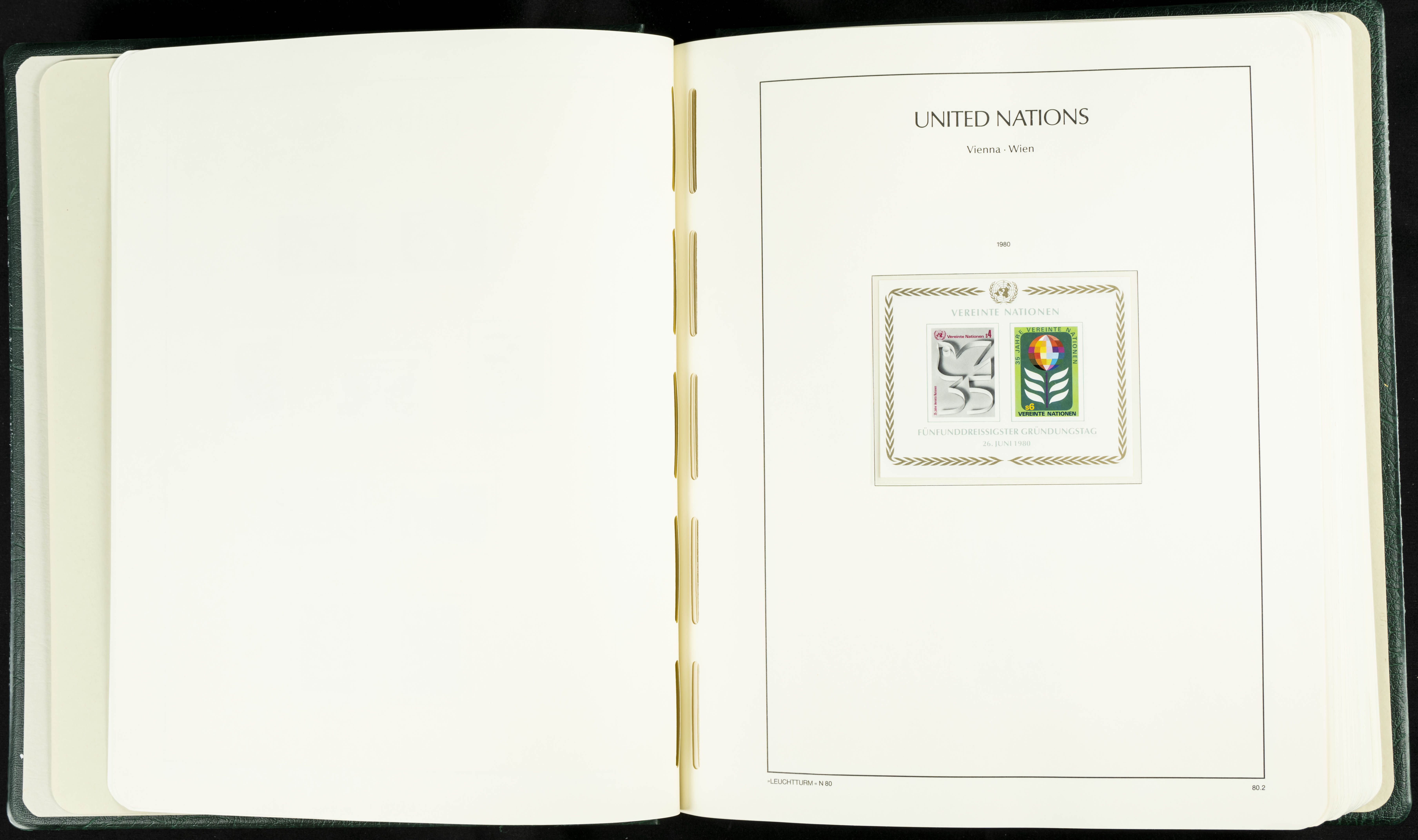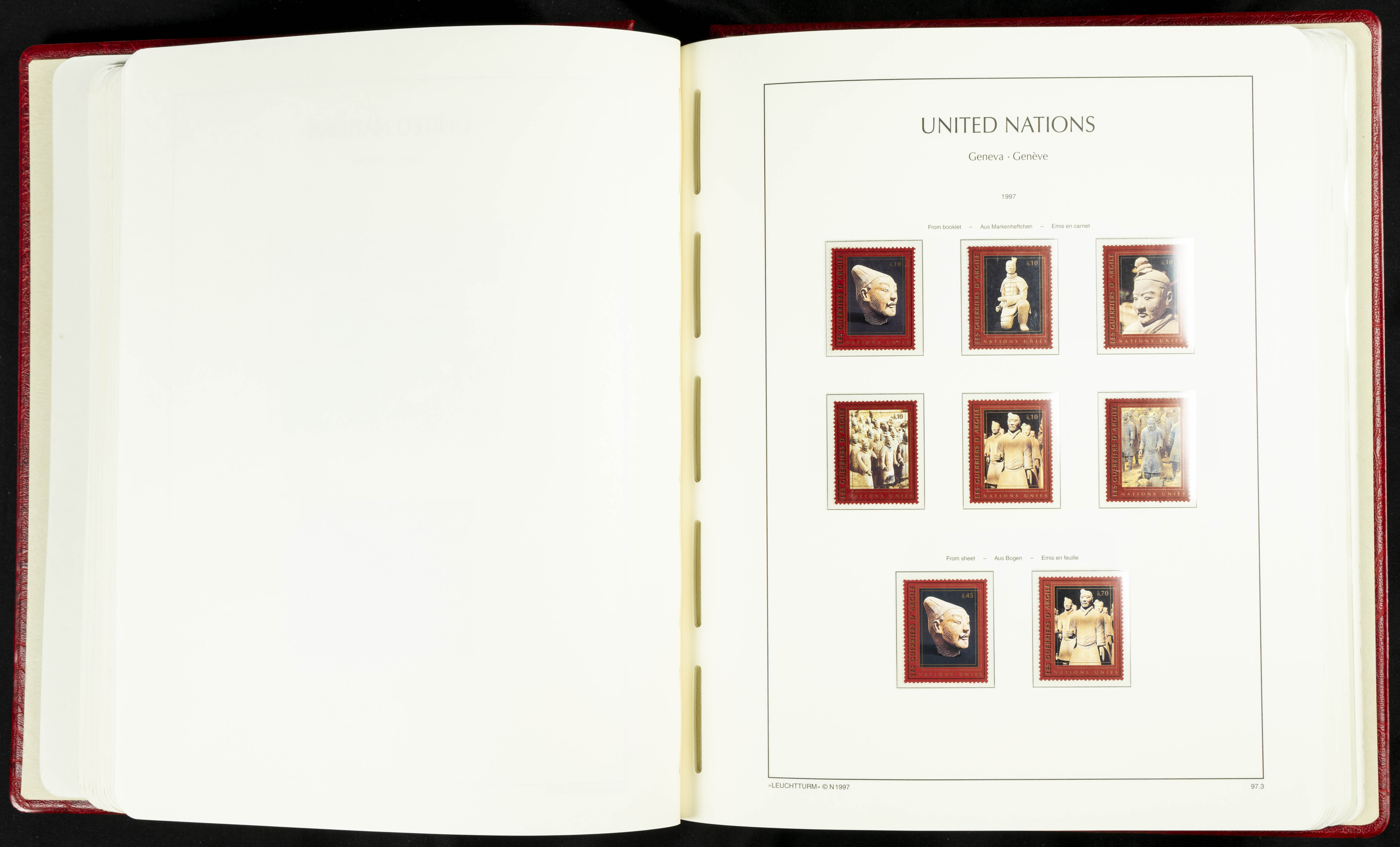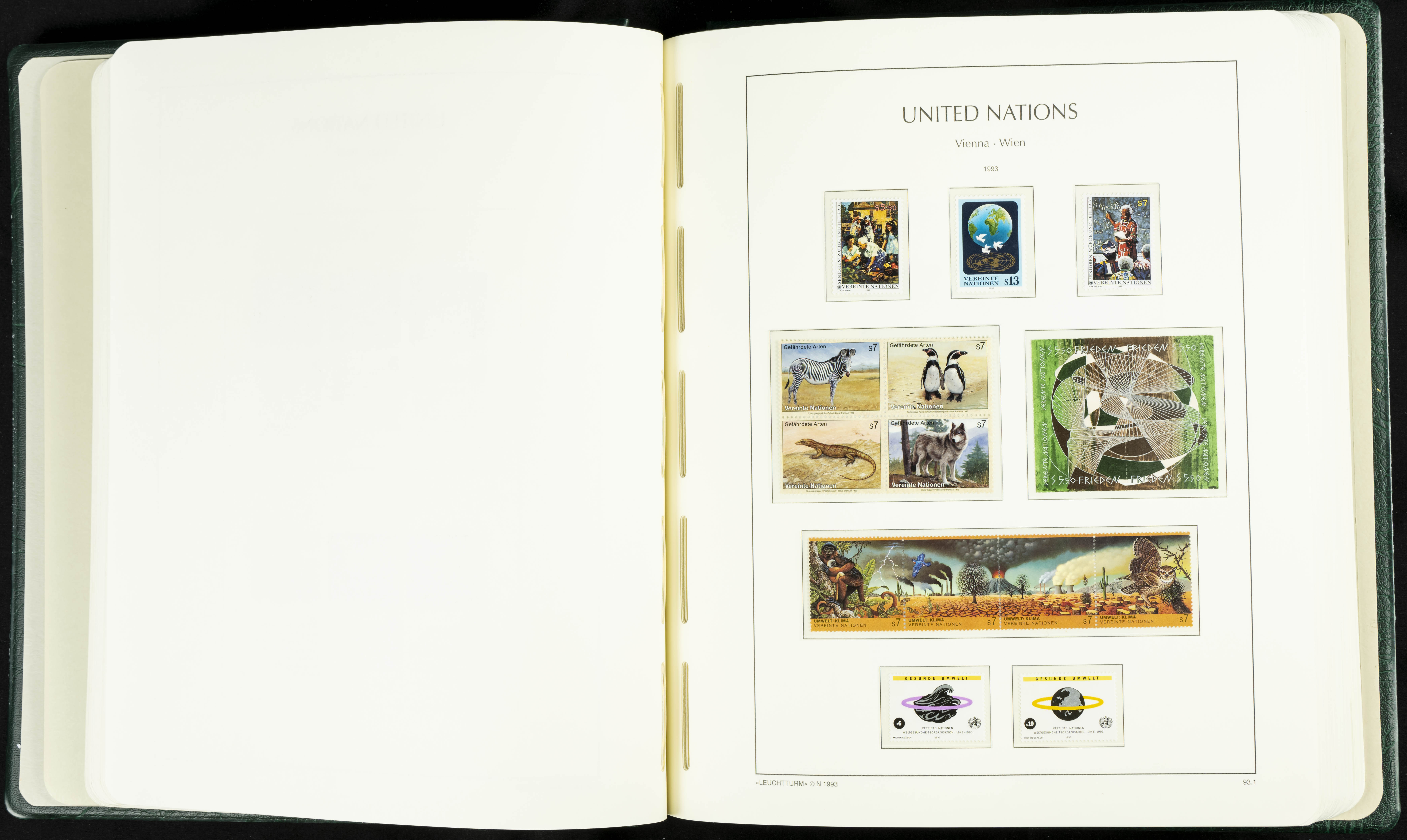 ★★(1951ca). Colección completa de Naciones Unidas (Nueva York, Ginebra y Viena) entre 1951 y 2011, en nuevo y sin fijasellos (montada en álbumes Faro). ALTO VALOR DE CATALOGO. A EXAMINAR.