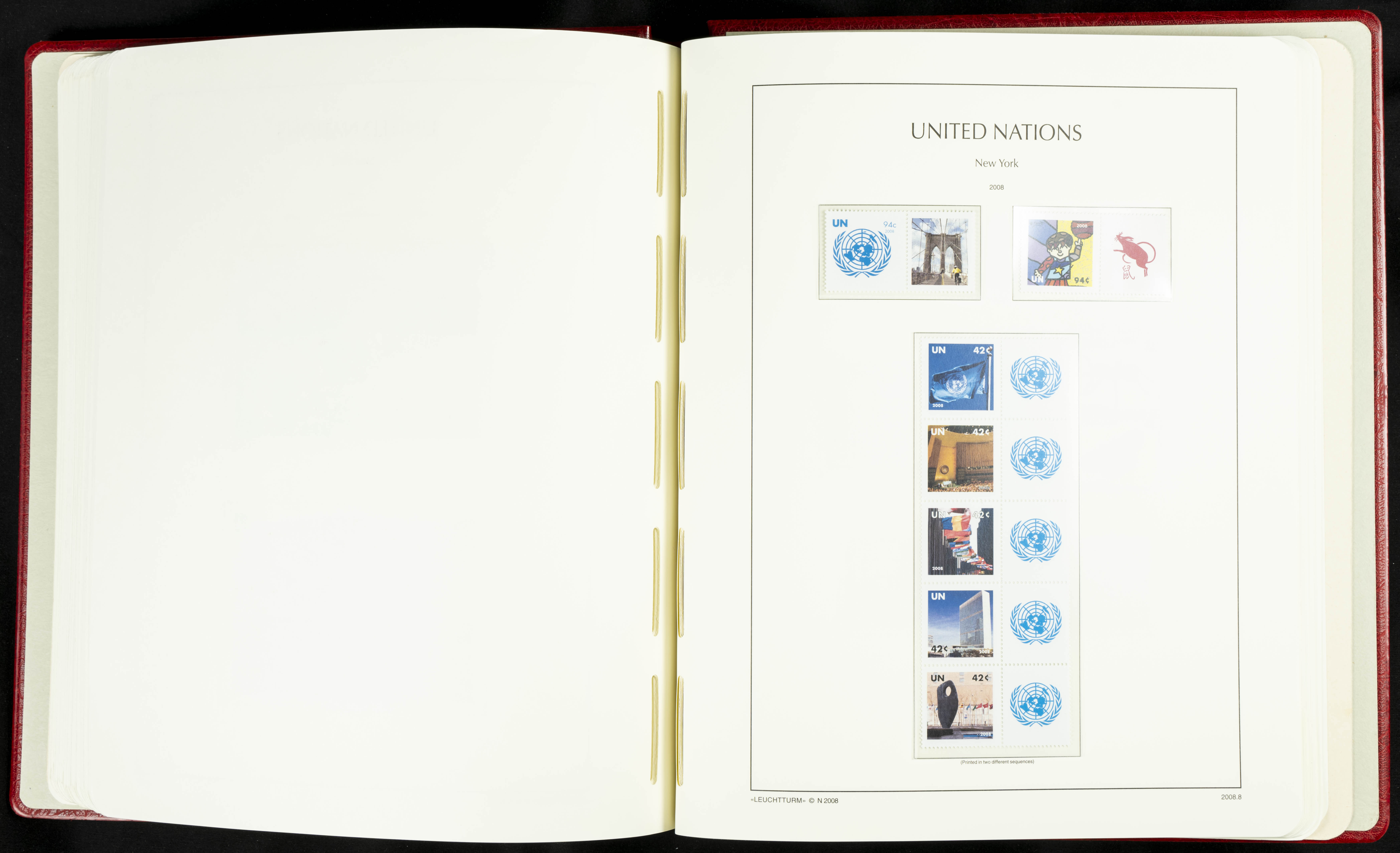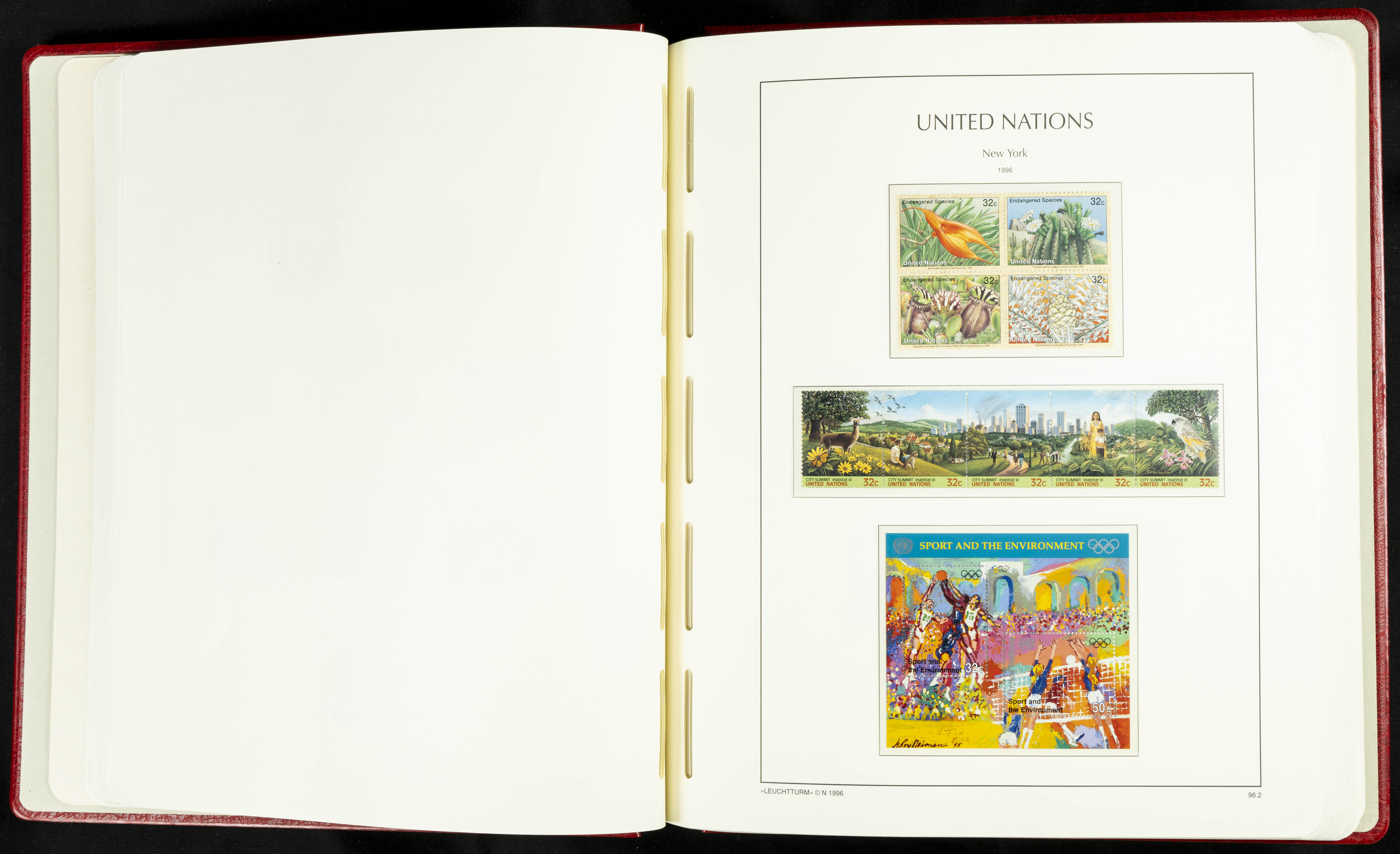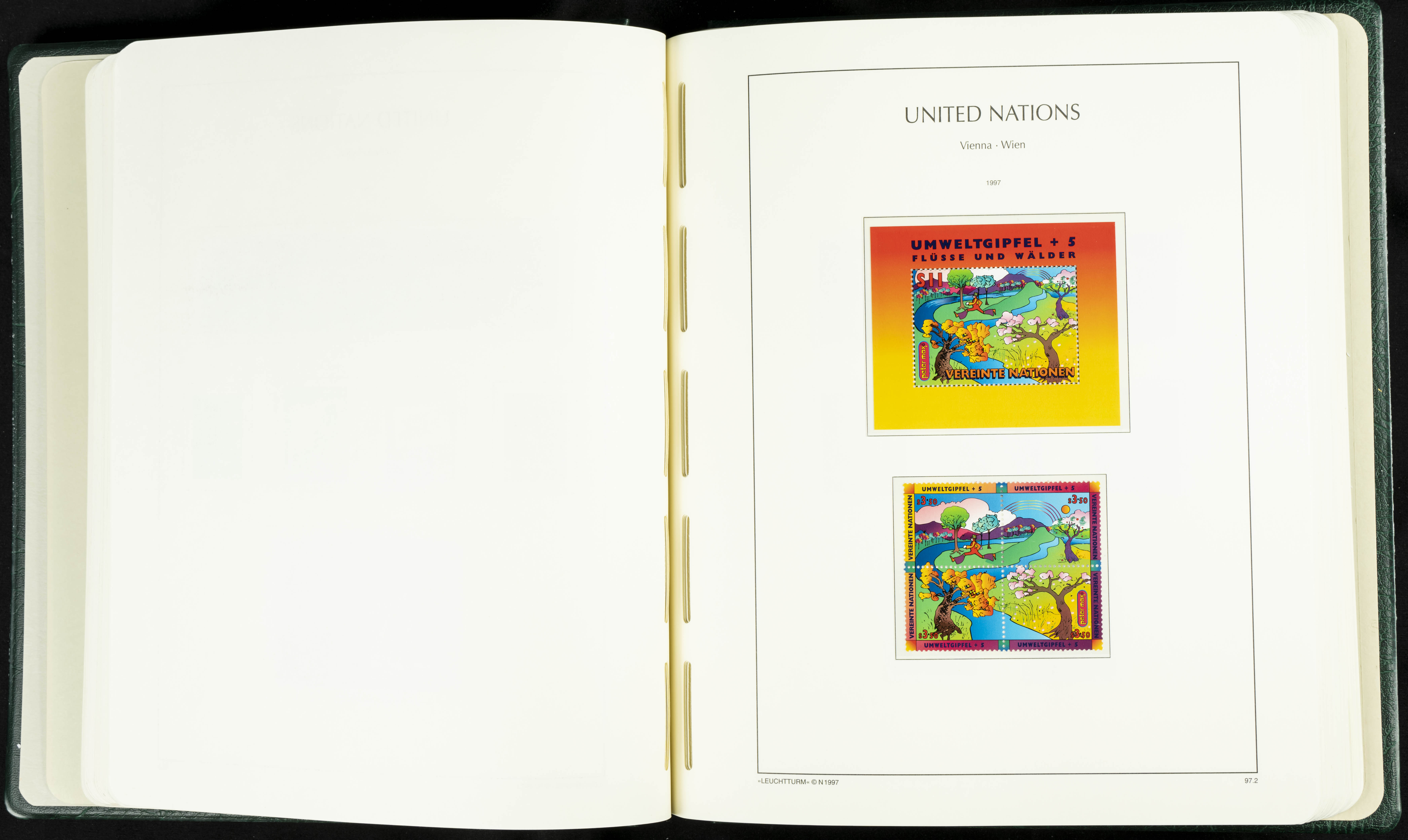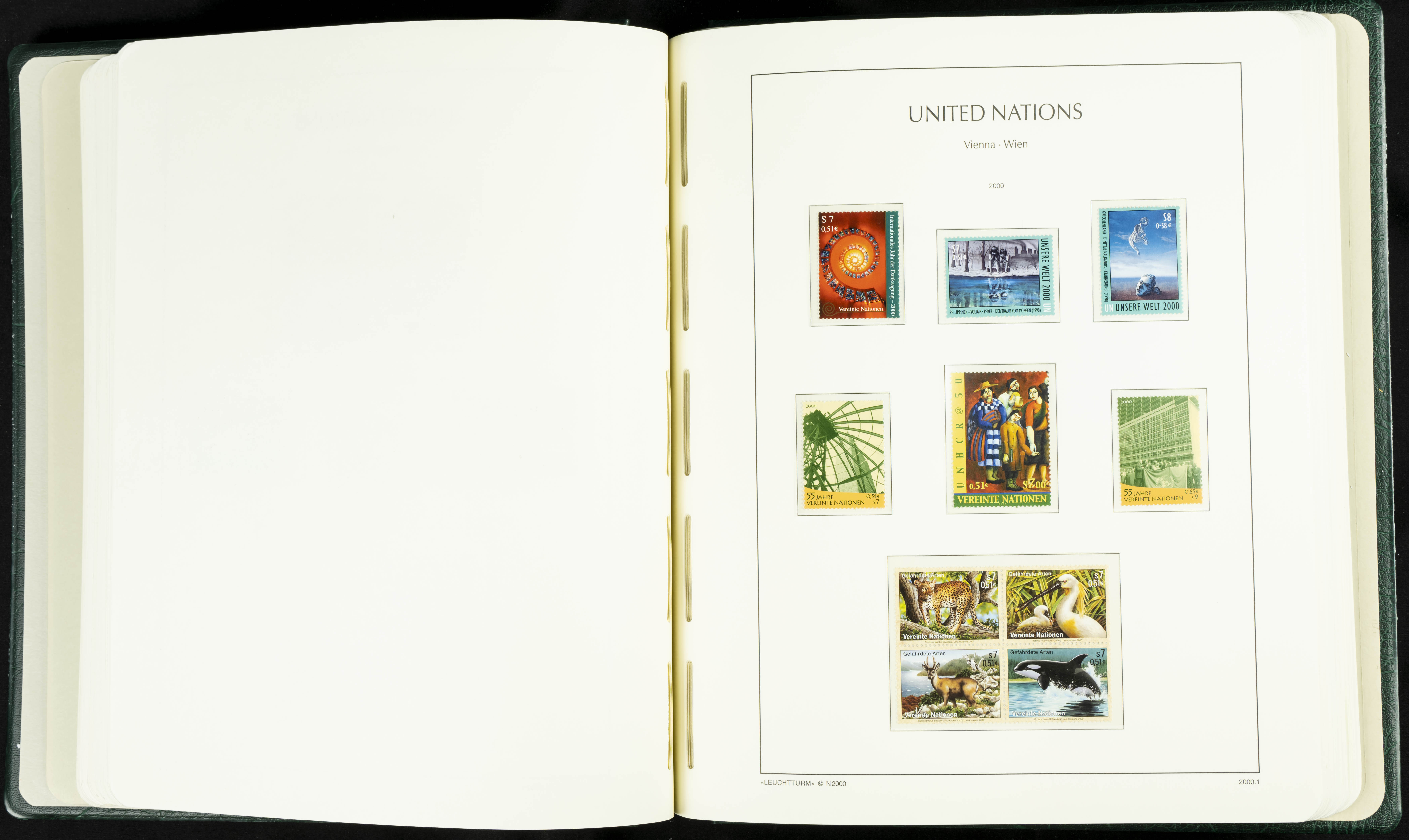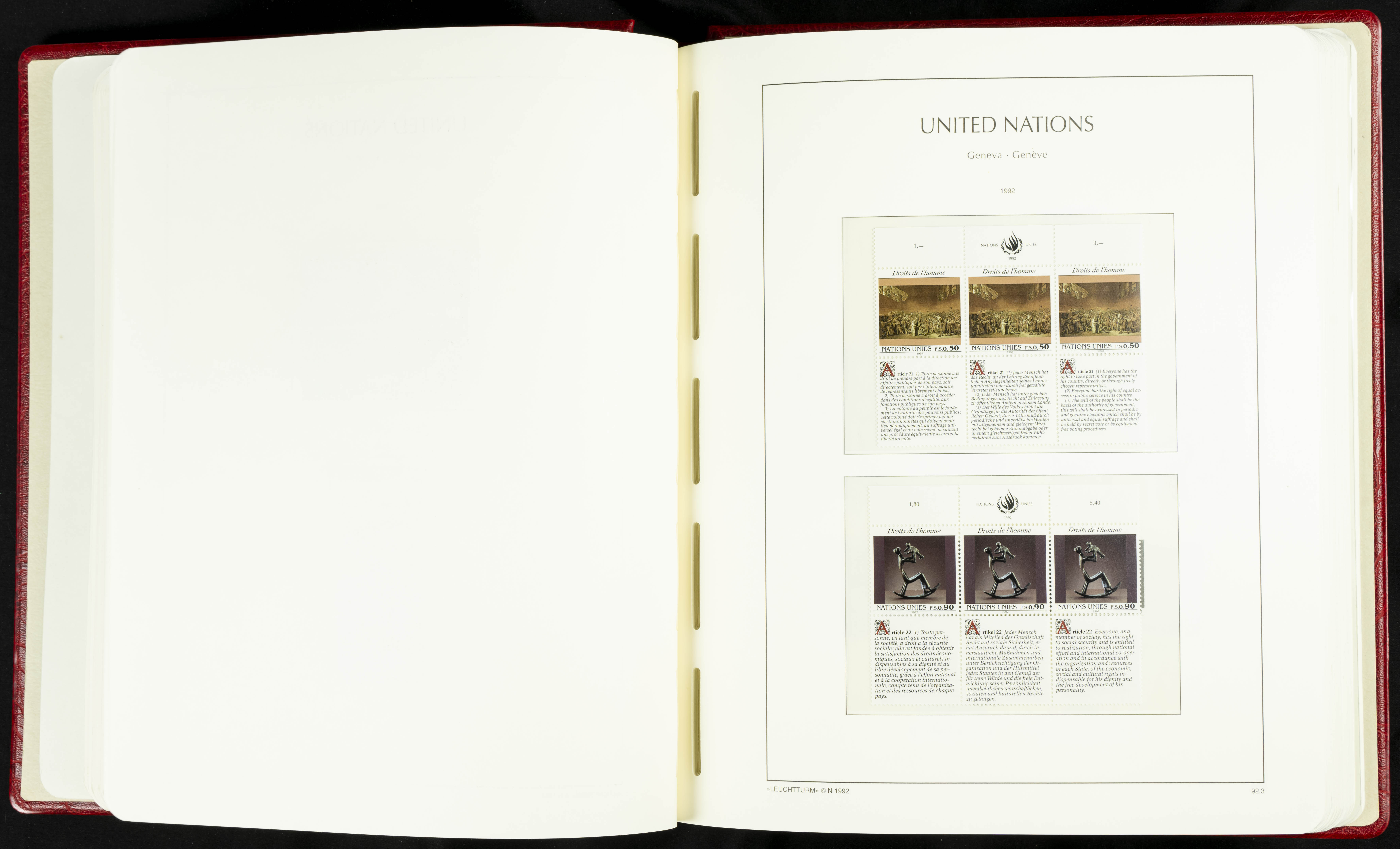 ★★(1951ca). Colección completa de Naciones Unidas (Nueva York, Ginebra y Viena) entre 1951 y 2011, en nuevo y sin fijasellos (montada en álbumes Faro). ALTO VALOR DE CATALOGO. A EXAMINAR.