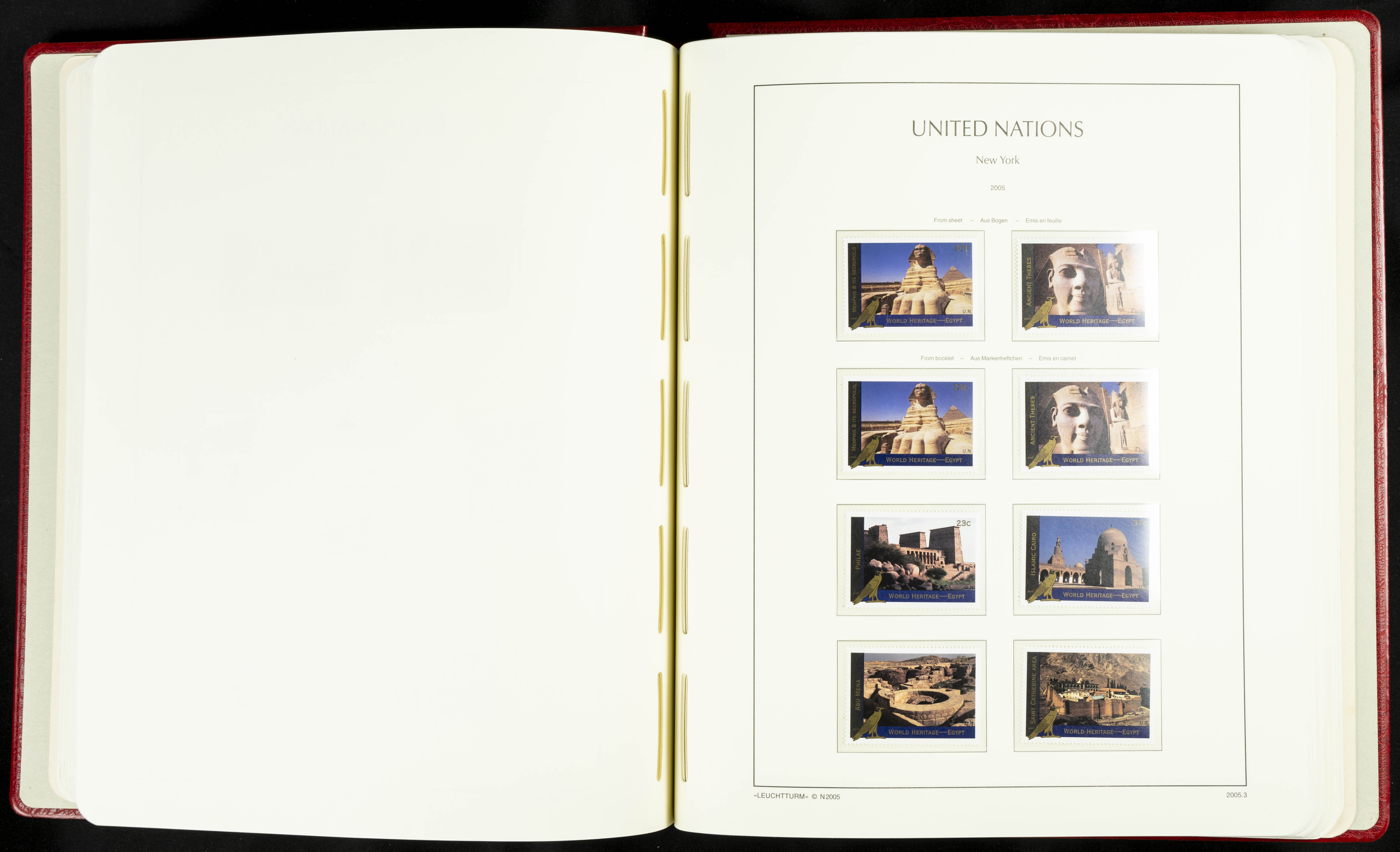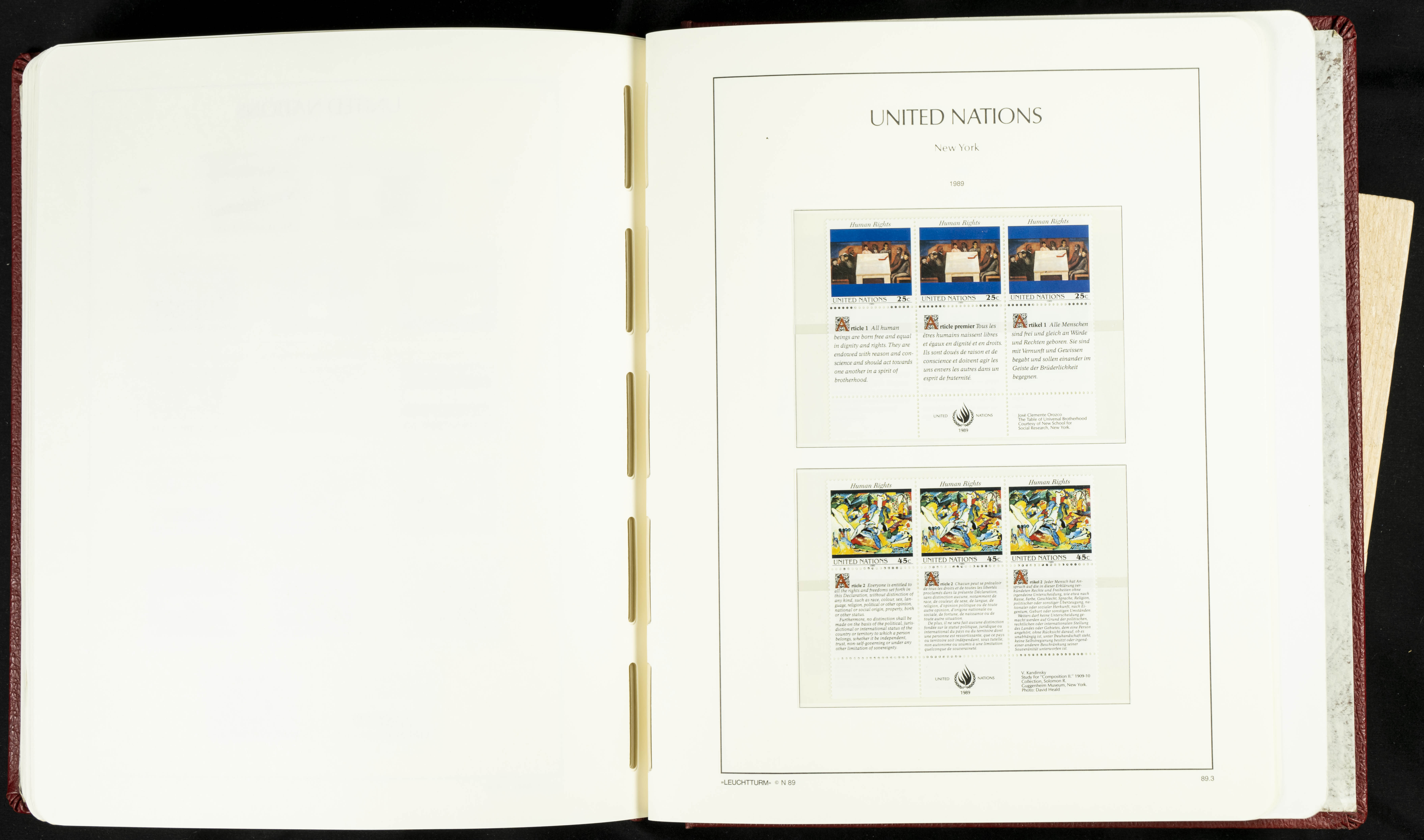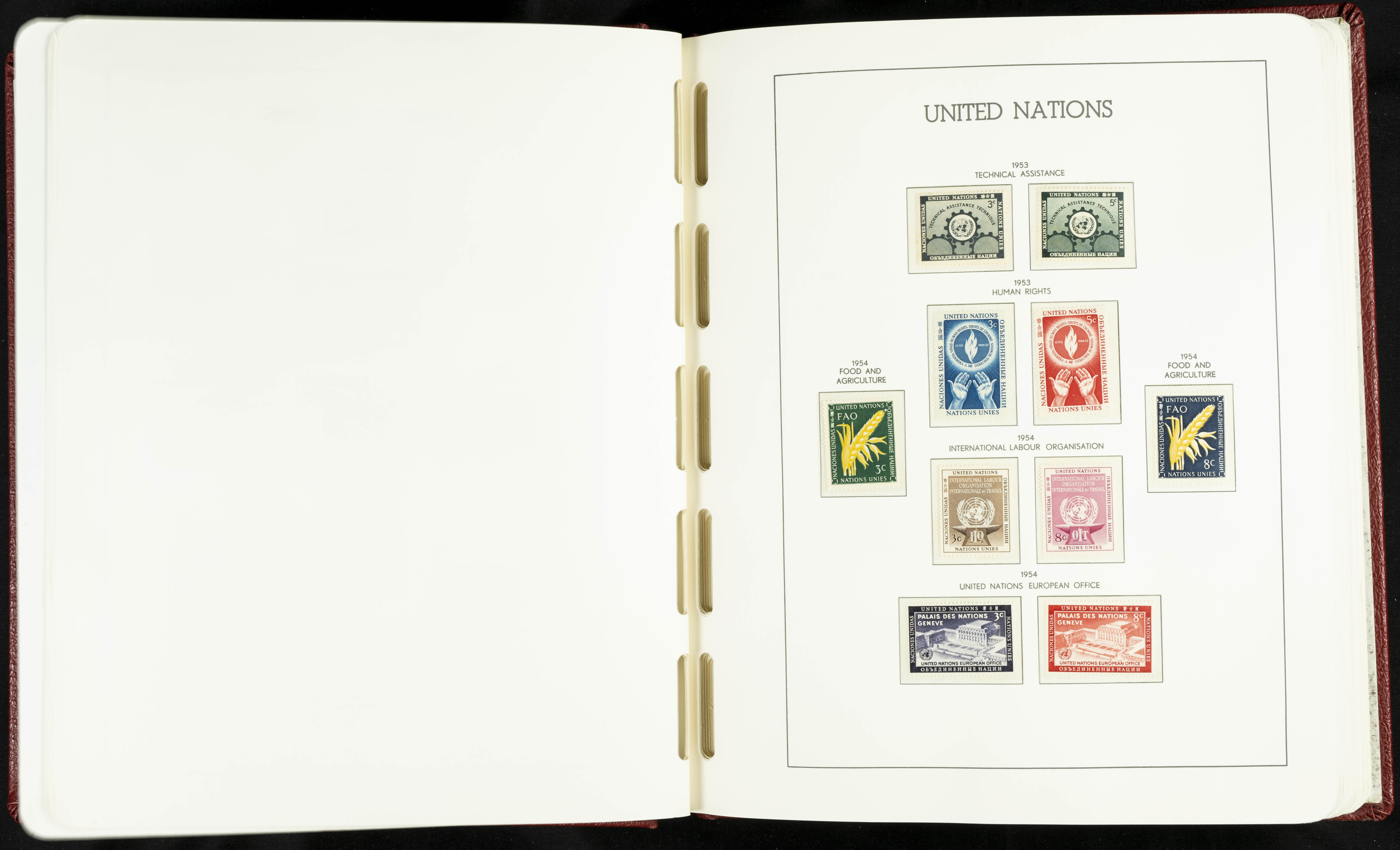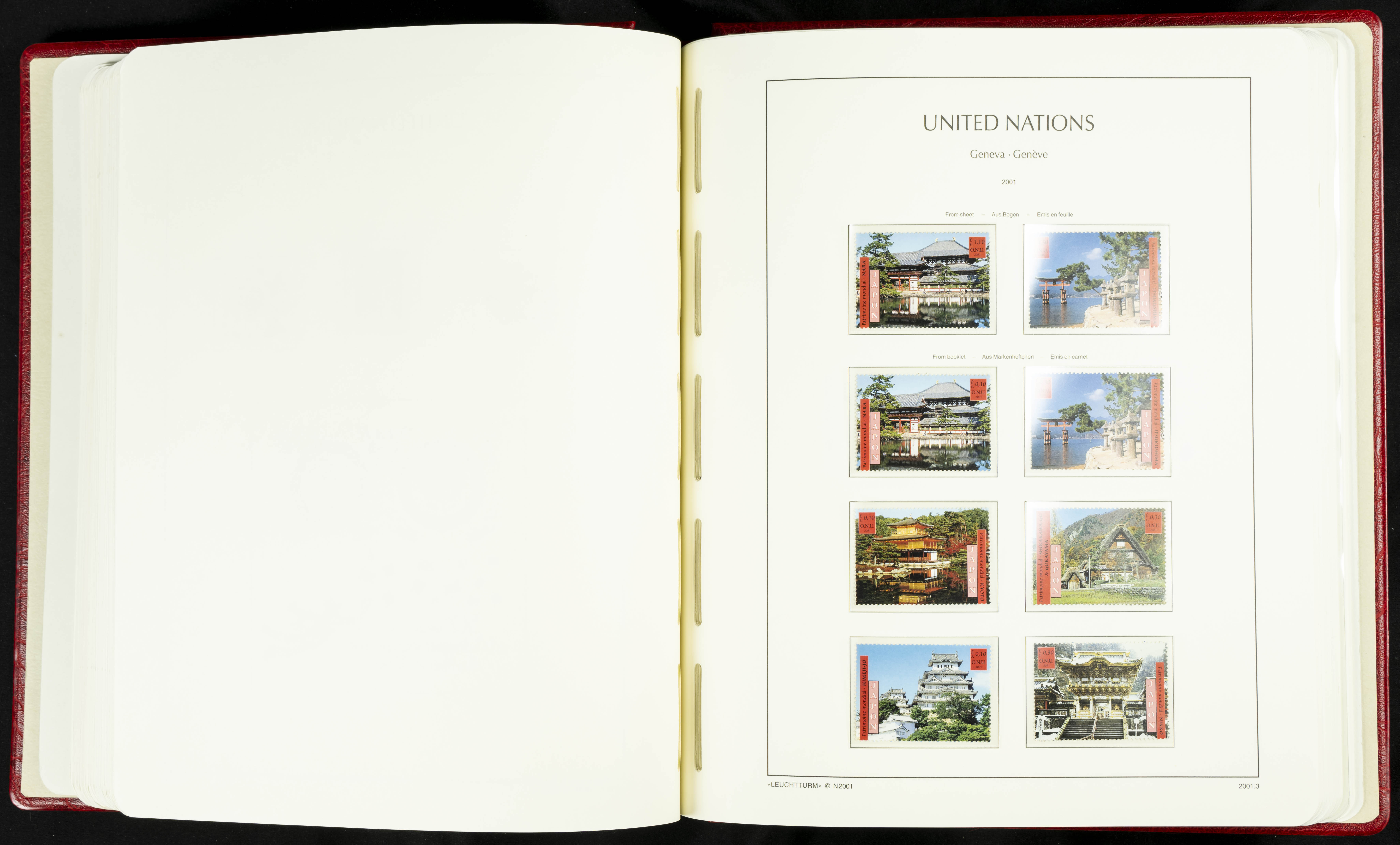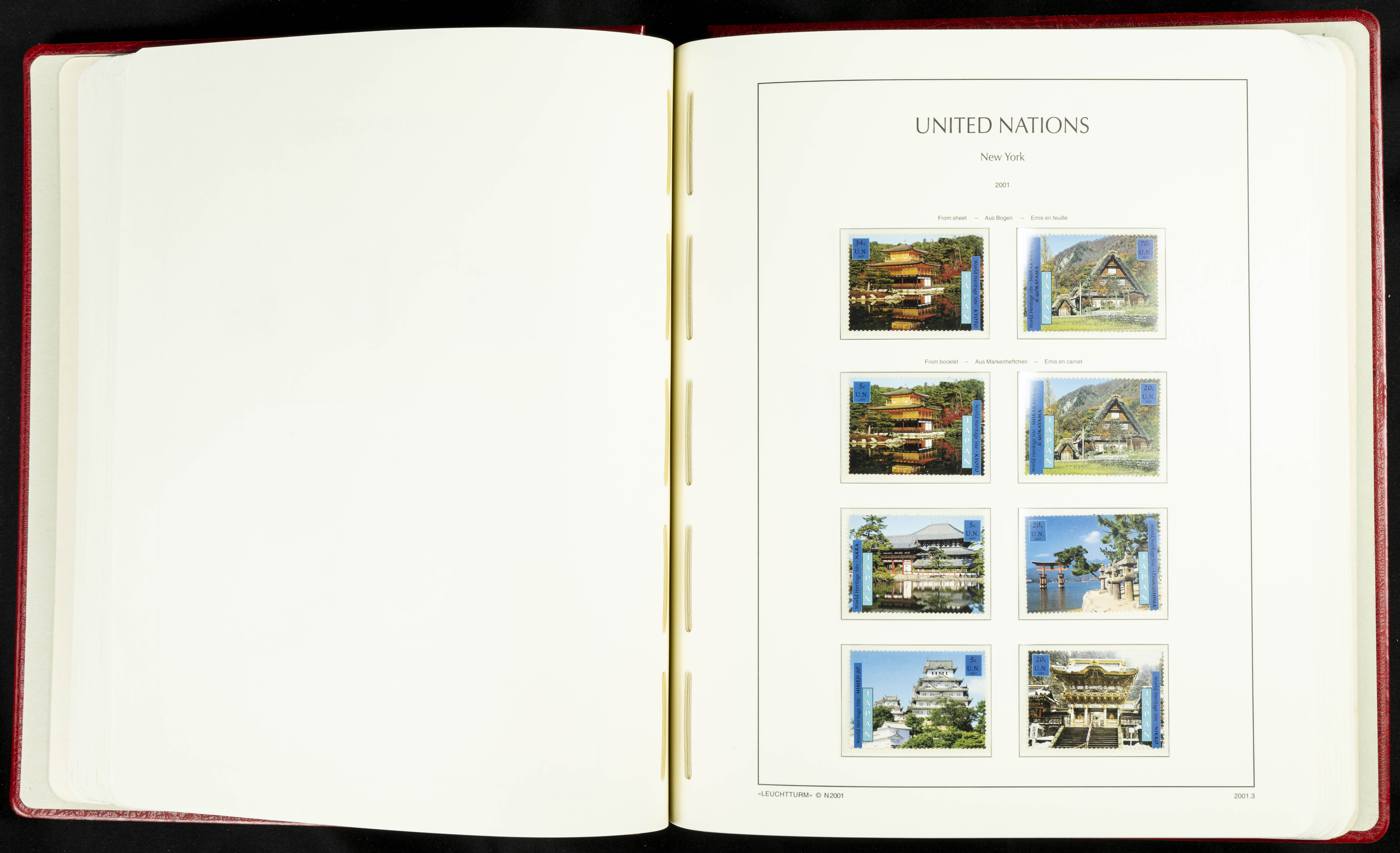 ★★(1951ca). Colección completa de Naciones Unidas (Nueva York, Ginebra y Viena) entre 1951 y 2011, en nuevo y sin fijasellos (montada en álbumes Faro). ALTO VALOR DE CATALOGO. A EXAMINAR.