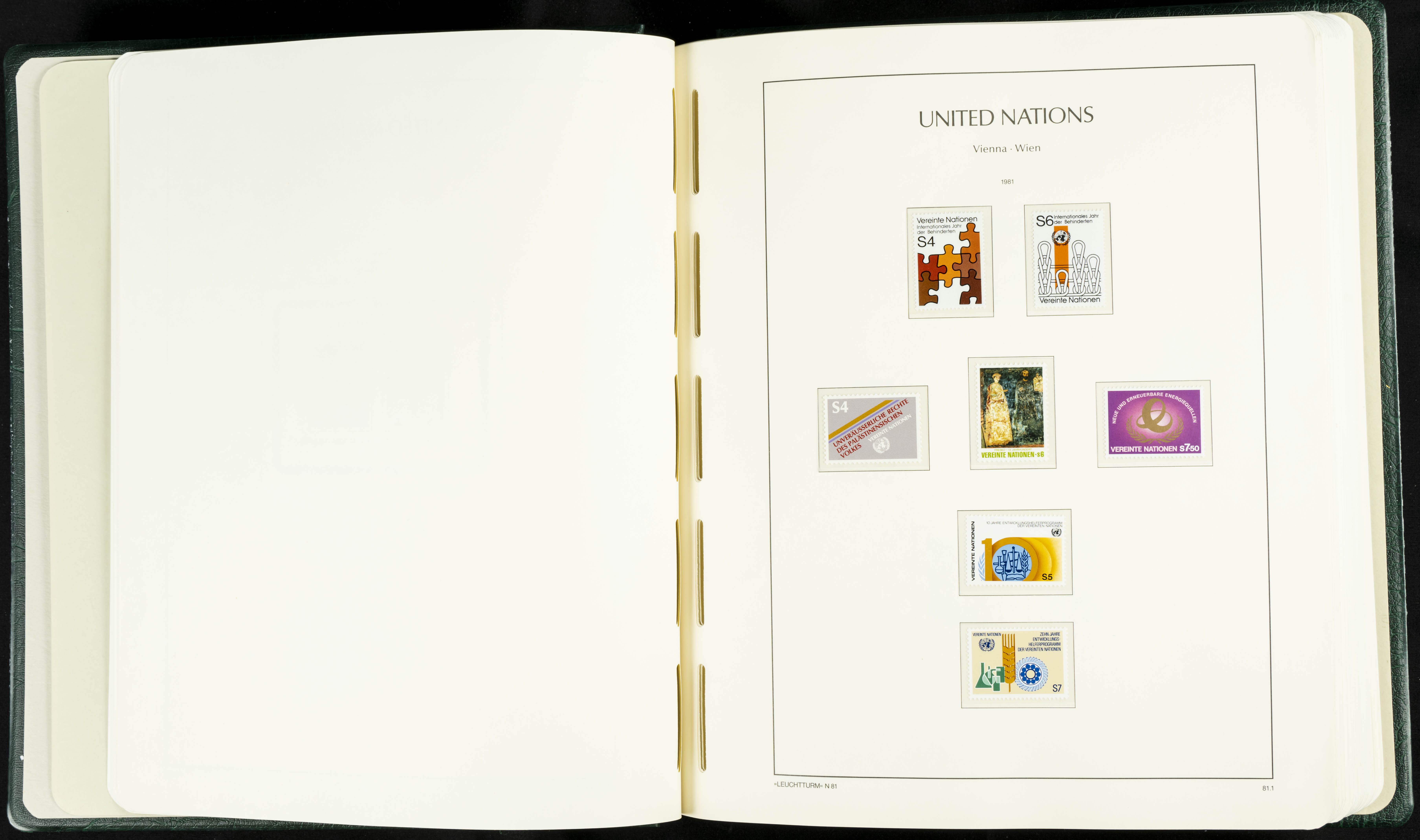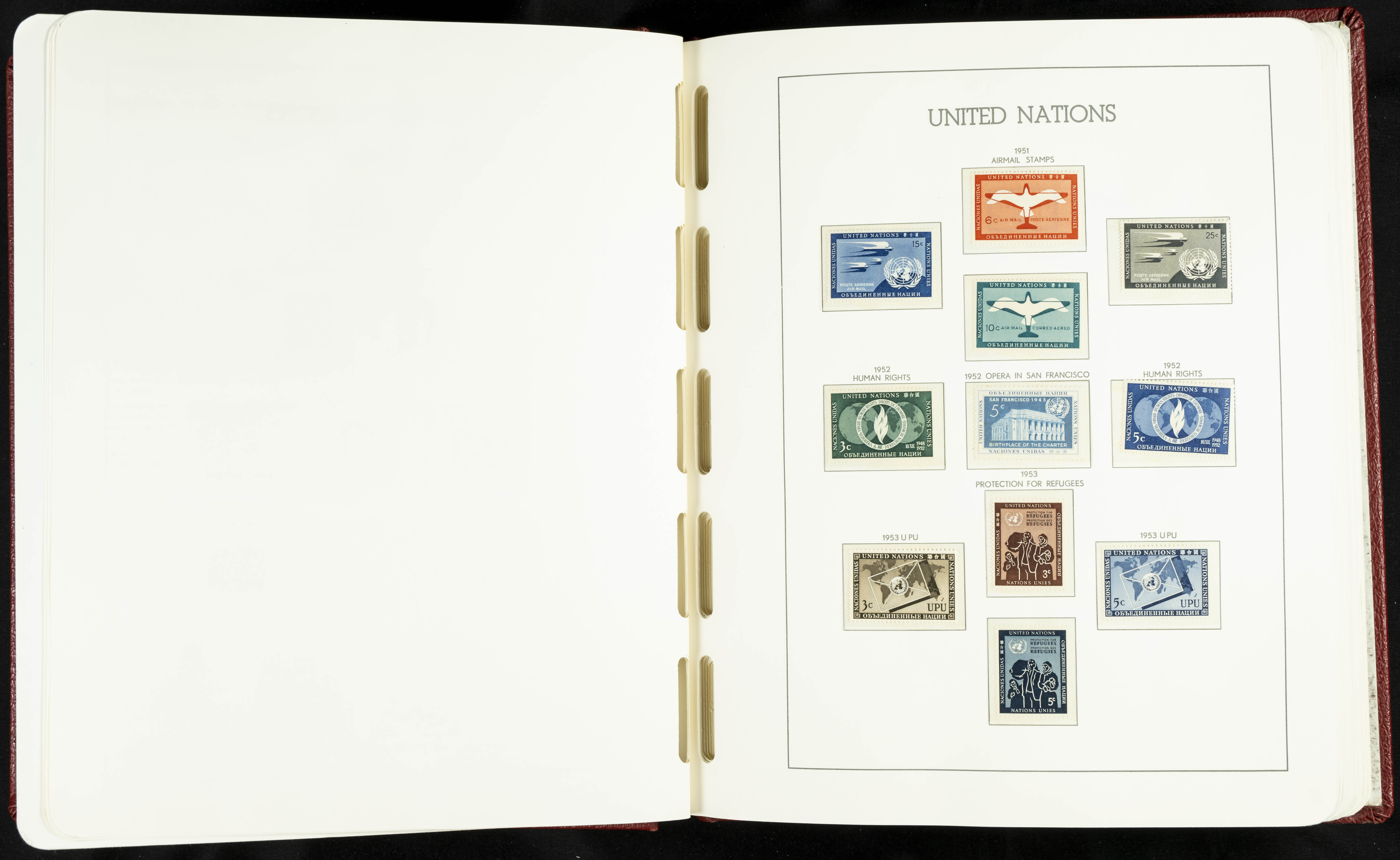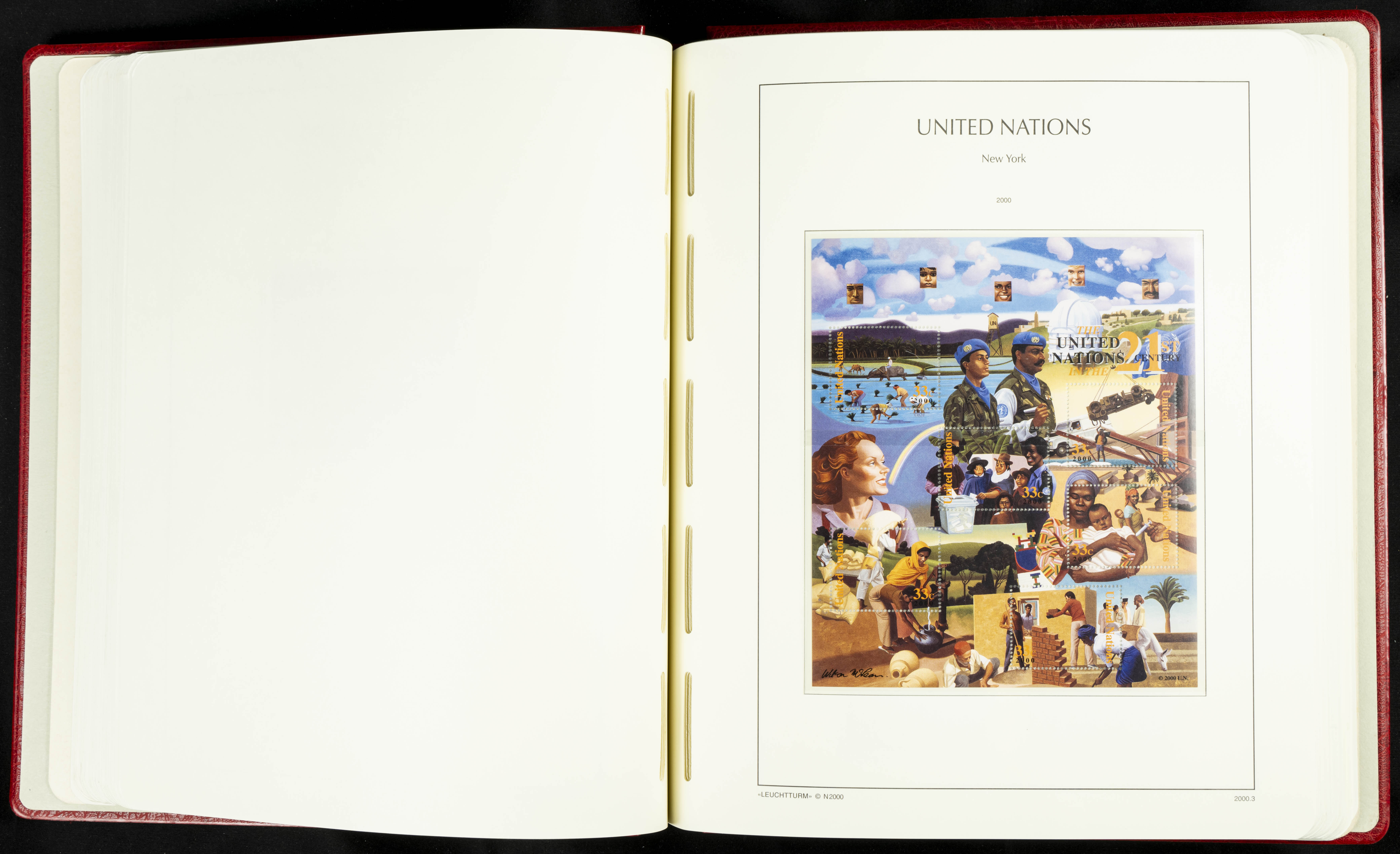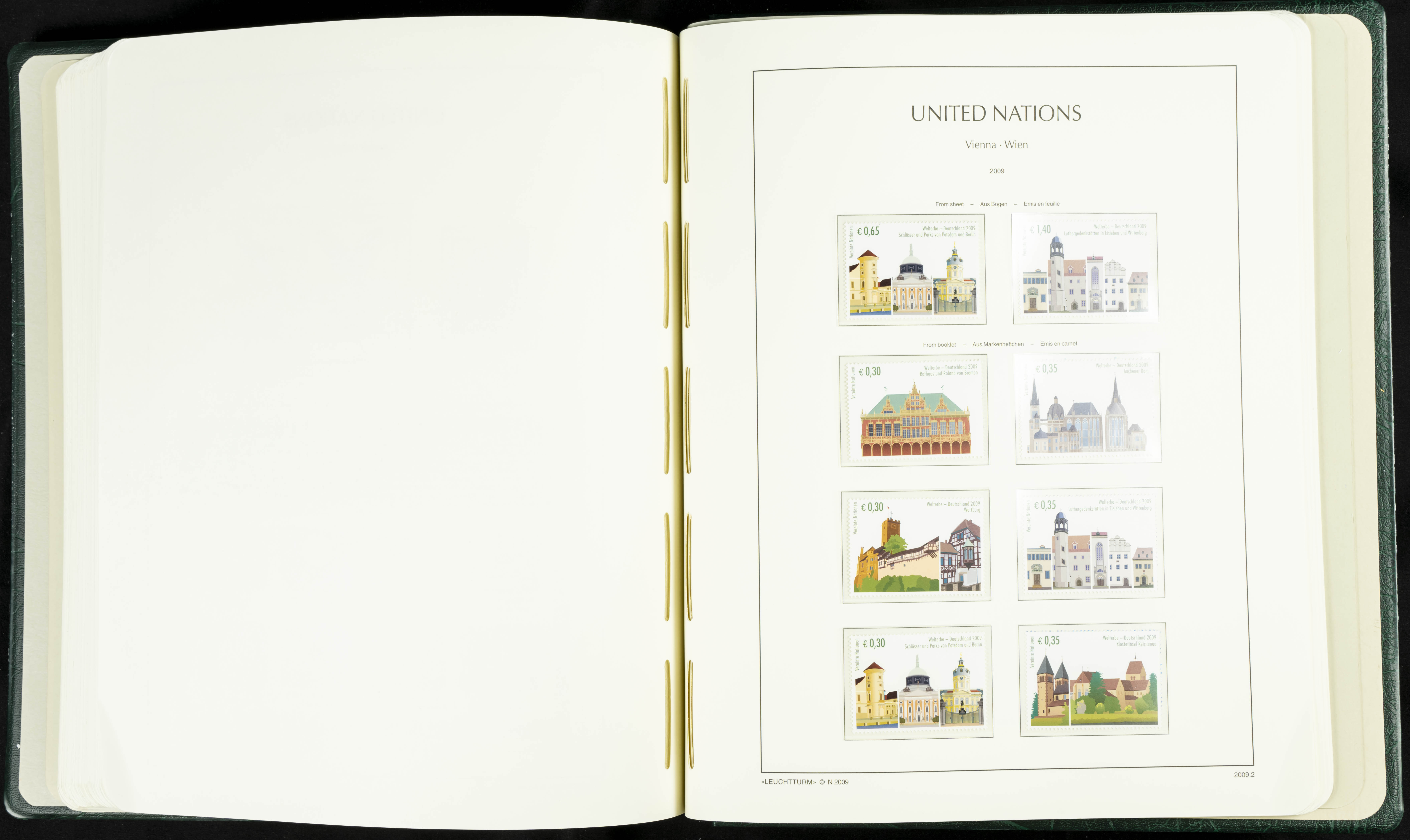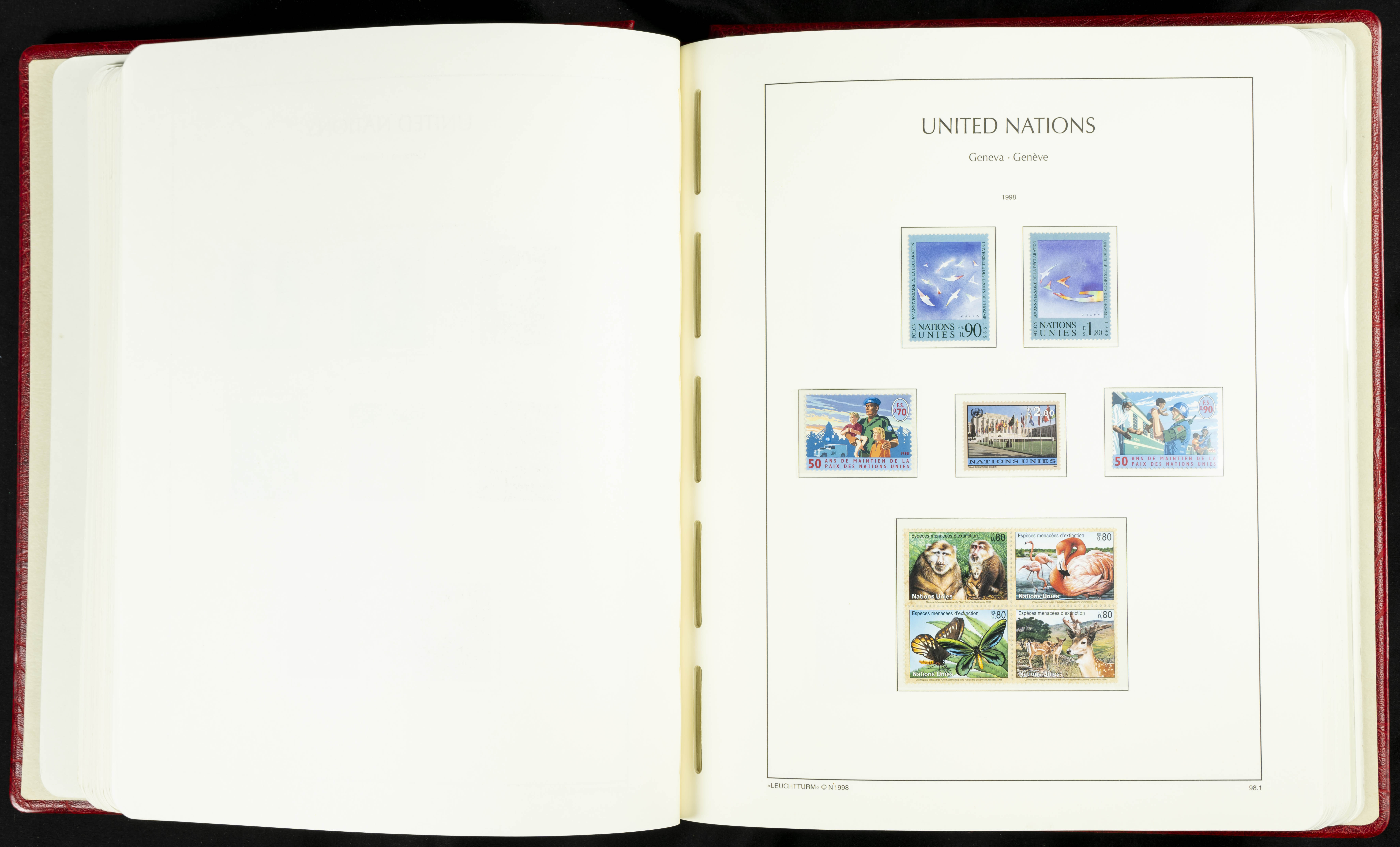 ★★(1951ca). Colección completa de Naciones Unidas (Nueva York, Ginebra y Viena) entre 1951 y 2011, en nuevo y sin fijasellos (montada en álbumes Faro). ALTO VALOR DE CATALOGO. A EXAMINAR.