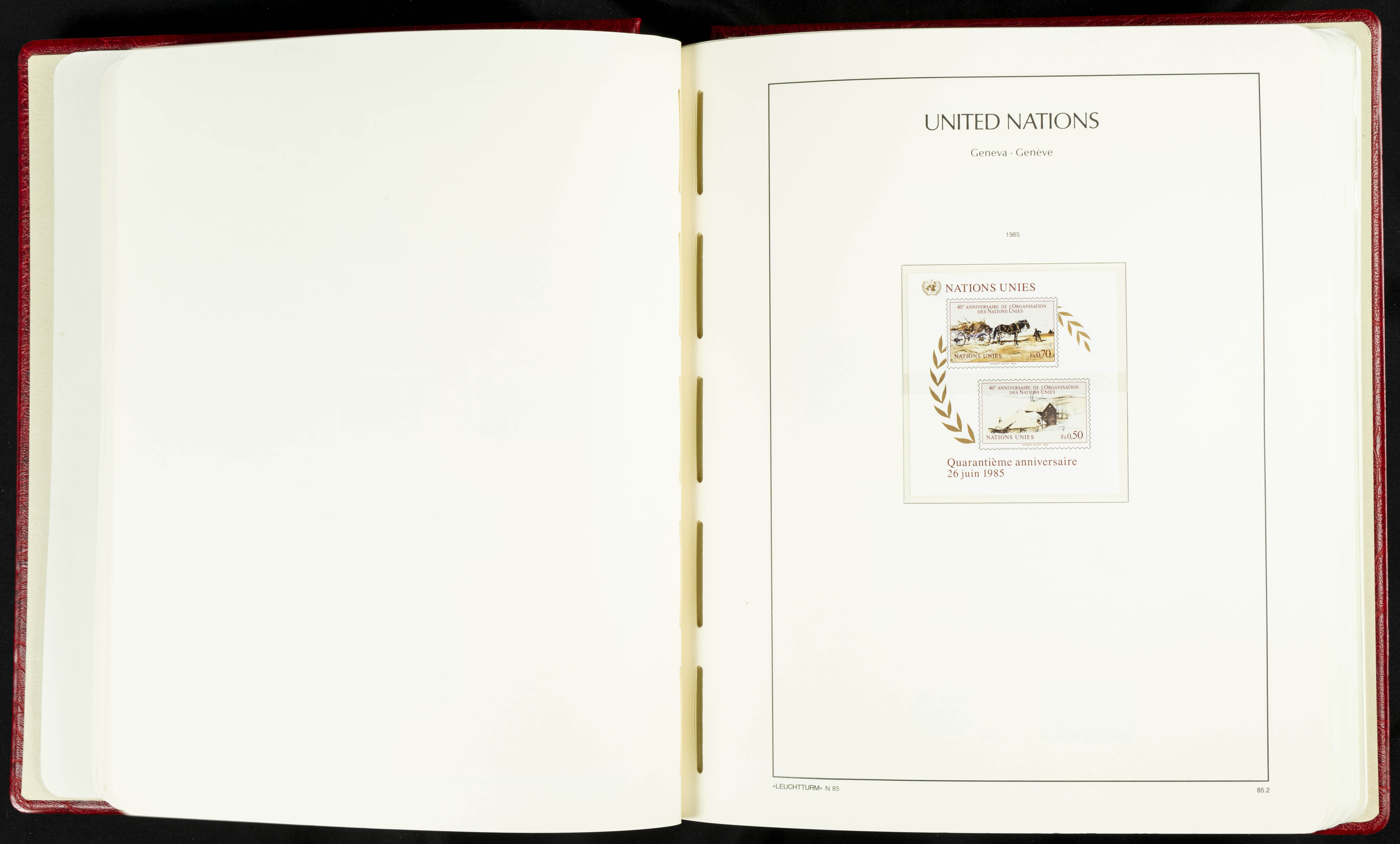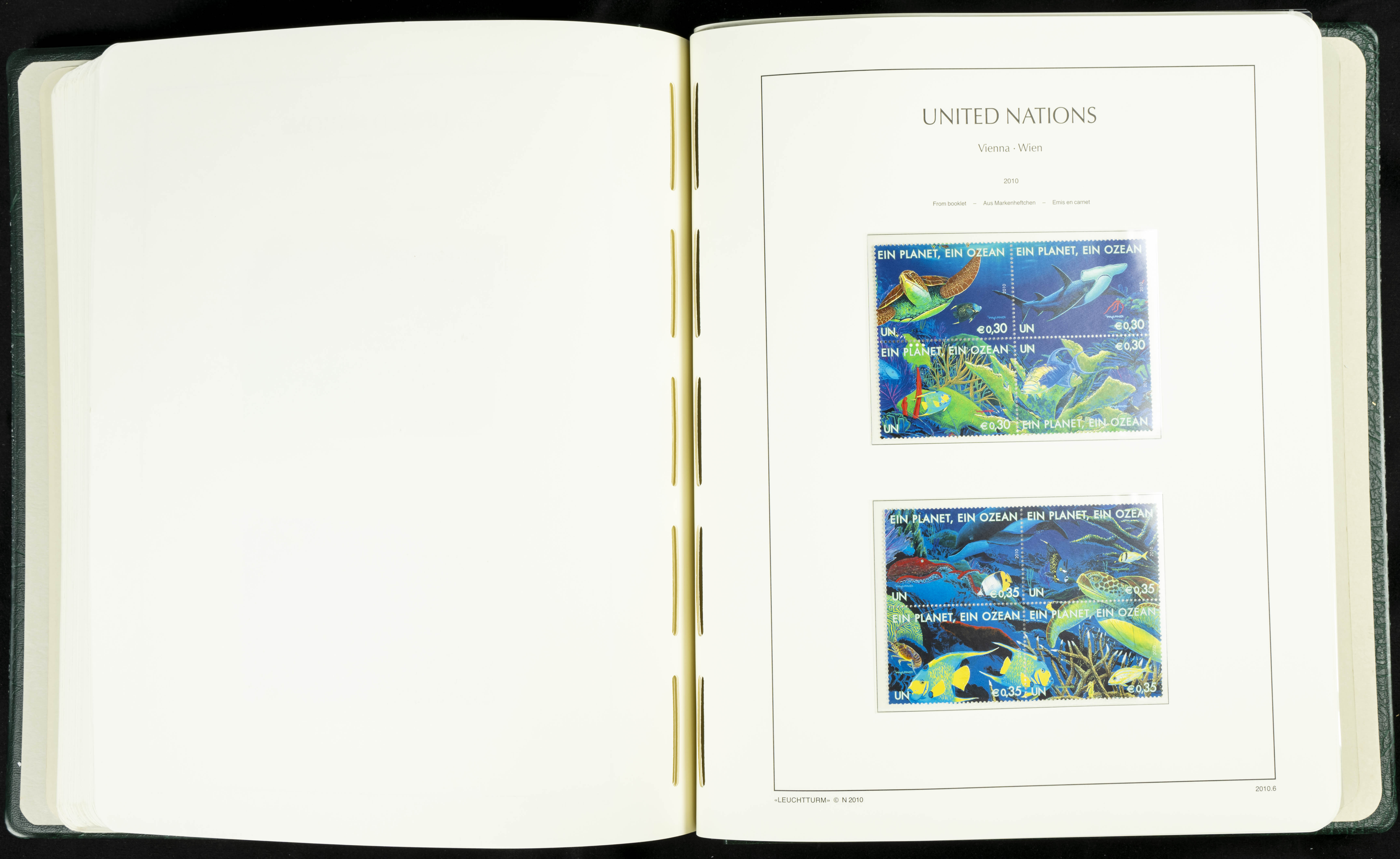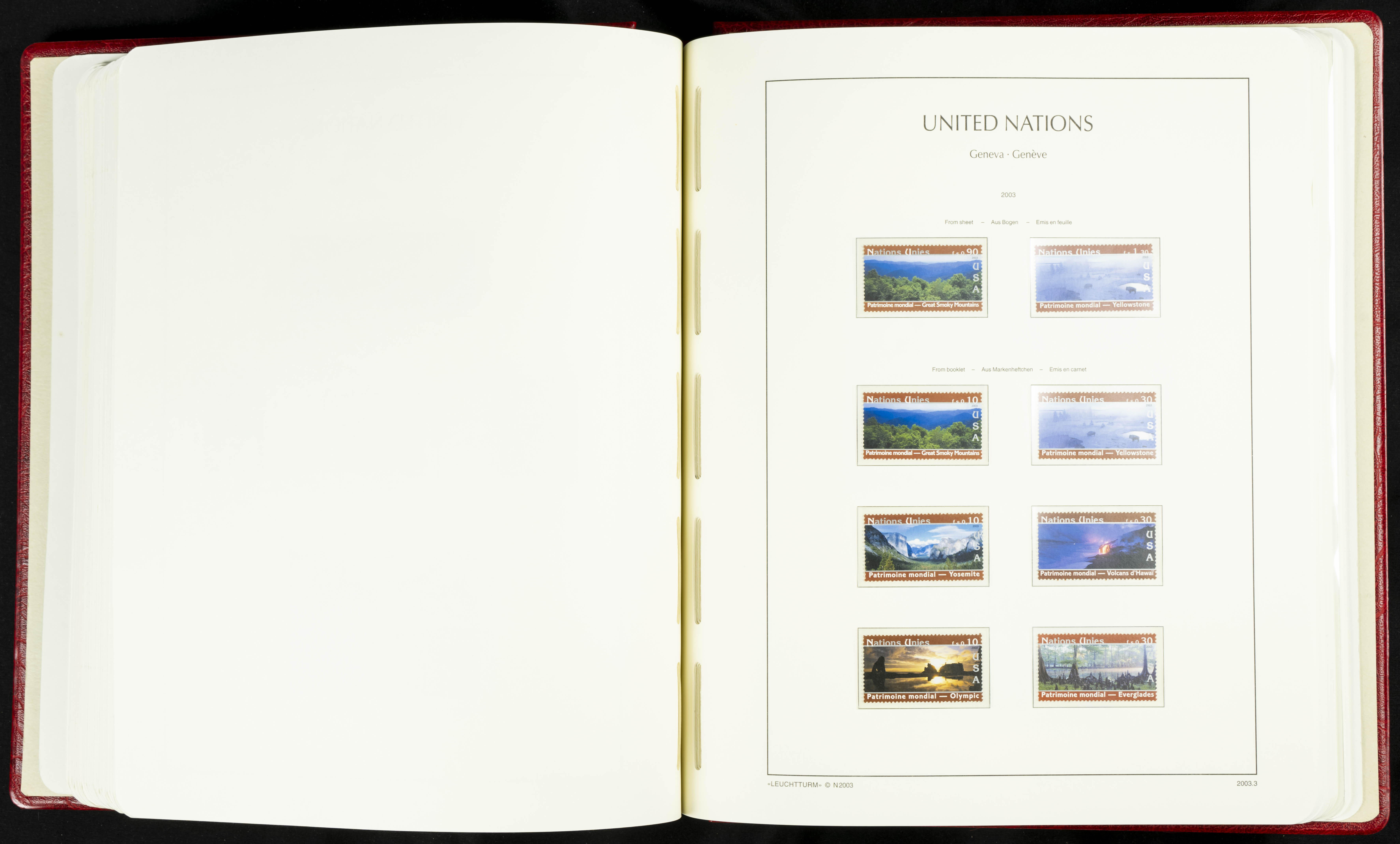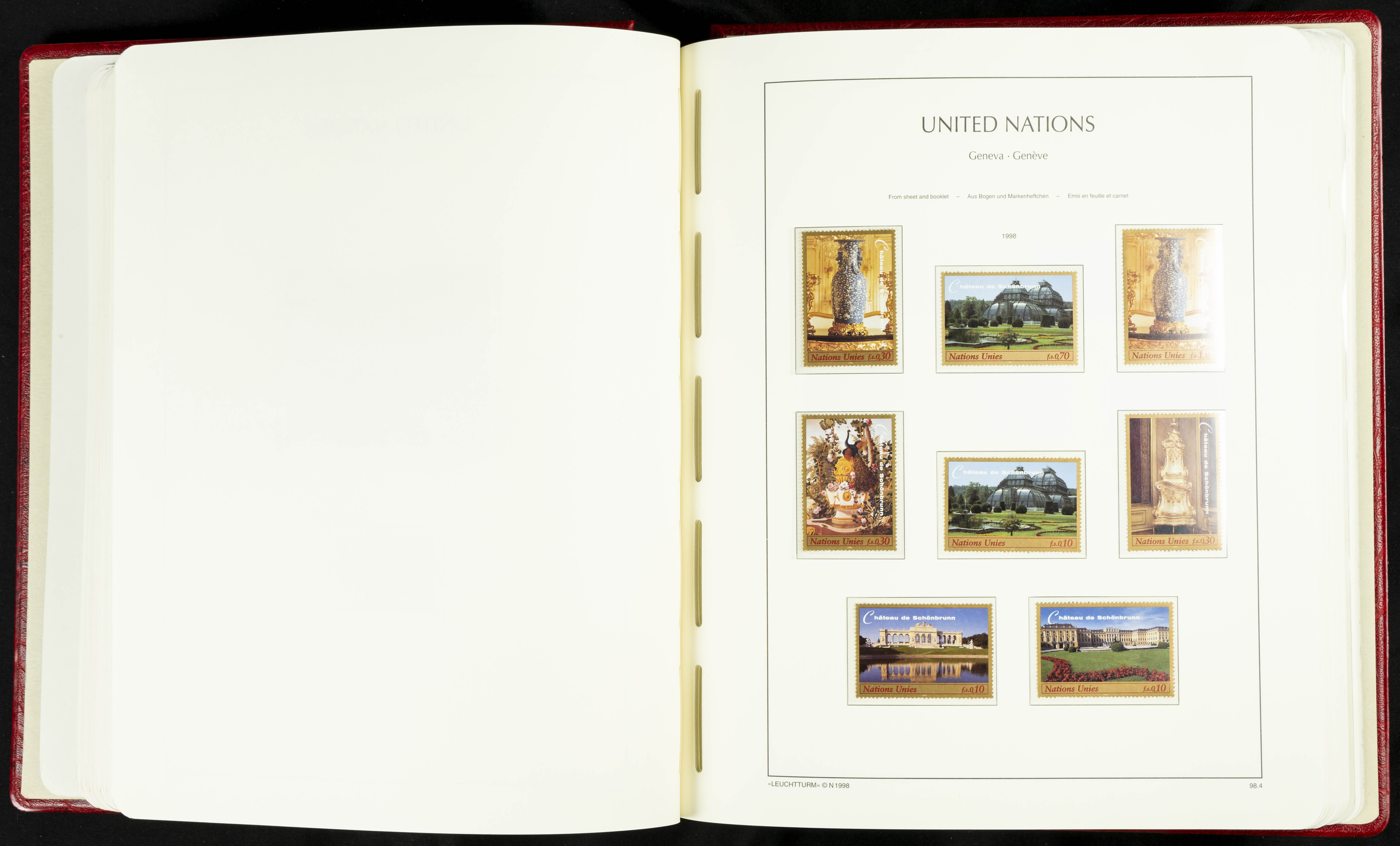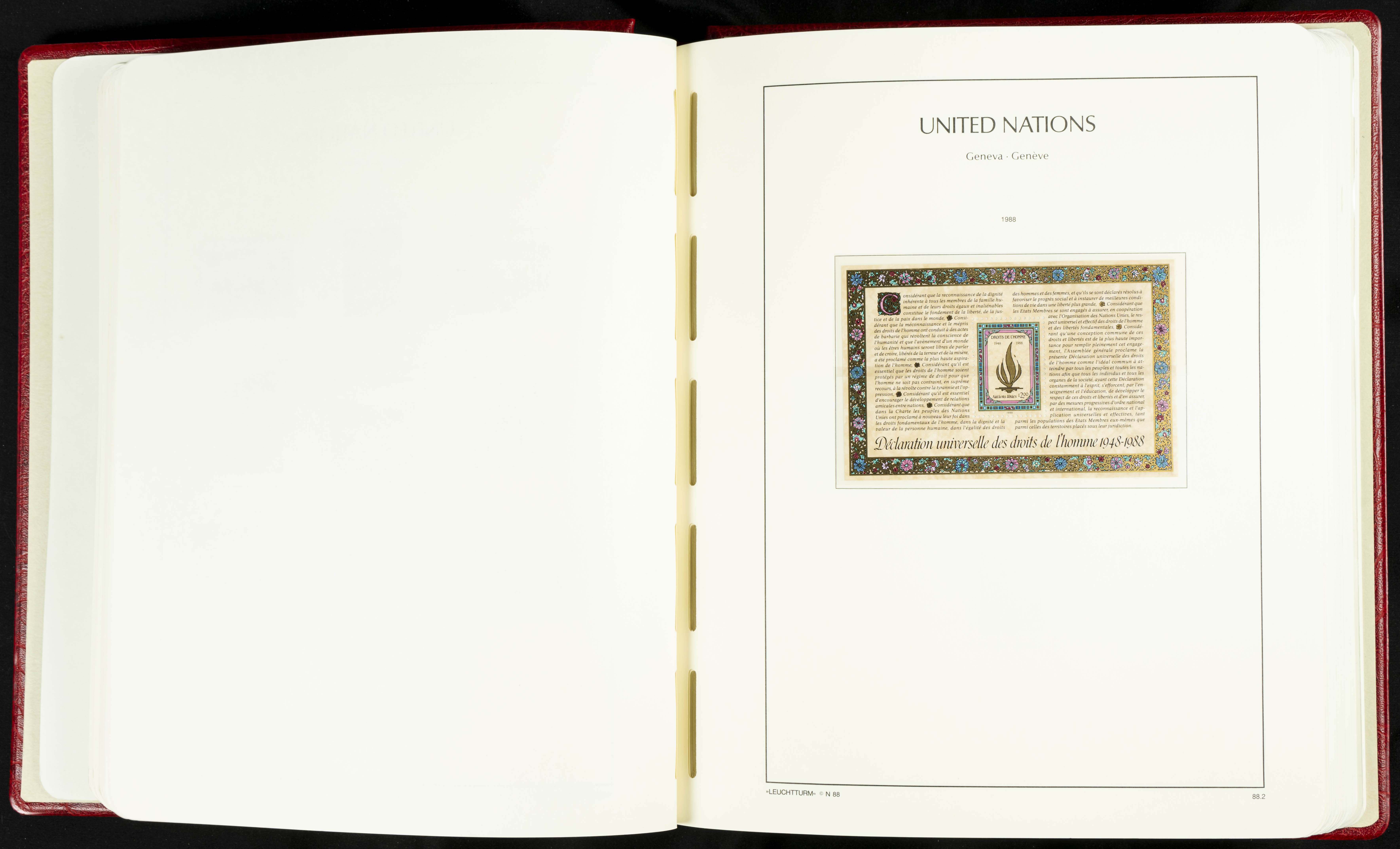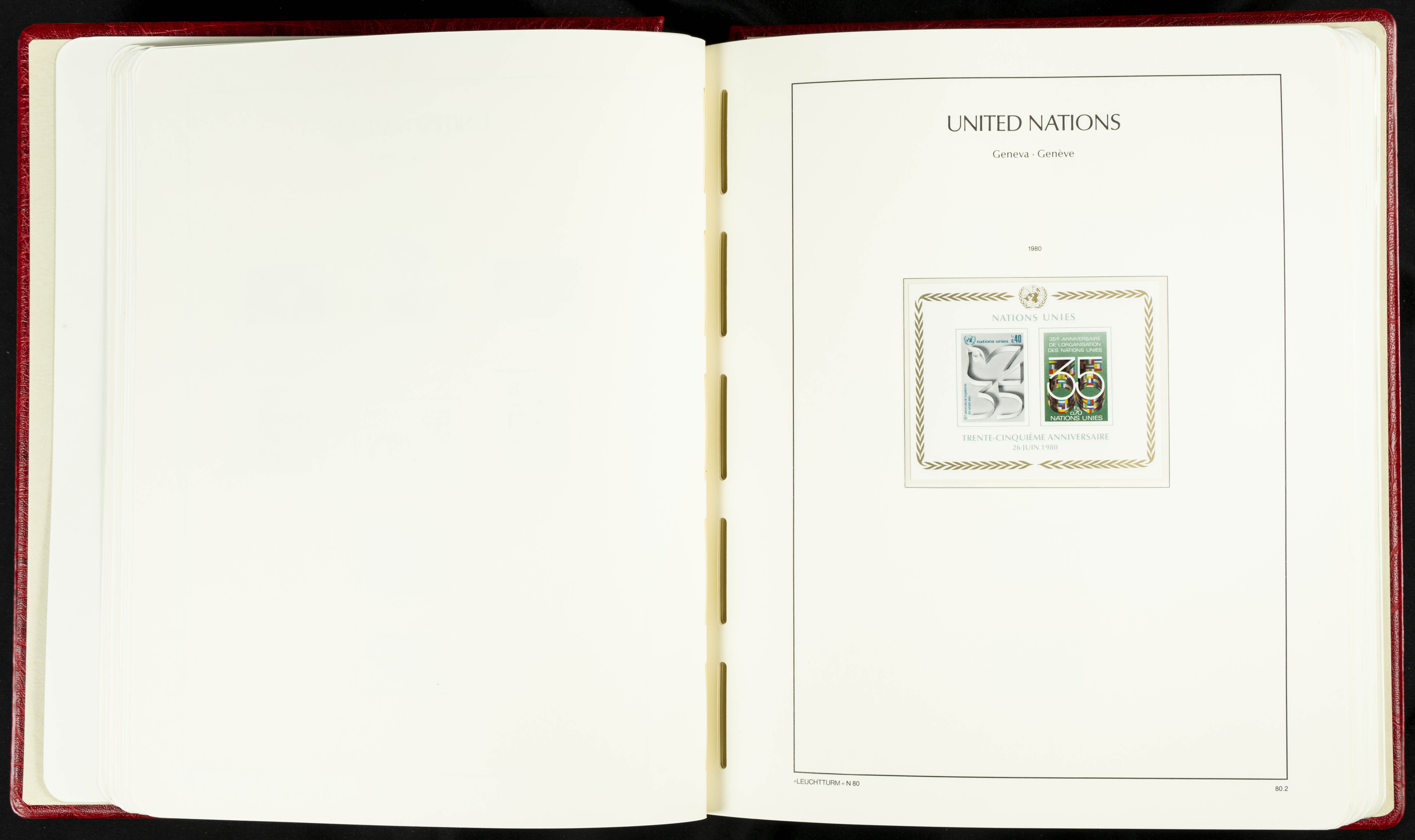 ★★(1951ca). Colección completa de Naciones Unidas (Nueva York, Ginebra y Viena) entre 1951 y 2011, en nuevo y sin fijasellos (montada en álbumes Faro). ALTO VALOR DE CATALOGO. A EXAMINAR.