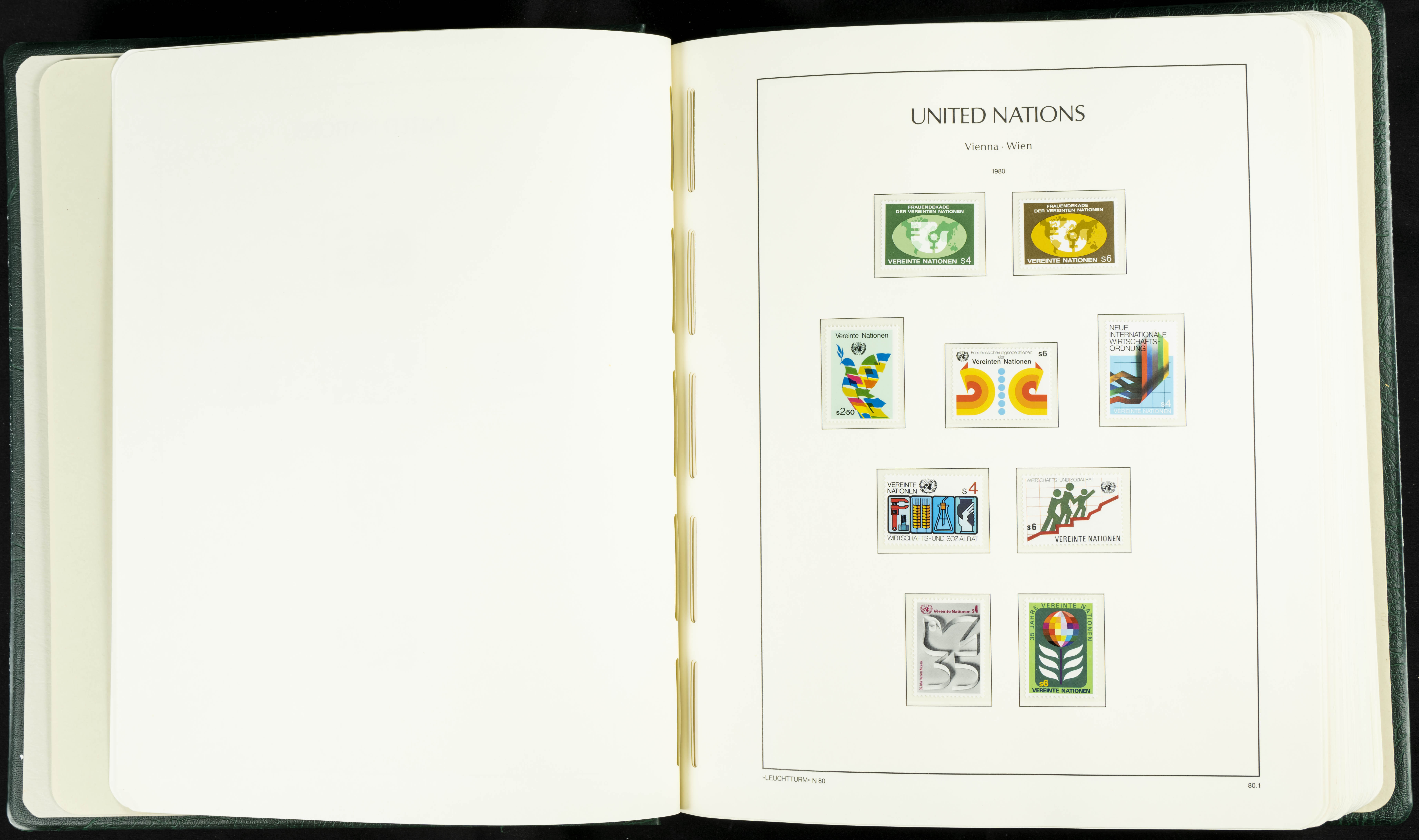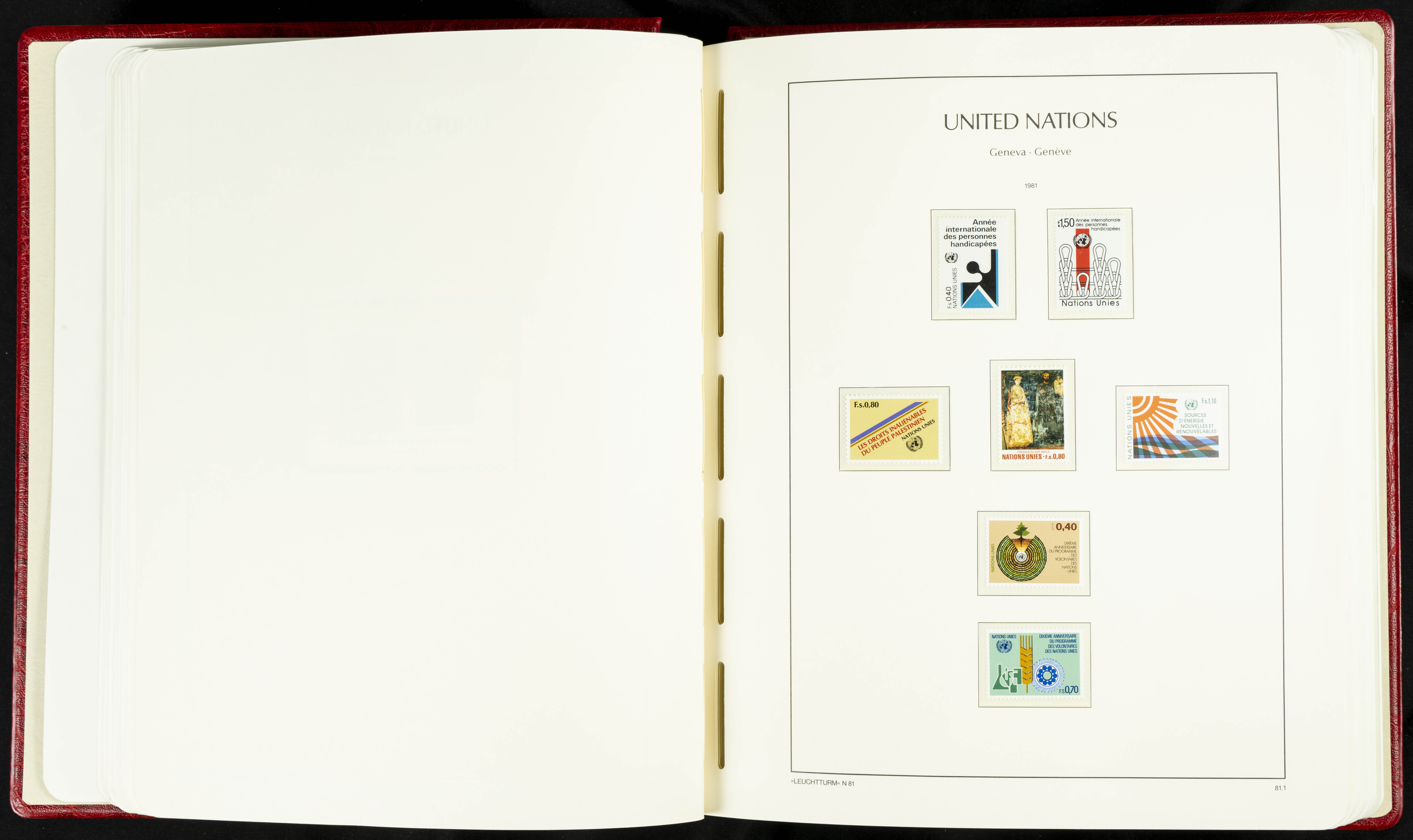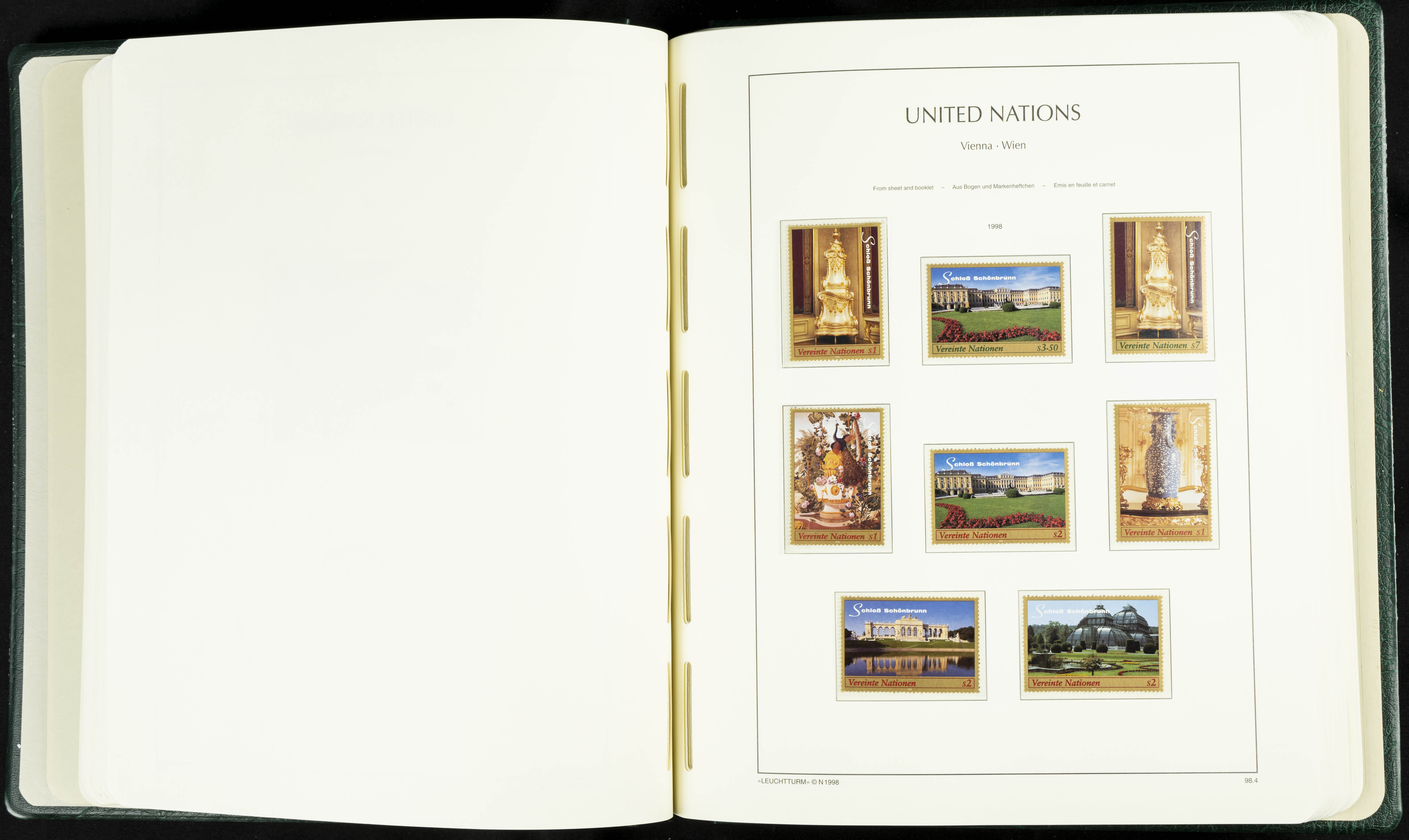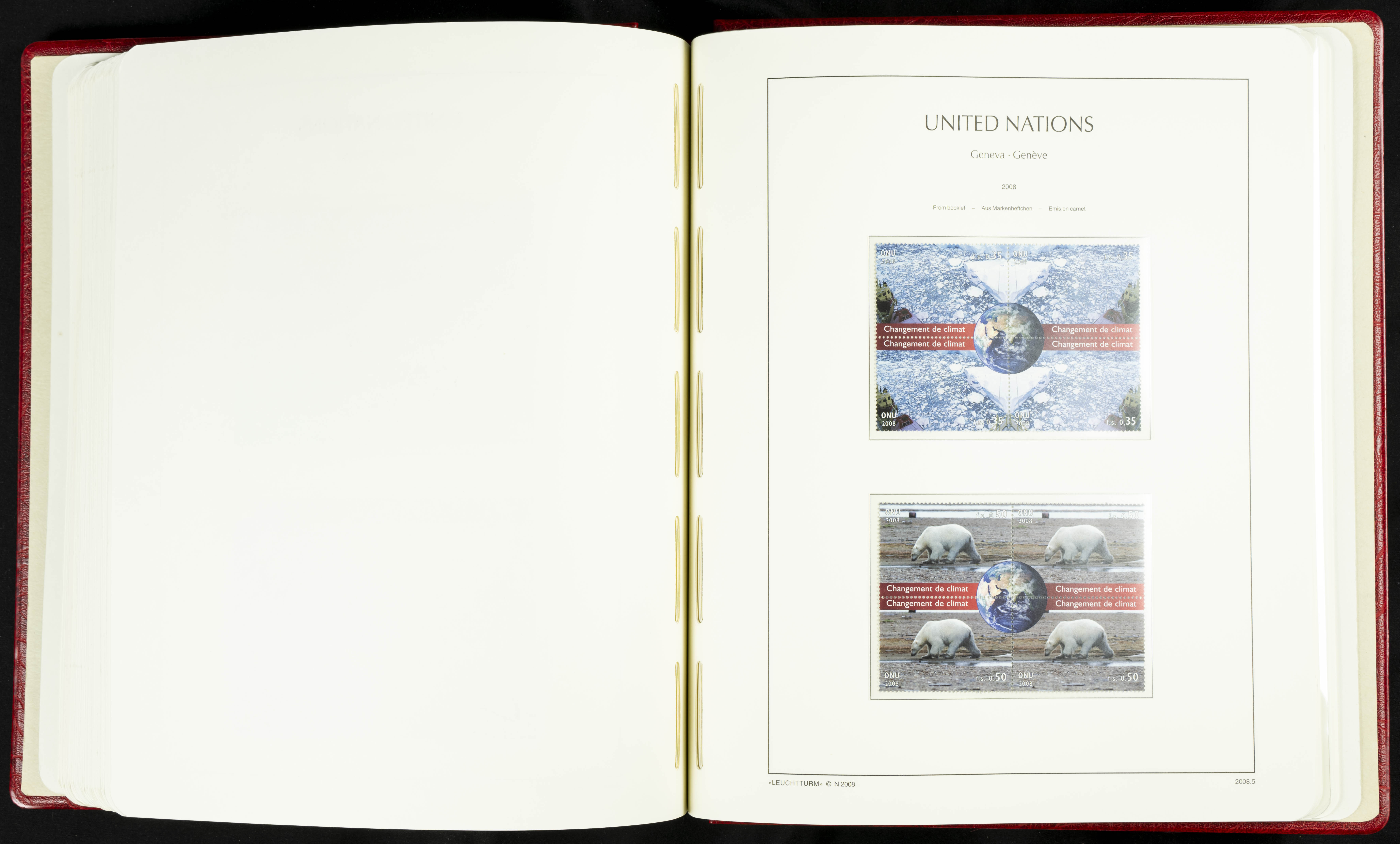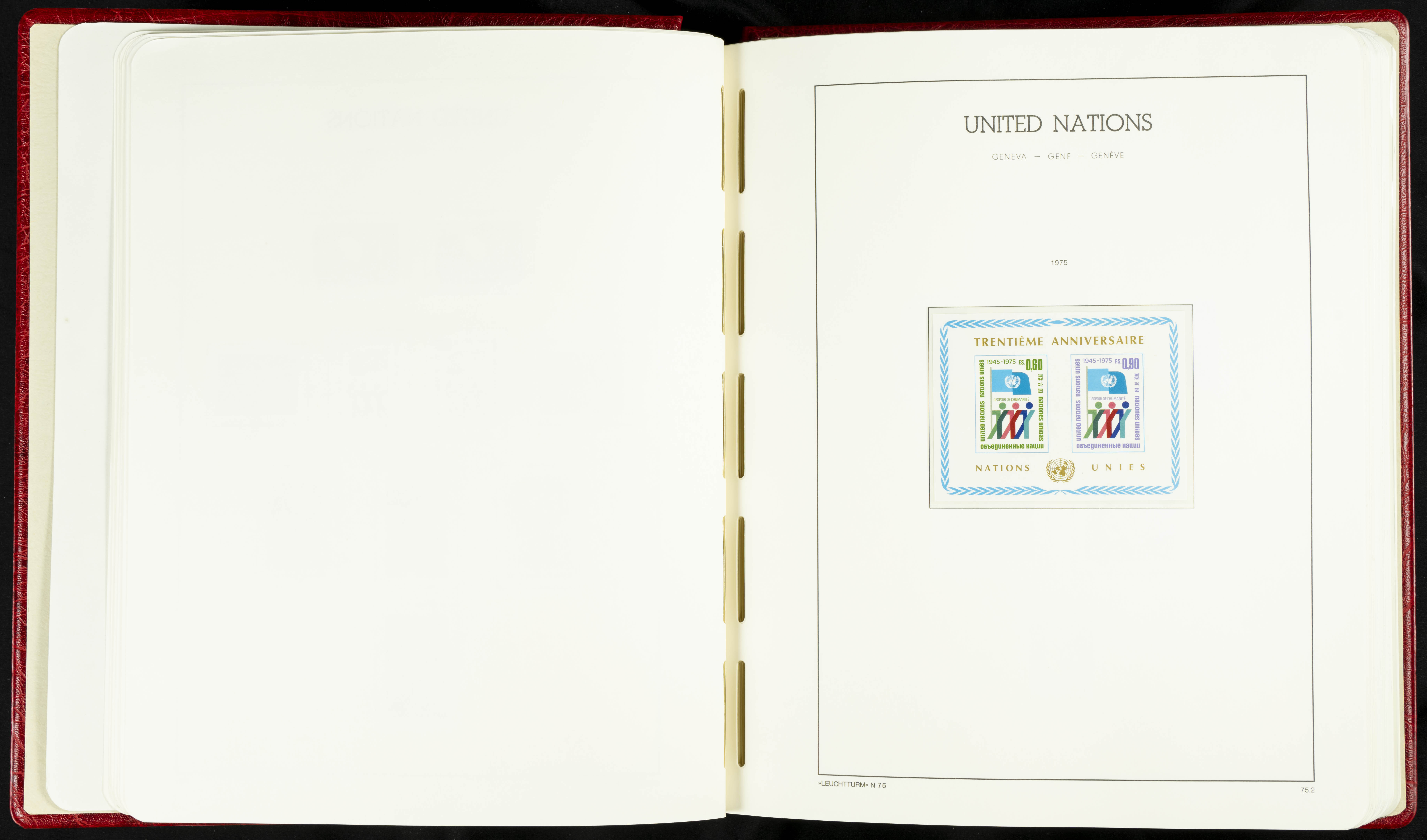 ★★(1951ca). Colección completa de Naciones Unidas (Nueva York, Ginebra y Viena) entre 1951 y 2011, en nuevo y sin fijasellos (montada en álbumes Faro). ALTO VALOR DE CATALOGO. A EXAMINAR.