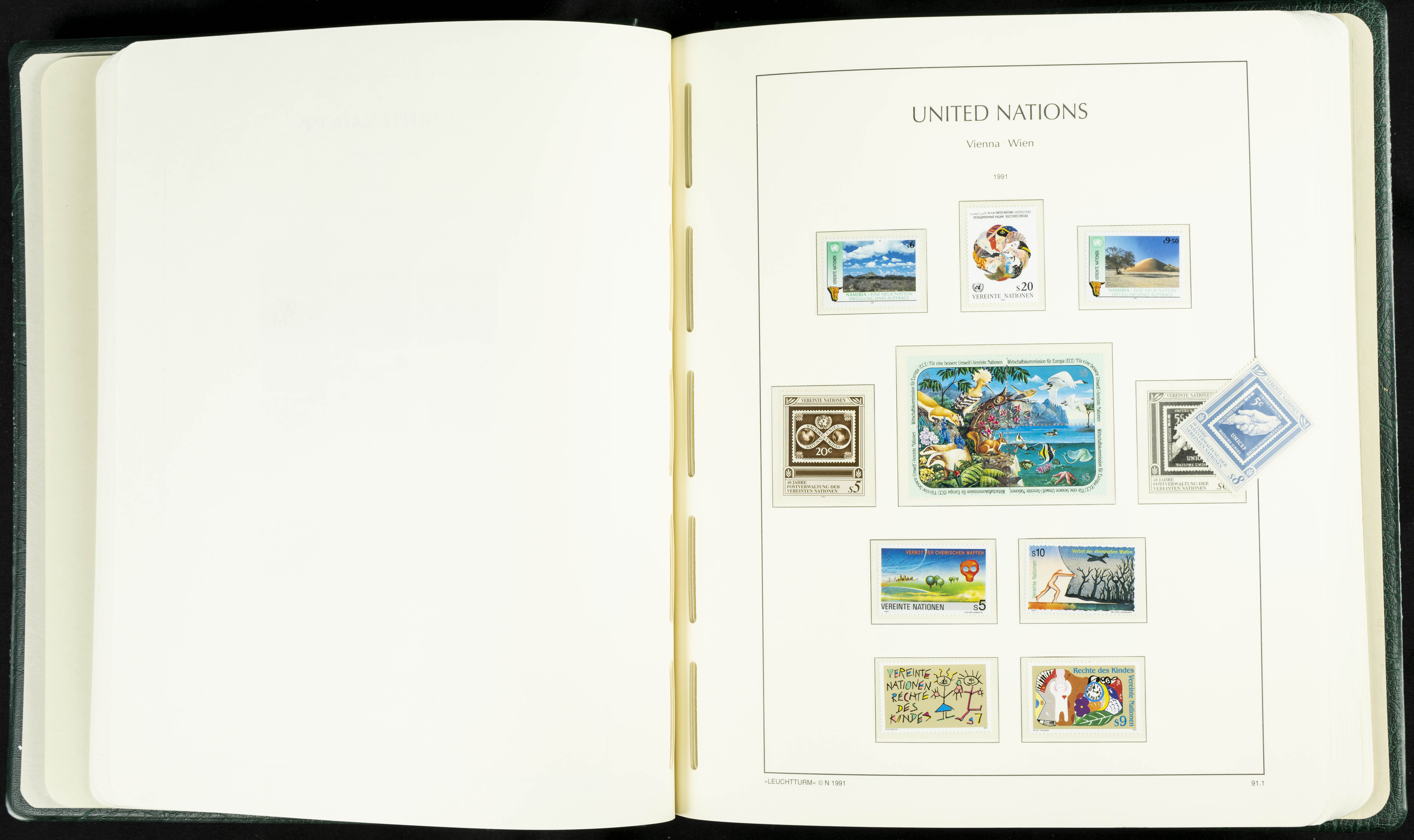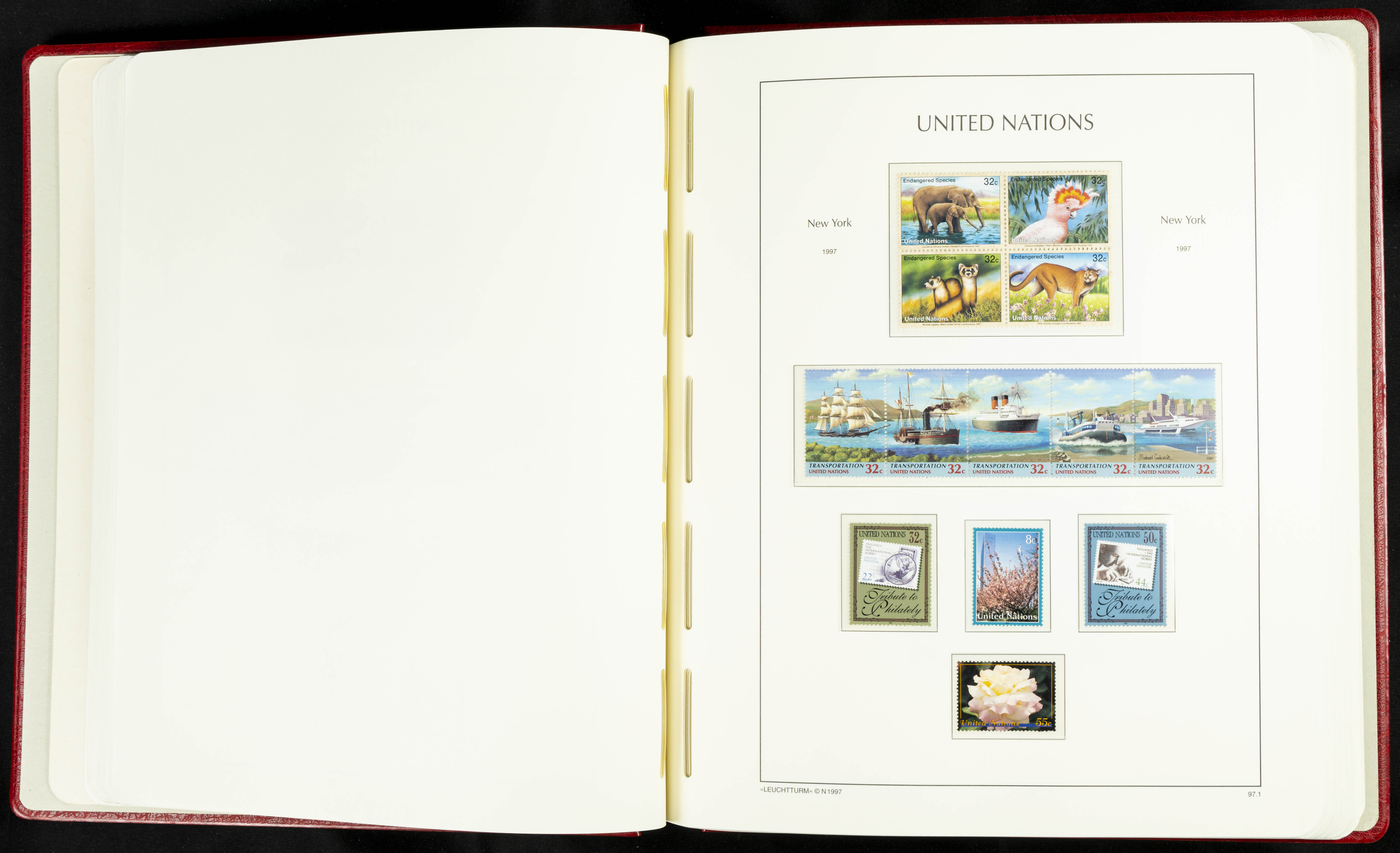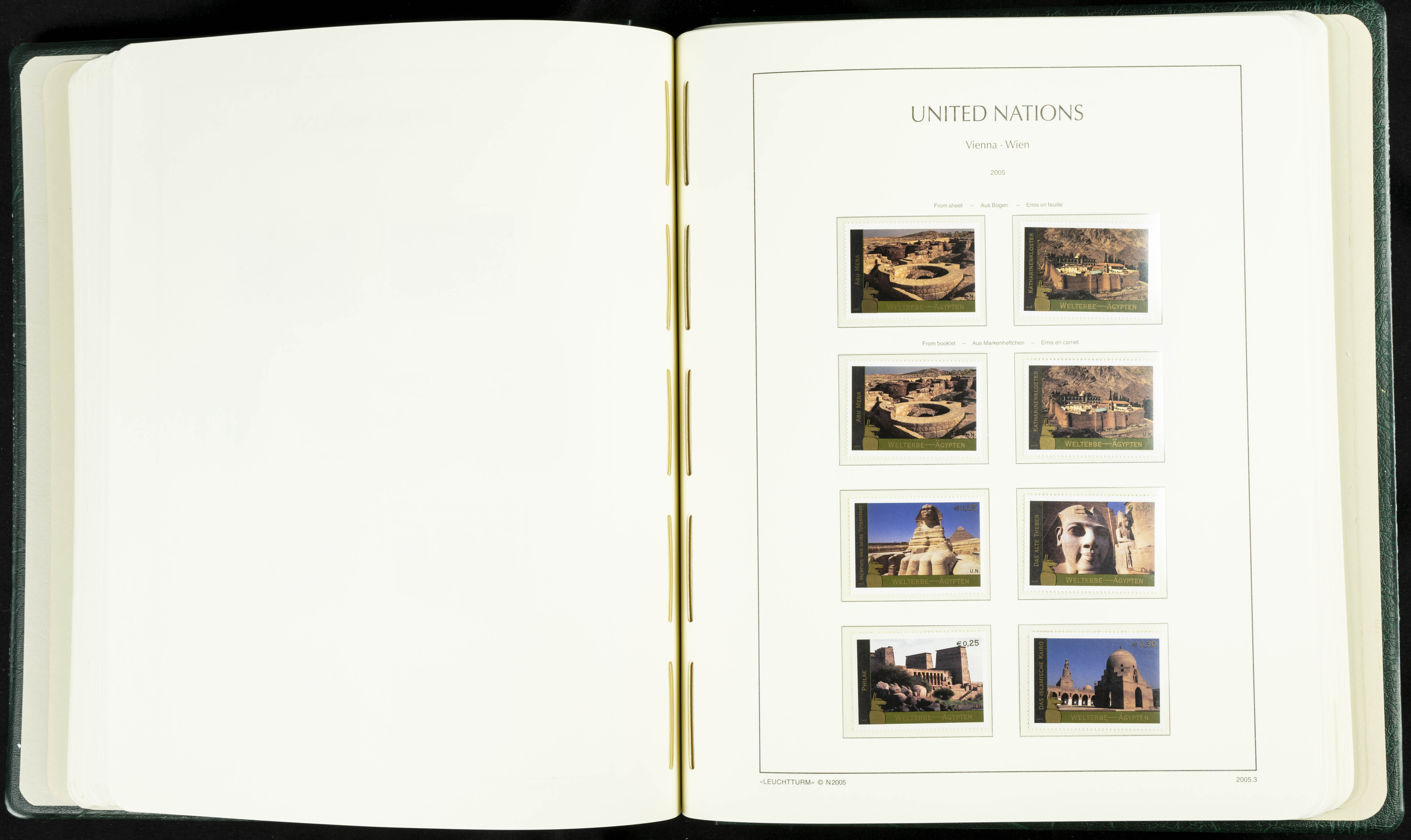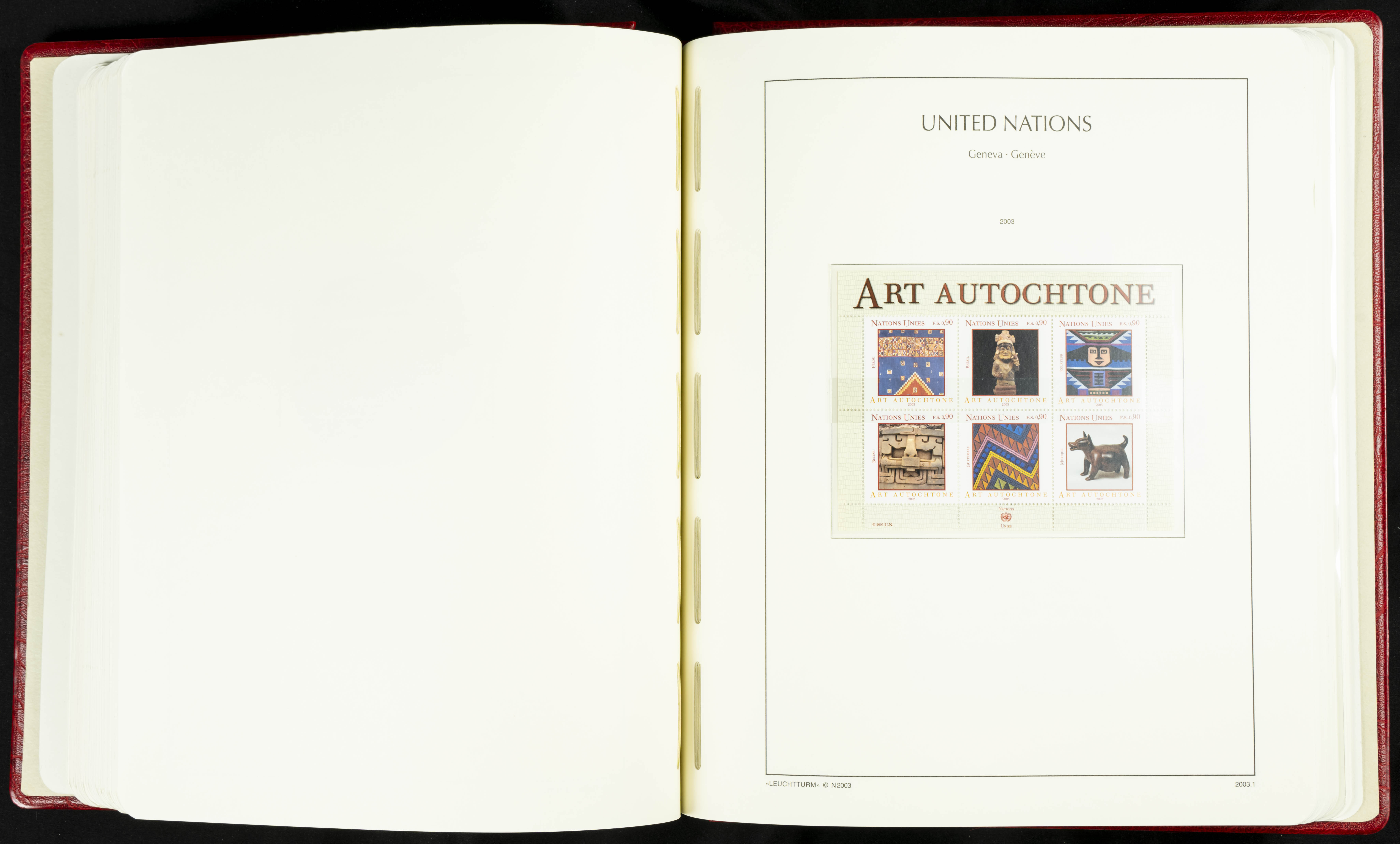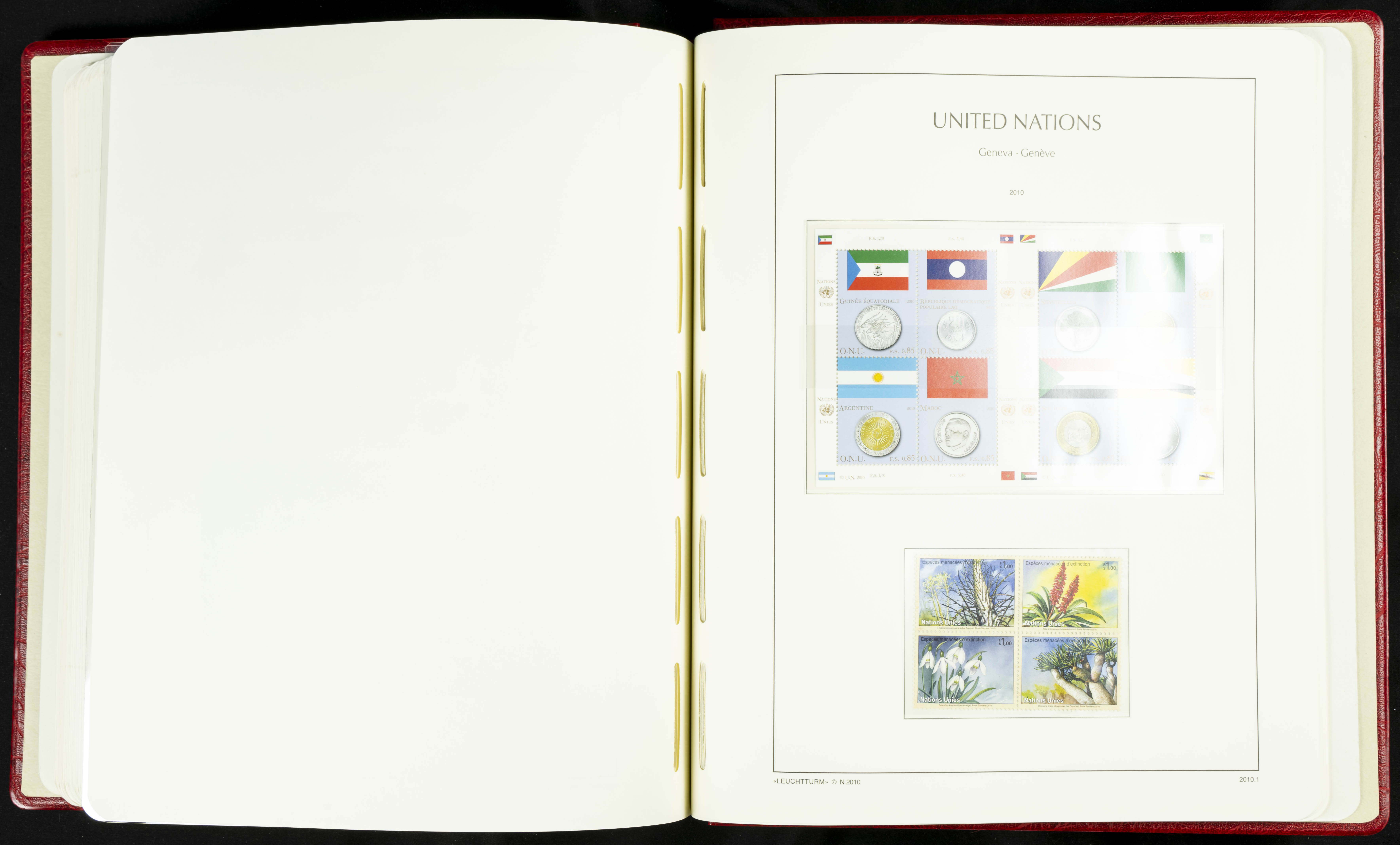 ★★(1951ca). Colección completa de Naciones Unidas (Nueva York, Ginebra y Viena) entre 1951 y 2011, en nuevo y sin fijasellos (montada en álbumes Faro). ALTO VALOR DE CATALOGO. A EXAMINAR.