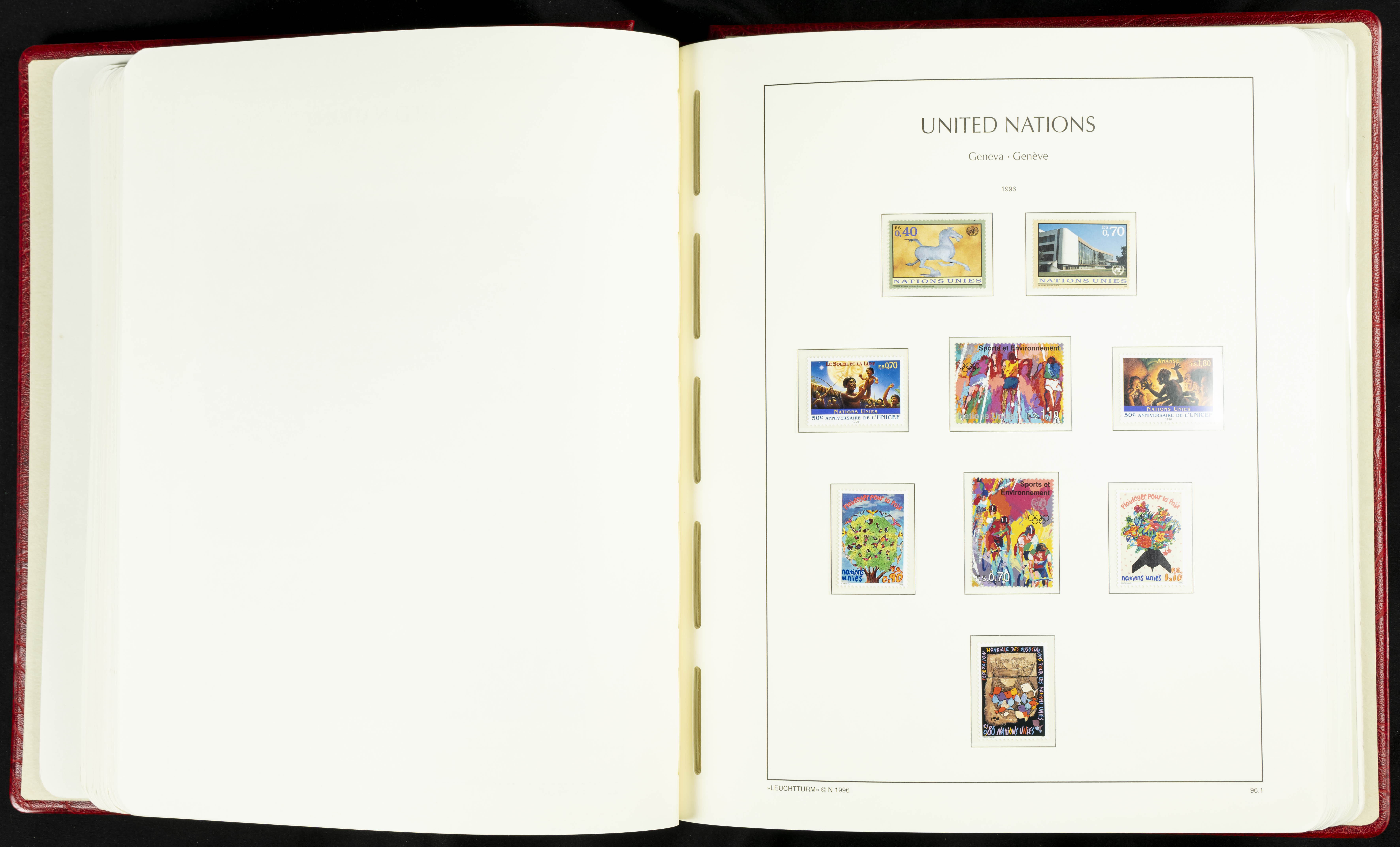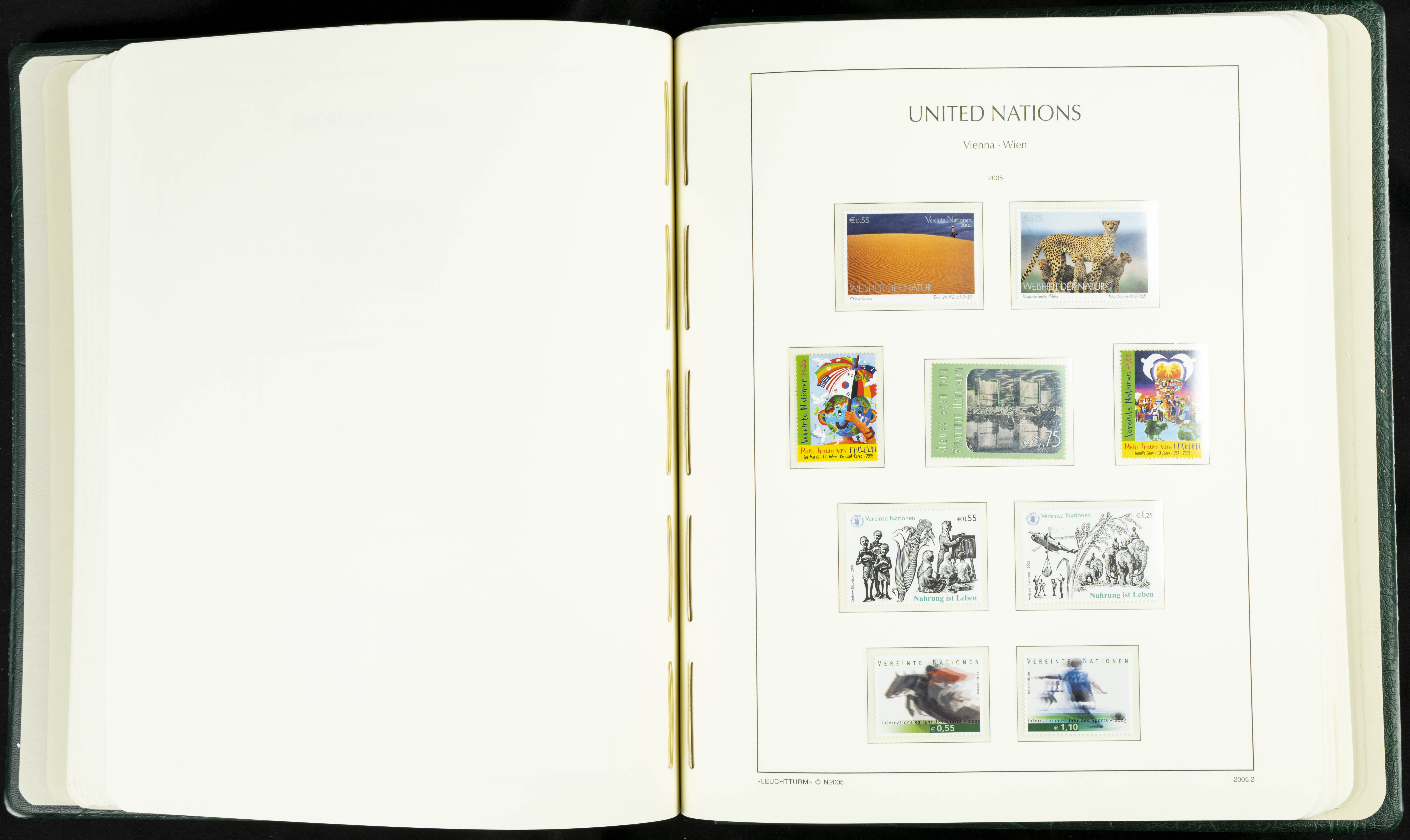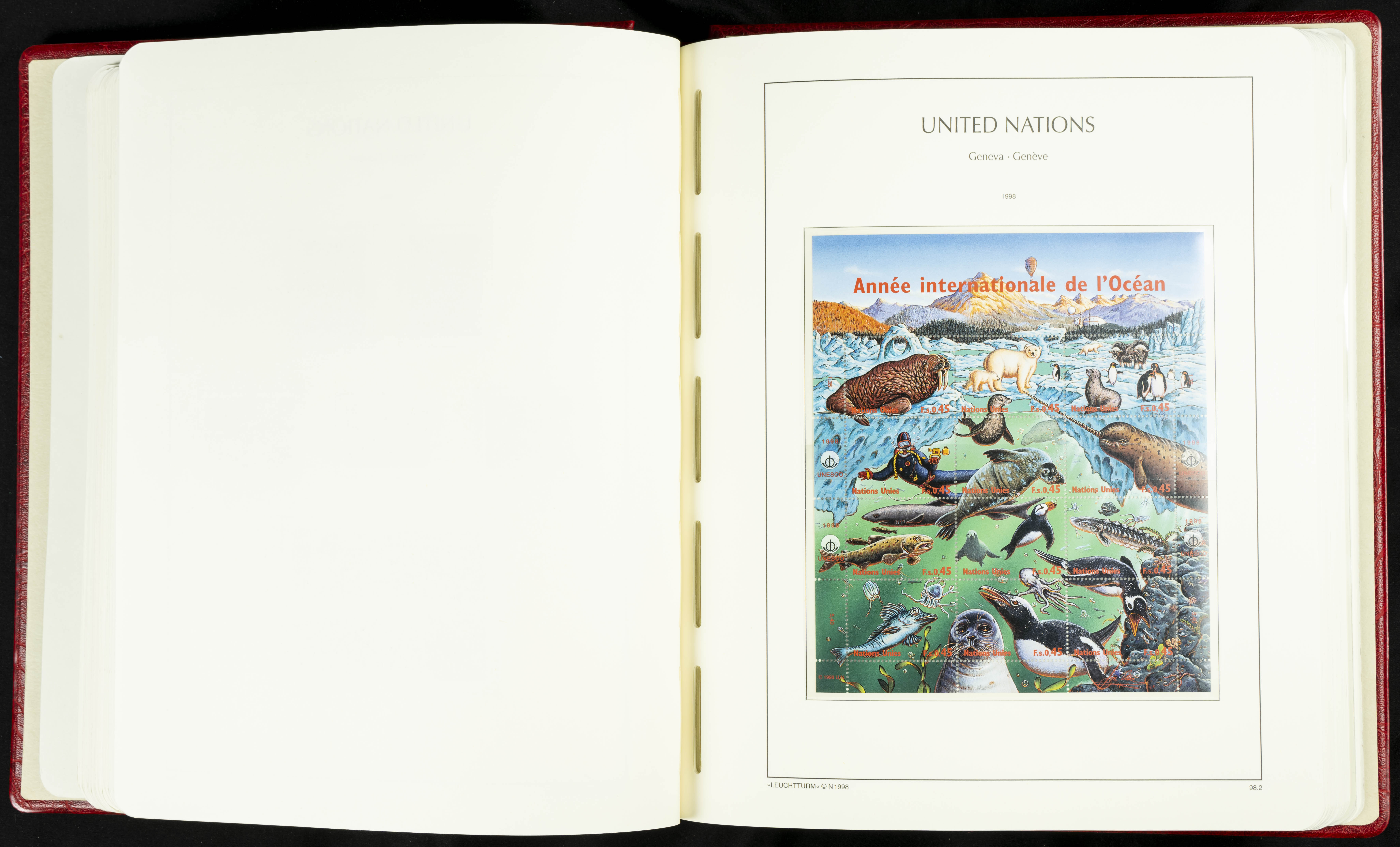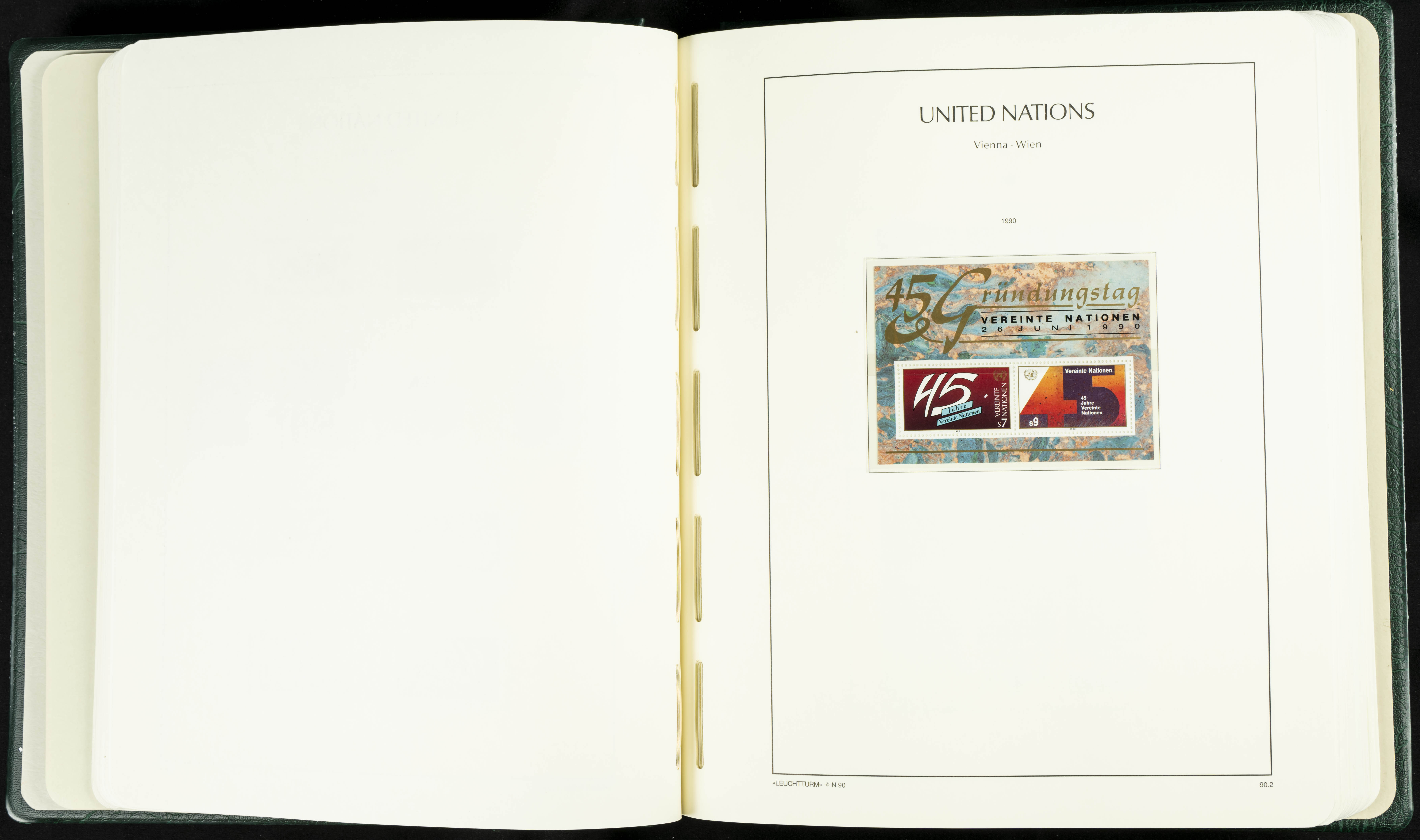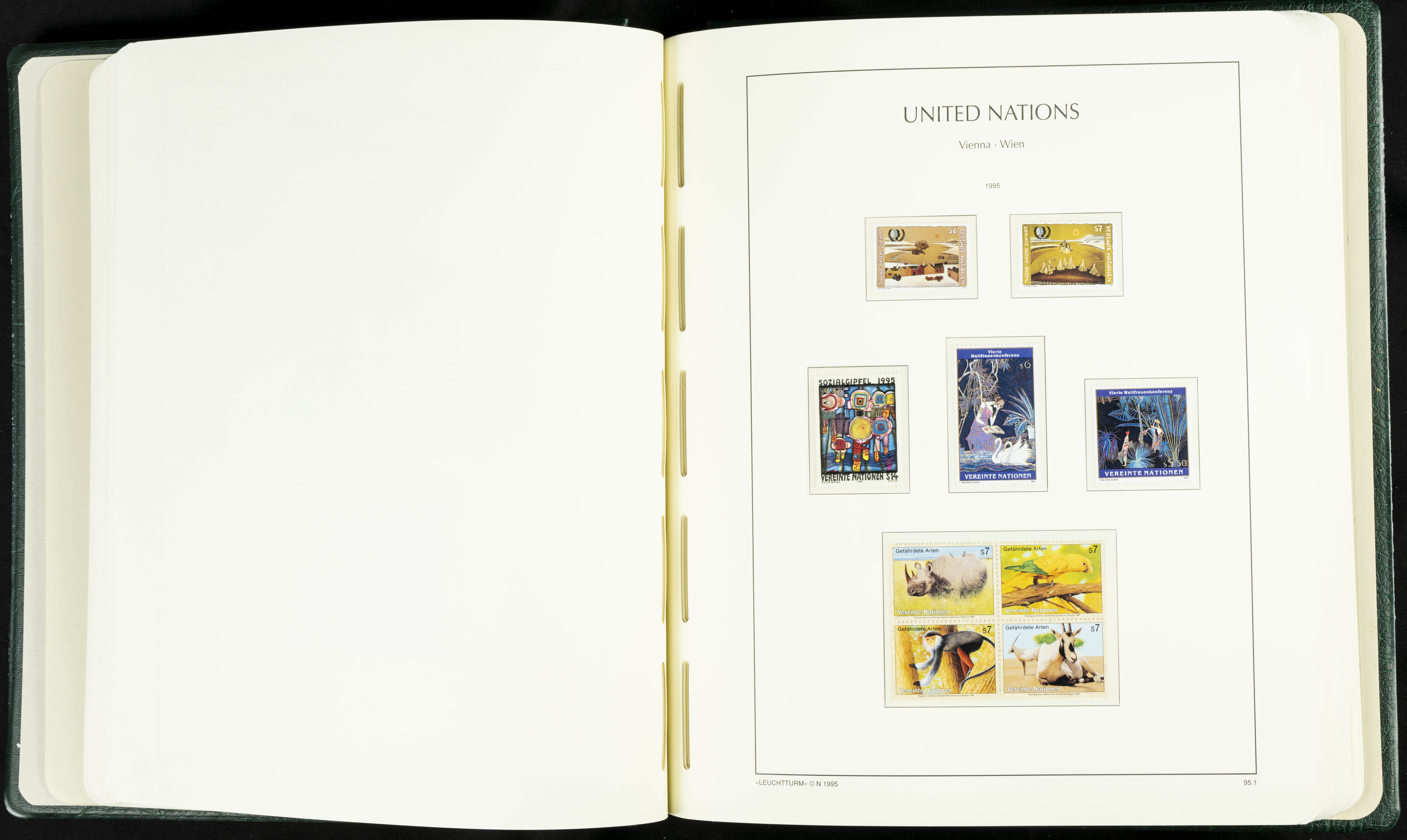 ★★(1951ca). Colección completa de Naciones Unidas (Nueva York, Ginebra y Viena) entre 1951 y 2011, en nuevo y sin fijasellos (montada en álbumes Faro). ALTO VALOR DE CATALOGO. A EXAMINAR.