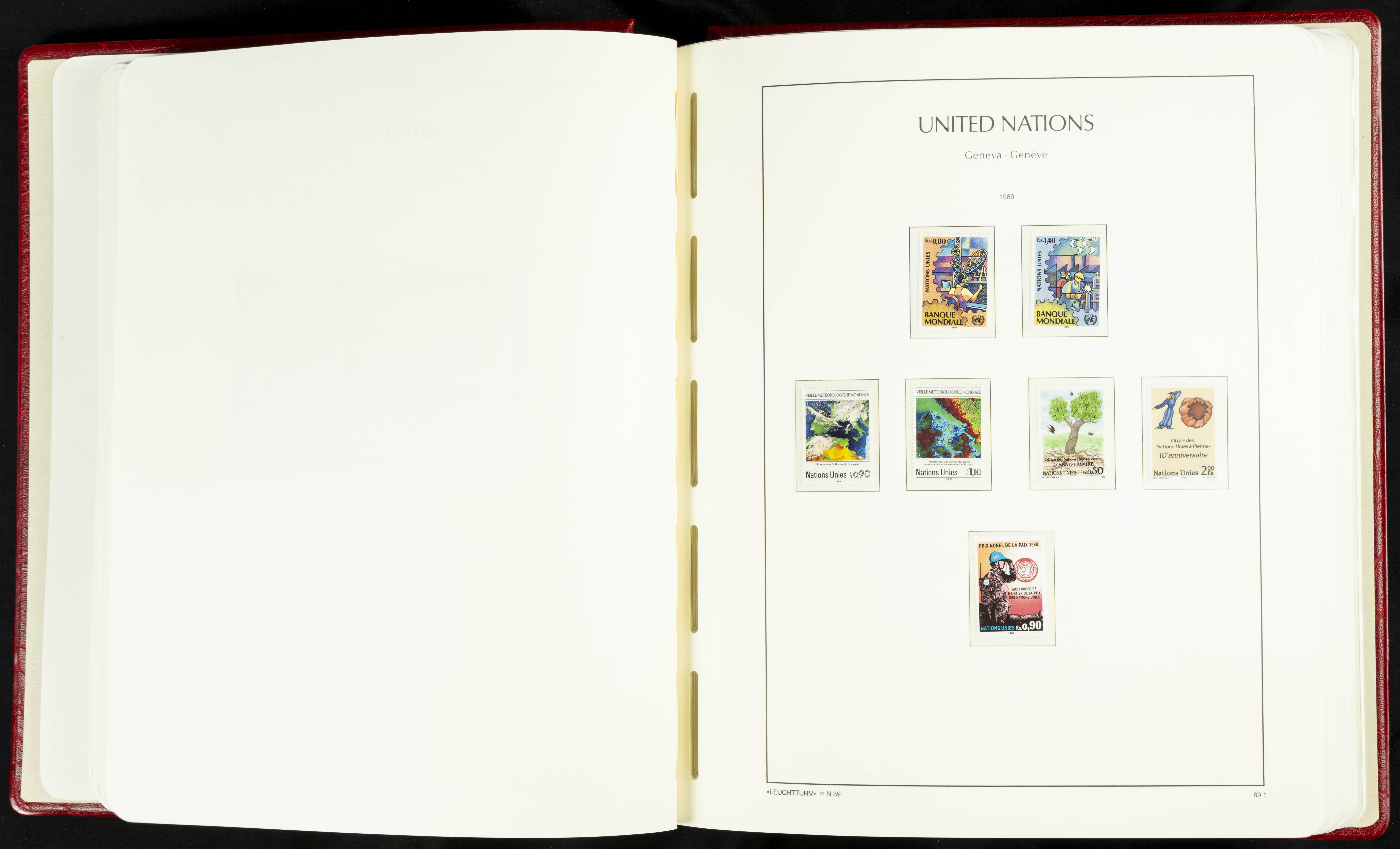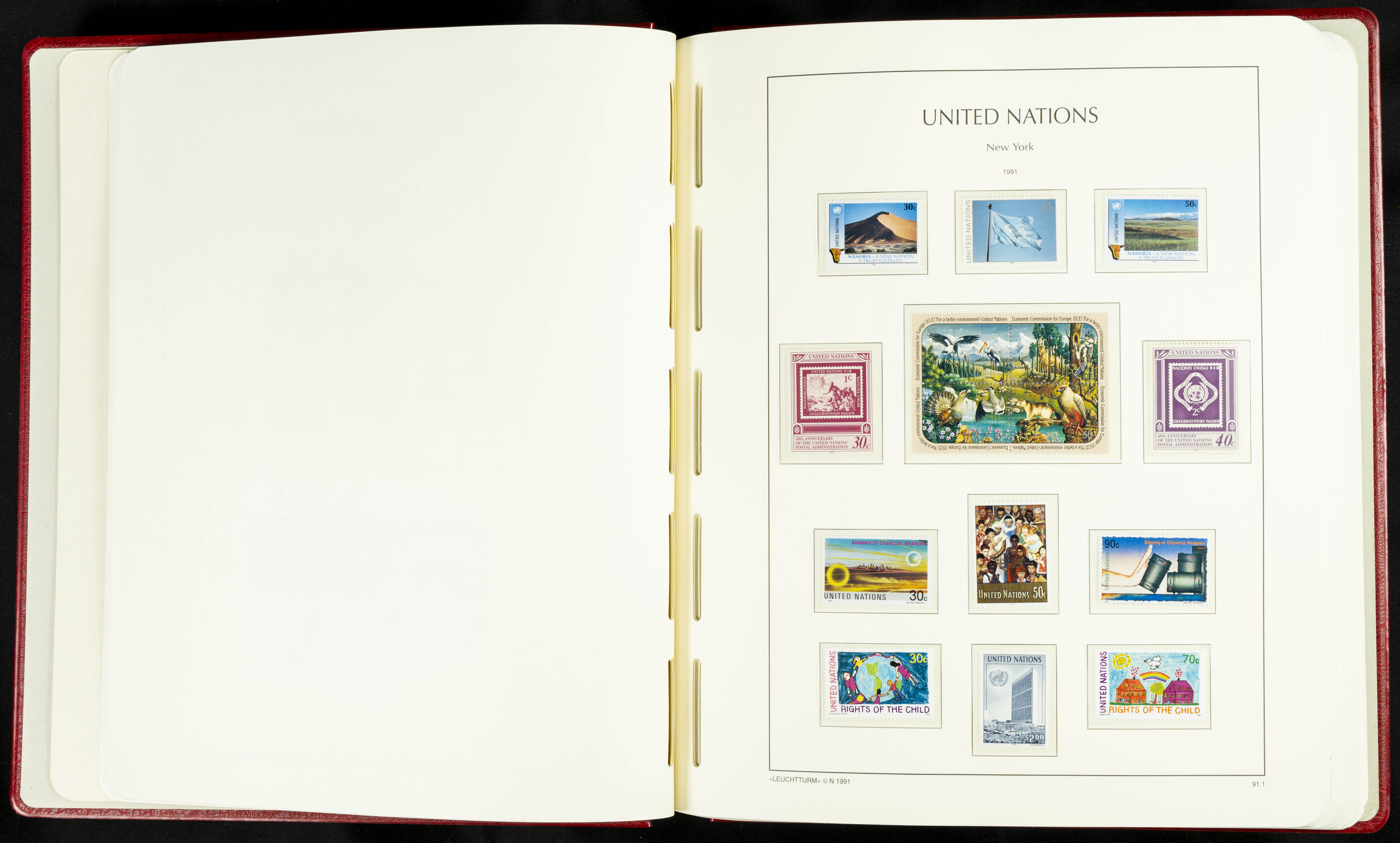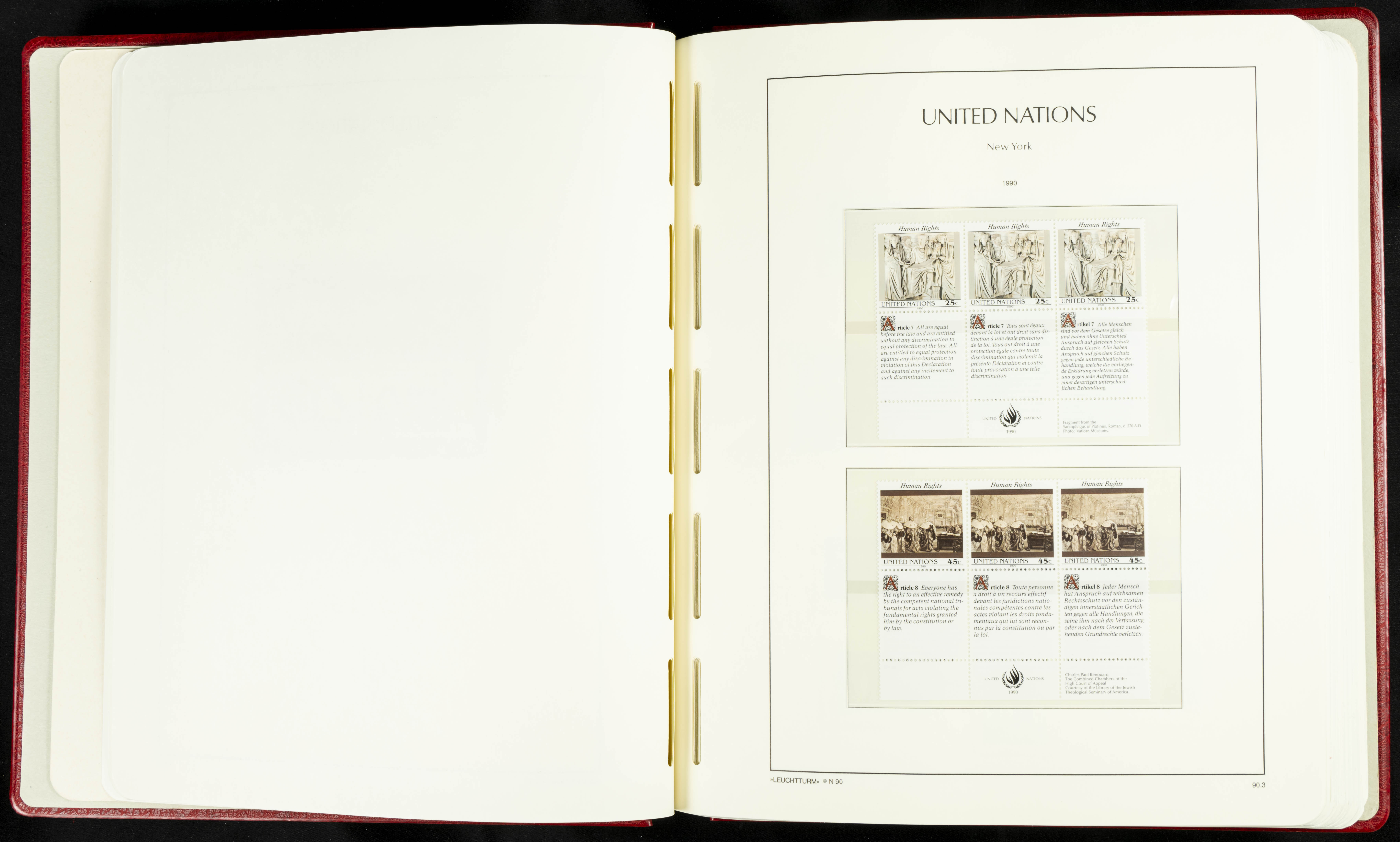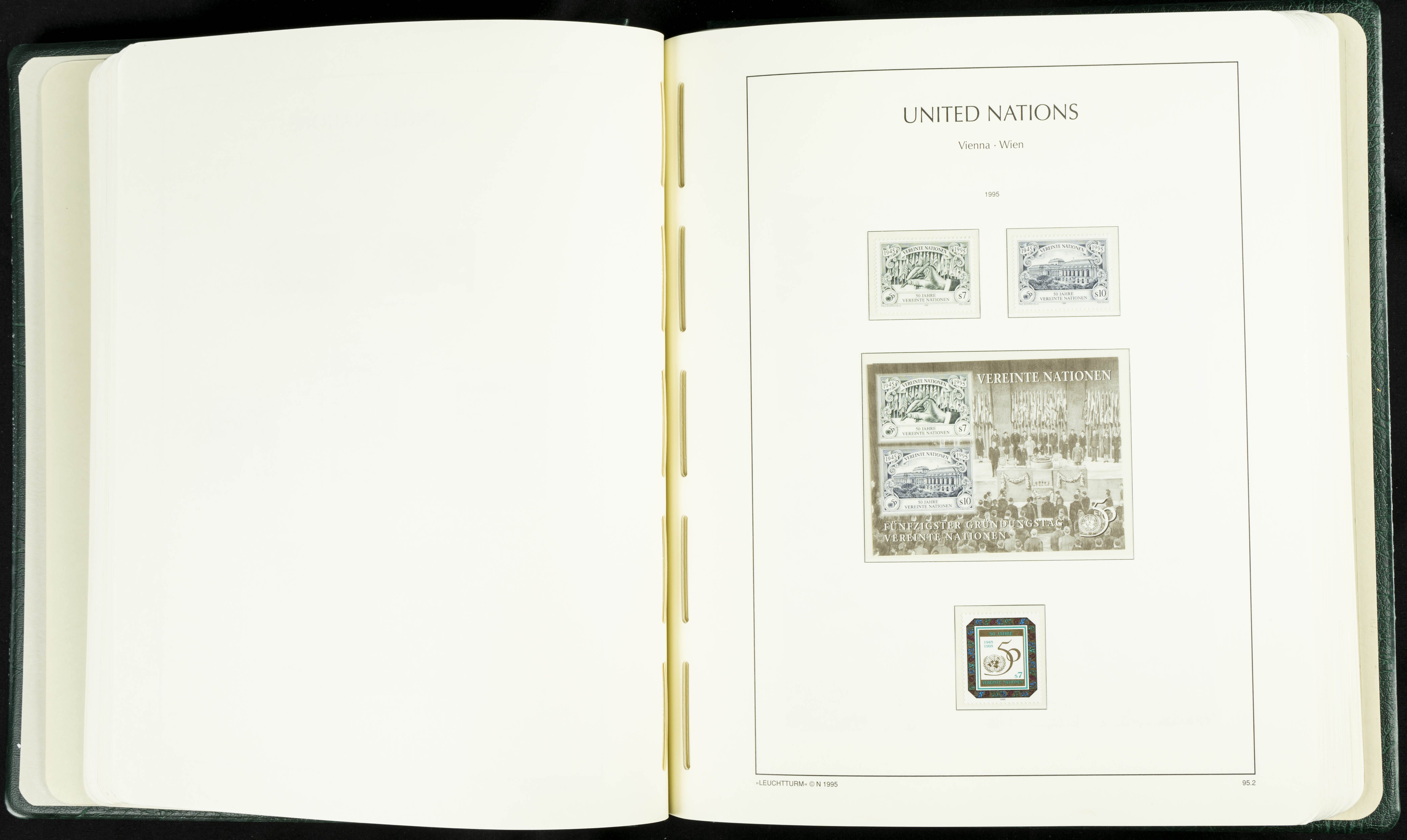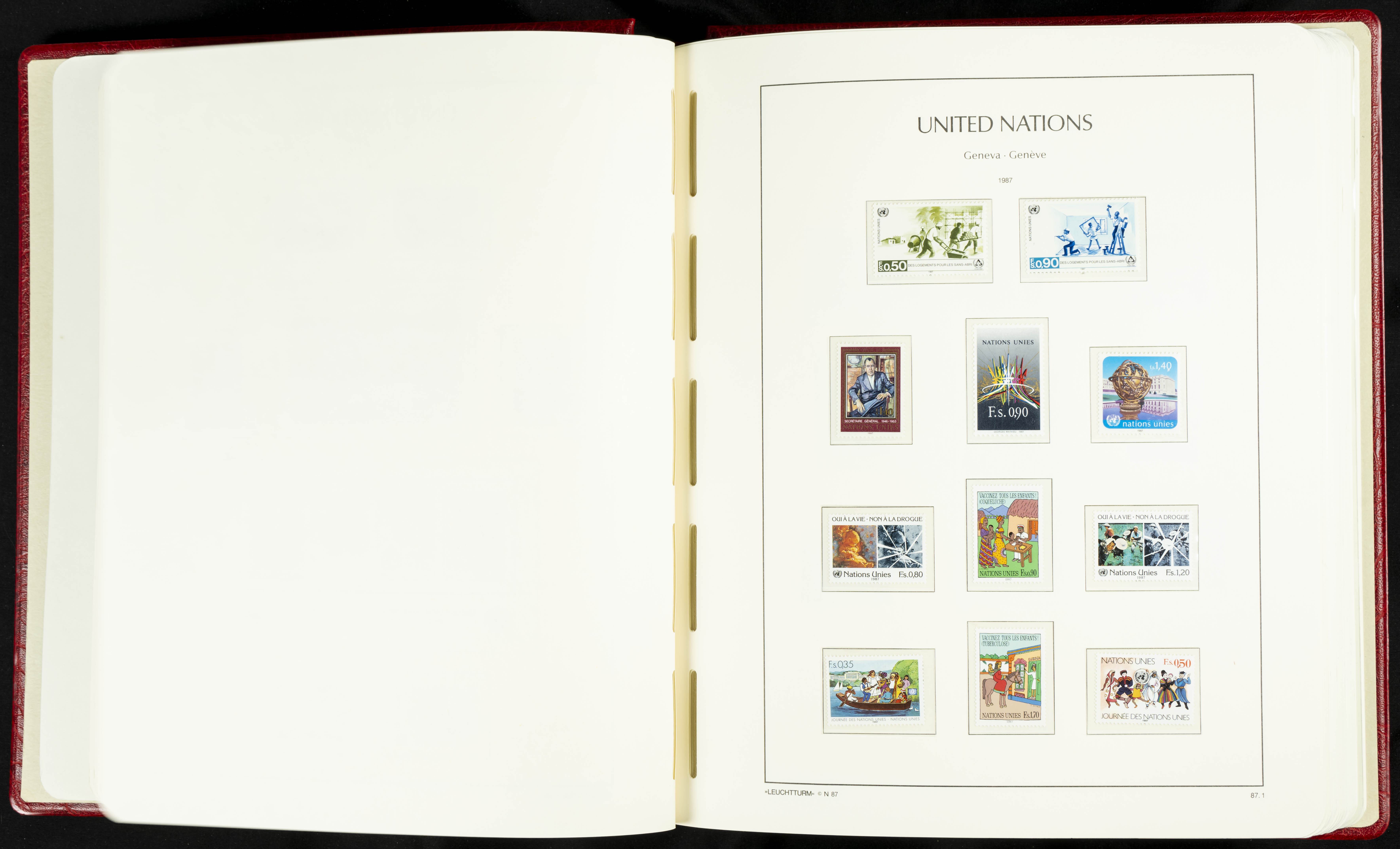 ★★(1951ca). Colección completa de Naciones Unidas (Nueva York, Ginebra y Viena) entre 1951 y 2011, en nuevo y sin fijasellos (montada en álbumes Faro). ALTO VALOR DE CATALOGO. A EXAMINAR.