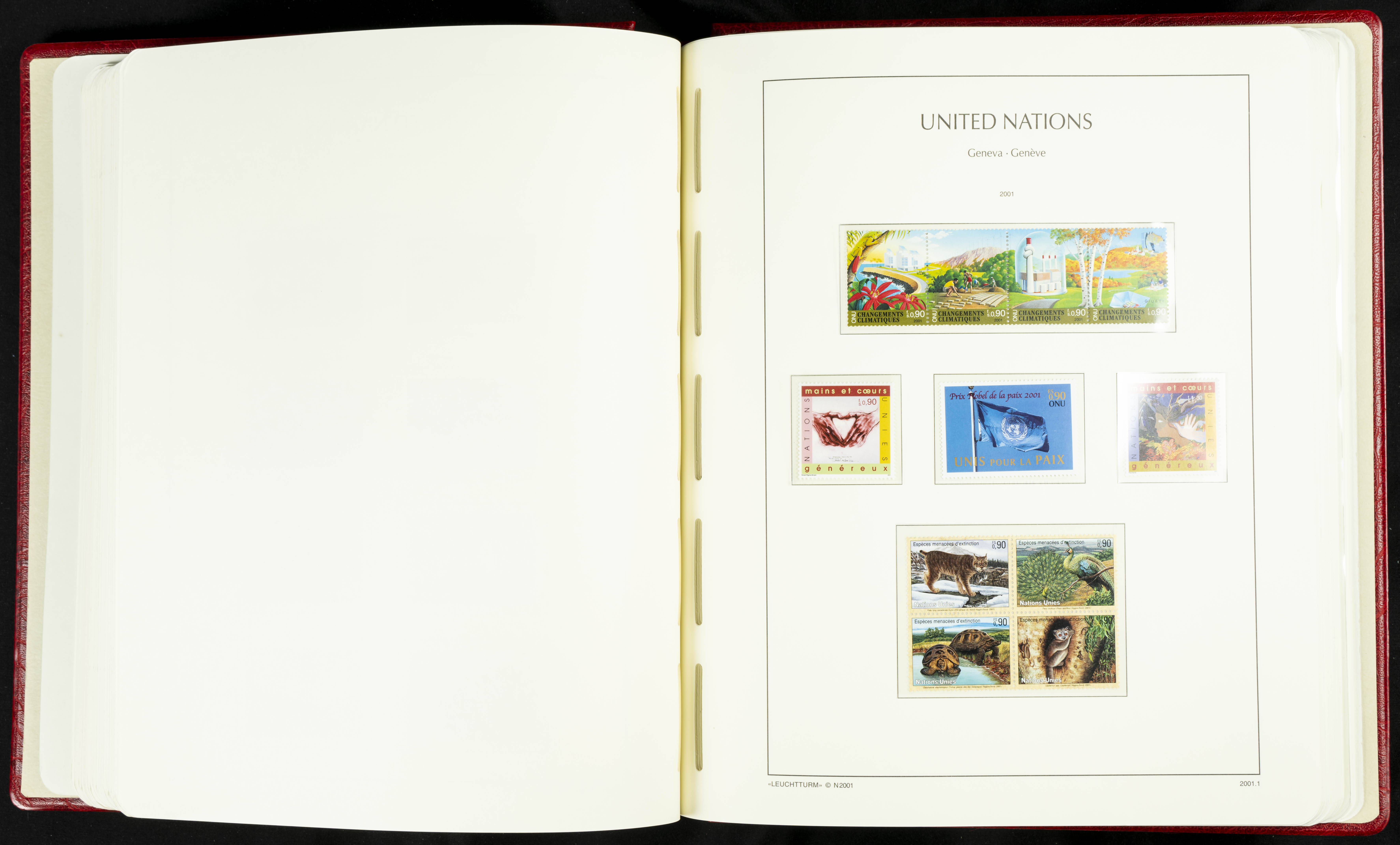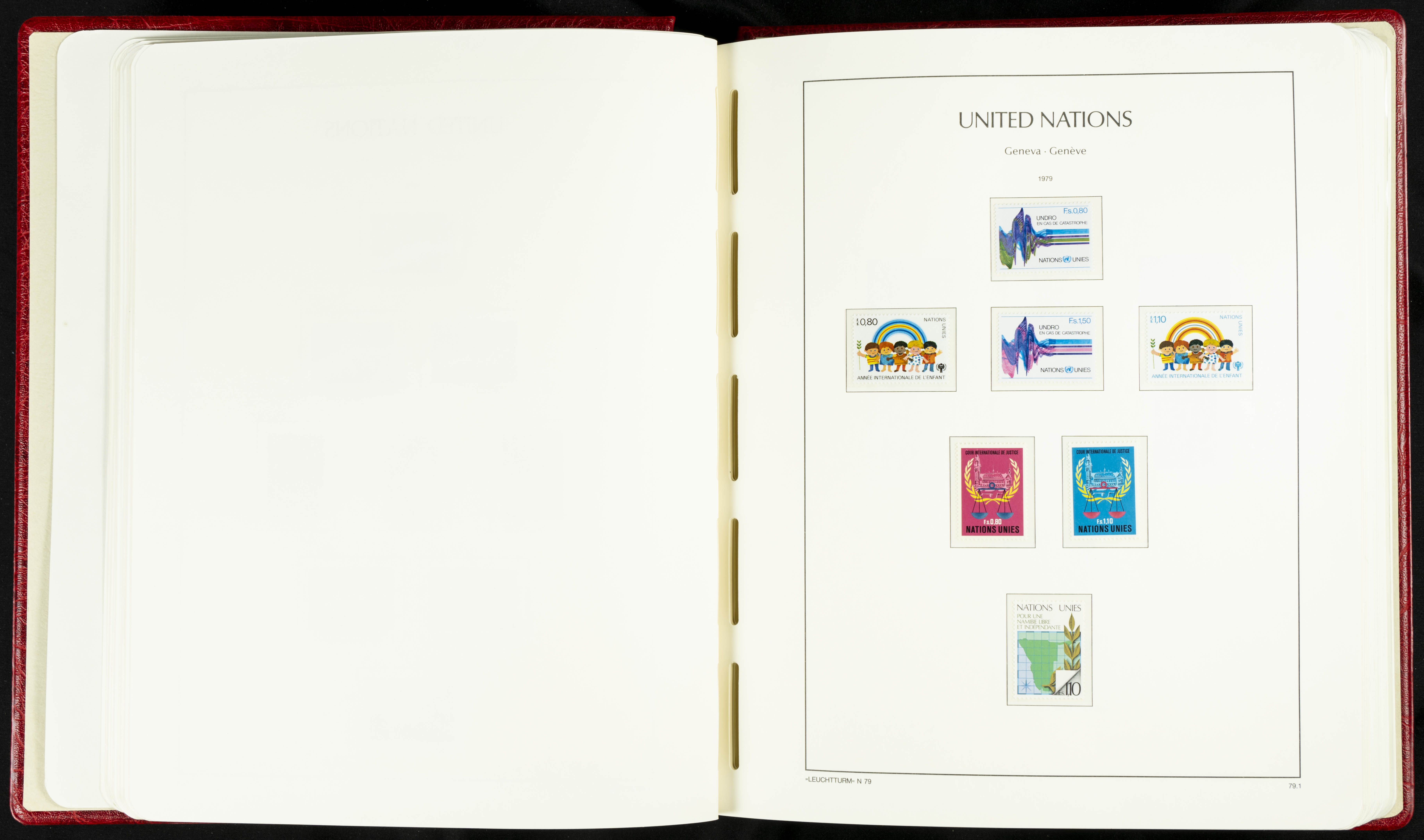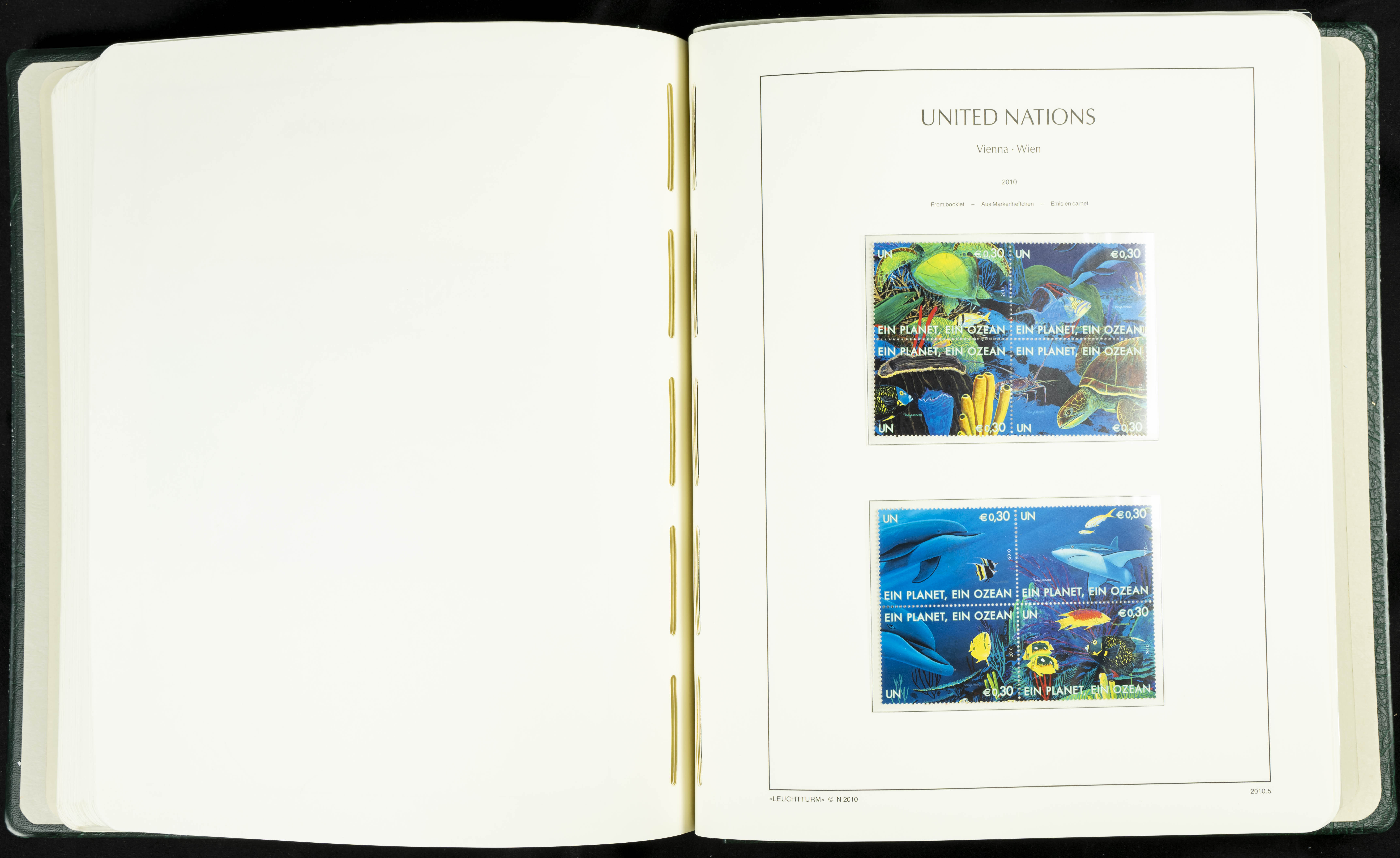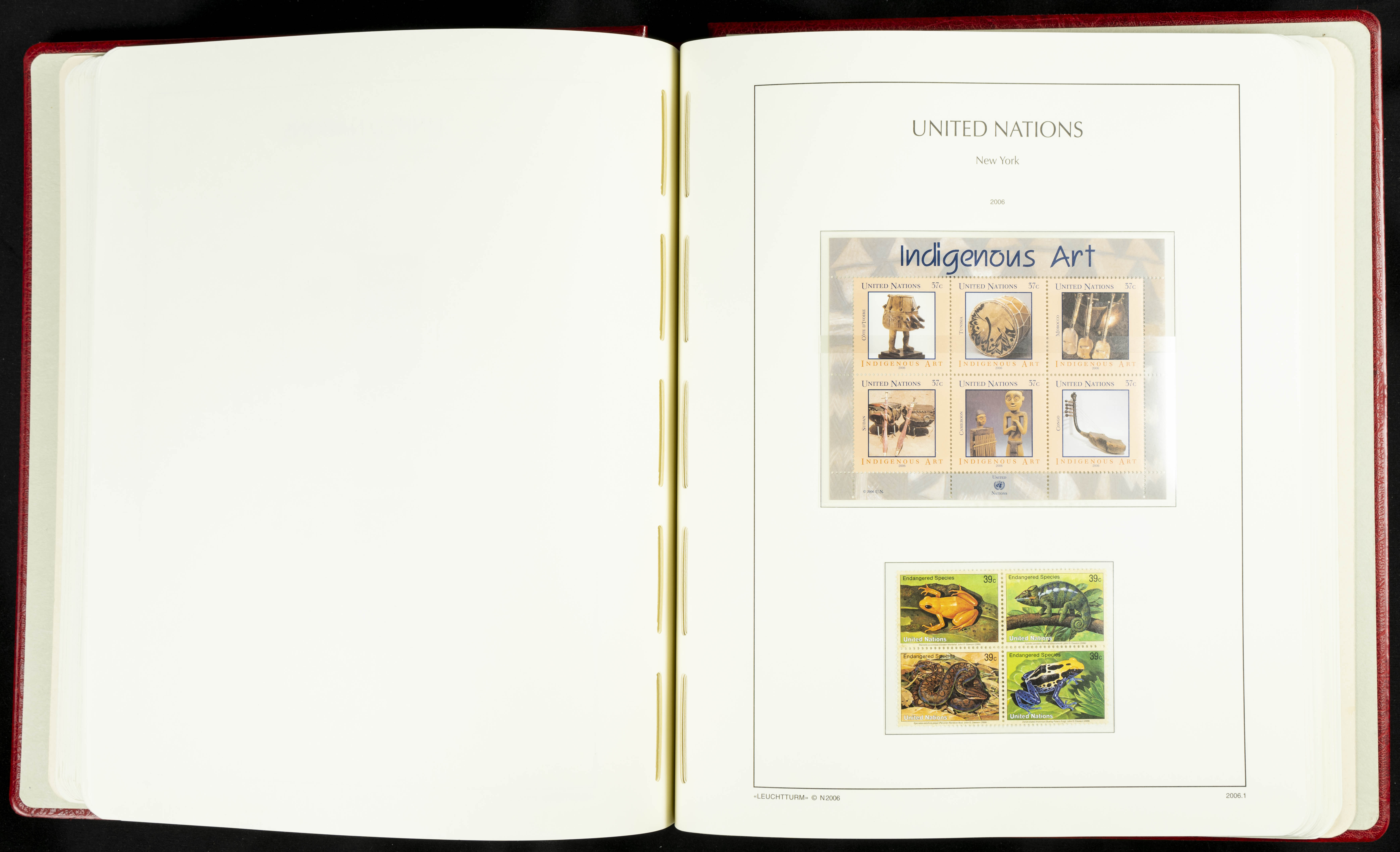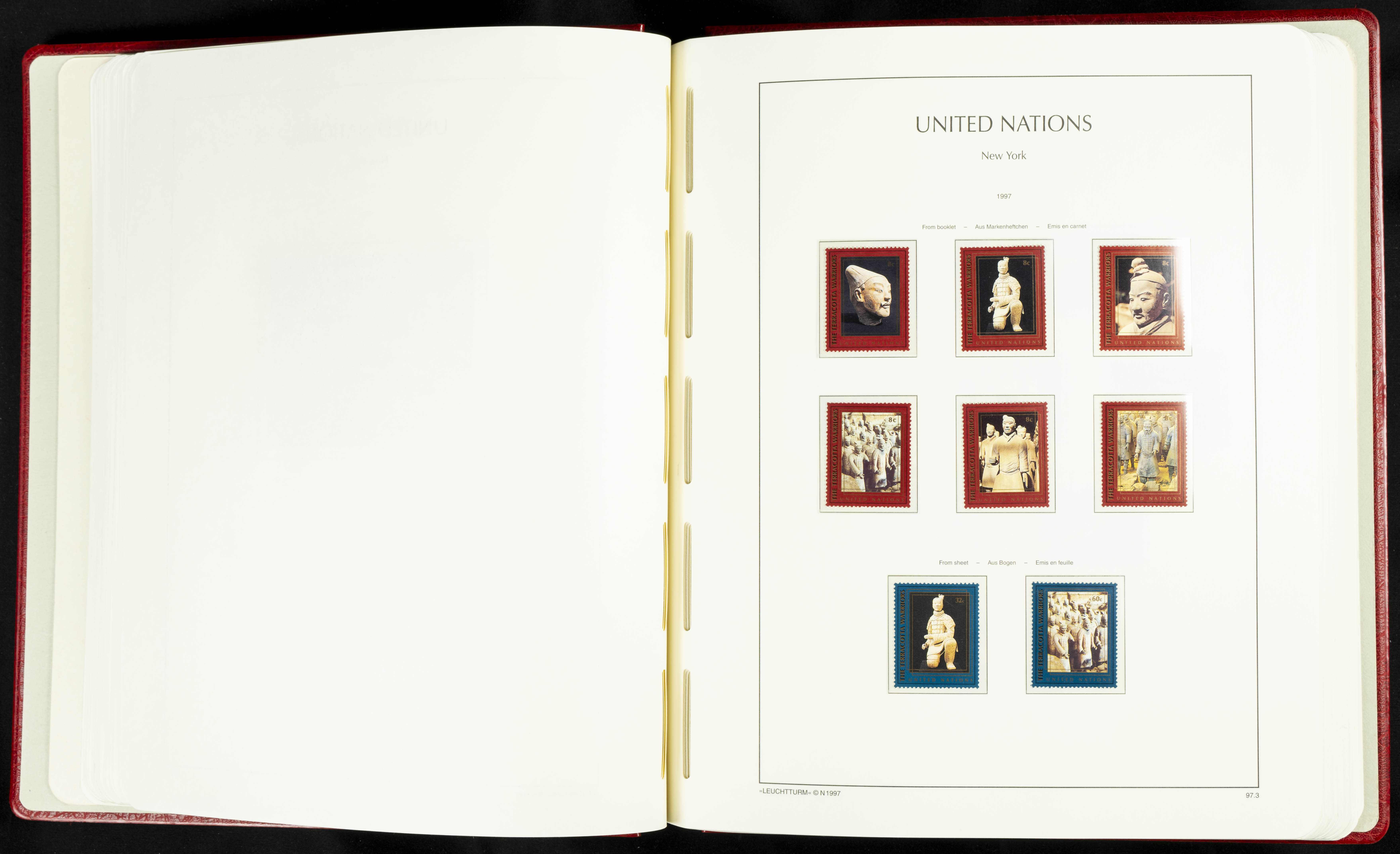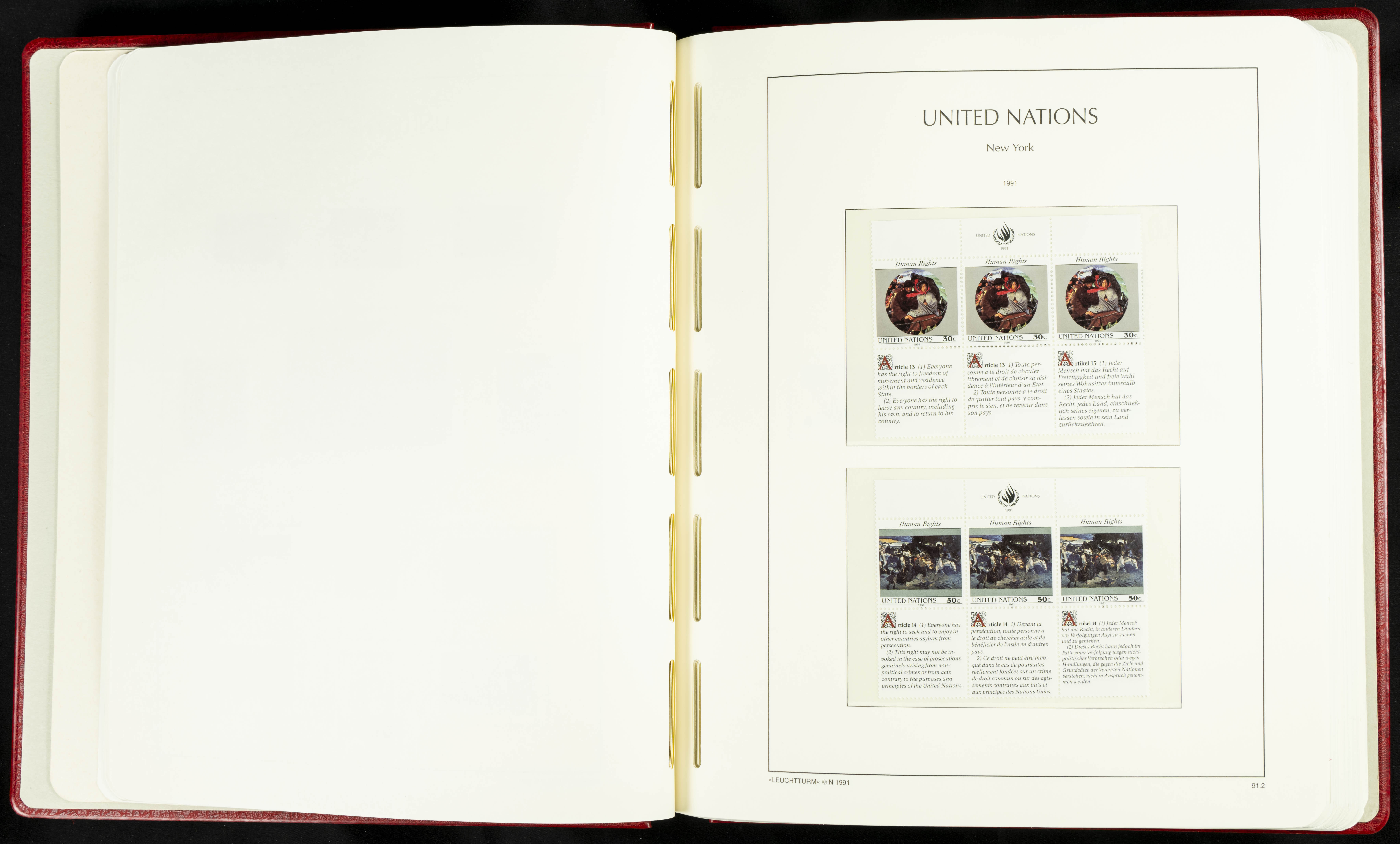 ★★(1951ca). Colección completa de Naciones Unidas (Nueva York, Ginebra y Viena) entre 1951 y 2011, en nuevo y sin fijasellos (montada en álbumes Faro). ALTO VALOR DE CATALOGO. A EXAMINAR.