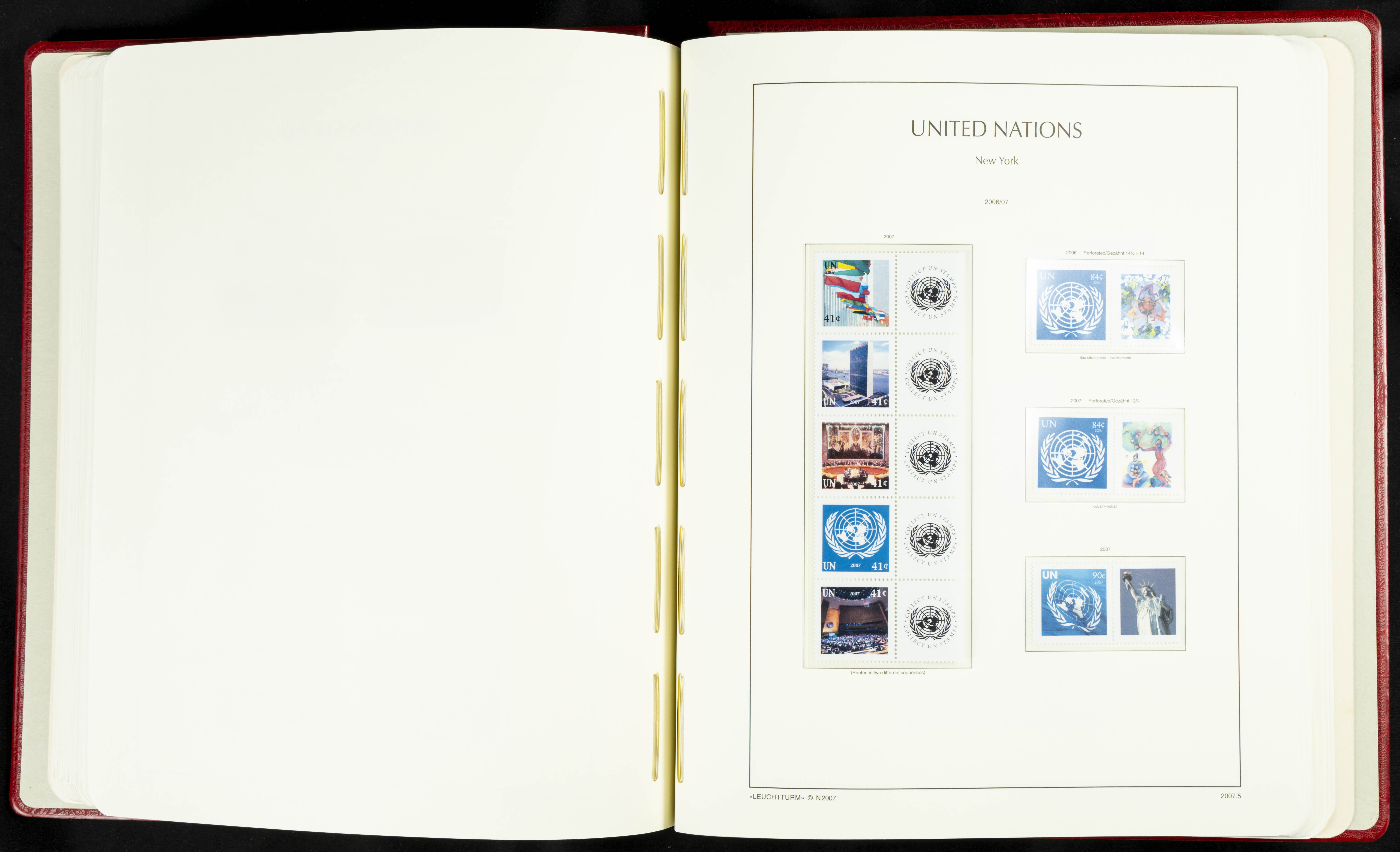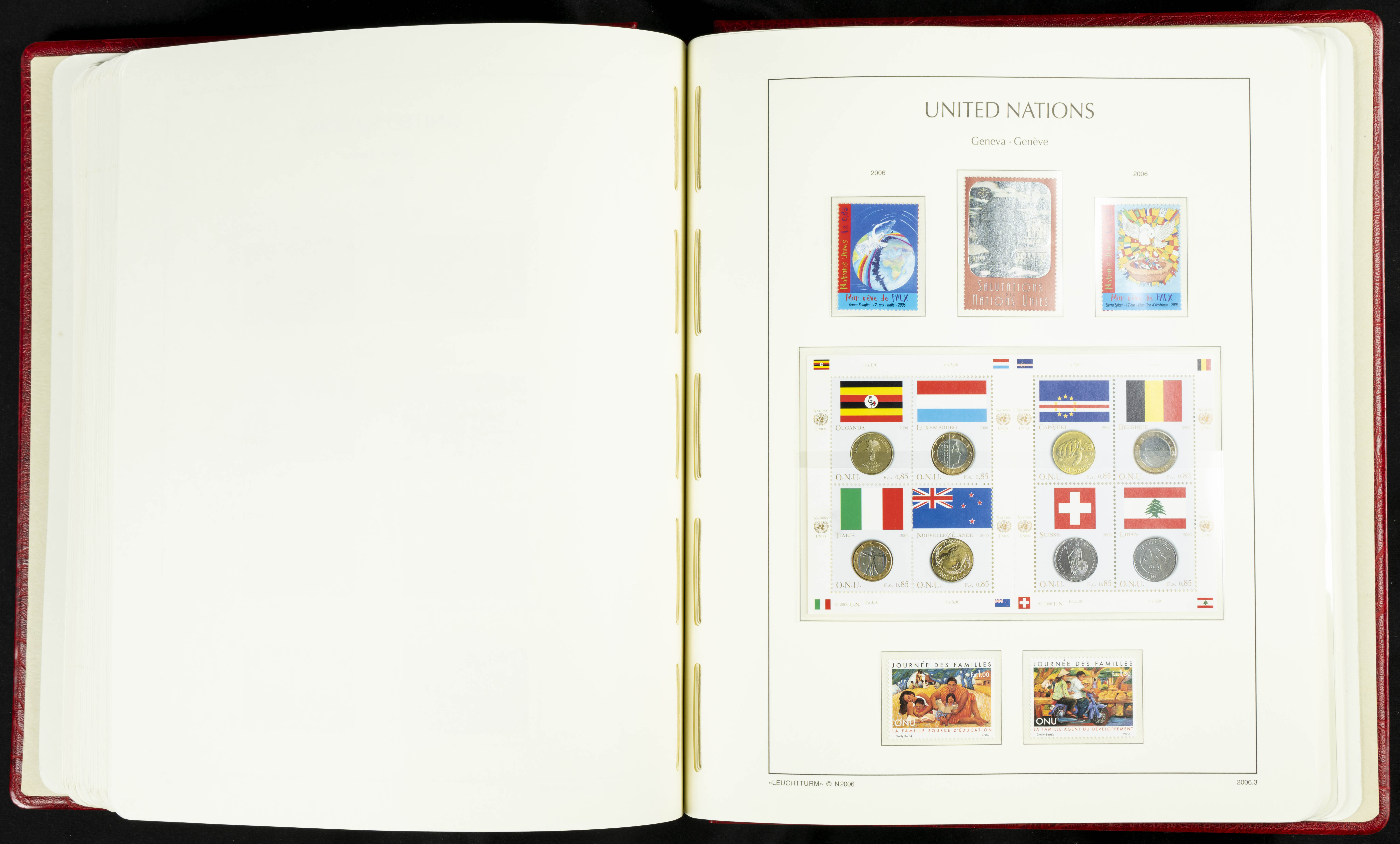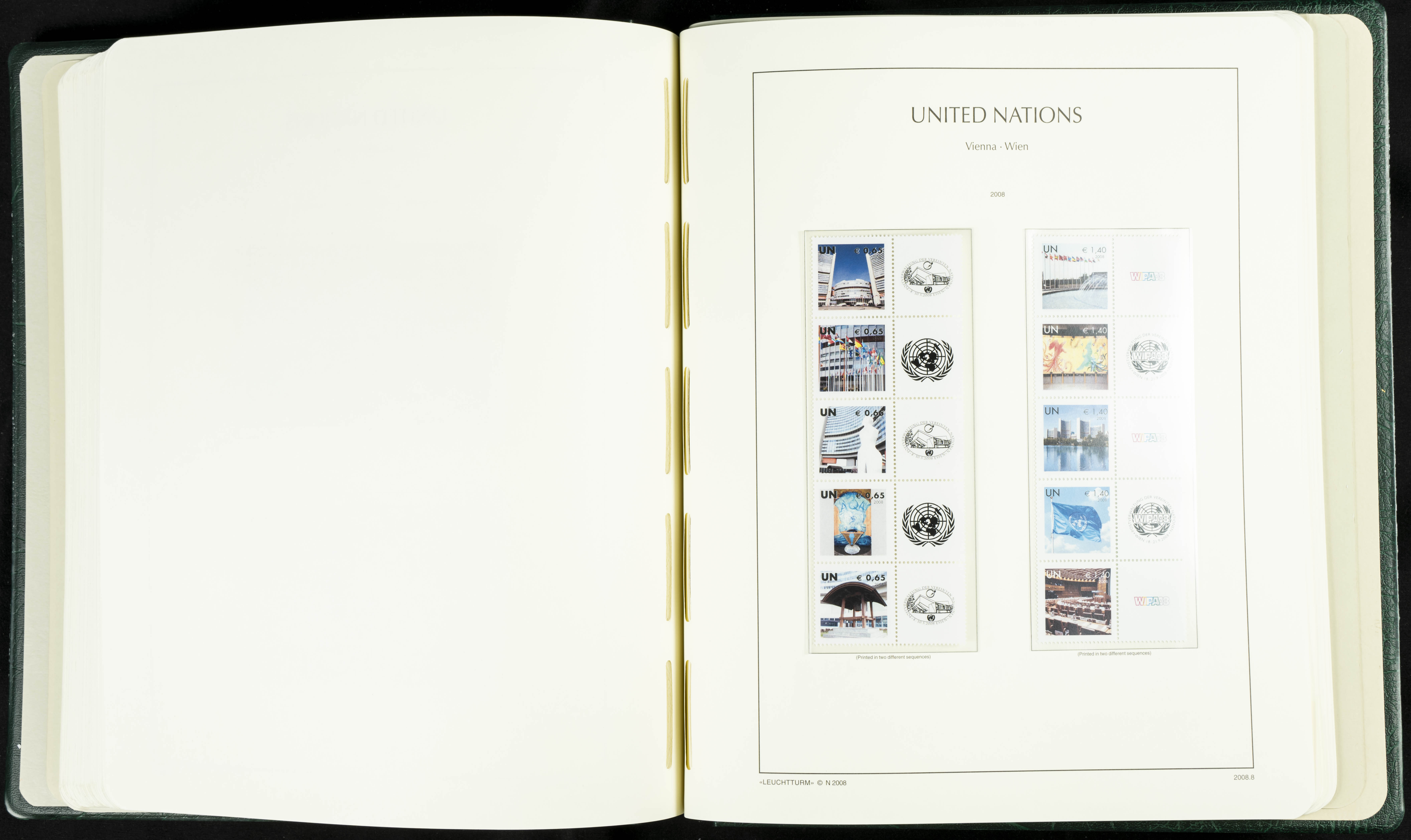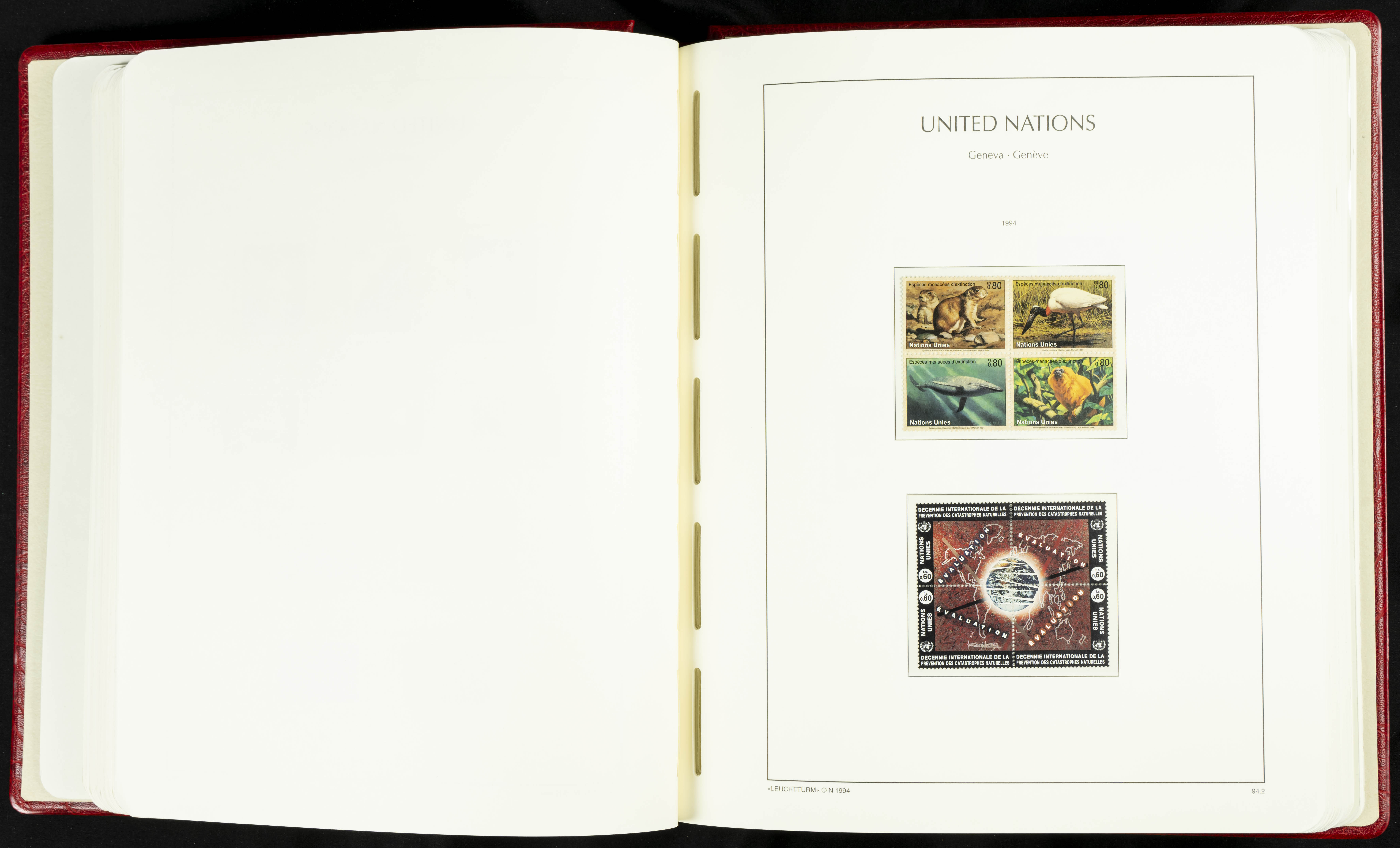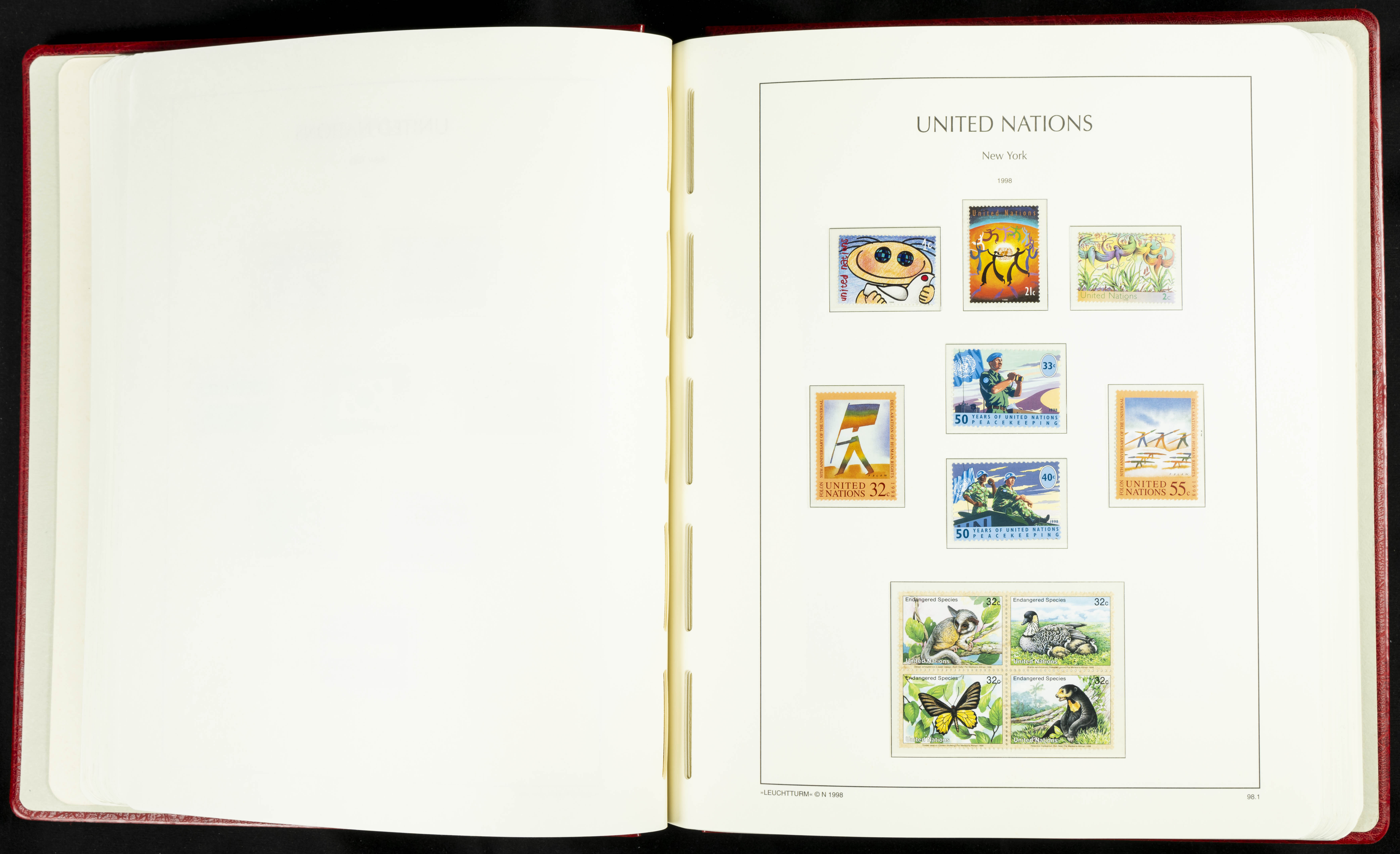 ★★(1951ca). Colección completa de Naciones Unidas (Nueva York, Ginebra y Viena) entre 1951 y 2011, en nuevo y sin fijasellos (montada en álbumes Faro). ALTO VALOR DE CATALOGO. A EXAMINAR.