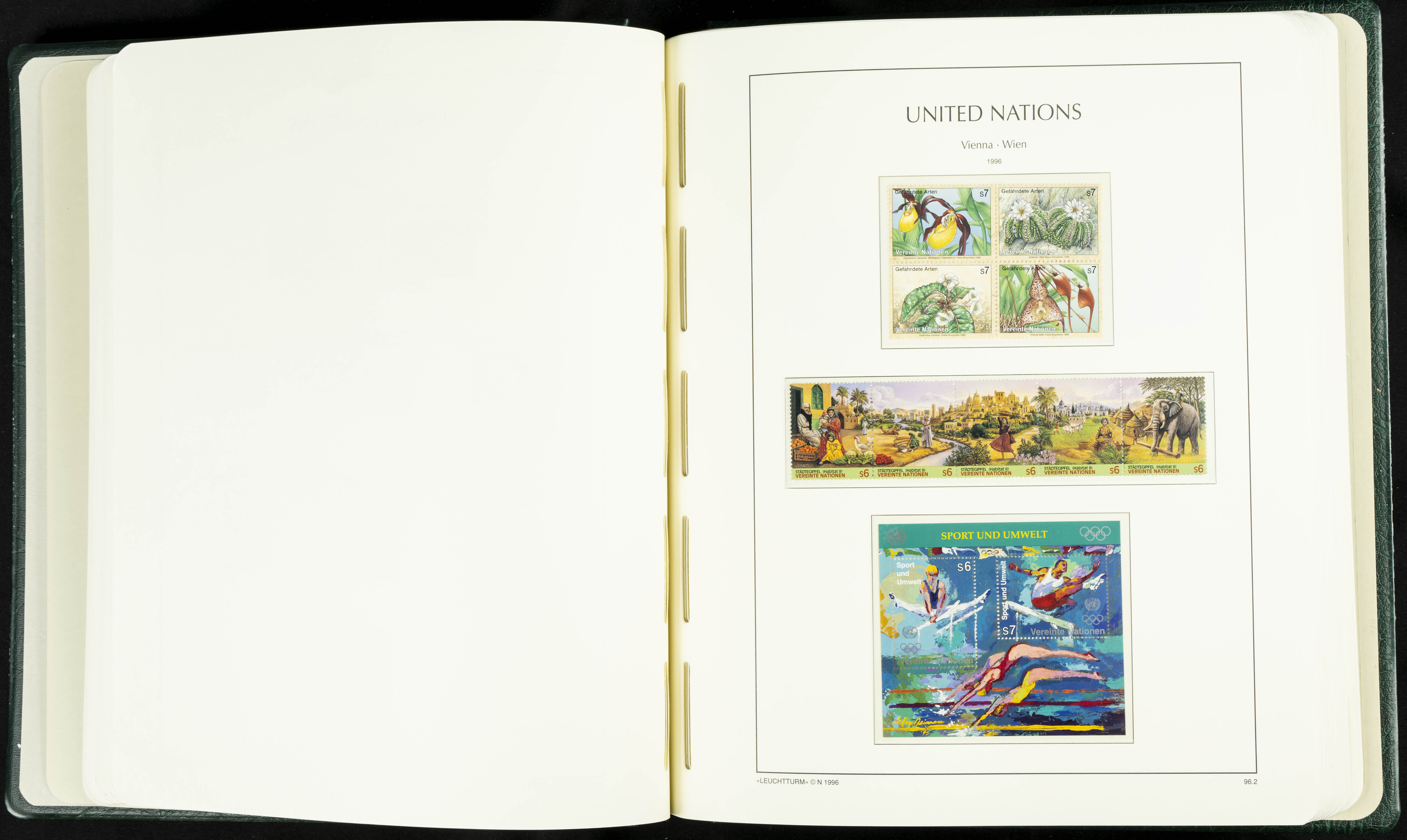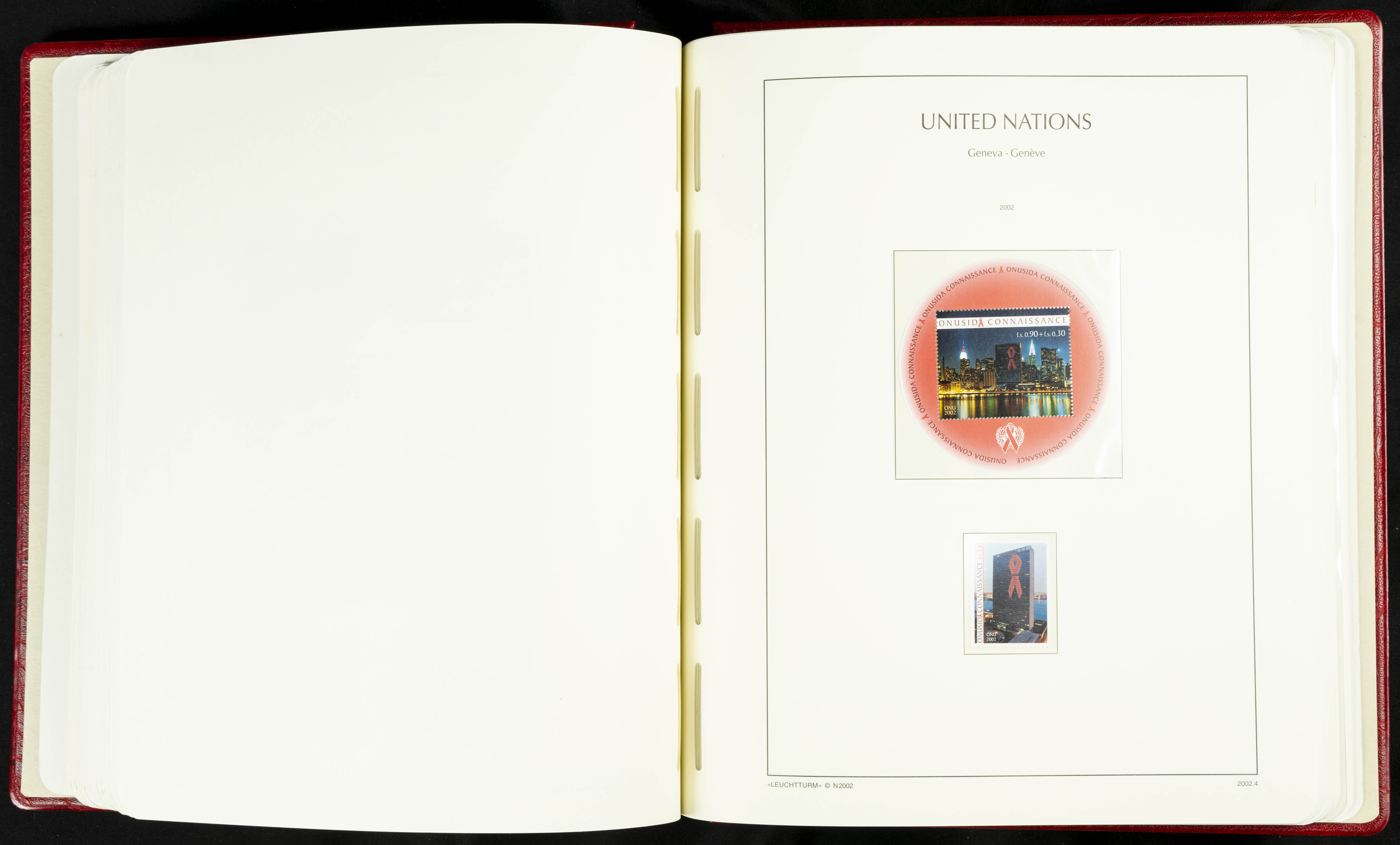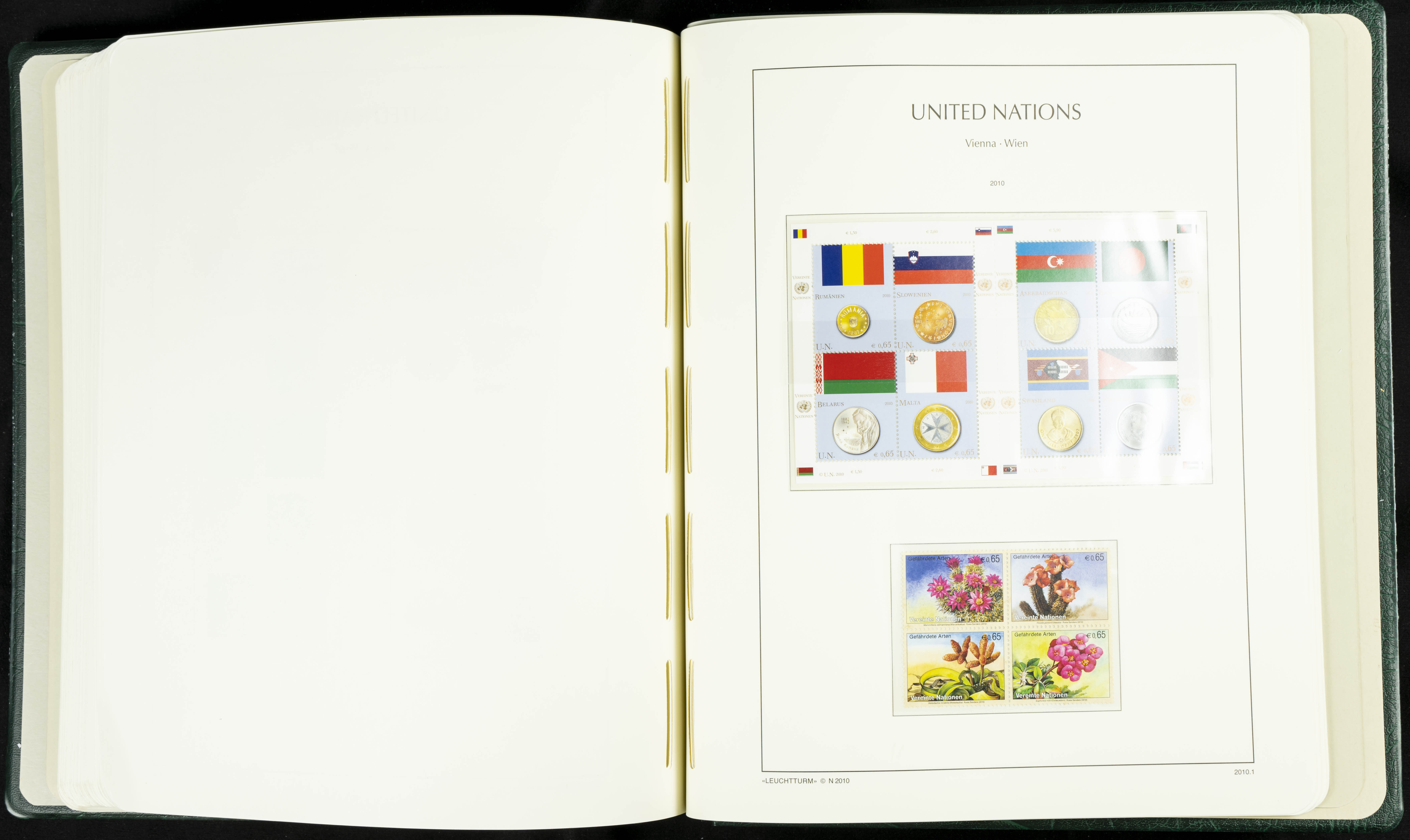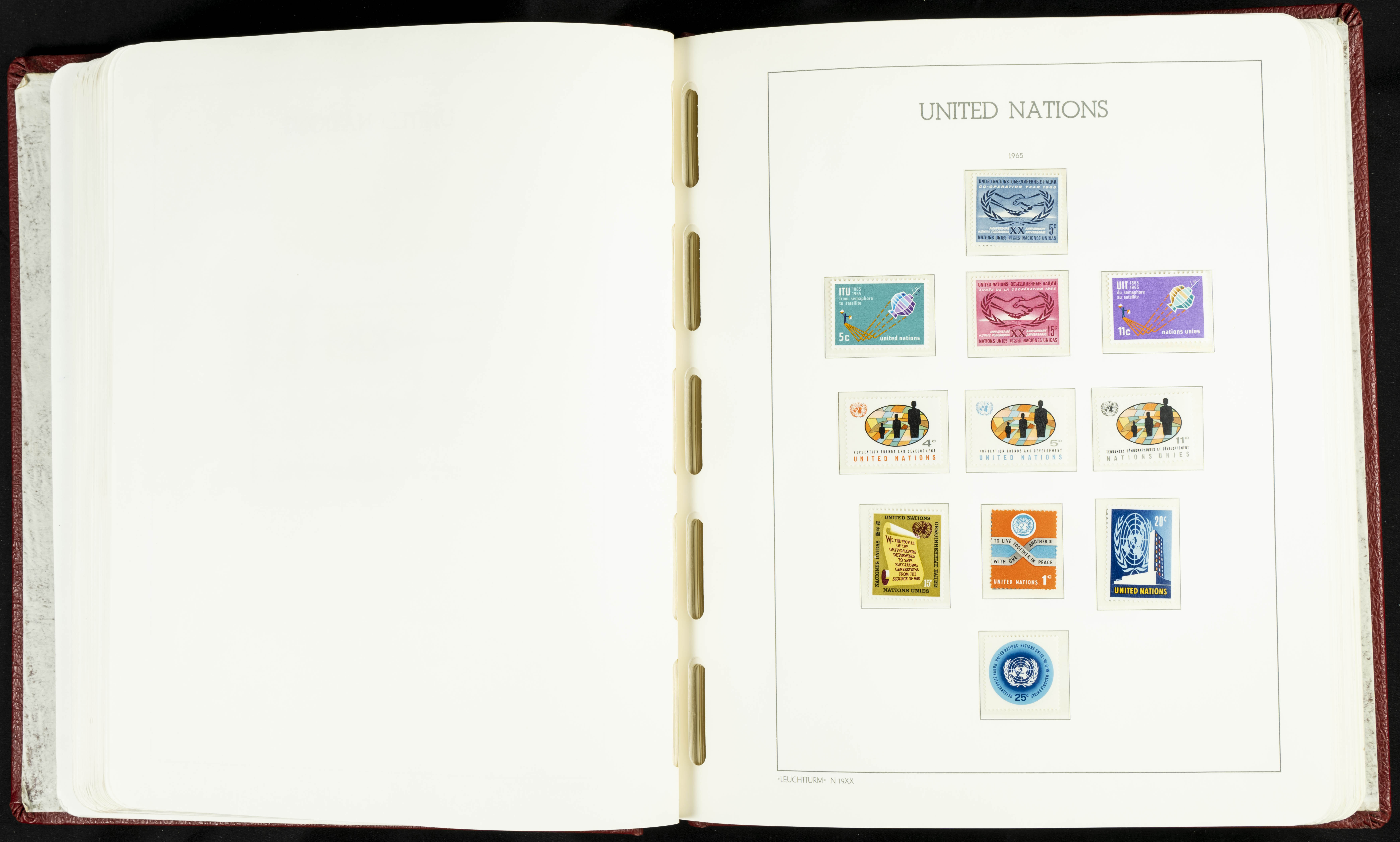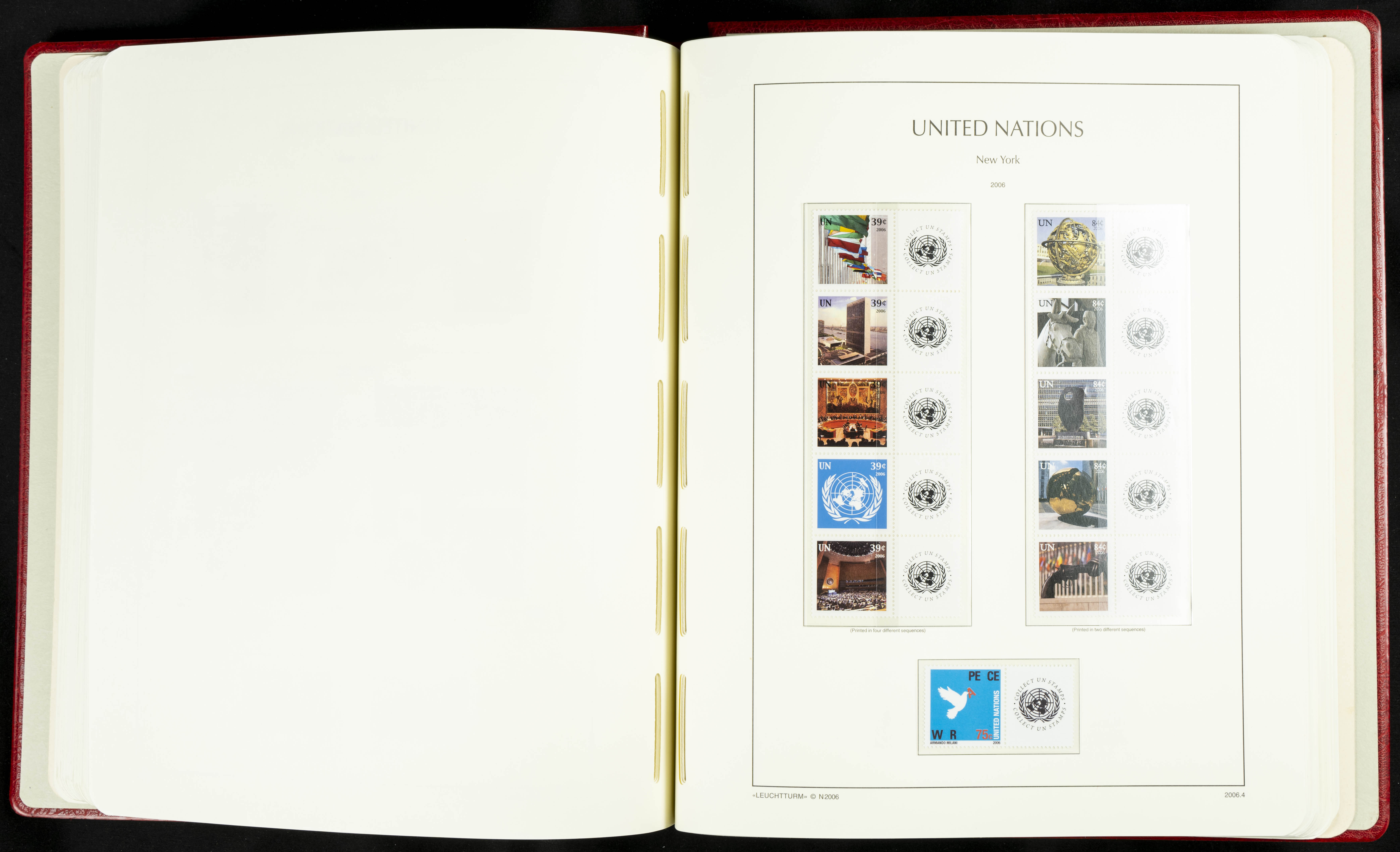 ★★(1951ca). Colección completa de Naciones Unidas (Nueva York, Ginebra y Viena) entre 1951 y 2011, en nuevo y sin fijasellos (montada en álbumes Faro). ALTO VALOR DE CATALOGO. A EXAMINAR.