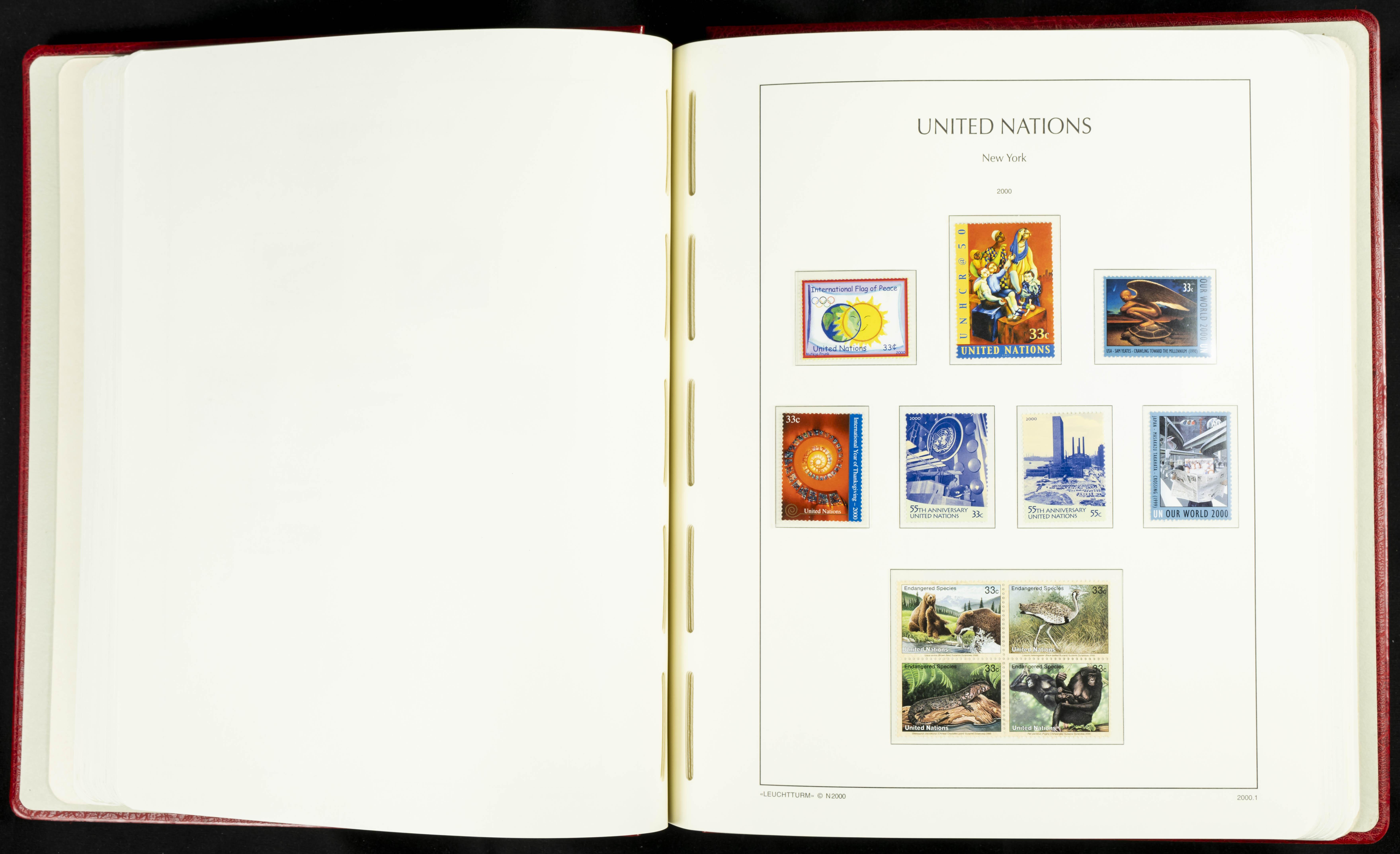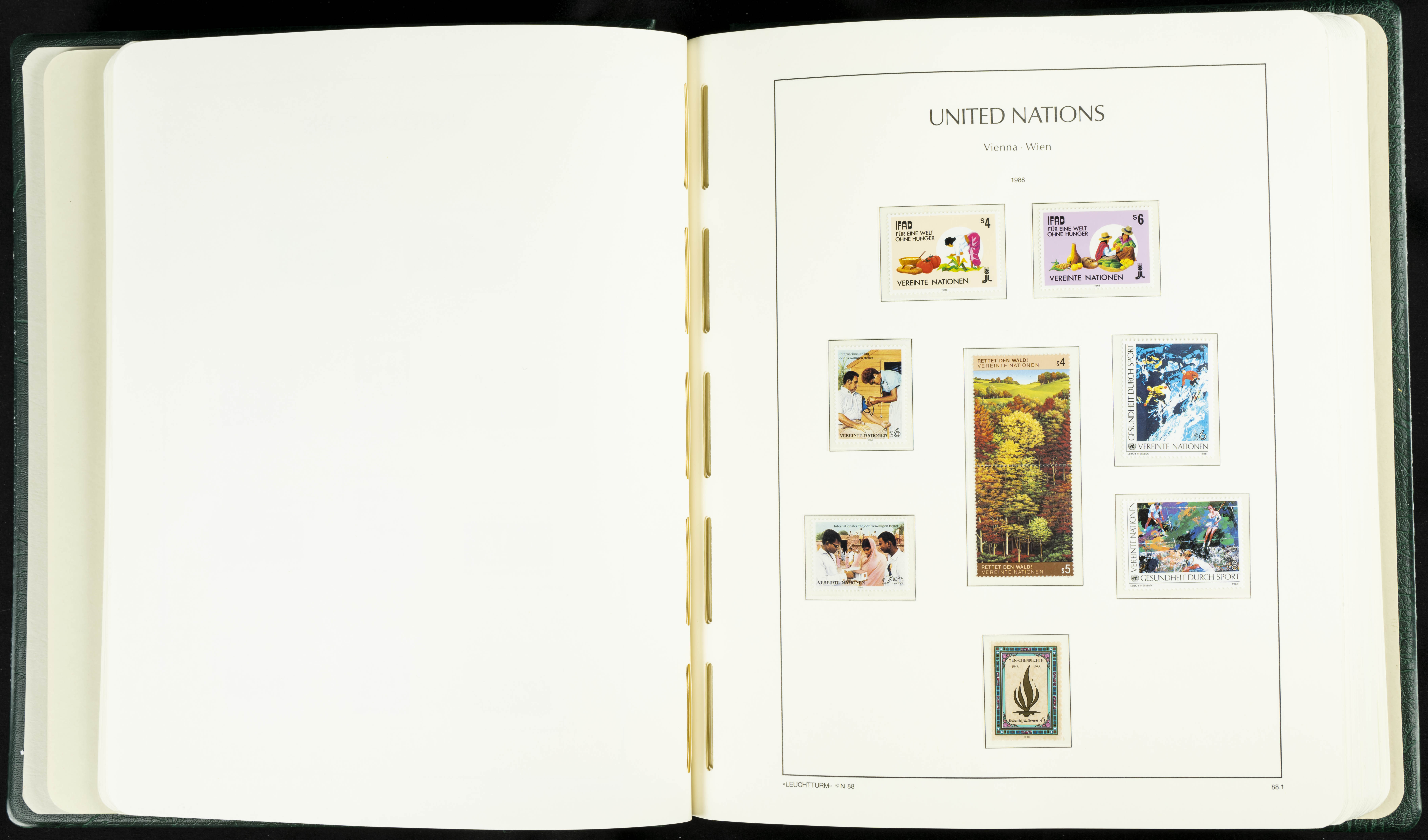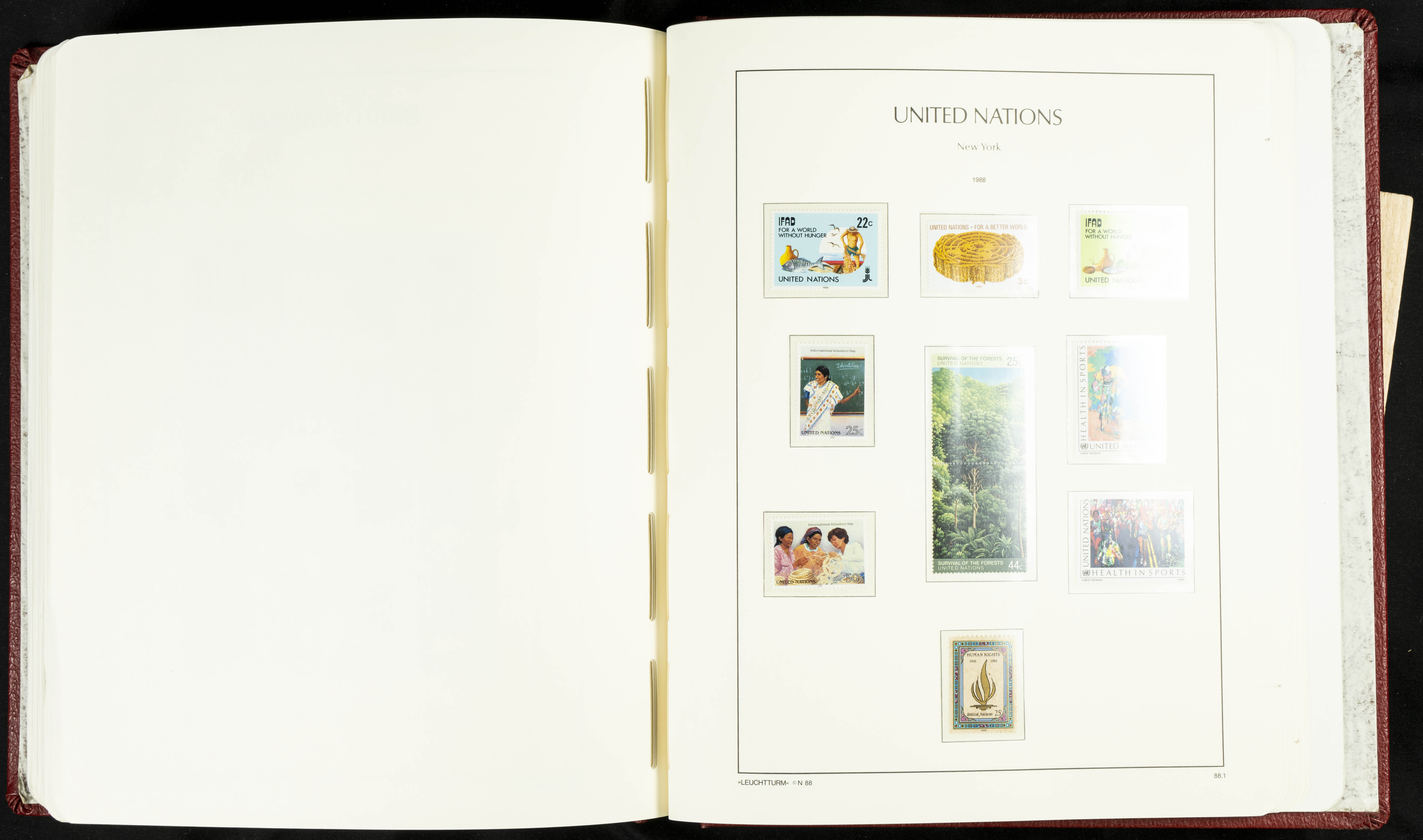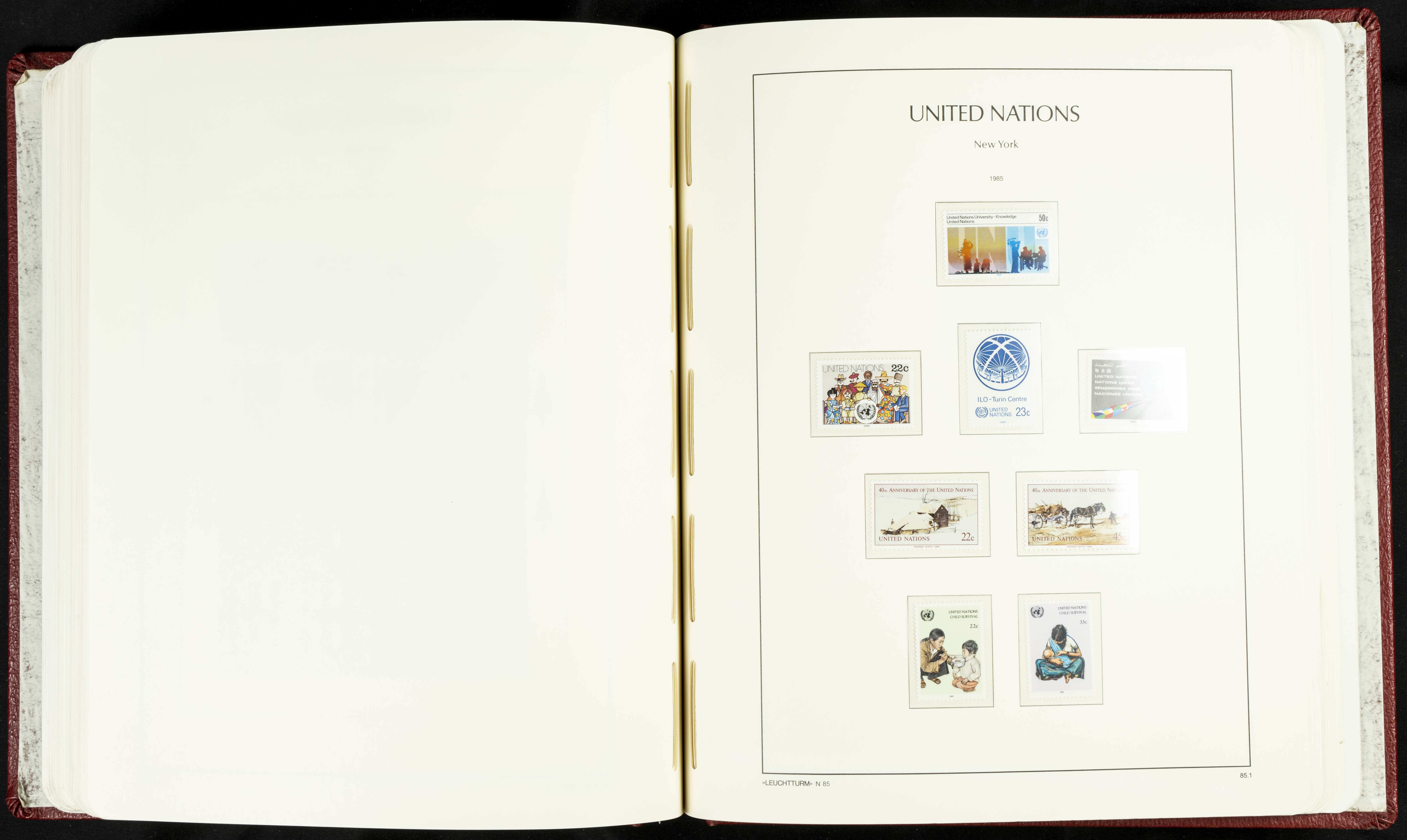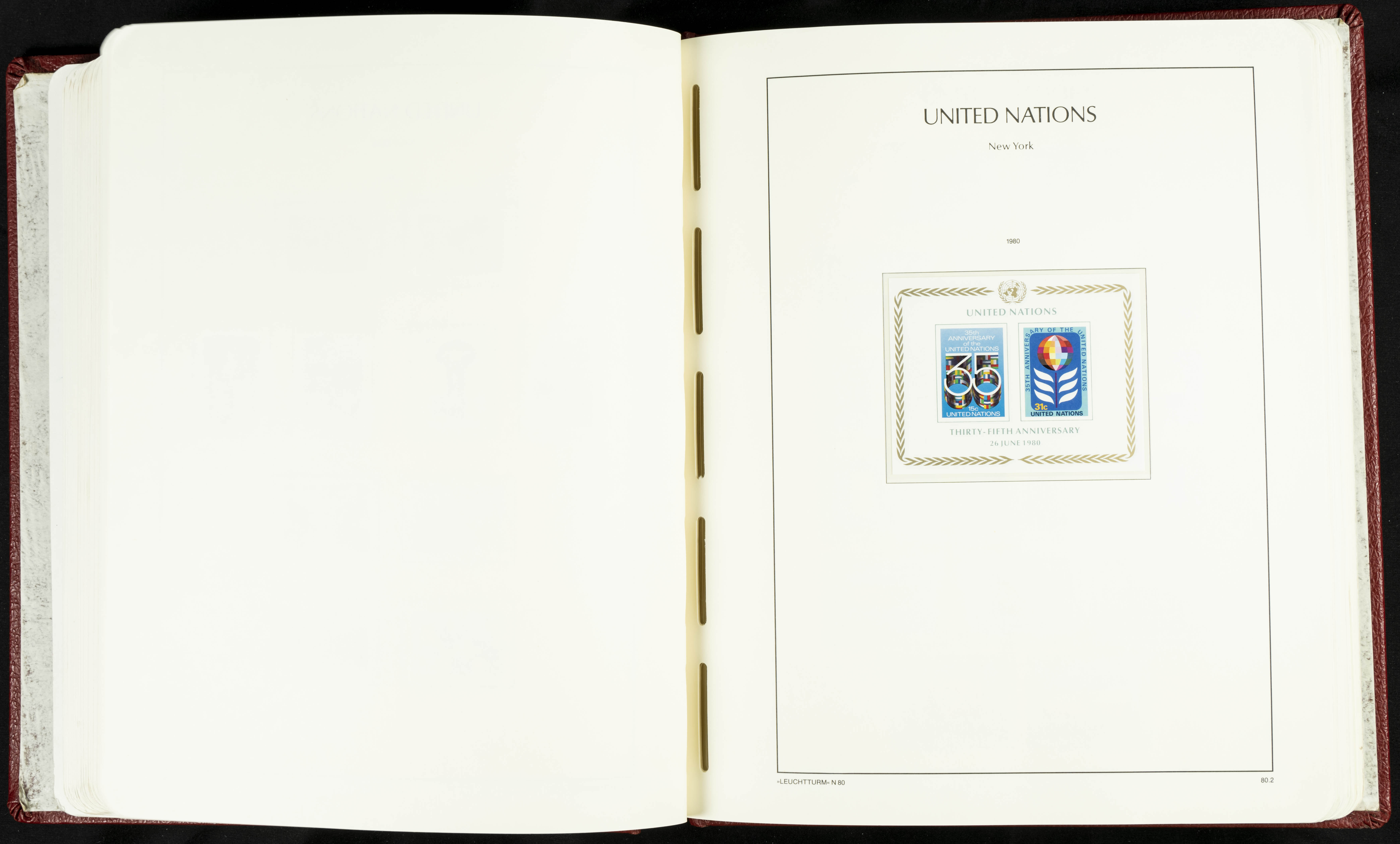 ★★(1951ca). Colección completa de Naciones Unidas (Nueva York, Ginebra y Viena) entre 1951 y 2011, en nuevo y sin fijasellos (montada en álbumes Faro). ALTO VALOR DE CATALOGO. A EXAMINAR.