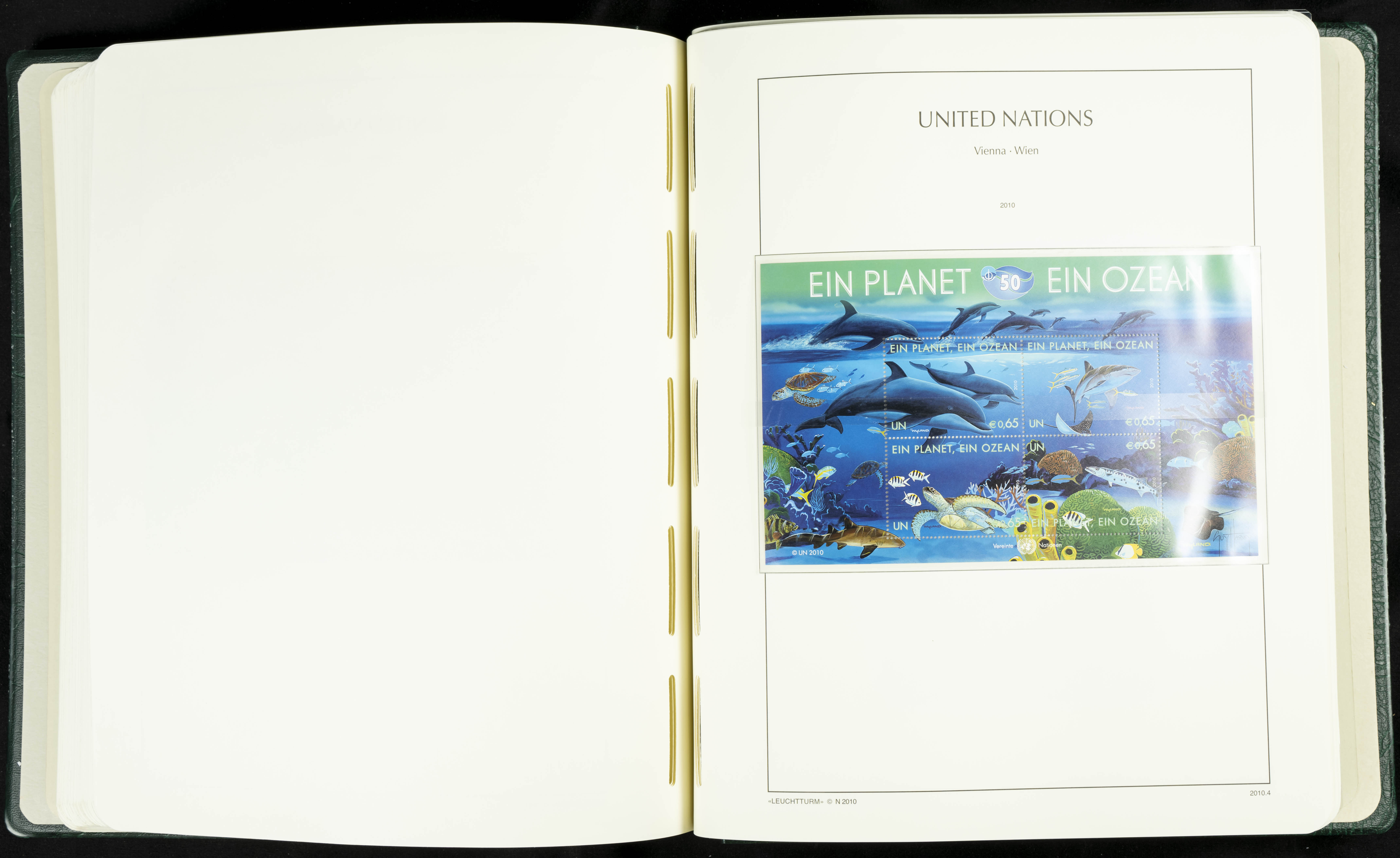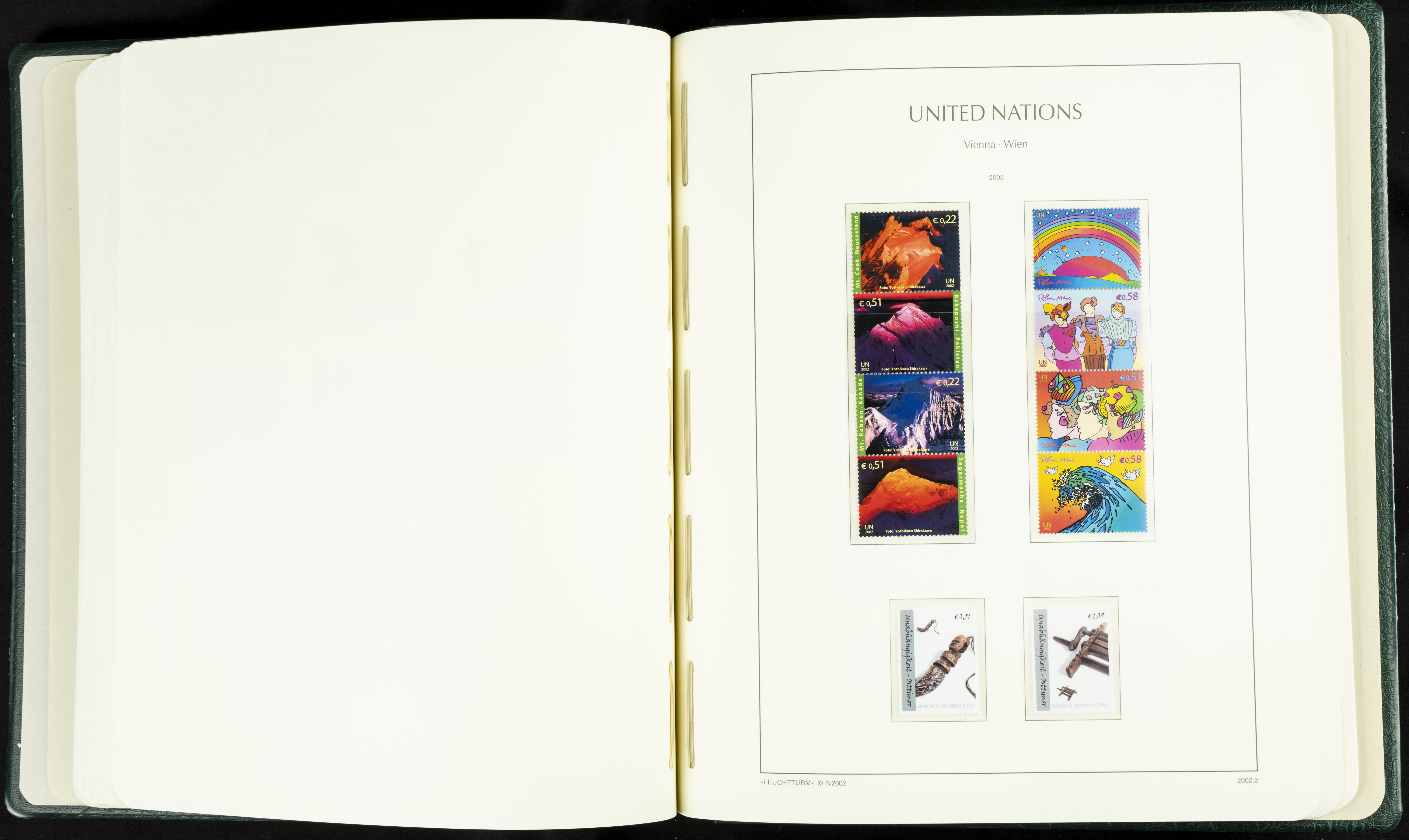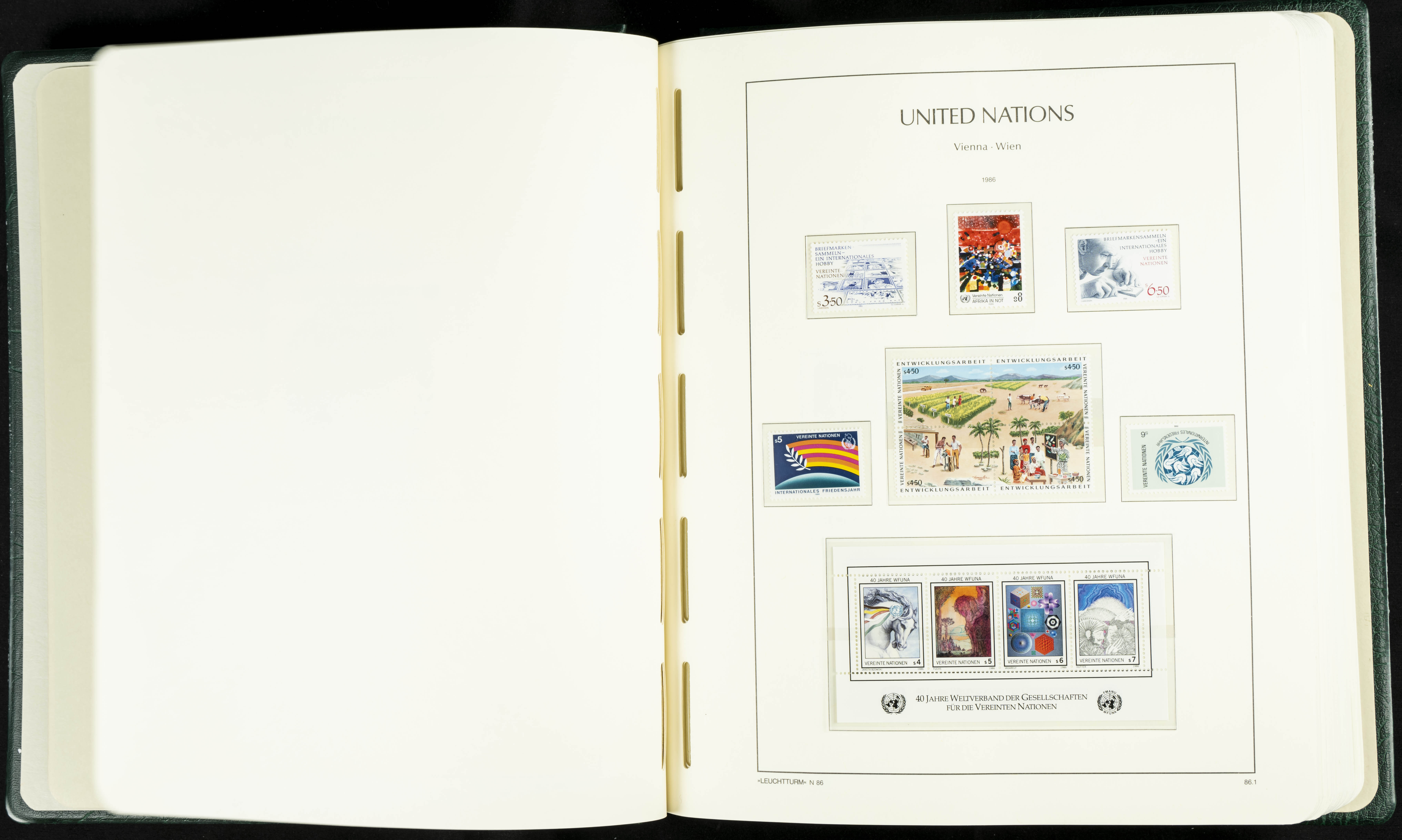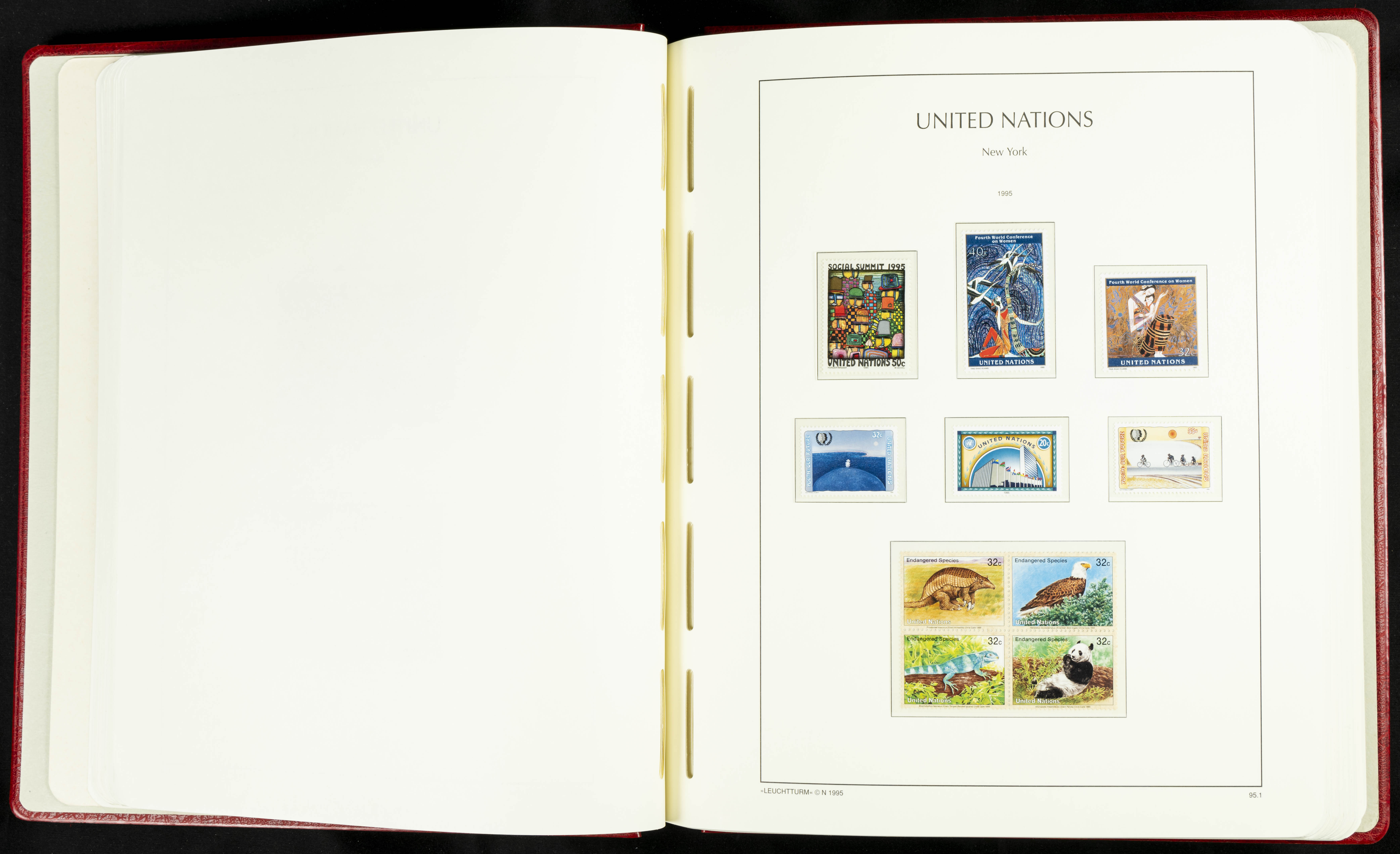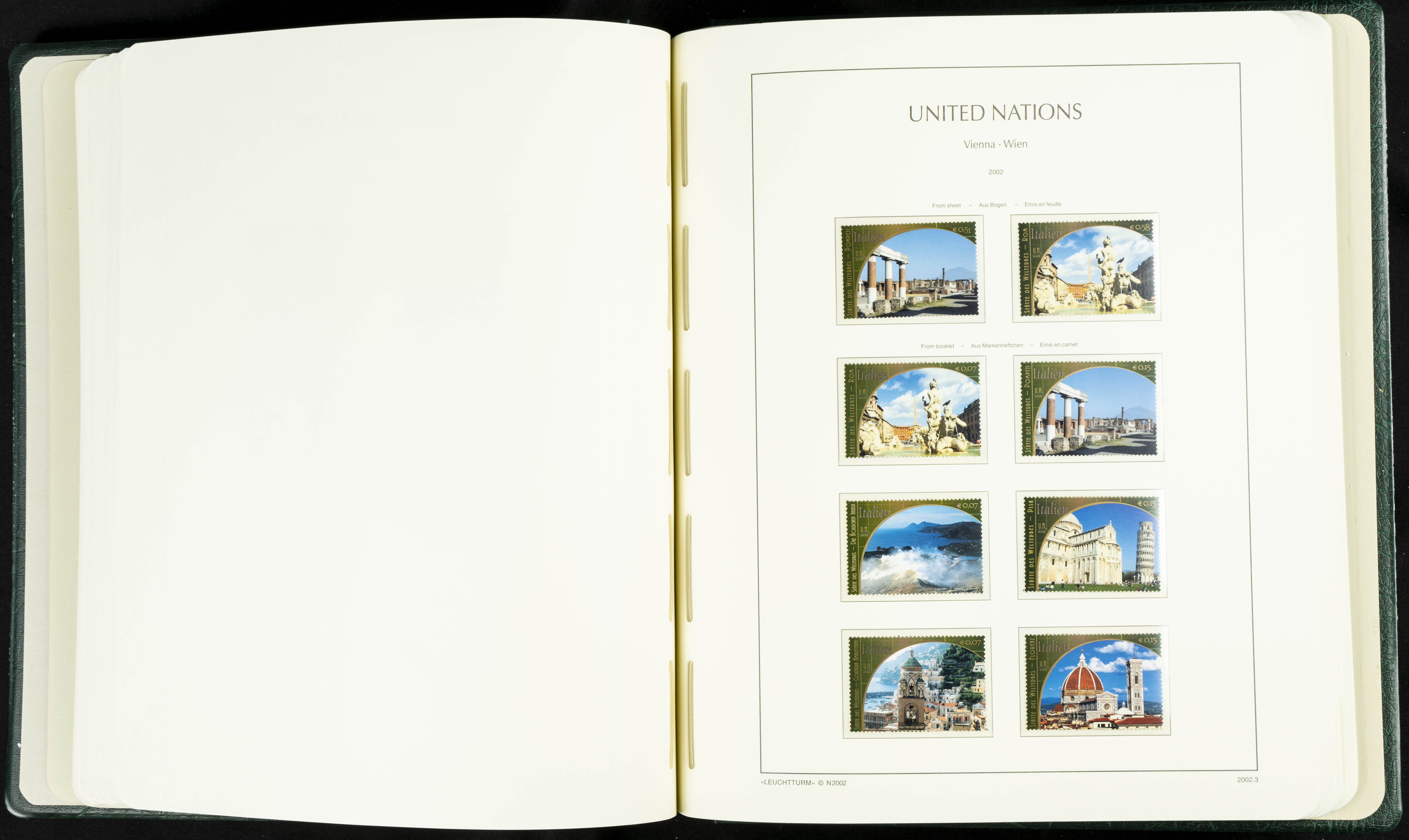 ★★(1951ca). Colección completa de Naciones Unidas (Nueva York, Ginebra y Viena) entre 1951 y 2011, en nuevo y sin fijasellos (montada en álbumes Faro). ALTO VALOR DE CATALOGO. A EXAMINAR.