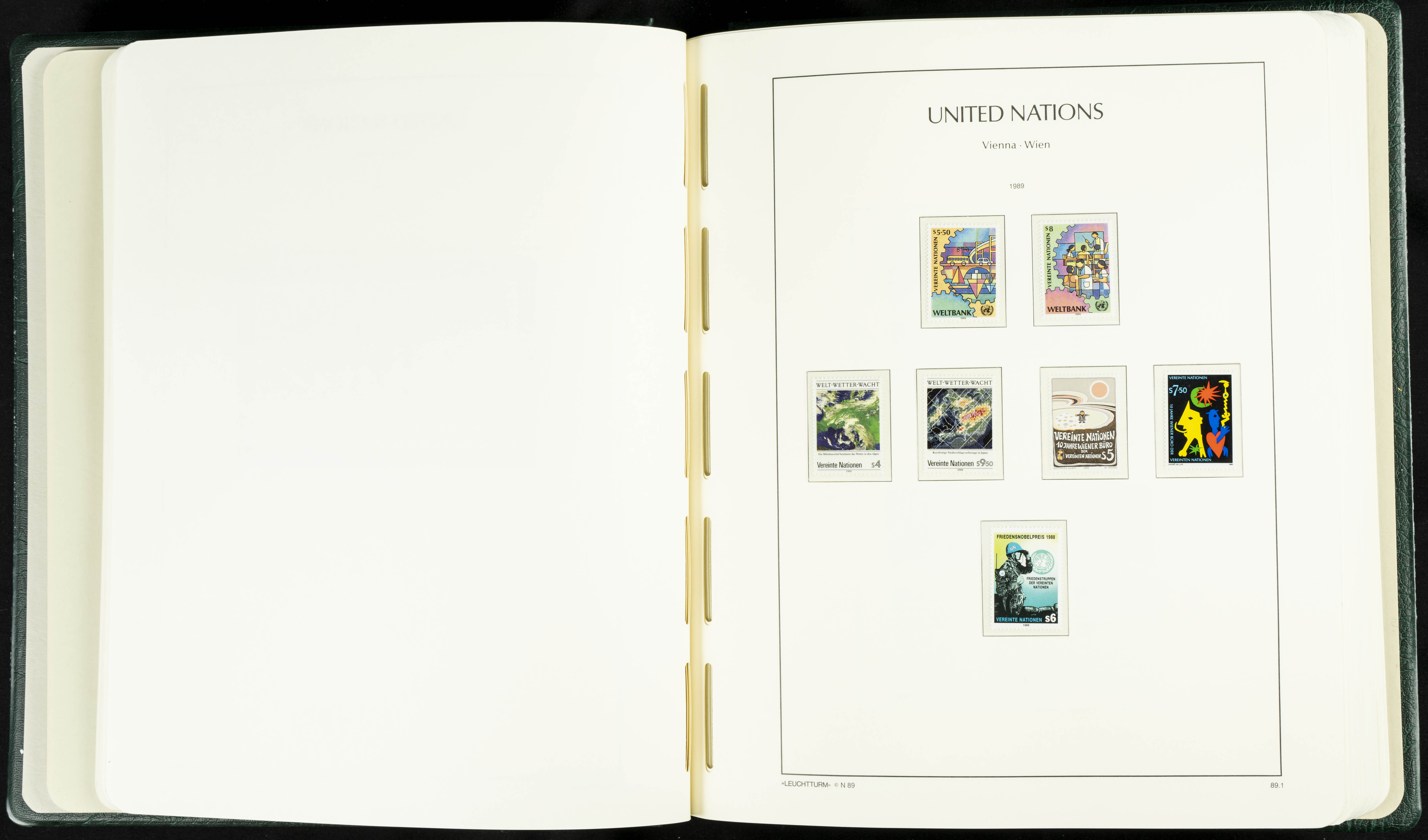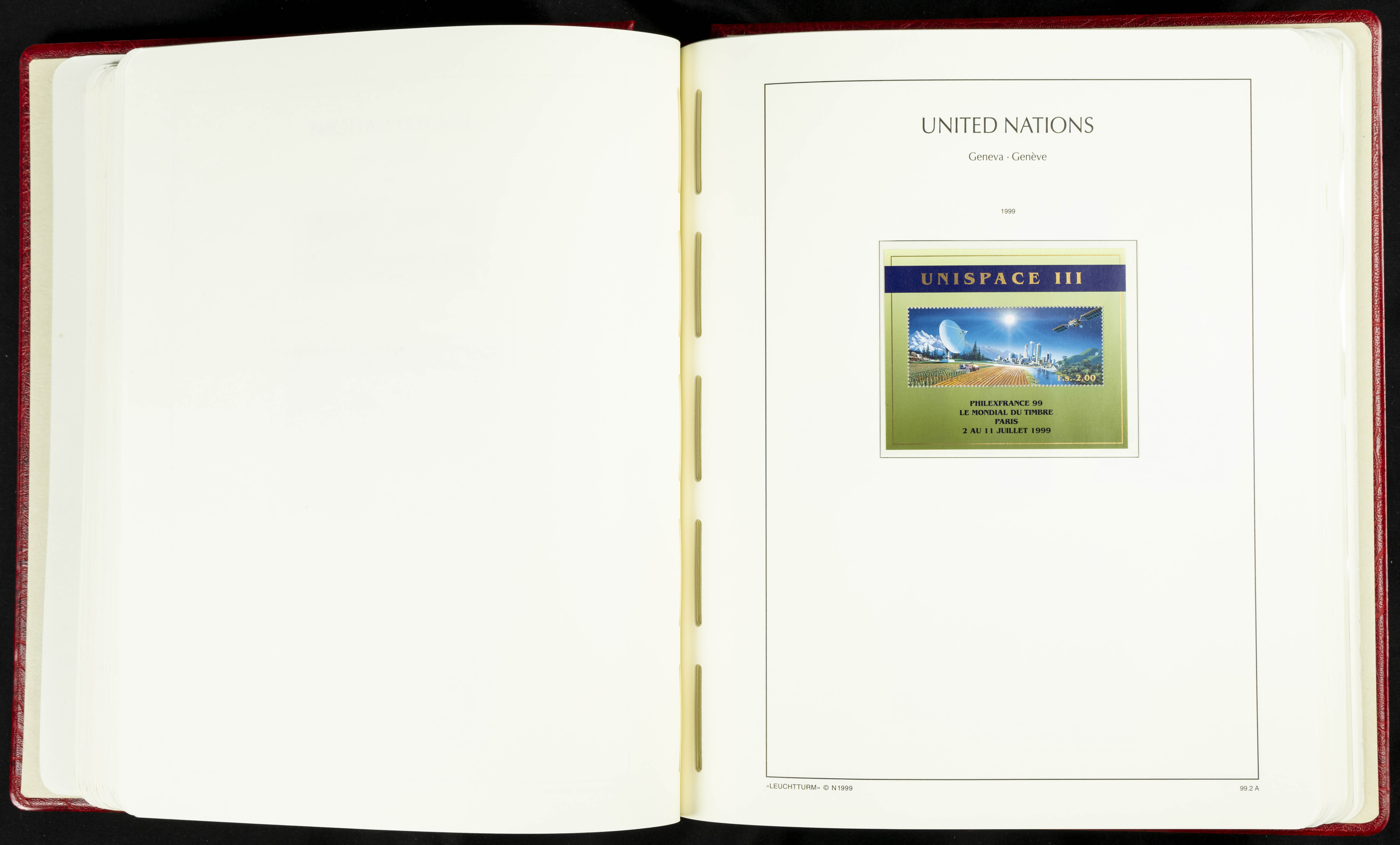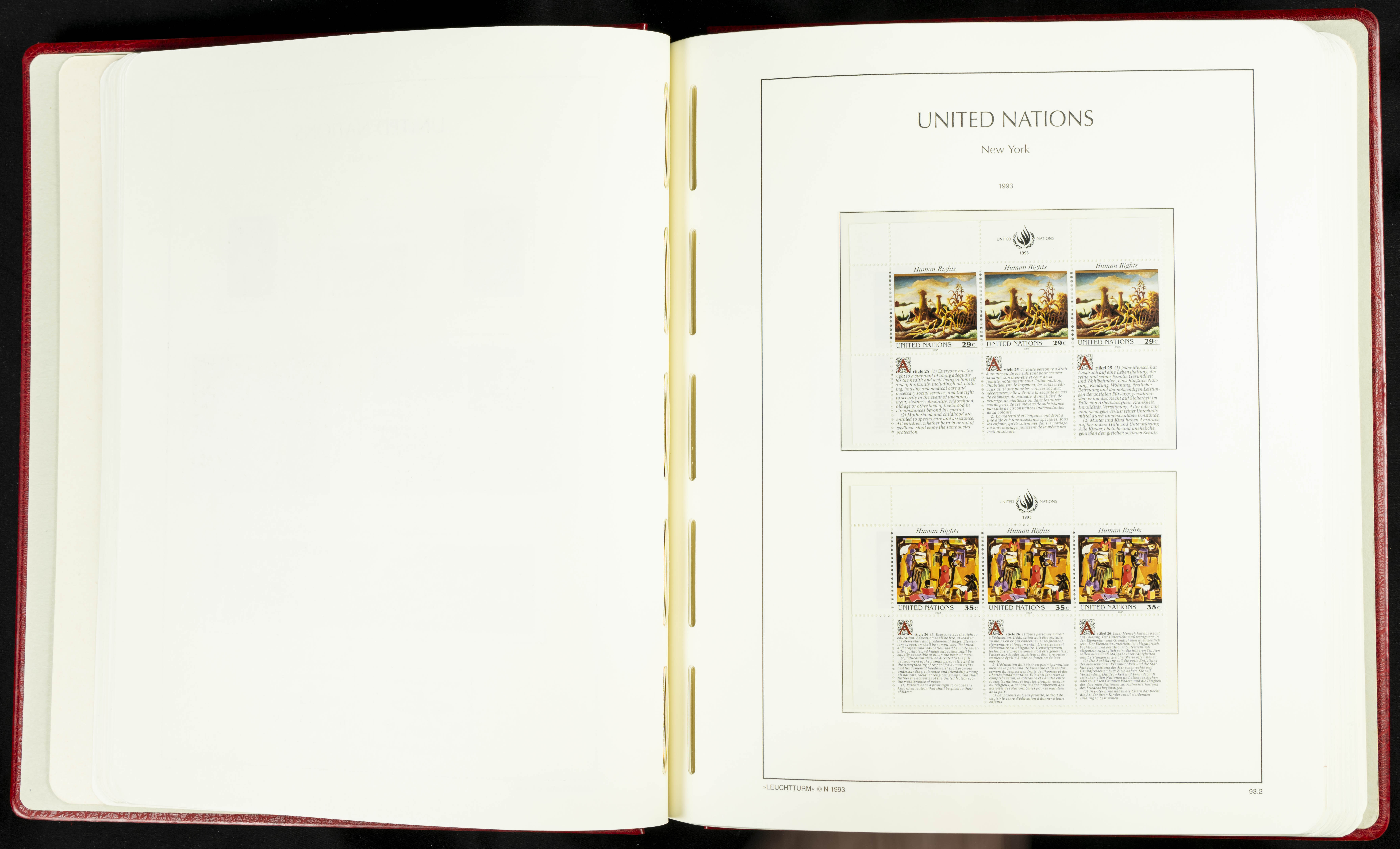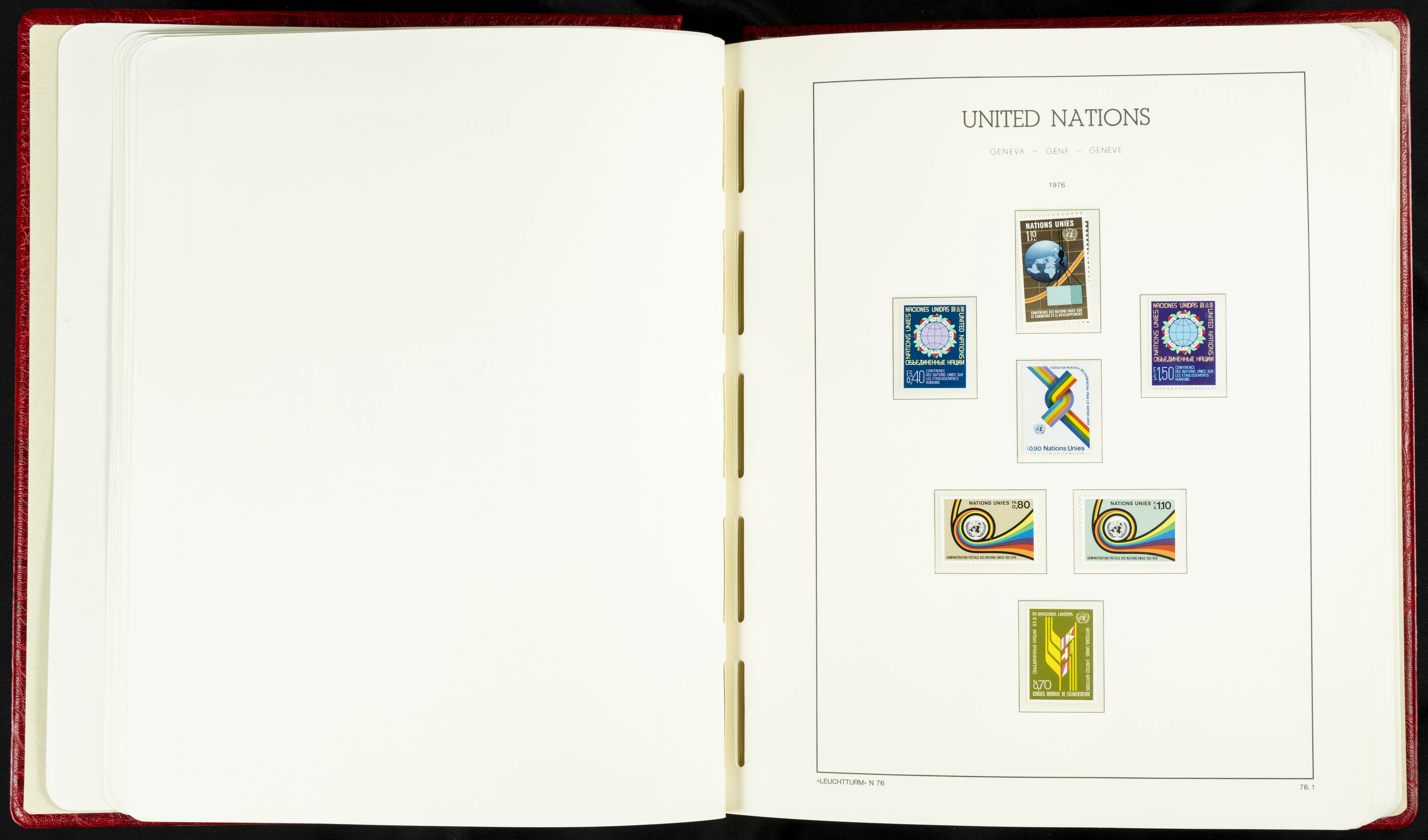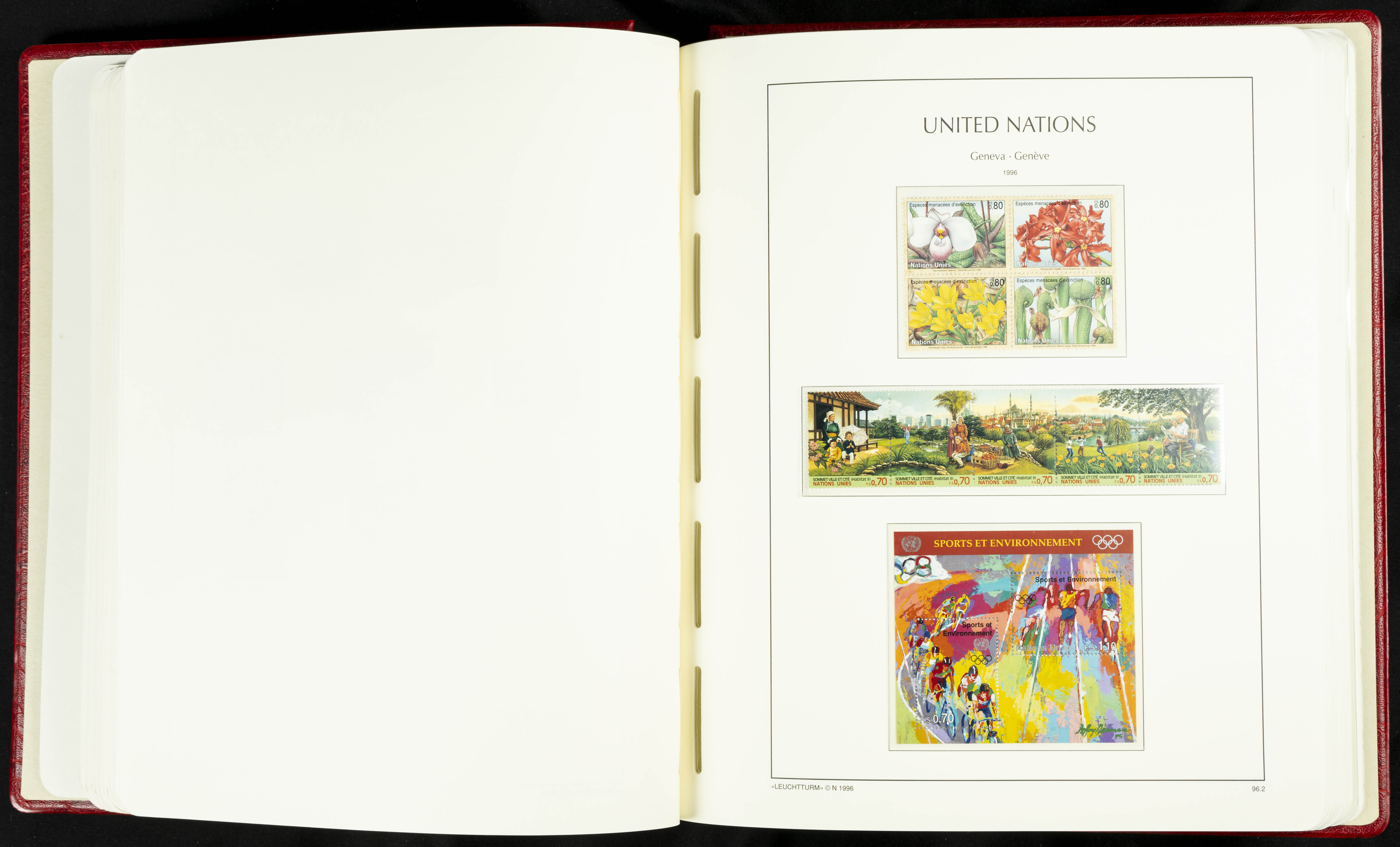 ★★(1951ca). Colección completa de Naciones Unidas (Nueva York, Ginebra y Viena) entre 1951 y 2011, en nuevo y sin fijasellos (montada en álbumes Faro). ALTO VALOR DE CATALOGO. A EXAMINAR.