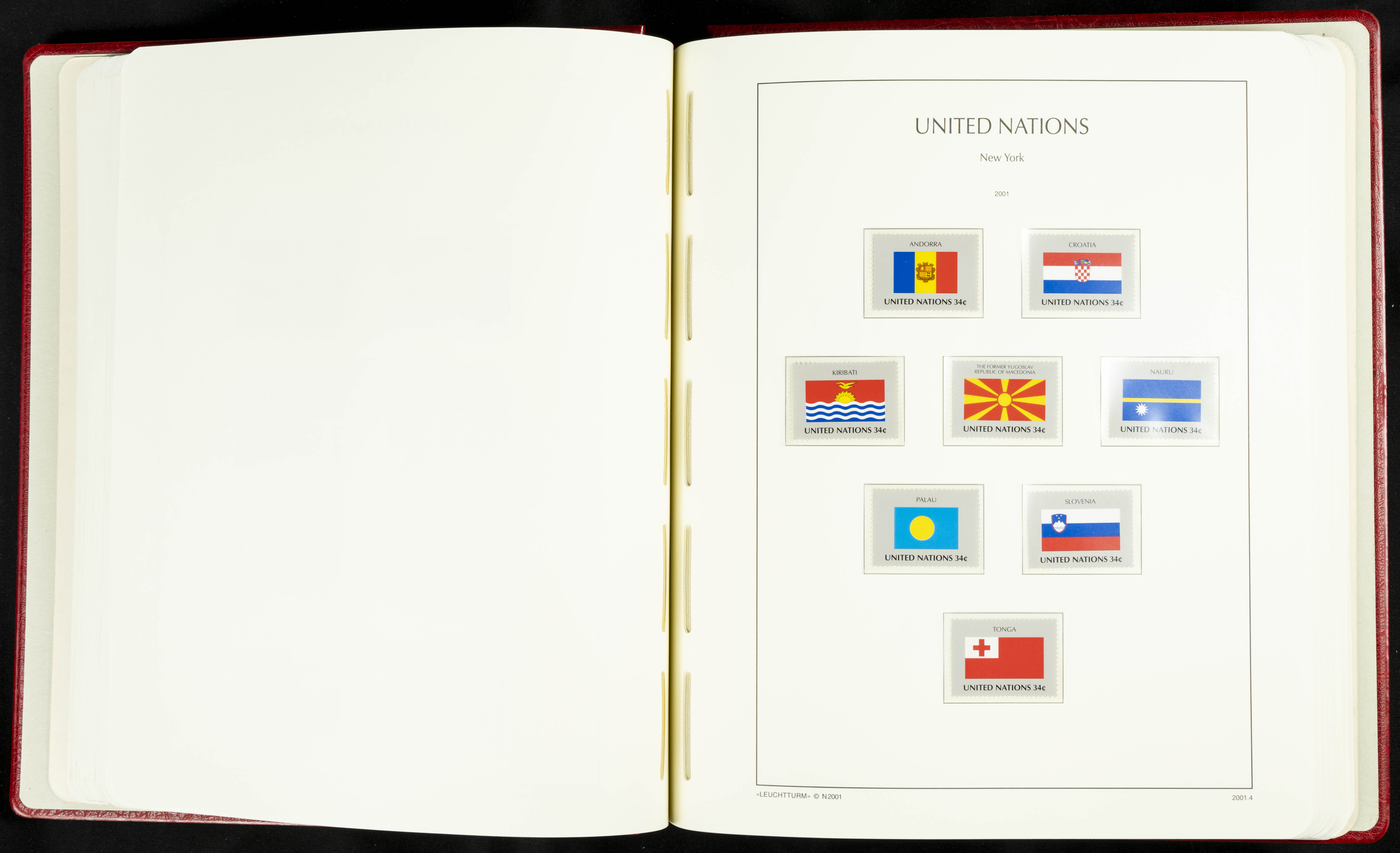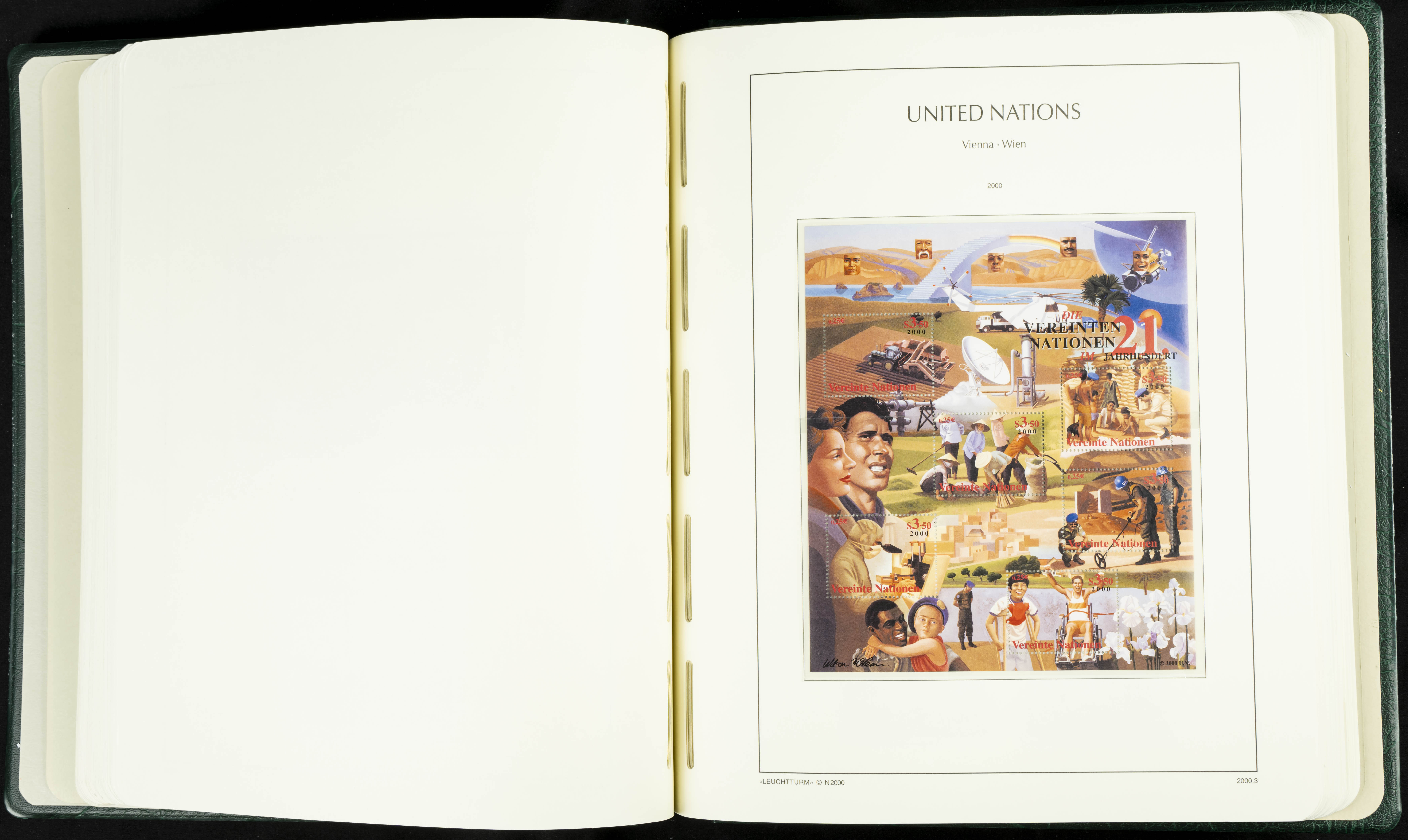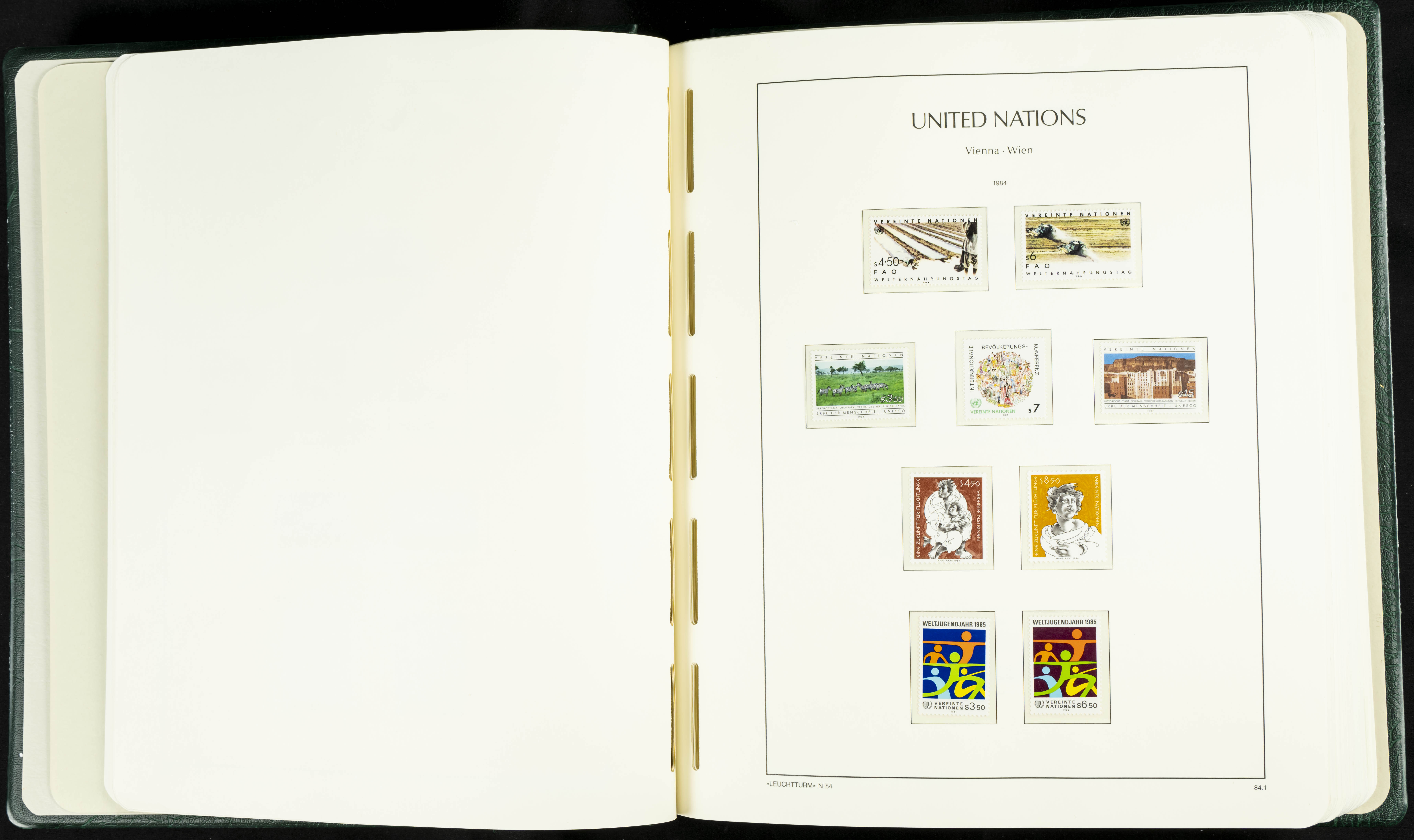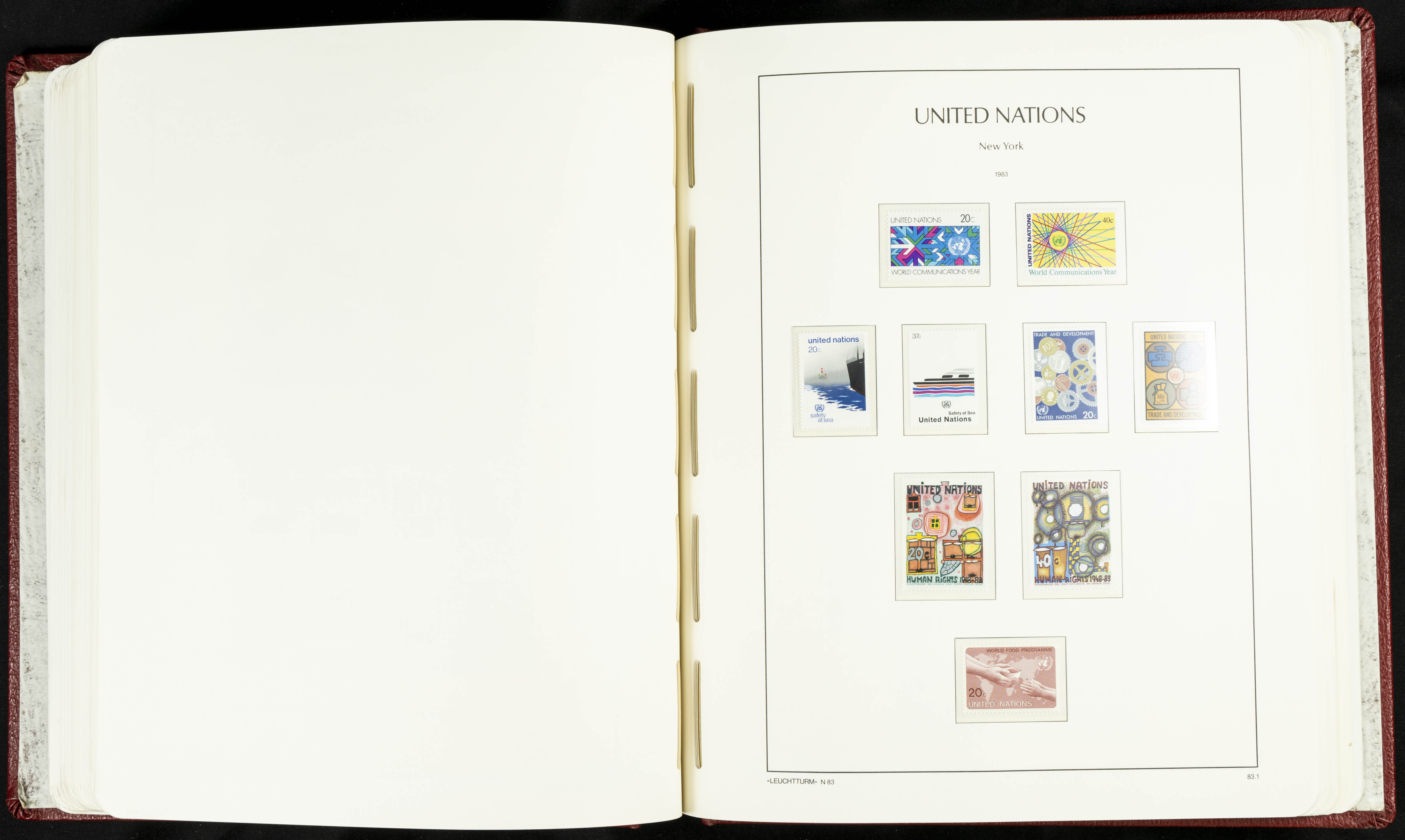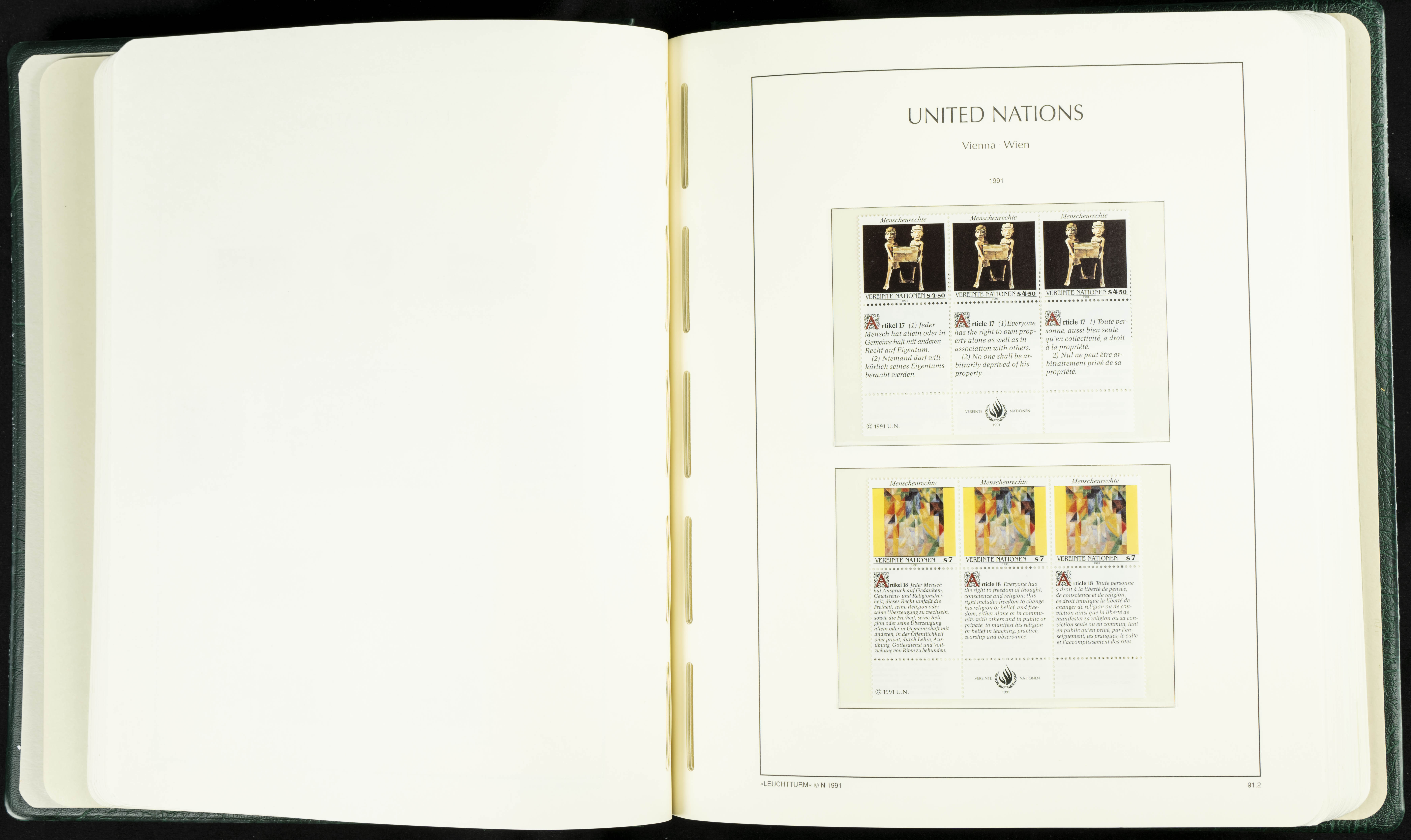 ★★(1951ca). Colección completa de Naciones Unidas (Nueva York, Ginebra y Viena) entre 1951 y 2011, en nuevo y sin fijasellos (montada en álbumes Faro). ALTO VALOR DE CATALOGO. A EXAMINAR.