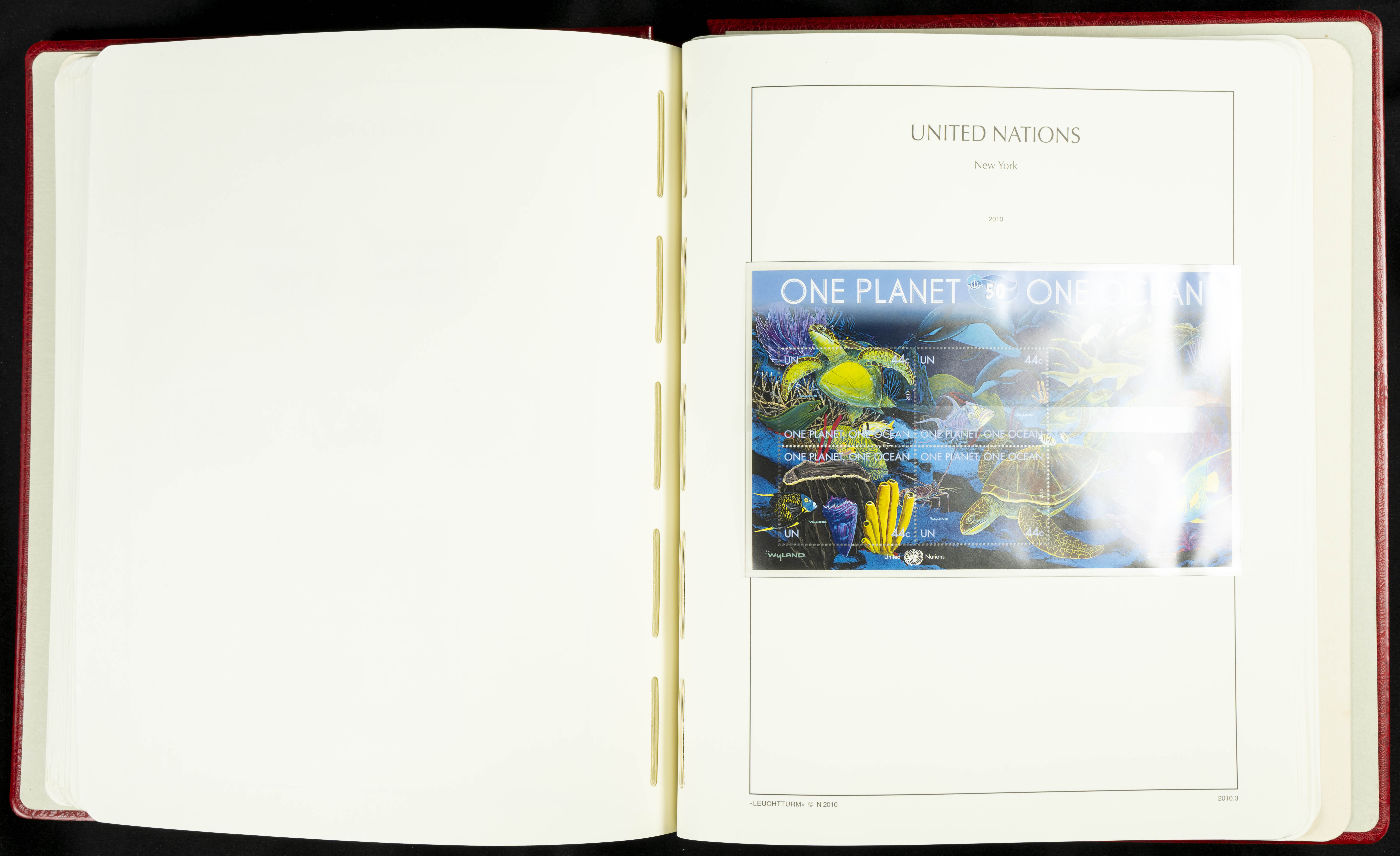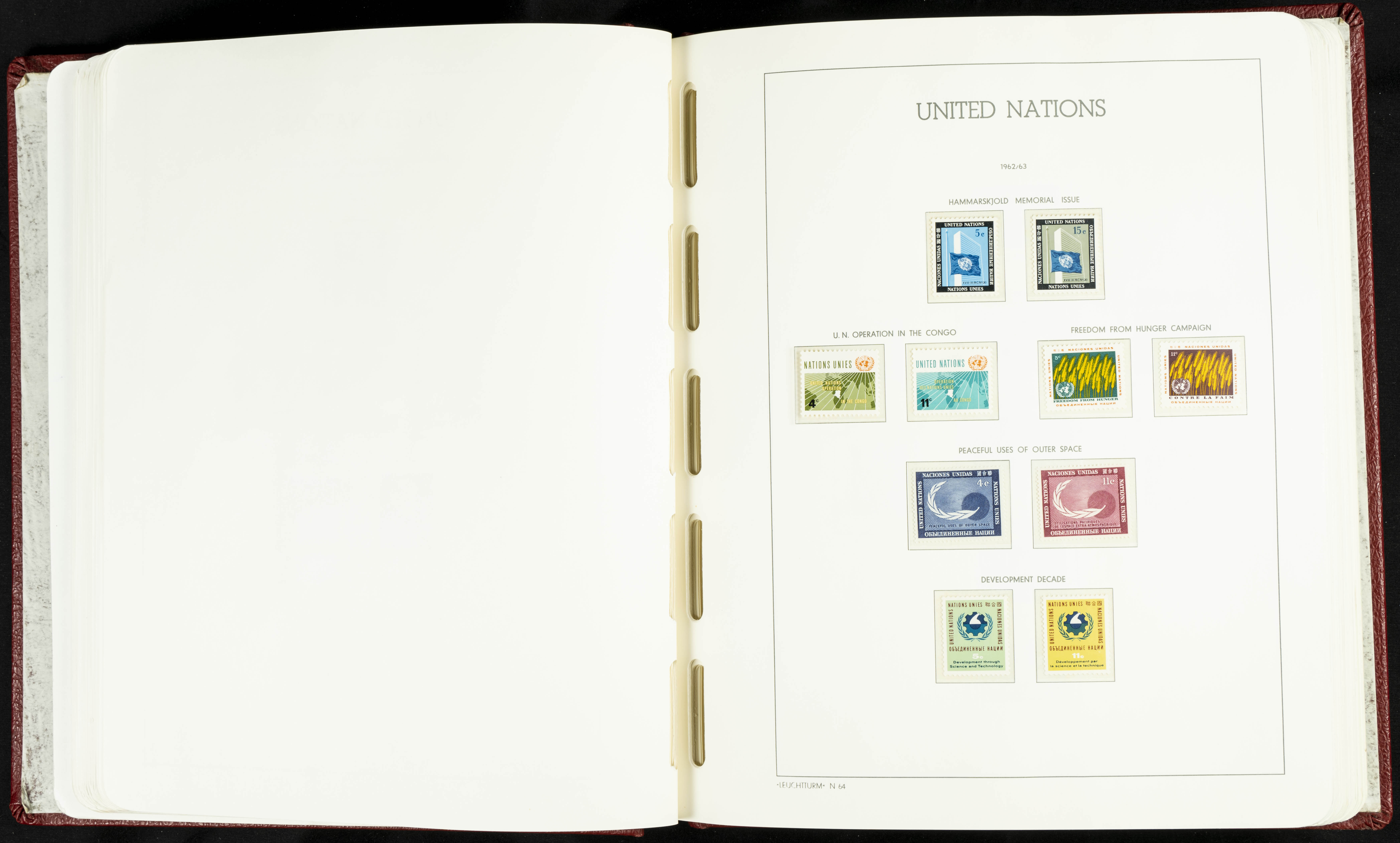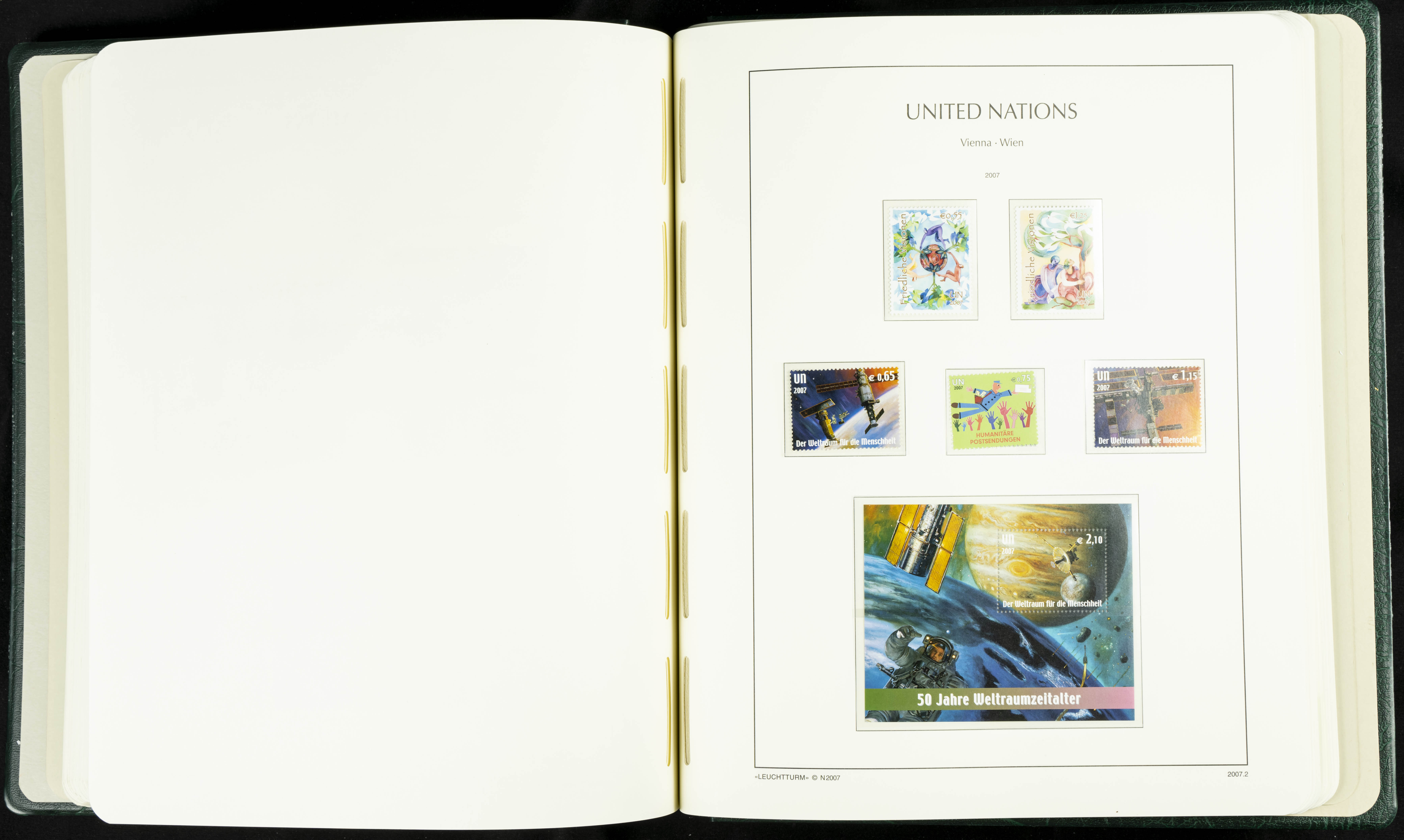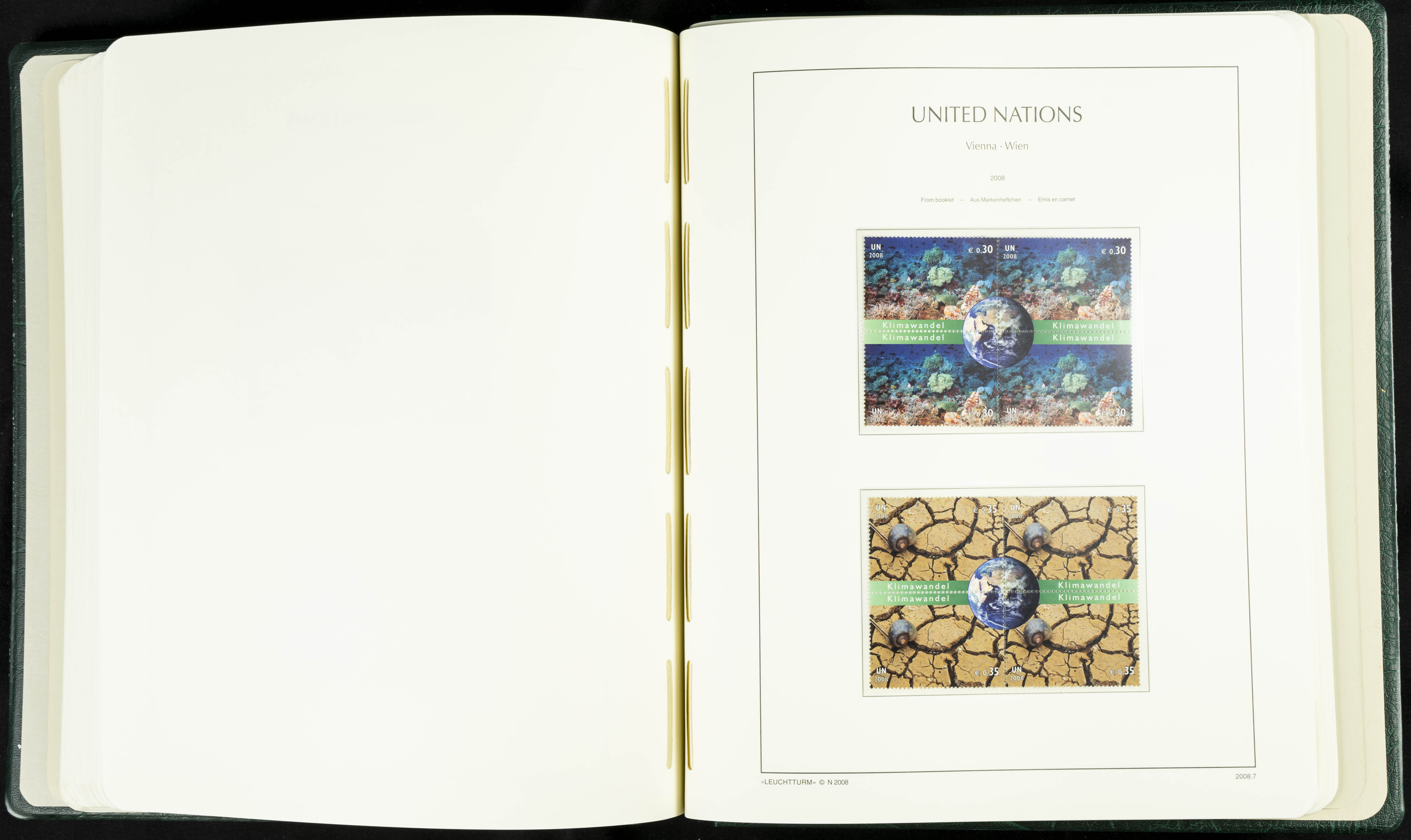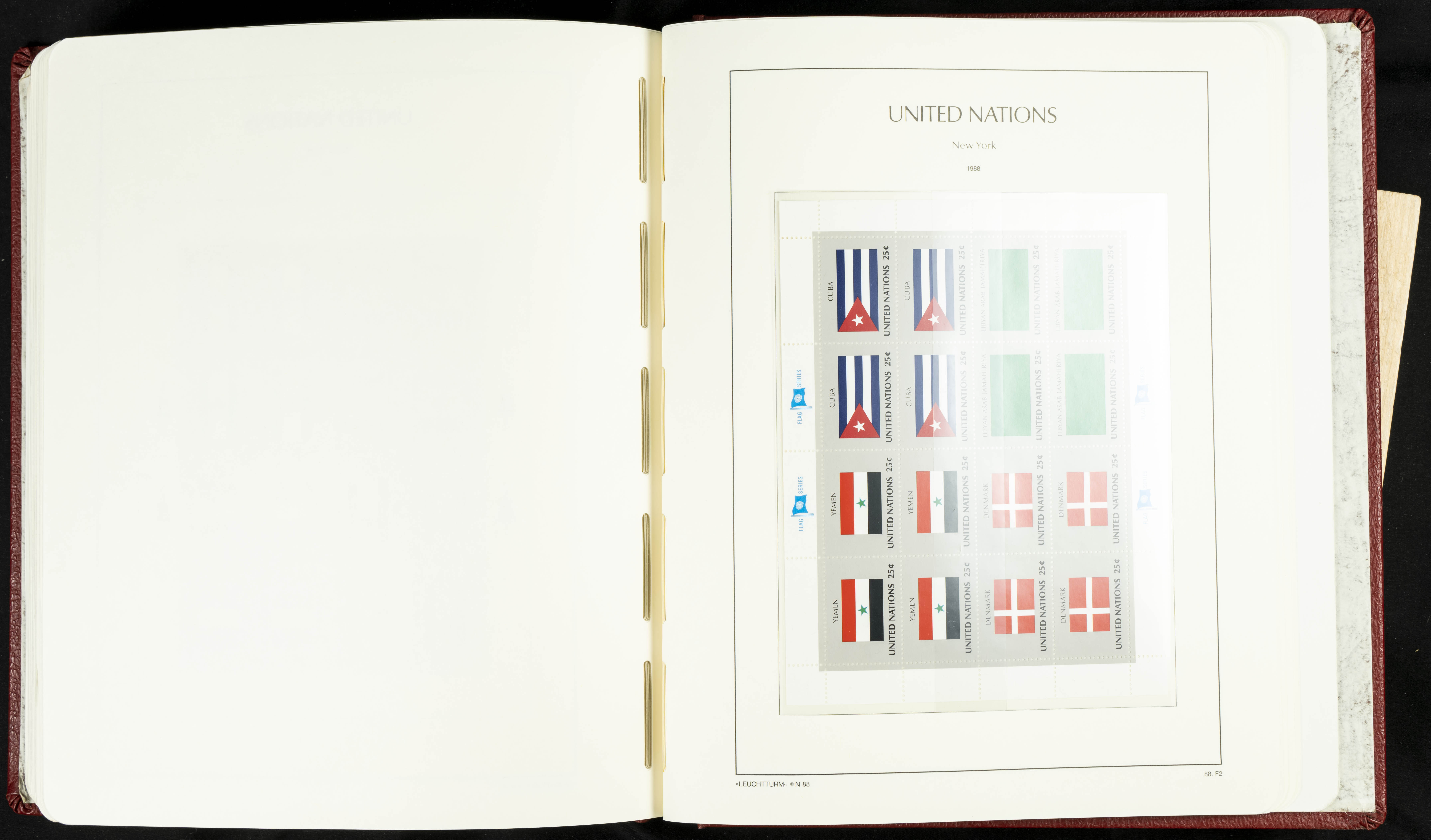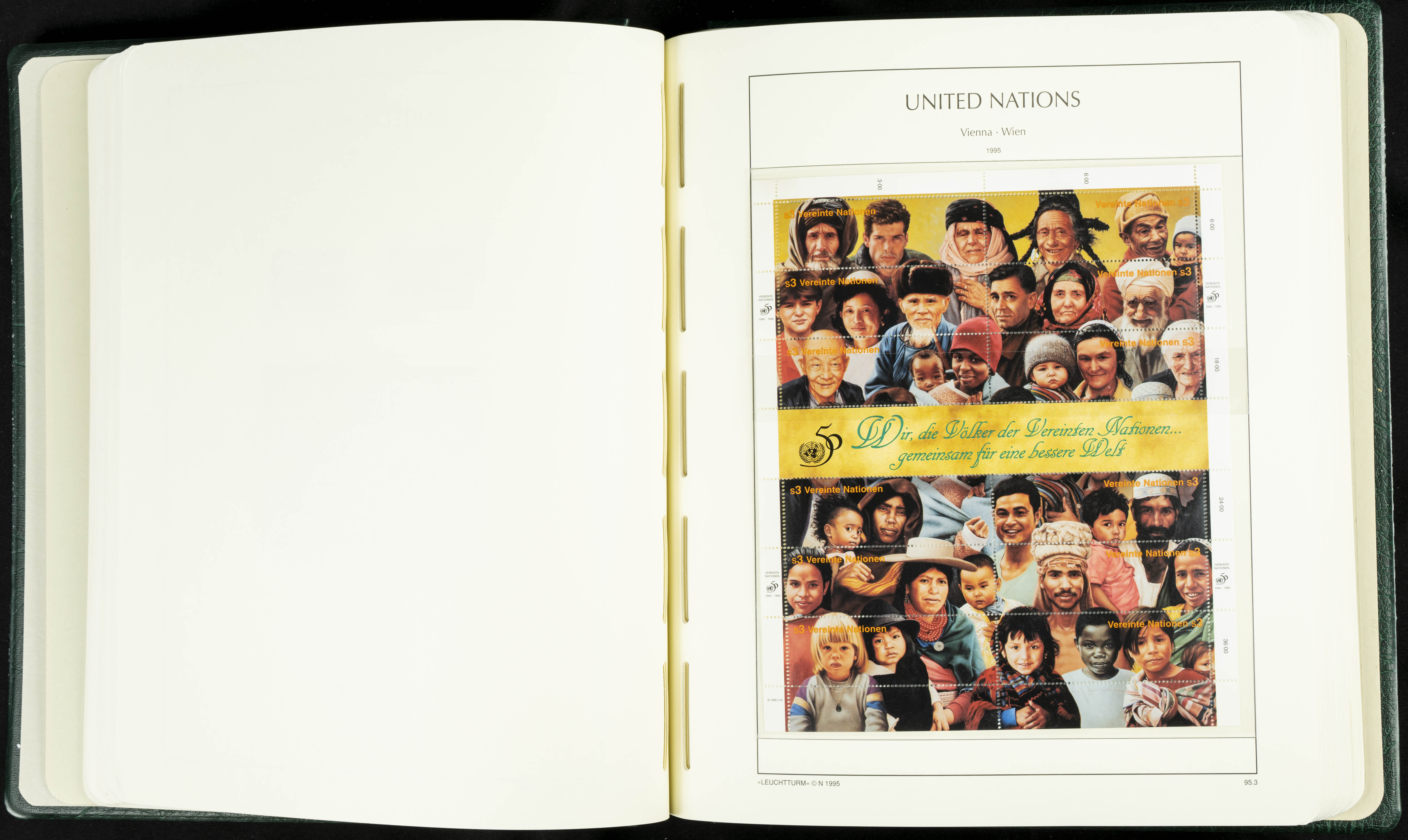 ★★(1951ca). Colección completa de Naciones Unidas (Nueva York, Ginebra y Viena) entre 1951 y 2011, en nuevo y sin fijasellos (montada en álbumes Faro). ALTO VALOR DE CATALOGO. A EXAMINAR.