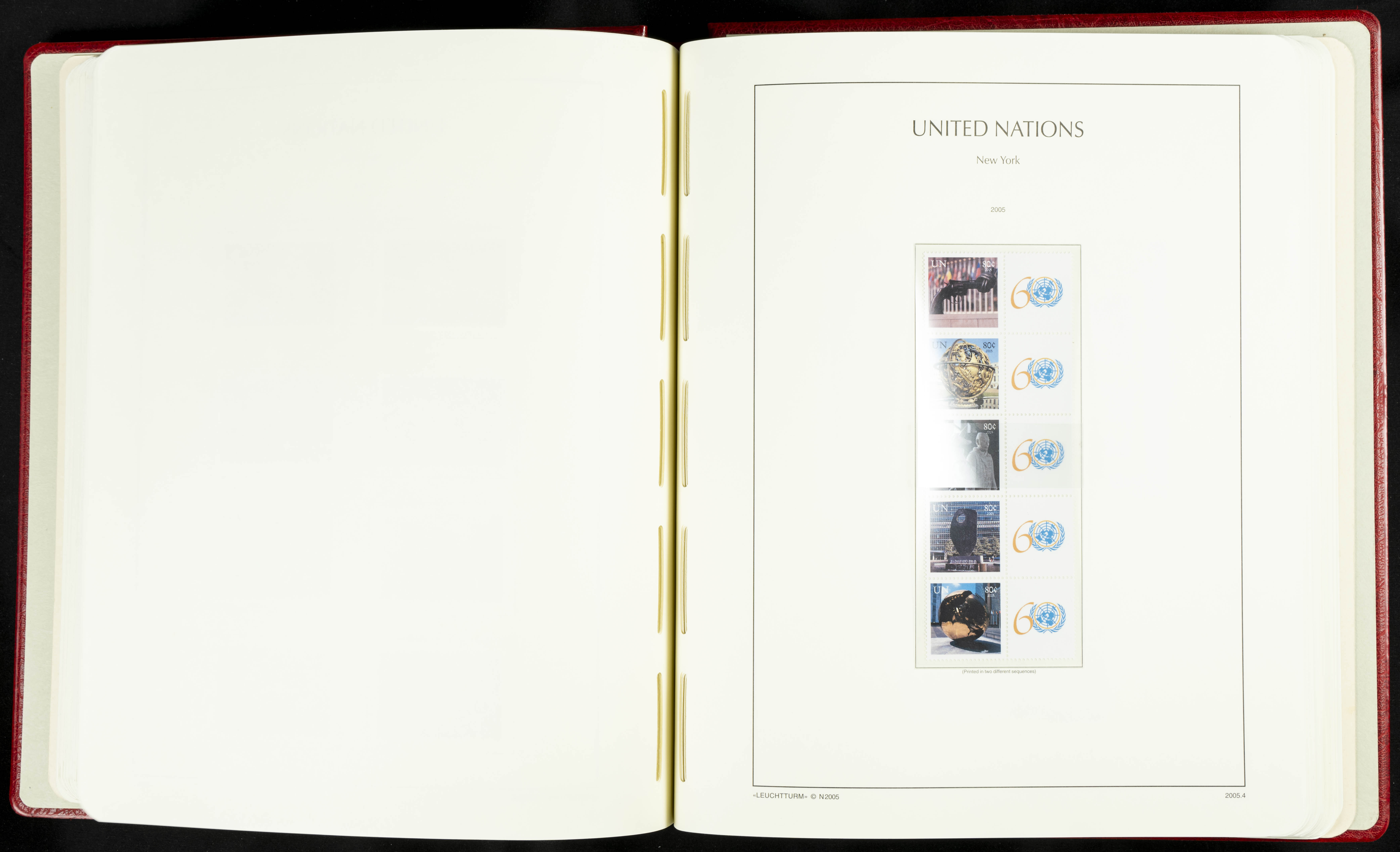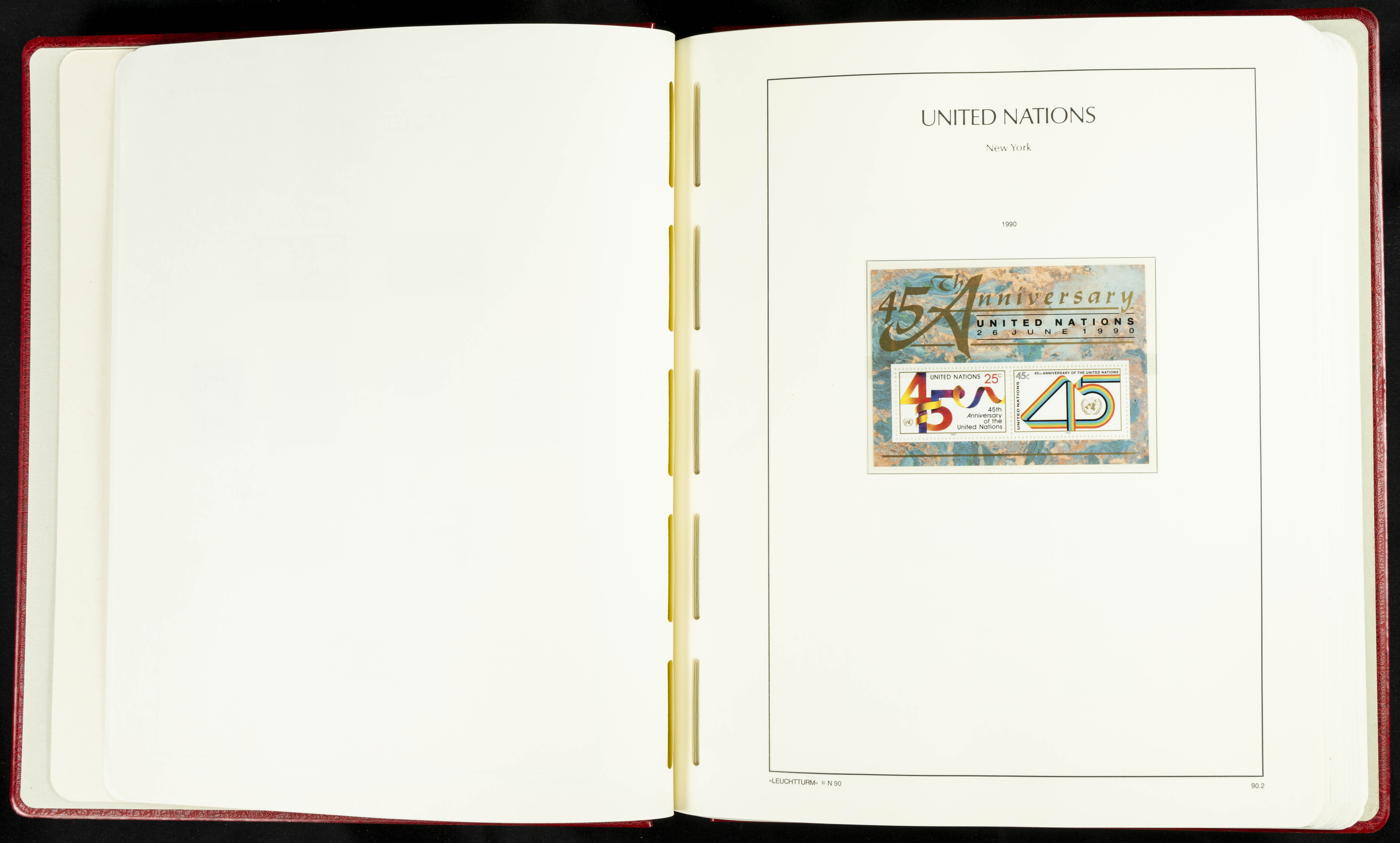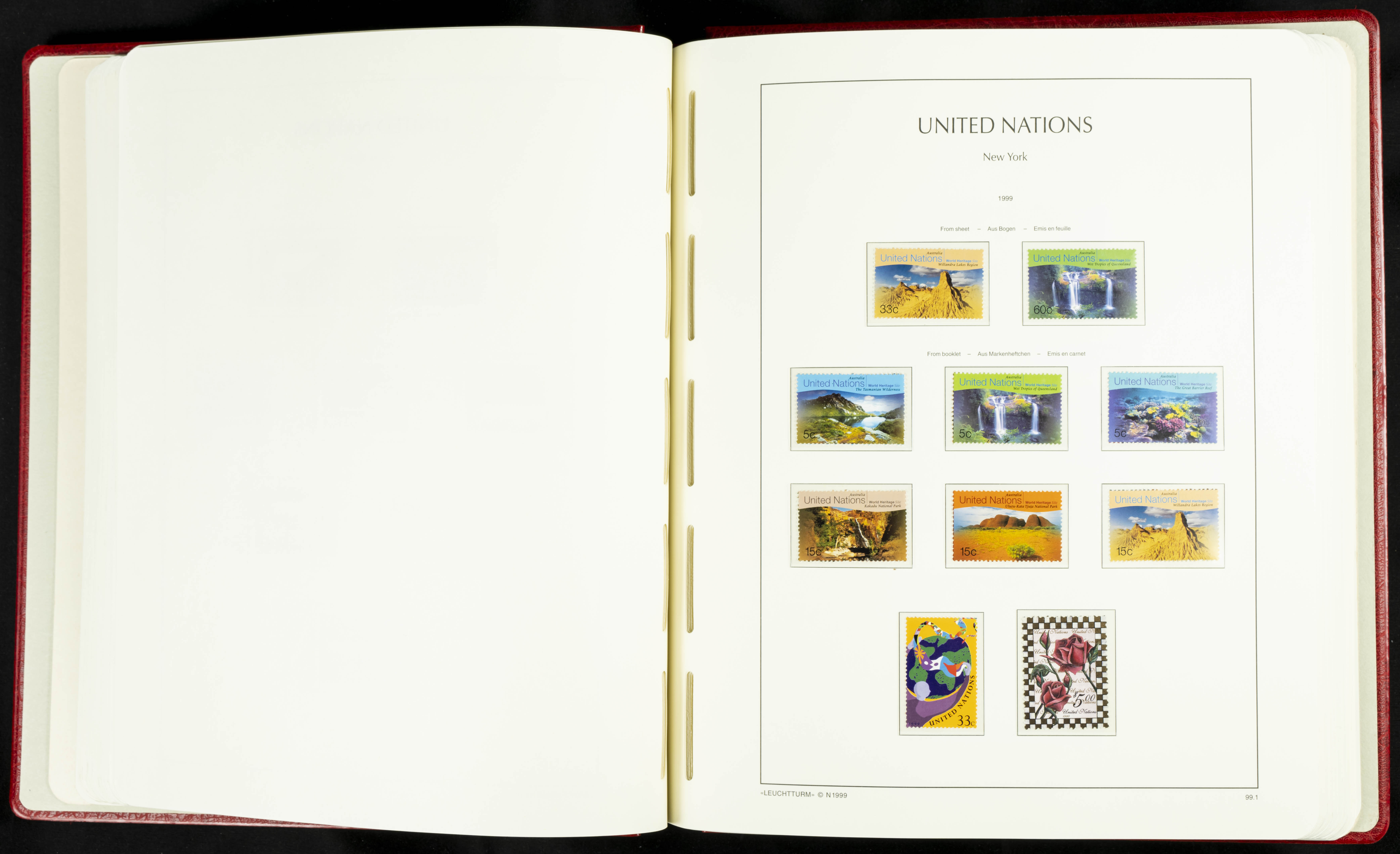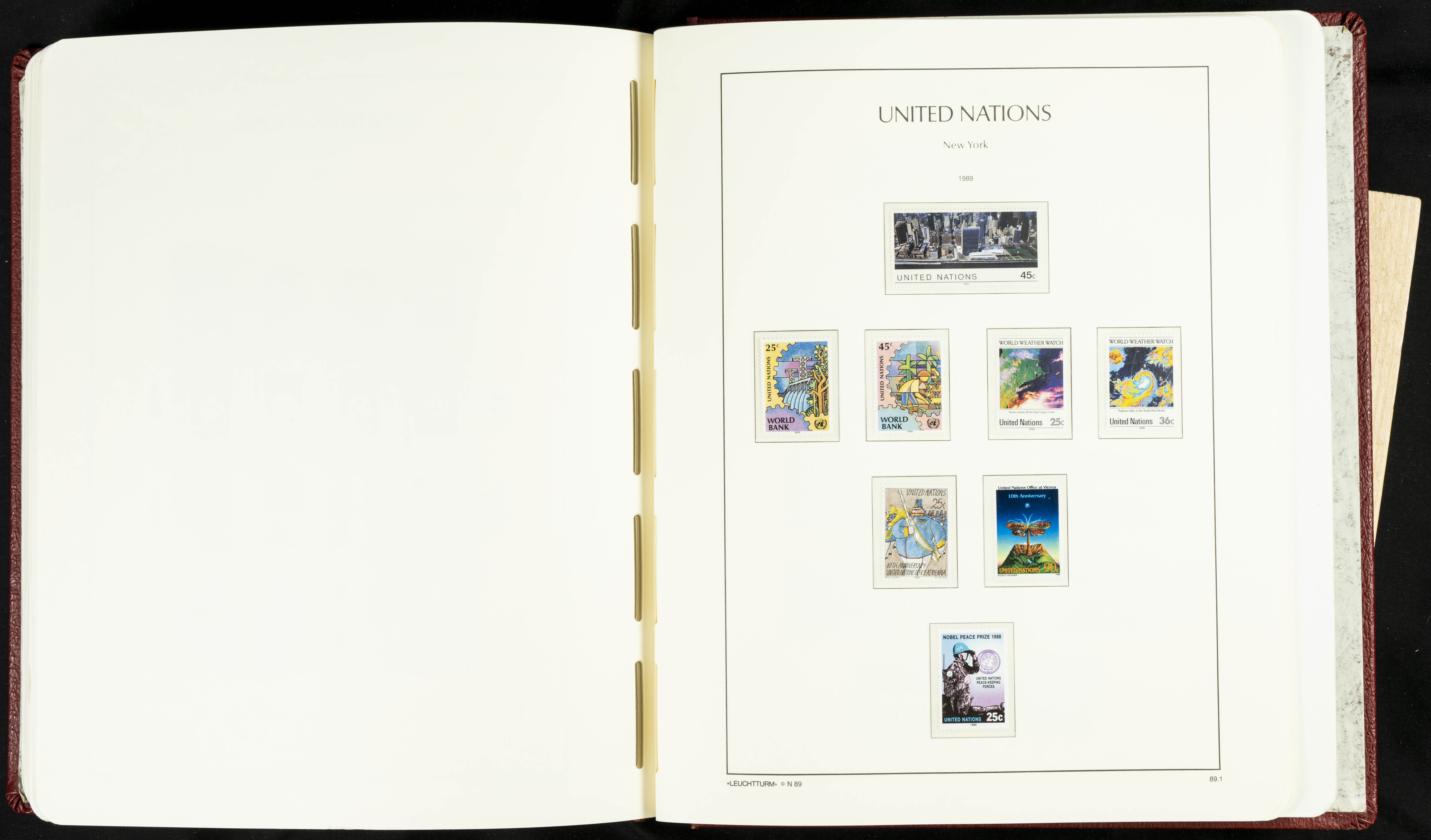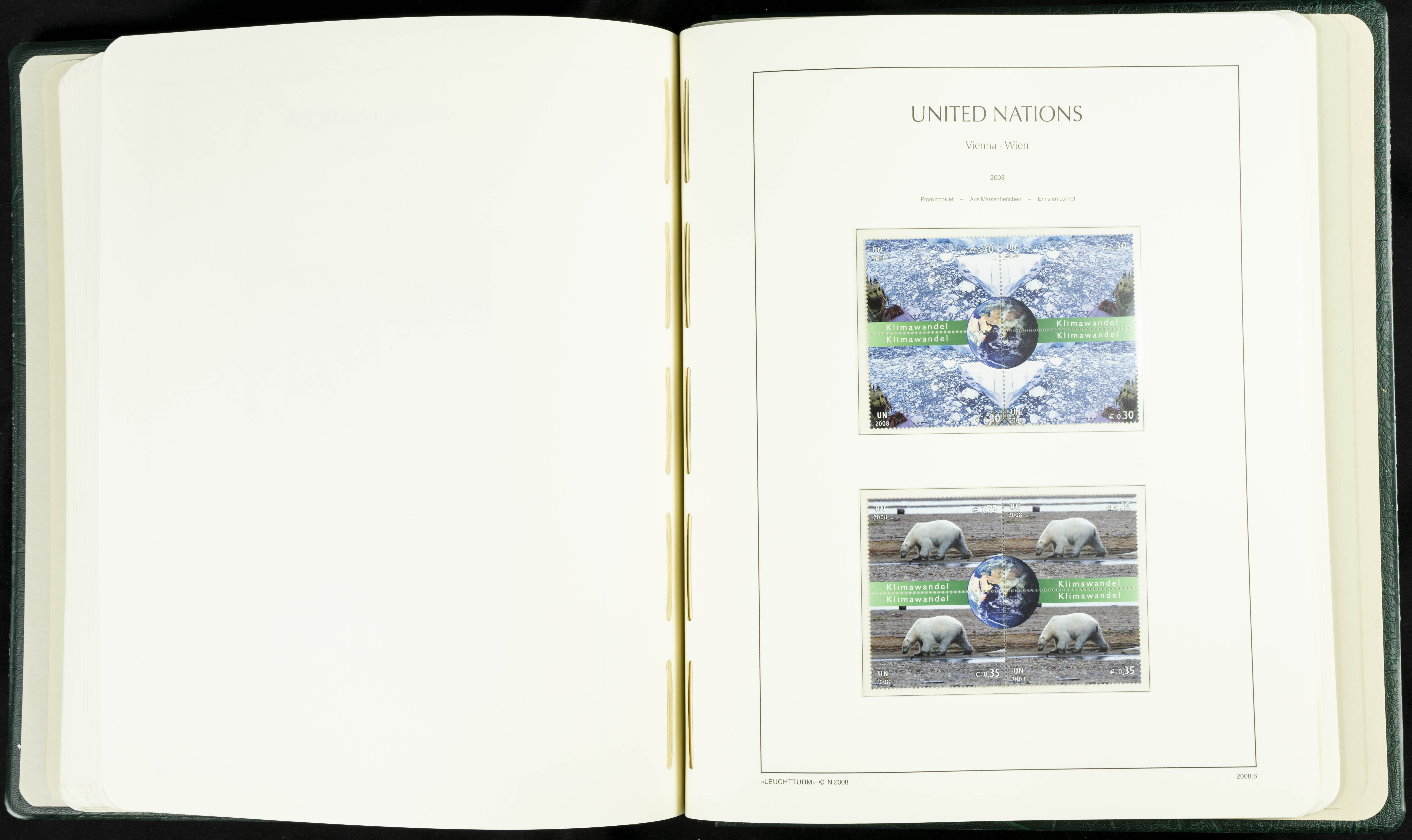 ★★(1951ca). Colección completa de Naciones Unidas (Nueva York, Ginebra y Viena) entre 1951 y 2011, en nuevo y sin fijasellos (montada en álbumes Faro). ALTO VALOR DE CATALOGO. A EXAMINAR.