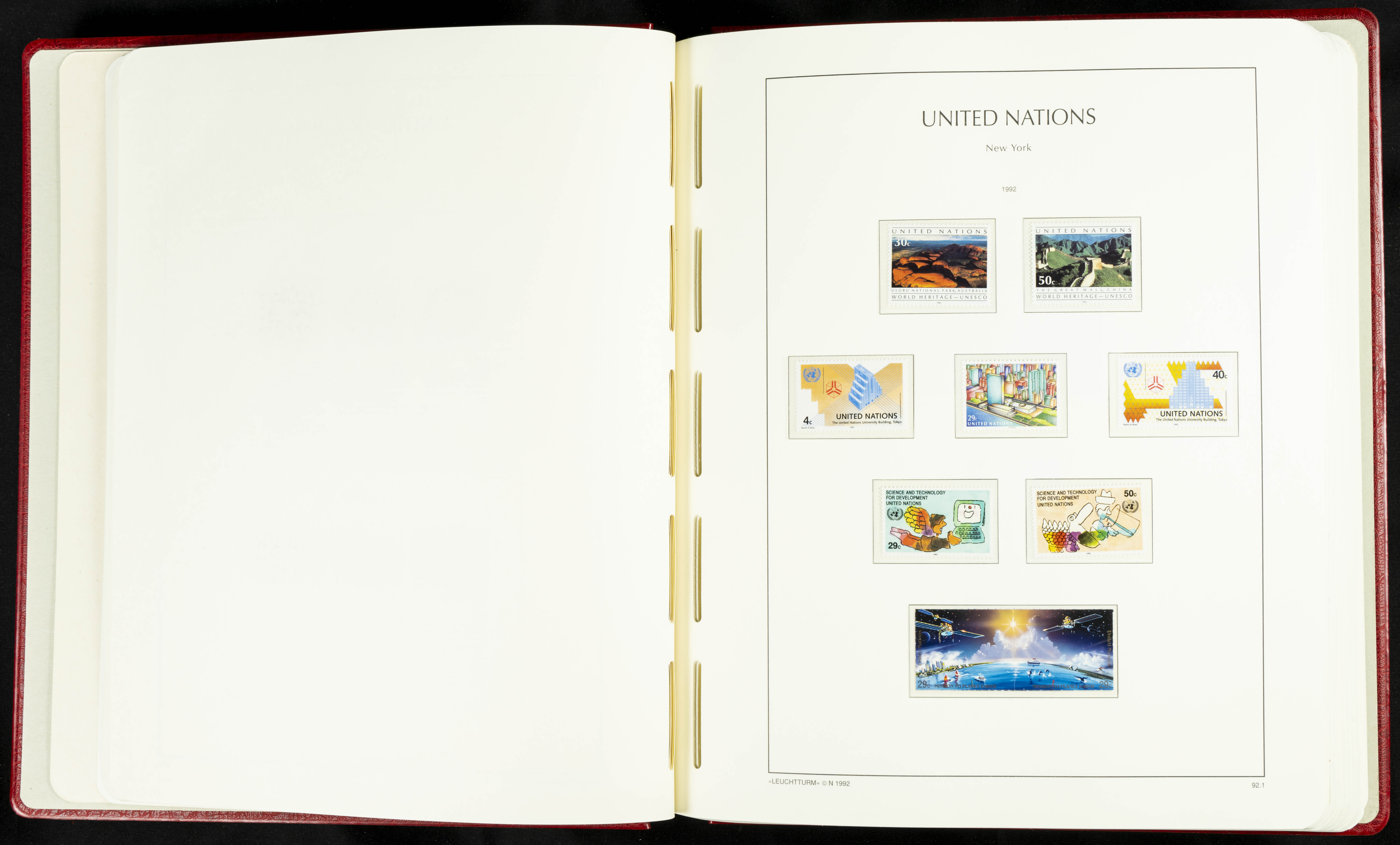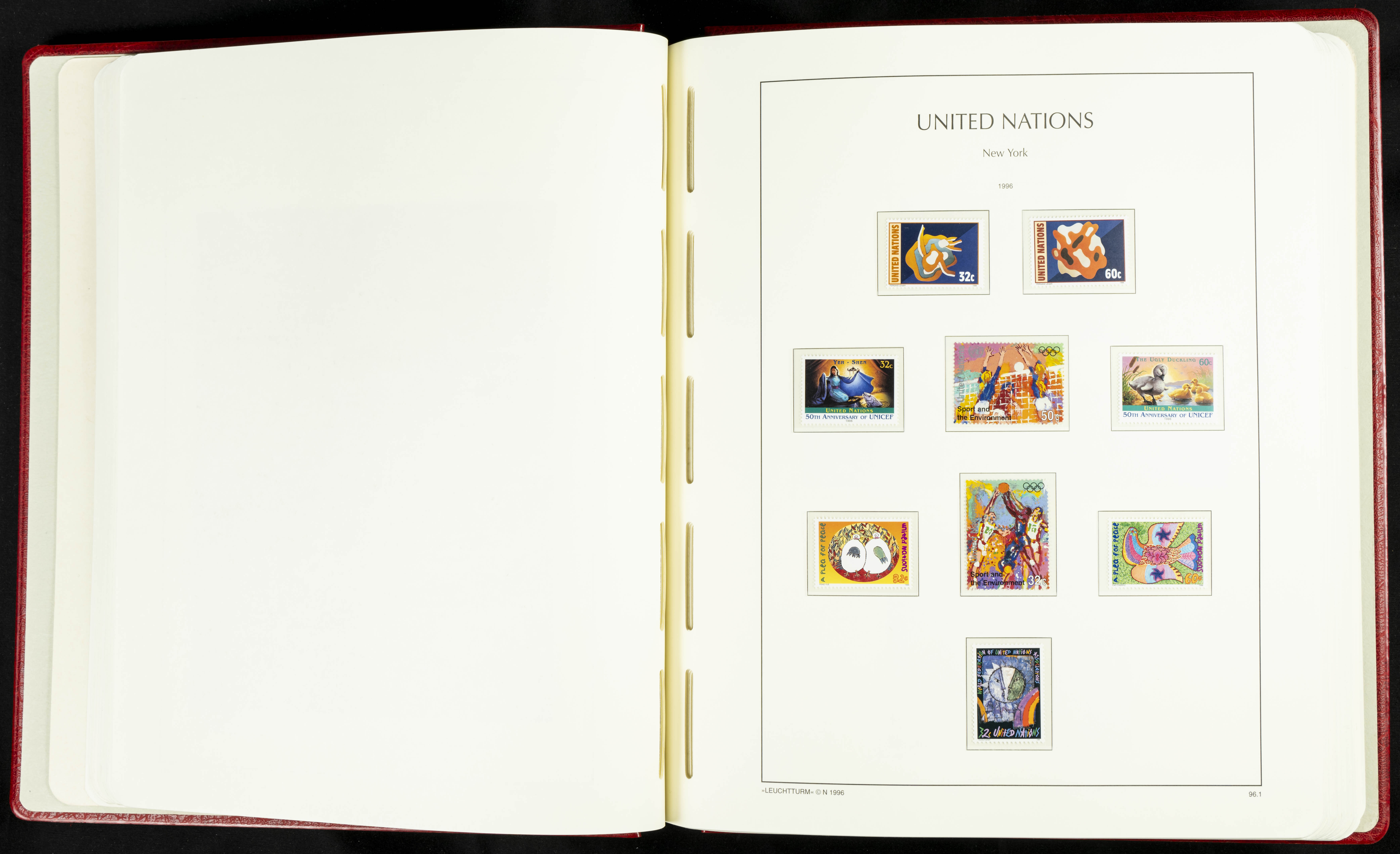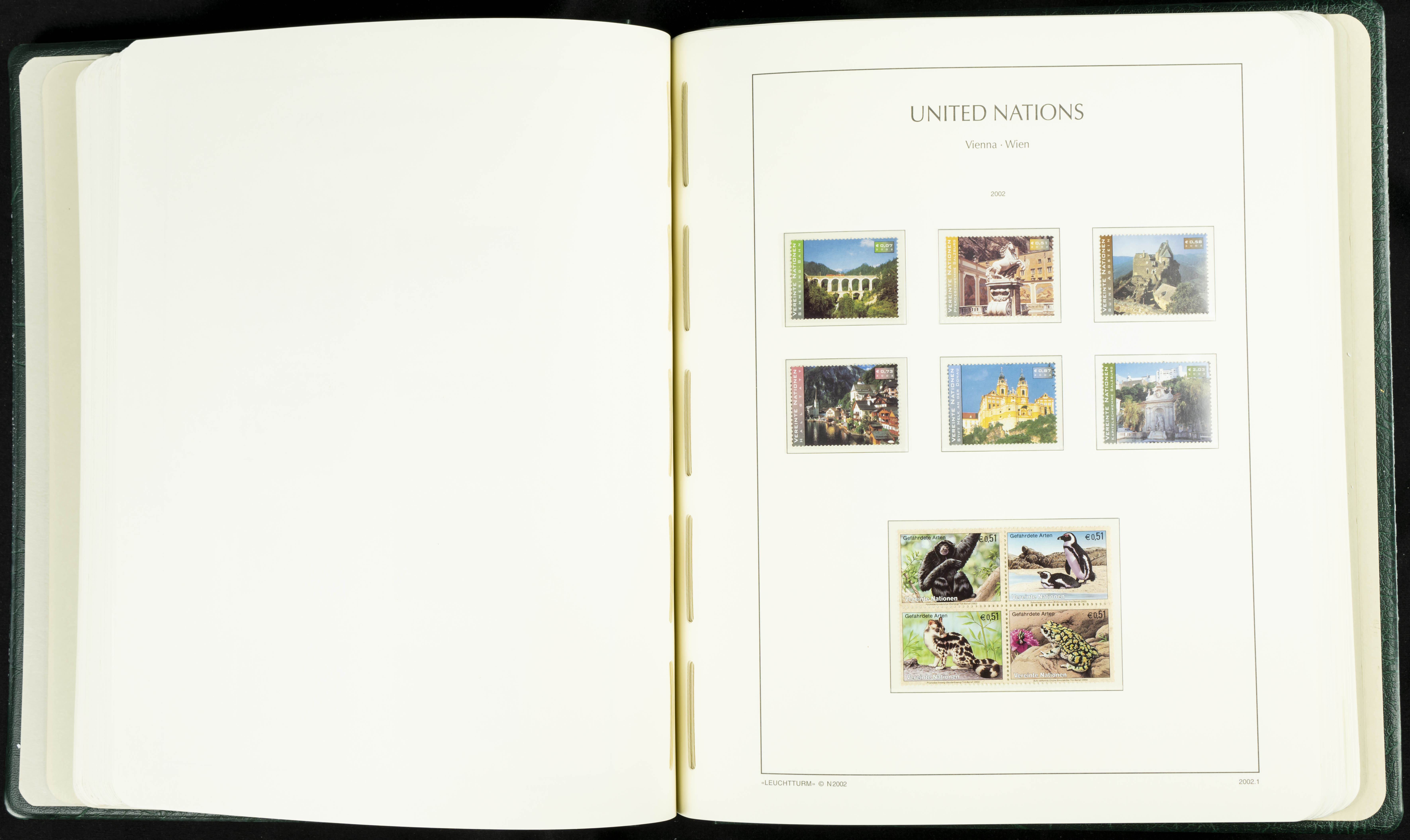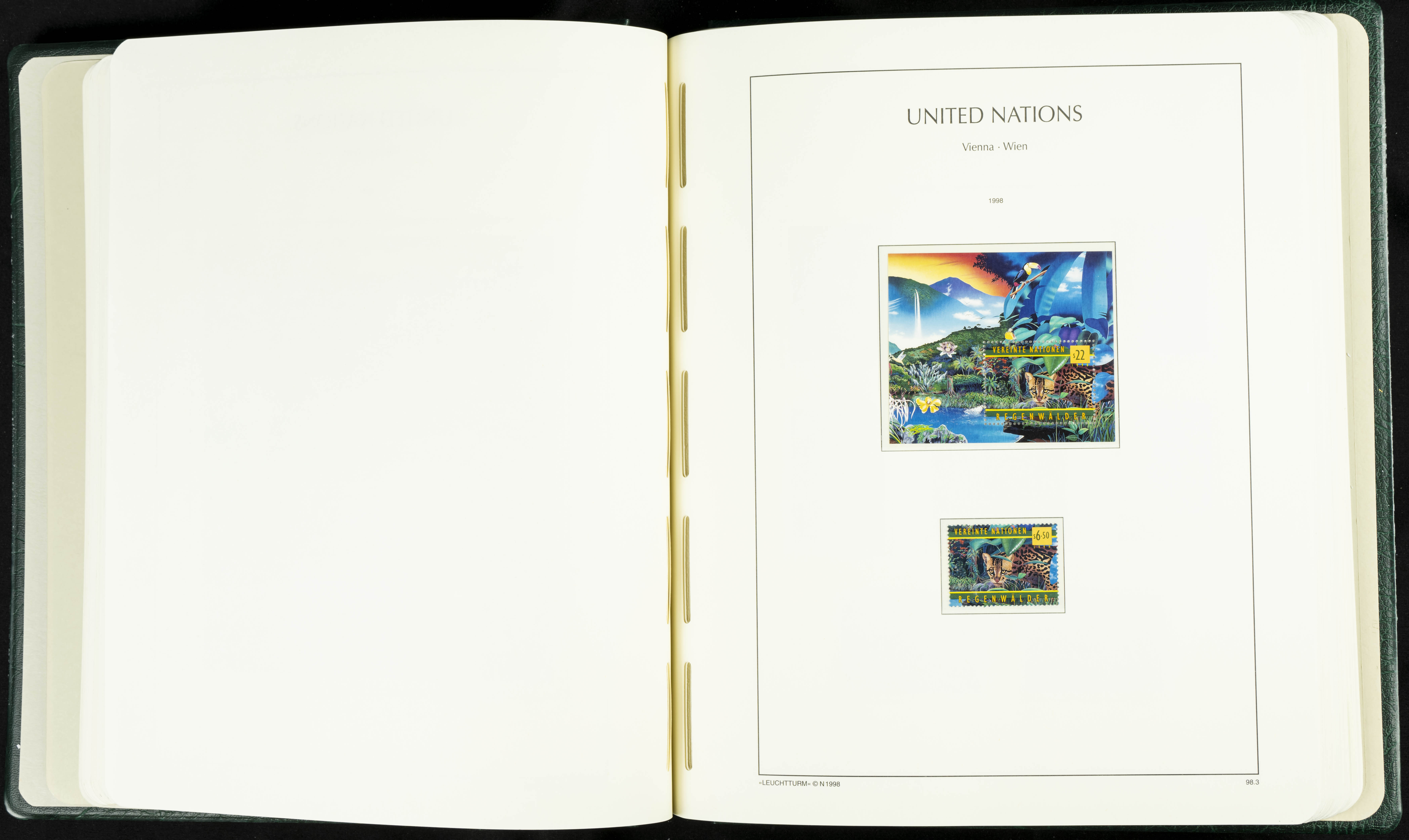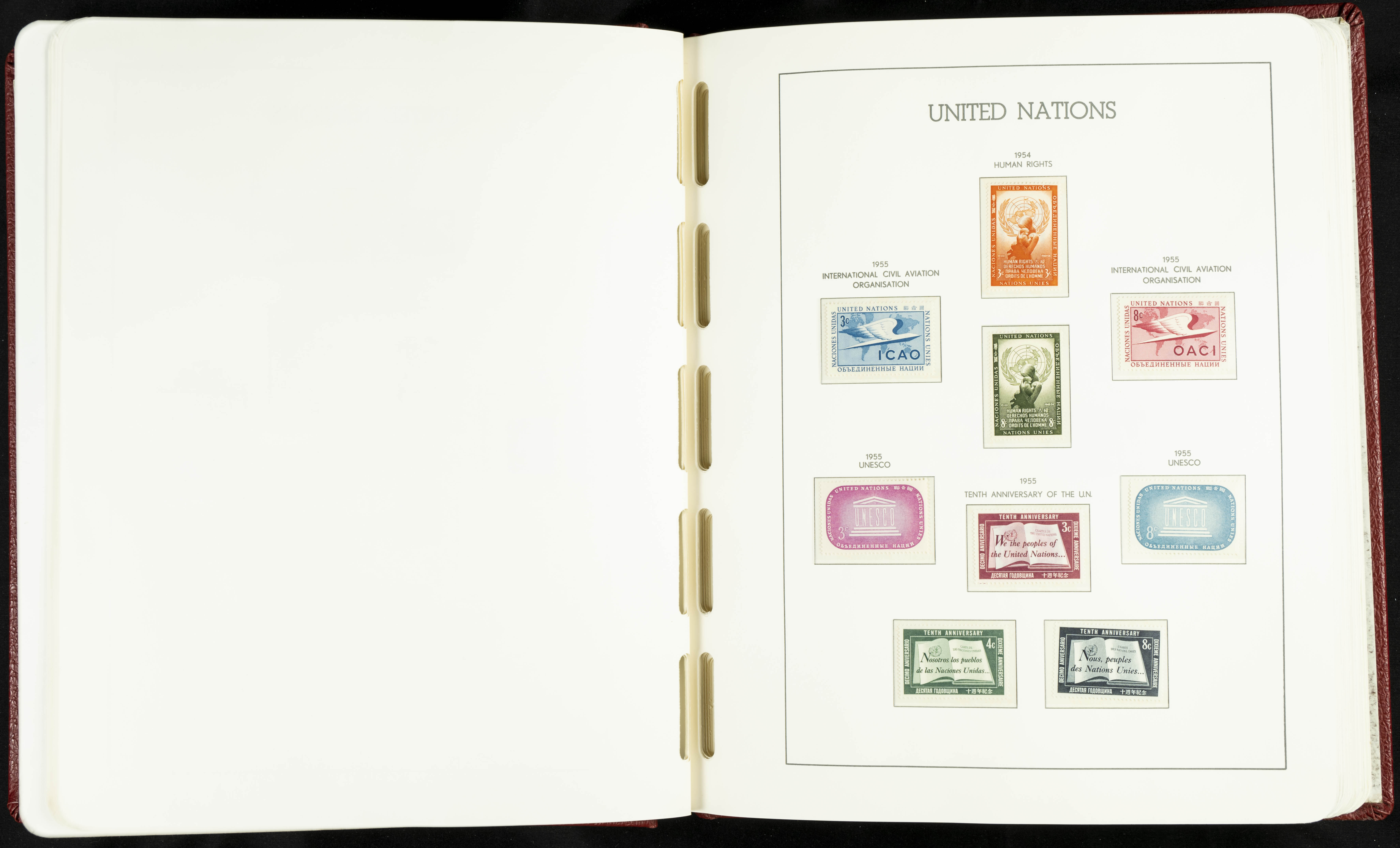 ★★(1951ca). Colección completa de Naciones Unidas (Nueva York, Ginebra y Viena) entre 1951 y 2011, en nuevo y sin fijasellos (montada en álbumes Faro). ALTO VALOR DE CATALOGO. A EXAMINAR.