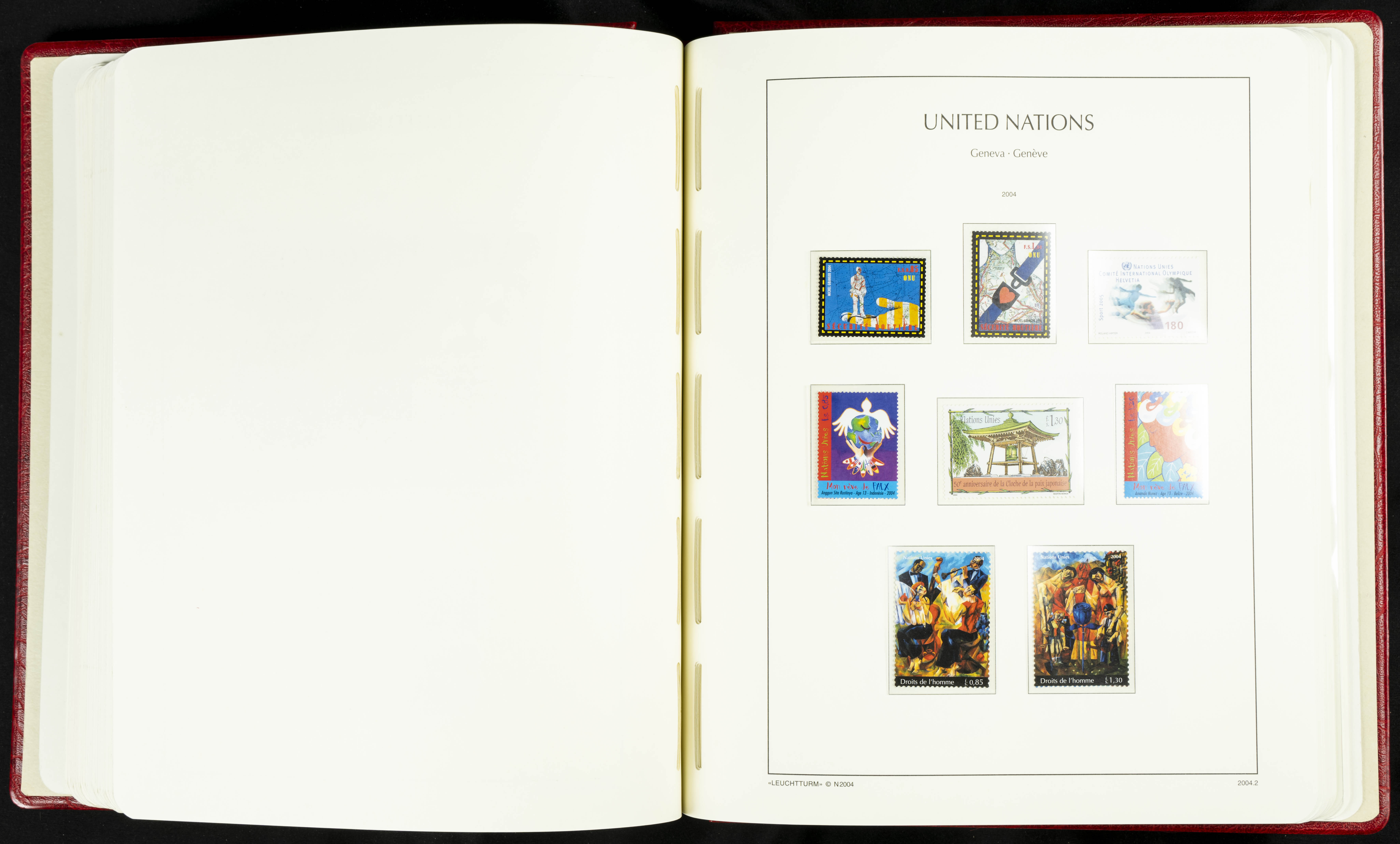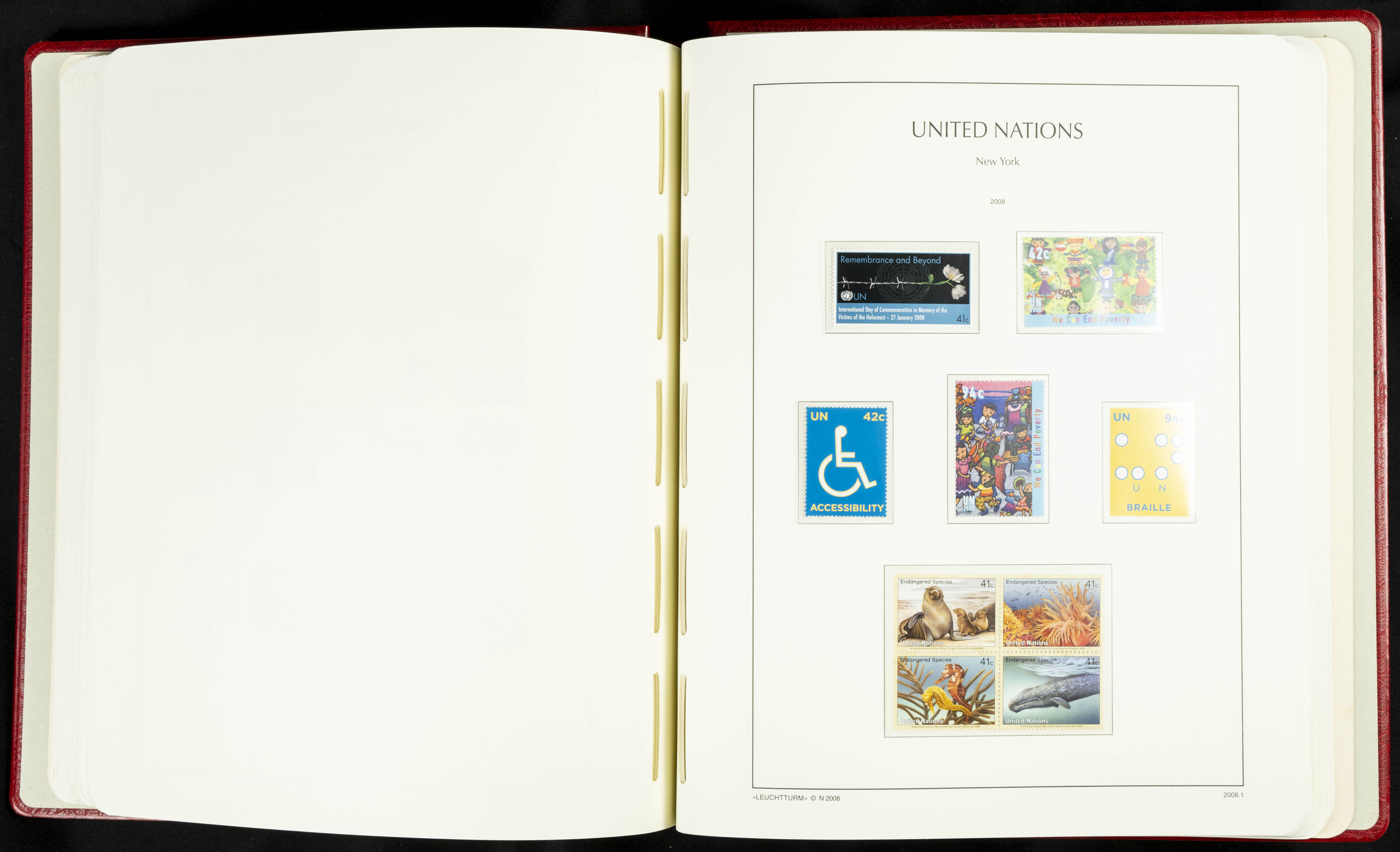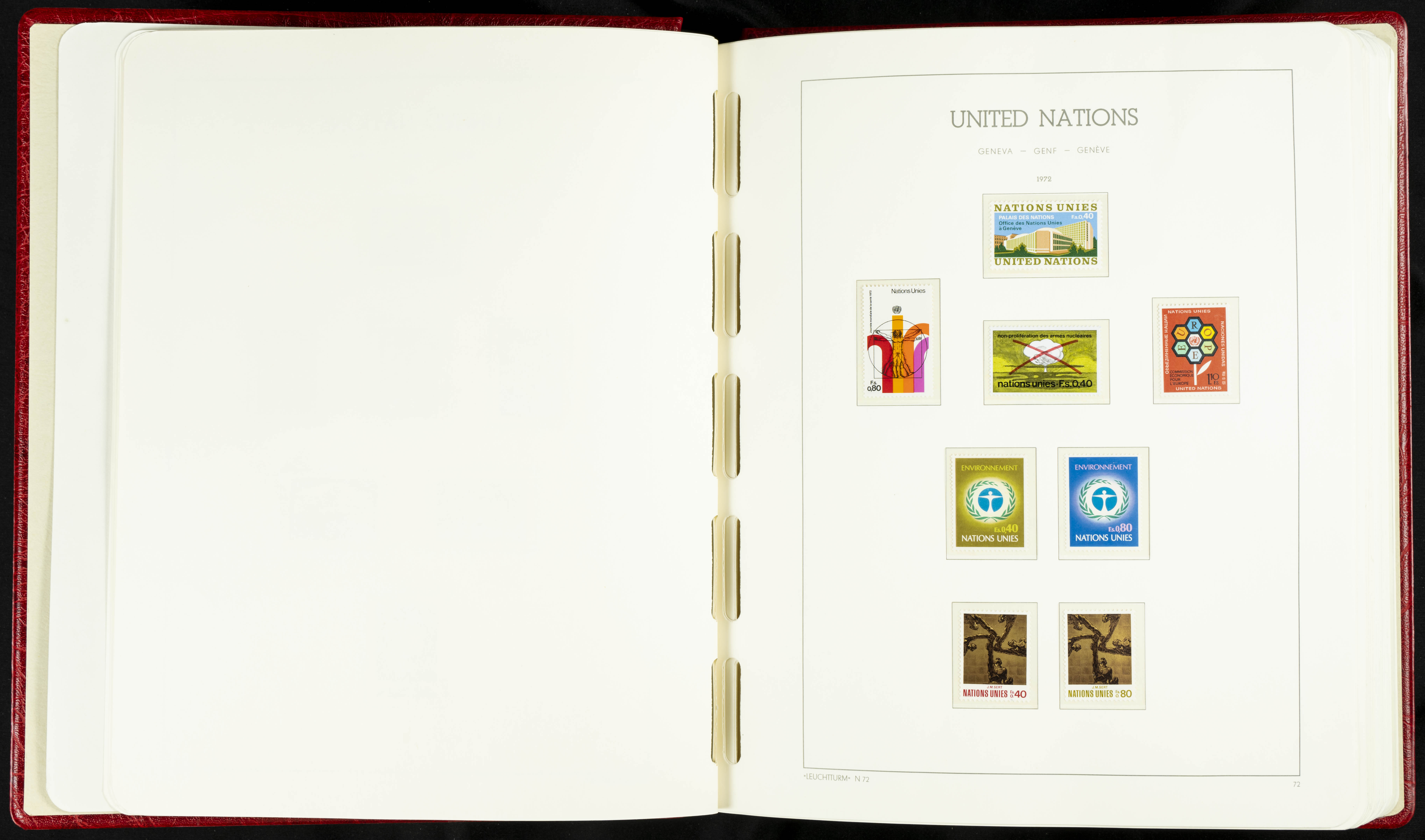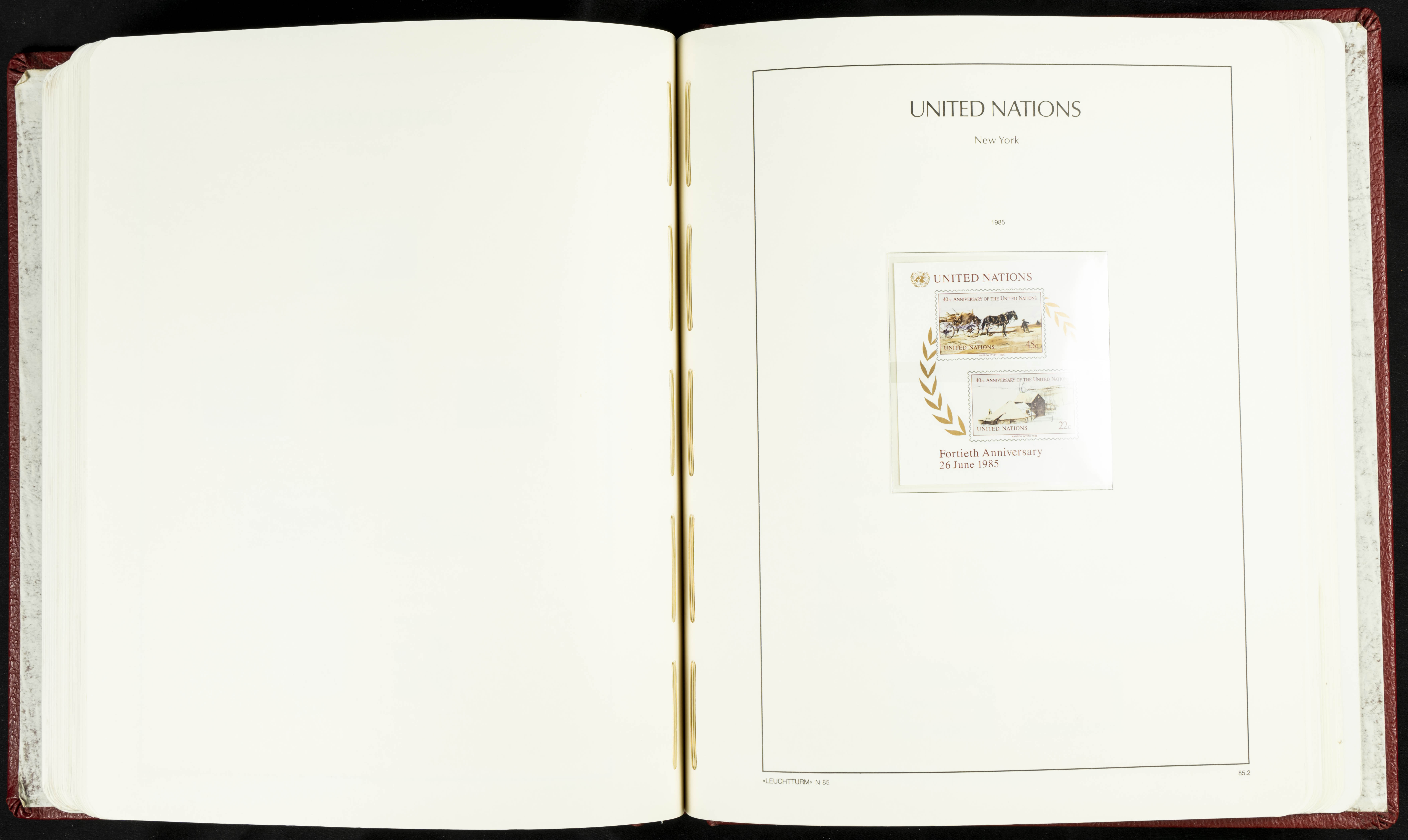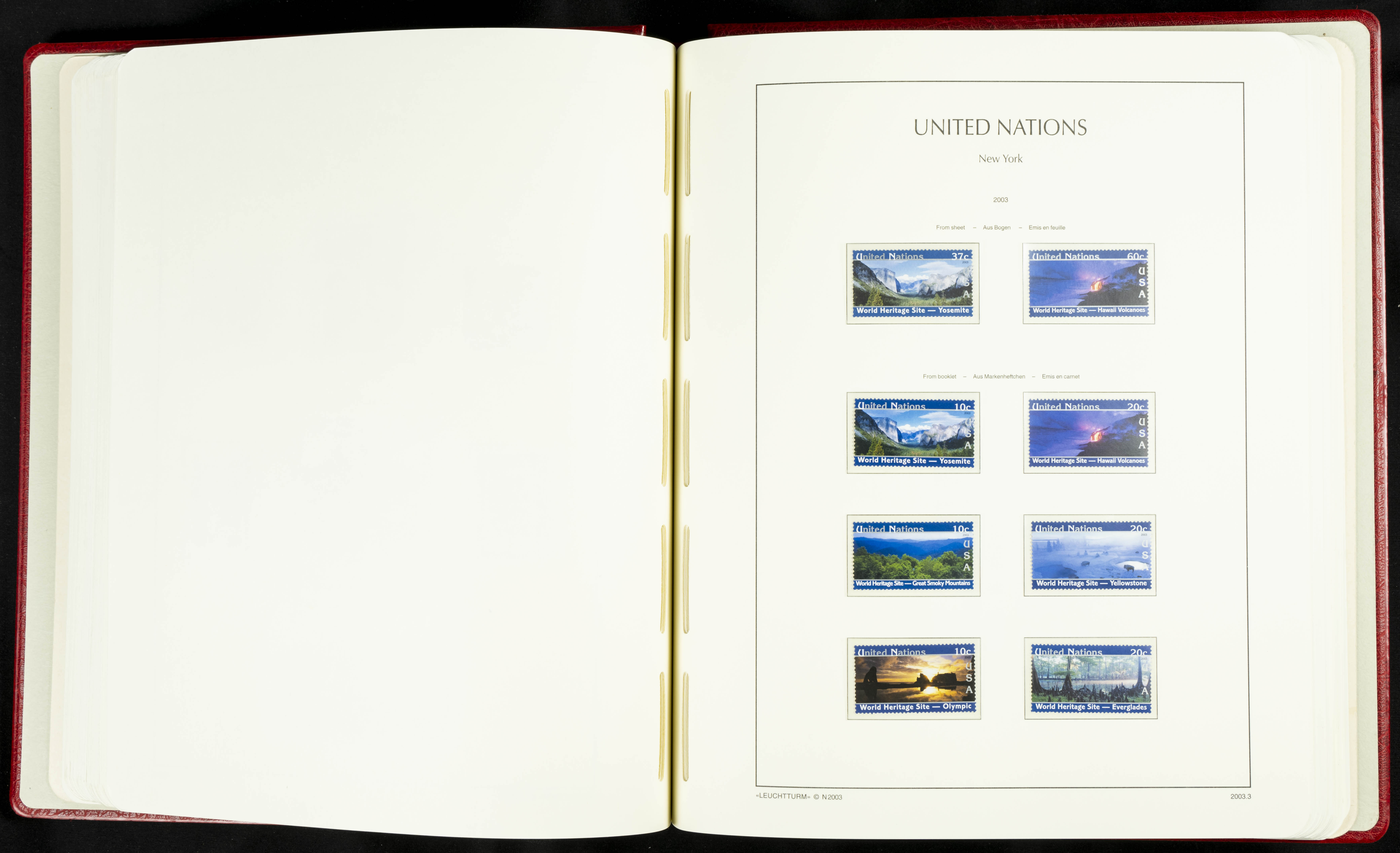 ★★(1951ca). Colección completa de Naciones Unidas (Nueva York, Ginebra y Viena) entre 1951 y 2011, en nuevo y sin fijasellos (montada en álbumes Faro). ALTO VALOR DE CATALOGO. A EXAMINAR.