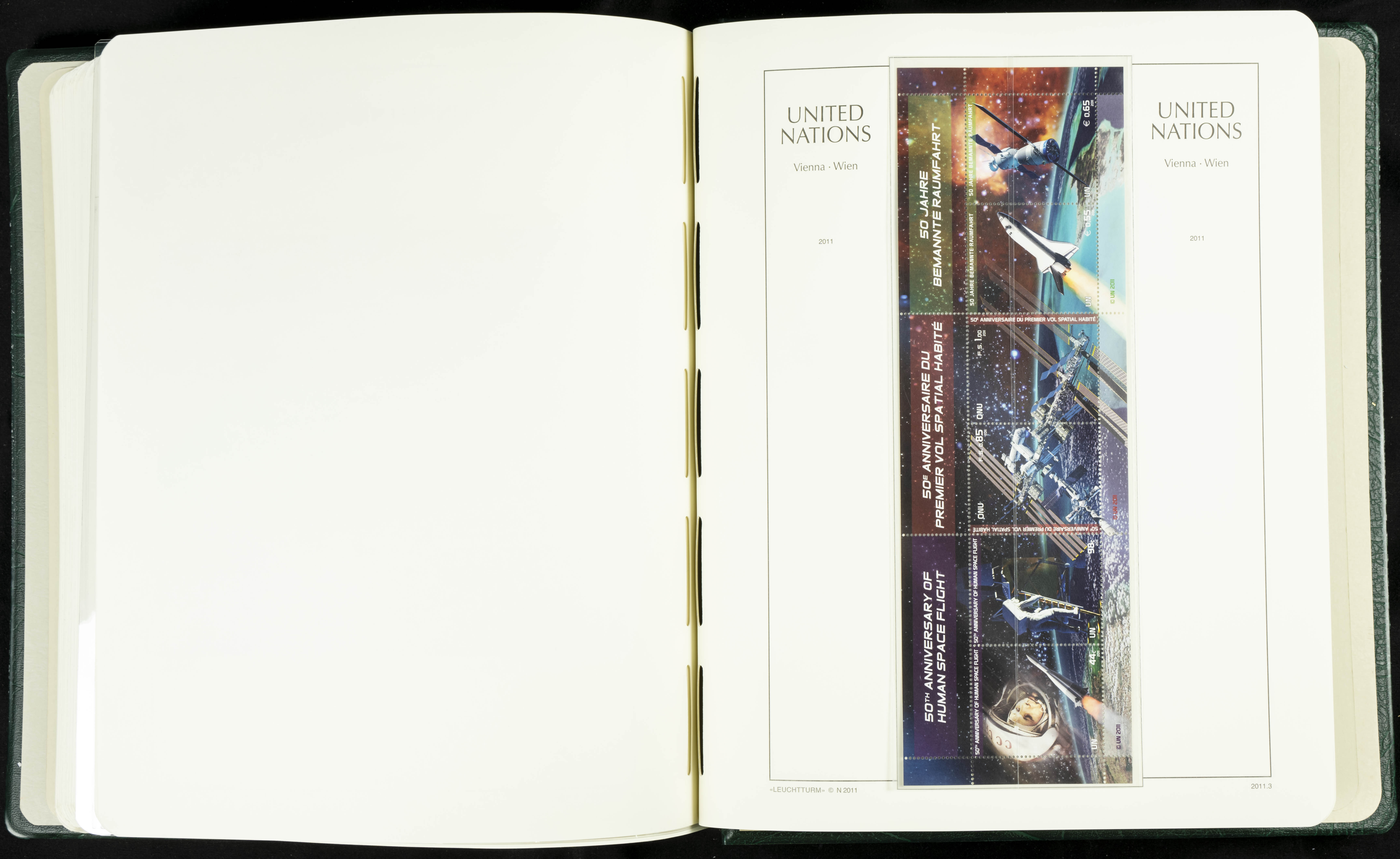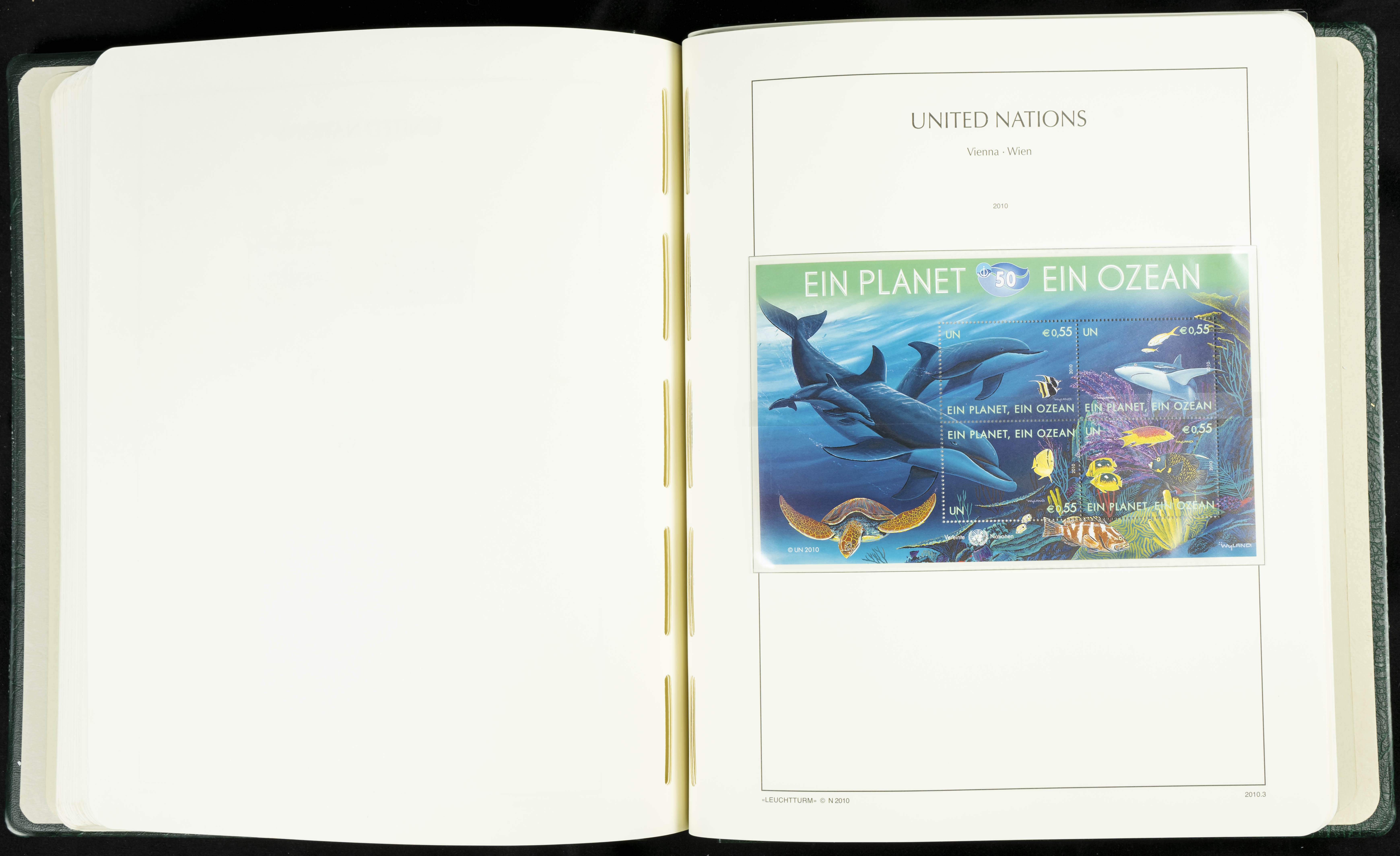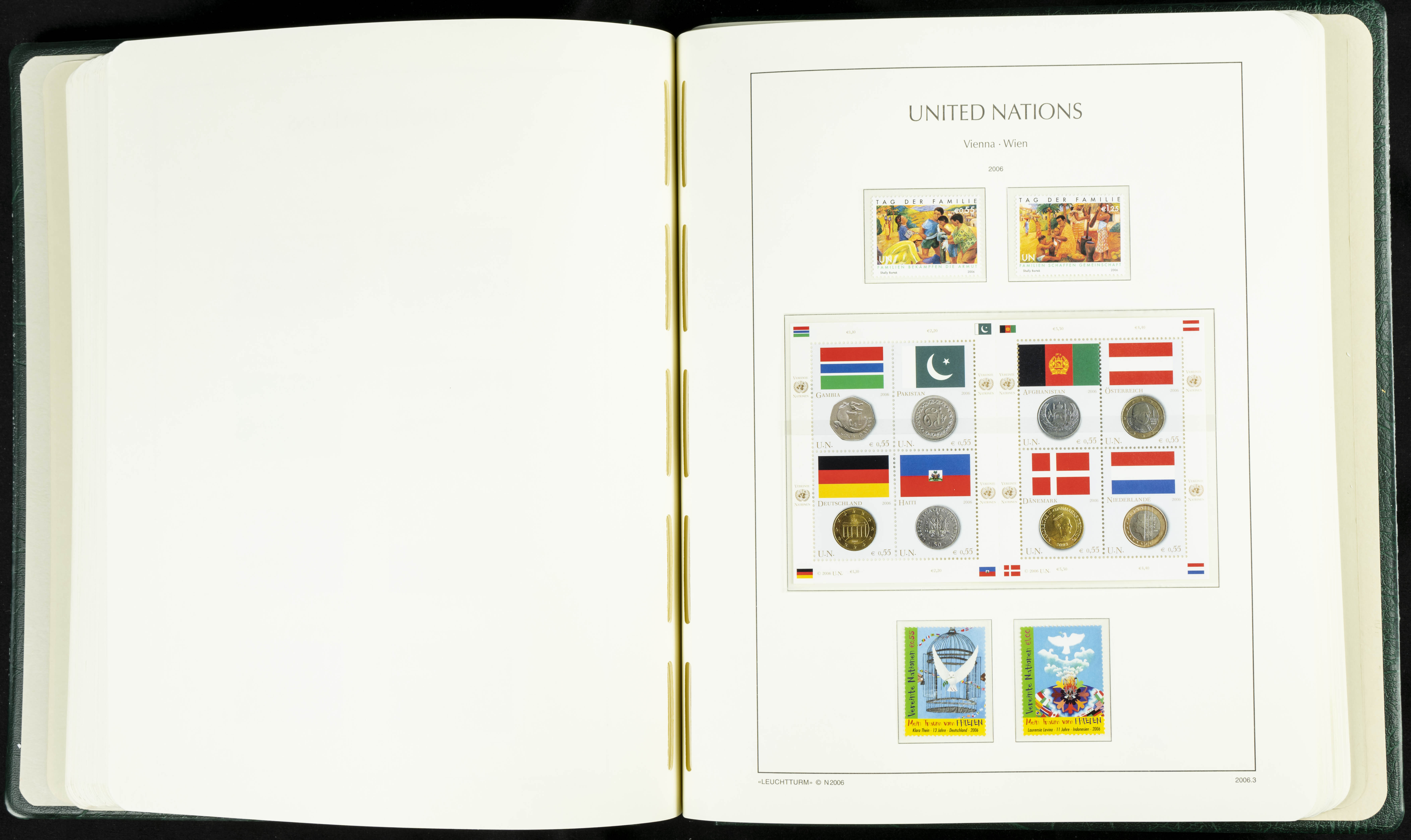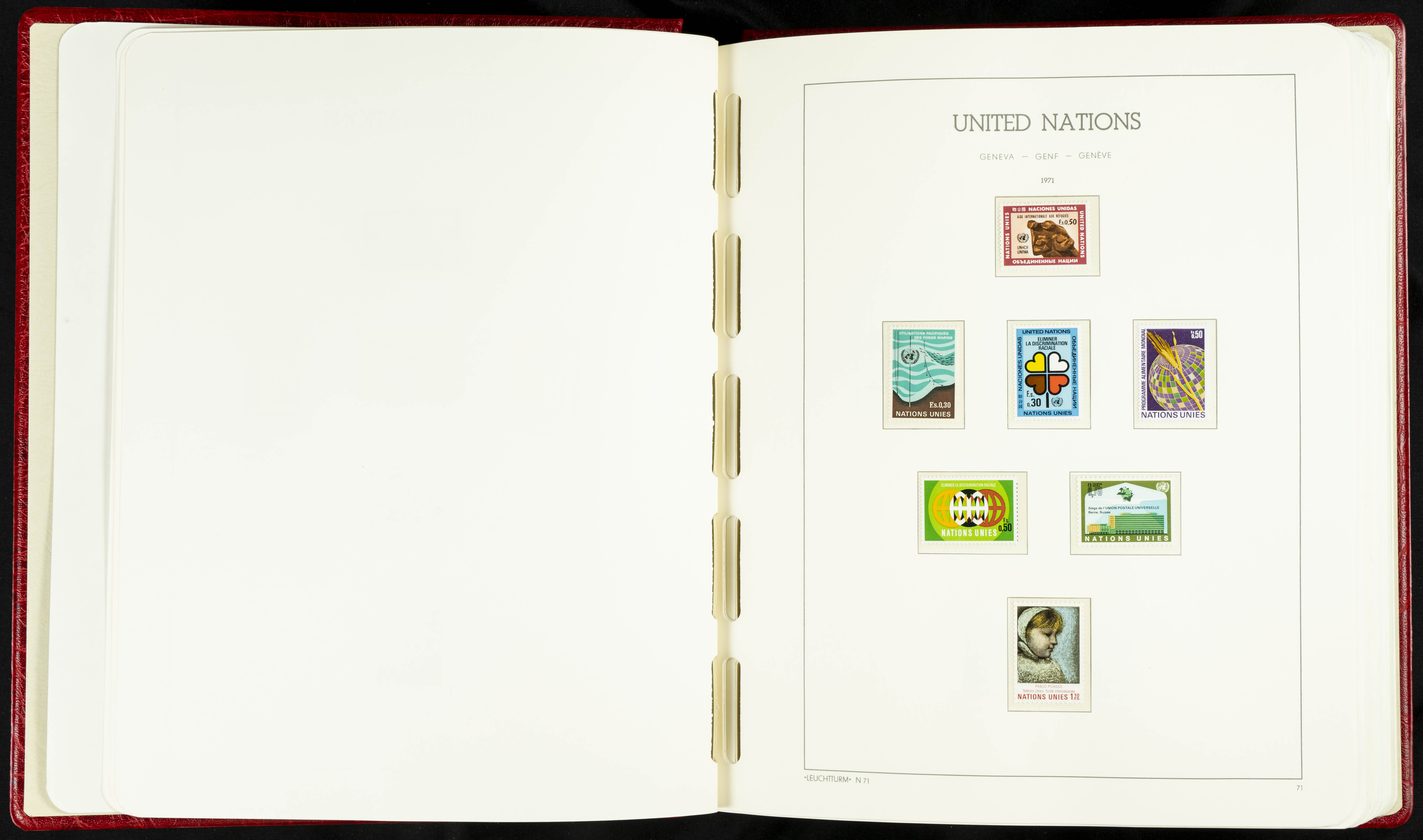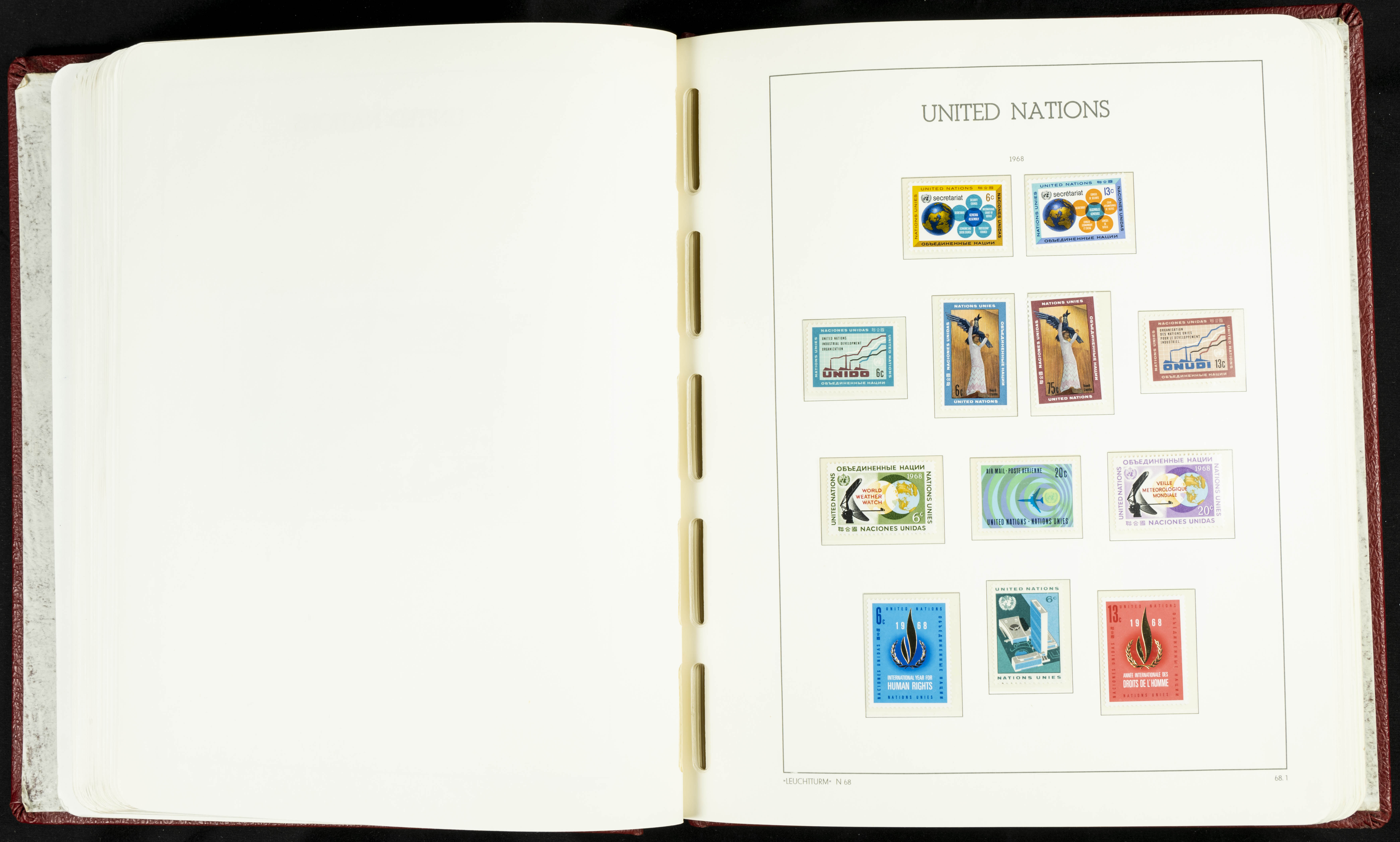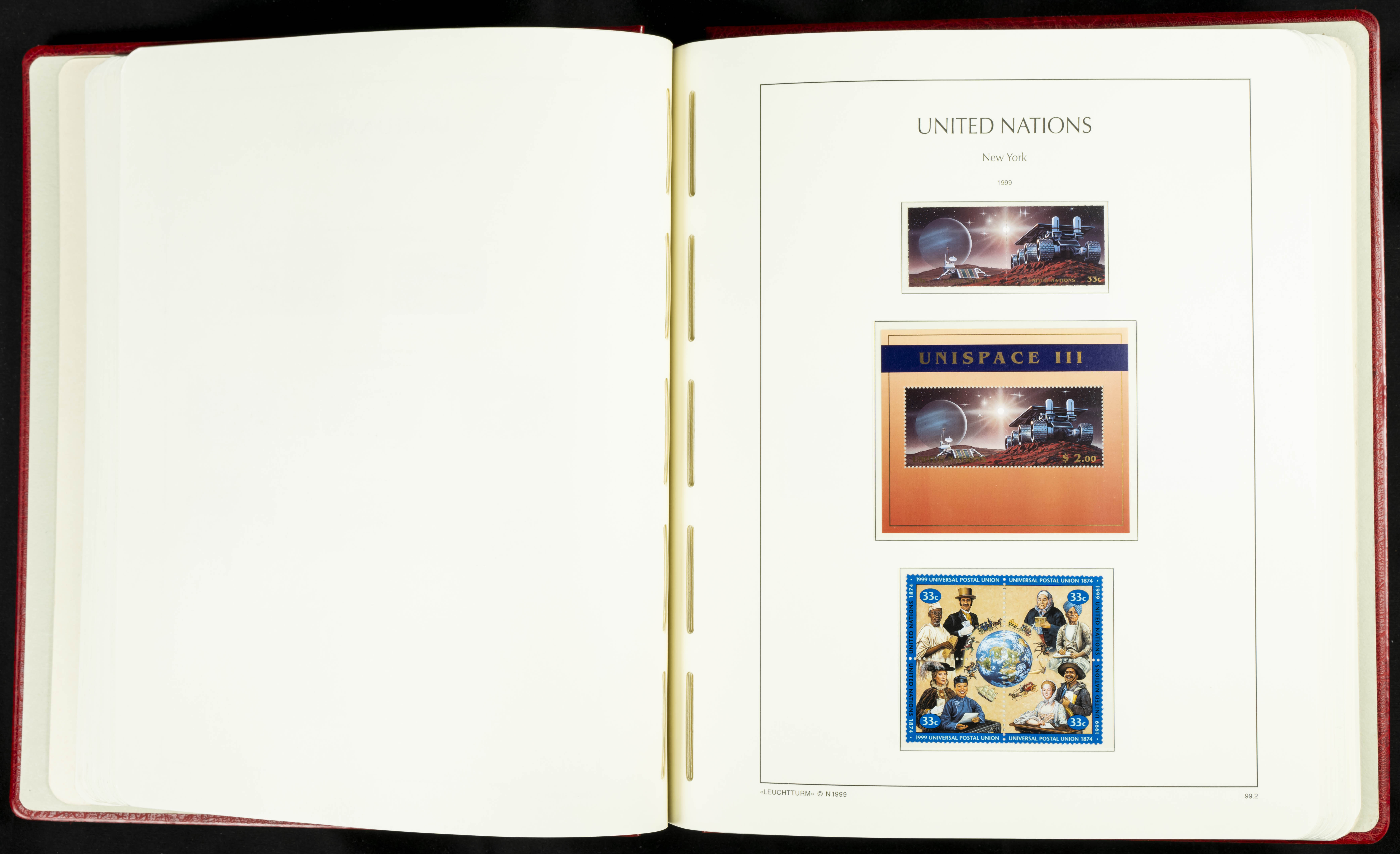 ★★(1951ca). Colección completa de Naciones Unidas (Nueva York, Ginebra y Viena) entre 1951 y 2011, en nuevo y sin fijasellos (montada en álbumes Faro). ALTO VALOR DE CATALOGO. A EXAMINAR.