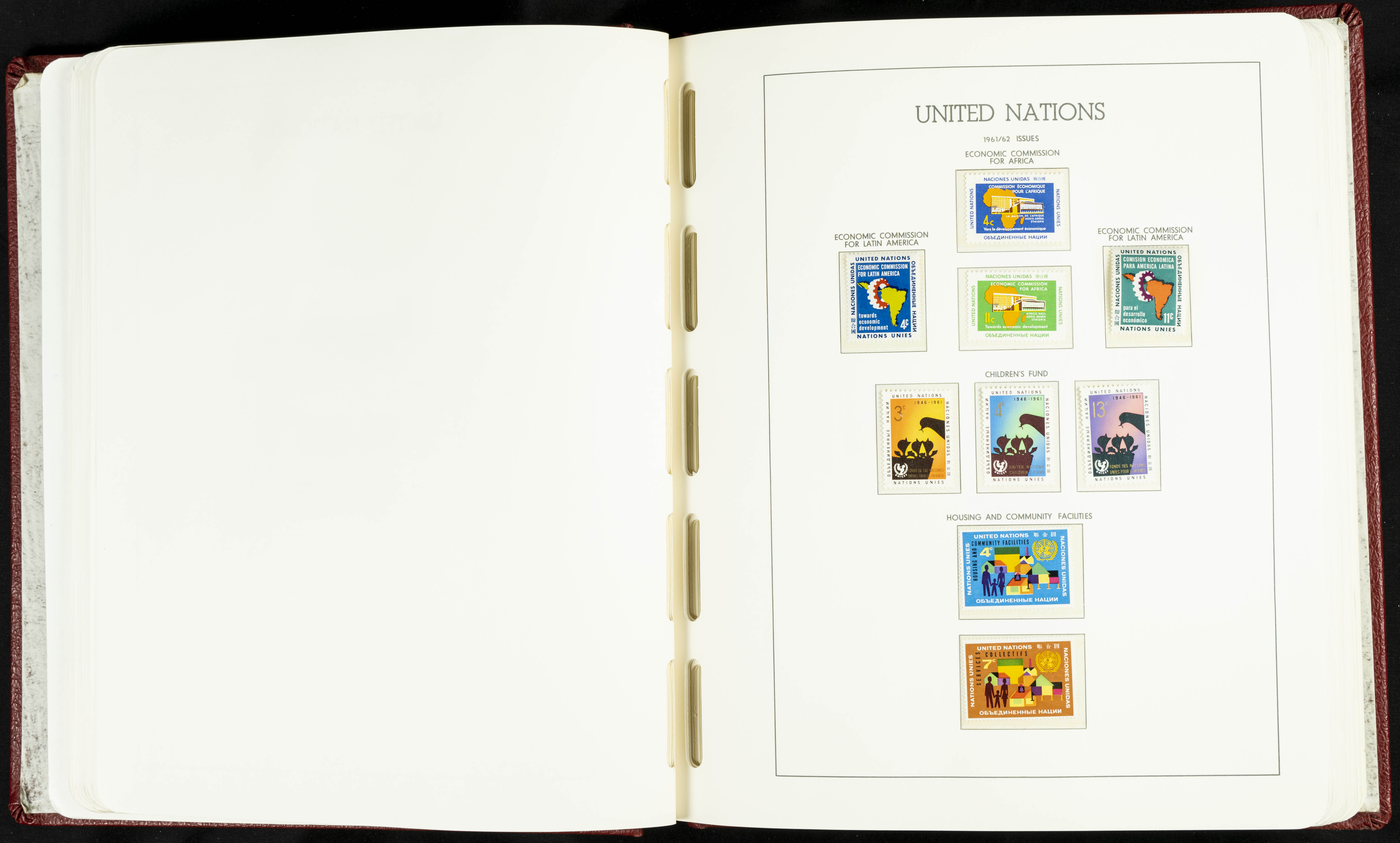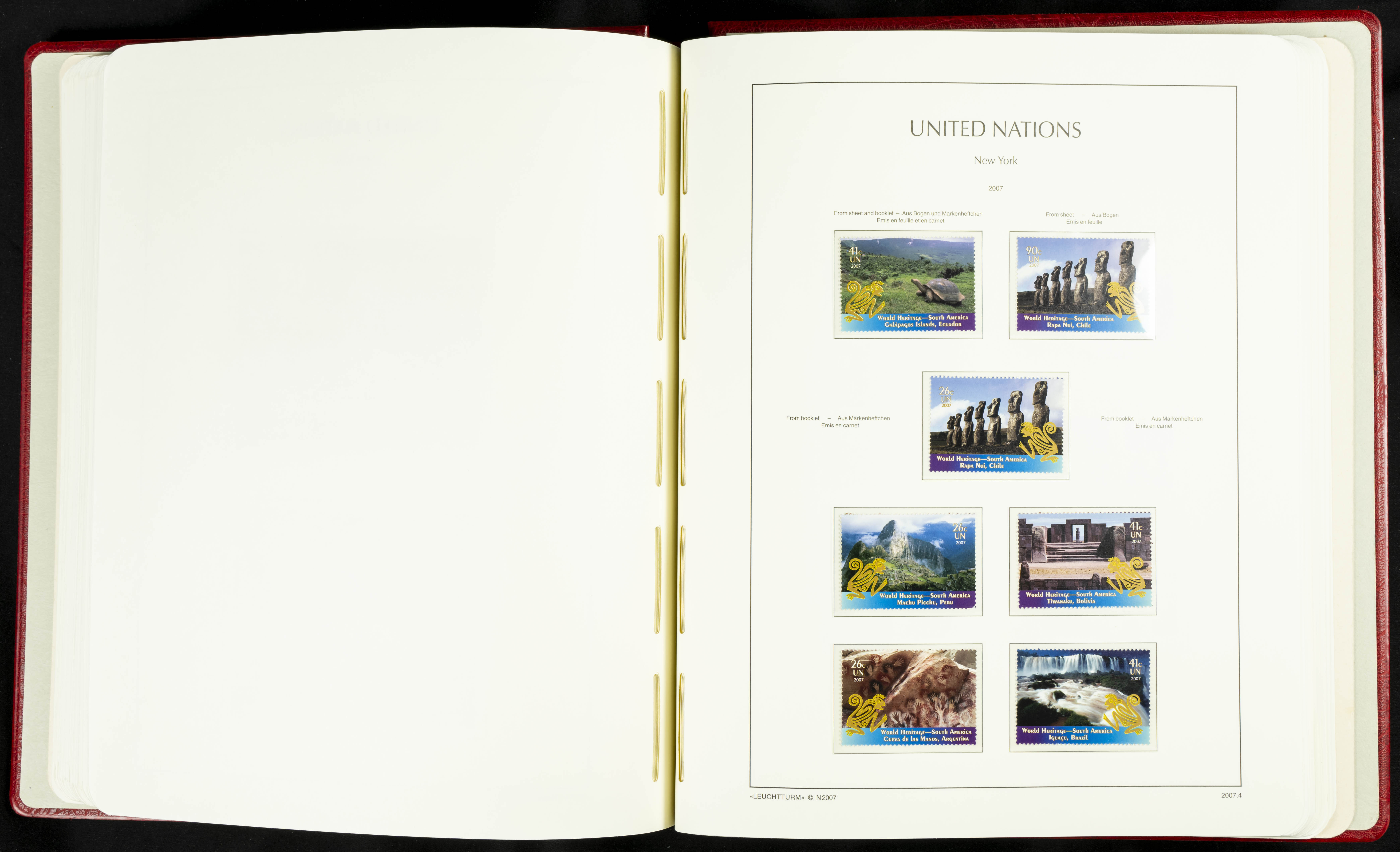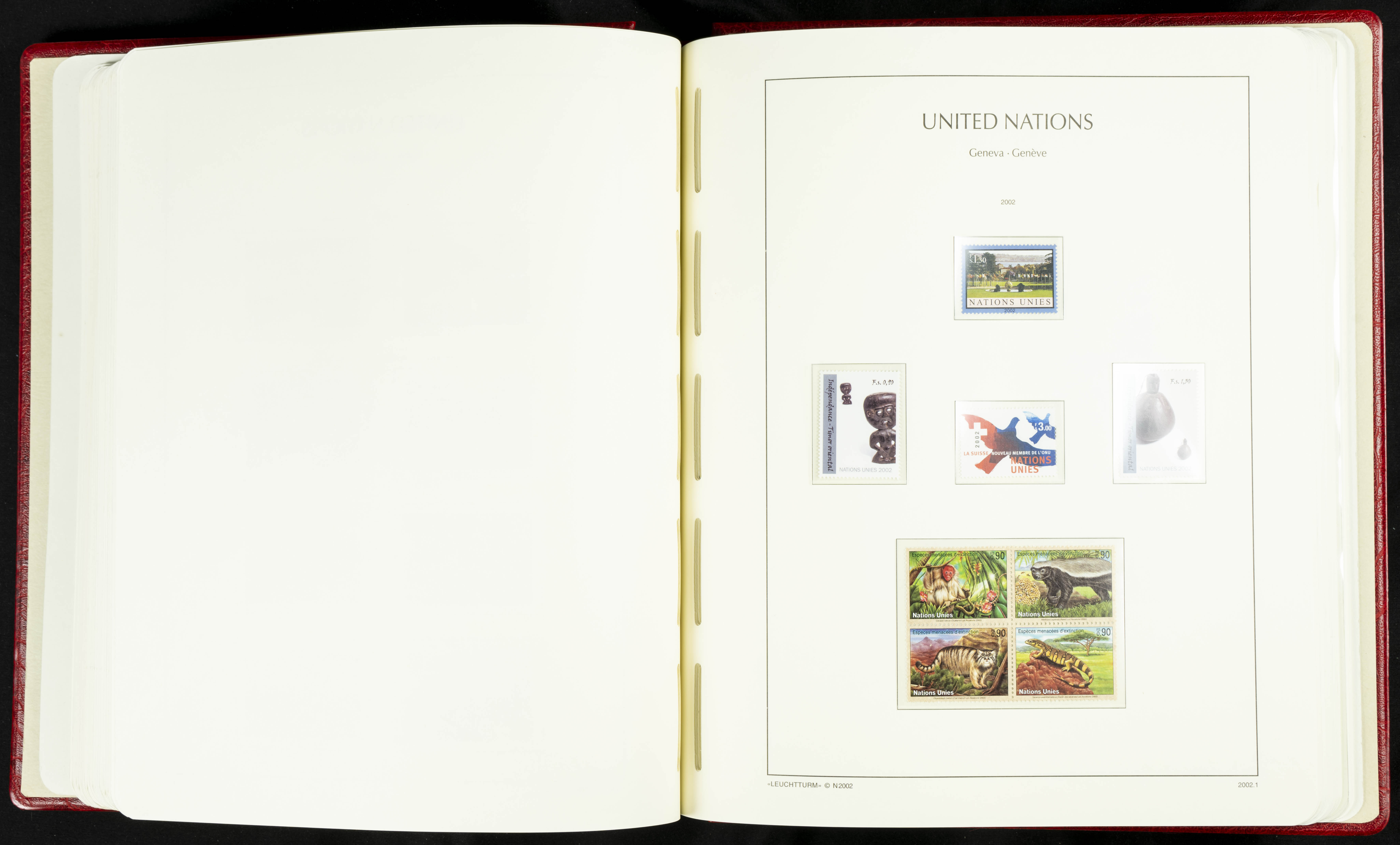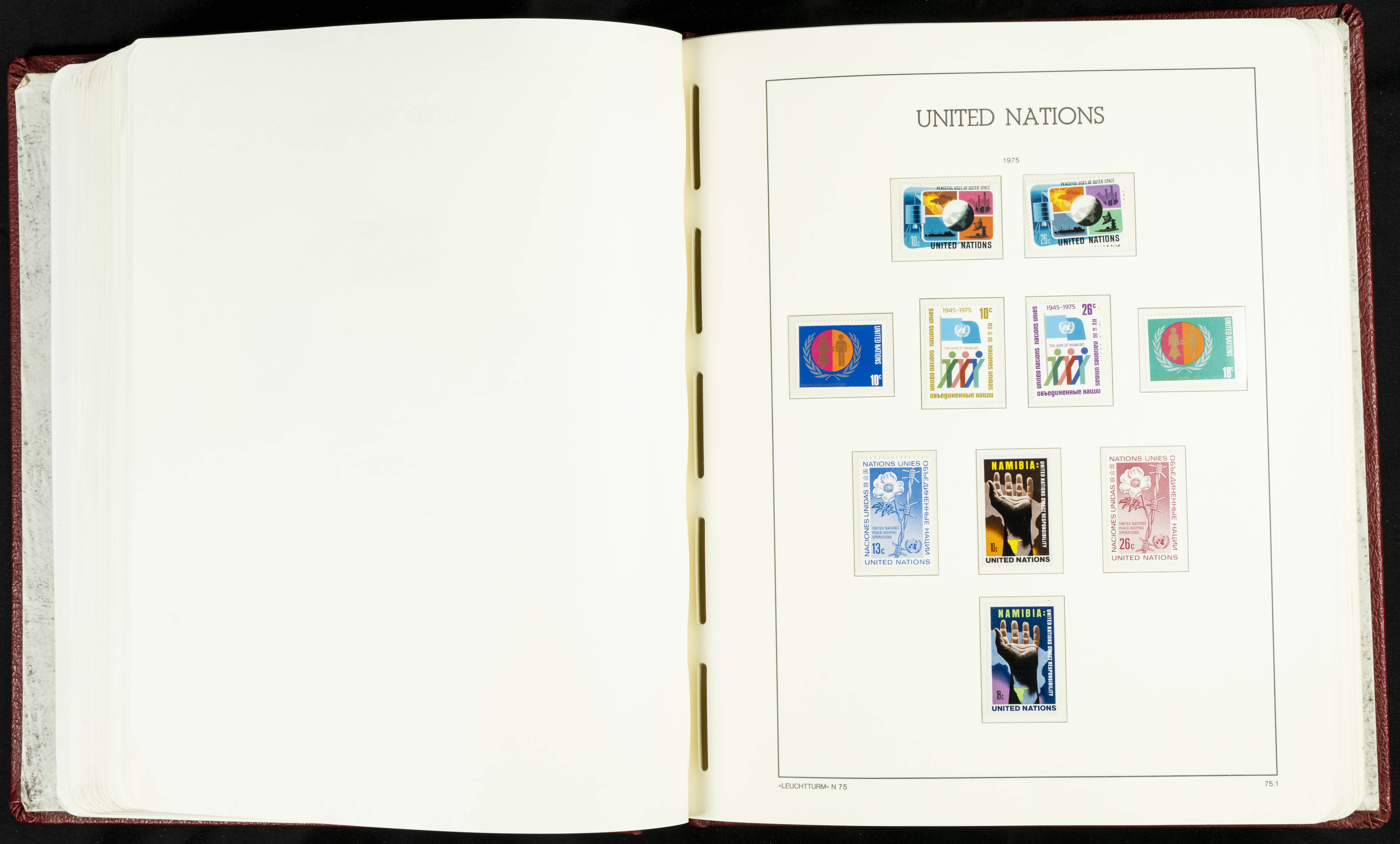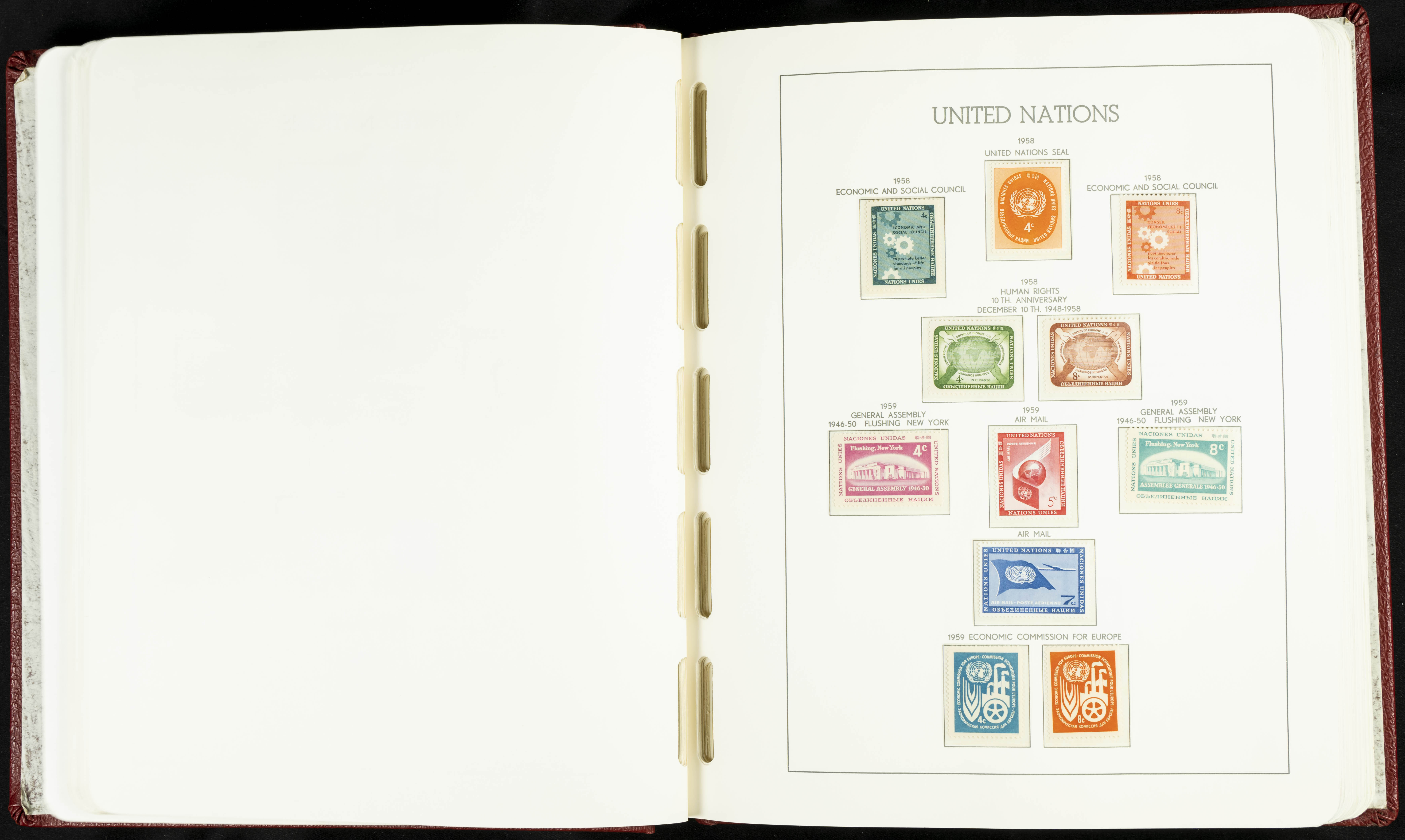 ★★(1951ca). Colección completa de Naciones Unidas (Nueva York, Ginebra y Viena) entre 1951 y 2011, en nuevo y sin fijasellos (montada en álbumes Faro). ALTO VALOR DE CATALOGO. A EXAMINAR.
