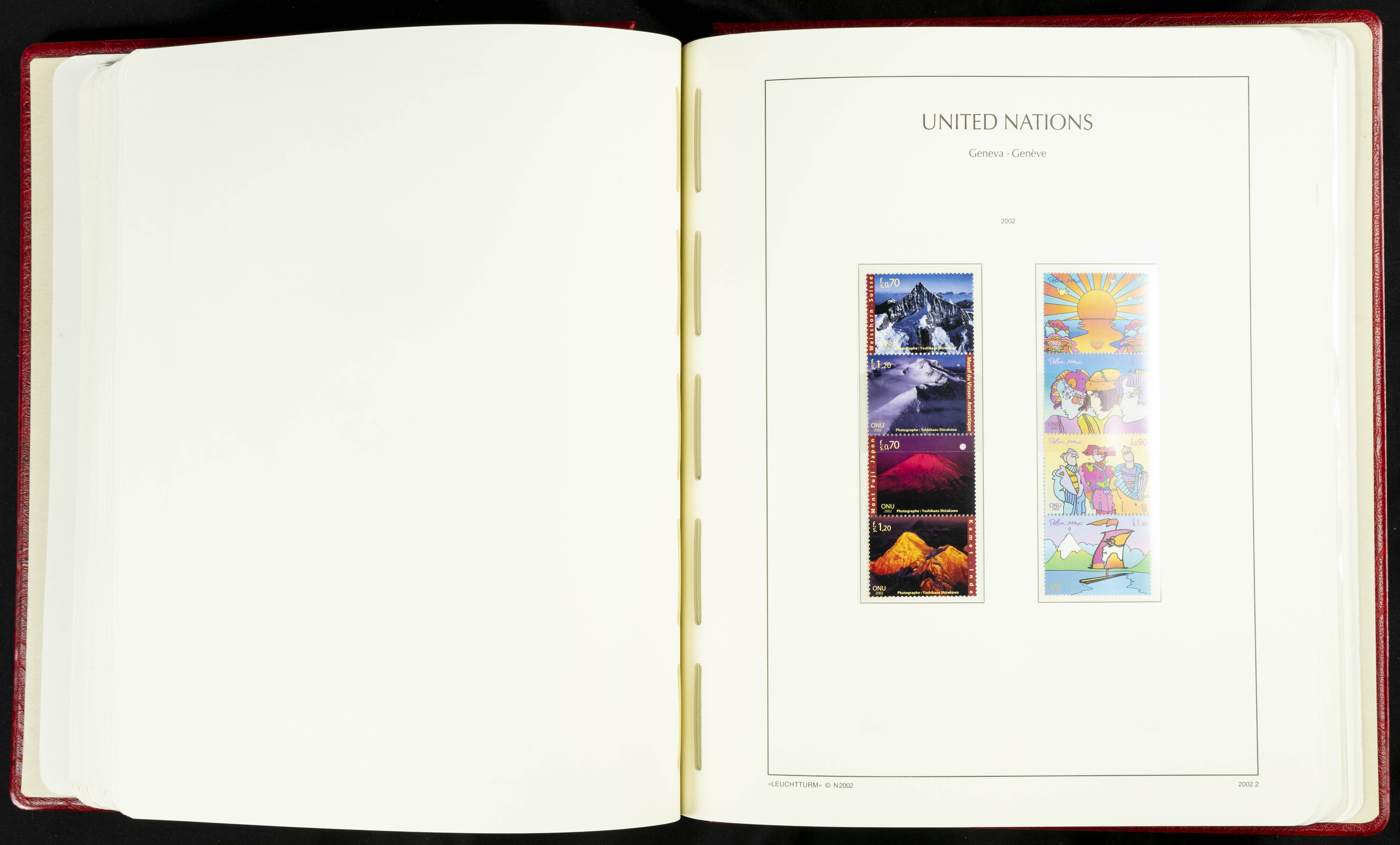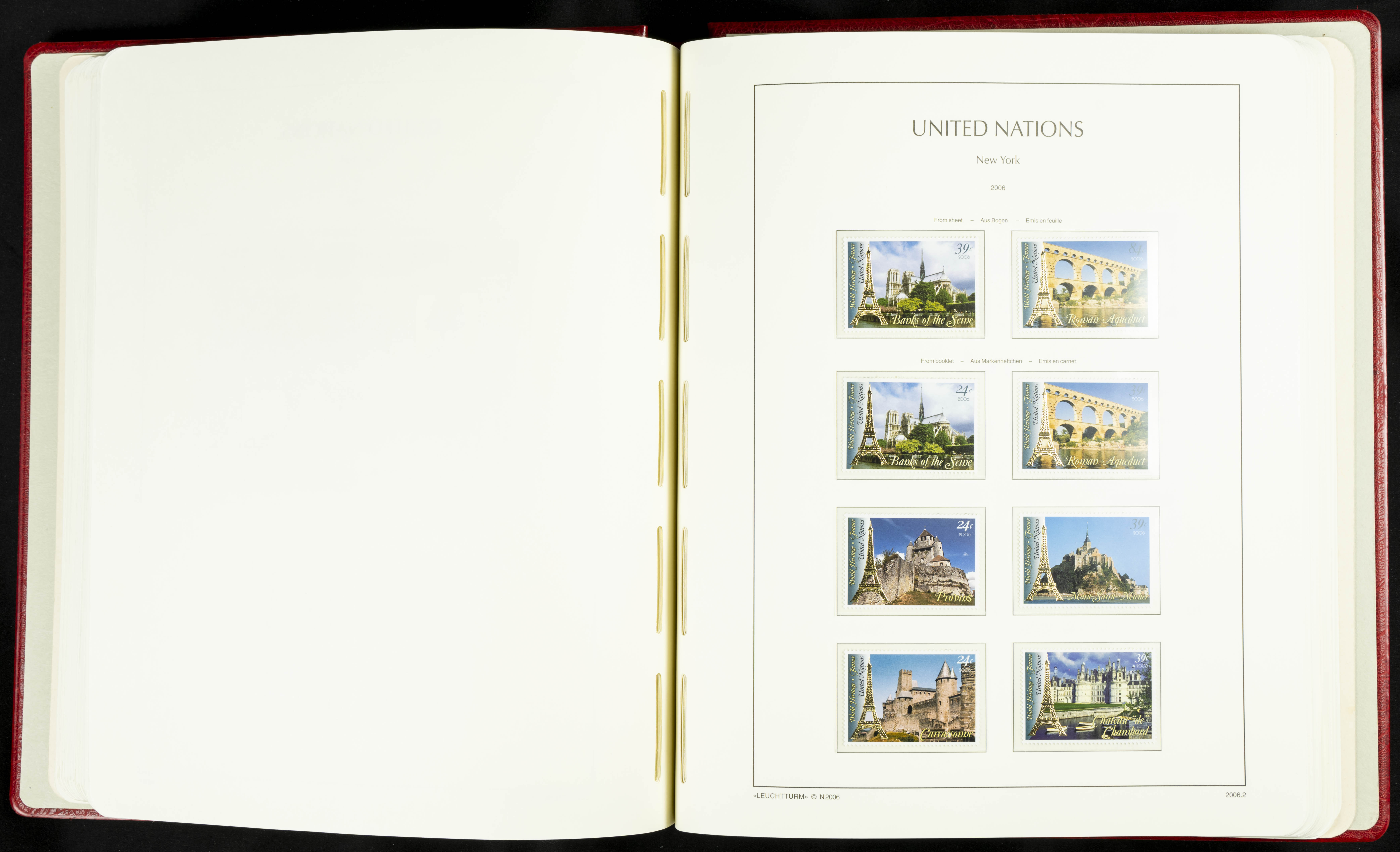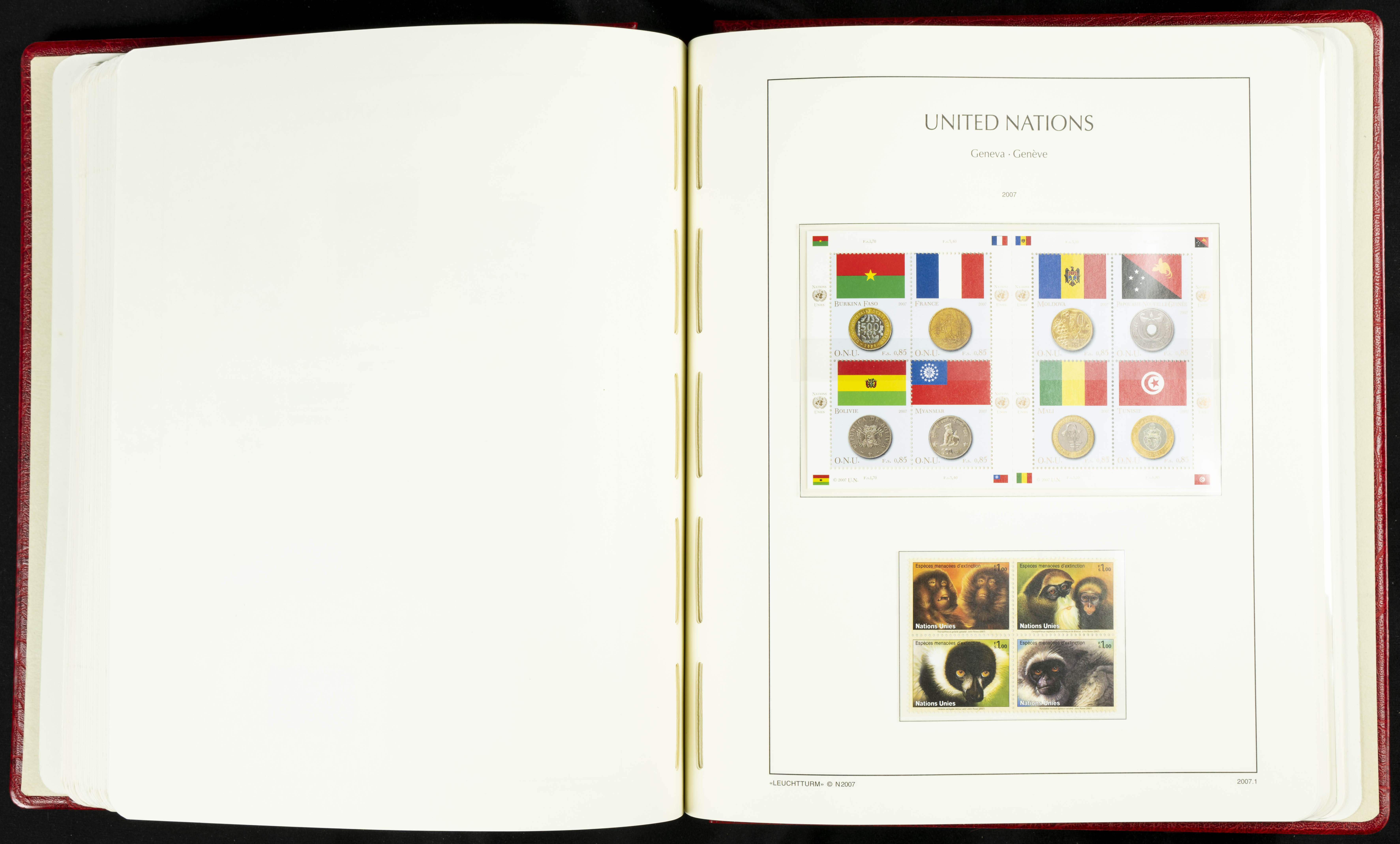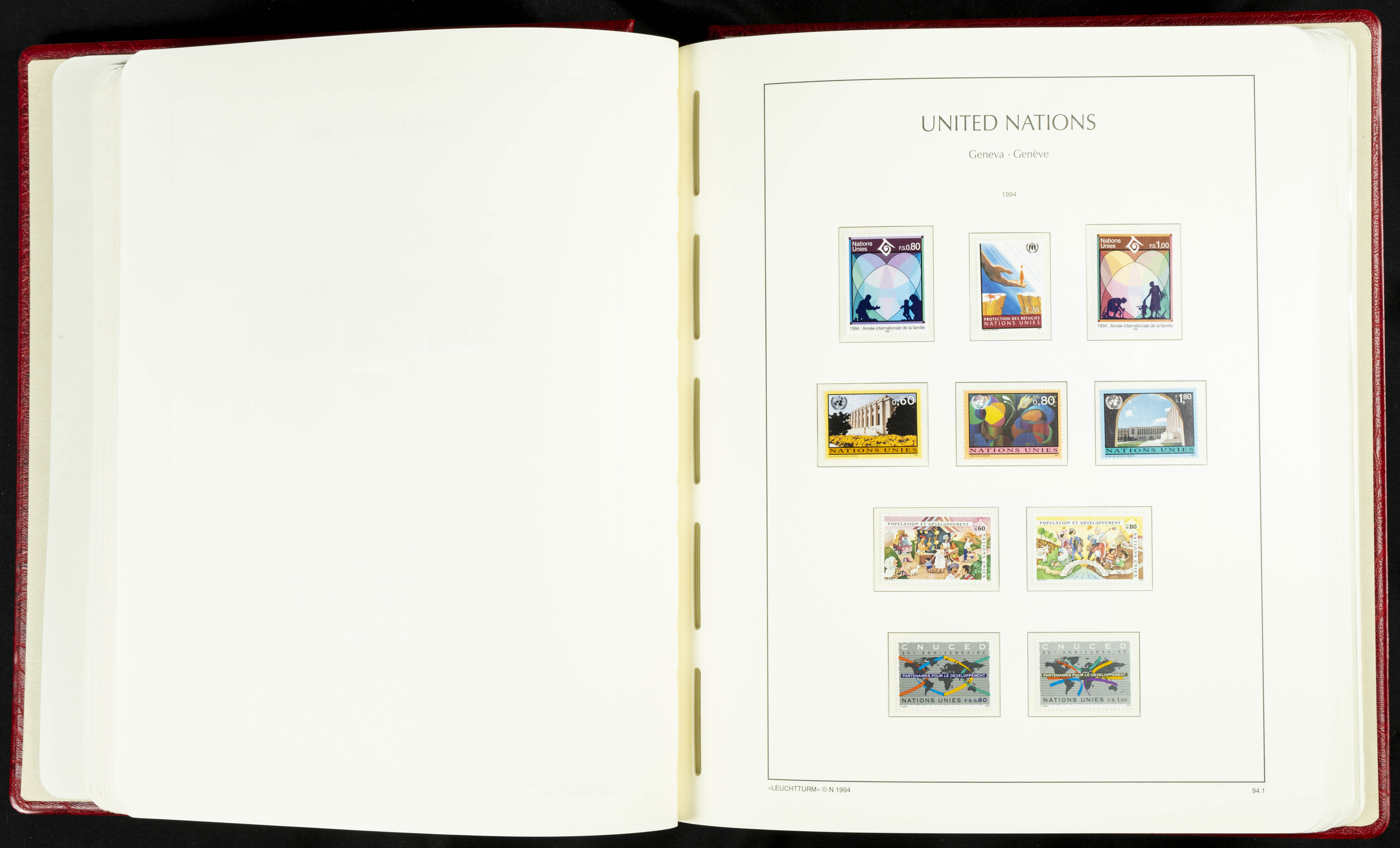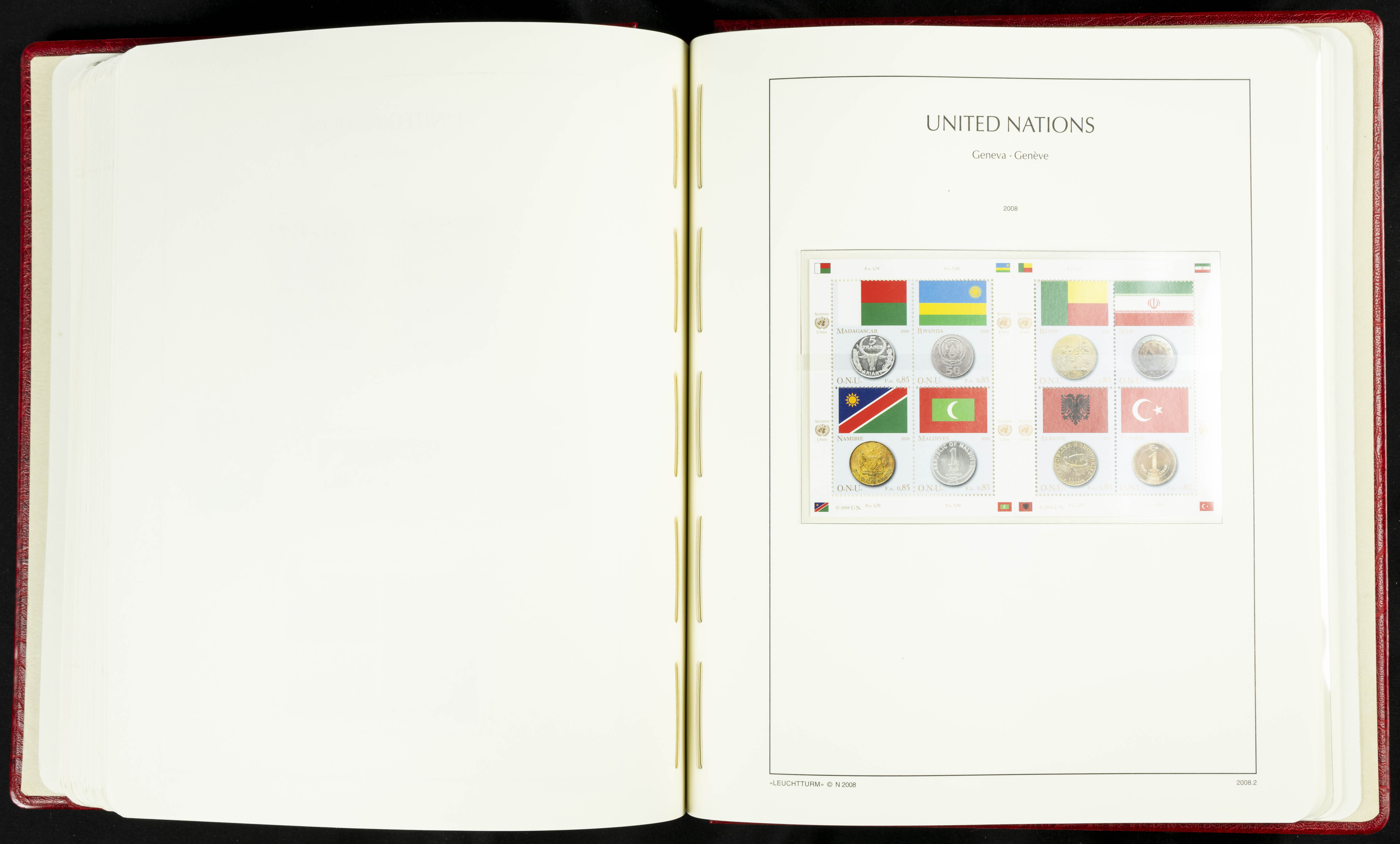 ★★(1951ca). Colección completa de Naciones Unidas (Nueva York, Ginebra y Viena) entre 1951 y 2011, en nuevo y sin fijasellos (montada en álbumes Faro). ALTO VALOR DE CATALOGO. A EXAMINAR.