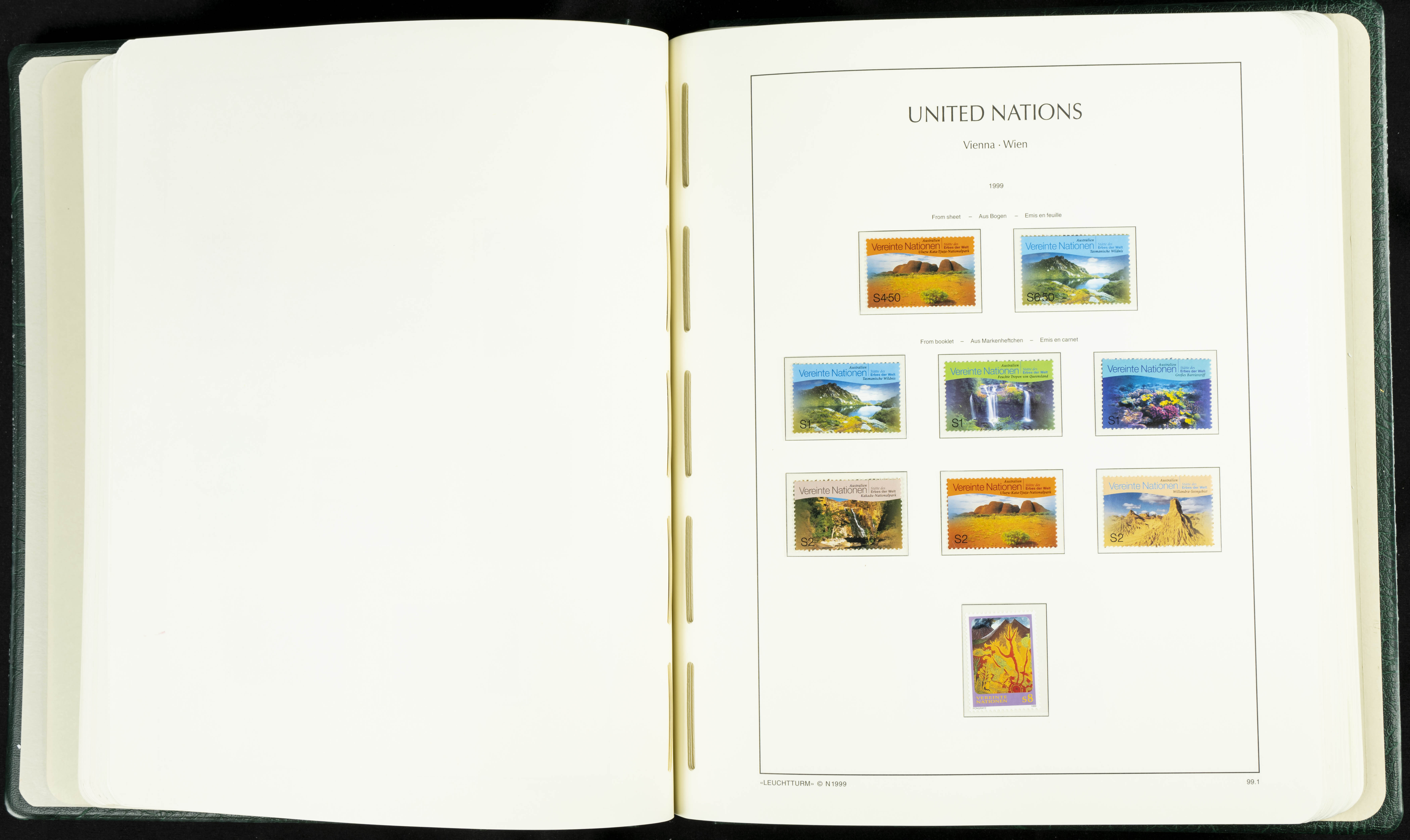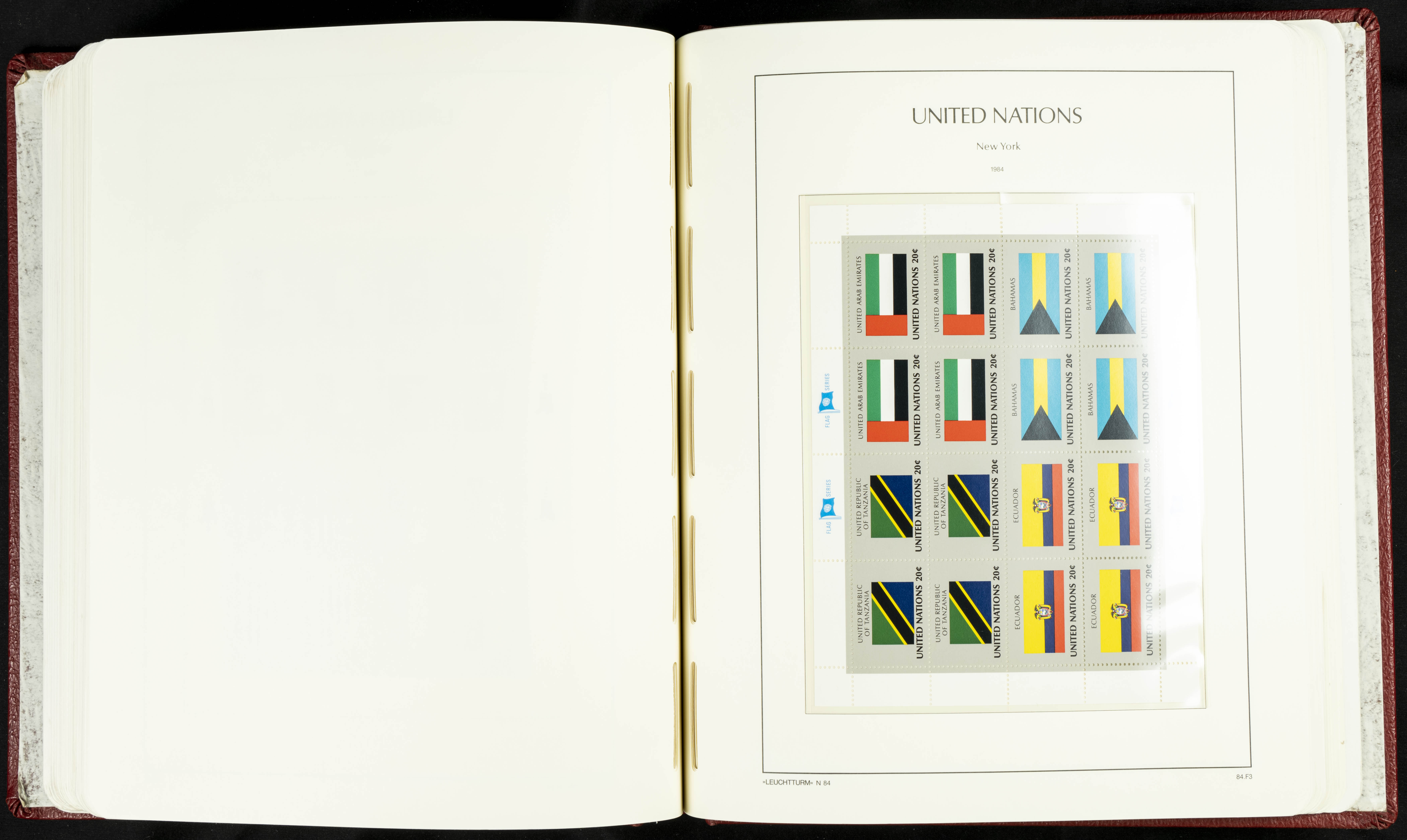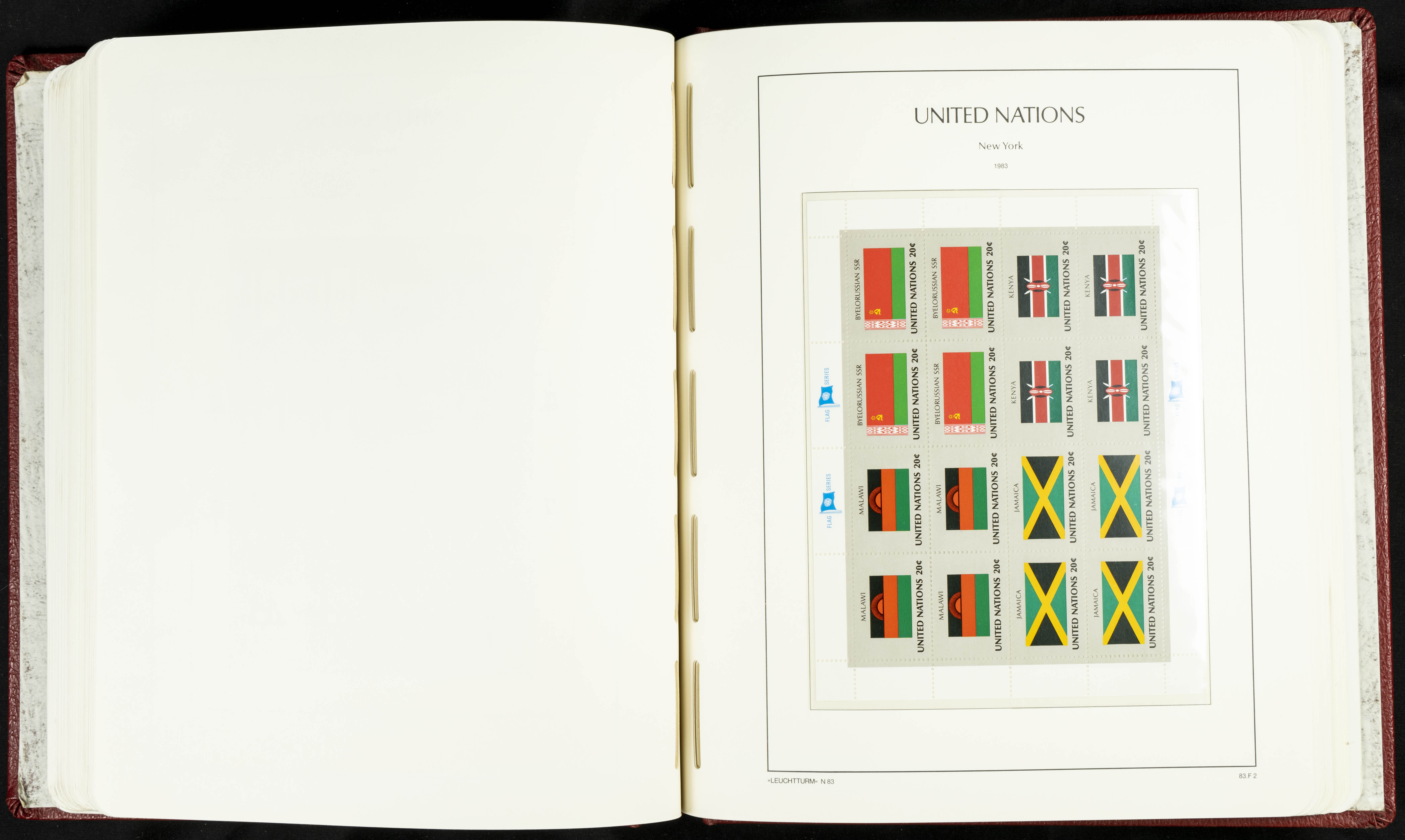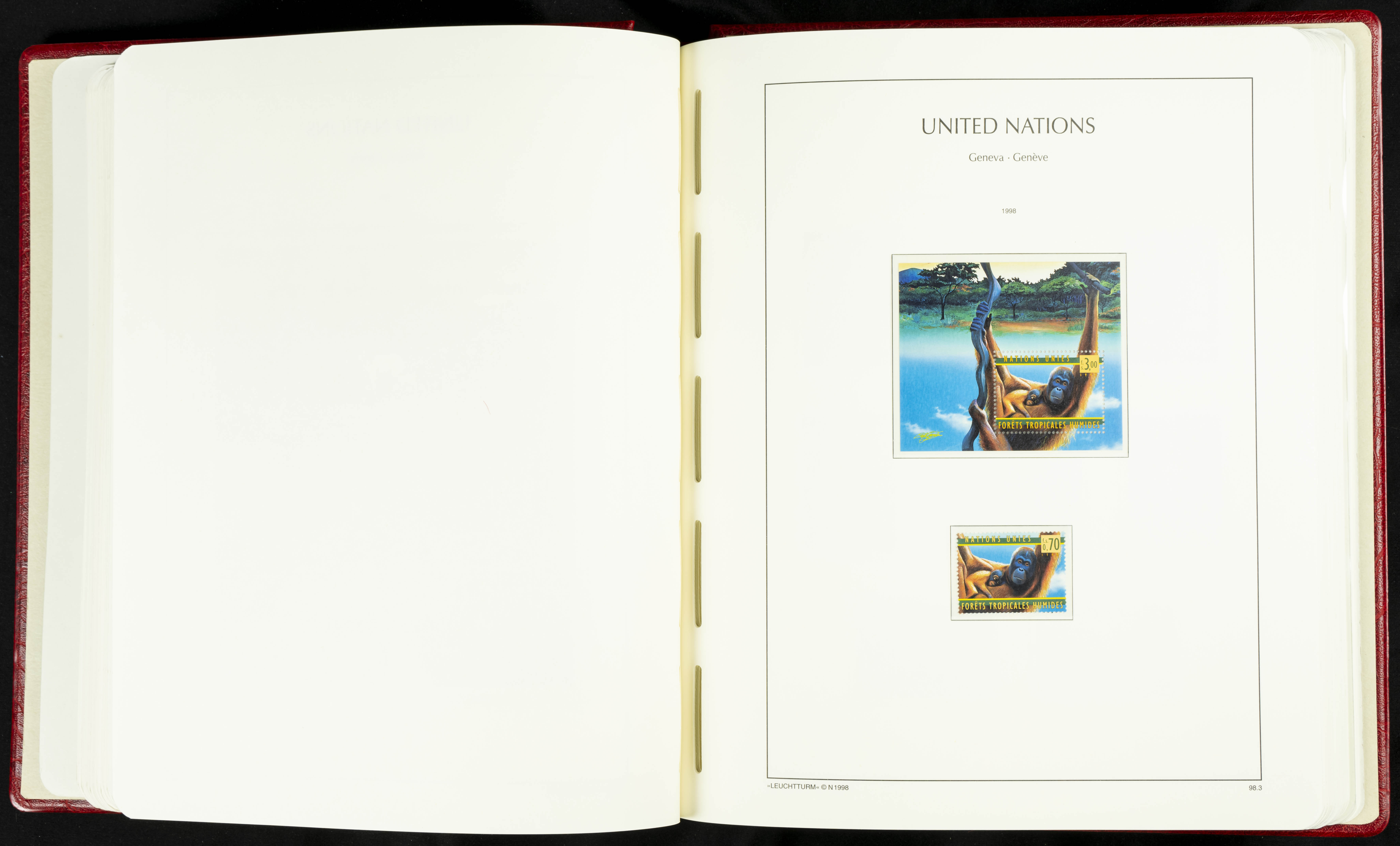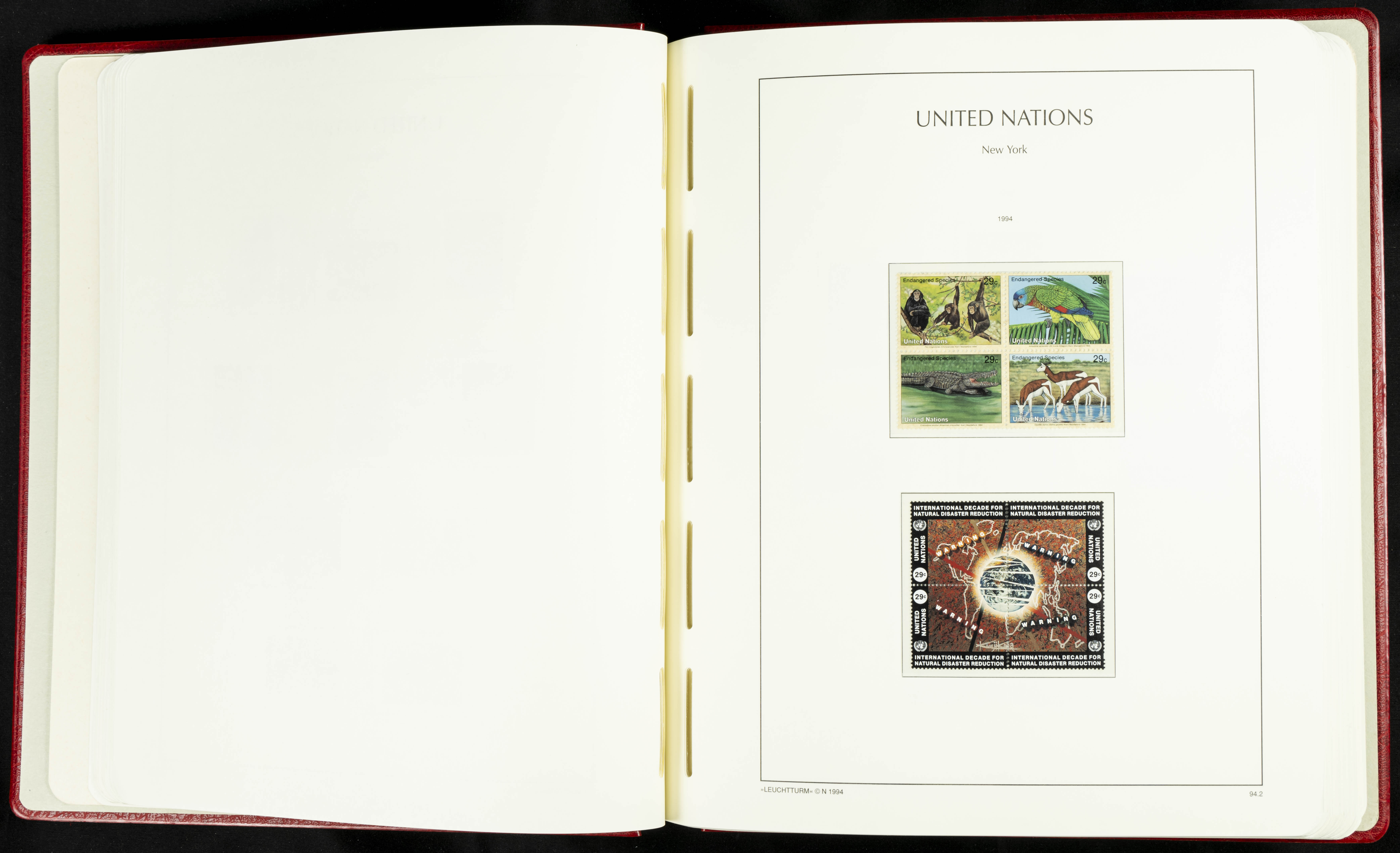 ★★(1951ca). Colección completa de Naciones Unidas (Nueva York, Ginebra y Viena) entre 1951 y 2011, en nuevo y sin fijasellos (montada en álbumes Faro). ALTO VALOR DE CATALOGO. A EXAMINAR.