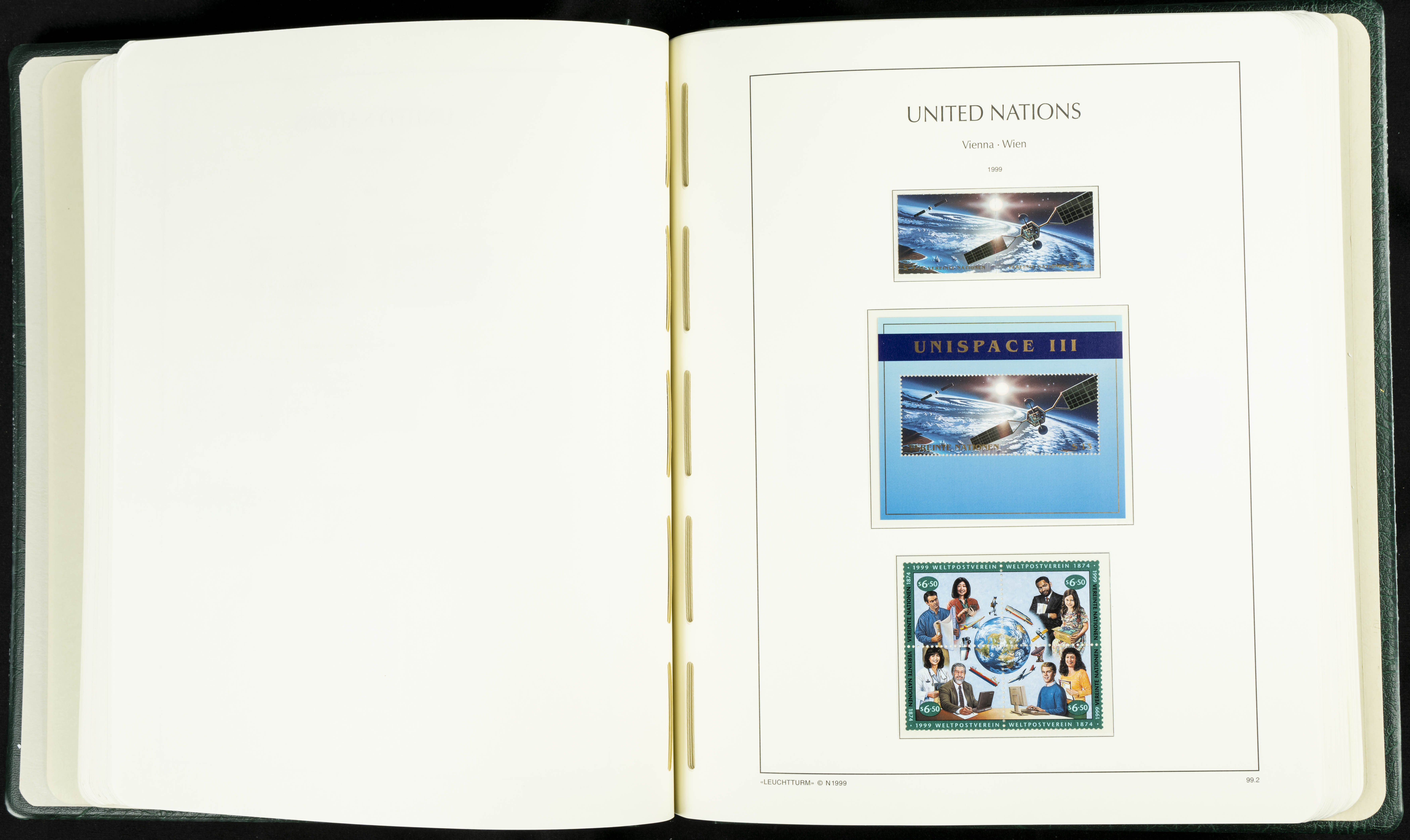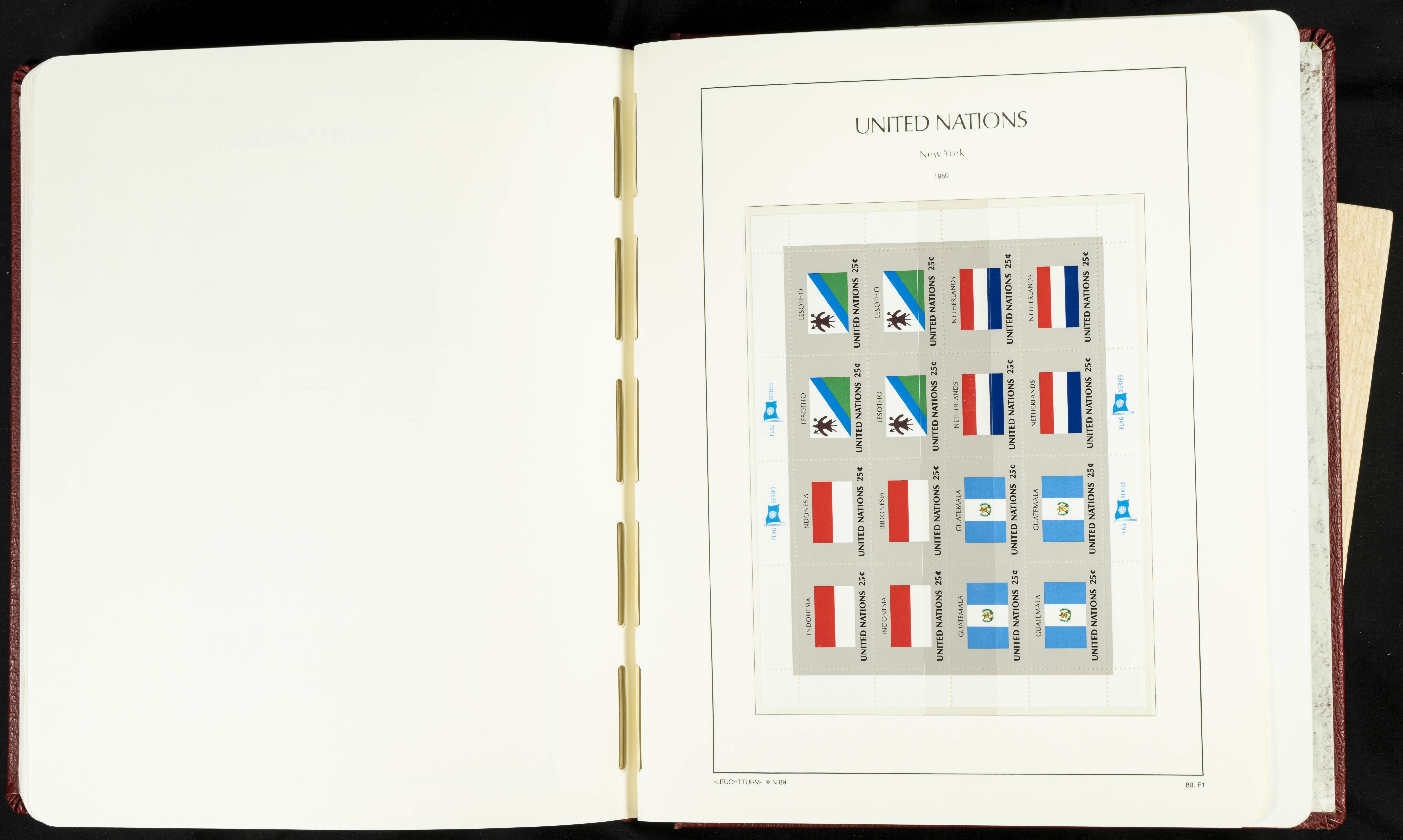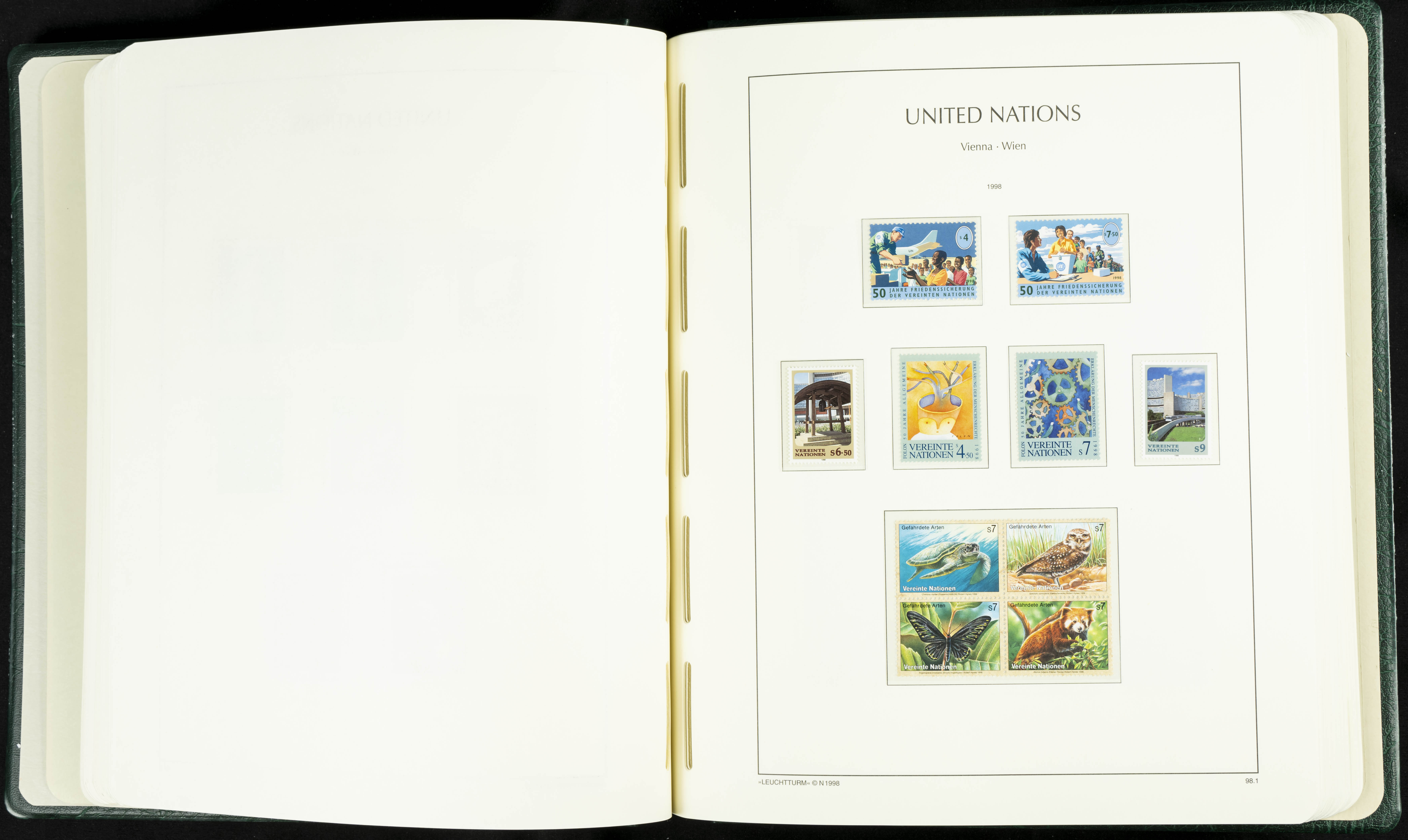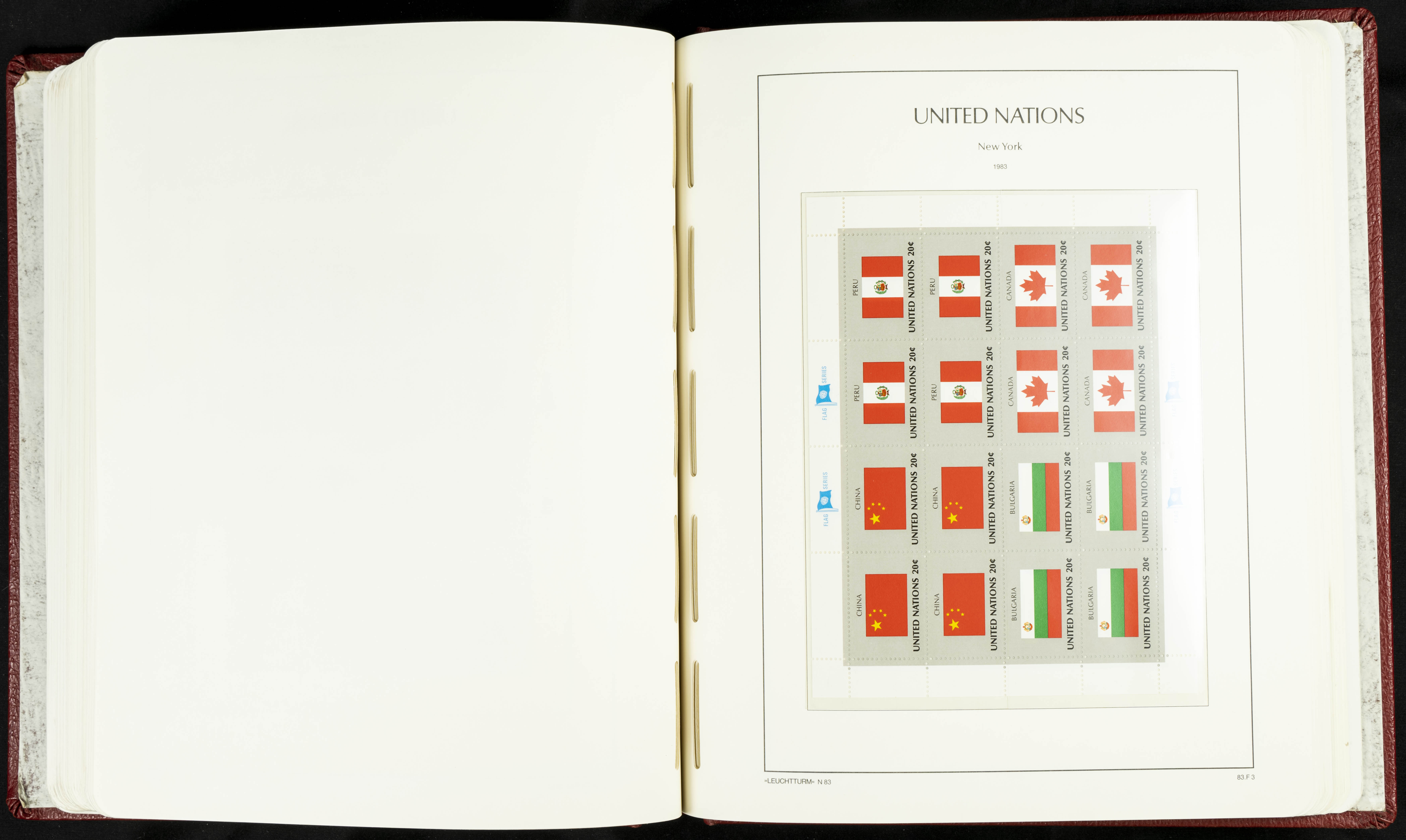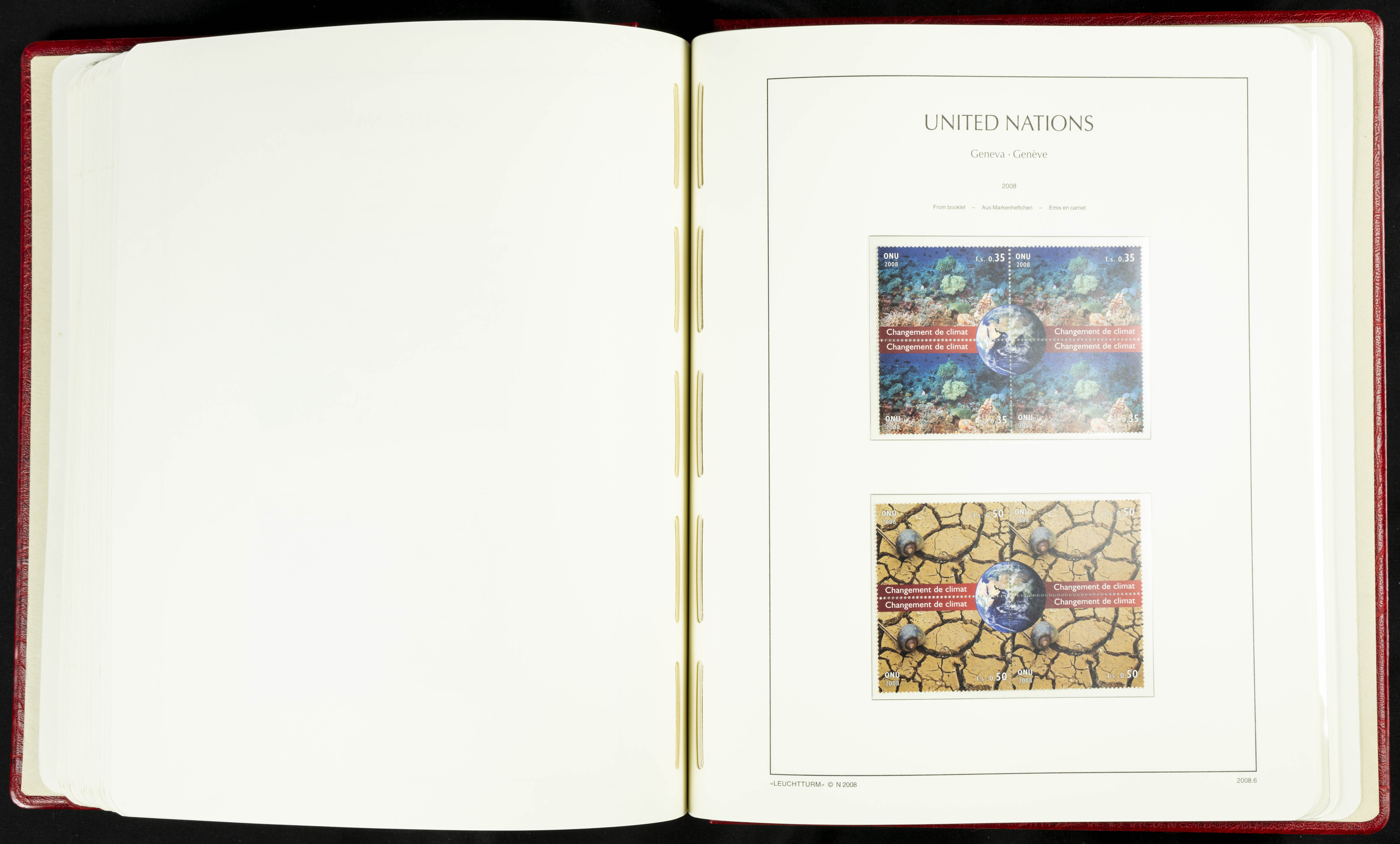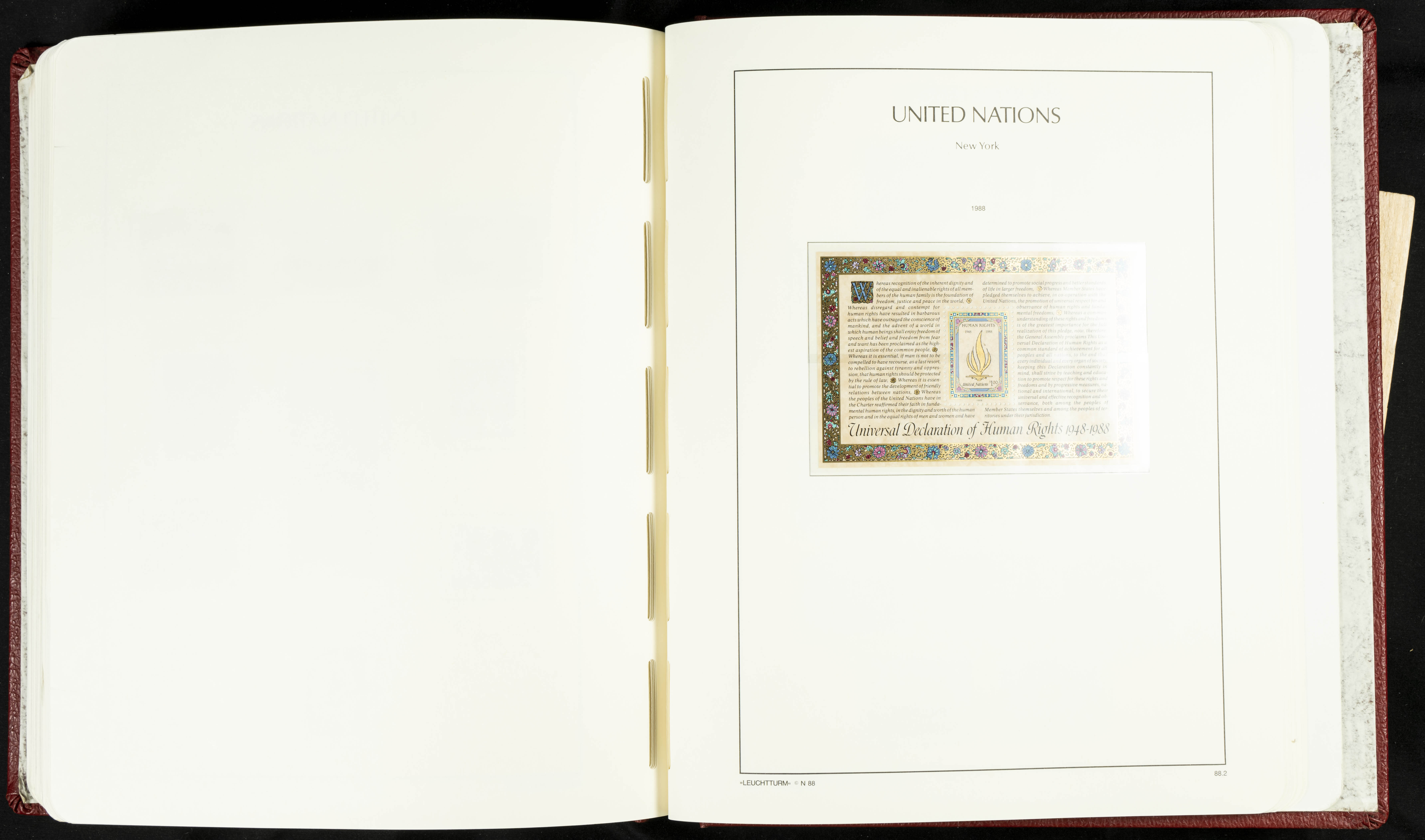 ★★(1951ca). Colección completa de Naciones Unidas (Nueva York, Ginebra y Viena) entre 1951 y 2011, en nuevo y sin fijasellos (montada en álbumes Faro). ALTO VALOR DE CATALOGO. A EXAMINAR.